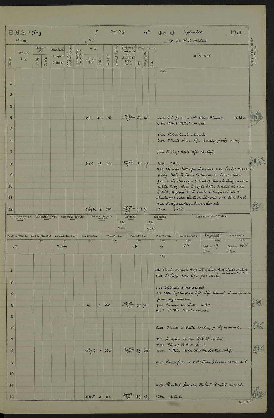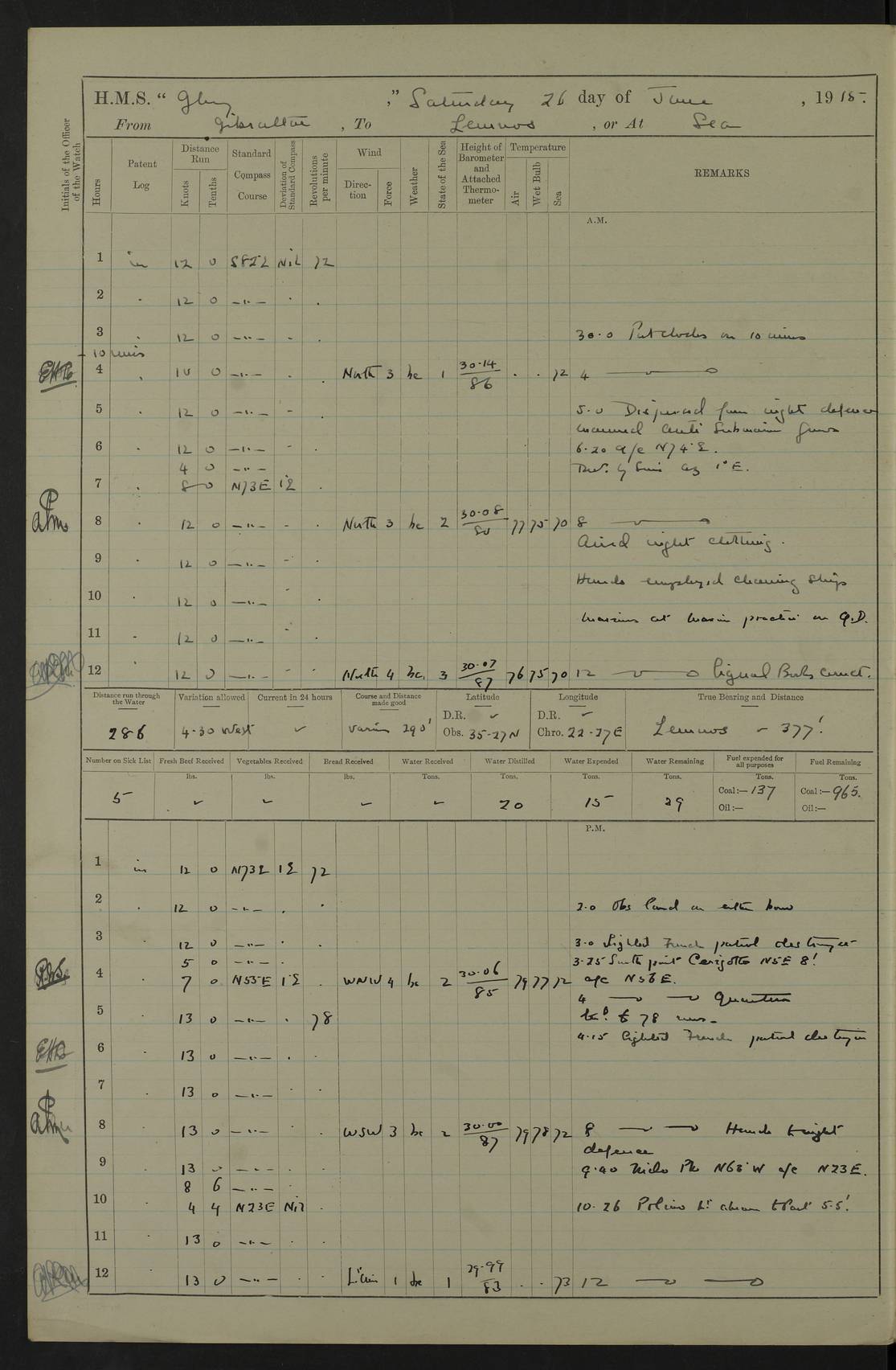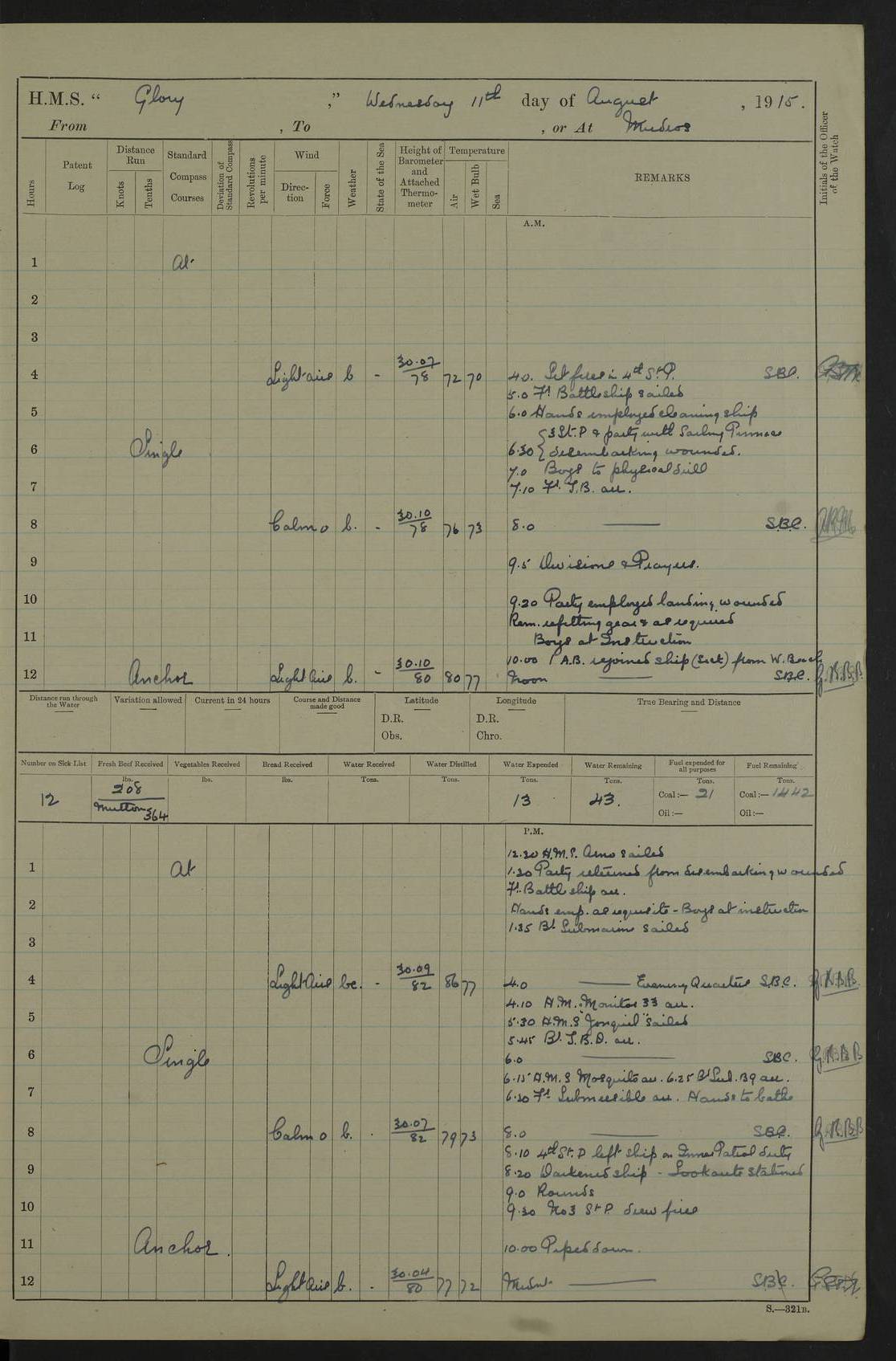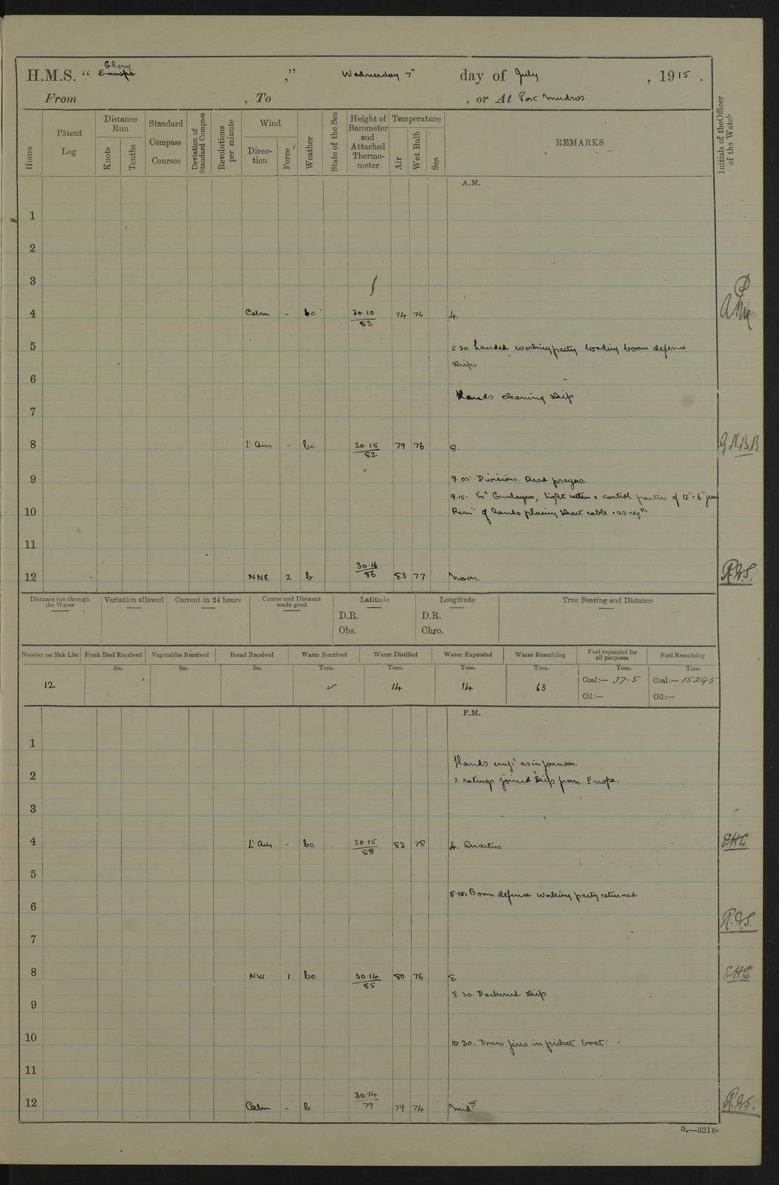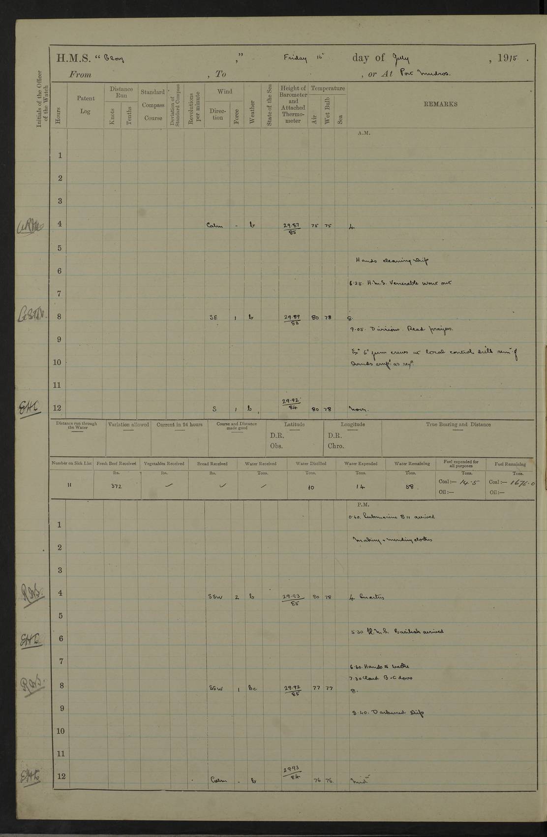 22 June 1915 At sea, Gibraltar to Lemnos Lat 36.1, Long -1.3 4.15am: Sighted land on starboard bow. 10.20am: Stopped port engine for repairs. 11.20am: proceeded with port engine. pm: a/c due to change in deviation. 10.00pm: Cape Tenez Light abeam, 18 miles. 4f73cd61a2fc8ea9030015f6: (https://s3.amazonaws.com:443/oldweather/ADM53-43015/0012_1.jpg) 23 June 1915 At sea, Gibraltar to Lemnos Lat 37.5, Long 4.8 Number on sick list: 4 5.00am: Secured from night defence stations. Placed anti-submarine guns. pm: Life saving appliances served out to men stationed in ? ?at abandon ship. 4f73cd61a2fc8ea9030015f7: (https://s3.amazonaws.com:443/oldweather/ADM53-43015/0013_0.jpg) 24 June 1915 At sea, Gibraltar to Lemnos Lat 37.4, Long 10.8 Position in log clearly bears no resemblance to the location of the ship. Position above is approximate and is based sighting of Zembra Island at 11.55am. 5.00am: Dispersed from night defence stations. Manned anti-submarine guns. am: Sighted two French torpedo boats. am: Torpedo boats passed to ~ No 362, 363. am: Sighted land on starboard beam. 11.55am: Zembra Island abeam, 25 miles. 2.00pm: Sighted Pantellaria S34ºE. 4.45pm: Pantellaria Light House abeam 12 miles. 4f73cd61a2fc8ea9030015f8: (https://s3.amazonaws.com:443/oldweather/ADM53-43015/0013_1.jpg) 25 June 1915 At sea, Gibraltar to Lemnos Lat 35.5, Long 16.7 2.10am: Gozo Light abeam 17 miles. 5.00am: Dispersed from night defence stations. Manned anti-submarine guns. 4f73cd61a2fc8ea9030015f9: (https://s3.amazonaws.com:443/oldweather/ADM53-43015/0014_0.jpg) 26 June 1915 At sea, Gibraltar to Lemnos Lat 35.5, Long 22.6 Number on sick list: 5 5.00am: Dispersed from night defence stations. Manned anti-submarine guns. am: Aired night clothing. am: marines at maxim practice on quarter deck. 2.00pm: Observed land on either bow. 3.00pm: Sighted French patrol destroyer. 4.15pm: Sighted French patrol destroyer. 9.40pm: Milo Peak N63ºW. 10.26pm: Polino Light abeam to port 5.5 miles. 4f73cd62a2fc8ea9030015fa: (https://s3.amazonaws.com:443/oldweather/ADM53-43015/0014_1.jpg) 27 June 1915 At sea and at Lemnos Lat 39.1, Long 24.4 From 0.50 to 3.05am sighting of multiple light houses. 3.50am: a/c to N39ºW and commenced to zig-zag. 5.00am: Dispersed from night defence stations and placed anti-submarine guns and look-outs. am: Lost overboard by accident Hazlewood fender, pat. 311, one in number. 10.30am: Held Divine Service onboard. pm: Met and signalled HMS Minerva on patrol duty. pm: Courses and speeds as requisite while waiting orders to approach Mudros. 3.00pm: Proceeded. 5.16pm: Increased to 90 revs, commenced to zig-zag. Course as requisite for Mudros. 7.00pm: Entered Mudros Bay. 7.47pm: Stopped. Let go port anchor in ‘M3’. 8.30pm: Darkened ship. pm: Manned one 6” and one 12 pdr. 4f73cd62a2fc8ea9030015fb: (https://s3.amazonaws.com:443/oldweather/ADM53-43015/0015_0.jpg) 28 June 1915 Mudros Bay, Lemnos Lat 39.89, Long 25.24 5,00am: HMS Vengeance entered harbour. HMS Vengeance was a pre-dreadnought of the Canopus class, launched in 1899 at Vickers, Barrow, and sold for scrapping in 1921. Details at http://en.wikipedia.org/wiki/HMS_Vengeance_(1899) . am/pm/: hands preparing for coaling and about ship’s work. pm: Collier Wabana secured alongside. 4f73cd62a2fc8ea9030015fc: (https://s3.amazonaws.com:443/oldweather/ADM53-43015/0015_1.jpg) 29 June 1915 Mudros Bay, Lemnos Lat 39.89, Long 25.24 5.15am: Commenced coaling. 2.00pm: Finished coaling. Collier left. 4f73cd62a2fc8ea9030015fd: (https://s3.amazonaws.com:443/oldweather/ADM53-43015/0016_0.jpg) 30 June 1915 Mudros Bay, Lemnos Lat 39.89, Long 25.24 am: Parties away sanding, and with fire engines onshore. am: Boats away disembarking troops. am: French Flagship Patrie sailed. The Patrie was a French pre-dreadnought, launched at La Seyne shipyard in 1903, and stricken in 1921. Details at http://en.wikipedia.org/wiki/French_battleship_Patrie . 6.30pm: Hands to bathe. 4f73cd63a2fc8ea9030015fe: (https://s3.amazonaws.com:443/oldweather/ADM53-43015/0016_1.jpg) 4f73cd63a2fc8ea9030015ff: (https://s3.amazonaws.com:443/oldweather/ADM53-43015/0017_0.jpg) 4f73cd63a2fc8ea903001600: (https://s3.amazonaws.com:443/oldweather/ADM53-43015/0017_1.jpg) 4f73cd63a2fc8ea903001601: (https://s3.amazonaws.com:443/oldweather/ADM53-43015/0018_0.jpg) 4f73cd64a2fc8ea903001602: (https://s3.amazonaws.com:443/oldweather/ADM53-43015/0018_1.jpg) LOGS FOR JULY 1915 From July to October 1915, HMS Glory spent her time at Port Mudros. Certain activities typically took place daily and are not generally noted in the pages below. These activities include: Lighting fires in the picket boat around 4am and drawing the fires in the late evening; Divisions at around 9–9.30am and Evening Quarters at 4pm; Darken ship at around 8.30pm; Daily ‘cleaning ship’, with variations thereof; SBC (for ‘Signal Books Correct’) at the watch changes. 4f73cd64a2fc8ea903001603: (https://s3.amazonaws.com:443/oldweather/ADM53-43016/0000_0.jpg) 4f73cd64a2fc8ea903001604: (https://s3.amazonaws.com:443/oldweather/ADM53-43016/0000_1.jpg) 4f73cd65a2fc8ea903001605: (https://s3.amazonaws.com:443/oldweather/ADM53-43016/0001_0.jpg) 4f73cd65a2fc8ea903001606: (https://s3.amazonaws.com:443/oldweather/ADM53-43016/0001_1.jpg) 1 July 1915 Port Mudros Lat 39.89, Long 25.24 6.30am: Landed working parties preparing boom defence ships. am: Discharged Acting Commander Rayne to Hector. Hector was a kite balloon ship. No further details readily available. 5.00pm: Tug T.10 made fast astern. 7.15pm: HMS Venerable went out. 7.30pm: HMS Chatham went out. HMS Chatham was a ‘Town’ cruiser and lead ship of her class. She was launched in 1911 at Chatham Dockyard and sold in 1926. Details at http://en.wikipedia.org/wiki/HMS_Chatham_(1911) . 4f73cd65a2fc8ea903001607: (https://s3.amazonaws.com:443/oldweather/ADM53-43016/0002_0.jpg) 2 July 1915 Port Mudros Lat 39.89, Long 25.24 5.35am: Landed working parties preparing boom defence ships. am/pm: Boom defence par