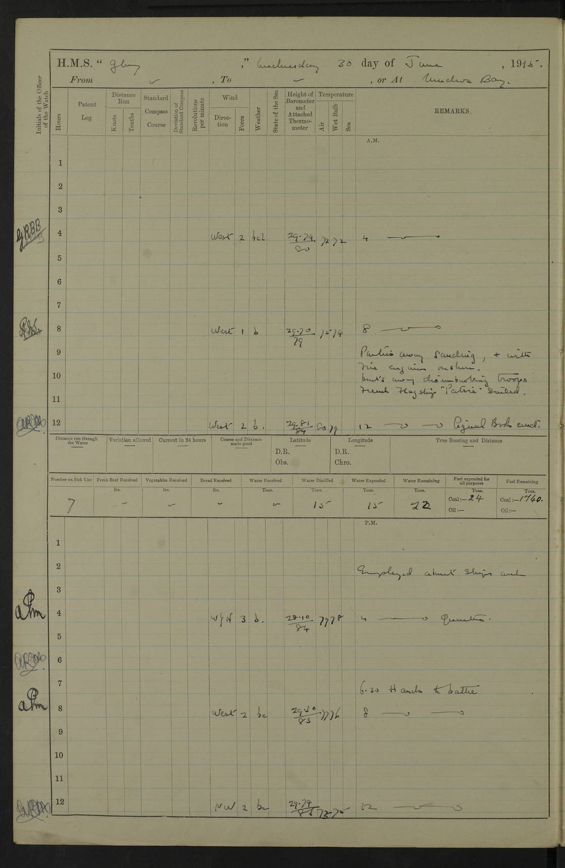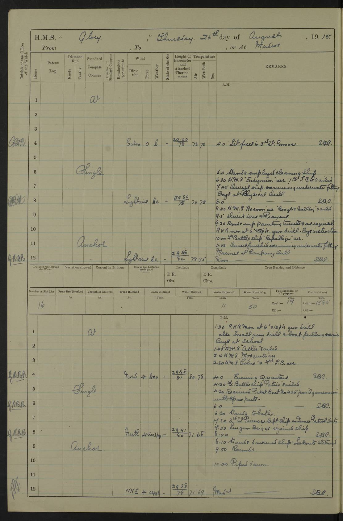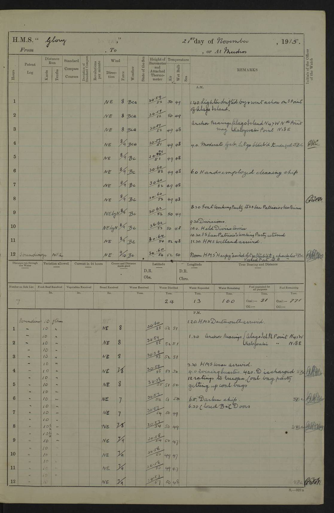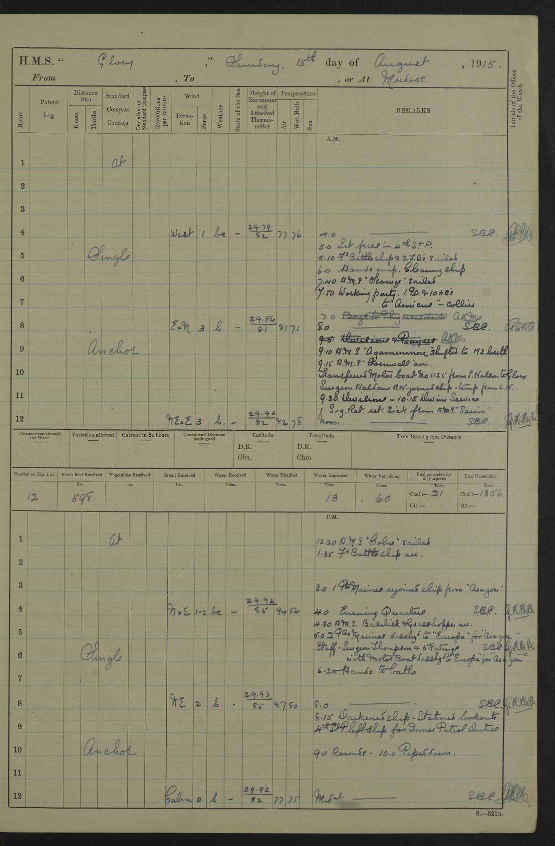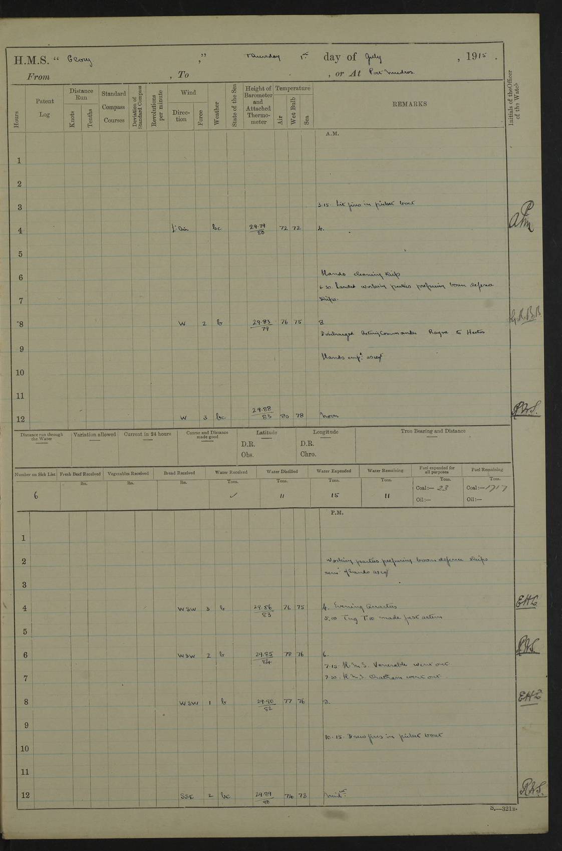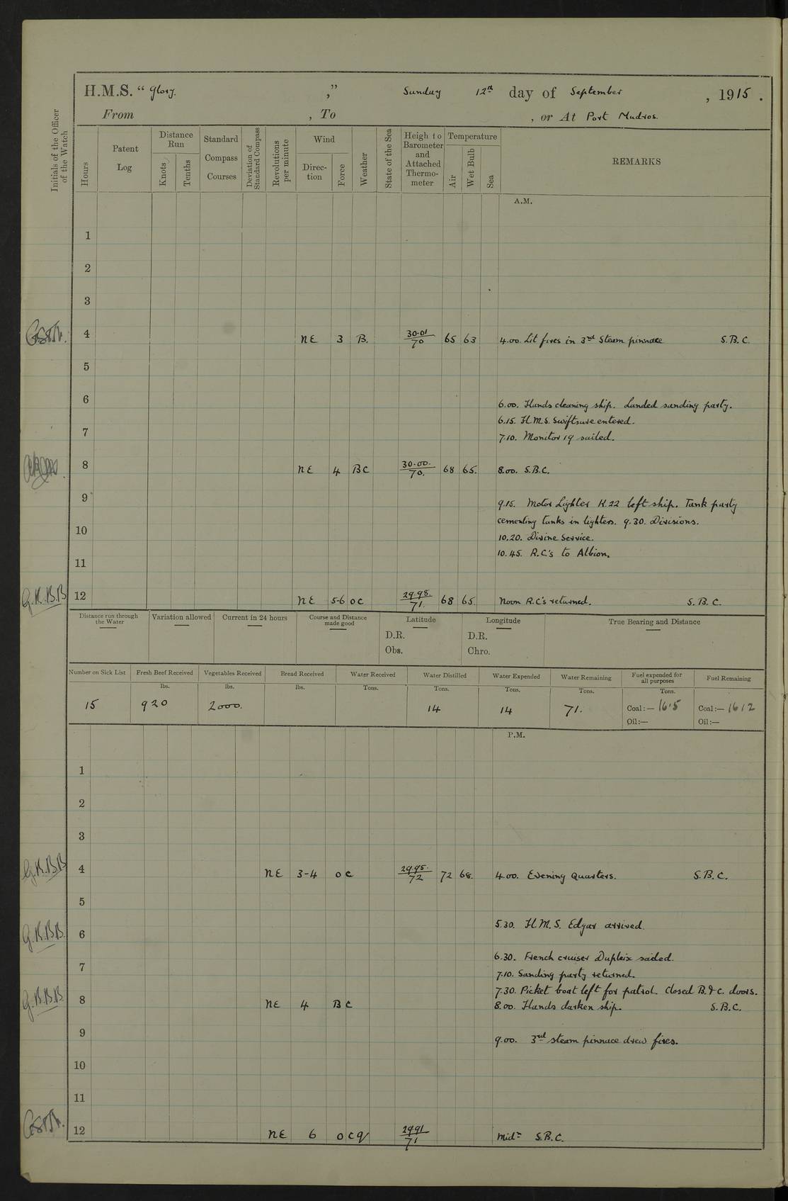 22 June 1915 At sea, Gibraltar to Lemnos Lat 36.1, Long -1.3 4.15am: Sighted land on starboard bow. 10.20am: Stopped port engine for repairs. 11.20am: proceeded with port engine. pm: a/c due to change in deviation. 10.00pm: Cape Tenez Light abeam, 18 miles. 4f73cd61a2fc8ea9030015f6: (https://s3.amazonaws.com:443/oldweather/ADM53-43015/0012_1.jpg) 23 June 1915 At sea, Gibraltar to Lemnos Lat 37.5, Long 4.8 Number on sick list: 4 5.00am: Secured from night defence stations. Placed anti-submarine guns. pm: Life saving appliances served out to men stationed in ? ?at abandon ship. 4f73cd61a2fc8ea9030015f7: (https://s3.amazonaws.com:443/oldweather/ADM53-43015/0013_0.jpg) 24 June 1915 At sea, Gibraltar to Lemnos Lat 37.4, Long 10.8 Position in log clearly bears no resemblance to the location of the ship. Position above is approximate and is based sighting of Zembra Island at 11.55am. 5.00am: Dispersed from night defence stations. Manned anti-submarine guns. am: Sighted two French torpedo boats. am: Torpedo boats passed to ~ No 362, 363. am: Sighted land on starboard beam. 11.55am: Zembra Island abeam, 25 miles. 2.00pm: Sighted Pantellaria S34ºE. 4.45pm: Pantellaria Light House abeam 12 miles. 4f73cd61a2fc8ea9030015f8: (https://s3.amazonaws.com:443/oldweather/ADM53-43015/0013_1.jpg) 25 June 1915 At sea, Gibraltar to Lemnos Lat 35.5, Long 16.7 2.10am: Gozo Light abeam 17 miles. 5.00am: Dispersed from night defence stations. Manned anti-submarine guns. 4f73cd61a2fc8ea9030015f9: (https://s3.amazonaws.com:443/oldweather/ADM53-43015/0014_0.jpg) 26 June 1915 At sea, Gibraltar to Lemnos Lat 35.5, Long 22.6 Number on sick list: 5 5.00am: Dispersed from night defence stations. Manned anti-submarine guns. am: Aired night clothing. am: marines at maxim practice on quarter deck. 2.00pm: Observed land on either bow. 3.00pm: Sighted French patrol destroyer. 4.15pm: Sighted French patrol destroyer. 9.40pm: Milo Peak N63ºW. 10.26pm: Polino Light abeam to port 5.5 miles. 4f73cd62a2fc8ea9030015fa: (https://s3.amazonaws.com:443/oldweather/ADM53-43015/0014_1.jpg) 27 June 1915 At sea and at Lemnos Lat 39.1, Long 24.4 From 0.50 to 3.05am sighting of multiple light houses. 3.50am: a/c to N39ºW and commenced to zig-zag. 5.00am: Dispersed from night defence stations and placed anti-submarine guns and look-outs. am: Lost overboard by accident Hazlewood fender, pat. 311, one in number. 10.30am: Held Divine Service onboard. pm: Met and signalled HMS Minerva on patrol duty. pm: Courses and speeds as requisite while waiting orders to approach Mudros. 3.00pm: Proceeded. 5.16pm: Increased to 90 revs, commenced to zig-zag. Course as requisite for Mudros. 7.00pm: Entered Mudros Bay. 7.47pm: Stopped. Let go port anchor in ‘M3’. 8.30pm: Darkened ship. pm: Manned one 6” and one 12 pdr. 4f73cd62a2fc8ea9030015fb: (https://s3.amazonaws.com:443/oldweather/ADM53-43015/0015_0.jpg) 28 June 1915 Mudros Bay, Lemnos Lat 39.89, Long 25.24 5,00am: HMS Vengeance entered harbour. HMS Vengeance was a pre-dreadnought of the Canopus class, launched in 1899 at Vickers, Barrow, and sold for scrapping in 1921. Details at http://en.wikipedia.org/wiki/HMS_Vengeance_(1899) . am/pm/: hands preparing for coaling and about ship’s work. pm: Collier Wabana secured alongside. 4f73cd62a2fc8ea9030015fc: (https://s3.amazonaws.com:443/oldweather/ADM53-43015/0015_1.jpg) 29 June 1915 Mudros Bay, Lemnos Lat 39.89, Long 25.24 5.15am: Commenced coaling. 2.00pm: Finished coaling. Collier left. 4f73cd62a2fc8ea9030015fd: (https://s3.amazonaws.com:443/oldweather/ADM53-43015/0016_0.jpg) 30 June 1915 Mudros Bay, Lemnos Lat 39.89, Long 25.24 am: Parties away sanding, and with fire engines onshore. am: Boats away disembarking troops. am: French Flagship Patrie sailed. The Patrie was a French pre-dreadnought, launched at La Seyne shipyard in 1903, and stricken in 1921. Details at http://en.wikipedia.org/wiki/French_battleship_Patrie . 6.30pm: Hands to bathe. 4f73cd63a2fc8ea9030015fe: (https://s3.amazonaws.com:443/oldweather/ADM53-43015/0016_1.jpg) 4f73cd63a2fc8ea9030015ff: (https://s3.amazonaws.com:443/oldweather/ADM53-43015/0017_0.jpg) 4f73cd63a2fc8ea903001600: (https://s3.amazonaws.com:443/oldweather/ADM53-43015/0017_1.jpg) 4f73cd63a2fc8ea903001601: (https://s3.amazonaws.com:443/oldweather/ADM53-43015/0018_0.jpg) 4f73cd64a2fc8ea903001602: (https://s3.amazonaws.com:443/oldweather/ADM53-43015/0018_1.jpg) LOGS FOR JULY 1915 From July to October 1915, HMS Glory spent her time at Port Mudros. Certain activities typically took place daily and are not generally noted in the pages below. These activities include: Lighting fires in the picket boat around 4am and drawing the fires in the late evening; Divisions at around 9–9.30am and Evening Quarters at 4pm; Darken ship at around 8.30pm; Daily ‘cleaning ship’, with variations thereof; SBC (for ‘Signal Books Correct’) at the watch changes. 4f73cd64a2fc8ea903001603: (https://s3.amazonaws.com:443/oldweather/ADM53-43016/0000_0.jpg) 4f73cd64a2fc8ea903001604: (https://s3.amazonaws.com:443/oldweather/ADM53-43016/0000_1.jpg) 4f73cd65a2fc8ea903001605: (https://s3.amazonaws.com:443/oldweather/ADM53-43016/0001_0.jpg) 4f73cd65a2fc8ea903001606: (https://s3.amazonaws.com:443/oldweather/ADM53-43016/0001_1.jpg) 1 July 1915 Port Mudros Lat 39.89, Long 25.24 6.30am: Landed working parties preparing boom defence ships. am: Discharged Acting Commander Rayne to Hector. Hector was a kite balloon ship. No further details readily available. 5.00pm: Tug T.10 made fast astern. 7.15pm: HMS Venerable went out. 7.30pm: HMS Chatham went out. HMS Chatham was a ‘Town’ cruiser and lead ship of her class. She was launched in 1911 at Chatham Dockyard and sold in 1926. Details at http://en.wikipedia.org/wiki/HMS_Chatham_(1911) . 4f73cd65a2fc8ea903001607: (https://s3.amazonaws.com:443/oldweather/ADM53-43016/0002_0.jpg) 2 July 1915 Port Mudros Lat 39.89, Long 25.24 5.35am: Landed working parties preparing boom defence ships. am/pm: Boom defence par