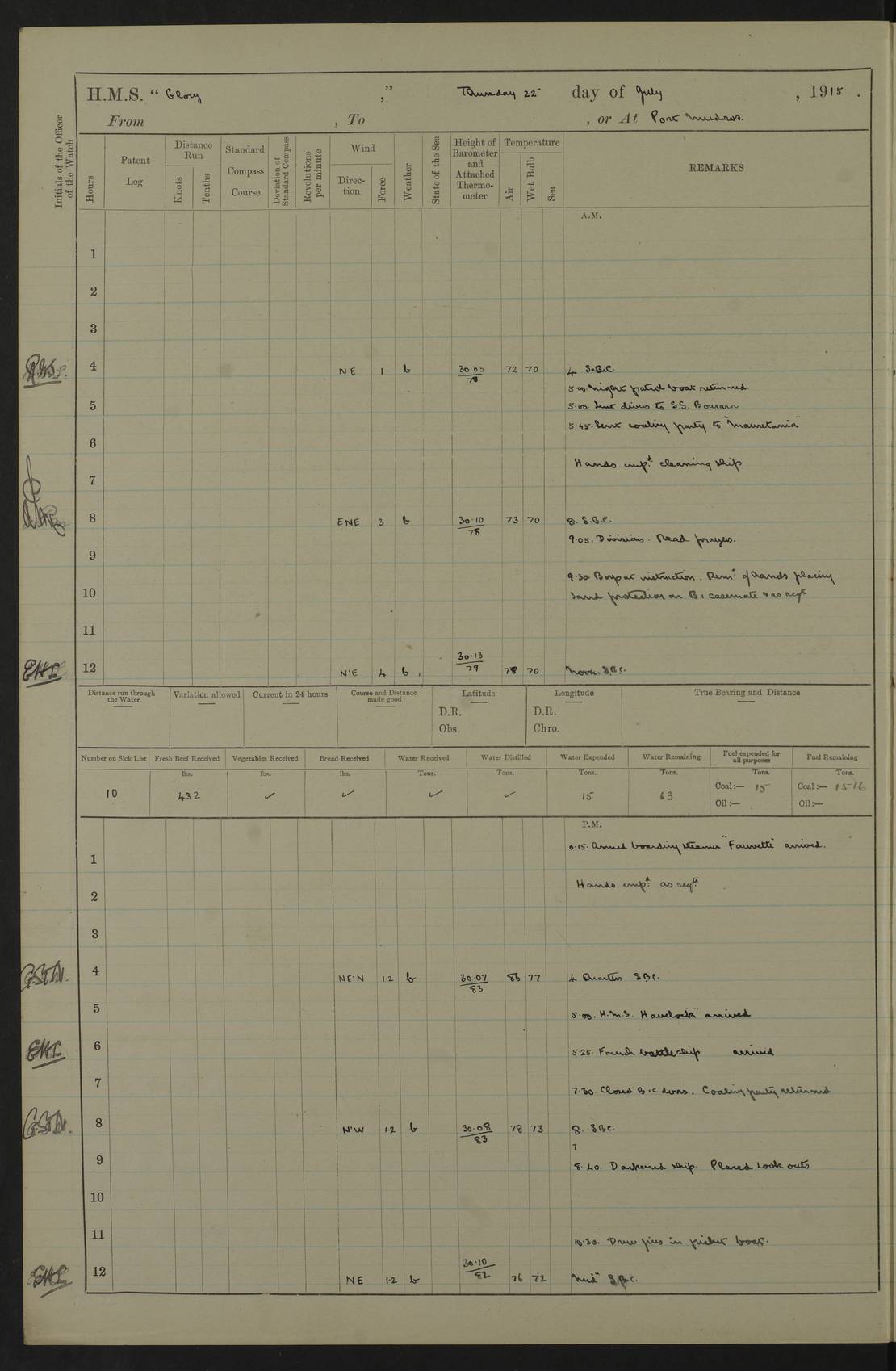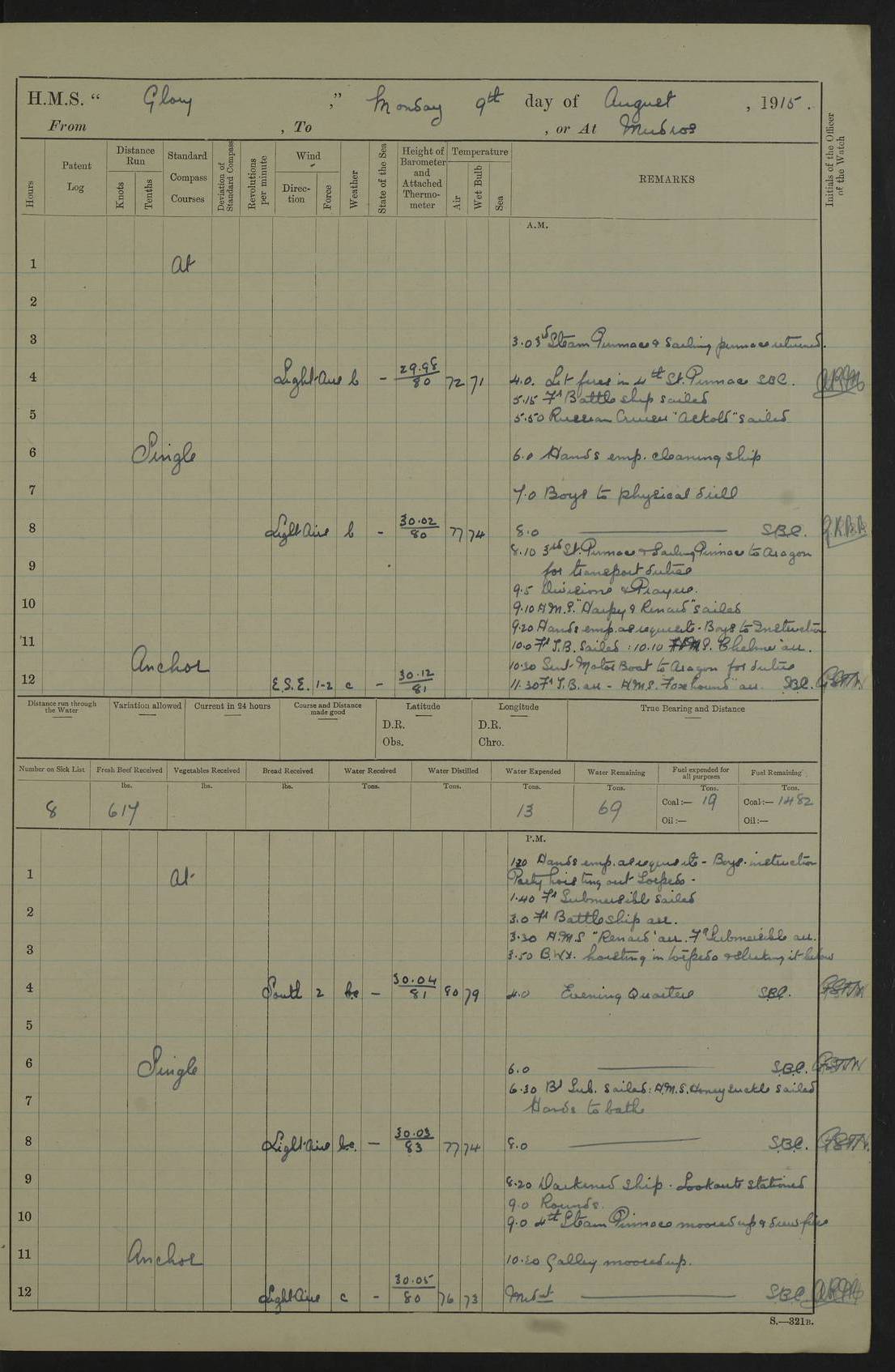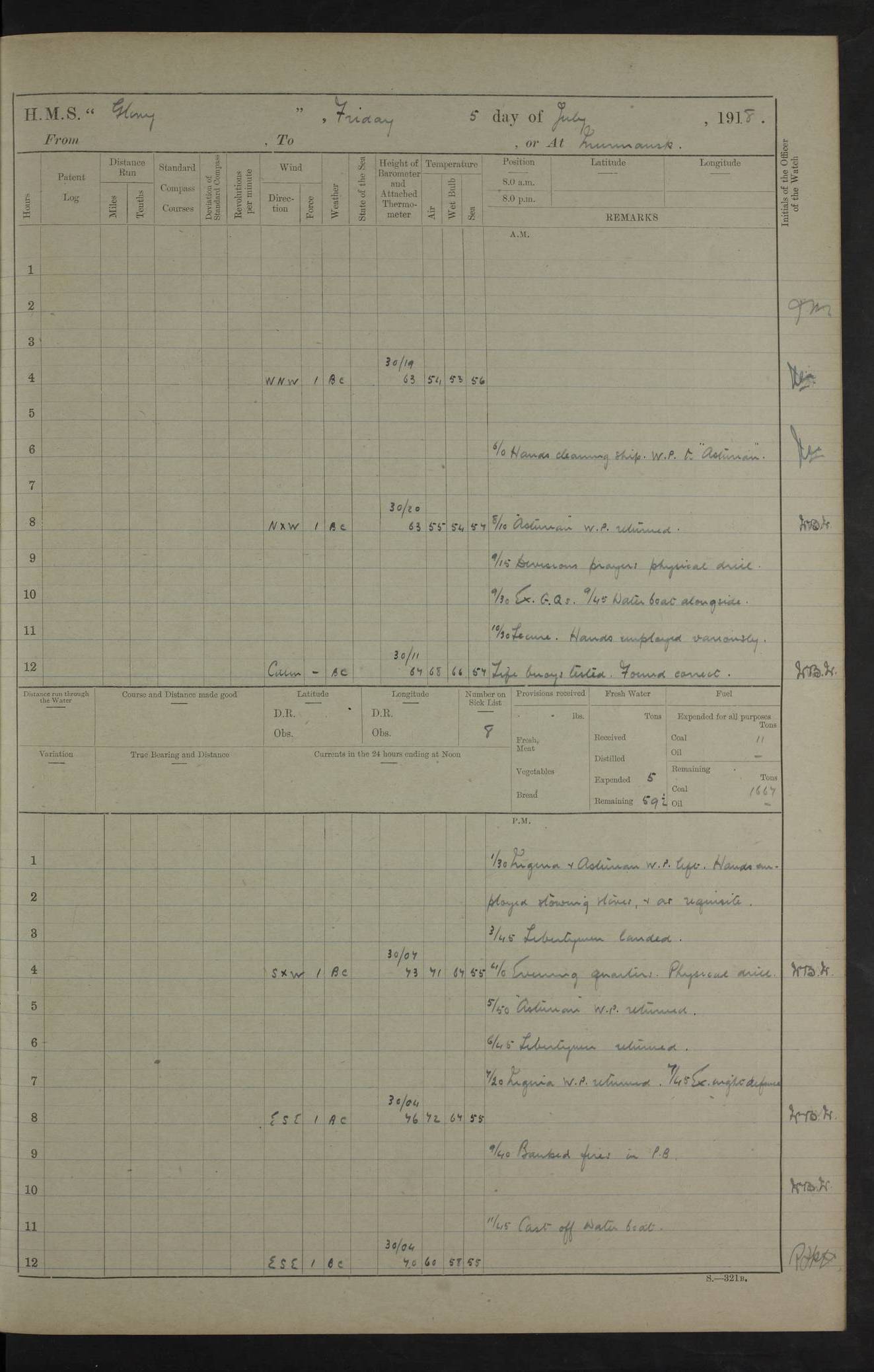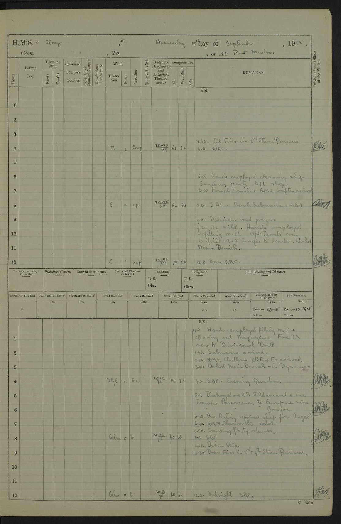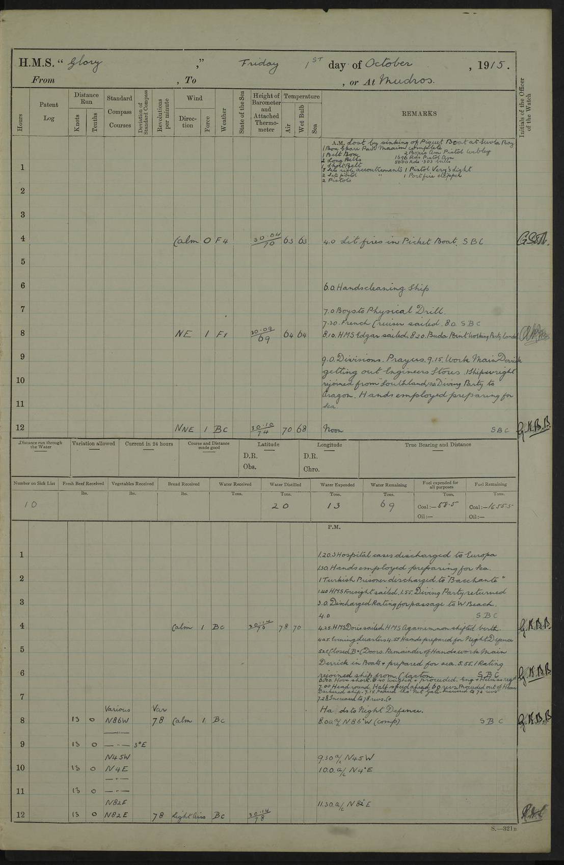 22 June 1915 At sea, Gibraltar to Lemnos Lat 36.1, Long -1.3 4.15am: Sighted land on starboard bow. 10.20am: Stopped port engine for repairs. 11.20am: proceeded with port engine. pm: a/c due to change in deviation. 10.00pm: Cape Tenez Light abeam, 18 miles. 4f73cd61a2fc8ea9030015f6: (https://s3.amazonaws.com:443/oldweather/ADM53-43015/0012_1.jpg) 23 June 1915 At sea, Gibraltar to Lemnos Lat 37.5, Long 4.8 Number on sick list: 4 5.00am: Secured from night defence stations. Placed anti-submarine guns. pm: Life saving appliances served out to men stationed in ? ?at abandon ship. 4f73cd61a2fc8ea9030015f7: (https://s3.amazonaws.com:443/oldweather/ADM53-43015/0013_0.jpg) 24 June 1915 At sea, Gibraltar to Lemnos Lat 37.4, Long 10.8 Position in log clearly bears no resemblance to the location of the ship. Position above is approximate and is based sighting of Zembra Island at 11.55am. 5.00am: Dispersed from night defence stations. Manned anti-submarine guns. am: Sighted two French torpedo boats. am: Torpedo boats passed to ~ No 362, 363. am: Sighted land on starboard beam. 11.55am: Zembra Island abeam, 25 miles. 2.00pm: Sighted Pantellaria S34ºE. 4.45pm: Pantellaria Light House abeam 12 miles. 4f73cd61a2fc8ea9030015f8: (https://s3.amazonaws.com:443/oldweather/ADM53-43015/0013_1.jpg) 25 June 1915 At sea, Gibraltar to Lemnos Lat 35.5, Long 16.7 2.10am: Gozo Light abeam 17 miles. 5.00am: Dispersed from night defence stations. Manned anti-submarine guns. 4f73cd61a2fc8ea9030015f9: (https://s3.amazonaws.com:443/oldweather/ADM53-43015/0014_0.jpg) 26 June 1915 At sea, Gibraltar to Lemnos Lat 35.5, Long 22.6 Number on sick list: 5 5.00am: Dispersed from night defence stations. Manned anti-submarine guns. am: Aired night clothing. am: marines at maxim practice on quarter deck. 2.00pm: Observed land on either bow. 3.00pm: Sighted French patrol destroyer. 4.15pm: Sighted French patrol destroyer. 9.40pm: Milo Peak N63ºW. 10.26pm: Polino Light abeam to port 5.5 miles. 4f73cd62a2fc8ea9030015fa: (https://s3.amazonaws.com:443/oldweather/ADM53-43015/0014_1.jpg) 27 June 1915 At sea and at Lemnos Lat 39.1, Long 24.4 From 0.50 to 3.05am sighting of multiple light houses. 3.50am: a/c to N39ºW and commenced to zig-zag. 5.00am: Dispersed from night defence stations and placed anti-submarine guns and look-outs. am: Lost overboard by accident Hazlewood fender, pat. 311, one in number. 10.30am: Held Divine Service onboard. pm: Met and signalled HMS Minerva on patrol duty. pm: Courses and speeds as requisite while waiting orders to approach Mudros. 3.00pm: Proceeded. 5.16pm: Increased to 90 revs, commenced to zig-zag. Course as requisite for Mudros. 7.00pm: Entered Mudros Bay. 7.47pm: Stopped. Let go port anchor in ‘M3’. 8.30pm: Darkened ship. pm: Manned one 6” and one 12 pdr. 4f73cd62a2fc8ea9030015fb: (https://s3.amazonaws.com:443/oldweather/ADM53-43015/0015_0.jpg) 28 June 1915 Mudros Bay, Lemnos Lat 39.89, Long 25.24 5,00am: HMS Vengeance entered harbour. HMS Vengeance was a pre-dreadnought of the Canopus class, launched in 1899 at Vickers, Barrow, and sold for scrapping in 1921. Details at http://en.wikipedia.org/wiki/HMS_Vengeance_(1899) . am/pm/: hands preparing for coaling and about ship’s work. pm: Collier Wabana secured alongside. 4f73cd62a2fc8ea9030015fc: (https://s3.amazonaws.com:443/oldweather/ADM53-43015/0015_1.jpg) 29 June 1915 Mudros Bay, Lemnos Lat 39.89, Long 25.24 5.15am: Commenced coaling. 2.00pm: Finished coaling. Collier left. 4f73cd62a2fc8ea9030015fd: (https://s3.amazonaws.com:443/oldweather/ADM53-43015/0016_0.jpg) 30 June 1915 Mudros Bay, Lemnos Lat 39.89, Long 25.24 am: Parties away sanding, and with fire engines onshore. am: Boats away disembarking troops. am: French Flagship Patrie sailed. The Patrie was a French pre-dreadnought, launched at La Seyne shipyard in 1903, and stricken in 1921. Details at http://en.wikipedia.org/wiki/French_battleship_Patrie . 6.30pm: Hands to bathe. 4f73cd63a2fc8ea9030015fe: (https://s3.amazonaws.com:443/oldweather/ADM53-43015/0016_1.jpg) 4f73cd63a2fc8ea9030015ff: (https://s3.amazonaws.com:443/oldweather/ADM53-43015/0017_0.jpg) 4f73cd63a2fc8ea903001600: (https://s3.amazonaws.com:443/oldweather/ADM53-43015/0017_1.jpg) 4f73cd63a2fc8ea903001601: (https://s3.amazonaws.com:443/oldweather/ADM53-43015/0018_0.jpg) 4f73cd64a2fc8ea903001602: (https://s3.amazonaws.com:443/oldweather/ADM53-43015/0018_1.jpg) LOGS FOR JULY 1915 From July to October 1915, HMS Glory spent her time at Port Mudros. Certain activities typically took place daily and are not generally noted in the pages below. These activities include: Lighting fires in the picket boat around 4am and drawing the fires in the late evening; Divisions at around 9–9.30am and Evening Quarters at 4pm; Darken ship at around 8.30pm; Daily ‘cleaning ship’, with variations thereof; SBC (for ‘Signal Books Correct’) at the watch changes. 4f73cd64a2fc8ea903001603: (https://s3.amazonaws.com:443/oldweather/ADM53-43016/0000_0.jpg) 4f73cd64a2fc8ea903001604: (https://s3.amazonaws.com:443/oldweather/ADM53-43016/0000_1.jpg) 4f73cd65a2fc8ea903001605: (https://s3.amazonaws.com:443/oldweather/ADM53-43016/0001_0.jpg) 4f73cd65a2fc8ea903001606: (https://s3.amazonaws.com:443/oldweather/ADM53-43016/0001_1.jpg) 1 July 1915 Port Mudros Lat 39.89, Long 25.24 6.30am: Landed working parties preparing boom defence ships. am: Discharged Acting Commander Rayne to Hector. Hector was a kite balloon ship. No further details readily available. 5.00pm: Tug T.10 made fast astern. 7.15pm: HMS Venerable went out. 7.30pm: HMS Chatham went out. HMS Chatham was a ‘Town’ cruiser and lead ship of her class. She was launched in 1911 at Chatham Dockyard and sold in 1926. Details at http://en.wikipedia.org/wiki/HMS_Chatham_(1911) . 4f73cd65a2fc8ea903001607: (https://s3.amazonaws.com:443/oldweather/ADM53-43016/0002_0.jpg) 2 July 1915 Port Mudros Lat 39.89, Long 25.24 5.35am: Landed working parties preparing boom defence ships. am/pm: Boom defence par