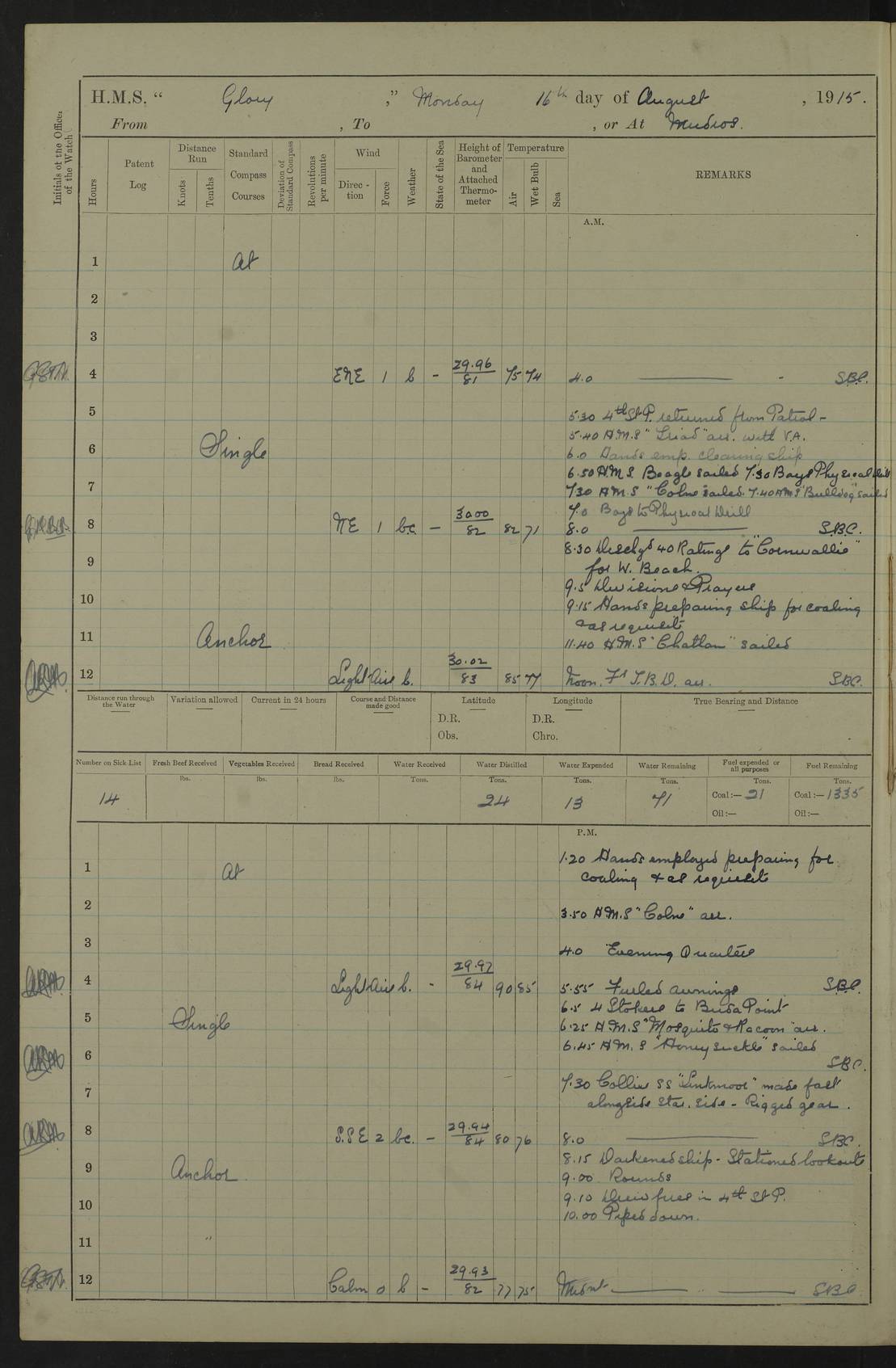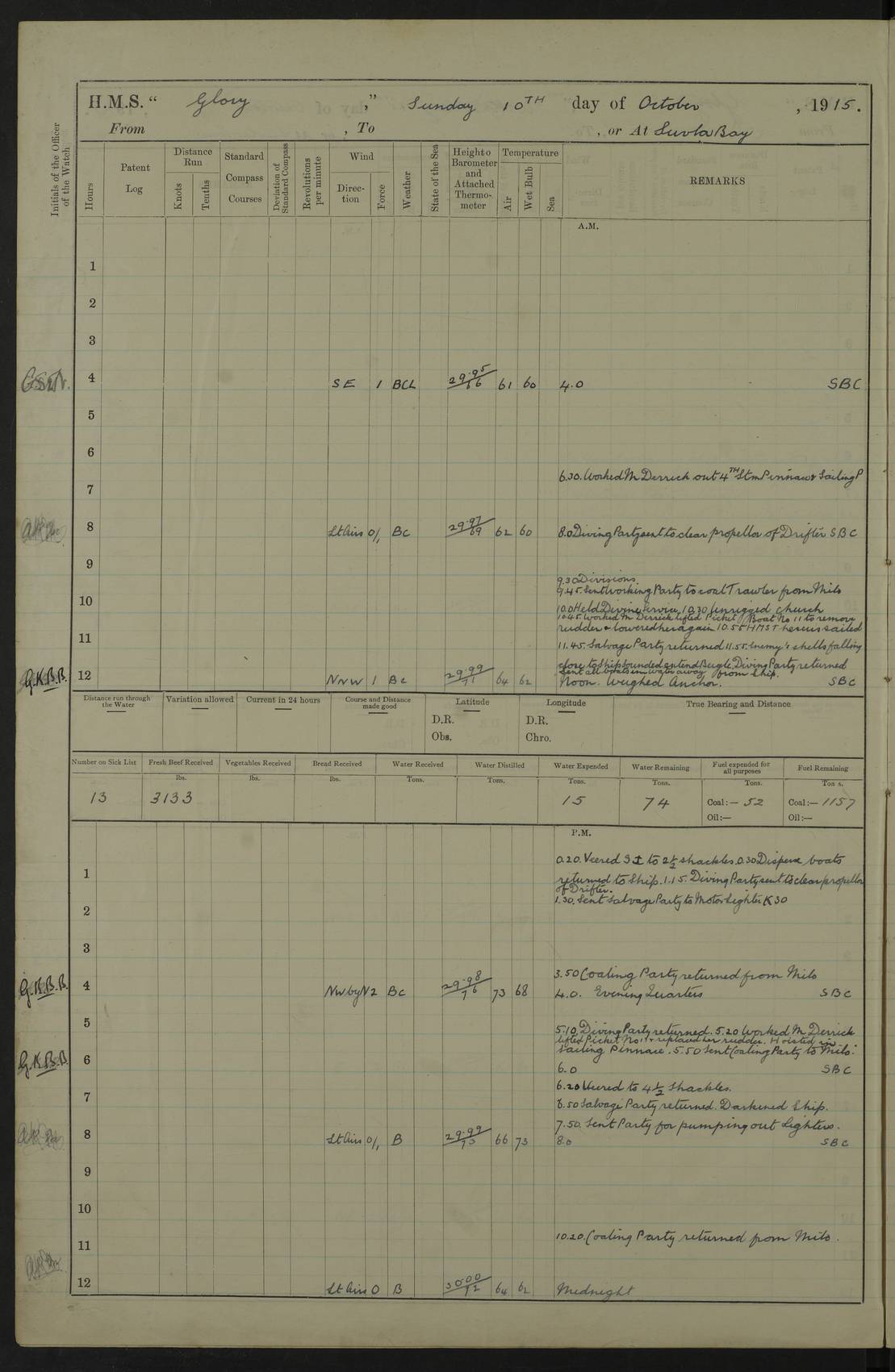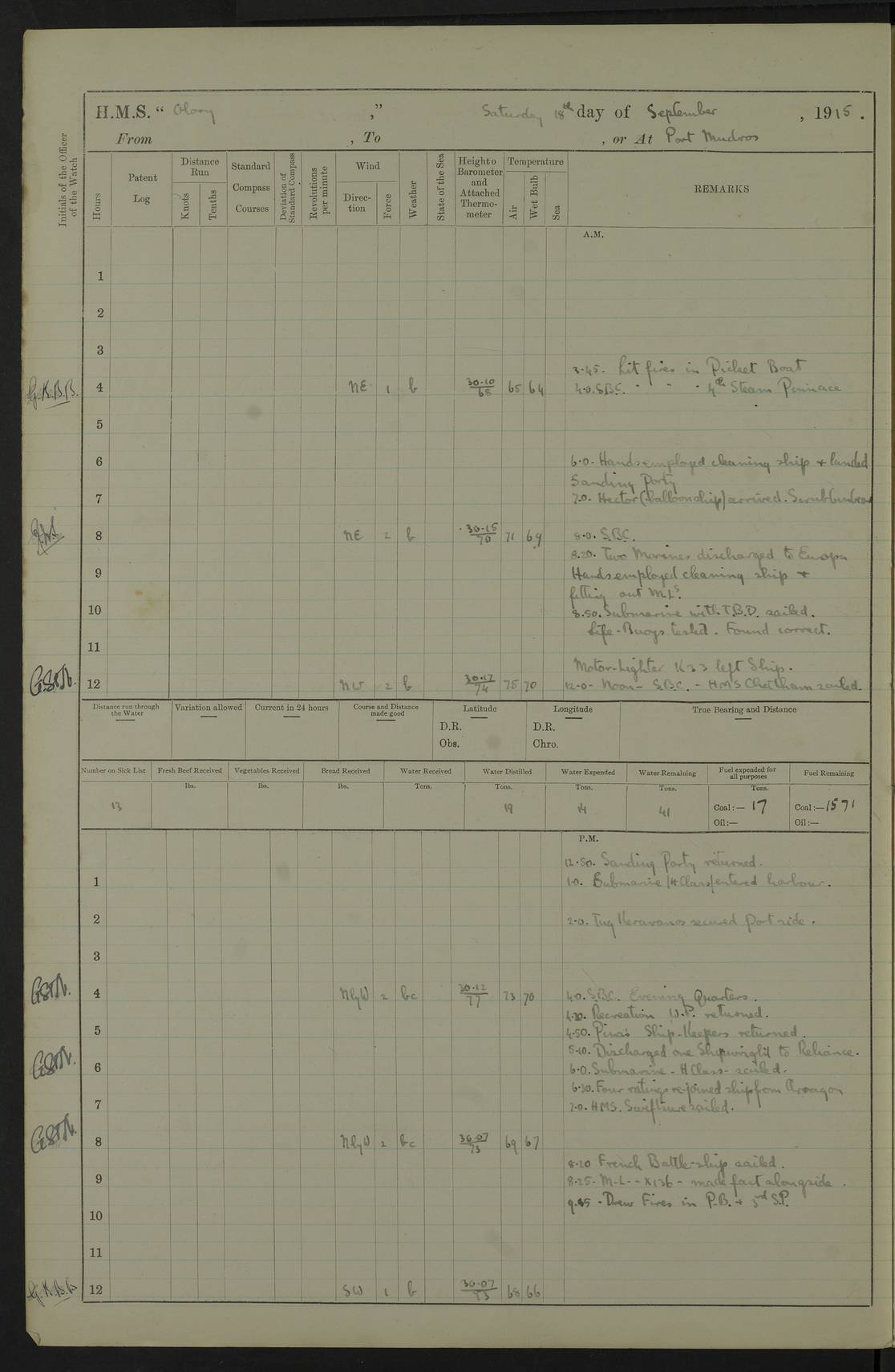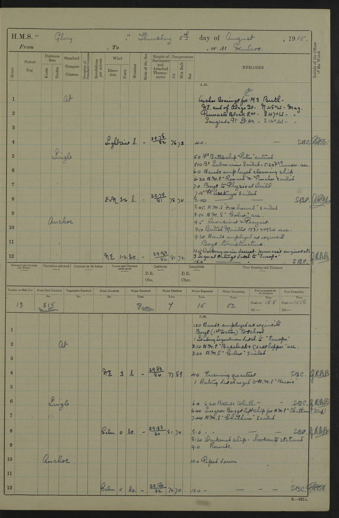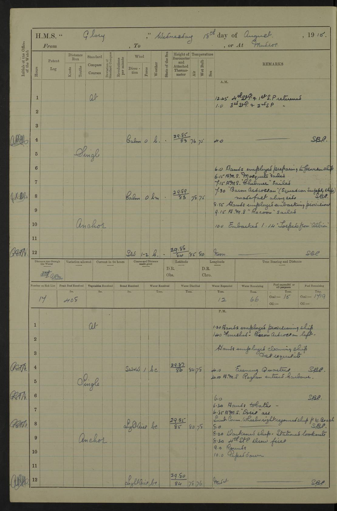 22 June 1915 At sea, Gibraltar to Lemnos Lat 36.1, Long -1.3 4.15am: Sighted land on starboard bow. 10.20am: Stopped port engine for repairs. 11.20am: proceeded with port engine. pm: a/c due to change in deviation. 10.00pm: Cape Tenez Light abeam, 18 miles. 4f73cd61a2fc8ea9030015f6: (https://s3.amazonaws.com:443/oldweather/ADM53-43015/0012_1.jpg) 23 June 1915 At sea, Gibraltar to Lemnos Lat 37.5, Long 4.8 Number on sick list: 4 5.00am: Secured from night defence stations. Placed anti-submarine guns. pm: Life saving appliances served out to men stationed in ? ?at abandon ship. 4f73cd61a2fc8ea9030015f7: (https://s3.amazonaws.com:443/oldweather/ADM53-43015/0013_0.jpg) 24 June 1915 At sea, Gibraltar to Lemnos Lat 37.4, Long 10.8 Position in log clearly bears no resemblance to the location of the ship. Position above is approximate and is based sighting of Zembra Island at 11.55am. 5.00am: Dispersed from night defence stations. Manned anti-submarine guns. am: Sighted two French torpedo boats. am: Torpedo boats passed to ~ No 362, 363. am: Sighted land on starboard beam. 11.55am: Zembra Island abeam, 25 miles. 2.00pm: Sighted Pantellaria S34ºE. 4.45pm: Pantellaria Light House abeam 12 miles. 4f73cd61a2fc8ea9030015f8: (https://s3.amazonaws.com:443/oldweather/ADM53-43015/0013_1.jpg) 25 June 1915 At sea, Gibraltar to Lemnos Lat 35.5, Long 16.7 2.10am: Gozo Light abeam 17 miles. 5.00am: Dispersed from night defence stations. Manned anti-submarine guns. 4f73cd61a2fc8ea9030015f9: (https://s3.amazonaws.com:443/oldweather/ADM53-43015/0014_0.jpg) 26 June 1915 At sea, Gibraltar to Lemnos Lat 35.5, Long 22.6 Number on sick list: 5 5.00am: Dispersed from night defence stations. Manned anti-submarine guns. am: Aired night clothing. am: marines at maxim practice on quarter deck. 2.00pm: Observed land on either bow. 3.00pm: Sighted French patrol destroyer. 4.15pm: Sighted French patrol destroyer. 9.40pm: Milo Peak N63ºW. 10.26pm: Polino Light abeam to port 5.5 miles. 4f73cd62a2fc8ea9030015fa: (https://s3.amazonaws.com:443/oldweather/ADM53-43015/0014_1.jpg) 27 June 1915 At sea and at Lemnos Lat 39.1, Long 24.4 From 0.50 to 3.05am sighting of multiple light houses. 3.50am: a/c to N39ºW and commenced to zig-zag. 5.00am: Dispersed from night defence stations and placed anti-submarine guns and look-outs. am: Lost overboard by accident Hazlewood fender, pat. 311, one in number. 10.30am: Held Divine Service onboard. pm: Met and signalled HMS Minerva on patrol duty. pm: Courses and speeds as requisite while waiting orders to approach Mudros. 3.00pm: Proceeded. 5.16pm: Increased to 90 revs, commenced to zig-zag. Course as requisite for Mudros. 7.00pm: Entered Mudros Bay. 7.47pm: Stopped. Let go port anchor in ‘M3’. 8.30pm: Darkened ship. pm: Manned one 6” and one 12 pdr. 4f73cd62a2fc8ea9030015fb: (https://s3.amazonaws.com:443/oldweather/ADM53-43015/0015_0.jpg) 28 June 1915 Mudros Bay, Lemnos Lat 39.89, Long 25.24 5,00am: HMS Vengeance entered harbour. HMS Vengeance was a pre-dreadnought of the Canopus class, launched in 1899 at Vickers, Barrow, and sold for scrapping in 1921. Details at http://en.wikipedia.org/wiki/HMS_Vengeance_(1899) . am/pm/: hands preparing for coaling and about ship’s work. pm: Collier Wabana secured alongside. 4f73cd62a2fc8ea9030015fc: (https://s3.amazonaws.com:443/oldweather/ADM53-43015/0015_1.jpg) 29 June 1915 Mudros Bay, Lemnos Lat 39.89, Long 25.24 5.15am: Commenced coaling. 2.00pm: Finished coaling. Collier left. 4f73cd62a2fc8ea9030015fd: (https://s3.amazonaws.com:443/oldweather/ADM53-43015/0016_0.jpg) 30 June 1915 Mudros Bay, Lemnos Lat 39.89, Long 25.24 am: Parties away sanding, and with fire engines onshore. am: Boats away disembarking troops. am: French Flagship Patrie sailed. The Patrie was a French pre-dreadnought, launched at La Seyne shipyard in 1903, and stricken in 1921. Details at http://en.wikipedia.org/wiki/French_battleship_Patrie . 6.30pm: Hands to bathe. 4f73cd63a2fc8ea9030015fe: (https://s3.amazonaws.com:443/oldweather/ADM53-43015/0016_1.jpg) 4f73cd63a2fc8ea9030015ff: (https://s3.amazonaws.com:443/oldweather/ADM53-43015/0017_0.jpg) 4f73cd63a2fc8ea903001600: (https://s3.amazonaws.com:443/oldweather/ADM53-43015/0017_1.jpg) 4f73cd63a2fc8ea903001601: (https://s3.amazonaws.com:443/oldweather/ADM53-43015/0018_0.jpg) 4f73cd64a2fc8ea903001602: (https://s3.amazonaws.com:443/oldweather/ADM53-43015/0018_1.jpg) LOGS FOR JULY 1915 From July to October 1915, HMS Glory spent her time at Port Mudros. Certain activities typically took place daily and are not generally noted in the pages below. These activities include: Lighting fires in the picket boat around 4am and drawing the fires in the late evening; Divisions at around 9–9.30am and Evening Quarters at 4pm; Darken ship at around 8.30pm; Daily ‘cleaning ship’, with variations thereof; SBC (for ‘Signal Books Correct’) at the watch changes. 4f73cd64a2fc8ea903001603: (https://s3.amazonaws.com:443/oldweather/ADM53-43016/0000_0.jpg) 4f73cd64a2fc8ea903001604: (https://s3.amazonaws.com:443/oldweather/ADM53-43016/0000_1.jpg) 4f73cd65a2fc8ea903001605: (https://s3.amazonaws.com:443/oldweather/ADM53-43016/0001_0.jpg) 4f73cd65a2fc8ea903001606: (https://s3.amazonaws.com:443/oldweather/ADM53-43016/0001_1.jpg) 1 July 1915 Port Mudros Lat 39.89, Long 25.24 6.30am: Landed working parties preparing boom defence ships. am: Discharged Acting Commander Rayne to Hector. Hector was a kite balloon ship. No further details readily available. 5.00pm: Tug T.10 made fast astern. 7.15pm: HMS Venerable went out. 7.30pm: HMS Chatham went out. HMS Chatham was a ‘Town’ cruiser and lead ship of her class. She was launched in 1911 at Chatham Dockyard and sold in 1926. Details at http://en.wikipedia.org/wiki/HMS_Chatham_(1911) . 4f73cd65a2fc8ea903001607: (https://s3.amazonaws.com:443/oldweather/ADM53-43016/0002_0.jpg) 2 July 1915 Port Mudros Lat 39.89, Long 25.24 5.35am: Landed working parties preparing boom defence ships. am/pm: Boom defence par
