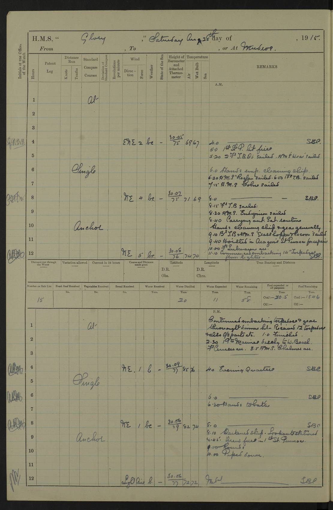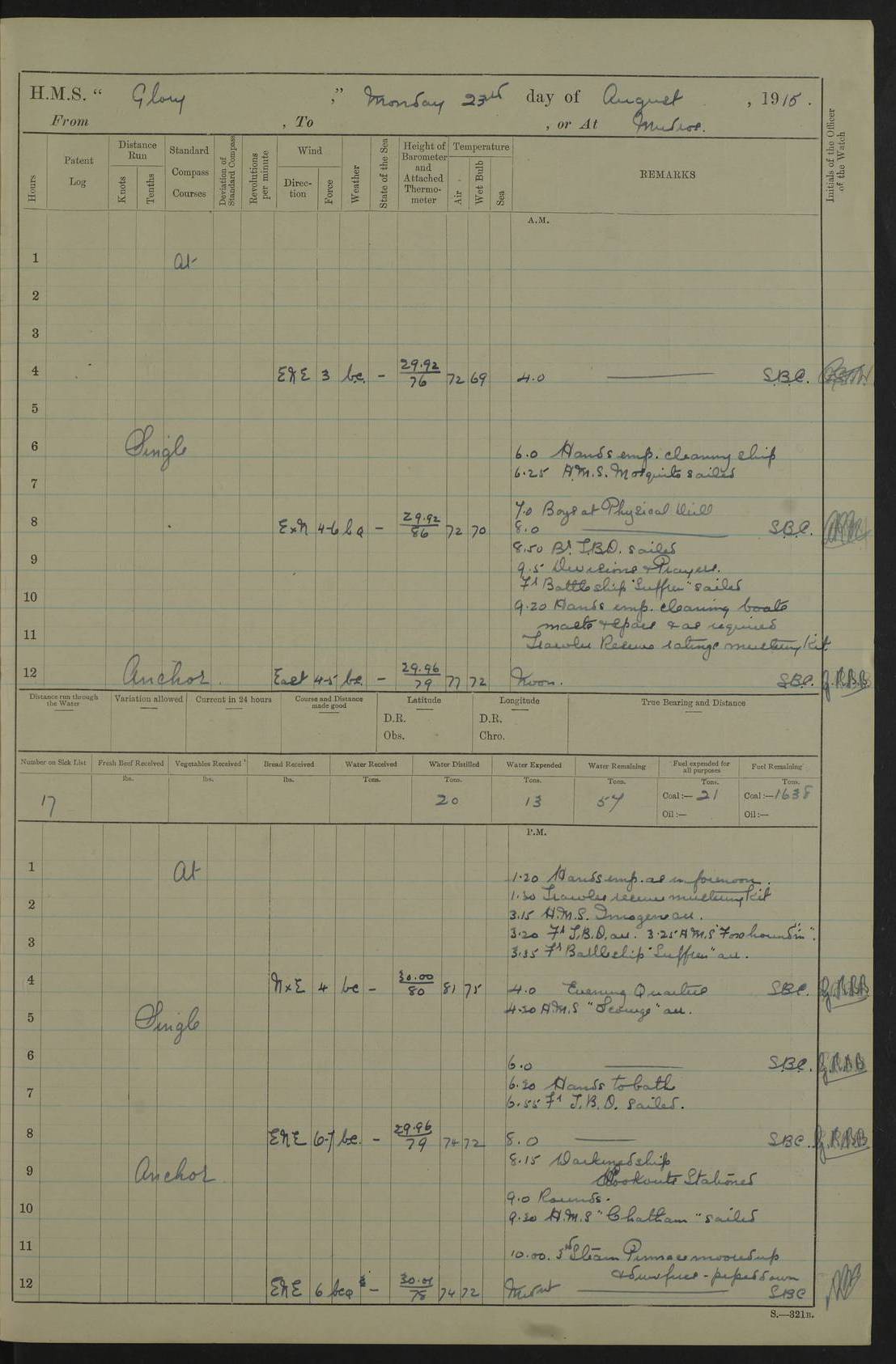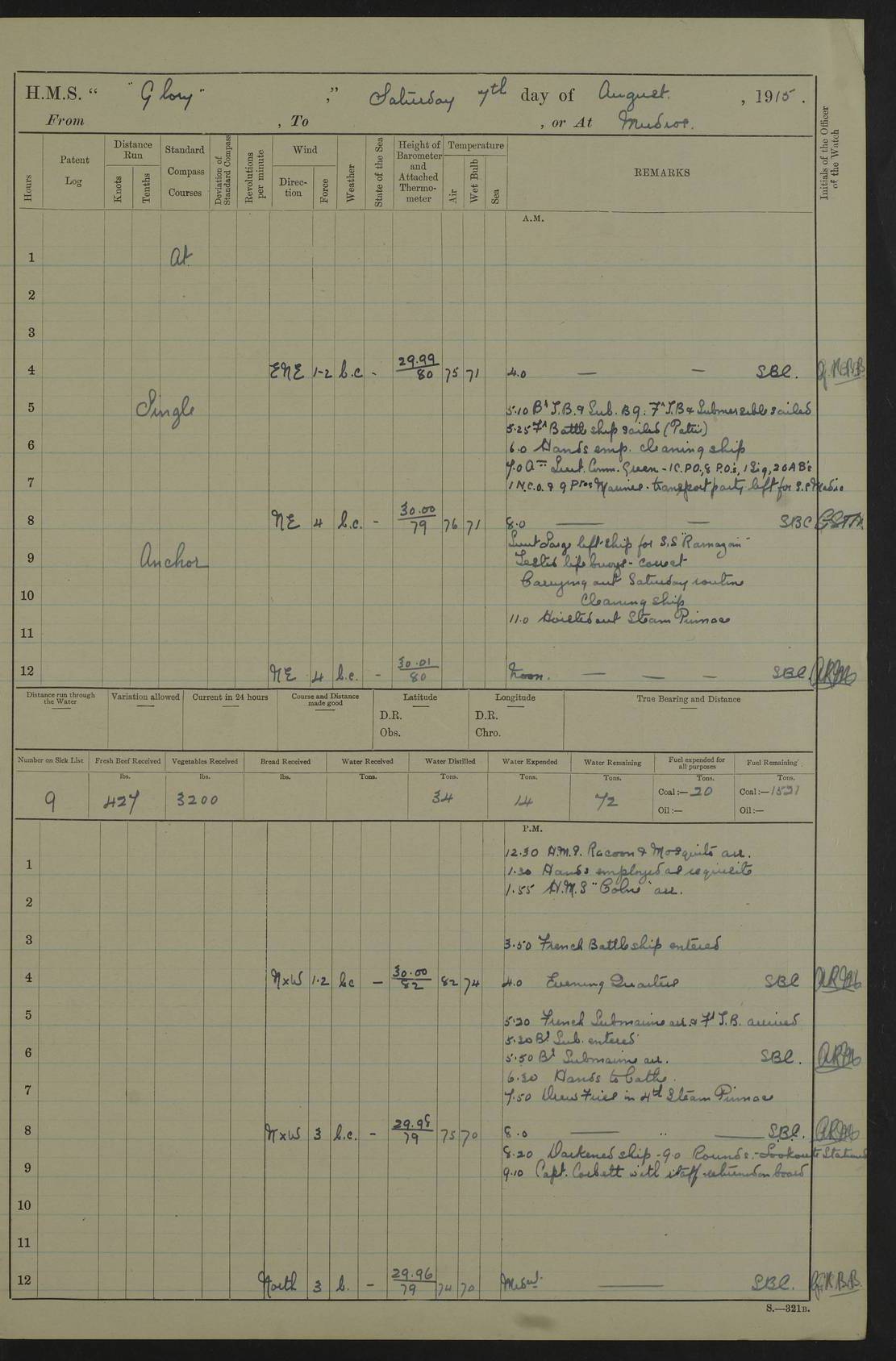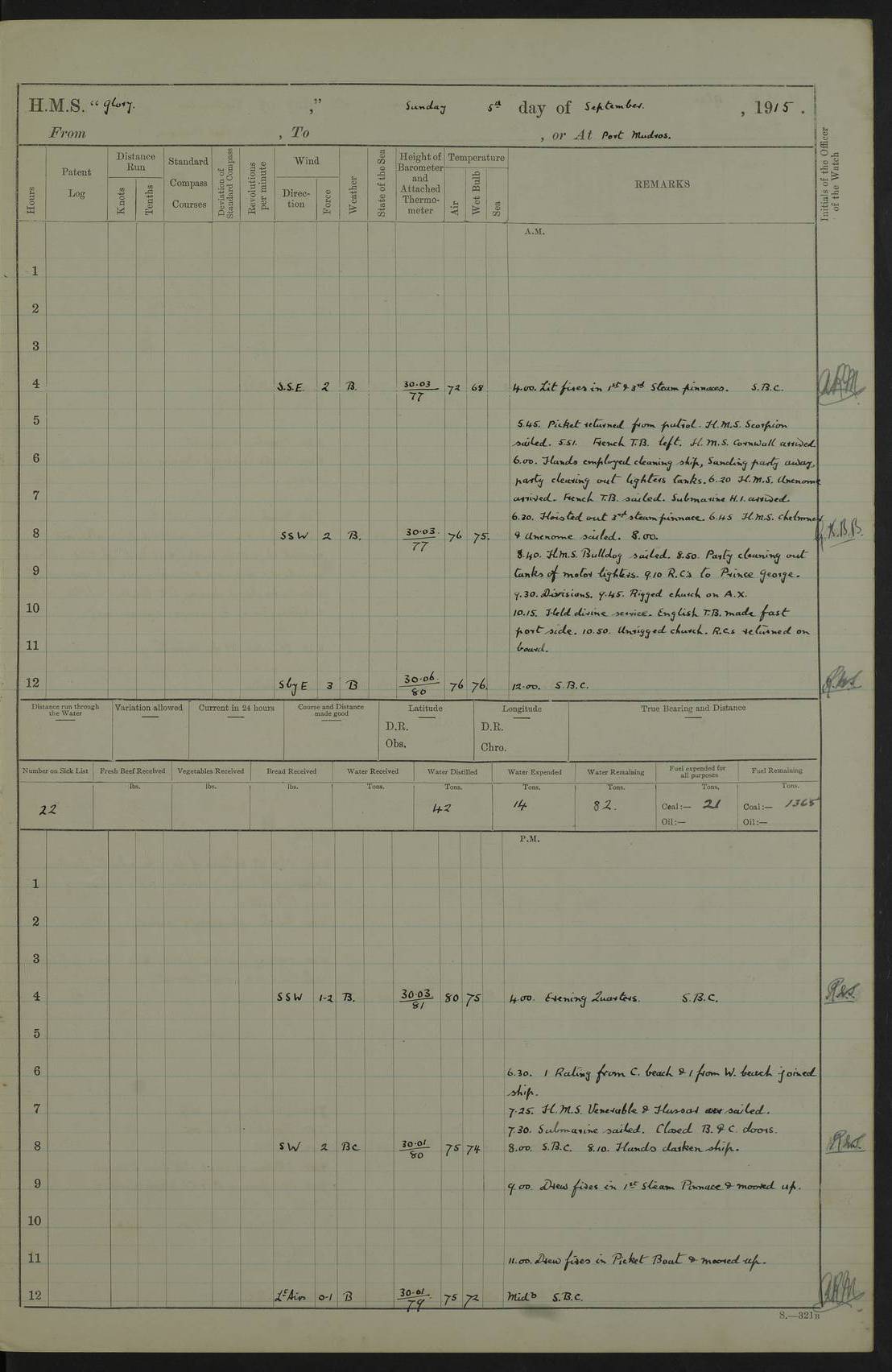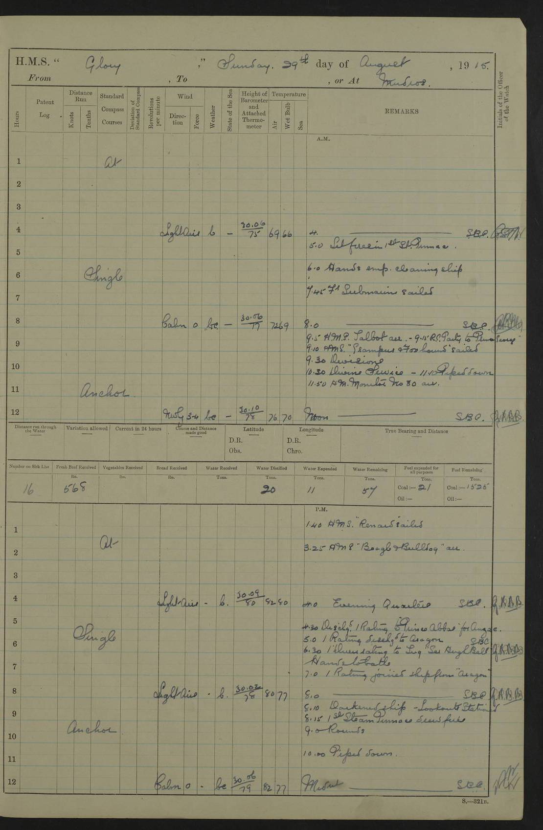 22 June 1915 At sea, Gibraltar to Lemnos Lat 36.1, Long -1.3 4.15am: Sighted land on starboard bow. 10.20am: Stopped port engine for repairs. 11.20am: proceeded with port engine. pm: a/c due to change in deviation. 10.00pm: Cape Tenez Light abeam, 18 miles. 4f73cd61a2fc8ea9030015f6: (https://s3.amazonaws.com:443/oldweather/ADM53-43015/0012_1.jpg) 23 June 1915 At sea, Gibraltar to Lemnos Lat 37.5, Long 4.8 Number on sick list: 4 5.00am: Secured from night defence stations. Placed anti-submarine guns. pm: Life saving appliances served out to men stationed in ? ?at abandon ship. 4f73cd61a2fc8ea9030015f7: (https://s3.amazonaws.com:443/oldweather/ADM53-43015/0013_0.jpg) 24 June 1915 At sea, Gibraltar to Lemnos Lat 37.4, Long 10.8 Position in log clearly bears no resemblance to the location of the ship. Position above is approximate and is based sighting of Zembra Island at 11.55am. 5.00am: Dispersed from night defence stations. Manned anti-submarine guns. am: Sighted two French torpedo boats. am: Torpedo boats passed to ~ No 362, 363. am: Sighted land on starboard beam. 11.55am: Zembra Island abeam, 25 miles. 2.00pm: Sighted Pantellaria S34ºE. 4.45pm: Pantellaria Light House abeam 12 miles. 4f73cd61a2fc8ea9030015f8: (https://s3.amazonaws.com:443/oldweather/ADM53-43015/0013_1.jpg) 25 June 1915 At sea, Gibraltar to Lemnos Lat 35.5, Long 16.7 2.10am: Gozo Light abeam 17 miles. 5.00am: Dispersed from night defence stations. Manned anti-submarine guns. 4f73cd61a2fc8ea9030015f9: (https://s3.amazonaws.com:443/oldweather/ADM53-43015/0014_0.jpg) 26 June 1915 At sea, Gibraltar to Lemnos Lat 35.5, Long 22.6 Number on sick list: 5 5.00am: Dispersed from night defence stations. Manned anti-submarine guns. am: Aired night clothing. am: marines at maxim practice on quarter deck. 2.00pm: Observed land on either bow. 3.00pm: Sighted French patrol destroyer. 4.15pm: Sighted French patrol destroyer. 9.40pm: Milo Peak N63ºW. 10.26pm: Polino Light abeam to port 5.5 miles. 4f73cd62a2fc8ea9030015fa: (https://s3.amazonaws.com:443/oldweather/ADM53-43015/0014_1.jpg) 27 June 1915 At sea and at Lemnos Lat 39.1, Long 24.4 From 0.50 to 3.05am sighting of multiple light houses. 3.50am: a/c to N39ºW and commenced to zig-zag. 5.00am: Dispersed from night defence stations and placed anti-submarine guns and look-outs. am: Lost overboard by accident Hazlewood fender, pat. 311, one in number. 10.30am: Held Divine Service onboard. pm: Met and signalled HMS Minerva on patrol duty. pm: Courses and speeds as requisite while waiting orders to approach Mudros. 3.00pm: Proceeded. 5.16pm: Increased to 90 revs, commenced to zig-zag. Course as requisite for Mudros. 7.00pm: Entered Mudros Bay. 7.47pm: Stopped. Let go port anchor in ‘M3’. 8.30pm: Darkened ship. pm: Manned one 6” and one 12 pdr. 4f73cd62a2fc8ea9030015fb: (https://s3.amazonaws.com:443/oldweather/ADM53-43015/0015_0.jpg) 28 June 1915 Mudros Bay, Lemnos Lat 39.89, Long 25.24 5,00am: HMS Vengeance entered harbour. HMS Vengeance was a pre-dreadnought of the Canopus class, launched in 1899 at Vickers, Barrow, and sold for scrapping in 1921. Details at http://en.wikipedia.org/wiki/HMS_Vengeance_(1899) . am/pm/: hands preparing for coaling and about ship’s work. pm: Collier Wabana secured alongside. 4f73cd62a2fc8ea9030015fc: (https://s3.amazonaws.com:443/oldweather/ADM53-43015/0015_1.jpg) 29 June 1915 Mudros Bay, Lemnos Lat 39.89, Long 25.24 5.15am: Commenced coaling. 2.00pm: Finished coaling. Collier left. 4f73cd62a2fc8ea9030015fd: (https://s3.amazonaws.com:443/oldweather/ADM53-43015/0016_0.jpg) 30 June 1915 Mudros Bay, Lemnos Lat 39.89, Long 25.24 am: Parties away sanding, and with fire engines onshore. am: Boats away disembarking troops. am: French Flagship Patrie sailed. The Patrie was a French pre-dreadnought, launched at La Seyne shipyard in 1903, and stricken in 1921. Details at http://en.wikipedia.org/wiki/French_battleship_Patrie . 6.30pm: Hands to bathe. 4f73cd63a2fc8ea9030015fe: (https://s3.amazonaws.com:443/oldweather/ADM53-43015/0016_1.jpg) 4f73cd63a2fc8ea9030015ff: (https://s3.amazonaws.com:443/oldweather/ADM53-43015/0017_0.jpg) 4f73cd63a2fc8ea903001600: (https://s3.amazonaws.com:443/oldweather/ADM53-43015/0017_1.jpg) 4f73cd63a2fc8ea903001601: (https://s3.amazonaws.com:443/oldweather/ADM53-43015/0018_0.jpg) 4f73cd64a2fc8ea903001602: (https://s3.amazonaws.com:443/oldweather/ADM53-43015/0018_1.jpg) LOGS FOR JULY 1915 From July to October 1915, HMS Glory spent her time at Port Mudros. Certain activities typically took place daily and are not generally noted in the pages below. These activities include: Lighting fires in the picket boat around 4am and drawing the fires in the late evening; Divisions at around 9–9.30am and Evening Quarters at 4pm; Darken ship at around 8.30pm; Daily ‘cleaning ship’, with variations thereof; SBC (for ‘Signal Books Correct’) at the watch changes. 4f73cd64a2fc8ea903001603: (https://s3.amazonaws.com:443/oldweather/ADM53-43016/0000_0.jpg) 4f73cd64a2fc8ea903001604: (https://s3.amazonaws.com:443/oldweather/ADM53-43016/0000_1.jpg) 4f73cd65a2fc8ea903001605: (https://s3.amazonaws.com:443/oldweather/ADM53-43016/0001_0.jpg) 4f73cd65a2fc8ea903001606: (https://s3.amazonaws.com:443/oldweather/ADM53-43016/0001_1.jpg) 1 July 1915 Port Mudros Lat 39.89, Long 25.24 6.30am: Landed working parties preparing boom defence ships. am: Discharged Acting Commander Rayne to Hector. Hector was a kite balloon ship. No further details readily available. 5.00pm: Tug T.10 made fast astern. 7.15pm: HMS Venerable went out. 7.30pm: HMS Chatham went out. HMS Chatham was a ‘Town’ cruiser and lead ship of her class. She was launched in 1911 at Chatham Dockyard and sold in 1926. Details at http://en.wikipedia.org/wiki/HMS_Chatham_(1911) . 4f73cd65a2fc8ea903001607: (https://s3.amazonaws.com:443/oldweather/ADM53-43016/0002_0.jpg) 2 July 1915 Port Mudros Lat 39.89, Long 25.24 5.35am: Landed working parties preparing boom defence ships. am/pm: Boom defence par