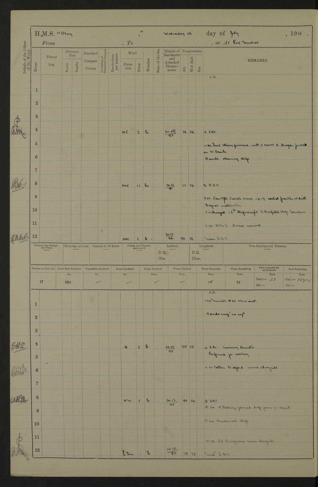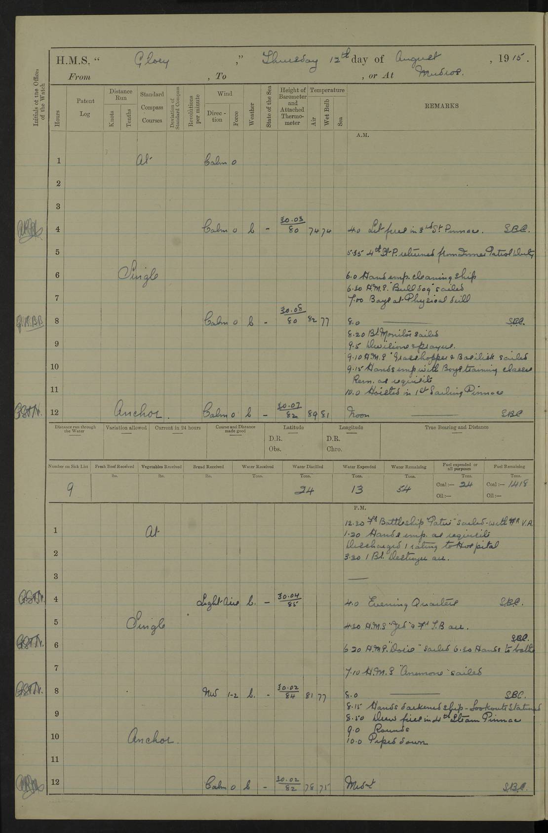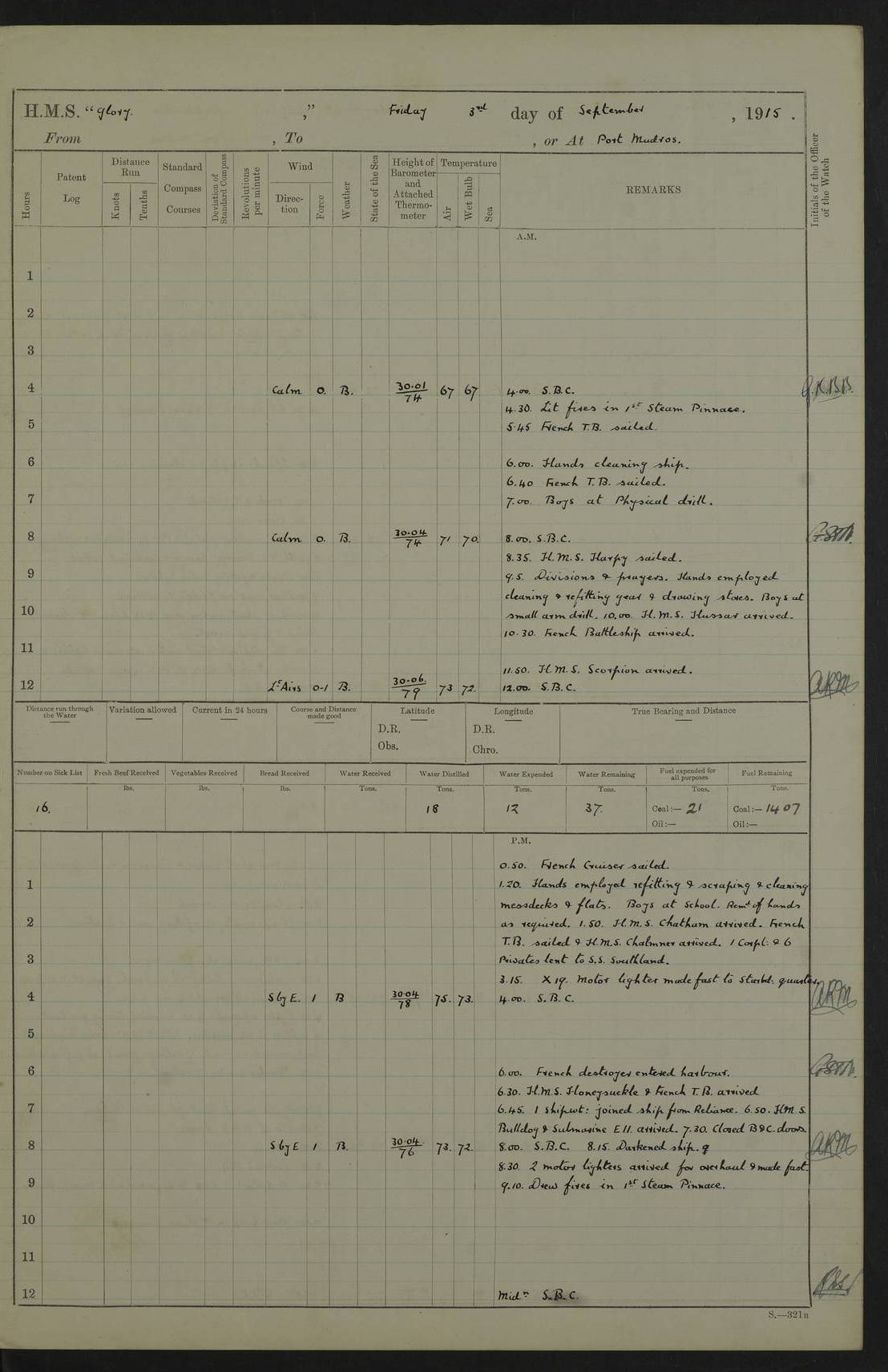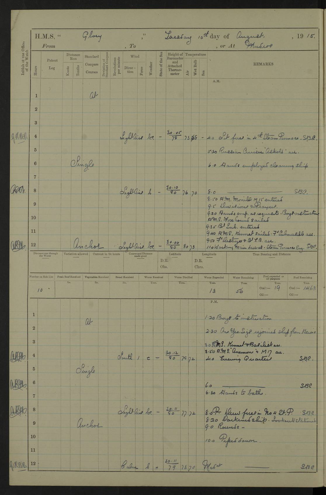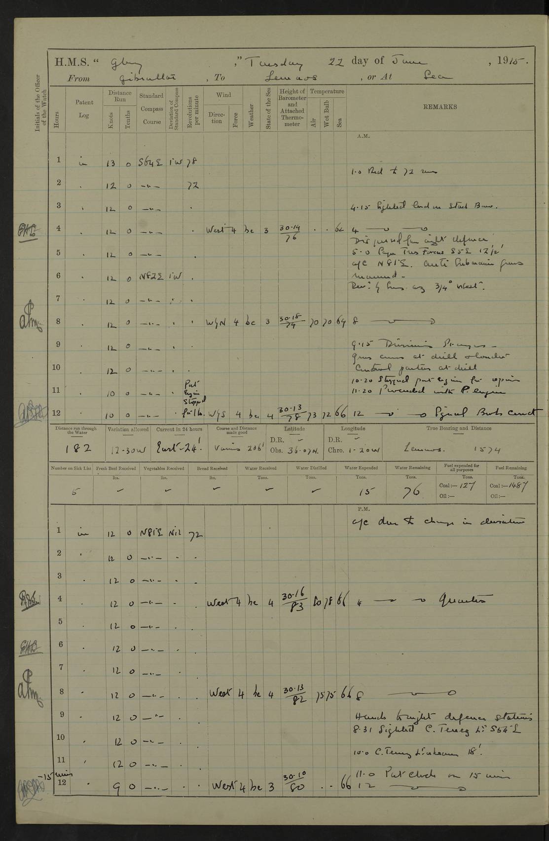 22 June 1915 At sea, Gibraltar to Lemnos Lat 36.1, Long -1.3 4.15am: Sighted land on starboard bow. 10.20am: Stopped port engine for repairs. 11.20am: proceeded with port engine. pm: a/c due to change in deviation. 10.00pm: Cape Tenez Light abeam, 18 miles. 4f73cd61a2fc8ea9030015f6: (https://s3.amazonaws.com:443/oldweather/ADM53-43015/0012_1.jpg) 23 June 1915 At sea, Gibraltar to Lemnos Lat 37.5, Long 4.8 Number on sick list: 4 5.00am: Secured from night defence stations. Placed anti-submarine guns. pm: Life saving appliances served out to men stationed in ? ?at abandon ship. 4f73cd61a2fc8ea9030015f7: (https://s3.amazonaws.com:443/oldweather/ADM53-43015/0013_0.jpg) 24 June 1915 At sea, Gibraltar to Lemnos Lat 37.4, Long 10.8 Position in log clearly bears no resemblance to the location of the ship. Position above is approximate and is based sighting of Zembra Island at 11.55am. 5.00am: Dispersed from night defence stations. Manned anti-submarine guns. am: Sighted two French torpedo boats. am: Torpedo boats passed to ~ No 362, 363. am: Sighted land on starboard beam. 11.55am: Zembra Island abeam, 25 miles. 2.00pm: Sighted Pantellaria S34ºE. 4.45pm: Pantellaria Light House abeam 12 miles. 4f73cd61a2fc8ea9030015f8: (https://s3.amazonaws.com:443/oldweather/ADM53-43015/0013_1.jpg) 25 June 1915 At sea, Gibraltar to Lemnos Lat 35.5, Long 16.7 2.10am: Gozo Light abeam 17 miles. 5.00am: Dispersed from night defence stations. Manned anti-submarine guns. 4f73cd61a2fc8ea9030015f9: (https://s3.amazonaws.com:443/oldweather/ADM53-43015/0014_0.jpg) 26 June 1915 At sea, Gibraltar to Lemnos Lat 35.5, Long 22.6 Number on sick list: 5 5.00am: Dispersed from night defence stations. Manned anti-submarine guns. am: Aired night clothing. am: marines at maxim practice on quarter deck. 2.00pm: Observed land on either bow. 3.00pm: Sighted French patrol destroyer. 4.15pm: Sighted French patrol destroyer. 9.40pm: Milo Peak N63ºW. 10.26pm: Polino Light abeam to port 5.5 miles. 4f73cd62a2fc8ea9030015fa: (https://s3.amazonaws.com:443/oldweather/ADM53-43015/0014_1.jpg) 27 June 1915 At sea and at Lemnos Lat 39.1, Long 24.4 From 0.50 to 3.05am sighting of multiple light houses. 3.50am: a/c to N39ºW and commenced to zig-zag. 5.00am: Dispersed from night defence stations and placed anti-submarine guns and look-outs. am: Lost overboard by accident Hazlewood fender, pat. 311, one in number. 10.30am: Held Divine Service onboard. pm: Met and signalled HMS Minerva on patrol duty. pm: Courses and speeds as requisite while waiting orders to approach Mudros. 3.00pm: Proceeded. 5.16pm: Increased to 90 revs, commenced to zig-zag. Course as requisite for Mudros. 7.00pm: Entered Mudros Bay. 7.47pm: Stopped. Let go port anchor in ‘M3’. 8.30pm: Darkened ship. pm: Manned one 6” and one 12 pdr. 4f73cd62a2fc8ea9030015fb: (https://s3.amazonaws.com:443/oldweather/ADM53-43015/0015_0.jpg) 28 June 1915 Mudros Bay, Lemnos Lat 39.89, Long 25.24 5,00am: HMS Vengeance entered harbour. HMS Vengeance was a pre-dreadnought of the Canopus class, launched in 1899 at Vickers, Barrow, and sold for scrapping in 1921. Details at http://en.wikipedia.org/wiki/HMS_Vengeance_(1899) . am/pm/: hands preparing for coaling and about ship’s work. pm: Collier Wabana secured alongside. 4f73cd62a2fc8ea9030015fc: (https://s3.amazonaws.com:443/oldweather/ADM53-43015/0015_1.jpg) 29 June 1915 Mudros Bay, Lemnos Lat 39.89, Long 25.24 5.15am: Commenced coaling. 2.00pm: Finished coaling. Collier left. 4f73cd62a2fc8ea9030015fd: (https://s3.amazonaws.com:443/oldweather/ADM53-43015/0016_0.jpg) 30 June 1915 Mudros Bay, Lemnos Lat 39.89, Long 25.24 am: Parties away sanding, and with fire engines onshore. am: Boats away disembarking troops. am: French Flagship Patrie sailed. The Patrie was a French pre-dreadnought, launched at La Seyne shipyard in 1903, and stricken in 1921. Details at http://en.wikipedia.org/wiki/French_battleship_Patrie . 6.30pm: Hands to bathe. 4f73cd63a2fc8ea9030015fe: (https://s3.amazonaws.com:443/oldweather/ADM53-43015/0016_1.jpg) 4f73cd63a2fc8ea9030015ff: (https://s3.amazonaws.com:443/oldweather/ADM53-43015/0017_0.jpg) 4f73cd63a2fc8ea903001600: (https://s3.amazonaws.com:443/oldweather/ADM53-43015/0017_1.jpg) 4f73cd63a2fc8ea903001601: (https://s3.amazonaws.com:443/oldweather/ADM53-43015/0018_0.jpg) 4f73cd64a2fc8ea903001602: (https://s3.amazonaws.com:443/oldweather/ADM53-43015/0018_1.jpg) LOGS FOR JULY 1915 From July to October 1915, HMS Glory spent her time at Port Mudros. Certain activities typically took place daily and are not generally noted in the pages below. These activities include: Lighting fires in the picket boat around 4am and drawing the fires in the late evening; Divisions at around 9–9.30am and Evening Quarters at 4pm; Darken ship at around 8.30pm; Daily ‘cleaning ship’, with variations thereof; SBC (for ‘Signal Books Correct’) at the watch changes. 4f73cd64a2fc8ea903001603: (https://s3.amazonaws.com:443/oldweather/ADM53-43016/0000_0.jpg) 4f73cd64a2fc8ea903001604: (https://s3.amazonaws.com:443/oldweather/ADM53-43016/0000_1.jpg) 4f73cd65a2fc8ea903001605: (https://s3.amazonaws.com:443/oldweather/ADM53-43016/0001_0.jpg) 4f73cd65a2fc8ea903001606: (https://s3.amazonaws.com:443/oldweather/ADM53-43016/0001_1.jpg) 1 July 1915 Port Mudros Lat 39.89, Long 25.24 6.30am: Landed working parties preparing boom defence ships. am: Discharged Acting Commander Rayne to Hector. Hector was a kite balloon ship. No further details readily available. 5.00pm: Tug T.10 made fast astern. 7.15pm: HMS Venerable went out. 7.30pm: HMS Chatham went out. HMS Chatham was a ‘Town’ cruiser and lead ship of her class. She was launched in 1911 at Chatham Dockyard and sold in 1926. Details at http://en.wikipedia.org/wiki/HMS_Chatham_(1911) . 4f73cd65a2fc8ea903001607: (https://s3.amazonaws.com:443/oldweather/ADM53-43016/0002_0.jpg) 2 July 1915 Port Mudros Lat 39.89, Long 25.24 5.35am: Landed working parties preparing boom defence ships. am/pm: Boom defence par