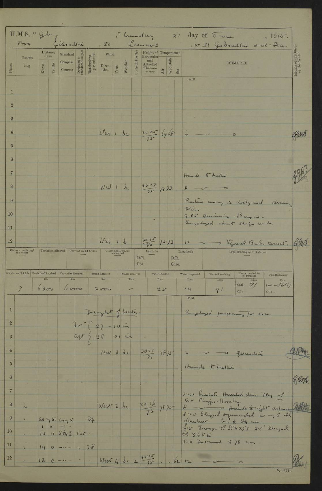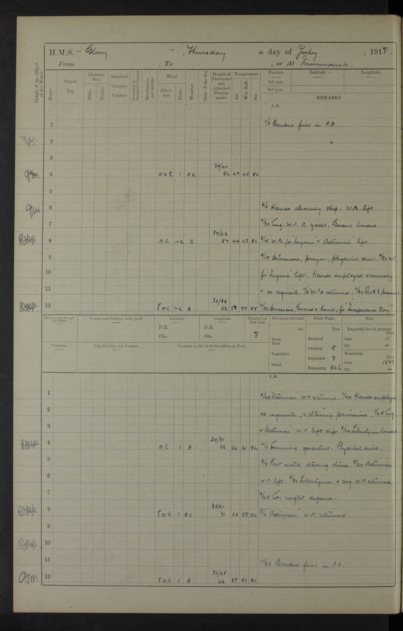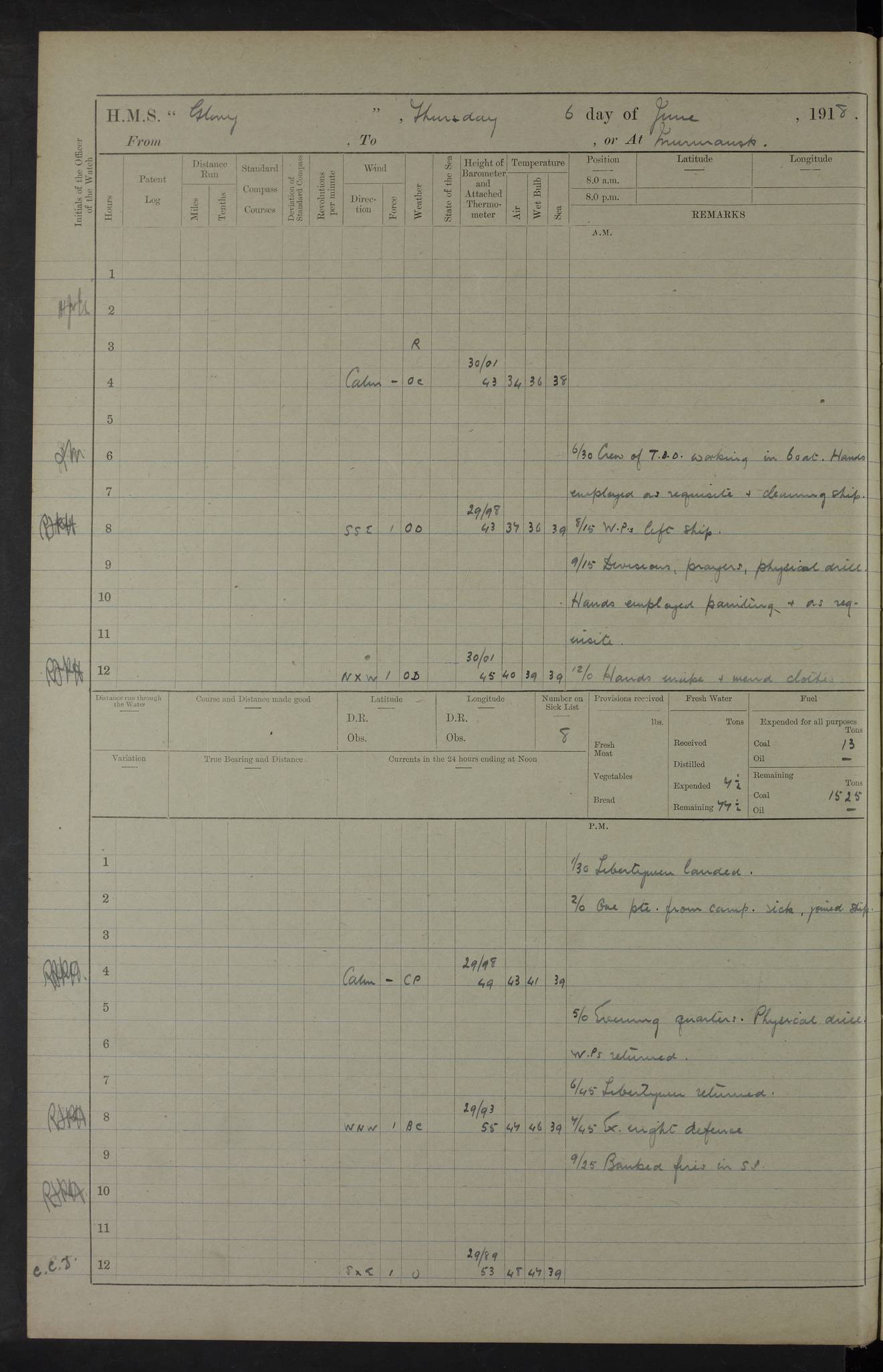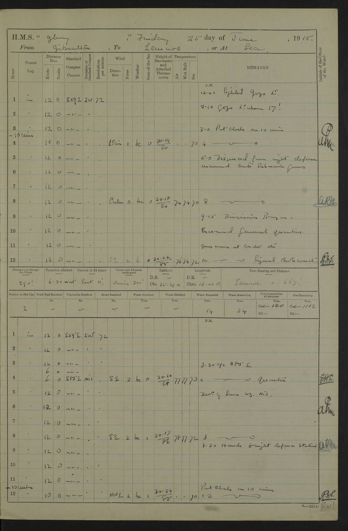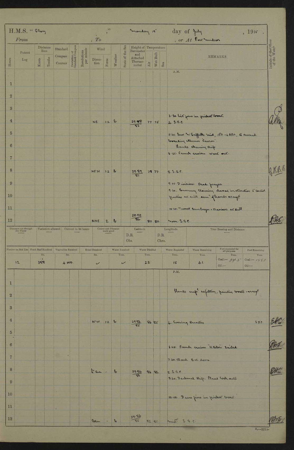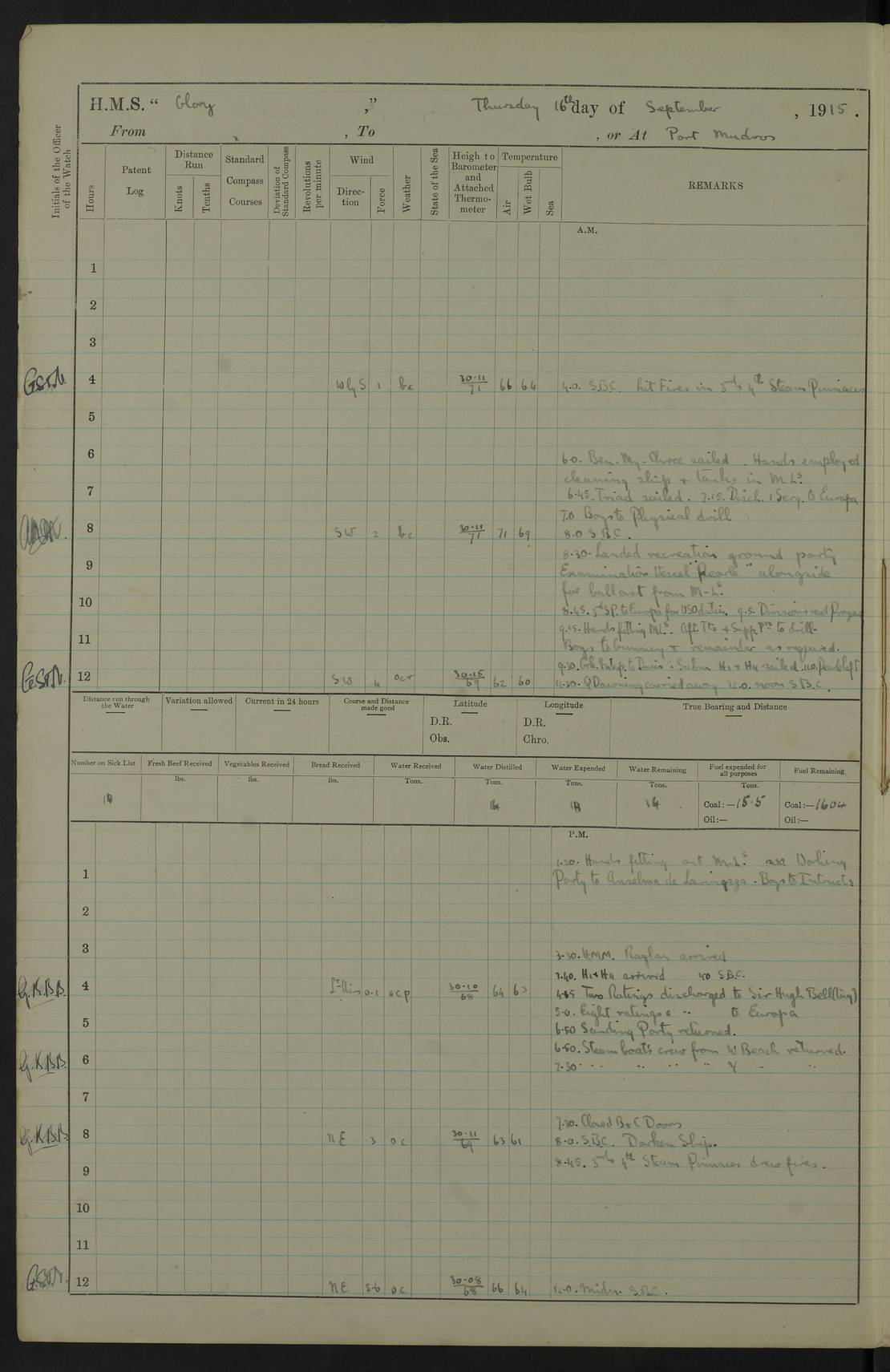 22 June 1915 At sea, Gibraltar to Lemnos Lat 36.1, Long -1.3 4.15am: Sighted land on starboard bow. 10.20am: Stopped port engine for repairs. 11.20am: proceeded with port engine. pm: a/c due to change in deviation. 10.00pm: Cape Tenez Light abeam, 18 miles. 4f73cd61a2fc8ea9030015f6: (https://s3.amazonaws.com:443/oldweather/ADM53-43015/0012_1.jpg) 23 June 1915 At sea, Gibraltar to Lemnos Lat 37.5, Long 4.8 Number on sick list: 4 5.00am: Secured from night defence stations. Placed anti-submarine guns. pm: Life saving appliances served out to men stationed in ? ?at abandon ship. 4f73cd61a2fc8ea9030015f7: (https://s3.amazonaws.com:443/oldweather/ADM53-43015/0013_0.jpg) 24 June 1915 At sea, Gibraltar to Lemnos Lat 37.4, Long 10.8 Position in log clearly bears no resemblance to the location of the ship. Position above is approximate and is based sighting of Zembra Island at 11.55am. 5.00am: Dispersed from night defence stations. Manned anti-submarine guns. am: Sighted two French torpedo boats. am: Torpedo boats passed to ~ No 362, 363. am: Sighted land on starboard beam. 11.55am: Zembra Island abeam, 25 miles. 2.00pm: Sighted Pantellaria S34ºE. 4.45pm: Pantellaria Light House abeam 12 miles. 4f73cd61a2fc8ea9030015f8: (https://s3.amazonaws.com:443/oldweather/ADM53-43015/0013_1.jpg) 25 June 1915 At sea, Gibraltar to Lemnos Lat 35.5, Long 16.7 2.10am: Gozo Light abeam 17 miles. 5.00am: Dispersed from night defence stations. Manned anti-submarine guns. 4f73cd61a2fc8ea9030015f9: (https://s3.amazonaws.com:443/oldweather/ADM53-43015/0014_0.jpg) 26 June 1915 At sea, Gibraltar to Lemnos Lat 35.5, Long 22.6 Number on sick list: 5 5.00am: Dispersed from night defence stations. Manned anti-submarine guns. am: Aired night clothing. am: marines at maxim practice on quarter deck. 2.00pm: Observed land on either bow. 3.00pm: Sighted French patrol destroyer. 4.15pm: Sighted French patrol destroyer. 9.40pm: Milo Peak N63ºW. 10.26pm: Polino Light abeam to port 5.5 miles. 4f73cd62a2fc8ea9030015fa: (https://s3.amazonaws.com:443/oldweather/ADM53-43015/0014_1.jpg) 27 June 1915 At sea and at Lemnos Lat 39.1, Long 24.4 From 0.50 to 3.05am sighting of multiple light houses. 3.50am: a/c to N39ºW and commenced to zig-zag. 5.00am: Dispersed from night defence stations and placed anti-submarine guns and look-outs. am: Lost overboard by accident Hazlewood fender, pat. 311, one in number. 10.30am: Held Divine Service onboard. pm: Met and signalled HMS Minerva on patrol duty. pm: Courses and speeds as requisite while waiting orders to approach Mudros. 3.00pm: Proceeded. 5.16pm: Increased to 90 revs, commenced to zig-zag. Course as requisite for Mudros. 7.00pm: Entered Mudros Bay. 7.47pm: Stopped. Let go port anchor in ‘M3’. 8.30pm: Darkened ship. pm: Manned one 6” and one 12 pdr. 4f73cd62a2fc8ea9030015fb: (https://s3.amazonaws.com:443/oldweather/ADM53-43015/0015_0.jpg) 28 June 1915 Mudros Bay, Lemnos Lat 39.89, Long 25.24 5,00am: HMS Vengeance entered harbour. HMS Vengeance was a pre-dreadnought of the Canopus class, launched in 1899 at Vickers, Barrow, and sold for scrapping in 1921. Details at http://en.wikipedia.org/wiki/HMS_Vengeance_(1899) . am/pm/: hands preparing for coaling and about ship’s work. pm: Collier Wabana secured alongside. 4f73cd62a2fc8ea9030015fc: (https://s3.amazonaws.com:443/oldweather/ADM53-43015/0015_1.jpg) 29 June 1915 Mudros Bay, Lemnos Lat 39.89, Long 25.24 5.15am: Commenced coaling. 2.00pm: Finished coaling. Collier left. 4f73cd62a2fc8ea9030015fd: (https://s3.amazonaws.com:443/oldweather/ADM53-43015/0016_0.jpg) 30 June 1915 Mudros Bay, Lemnos Lat 39.89, Long 25.24 am: Parties away sanding, and with fire engines onshore. am: Boats away disembarking troops. am: French Flagship Patrie sailed. The Patrie was a French pre-dreadnought, launched at La Seyne shipyard in 1903, and stricken in 1921. Details at http://en.wikipedia.org/wiki/French_battleship_Patrie . 6.30pm: Hands to bathe. 4f73cd63a2fc8ea9030015fe: (https://s3.amazonaws.com:443/oldweather/ADM53-43015/0016_1.jpg) 4f73cd63a2fc8ea9030015ff: (https://s3.amazonaws.com:443/oldweather/ADM53-43015/0017_0.jpg) 4f73cd63a2fc8ea903001600: (https://s3.amazonaws.com:443/oldweather/ADM53-43015/0017_1.jpg) 4f73cd63a2fc8ea903001601: (https://s3.amazonaws.com:443/oldweather/ADM53-43015/0018_0.jpg) 4f73cd64a2fc8ea903001602: (https://s3.amazonaws.com:443/oldweather/ADM53-43015/0018_1.jpg) LOGS FOR JULY 1915 From July to October 1915, HMS Glory spent her time at Port Mudros. Certain activities typically took place daily and are not generally noted in the pages below. These activities include: Lighting fires in the picket boat around 4am and drawing the fires in the late evening; Divisions at around 9–9.30am and Evening Quarters at 4pm; Darken ship at around 8.30pm; Daily ‘cleaning ship’, with variations thereof; SBC (for ‘Signal Books Correct’) at the watch changes. 4f73cd64a2fc8ea903001603: (https://s3.amazonaws.com:443/oldweather/ADM53-43016/0000_0.jpg) 4f73cd64a2fc8ea903001604: (https://s3.amazonaws.com:443/oldweather/ADM53-43016/0000_1.jpg) 4f73cd65a2fc8ea903001605: (https://s3.amazonaws.com:443/oldweather/ADM53-43016/0001_0.jpg) 4f73cd65a2fc8ea903001606: (https://s3.amazonaws.com:443/oldweather/ADM53-43016/0001_1.jpg) 1 July 1915 Port Mudros Lat 39.89, Long 25.24 6.30am: Landed working parties preparing boom defence ships. am: Discharged Acting Commander Rayne to Hector. Hector was a kite balloon ship. No further details readily available. 5.00pm: Tug T.10 made fast astern. 7.15pm: HMS Venerable went out. 7.30pm: HMS Chatham went out. HMS Chatham was a ‘Town’ cruiser and lead ship of her class. She was launched in 1911 at Chatham Dockyard and sold in 1926. Details at http://en.wikipedia.org/wiki/HMS_Chatham_(1911) . 4f73cd65a2fc8ea903001607: (https://s3.amazonaws.com:443/oldweather/ADM53-43016/0002_0.jpg) 2 July 1915 Port Mudros Lat 39.89, Long 25.24 5.35am: Landed working parties preparing boom defence ships. am/pm: Boom defence par