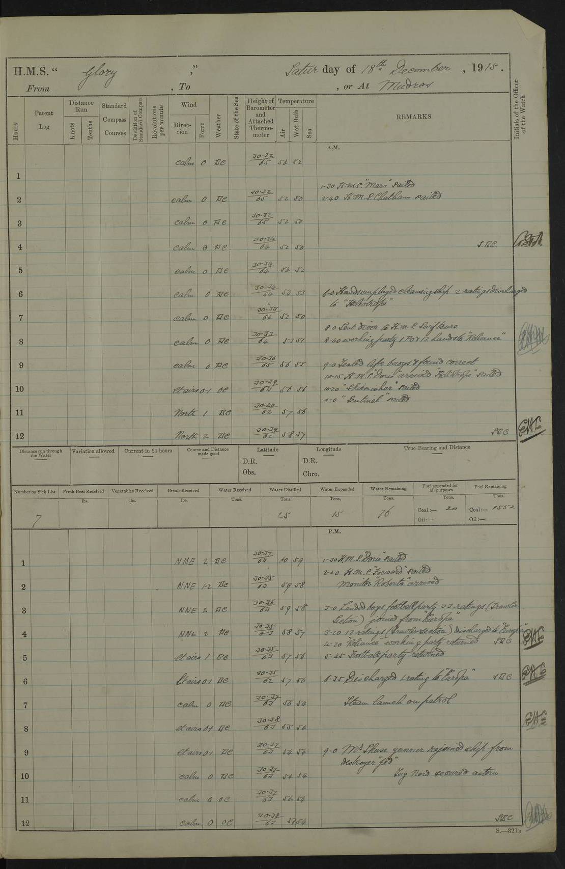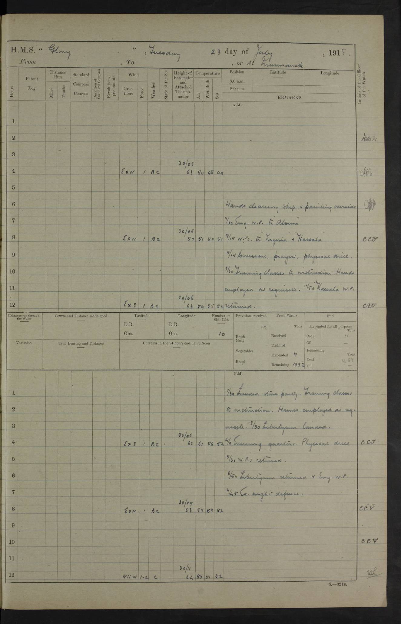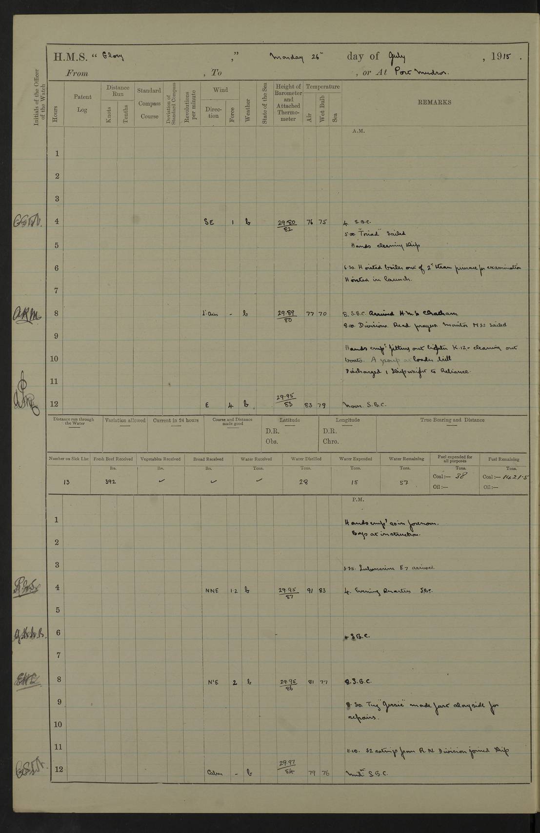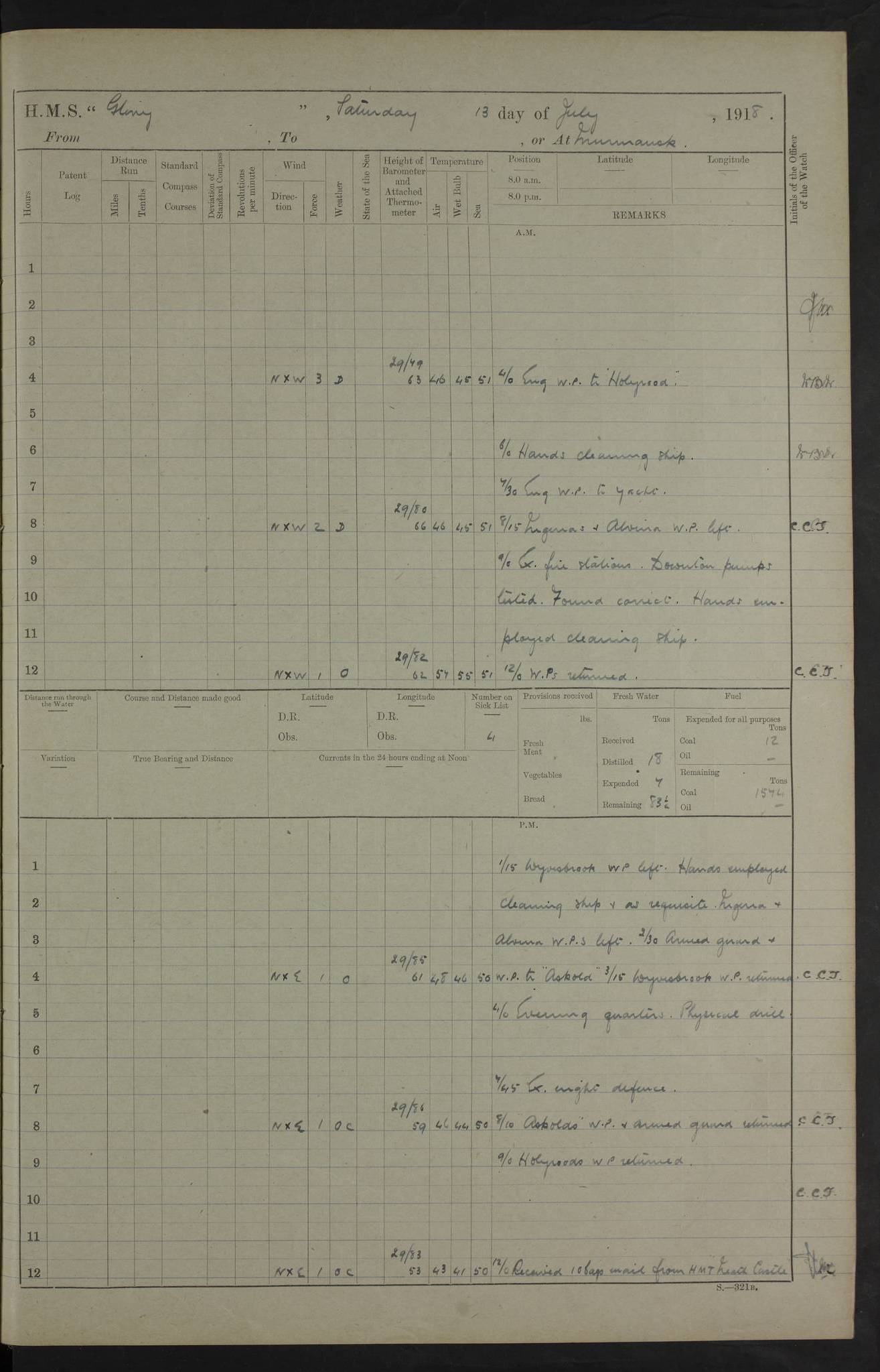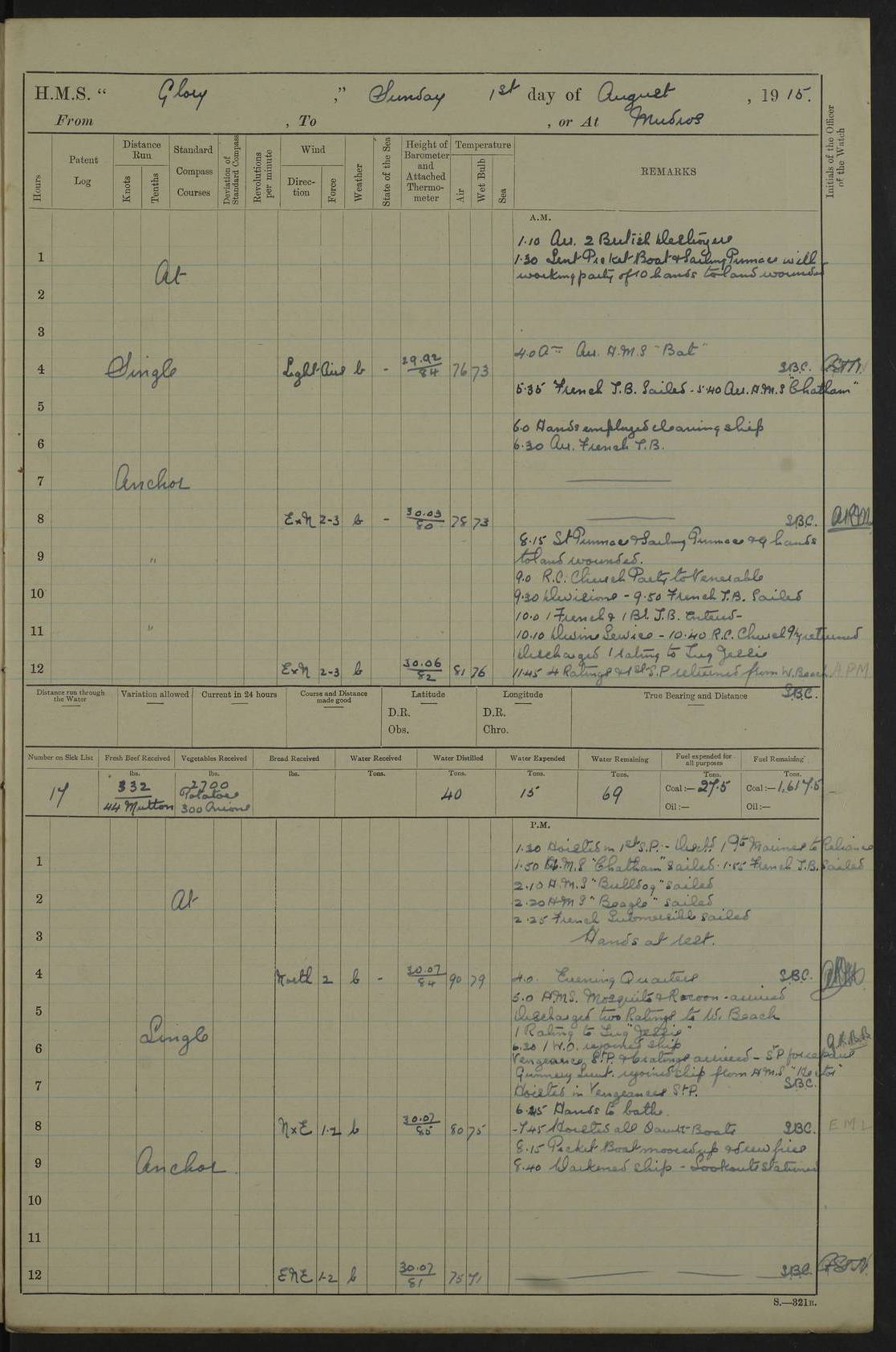 22 June 1915 At sea, Gibraltar to Lemnos Lat 36.1, Long -1.3 4.15am: Sighted land on starboard bow. 10.20am: Stopped port engine for repairs. 11.20am: proceeded with port engine. pm: a/c due to change in deviation. 10.00pm: Cape Tenez Light abeam, 18 miles. 4f73cd61a2fc8ea9030015f6: (https://s3.amazonaws.com:443/oldweather/ADM53-43015/0012_1.jpg) 23 June 1915 At sea, Gibraltar to Lemnos Lat 37.5, Long 4.8 Number on sick list: 4 5.00am: Secured from night defence stations. Placed anti-submarine guns. pm: Life saving appliances served out to men stationed in ? ?at abandon ship. 4f73cd61a2fc8ea9030015f7: (https://s3.amazonaws.com:443/oldweather/ADM53-43015/0013_0.jpg) 24 June 1915 At sea, Gibraltar to Lemnos Lat 37.4, Long 10.8 Position in log clearly bears no resemblance to the location of the ship. Position above is approximate and is based sighting of Zembra Island at 11.55am. 5.00am: Dispersed from night defence stations. Manned anti-submarine guns. am: Sighted two French torpedo boats. am: Torpedo boats passed to ~ No 362, 363. am: Sighted land on starboard beam. 11.55am: Zembra Island abeam, 25 miles. 2.00pm: Sighted Pantellaria S34ºE. 4.45pm: Pantellaria Light House abeam 12 miles. 4f73cd61a2fc8ea9030015f8: (https://s3.amazonaws.com:443/oldweather/ADM53-43015/0013_1.jpg) 25 June 1915 At sea, Gibraltar to Lemnos Lat 35.5, Long 16.7 2.10am: Gozo Light abeam 17 miles. 5.00am: Dispersed from night defence stations. Manned anti-submarine guns. 4f73cd61a2fc8ea9030015f9: (https://s3.amazonaws.com:443/oldweather/ADM53-43015/0014_0.jpg) 26 June 1915 At sea, Gibraltar to Lemnos Lat 35.5, Long 22.6 Number on sick list: 5 5.00am: Dispersed from night defence stations. Manned anti-submarine guns. am: Aired night clothing. am: marines at maxim practice on quarter deck. 2.00pm: Observed land on either bow. 3.00pm: Sighted French patrol destroyer. 4.15pm: Sighted French patrol destroyer. 9.40pm: Milo Peak N63ºW. 10.26pm: Polino Light abeam to port 5.5 miles. 4f73cd62a2fc8ea9030015fa: (https://s3.amazonaws.com:443/oldweather/ADM53-43015/0014_1.jpg) 27 June 1915 At sea and at Lemnos Lat 39.1, Long 24.4 From 0.50 to 3.05am sighting of multiple light houses. 3.50am: a/c to N39ºW and commenced to zig-zag. 5.00am: Dispersed from night defence stations and placed anti-submarine guns and look-outs. am: Lost overboard by accident Hazlewood fender, pat. 311, one in number. 10.30am: Held Divine Service onboard. pm: Met and signalled HMS Minerva on patrol duty. pm: Courses and speeds as requisite while waiting orders to approach Mudros. 3.00pm: Proceeded. 5.16pm: Increased to 90 revs, commenced to zig-zag. Course as requisite for Mudros. 7.00pm: Entered Mudros Bay. 7.47pm: Stopped. Let go port anchor in ‘M3’. 8.30pm: Darkened ship. pm: Manned one 6” and one 12 pdr. 4f73cd62a2fc8ea9030015fb: (https://s3.amazonaws.com:443/oldweather/ADM53-43015/0015_0.jpg) 28 June 1915 Mudros Bay, Lemnos Lat 39.89, Long 25.24 5,00am: HMS Vengeance entered harbour. HMS Vengeance was a pre-dreadnought of the Canopus class, launched in 1899 at Vickers, Barrow, and sold for scrapping in 1921. Details at http://en.wikipedia.org/wiki/HMS_Vengeance_(1899) . am/pm/: hands preparing for coaling and about ship’s work. pm: Collier Wabana secured alongside. 4f73cd62a2fc8ea9030015fc: (https://s3.amazonaws.com:443/oldweather/ADM53-43015/0015_1.jpg) 29 June 1915 Mudros Bay, Lemnos Lat 39.89, Long 25.24 5.15am: Commenced coaling. 2.00pm: Finished coaling. Collier left. 4f73cd62a2fc8ea9030015fd: (https://s3.amazonaws.com:443/oldweather/ADM53-43015/0016_0.jpg) 30 June 1915 Mudros Bay, Lemnos Lat 39.89, Long 25.24 am: Parties away sanding, and with fire engines onshore. am: Boats away disembarking troops. am: French Flagship Patrie sailed. The Patrie was a French pre-dreadnought, launched at La Seyne shipyard in 1903, and stricken in 1921. Details at http://en.wikipedia.org/wiki/French_battleship_Patrie . 6.30pm: Hands to bathe. 4f73cd63a2fc8ea9030015fe: (https://s3.amazonaws.com:443/oldweather/ADM53-43015/0016_1.jpg) 4f73cd63a2fc8ea9030015ff: (https://s3.amazonaws.com:443/oldweather/ADM53-43015/0017_0.jpg) 4f73cd63a2fc8ea903001600: (https://s3.amazonaws.com:443/oldweather/ADM53-43015/0017_1.jpg) 4f73cd63a2fc8ea903001601: (https://s3.amazonaws.com:443/oldweather/ADM53-43015/0018_0.jpg) 4f73cd64a2fc8ea903001602: (https://s3.amazonaws.com:443/oldweather/ADM53-43015/0018_1.jpg) LOGS FOR JULY 1915 From July to October 1915, HMS Glory spent her time at Port Mudros. Certain activities typically took place daily and are not generally noted in the pages below. These activities include: Lighting fires in the picket boat around 4am and drawing the fires in the late evening; Divisions at around 9–9.30am and Evening Quarters at 4pm; Darken ship at around 8.30pm; Daily ‘cleaning ship’, with variations thereof; SBC (for ‘Signal Books Correct’) at the watch changes. 4f73cd64a2fc8ea903001603: (https://s3.amazonaws.com:443/oldweather/ADM53-43016/0000_0.jpg) 4f73cd64a2fc8ea903001604: (https://s3.amazonaws.com:443/oldweather/ADM53-43016/0000_1.jpg) 4f73cd65a2fc8ea903001605: (https://s3.amazonaws.com:443/oldweather/ADM53-43016/0001_0.jpg) 4f73cd65a2fc8ea903001606: (https://s3.amazonaws.com:443/oldweather/ADM53-43016/0001_1.jpg) 1 July 1915 Port Mudros Lat 39.89, Long 25.24 6.30am: Landed working parties preparing boom defence ships. am: Discharged Acting Commander Rayne to Hector. Hector was a kite balloon ship. No further details readily available. 5.00pm: Tug T.10 made fast astern. 7.15pm: HMS Venerable went out. 7.30pm: HMS Chatham went out. HMS Chatham was a ‘Town’ cruiser and lead ship of her class. She was launched in 1911 at Chatham Dockyard and sold in 1926. Details at http://en.wikipedia.org/wiki/HMS_Chatham_(1911) . 4f73cd65a2fc8ea903001607: (https://s3.amazonaws.com:443/oldweather/ADM53-43016/0002_0.jpg) 2 July 1915 Port Mudros Lat 39.89, Long 25.24 5.35am: Landed working parties preparing boom defence ships. am/pm: Boom defence par