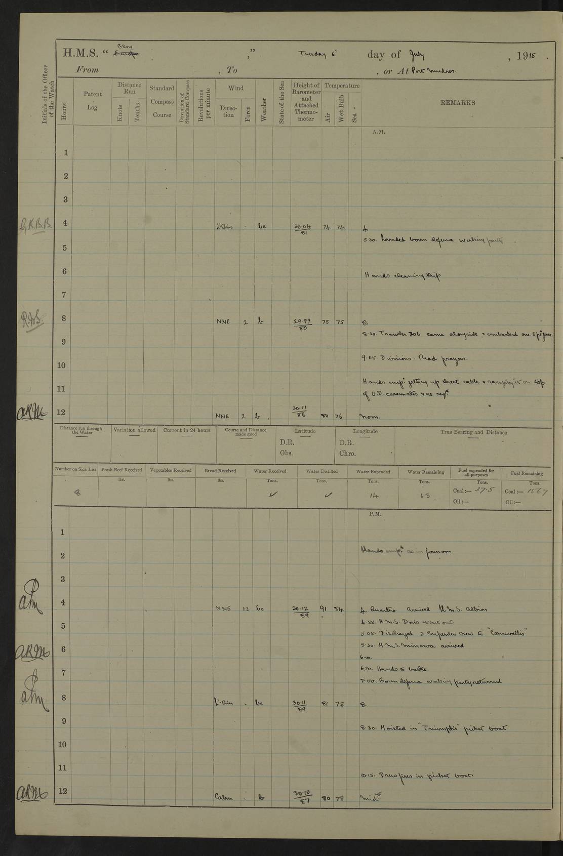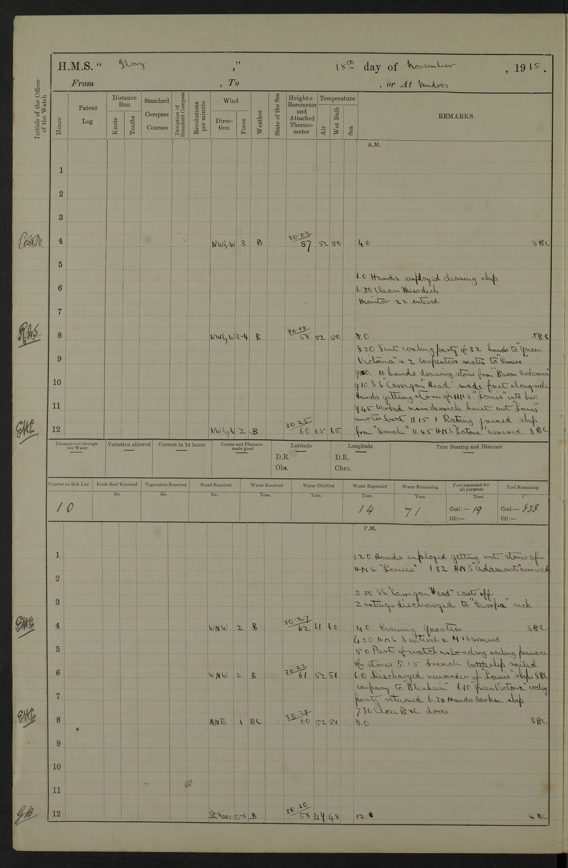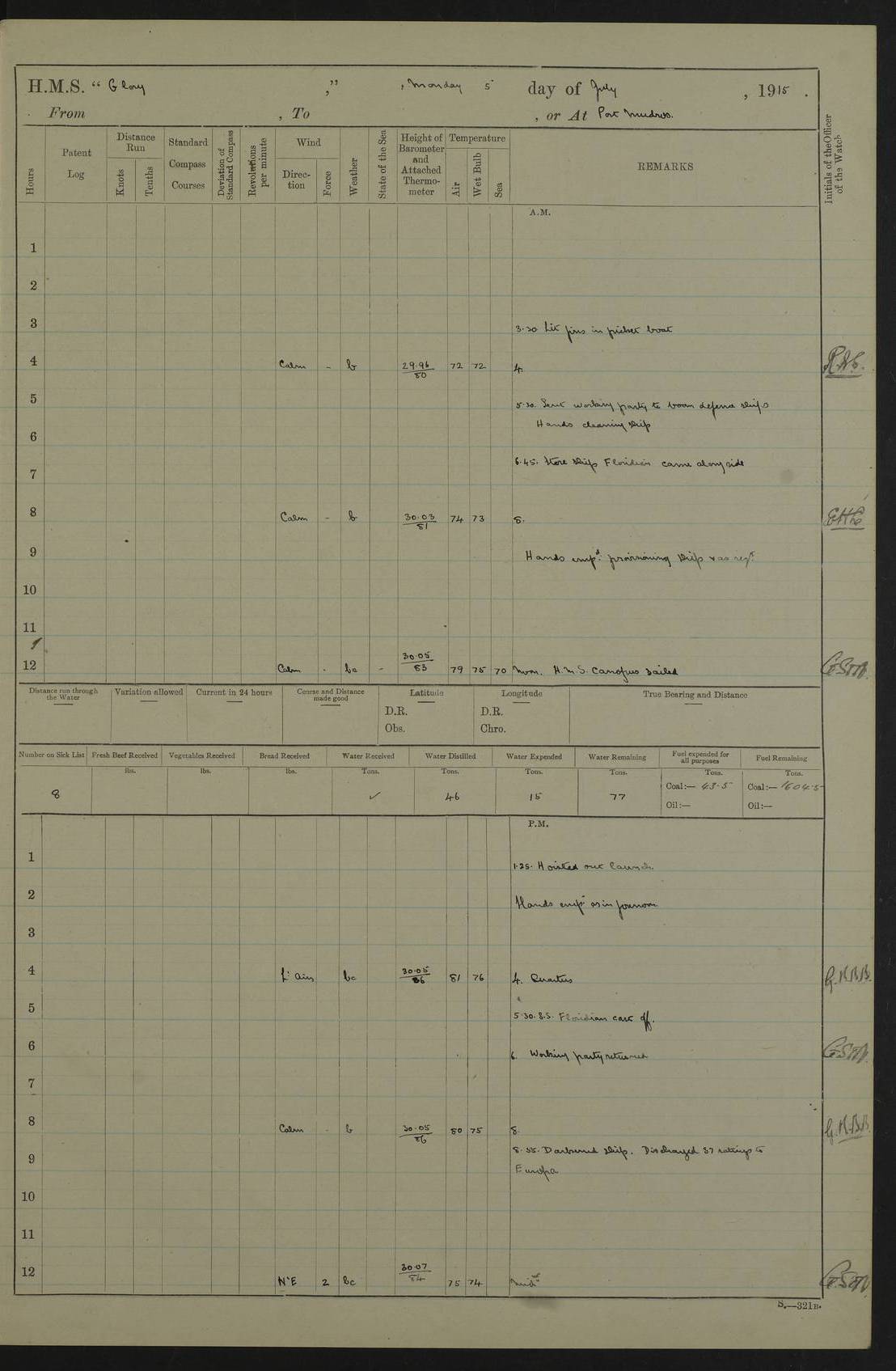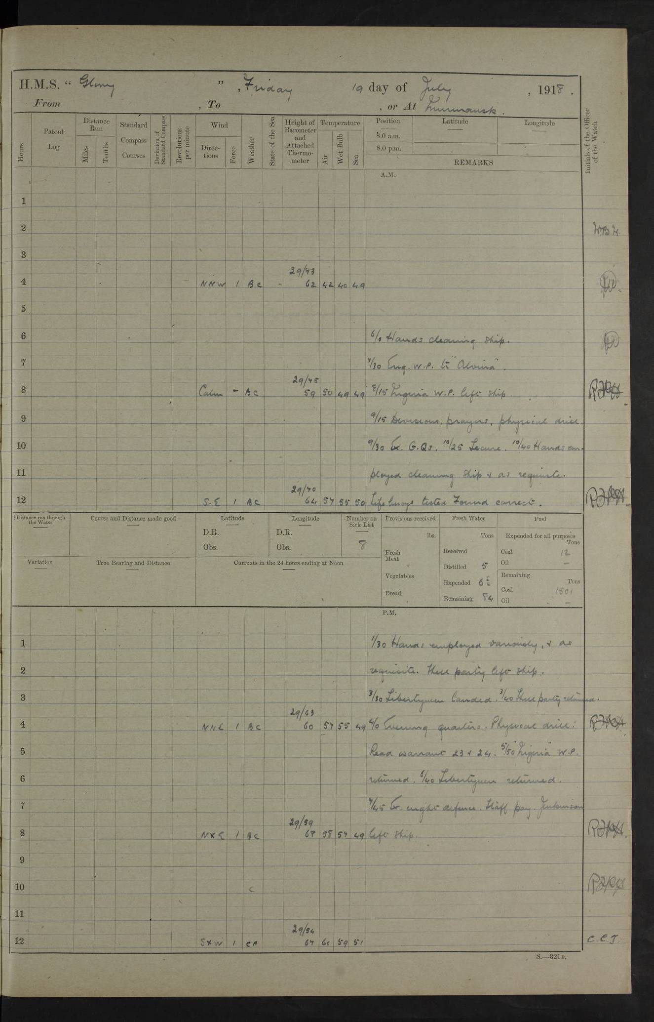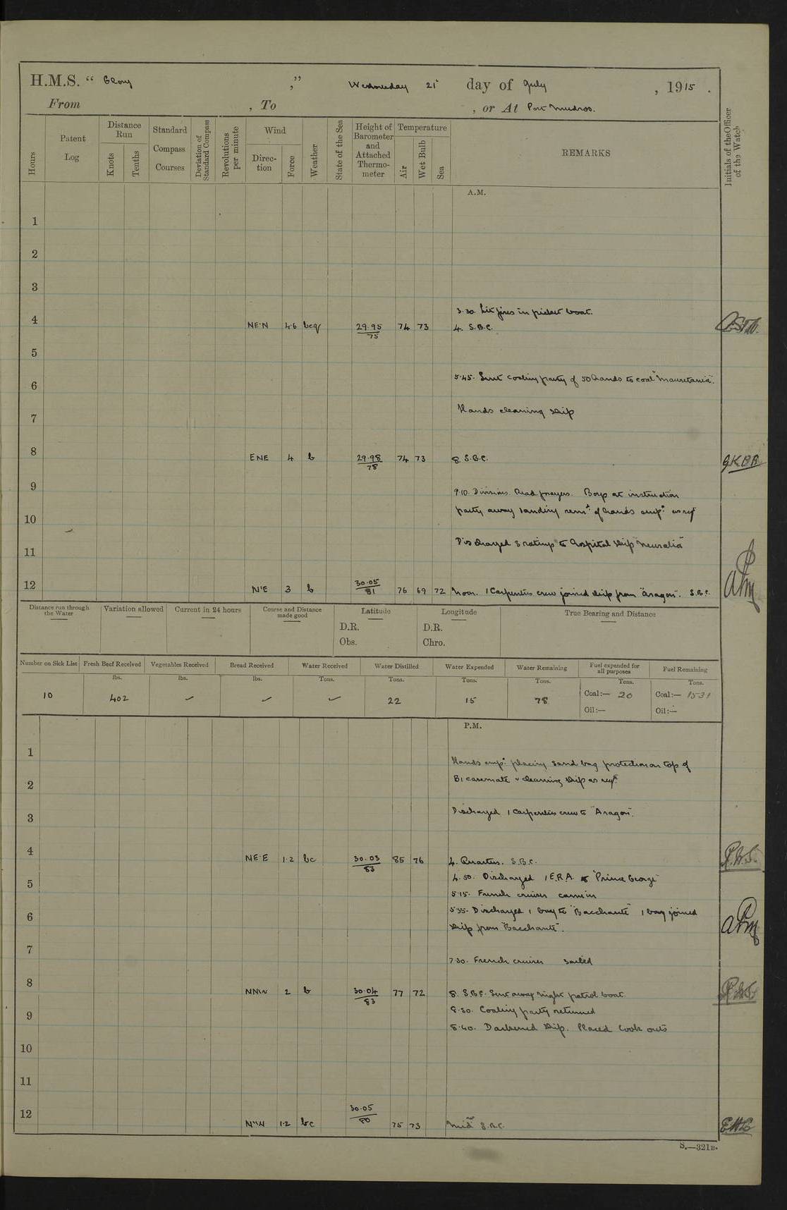 22 June 1915 At sea, Gibraltar to Lemnos Lat 36.1, Long -1.3 4.15am: Sighted land on starboard bow. 10.20am: Stopped port engine for repairs. 11.20am: proceeded with port engine. pm: a/c due to change in deviation. 10.00pm: Cape Tenez Light abeam, 18 miles. 4f73cd61a2fc8ea9030015f6: (https://s3.amazonaws.com:443/oldweather/ADM53-43015/0012_1.jpg) 23 June 1915 At sea, Gibraltar to Lemnos Lat 37.5, Long 4.8 Number on sick list: 4 5.00am: Secured from night defence stations. Placed anti-submarine guns. pm: Life saving appliances served out to men stationed in ? ?at abandon ship. 4f73cd61a2fc8ea9030015f7: (https://s3.amazonaws.com:443/oldweather/ADM53-43015/0013_0.jpg) 24 June 1915 At sea, Gibraltar to Lemnos Lat 37.4, Long 10.8 Position in log clearly bears no resemblance to the location of the ship. Position above is approximate and is based sighting of Zembra Island at 11.55am. 5.00am: Dispersed from night defence stations. Manned anti-submarine guns. am: Sighted two French torpedo boats. am: Torpedo boats passed to ~ No 362, 363. am: Sighted land on starboard beam. 11.55am: Zembra Island abeam, 25 miles. 2.00pm: Sighted Pantellaria S34ºE. 4.45pm: Pantellaria Light House abeam 12 miles. 4f73cd61a2fc8ea9030015f8: (https://s3.amazonaws.com:443/oldweather/ADM53-43015/0013_1.jpg) 25 June 1915 At sea, Gibraltar to Lemnos Lat 35.5, Long 16.7 2.10am: Gozo Light abeam 17 miles. 5.00am: Dispersed from night defence stations. Manned anti-submarine guns. 4f73cd61a2fc8ea9030015f9: (https://s3.amazonaws.com:443/oldweather/ADM53-43015/0014_0.jpg) 26 June 1915 At sea, Gibraltar to Lemnos Lat 35.5, Long 22.6 Number on sick list: 5 5.00am: Dispersed from night defence stations. Manned anti-submarine guns. am: Aired night clothing. am: marines at maxim practice on quarter deck. 2.00pm: Observed land on either bow. 3.00pm: Sighted French patrol destroyer. 4.15pm: Sighted French patrol destroyer. 9.40pm: Milo Peak N63ºW. 10.26pm: Polino Light abeam to port 5.5 miles. 4f73cd62a2fc8ea9030015fa: (https://s3.amazonaws.com:443/oldweather/ADM53-43015/0014_1.jpg) 27 June 1915 At sea and at Lemnos Lat 39.1, Long 24.4 From 0.50 to 3.05am sighting of multiple light houses. 3.50am: a/c to N39ºW and commenced to zig-zag. 5.00am: Dispersed from night defence stations and placed anti-submarine guns and look-outs. am: Lost overboard by accident Hazlewood fender, pat. 311, one in number. 10.30am: Held Divine Service onboard. pm: Met and signalled HMS Minerva on patrol duty. pm: Courses and speeds as requisite while waiting orders to approach Mudros. 3.00pm: Proceeded. 5.16pm: Increased to 90 revs, commenced to zig-zag. Course as requisite for Mudros. 7.00pm: Entered Mudros Bay. 7.47pm: Stopped. Let go port anchor in ‘M3’. 8.30pm: Darkened ship. pm: Manned one 6” and one 12 pdr. 4f73cd62a2fc8ea9030015fb: (https://s3.amazonaws.com:443/oldweather/ADM53-43015/0015_0.jpg) 28 June 1915 Mudros Bay, Lemnos Lat 39.89, Long 25.24 5,00am: HMS Vengeance entered harbour. HMS Vengeance was a pre-dreadnought of the Canopus class, launched in 1899 at Vickers, Barrow, and sold for scrapping in 1921. Details at http://en.wikipedia.org/wiki/HMS_Vengeance_(1899) . am/pm/: hands preparing for coaling and about ship’s work. pm: Collier Wabana secured alongside. 4f73cd62a2fc8ea9030015fc: (https://s3.amazonaws.com:443/oldweather/ADM53-43015/0015_1.jpg) 29 June 1915 Mudros Bay, Lemnos Lat 39.89, Long 25.24 5.15am: Commenced coaling. 2.00pm: Finished coaling. Collier left. 4f73cd62a2fc8ea9030015fd: (https://s3.amazonaws.com:443/oldweather/ADM53-43015/0016_0.jpg) 30 June 1915 Mudros Bay, Lemnos Lat 39.89, Long 25.24 am: Parties away sanding, and with fire engines onshore. am: Boats away disembarking troops. am: French Flagship Patrie sailed. The Patrie was a French pre-dreadnought, launched at La Seyne shipyard in 1903, and stricken in 1921. Details at http://en.wikipedia.org/wiki/French_battleship_Patrie . 6.30pm: Hands to bathe. 4f73cd63a2fc8ea9030015fe: (https://s3.amazonaws.com:443/oldweather/ADM53-43015/0016_1.jpg) 4f73cd63a2fc8ea9030015ff: (https://s3.amazonaws.com:443/oldweather/ADM53-43015/0017_0.jpg) 4f73cd63a2fc8ea903001600: (https://s3.amazonaws.com:443/oldweather/ADM53-43015/0017_1.jpg) 4f73cd63a2fc8ea903001601: (https://s3.amazonaws.com:443/oldweather/ADM53-43015/0018_0.jpg) 4f73cd64a2fc8ea903001602: (https://s3.amazonaws.com:443/oldweather/ADM53-43015/0018_1.jpg) LOGS FOR JULY 1915 From July to October 1915, HMS Glory spent her time at Port Mudros. Certain activities typically took place daily and are not generally noted in the pages below. These activities include: Lighting fires in the picket boat around 4am and drawing the fires in the late evening; Divisions at around 9–9.30am and Evening Quarters at 4pm; Darken ship at around 8.30pm; Daily ‘cleaning ship’, with variations thereof; SBC (for ‘Signal Books Correct’) at the watch changes. 4f73cd64a2fc8ea903001603: (https://s3.amazonaws.com:443/oldweather/ADM53-43016/0000_0.jpg) 4f73cd64a2fc8ea903001604: (https://s3.amazonaws.com:443/oldweather/ADM53-43016/0000_1.jpg) 4f73cd65a2fc8ea903001605: (https://s3.amazonaws.com:443/oldweather/ADM53-43016/0001_0.jpg) 4f73cd65a2fc8ea903001606: (https://s3.amazonaws.com:443/oldweather/ADM53-43016/0001_1.jpg) 1 July 1915 Port Mudros Lat 39.89, Long 25.24 6.30am: Landed working parties preparing boom defence ships. am: Discharged Acting Commander Rayne to Hector. Hector was a kite balloon ship. No further details readily available. 5.00pm: Tug T.10 made fast astern. 7.15pm: HMS Venerable went out. 7.30pm: HMS Chatham went out. HMS Chatham was a ‘Town’ cruiser and lead ship of her class. She was launched in 1911 at Chatham Dockyard and sold in 1926. Details at http://en.wikipedia.org/wiki/HMS_Chatham_(1911) . 4f73cd65a2fc8ea903001607: (https://s3.amazonaws.com:443/oldweather/ADM53-43016/0002_0.jpg) 2 July 1915 Port Mudros Lat 39.89, Long 25.24 5.35am: Landed working parties preparing boom defence ships. am/pm: Boom defence par