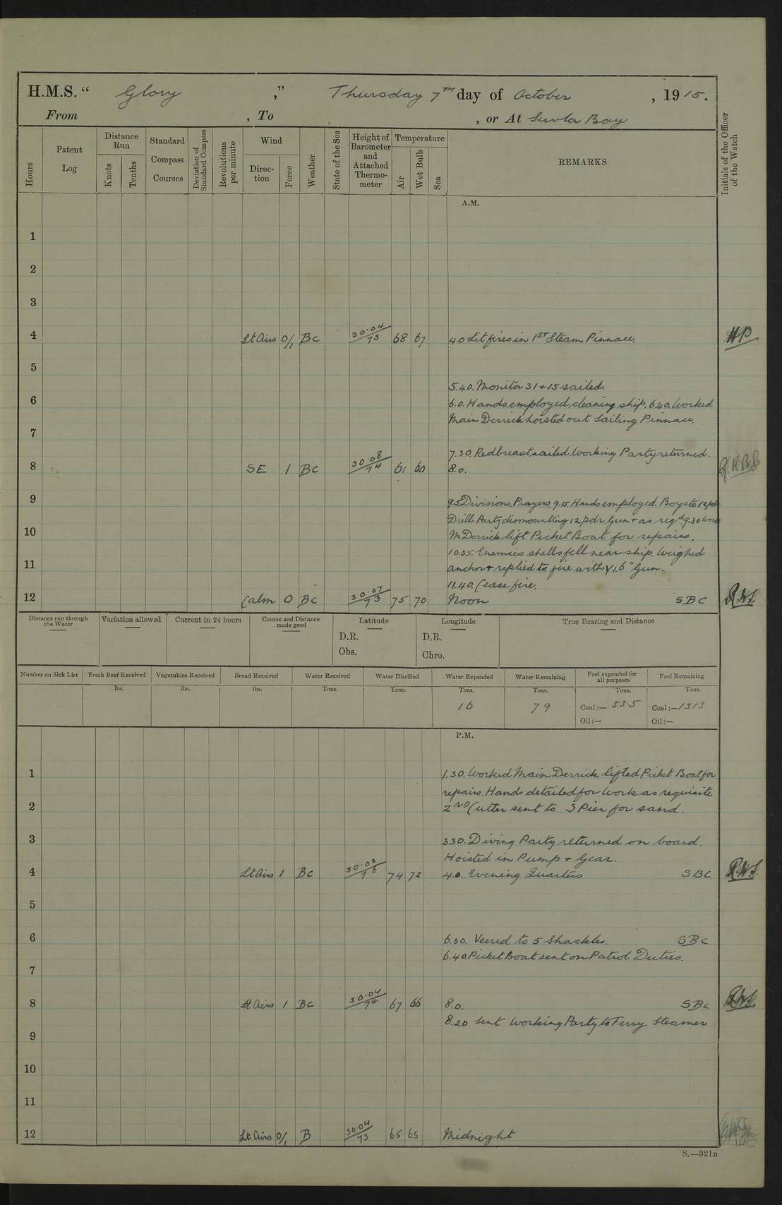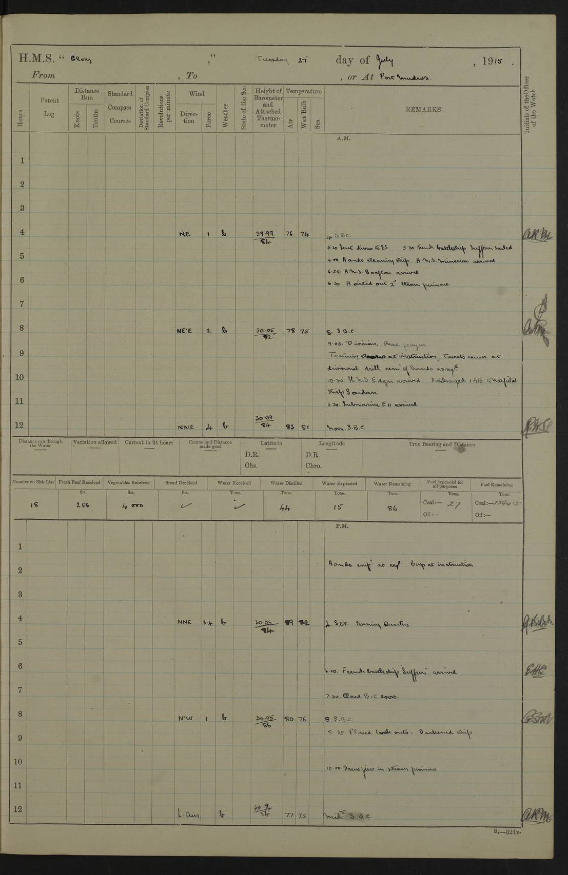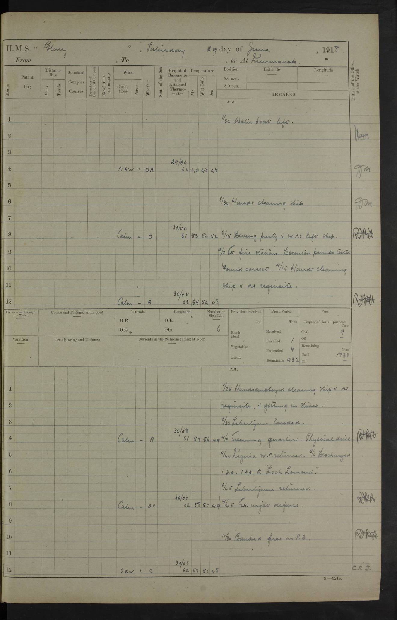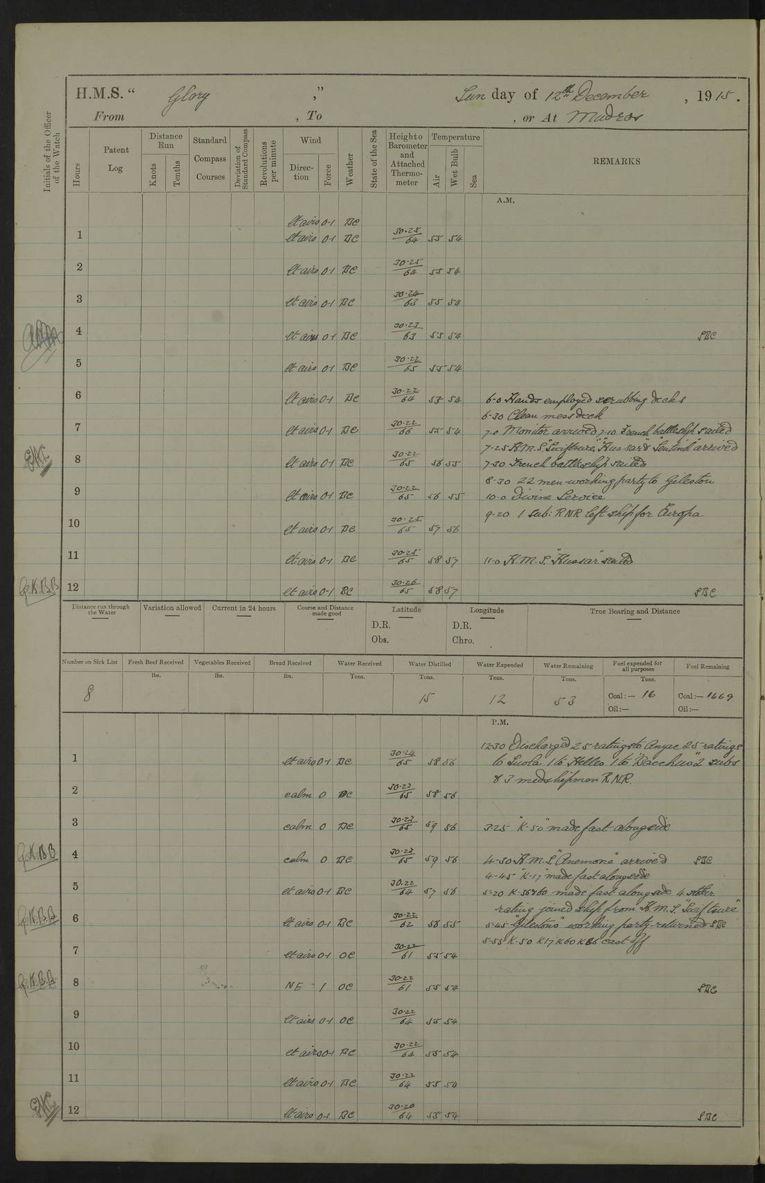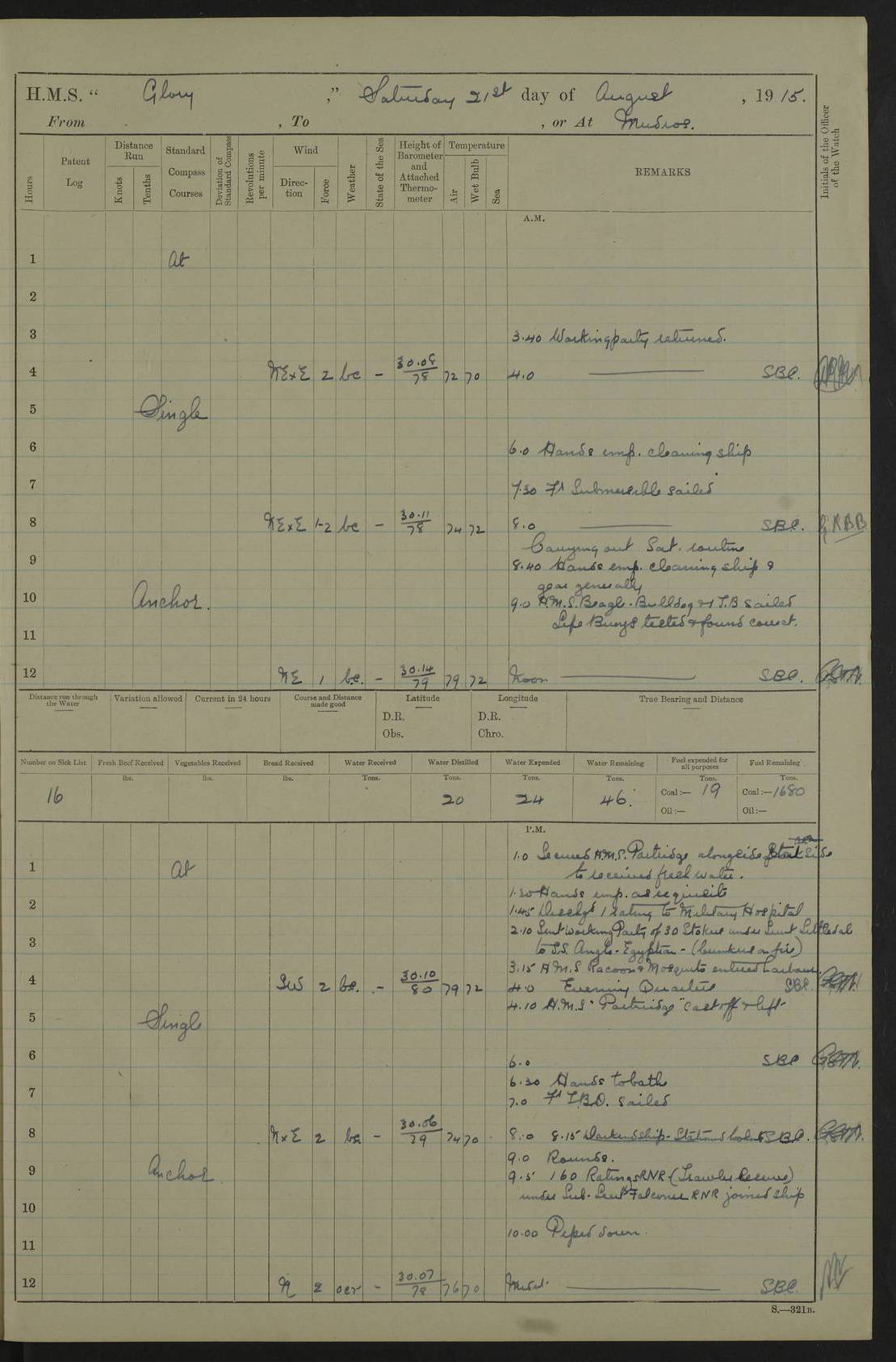 22 June 1915 At sea, Gibraltar to Lemnos Lat 36.1, Long -1.3 4.15am: Sighted land on starboard bow. 10.20am: Stopped port engine for repairs. 11.20am: proceeded with port engine. pm: a/c due to change in deviation. 10.00pm: Cape Tenez Light abeam, 18 miles. 4f73cd61a2fc8ea9030015f6: (https://s3.amazonaws.com:443/oldweather/ADM53-43015/0012_1.jpg) 23 June 1915 At sea, Gibraltar to Lemnos Lat 37.5, Long 4.8 Number on sick list: 4 5.00am: Secured from night defence stations. Placed anti-submarine guns. pm: Life saving appliances served out to men stationed in ? ?at abandon ship. 4f73cd61a2fc8ea9030015f7: (https://s3.amazonaws.com:443/oldweather/ADM53-43015/0013_0.jpg) 24 June 1915 At sea, Gibraltar to Lemnos Lat 37.4, Long 10.8 Position in log clearly bears no resemblance to the location of the ship. Position above is approximate and is based sighting of Zembra Island at 11.55am. 5.00am: Dispersed from night defence stations. Manned anti-submarine guns. am: Sighted two French torpedo boats. am: Torpedo boats passed to ~ No 362, 363. am: Sighted land on starboard beam. 11.55am: Zembra Island abeam, 25 miles. 2.00pm: Sighted Pantellaria S34ºE. 4.45pm: Pantellaria Light House abeam 12 miles. 4f73cd61a2fc8ea9030015f8: (https://s3.amazonaws.com:443/oldweather/ADM53-43015/0013_1.jpg) 25 June 1915 At sea, Gibraltar to Lemnos Lat 35.5, Long 16.7 2.10am: Gozo Light abeam 17 miles. 5.00am: Dispersed from night defence stations. Manned anti-submarine guns. 4f73cd61a2fc8ea9030015f9: (https://s3.amazonaws.com:443/oldweather/ADM53-43015/0014_0.jpg) 26 June 1915 At sea, Gibraltar to Lemnos Lat 35.5, Long 22.6 Number on sick list: 5 5.00am: Dispersed from night defence stations. Manned anti-submarine guns. am: Aired night clothing. am: marines at maxim practice on quarter deck. 2.00pm: Observed land on either bow. 3.00pm: Sighted French patrol destroyer. 4.15pm: Sighted French patrol destroyer. 9.40pm: Milo Peak N63ºW. 10.26pm: Polino Light abeam to port 5.5 miles. 4f73cd62a2fc8ea9030015fa: (https://s3.amazonaws.com:443/oldweather/ADM53-43015/0014_1.jpg) 27 June 1915 At sea and at Lemnos Lat 39.1, Long 24.4 From 0.50 to 3.05am sighting of multiple light houses. 3.50am: a/c to N39ºW and commenced to zig-zag. 5.00am: Dispersed from night defence stations and placed anti-submarine guns and look-outs. am: Lost overboard by accident Hazlewood fender, pat. 311, one in number. 10.30am: Held Divine Service onboard. pm: Met and signalled HMS Minerva on patrol duty. pm: Courses and speeds as requisite while waiting orders to approach Mudros. 3.00pm: Proceeded. 5.16pm: Increased to 90 revs, commenced to zig-zag. Course as requisite for Mudros. 7.00pm: Entered Mudros Bay. 7.47pm: Stopped. Let go port anchor in ‘M3’. 8.30pm: Darkened ship. pm: Manned one 6” and one 12 pdr. 4f73cd62a2fc8ea9030015fb: (https://s3.amazonaws.com:443/oldweather/ADM53-43015/0015_0.jpg) 28 June 1915 Mudros Bay, Lemnos Lat 39.89, Long 25.24 5,00am: HMS Vengeance entered harbour. HMS Vengeance was a pre-dreadnought of the Canopus class, launched in 1899 at Vickers, Barrow, and sold for scrapping in 1921. Details at http://en.wikipedia.org/wiki/HMS_Vengeance_(1899) . am/pm/: hands preparing for coaling and about ship’s work. pm: Collier Wabana secured alongside. 4f73cd62a2fc8ea9030015fc: (https://s3.amazonaws.com:443/oldweather/ADM53-43015/0015_1.jpg) 29 June 1915 Mudros Bay, Lemnos Lat 39.89, Long 25.24 5.15am: Commenced coaling. 2.00pm: Finished coaling. Collier left. 4f73cd62a2fc8ea9030015fd: (https://s3.amazonaws.com:443/oldweather/ADM53-43015/0016_0.jpg) 30 June 1915 Mudros Bay, Lemnos Lat 39.89, Long 25.24 am: Parties away sanding, and with fire engines onshore. am: Boats away disembarking troops. am: French Flagship Patrie sailed. The Patrie was a French pre-dreadnought, launched at La Seyne shipyard in 1903, and stricken in 1921. Details at http://en.wikipedia.org/wiki/French_battleship_Patrie . 6.30pm: Hands to bathe. 4f73cd63a2fc8ea9030015fe: (https://s3.amazonaws.com:443/oldweather/ADM53-43015/0016_1.jpg) 4f73cd63a2fc8ea9030015ff: (https://s3.amazonaws.com:443/oldweather/ADM53-43015/0017_0.jpg) 4f73cd63a2fc8ea903001600: (https://s3.amazonaws.com:443/oldweather/ADM53-43015/0017_1.jpg) 4f73cd63a2fc8ea903001601: (https://s3.amazonaws.com:443/oldweather/ADM53-43015/0018_0.jpg) 4f73cd64a2fc8ea903001602: (https://s3.amazonaws.com:443/oldweather/ADM53-43015/0018_1.jpg) LOGS FOR JULY 1915 From July to October 1915, HMS Glory spent her time at Port Mudros. Certain activities typically took place daily and are not generally noted in the pages below. These activities include: Lighting fires in the picket boat around 4am and drawing the fires in the late evening; Divisions at around 9–9.30am and Evening Quarters at 4pm; Darken ship at around 8.30pm; Daily ‘cleaning ship’, with variations thereof; SBC (for ‘Signal Books Correct’) at the watch changes. 4f73cd64a2fc8ea903001603: (https://s3.amazonaws.com:443/oldweather/ADM53-43016/0000_0.jpg) 4f73cd64a2fc8ea903001604: (https://s3.amazonaws.com:443/oldweather/ADM53-43016/0000_1.jpg) 4f73cd65a2fc8ea903001605: (https://s3.amazonaws.com:443/oldweather/ADM53-43016/0001_0.jpg) 4f73cd65a2fc8ea903001606: (https://s3.amazonaws.com:443/oldweather/ADM53-43016/0001_1.jpg) 1 July 1915 Port Mudros Lat 39.89, Long 25.24 6.30am: Landed working parties preparing boom defence ships. am: Discharged Acting Commander Rayne to Hector. Hector was a kite balloon ship. No further details readily available. 5.00pm: Tug T.10 made fast astern. 7.15pm: HMS Venerable went out. 7.30pm: HMS Chatham went out. HMS Chatham was a ‘Town’ cruiser and lead ship of her class. She was launched in 1911 at Chatham Dockyard and sold in 1926. Details at http://en.wikipedia.org/wiki/HMS_Chatham_(1911) . 4f73cd65a2fc8ea903001607: (https://s3.amazonaws.com:443/oldweather/ADM53-43016/0002_0.jpg) 2 July 1915 Port Mudros Lat 39.89, Long 25.24 5.35am: Landed working parties preparing boom defence ships. am/pm: Boom defence par