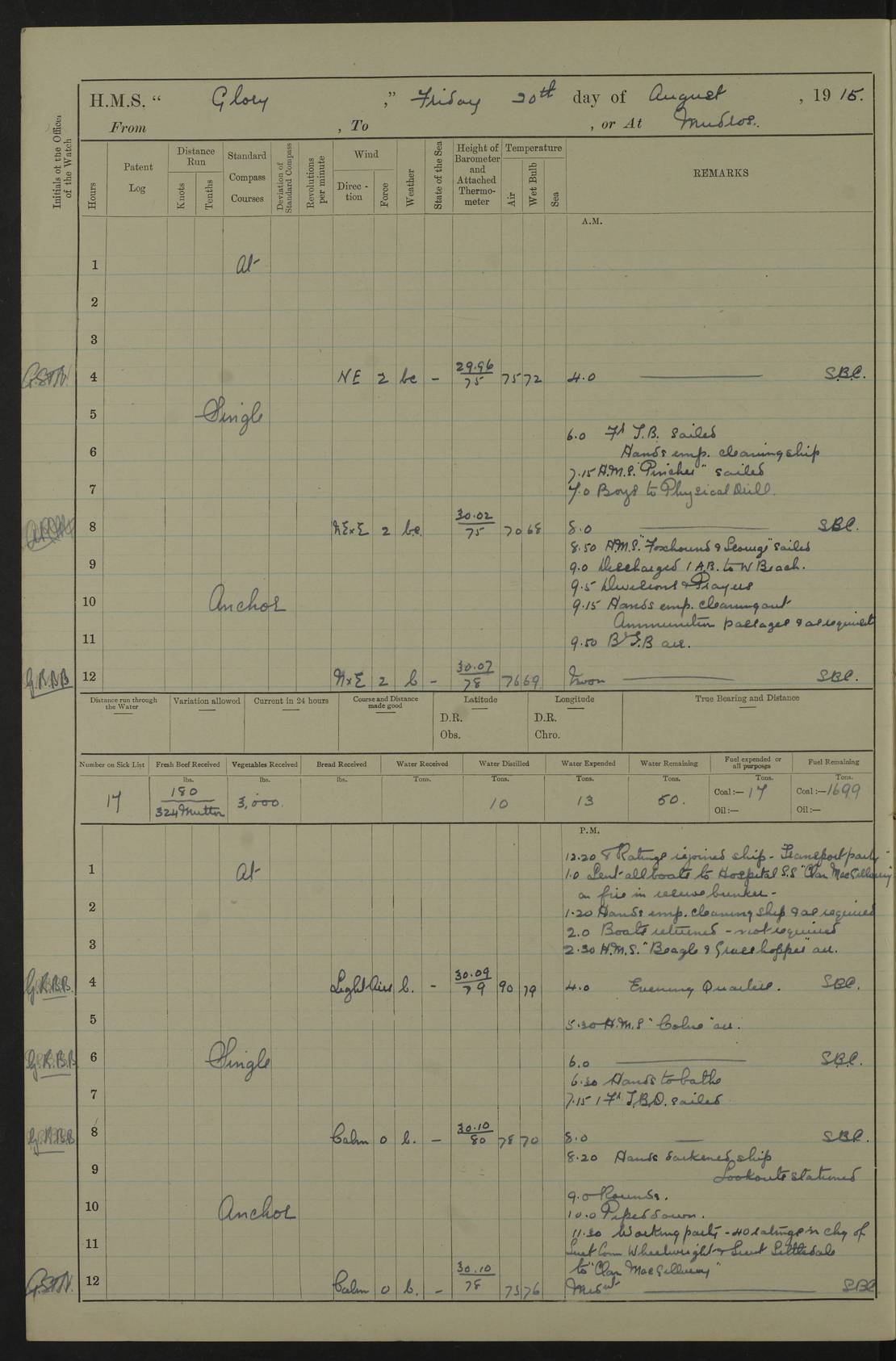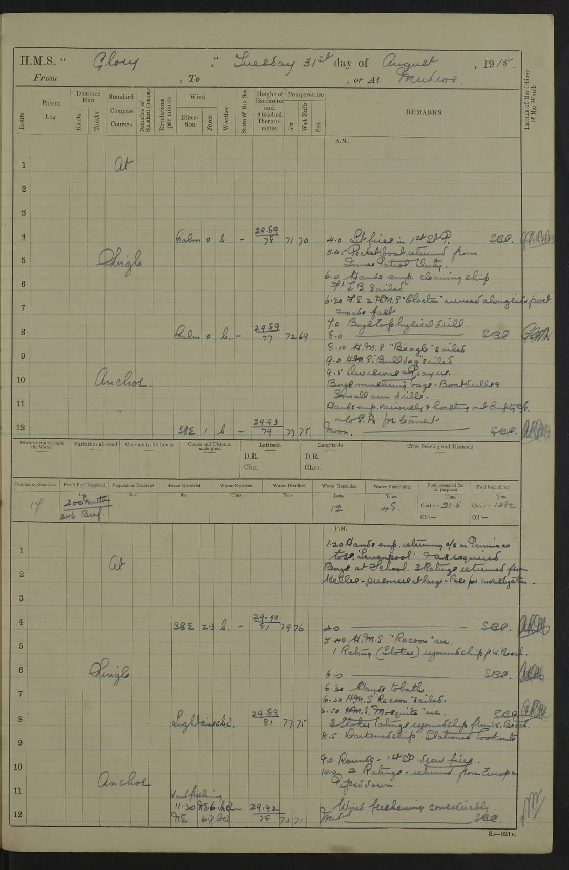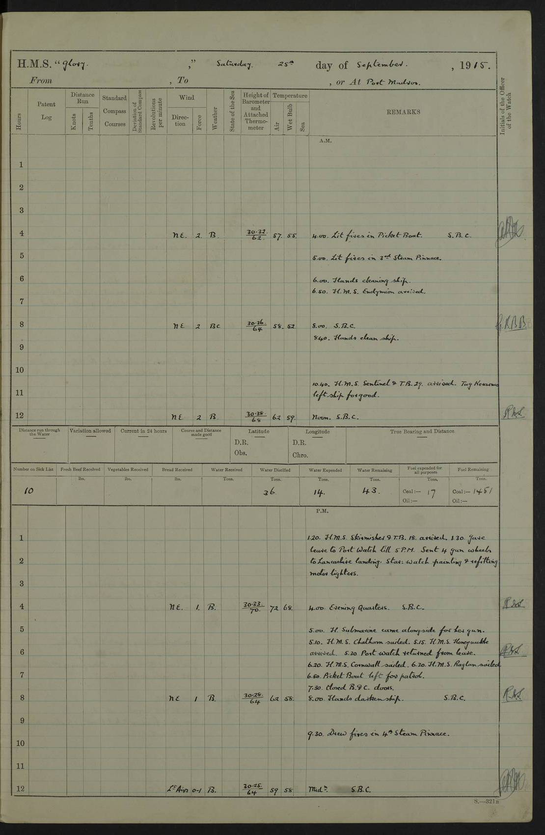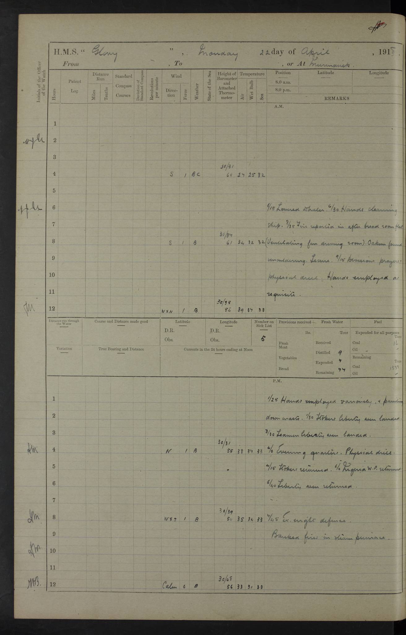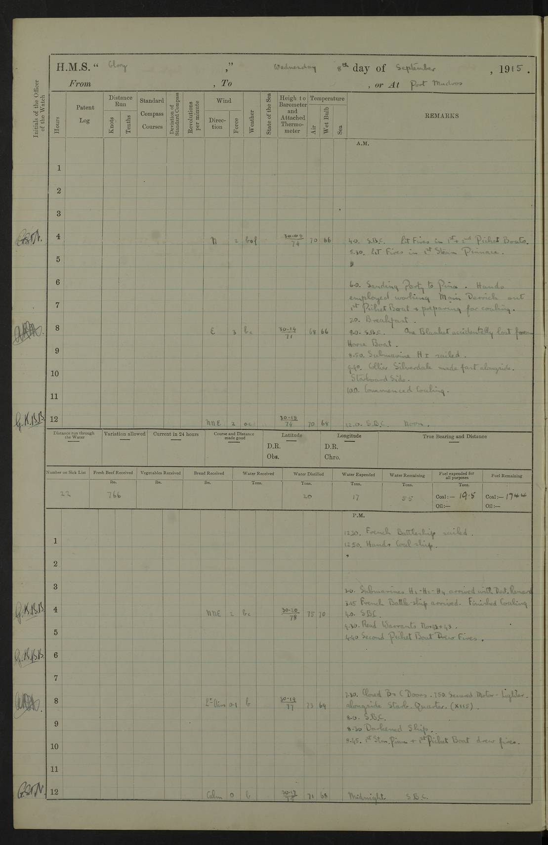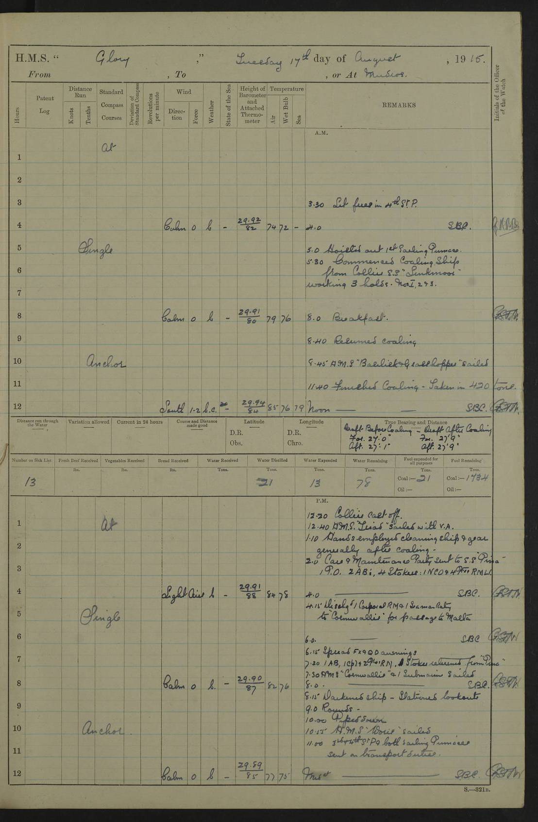 22 June 1915 At sea, Gibraltar to Lemnos Lat 36.1, Long -1.3 4.15am: Sighted land on starboard bow. 10.20am: Stopped port engine for repairs. 11.20am: proceeded with port engine. pm: a/c due to change in deviation. 10.00pm: Cape Tenez Light abeam, 18 miles. 4f73cd61a2fc8ea9030015f6: (https://s3.amazonaws.com:443/oldweather/ADM53-43015/0012_1.jpg) 23 June 1915 At sea, Gibraltar to Lemnos Lat 37.5, Long 4.8 Number on sick list: 4 5.00am: Secured from night defence stations. Placed anti-submarine guns. pm: Life saving appliances served out to men stationed in ? ?at abandon ship. 4f73cd61a2fc8ea9030015f7: (https://s3.amazonaws.com:443/oldweather/ADM53-43015/0013_0.jpg) 24 June 1915 At sea, Gibraltar to Lemnos Lat 37.4, Long 10.8 Position in log clearly bears no resemblance to the location of the ship. Position above is approximate and is based sighting of Zembra Island at 11.55am. 5.00am: Dispersed from night defence stations. Manned anti-submarine guns. am: Sighted two French torpedo boats. am: Torpedo boats passed to ~ No 362, 363. am: Sighted land on starboard beam. 11.55am: Zembra Island abeam, 25 miles. 2.00pm: Sighted Pantellaria S34ºE. 4.45pm: Pantellaria Light House abeam 12 miles. 4f73cd61a2fc8ea9030015f8: (https://s3.amazonaws.com:443/oldweather/ADM53-43015/0013_1.jpg) 25 June 1915 At sea, Gibraltar to Lemnos Lat 35.5, Long 16.7 2.10am: Gozo Light abeam 17 miles. 5.00am: Dispersed from night defence stations. Manned anti-submarine guns. 4f73cd61a2fc8ea9030015f9: (https://s3.amazonaws.com:443/oldweather/ADM53-43015/0014_0.jpg) 26 June 1915 At sea, Gibraltar to Lemnos Lat 35.5, Long 22.6 Number on sick list: 5 5.00am: Dispersed from night defence stations. Manned anti-submarine guns. am: Aired night clothing. am: marines at maxim practice on quarter deck. 2.00pm: Observed land on either bow. 3.00pm: Sighted French patrol destroyer. 4.15pm: Sighted French patrol destroyer. 9.40pm: Milo Peak N63ºW. 10.26pm: Polino Light abeam to port 5.5 miles. 4f73cd62a2fc8ea9030015fa: (https://s3.amazonaws.com:443/oldweather/ADM53-43015/0014_1.jpg) 27 June 1915 At sea and at Lemnos Lat 39.1, Long 24.4 From 0.50 to 3.05am sighting of multiple light houses. 3.50am: a/c to N39ºW and commenced to zig-zag. 5.00am: Dispersed from night defence stations and placed anti-submarine guns and look-outs. am: Lost overboard by accident Hazlewood fender, pat. 311, one in number. 10.30am: Held Divine Service onboard. pm: Met and signalled HMS Minerva on patrol duty. pm: Courses and speeds as requisite while waiting orders to approach Mudros. 3.00pm: Proceeded. 5.16pm: Increased to 90 revs, commenced to zig-zag. Course as requisite for Mudros. 7.00pm: Entered Mudros Bay. 7.47pm: Stopped. Let go port anchor in ‘M3’. 8.30pm: Darkened ship. pm: Manned one 6” and one 12 pdr. 4f73cd62a2fc8ea9030015fb: (https://s3.amazonaws.com:443/oldweather/ADM53-43015/0015_0.jpg) 28 June 1915 Mudros Bay, Lemnos Lat 39.89, Long 25.24 5,00am: HMS Vengeance entered harbour. HMS Vengeance was a pre-dreadnought of the Canopus class, launched in 1899 at Vickers, Barrow, and sold for scrapping in 1921. Details at http://en.wikipedia.org/wiki/HMS_Vengeance_(1899) . am/pm/: hands preparing for coaling and about ship’s work. pm: Collier Wabana secured alongside. 4f73cd62a2fc8ea9030015fc: (https://s3.amazonaws.com:443/oldweather/ADM53-43015/0015_1.jpg) 29 June 1915 Mudros Bay, Lemnos Lat 39.89, Long 25.24 5.15am: Commenced coaling. 2.00pm: Finished coaling. Collier left. 4f73cd62a2fc8ea9030015fd: (https://s3.amazonaws.com:443/oldweather/ADM53-43015/0016_0.jpg) 30 June 1915 Mudros Bay, Lemnos Lat 39.89, Long 25.24 am: Parties away sanding, and with fire engines onshore. am: Boats away disembarking troops. am: French Flagship Patrie sailed. The Patrie was a French pre-dreadnought, launched at La Seyne shipyard in 1903, and stricken in 1921. Details at http://en.wikipedia.org/wiki/French_battleship_Patrie . 6.30pm: Hands to bathe. 4f73cd63a2fc8ea9030015fe: (https://s3.amazonaws.com:443/oldweather/ADM53-43015/0016_1.jpg) 4f73cd63a2fc8ea9030015ff: (https://s3.amazonaws.com:443/oldweather/ADM53-43015/0017_0.jpg) 4f73cd63a2fc8ea903001600: (https://s3.amazonaws.com:443/oldweather/ADM53-43015/0017_1.jpg) 4f73cd63a2fc8ea903001601: (https://s3.amazonaws.com:443/oldweather/ADM53-43015/0018_0.jpg) 4f73cd64a2fc8ea903001602: (https://s3.amazonaws.com:443/oldweather/ADM53-43015/0018_1.jpg) LOGS FOR JULY 1915 From July to October 1915, HMS Glory spent her time at Port Mudros. Certain activities typically took place daily and are not generally noted in the pages below. These activities include: Lighting fires in the picket boat around 4am and drawing the fires in the late evening; Divisions at around 9–9.30am and Evening Quarters at 4pm; Darken ship at around 8.30pm; Daily ‘cleaning ship’, with variations thereof; SBC (for ‘Signal Books Correct’) at the watch changes. 4f73cd64a2fc8ea903001603: (https://s3.amazonaws.com:443/oldweather/ADM53-43016/0000_0.jpg) 4f73cd64a2fc8ea903001604: (https://s3.amazonaws.com:443/oldweather/ADM53-43016/0000_1.jpg) 4f73cd65a2fc8ea903001605: (https://s3.amazonaws.com:443/oldweather/ADM53-43016/0001_0.jpg) 4f73cd65a2fc8ea903001606: (https://s3.amazonaws.com:443/oldweather/ADM53-43016/0001_1.jpg) 1 July 1915 Port Mudros Lat 39.89, Long 25.24 6.30am: Landed working parties preparing boom defence ships. am: Discharged Acting Commander Rayne to Hector. Hector was a kite balloon ship. No further details readily available. 5.00pm: Tug T.10 made fast astern. 7.15pm: HMS Venerable went out. 7.30pm: HMS Chatham went out. HMS Chatham was a ‘Town’ cruiser and lead ship of her class. She was launched in 1911 at Chatham Dockyard and sold in 1926. Details at http://en.wikipedia.org/wiki/HMS_Chatham_(1911) . 4f73cd65a2fc8ea903001607: (https://s3.amazonaws.com:443/oldweather/ADM53-43016/0002_0.jpg) 2 July 1915 Port Mudros Lat 39.89, Long 25.24 5.35am: Landed working parties preparing boom defence ships. am/pm: Boom defence par
