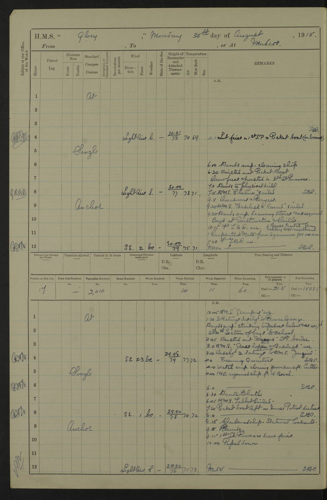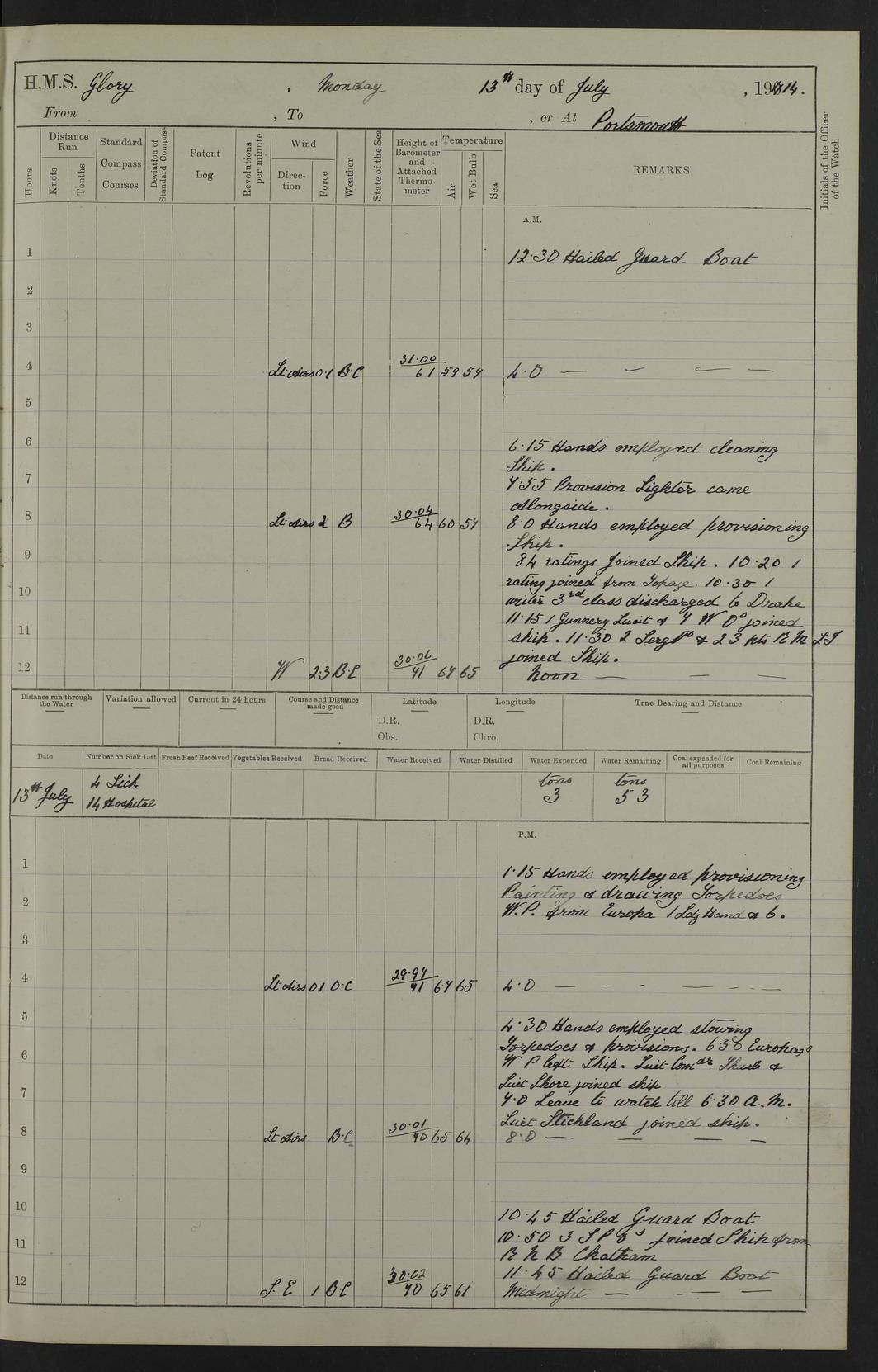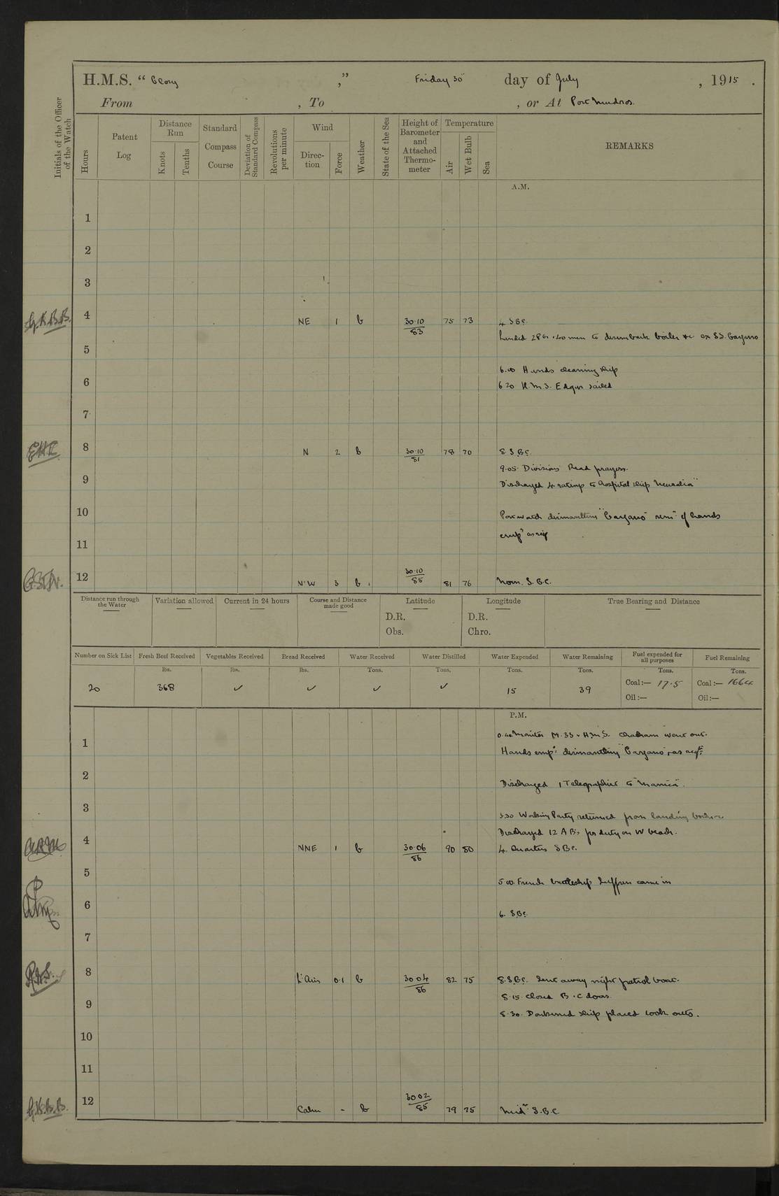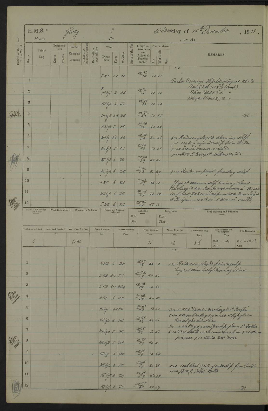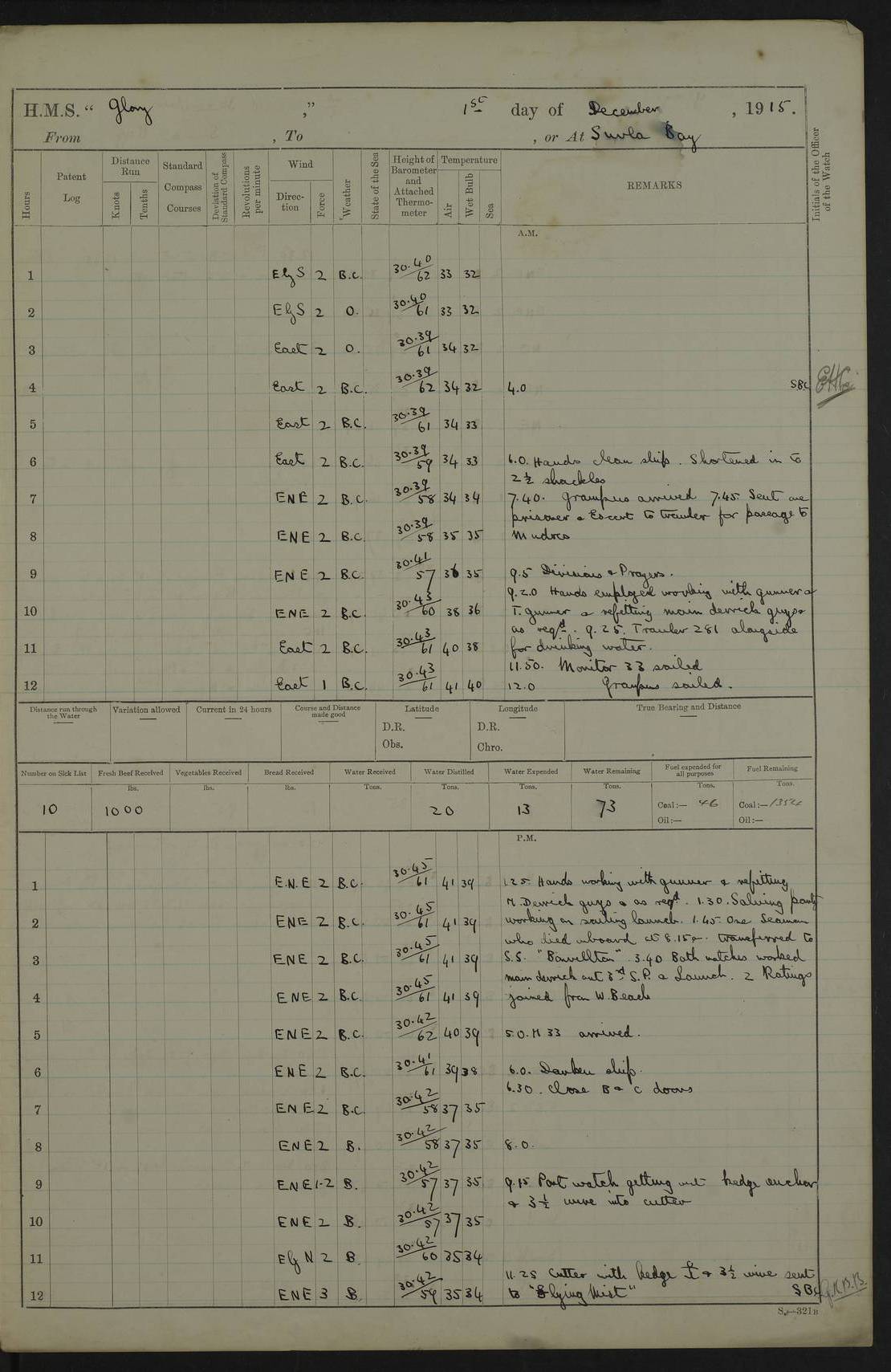 22 June 1915 At sea, Gibraltar to Lemnos Lat 36.1, Long -1.3 4.15am: Sighted land on starboard bow. 10.20am: Stopped port engine for repairs. 11.20am: proceeded with port engine. pm: a/c due to change in deviation. 10.00pm: Cape Tenez Light abeam, 18 miles. 4f73cd61a2fc8ea9030015f6: (https://s3.amazonaws.com:443/oldweather/ADM53-43015/0012_1.jpg) 23 June 1915 At sea, Gibraltar to Lemnos Lat 37.5, Long 4.8 Number on sick list: 4 5.00am: Secured from night defence stations. Placed anti-submarine guns. pm: Life saving appliances served out to men stationed in ? ?at abandon ship. 4f73cd61a2fc8ea9030015f7: (https://s3.amazonaws.com:443/oldweather/ADM53-43015/0013_0.jpg) 24 June 1915 At sea, Gibraltar to Lemnos Lat 37.4, Long 10.8 Position in log clearly bears no resemblance to the location of the ship. Position above is approximate and is based sighting of Zembra Island at 11.55am. 5.00am: Dispersed from night defence stations. Manned anti-submarine guns. am: Sighted two French torpedo boats. am: Torpedo boats passed to ~ No 362, 363. am: Sighted land on starboard beam. 11.55am: Zembra Island abeam, 25 miles. 2.00pm: Sighted Pantellaria S34ºE. 4.45pm: Pantellaria Light House abeam 12 miles. 4f73cd61a2fc8ea9030015f8: (https://s3.amazonaws.com:443/oldweather/ADM53-43015/0013_1.jpg) 25 June 1915 At sea, Gibraltar to Lemnos Lat 35.5, Long 16.7 2.10am: Gozo Light abeam 17 miles. 5.00am: Dispersed from night defence stations. Manned anti-submarine guns. 4f73cd61a2fc8ea9030015f9: (https://s3.amazonaws.com:443/oldweather/ADM53-43015/0014_0.jpg) 26 June 1915 At sea, Gibraltar to Lemnos Lat 35.5, Long 22.6 Number on sick list: 5 5.00am: Dispersed from night defence stations. Manned anti-submarine guns. am: Aired night clothing. am: marines at maxim practice on quarter deck. 2.00pm: Observed land on either bow. 3.00pm: Sighted French patrol destroyer. 4.15pm: Sighted French patrol destroyer. 9.40pm: Milo Peak N63ºW. 10.26pm: Polino Light abeam to port 5.5 miles. 4f73cd62a2fc8ea9030015fa: (https://s3.amazonaws.com:443/oldweather/ADM53-43015/0014_1.jpg) 27 June 1915 At sea and at Lemnos Lat 39.1, Long 24.4 From 0.50 to 3.05am sighting of multiple light houses. 3.50am: a/c to N39ºW and commenced to zig-zag. 5.00am: Dispersed from night defence stations and placed anti-submarine guns and look-outs. am: Lost overboard by accident Hazlewood fender, pat. 311, one in number. 10.30am: Held Divine Service onboard. pm: Met and signalled HMS Minerva on patrol duty. pm: Courses and speeds as requisite while waiting orders to approach Mudros. 3.00pm: Proceeded. 5.16pm: Increased to 90 revs, commenced to zig-zag. Course as requisite for Mudros. 7.00pm: Entered Mudros Bay. 7.47pm: Stopped. Let go port anchor in ‘M3’. 8.30pm: Darkened ship. pm: Manned one 6” and one 12 pdr. 4f73cd62a2fc8ea9030015fb: (https://s3.amazonaws.com:443/oldweather/ADM53-43015/0015_0.jpg) 28 June 1915 Mudros Bay, Lemnos Lat 39.89, Long 25.24 5,00am: HMS Vengeance entered harbour. HMS Vengeance was a pre-dreadnought of the Canopus class, launched in 1899 at Vickers, Barrow, and sold for scrapping in 1921. Details at http://en.wikipedia.org/wiki/HMS_Vengeance_(1899) . am/pm/: hands preparing for coaling and about ship’s work. pm: Collier Wabana secured alongside. 4f73cd62a2fc8ea9030015fc: (https://s3.amazonaws.com:443/oldweather/ADM53-43015/0015_1.jpg) 29 June 1915 Mudros Bay, Lemnos Lat 39.89, Long 25.24 5.15am: Commenced coaling. 2.00pm: Finished coaling. Collier left. 4f73cd62a2fc8ea9030015fd: (https://s3.amazonaws.com:443/oldweather/ADM53-43015/0016_0.jpg) 30 June 1915 Mudros Bay, Lemnos Lat 39.89, Long 25.24 am: Parties away sanding, and with fire engines onshore. am: Boats away disembarking troops. am: French Flagship Patrie sailed. The Patrie was a French pre-dreadnought, launched at La Seyne shipyard in 1903, and stricken in 1921. Details at http://en.wikipedia.org/wiki/French_battleship_Patrie . 6.30pm: Hands to bathe. 4f73cd63a2fc8ea9030015fe: (https://s3.amazonaws.com:443/oldweather/ADM53-43015/0016_1.jpg) 4f73cd63a2fc8ea9030015ff: (https://s3.amazonaws.com:443/oldweather/ADM53-43015/0017_0.jpg) 4f73cd63a2fc8ea903001600: (https://s3.amazonaws.com:443/oldweather/ADM53-43015/0017_1.jpg) 4f73cd63a2fc8ea903001601: (https://s3.amazonaws.com:443/oldweather/ADM53-43015/0018_0.jpg) 4f73cd64a2fc8ea903001602: (https://s3.amazonaws.com:443/oldweather/ADM53-43015/0018_1.jpg) LOGS FOR JULY 1915 From July to October 1915, HMS Glory spent her time at Port Mudros. Certain activities typically took place daily and are not generally noted in the pages below. These activities include: Lighting fires in the picket boat around 4am and drawing the fires in the late evening; Divisions at around 9–9.30am and Evening Quarters at 4pm; Darken ship at around 8.30pm; Daily ‘cleaning ship’, with variations thereof; SBC (for ‘Signal Books Correct’) at the watch changes. 4f73cd64a2fc8ea903001603: (https://s3.amazonaws.com:443/oldweather/ADM53-43016/0000_0.jpg) 4f73cd64a2fc8ea903001604: (https://s3.amazonaws.com:443/oldweather/ADM53-43016/0000_1.jpg) 4f73cd65a2fc8ea903001605: (https://s3.amazonaws.com:443/oldweather/ADM53-43016/0001_0.jpg) 4f73cd65a2fc8ea903001606: (https://s3.amazonaws.com:443/oldweather/ADM53-43016/0001_1.jpg) 1 July 1915 Port Mudros Lat 39.89, Long 25.24 6.30am: Landed working parties preparing boom defence ships. am: Discharged Acting Commander Rayne to Hector. Hector was a kite balloon ship. No further details readily available. 5.00pm: Tug T.10 made fast astern. 7.15pm: HMS Venerable went out. 7.30pm: HMS Chatham went out. HMS Chatham was a ‘Town’ cruiser and lead ship of her class. She was launched in 1911 at Chatham Dockyard and sold in 1926. Details at http://en.wikipedia.org/wiki/HMS_Chatham_(1911) . 4f73cd65a2fc8ea903001607: (https://s3.amazonaws.com:443/oldweather/ADM53-43016/0002_0.jpg) 2 July 1915 Port Mudros Lat 39.89, Long 25.24 5.35am: Landed working parties preparing boom defence ships. am/pm: Boom defence par