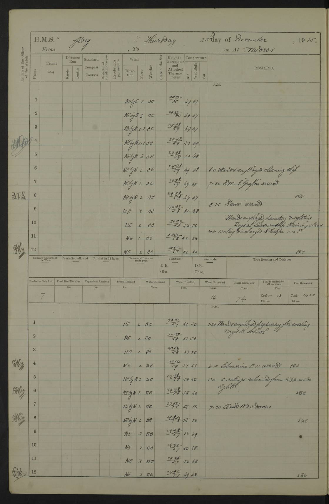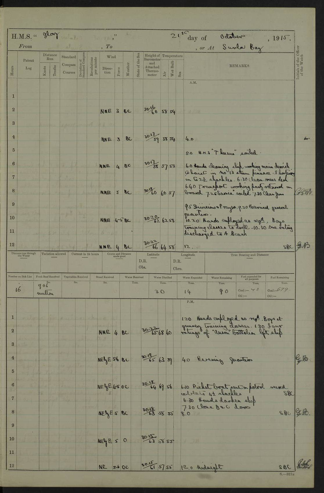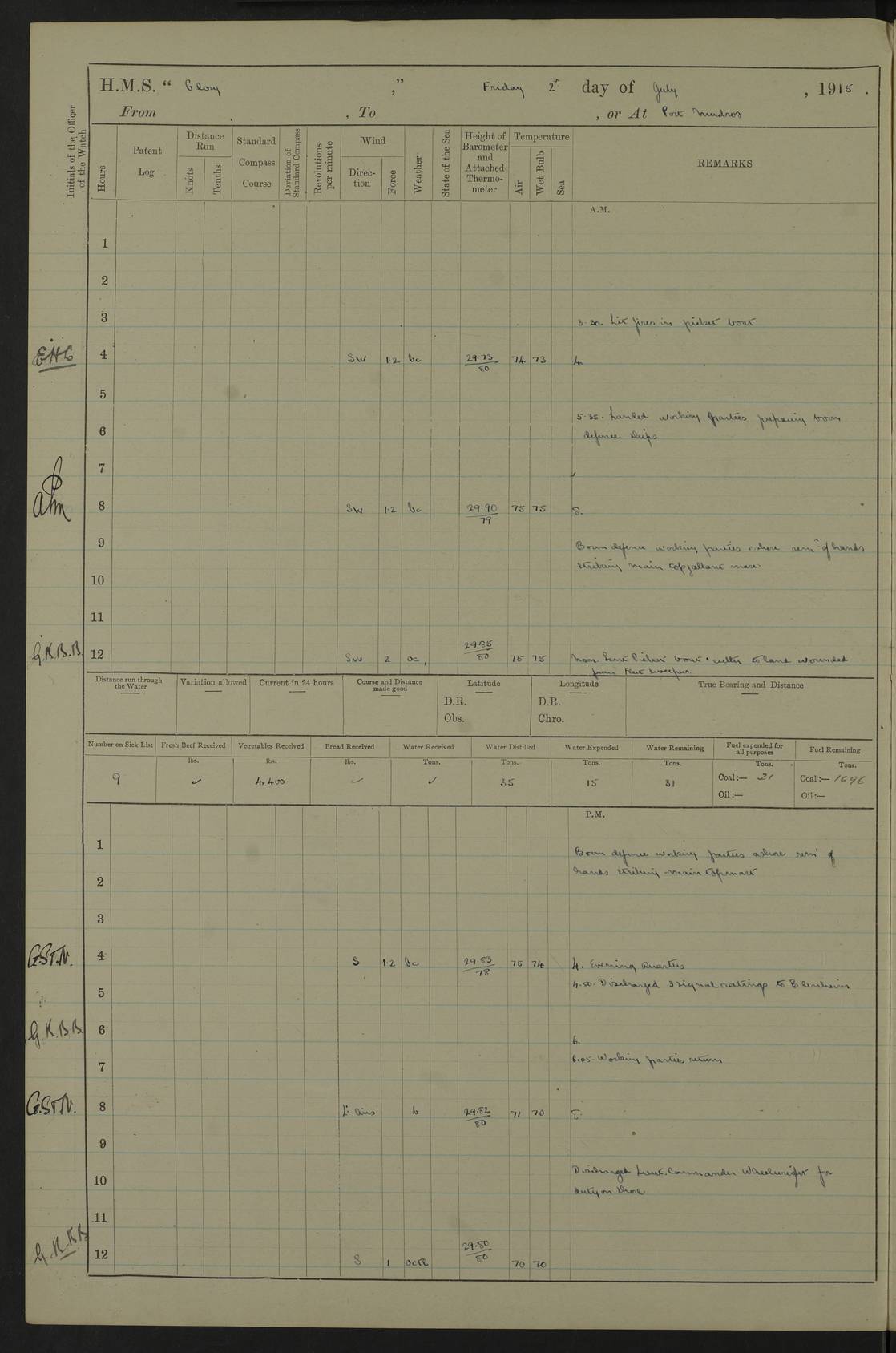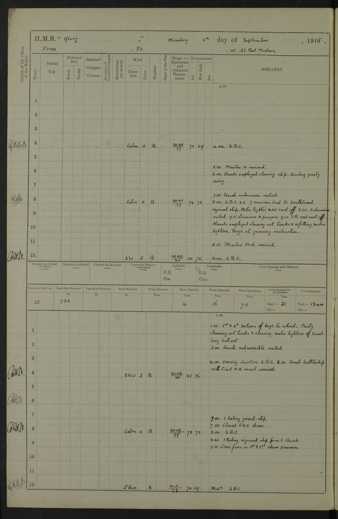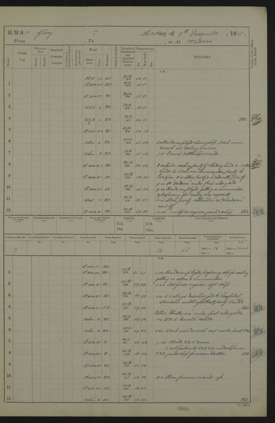 22 June 1915 At sea, Gibraltar to Lemnos Lat 36.1, Long -1.3 4.15am: Sighted land on starboard bow. 10.20am: Stopped port engine for repairs. 11.20am: proceeded with port engine. pm: a/c due to change in deviation. 10.00pm: Cape Tenez Light abeam, 18 miles. 4f73cd61a2fc8ea9030015f6: (https://s3.amazonaws.com:443/oldweather/ADM53-43015/0012_1.jpg) 23 June 1915 At sea, Gibraltar to Lemnos Lat 37.5, Long 4.8 Number on sick list: 4 5.00am: Secured from night defence stations. Placed anti-submarine guns. pm: Life saving appliances served out to men stationed in ? ?at abandon ship. 4f73cd61a2fc8ea9030015f7: (https://s3.amazonaws.com:443/oldweather/ADM53-43015/0013_0.jpg) 24 June 1915 At sea, Gibraltar to Lemnos Lat 37.4, Long 10.8 Position in log clearly bears no resemblance to the location of the ship. Position above is approximate and is based sighting of Zembra Island at 11.55am. 5.00am: Dispersed from night defence stations. Manned anti-submarine guns. am: Sighted two French torpedo boats. am: Torpedo boats passed to ~ No 362, 363. am: Sighted land on starboard beam. 11.55am: Zembra Island abeam, 25 miles. 2.00pm: Sighted Pantellaria S34ºE. 4.45pm: Pantellaria Light House abeam 12 miles. 4f73cd61a2fc8ea9030015f8: (https://s3.amazonaws.com:443/oldweather/ADM53-43015/0013_1.jpg) 25 June 1915 At sea, Gibraltar to Lemnos Lat 35.5, Long 16.7 2.10am: Gozo Light abeam 17 miles. 5.00am: Dispersed from night defence stations. Manned anti-submarine guns. 4f73cd61a2fc8ea9030015f9: (https://s3.amazonaws.com:443/oldweather/ADM53-43015/0014_0.jpg) 26 June 1915 At sea, Gibraltar to Lemnos Lat 35.5, Long 22.6 Number on sick list: 5 5.00am: Dispersed from night defence stations. Manned anti-submarine guns. am: Aired night clothing. am: marines at maxim practice on quarter deck. 2.00pm: Observed land on either bow. 3.00pm: Sighted French patrol destroyer. 4.15pm: Sighted French patrol destroyer. 9.40pm: Milo Peak N63ºW. 10.26pm: Polino Light abeam to port 5.5 miles. 4f73cd62a2fc8ea9030015fa: (https://s3.amazonaws.com:443/oldweather/ADM53-43015/0014_1.jpg) 27 June 1915 At sea and at Lemnos Lat 39.1, Long 24.4 From 0.50 to 3.05am sighting of multiple light houses. 3.50am: a/c to N39ºW and commenced to zig-zag. 5.00am: Dispersed from night defence stations and placed anti-submarine guns and look-outs. am: Lost overboard by accident Hazlewood fender, pat. 311, one in number. 10.30am: Held Divine Service onboard. pm: Met and signalled HMS Minerva on patrol duty. pm: Courses and speeds as requisite while waiting orders to approach Mudros. 3.00pm: Proceeded. 5.16pm: Increased to 90 revs, commenced to zig-zag. Course as requisite for Mudros. 7.00pm: Entered Mudros Bay. 7.47pm: Stopped. Let go port anchor in ‘M3’. 8.30pm: Darkened ship. pm: Manned one 6” and one 12 pdr. 4f73cd62a2fc8ea9030015fb: (https://s3.amazonaws.com:443/oldweather/ADM53-43015/0015_0.jpg) 28 June 1915 Mudros Bay, Lemnos Lat 39.89, Long 25.24 5,00am: HMS Vengeance entered harbour. HMS Vengeance was a pre-dreadnought of the Canopus class, launched in 1899 at Vickers, Barrow, and sold for scrapping in 1921. Details at http://en.wikipedia.org/wiki/HMS_Vengeance_(1899) . am/pm/: hands preparing for coaling and about ship’s work. pm: Collier Wabana secured alongside. 4f73cd62a2fc8ea9030015fc: (https://s3.amazonaws.com:443/oldweather/ADM53-43015/0015_1.jpg) 29 June 1915 Mudros Bay, Lemnos Lat 39.89, Long 25.24 5.15am: Commenced coaling. 2.00pm: Finished coaling. Collier left. 4f73cd62a2fc8ea9030015fd: (https://s3.amazonaws.com:443/oldweather/ADM53-43015/0016_0.jpg) 30 June 1915 Mudros Bay, Lemnos Lat 39.89, Long 25.24 am: Parties away sanding, and with fire engines onshore. am: Boats away disembarking troops. am: French Flagship Patrie sailed. The Patrie was a French pre-dreadnought, launched at La Seyne shipyard in 1903, and stricken in 1921. Details at http://en.wikipedia.org/wiki/French_battleship_Patrie . 6.30pm: Hands to bathe. 4f73cd63a2fc8ea9030015fe: (https://s3.amazonaws.com:443/oldweather/ADM53-43015/0016_1.jpg) 4f73cd63a2fc8ea9030015ff: (https://s3.amazonaws.com:443/oldweather/ADM53-43015/0017_0.jpg) 4f73cd63a2fc8ea903001600: (https://s3.amazonaws.com:443/oldweather/ADM53-43015/0017_1.jpg) 4f73cd63a2fc8ea903001601: (https://s3.amazonaws.com:443/oldweather/ADM53-43015/0018_0.jpg) 4f73cd64a2fc8ea903001602: (https://s3.amazonaws.com:443/oldweather/ADM53-43015/0018_1.jpg) LOGS FOR JULY 1915 From July to October 1915, HMS Glory spent her time at Port Mudros. Certain activities typically took place daily and are not generally noted in the pages below. These activities include: Lighting fires in the picket boat around 4am and drawing the fires in the late evening; Divisions at around 9–9.30am and Evening Quarters at 4pm; Darken ship at around 8.30pm; Daily ‘cleaning ship’, with variations thereof; SBC (for ‘Signal Books Correct’) at the watch changes. 4f73cd64a2fc8ea903001603: (https://s3.amazonaws.com:443/oldweather/ADM53-43016/0000_0.jpg) 4f73cd64a2fc8ea903001604: (https://s3.amazonaws.com:443/oldweather/ADM53-43016/0000_1.jpg) 4f73cd65a2fc8ea903001605: (https://s3.amazonaws.com:443/oldweather/ADM53-43016/0001_0.jpg) 4f73cd65a2fc8ea903001606: (https://s3.amazonaws.com:443/oldweather/ADM53-43016/0001_1.jpg) 1 July 1915 Port Mudros Lat 39.89, Long 25.24 6.30am: Landed working parties preparing boom defence ships. am: Discharged Acting Commander Rayne to Hector. Hector was a kite balloon ship. No further details readily available. 5.00pm: Tug T.10 made fast astern. 7.15pm: HMS Venerable went out. 7.30pm: HMS Chatham went out. HMS Chatham was a ‘Town’ cruiser and lead ship of her class. She was launched in 1911 at Chatham Dockyard and sold in 1926. Details at http://en.wikipedia.org/wiki/HMS_Chatham_(1911) . 4f73cd65a2fc8ea903001607: (https://s3.amazonaws.com:443/oldweather/ADM53-43016/0002_0.jpg) 2 July 1915 Port Mudros Lat 39.89, Long 25.24 5.35am: Landed working parties preparing boom defence ships. am/pm: Boom defence par