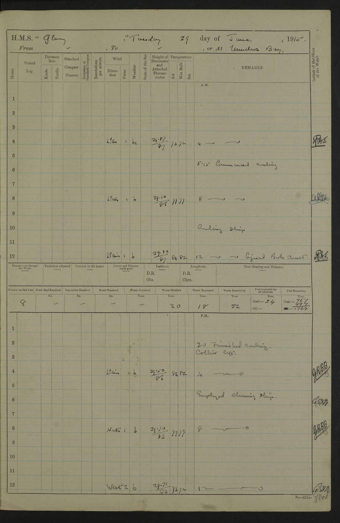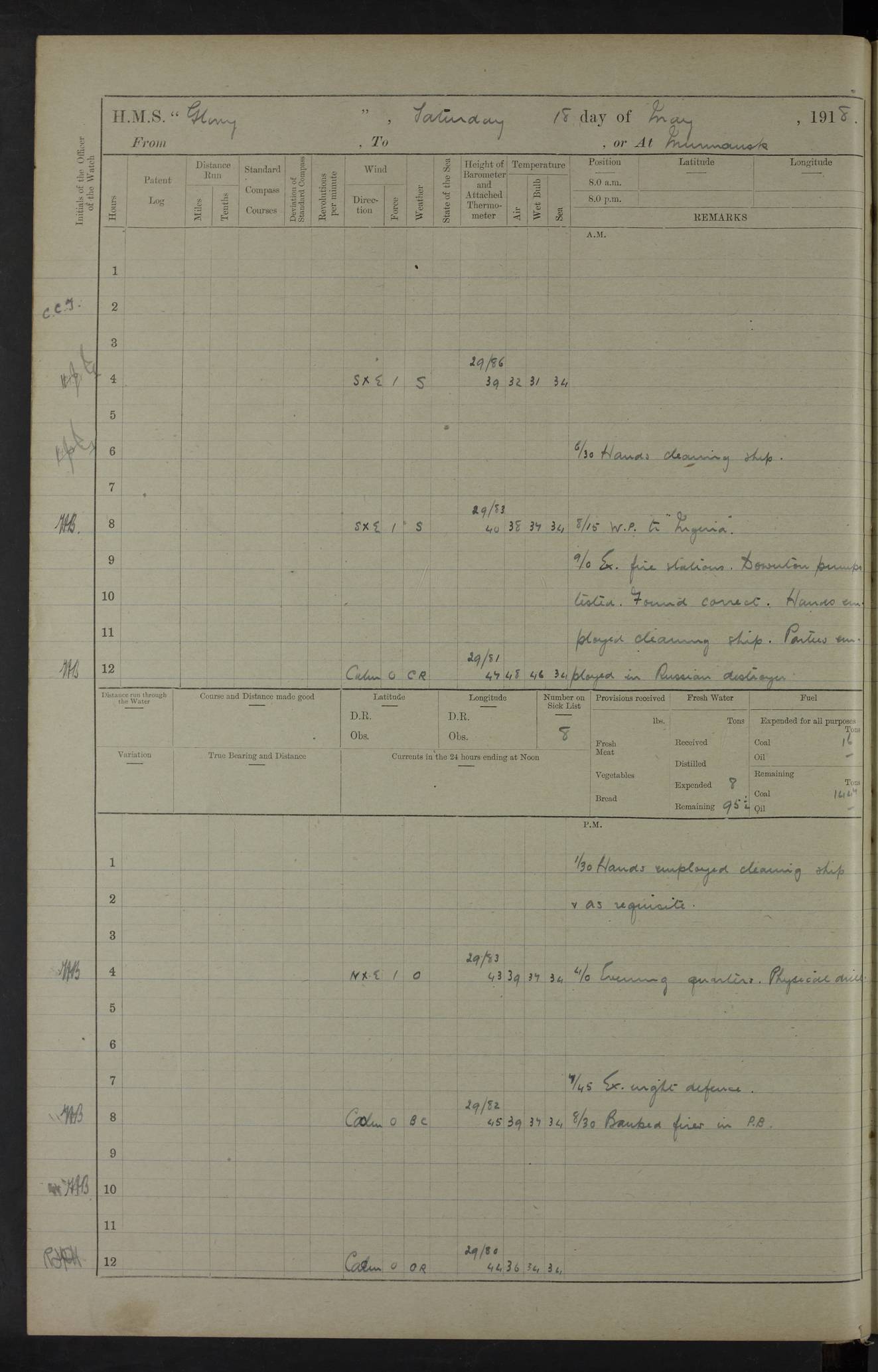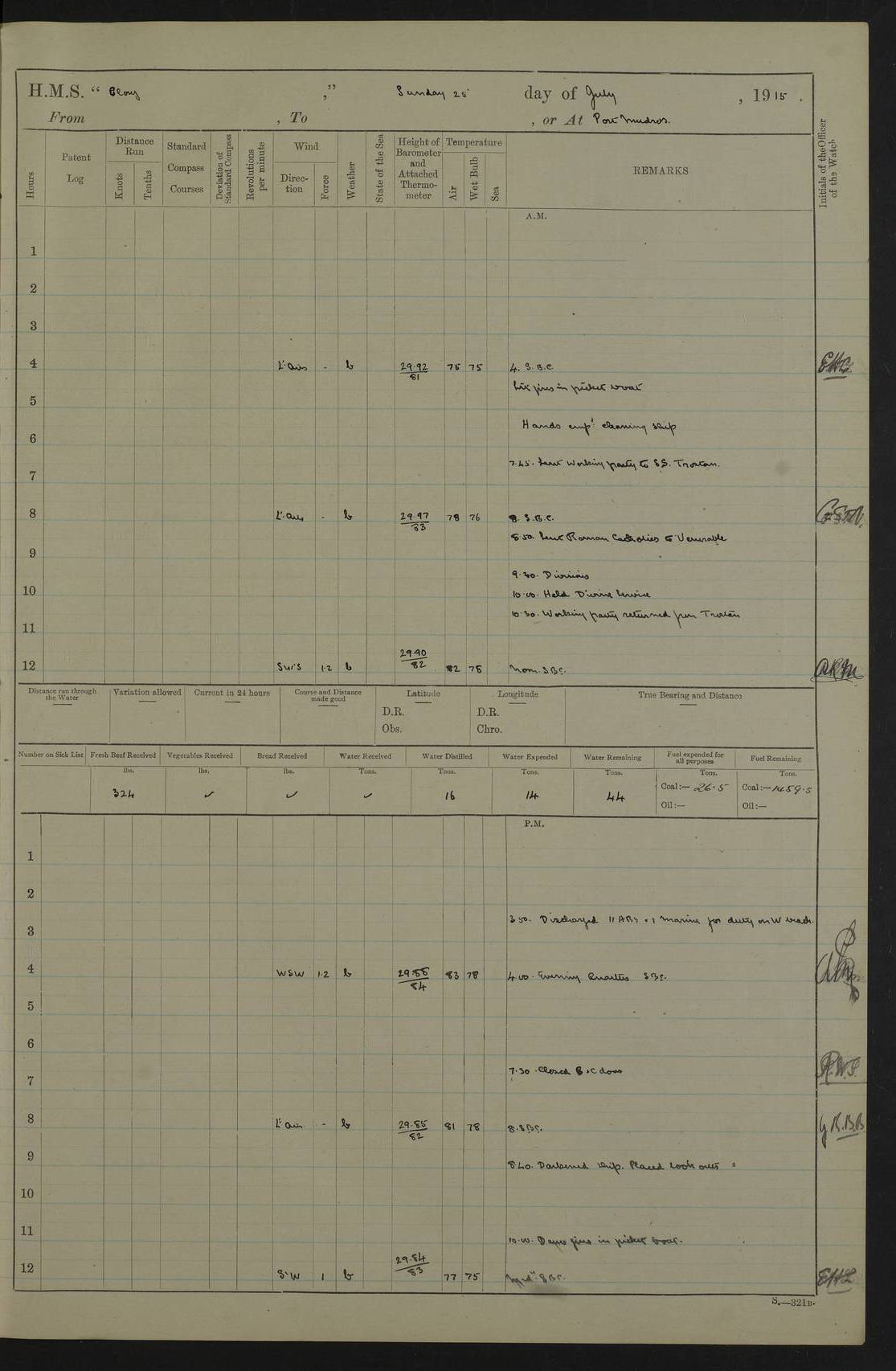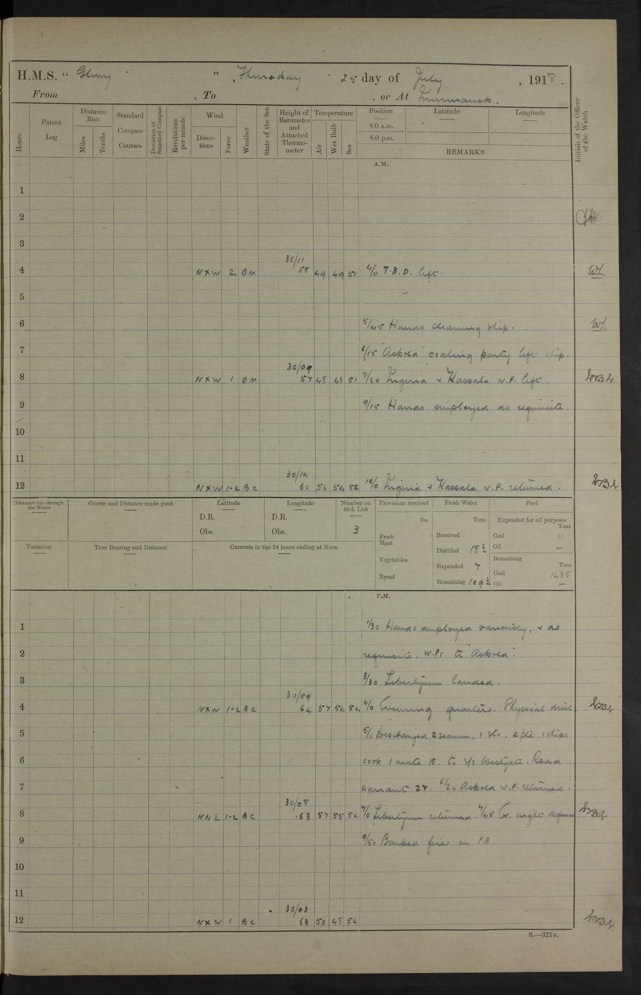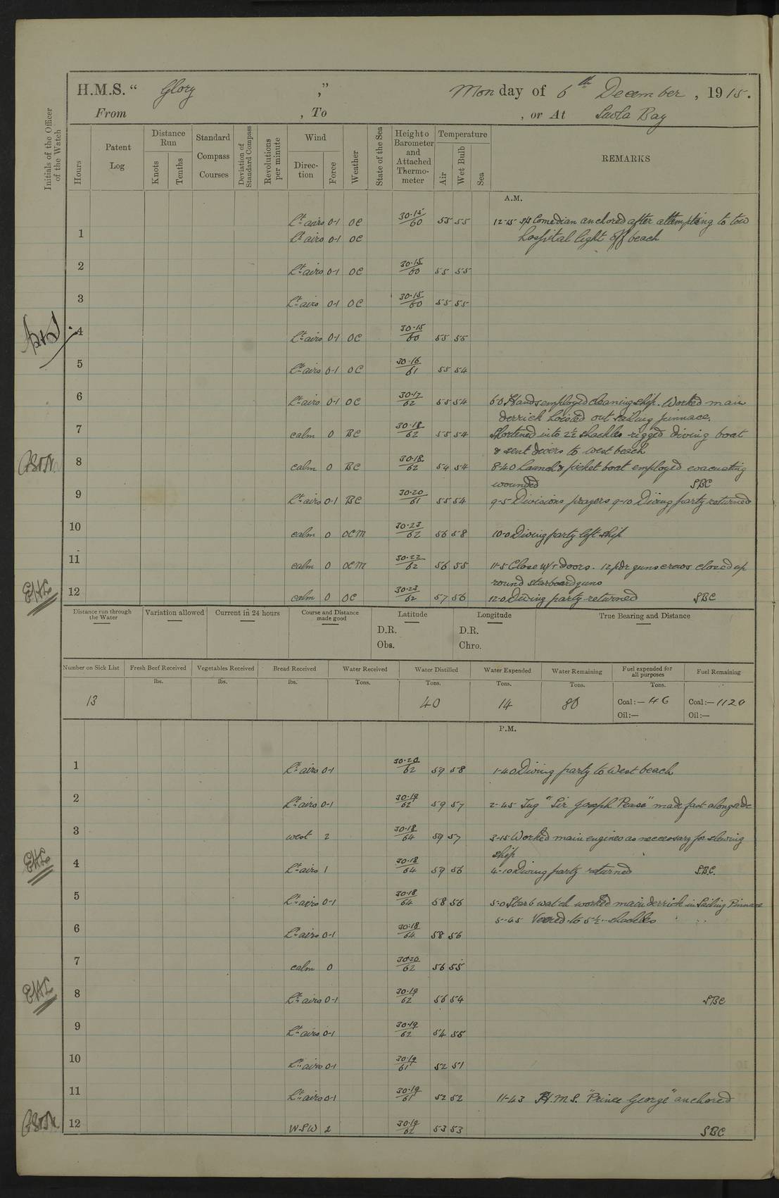 22 June 1915 At sea, Gibraltar to Lemnos Lat 36.1, Long -1.3 4.15am: Sighted land on starboard bow. 10.20am: Stopped port engine for repairs. 11.20am: proceeded with port engine. pm: a/c due to change in deviation. 10.00pm: Cape Tenez Light abeam, 18 miles. 4f73cd61a2fc8ea9030015f6: (https://s3.amazonaws.com:443/oldweather/ADM53-43015/0012_1.jpg) 23 June 1915 At sea, Gibraltar to Lemnos Lat 37.5, Long 4.8 Number on sick list: 4 5.00am: Secured from night defence stations. Placed anti-submarine guns. pm: Life saving appliances served out to men stationed in ? ?at abandon ship. 4f73cd61a2fc8ea9030015f7: (https://s3.amazonaws.com:443/oldweather/ADM53-43015/0013_0.jpg) 24 June 1915 At sea, Gibraltar to Lemnos Lat 37.4, Long 10.8 Position in log clearly bears no resemblance to the location of the ship. Position above is approximate and is based sighting of Zembra Island at 11.55am. 5.00am: Dispersed from night defence stations. Manned anti-submarine guns. am: Sighted two French torpedo boats. am: Torpedo boats passed to ~ No 362, 363. am: Sighted land on starboard beam. 11.55am: Zembra Island abeam, 25 miles. 2.00pm: Sighted Pantellaria S34ºE. 4.45pm: Pantellaria Light House abeam 12 miles. 4f73cd61a2fc8ea9030015f8: (https://s3.amazonaws.com:443/oldweather/ADM53-43015/0013_1.jpg) 25 June 1915 At sea, Gibraltar to Lemnos Lat 35.5, Long 16.7 2.10am: Gozo Light abeam 17 miles. 5.00am: Dispersed from night defence stations. Manned anti-submarine guns. 4f73cd61a2fc8ea9030015f9: (https://s3.amazonaws.com:443/oldweather/ADM53-43015/0014_0.jpg) 26 June 1915 At sea, Gibraltar to Lemnos Lat 35.5, Long 22.6 Number on sick list: 5 5.00am: Dispersed from night defence stations. Manned anti-submarine guns. am: Aired night clothing. am: marines at maxim practice on quarter deck. 2.00pm: Observed land on either bow. 3.00pm: Sighted French patrol destroyer. 4.15pm: Sighted French patrol destroyer. 9.40pm: Milo Peak N63ºW. 10.26pm: Polino Light abeam to port 5.5 miles. 4f73cd62a2fc8ea9030015fa: (https://s3.amazonaws.com:443/oldweather/ADM53-43015/0014_1.jpg) 27 June 1915 At sea and at Lemnos Lat 39.1, Long 24.4 From 0.50 to 3.05am sighting of multiple light houses. 3.50am: a/c to N39ºW and commenced to zig-zag. 5.00am: Dispersed from night defence stations and placed anti-submarine guns and look-outs. am: Lost overboard by accident Hazlewood fender, pat. 311, one in number. 10.30am: Held Divine Service onboard. pm: Met and signalled HMS Minerva on patrol duty. pm: Courses and speeds as requisite while waiting orders to approach Mudros. 3.00pm: Proceeded. 5.16pm: Increased to 90 revs, commenced to zig-zag. Course as requisite for Mudros. 7.00pm: Entered Mudros Bay. 7.47pm: Stopped. Let go port anchor in ‘M3’. 8.30pm: Darkened ship. pm: Manned one 6” and one 12 pdr. 4f73cd62a2fc8ea9030015fb: (https://s3.amazonaws.com:443/oldweather/ADM53-43015/0015_0.jpg) 28 June 1915 Mudros Bay, Lemnos Lat 39.89, Long 25.24 5,00am: HMS Vengeance entered harbour. HMS Vengeance was a pre-dreadnought of the Canopus class, launched in 1899 at Vickers, Barrow, and sold for scrapping in 1921. Details at http://en.wikipedia.org/wiki/HMS_Vengeance_(1899) . am/pm/: hands preparing for coaling and about ship’s work. pm: Collier Wabana secured alongside. 4f73cd62a2fc8ea9030015fc: (https://s3.amazonaws.com:443/oldweather/ADM53-43015/0015_1.jpg) 29 June 1915 Mudros Bay, Lemnos Lat 39.89, Long 25.24 5.15am: Commenced coaling. 2.00pm: Finished coaling. Collier left. 4f73cd62a2fc8ea9030015fd: (https://s3.amazonaws.com:443/oldweather/ADM53-43015/0016_0.jpg) 30 June 1915 Mudros Bay, Lemnos Lat 39.89, Long 25.24 am: Parties away sanding, and with fire engines onshore. am: Boats away disembarking troops. am: French Flagship Patrie sailed. The Patrie was a French pre-dreadnought, launched at La Seyne shipyard in 1903, and stricken in 1921. Details at http://en.wikipedia.org/wiki/French_battleship_Patrie . 6.30pm: Hands to bathe. 4f73cd63a2fc8ea9030015fe: (https://s3.amazonaws.com:443/oldweather/ADM53-43015/0016_1.jpg) 4f73cd63a2fc8ea9030015ff: (https://s3.amazonaws.com:443/oldweather/ADM53-43015/0017_0.jpg) 4f73cd63a2fc8ea903001600: (https://s3.amazonaws.com:443/oldweather/ADM53-43015/0017_1.jpg) 4f73cd63a2fc8ea903001601: (https://s3.amazonaws.com:443/oldweather/ADM53-43015/0018_0.jpg) 4f73cd64a2fc8ea903001602: (https://s3.amazonaws.com:443/oldweather/ADM53-43015/0018_1.jpg) LOGS FOR JULY 1915 From July to October 1915, HMS Glory spent her time at Port Mudros. Certain activities typically took place daily and are not generally noted in the pages below. These activities include: Lighting fires in the picket boat around 4am and drawing the fires in the late evening; Divisions at around 9–9.30am and Evening Quarters at 4pm; Darken ship at around 8.30pm; Daily ‘cleaning ship’, with variations thereof; SBC (for ‘Signal Books Correct’) at the watch changes. 4f73cd64a2fc8ea903001603: (https://s3.amazonaws.com:443/oldweather/ADM53-43016/0000_0.jpg) 4f73cd64a2fc8ea903001604: (https://s3.amazonaws.com:443/oldweather/ADM53-43016/0000_1.jpg) 4f73cd65a2fc8ea903001605: (https://s3.amazonaws.com:443/oldweather/ADM53-43016/0001_0.jpg) 4f73cd65a2fc8ea903001606: (https://s3.amazonaws.com:443/oldweather/ADM53-43016/0001_1.jpg) 1 July 1915 Port Mudros Lat 39.89, Long 25.24 6.30am: Landed working parties preparing boom defence ships. am: Discharged Acting Commander Rayne to Hector. Hector was a kite balloon ship. No further details readily available. 5.00pm: Tug T.10 made fast astern. 7.15pm: HMS Venerable went out. 7.30pm: HMS Chatham went out. HMS Chatham was a ‘Town’ cruiser and lead ship of her class. She was launched in 1911 at Chatham Dockyard and sold in 1926. Details at http://en.wikipedia.org/wiki/HMS_Chatham_(1911) . 4f73cd65a2fc8ea903001607: (https://s3.amazonaws.com:443/oldweather/ADM53-43016/0002_0.jpg) 2 July 1915 Port Mudros Lat 39.89, Long 25.24 5.35am: Landed working parties preparing boom defence ships. am/pm: Boom defence par