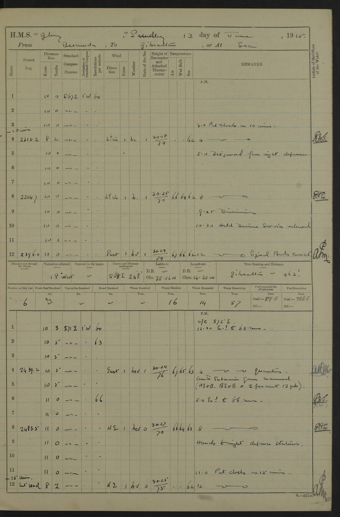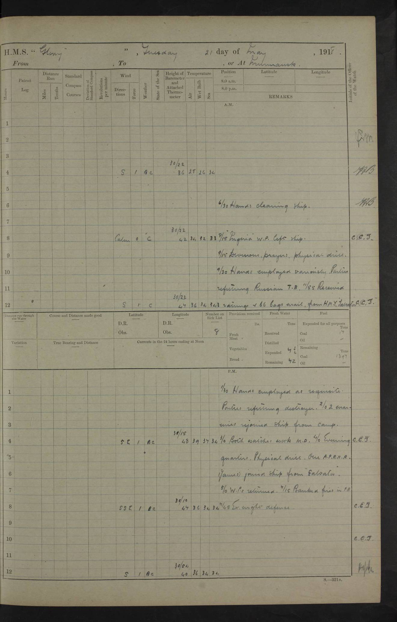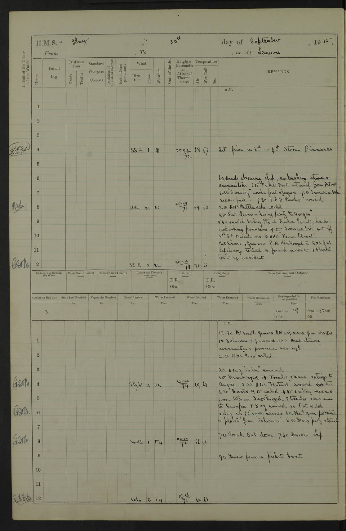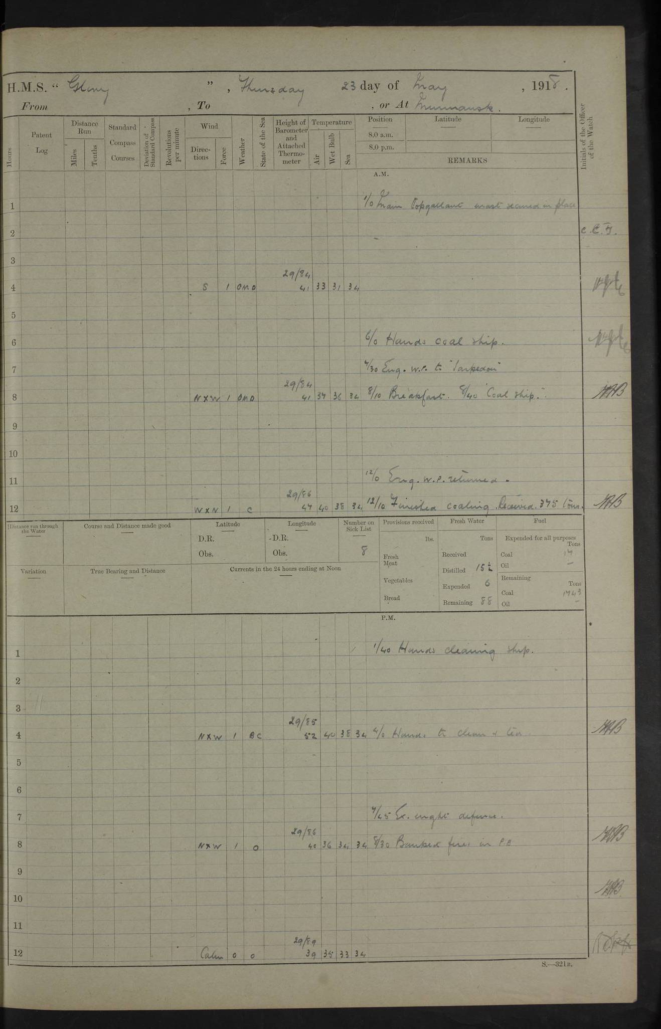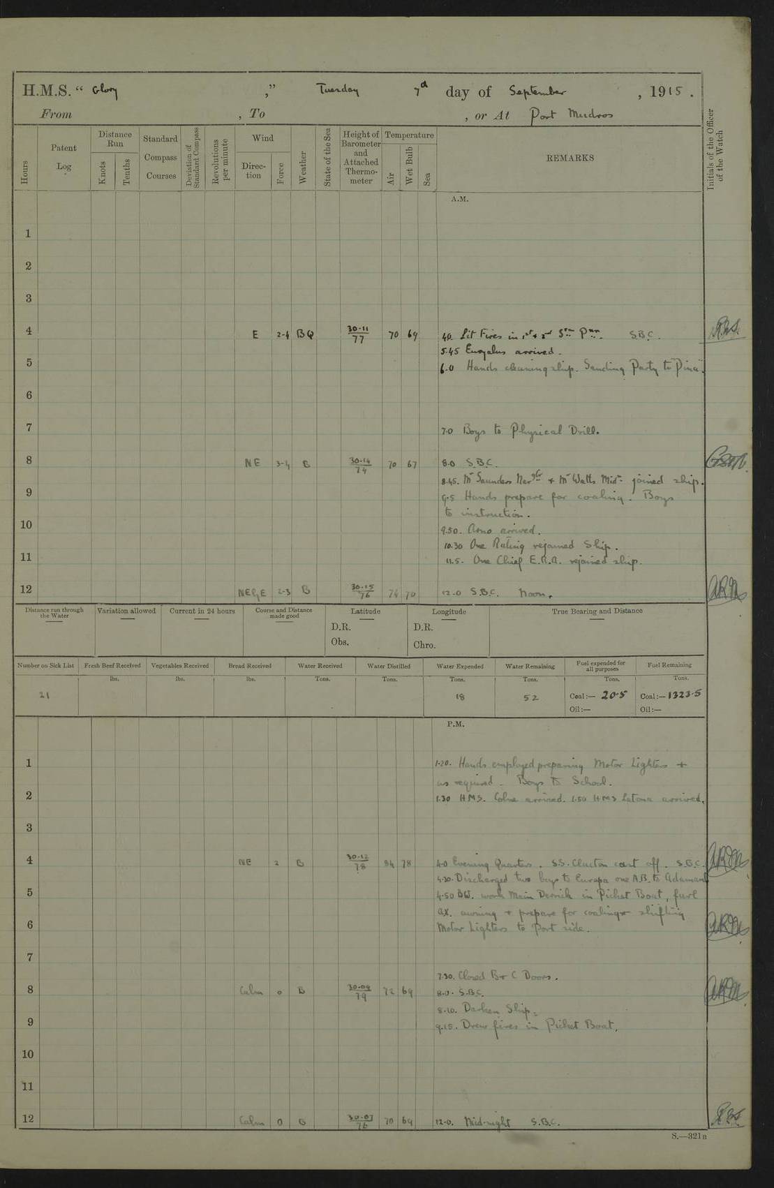 22 June 1915 At sea, Gibraltar to Lemnos Lat 36.1, Long -1.3 4.15am: Sighted land on starboard bow. 10.20am: Stopped port engine for repairs. 11.20am: proceeded with port engine. pm: a/c due to change in deviation. 10.00pm: Cape Tenez Light abeam, 18 miles. 4f73cd61a2fc8ea9030015f6: (https://s3.amazonaws.com:443/oldweather/ADM53-43015/0012_1.jpg) 23 June 1915 At sea, Gibraltar to Lemnos Lat 37.5, Long 4.8 Number on sick list: 4 5.00am: Secured from night defence stations. Placed anti-submarine guns. pm: Life saving appliances served out to men stationed in ? ?at abandon ship. 4f73cd61a2fc8ea9030015f7: (https://s3.amazonaws.com:443/oldweather/ADM53-43015/0013_0.jpg) 24 June 1915 At sea, Gibraltar to Lemnos Lat 37.4, Long 10.8 Position in log clearly bears no resemblance to the location of the ship. Position above is approximate and is based sighting of Zembra Island at 11.55am. 5.00am: Dispersed from night defence stations. Manned anti-submarine guns. am: Sighted two French torpedo boats. am: Torpedo boats passed to ~ No 362, 363. am: Sighted land on starboard beam. 11.55am: Zembra Island abeam, 25 miles. 2.00pm: Sighted Pantellaria S34ºE. 4.45pm: Pantellaria Light House abeam 12 miles. 4f73cd61a2fc8ea9030015f8: (https://s3.amazonaws.com:443/oldweather/ADM53-43015/0013_1.jpg) 25 June 1915 At sea, Gibraltar to Lemnos Lat 35.5, Long 16.7 2.10am: Gozo Light abeam 17 miles. 5.00am: Dispersed from night defence stations. Manned anti-submarine guns. 4f73cd61a2fc8ea9030015f9: (https://s3.amazonaws.com:443/oldweather/ADM53-43015/0014_0.jpg) 26 June 1915 At sea, Gibraltar to Lemnos Lat 35.5, Long 22.6 Number on sick list: 5 5.00am: Dispersed from night defence stations. Manned anti-submarine guns. am: Aired night clothing. am: marines at maxim practice on quarter deck. 2.00pm: Observed land on either bow. 3.00pm: Sighted French patrol destroyer. 4.15pm: Sighted French patrol destroyer. 9.40pm: Milo Peak N63ºW. 10.26pm: Polino Light abeam to port 5.5 miles. 4f73cd62a2fc8ea9030015fa: (https://s3.amazonaws.com:443/oldweather/ADM53-43015/0014_1.jpg) 27 June 1915 At sea and at Lemnos Lat 39.1, Long 24.4 From 0.50 to 3.05am sighting of multiple light houses. 3.50am: a/c to N39ºW and commenced to zig-zag. 5.00am: Dispersed from night defence stations and placed anti-submarine guns and look-outs. am: Lost overboard by accident Hazlewood fender, pat. 311, one in number. 10.30am: Held Divine Service onboard. pm: Met and signalled HMS Minerva on patrol duty. pm: Courses and speeds as requisite while waiting orders to approach Mudros. 3.00pm: Proceeded. 5.16pm: Increased to 90 revs, commenced to zig-zag. Course as requisite for Mudros. 7.00pm: Entered Mudros Bay. 7.47pm: Stopped. Let go port anchor in ‘M3’. 8.30pm: Darkened ship. pm: Manned one 6” and one 12 pdr. 4f73cd62a2fc8ea9030015fb: (https://s3.amazonaws.com:443/oldweather/ADM53-43015/0015_0.jpg) 28 June 1915 Mudros Bay, Lemnos Lat 39.89, Long 25.24 5,00am: HMS Vengeance entered harbour. HMS Vengeance was a pre-dreadnought of the Canopus class, launched in 1899 at Vickers, Barrow, and sold for scrapping in 1921. Details at http://en.wikipedia.org/wiki/HMS_Vengeance_(1899) . am/pm/: hands preparing for coaling and about ship’s work. pm: Collier Wabana secured alongside. 4f73cd62a2fc8ea9030015fc: (https://s3.amazonaws.com:443/oldweather/ADM53-43015/0015_1.jpg) 29 June 1915 Mudros Bay, Lemnos Lat 39.89, Long 25.24 5.15am: Commenced coaling. 2.00pm: Finished coaling. Collier left. 4f73cd62a2fc8ea9030015fd: (https://s3.amazonaws.com:443/oldweather/ADM53-43015/0016_0.jpg) 30 June 1915 Mudros Bay, Lemnos Lat 39.89, Long 25.24 am: Parties away sanding, and with fire engines onshore. am: Boats away disembarking troops. am: French Flagship Patrie sailed. The Patrie was a French pre-dreadnought, launched at La Seyne shipyard in 1903, and stricken in 1921. Details at http://en.wikipedia.org/wiki/French_battleship_Patrie . 6.30pm: Hands to bathe. 4f73cd63a2fc8ea9030015fe: (https://s3.amazonaws.com:443/oldweather/ADM53-43015/0016_1.jpg) 4f73cd63a2fc8ea9030015ff: (https://s3.amazonaws.com:443/oldweather/ADM53-43015/0017_0.jpg) 4f73cd63a2fc8ea903001600: (https://s3.amazonaws.com:443/oldweather/ADM53-43015/0017_1.jpg) 4f73cd63a2fc8ea903001601: (https://s3.amazonaws.com:443/oldweather/ADM53-43015/0018_0.jpg) 4f73cd64a2fc8ea903001602: (https://s3.amazonaws.com:443/oldweather/ADM53-43015/0018_1.jpg) LOGS FOR JULY 1915 From July to October 1915, HMS Glory spent her time at Port Mudros. Certain activities typically took place daily and are not generally noted in the pages below. These activities include: Lighting fires in the picket boat around 4am and drawing the fires in the late evening; Divisions at around 9–9.30am and Evening Quarters at 4pm; Darken ship at around 8.30pm; Daily ‘cleaning ship’, with variations thereof; SBC (for ‘Signal Books Correct’) at the watch changes. 4f73cd64a2fc8ea903001603: (https://s3.amazonaws.com:443/oldweather/ADM53-43016/0000_0.jpg) 4f73cd64a2fc8ea903001604: (https://s3.amazonaws.com:443/oldweather/ADM53-43016/0000_1.jpg) 4f73cd65a2fc8ea903001605: (https://s3.amazonaws.com:443/oldweather/ADM53-43016/0001_0.jpg) 4f73cd65a2fc8ea903001606: (https://s3.amazonaws.com:443/oldweather/ADM53-43016/0001_1.jpg) 1 July 1915 Port Mudros Lat 39.89, Long 25.24 6.30am: Landed working parties preparing boom defence ships. am: Discharged Acting Commander Rayne to Hector. Hector was a kite balloon ship. No further details readily available. 5.00pm: Tug T.10 made fast astern. 7.15pm: HMS Venerable went out. 7.30pm: HMS Chatham went out. HMS Chatham was a ‘Town’ cruiser and lead ship of her class. She was launched in 1911 at Chatham Dockyard and sold in 1926. Details at http://en.wikipedia.org/wiki/HMS_Chatham_(1911) . 4f73cd65a2fc8ea903001607: (https://s3.amazonaws.com:443/oldweather/ADM53-43016/0002_0.jpg) 2 July 1915 Port Mudros Lat 39.89, Long 25.24 5.35am: Landed working parties preparing boom defence ships. am/pm: Boom defence par