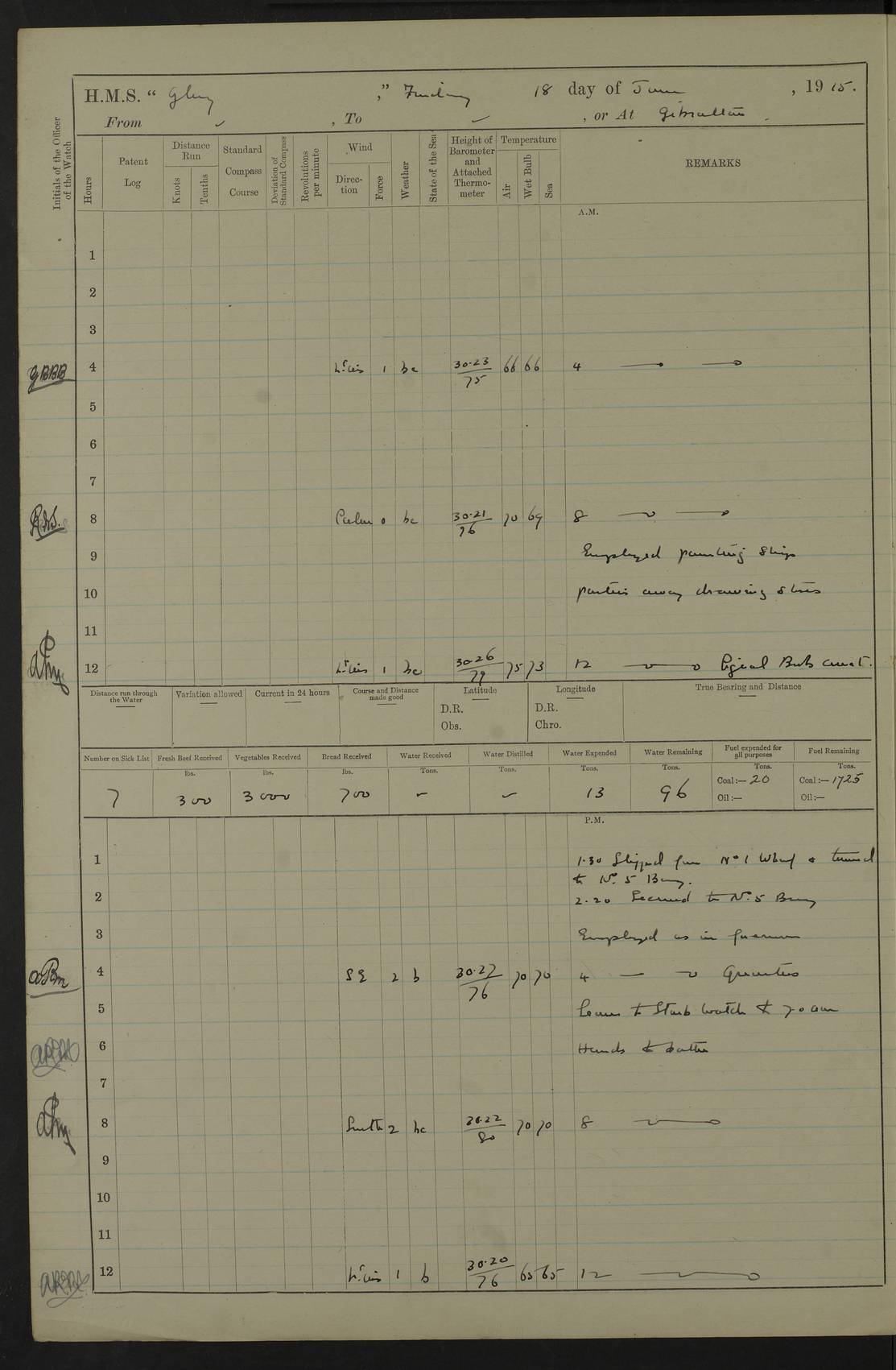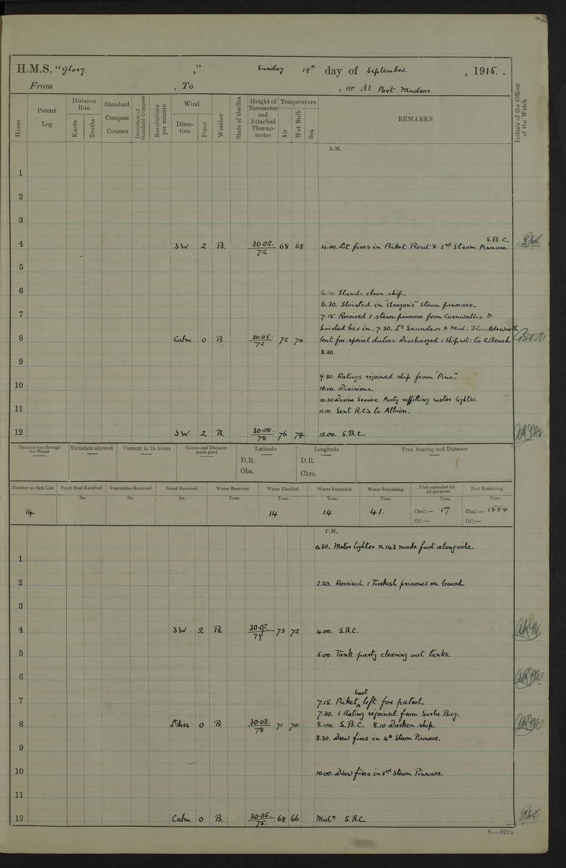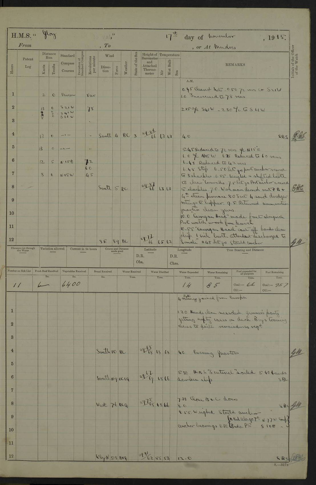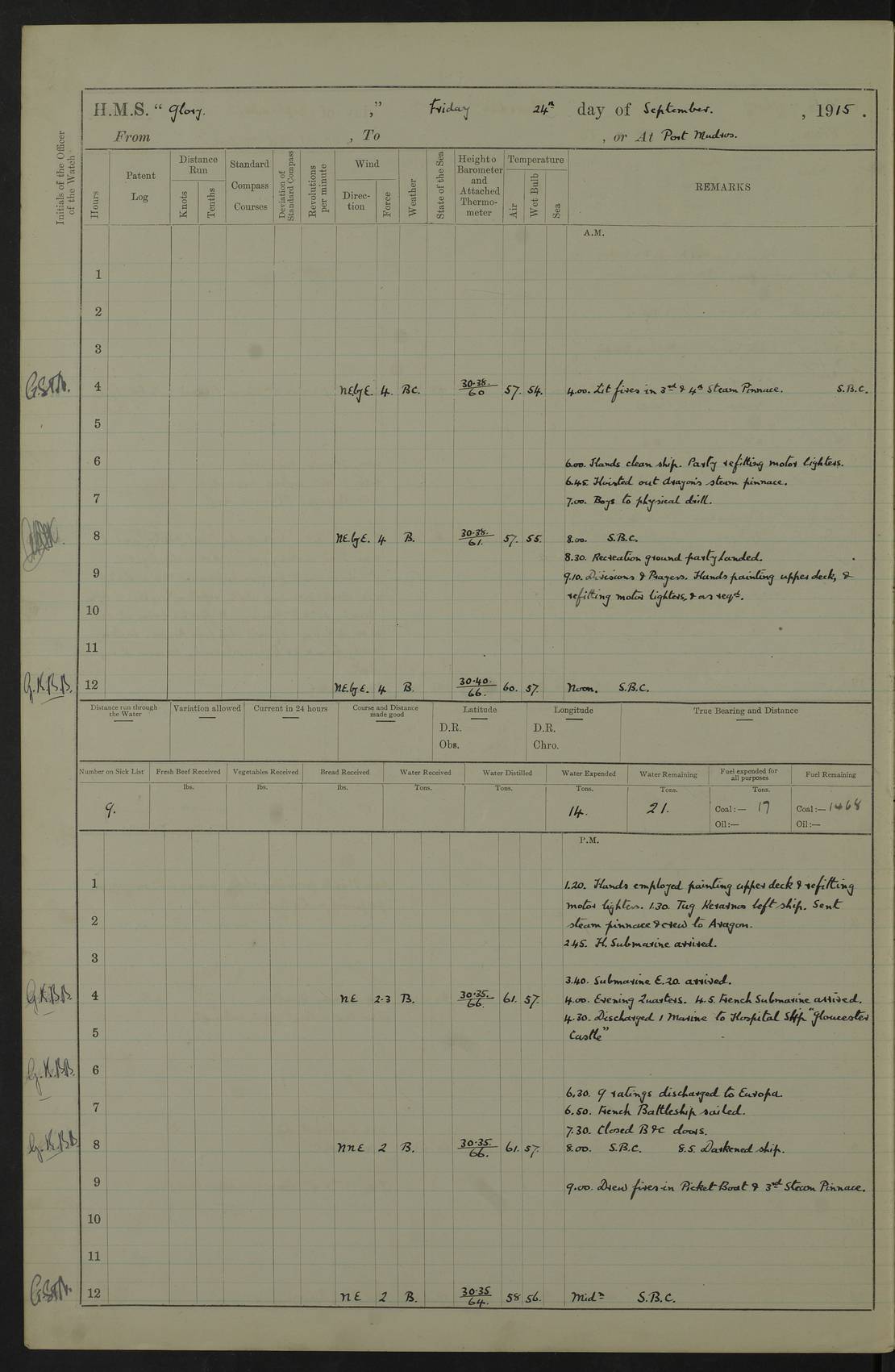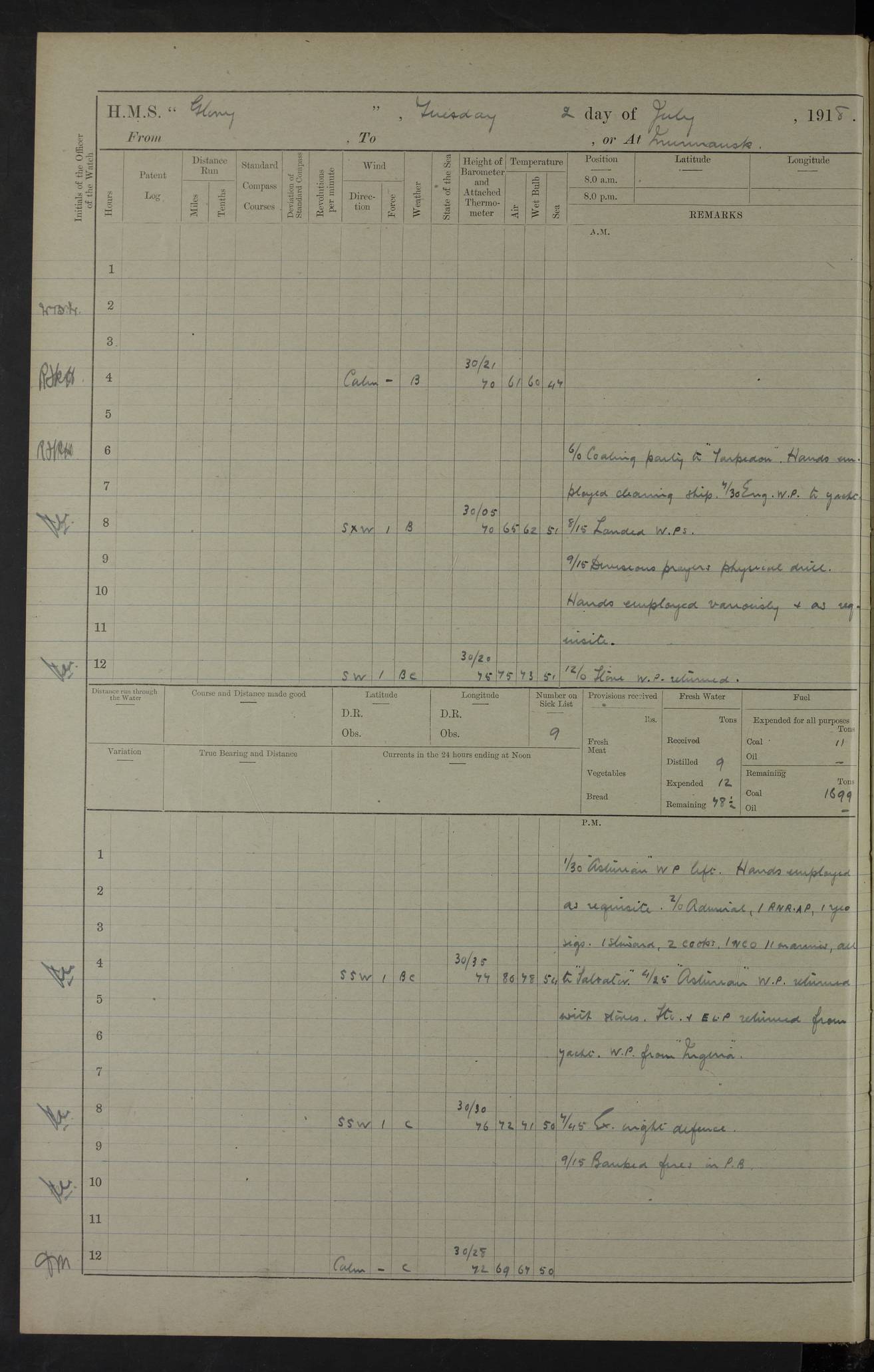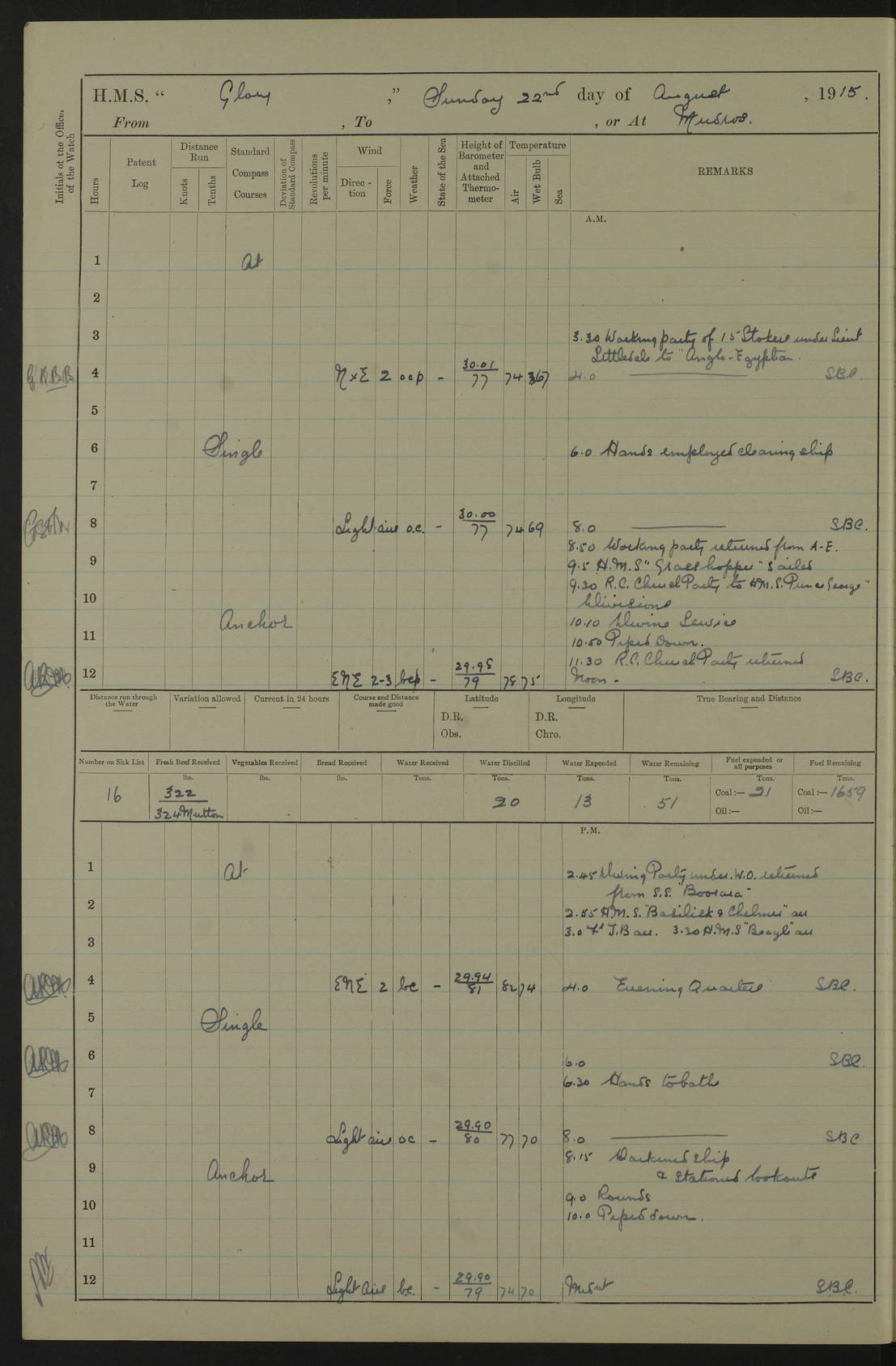22 June 1915 At sea, Gibraltar to Lemnos Lat 36.1, Long -1.3 4.15am: Sighted land on starboard bow. 10.20am: Stopped port engine for repairs. 11.20am: proceeded with port engine. pm: a/c due to change in deviation. 10.00pm: Cape Tenez Light abeam, 18 miles. 4f73cd61a2fc8ea9030015f6: (https://s3.amazonaws.com:443/oldweather/ADM53-43015/0012_1.jpg) 23 June 1915 At sea, Gibraltar to Lemnos Lat 37.5, Long 4.8 Number on sick list: 4 5.00am: Secured from night defence stations. Placed anti-submarine guns. pm: Life saving appliances served out to men stationed in ? ?at abandon ship. 4f73cd61a2fc8ea9030015f7: (https://s3.amazonaws.com:443/oldweather/ADM53-43015/0013_0.jpg) 24 June 1915 At sea, Gibraltar to Lemnos Lat 37.4, Long 10.8 Position in log clearly bears no resemblance to the location of the ship. Position above is approximate and is based sighting of Zembra Island at 11.55am. 5.00am: Dispersed from night defence stations. Manned anti-submarine guns. am: Sighted two French torpedo boats. am: Torpedo boats passed to ~ No 362, 363. am: Sighted land on starboard beam. 11.55am: Zembra Island abeam, 25 miles. 2.00pm: Sighted Pantellaria S34ºE. 4.45pm: Pantellaria Light House abeam 12 miles. 4f73cd61a2fc8ea9030015f8: (https://s3.amazonaws.com:443/oldweather/ADM53-43015/0013_1.jpg) 25 June 1915 At sea, Gibraltar to Lemnos Lat 35.5, Long 16.7 2.10am: Gozo Light abeam 17 miles. 5.00am: Dispersed from night defence stations. Manned anti-submarine guns. 4f73cd61a2fc8ea9030015f9: (https://s3.amazonaws.com:443/oldweather/ADM53-43015/0014_0.jpg) 26 June 1915 At sea, Gibraltar to Lemnos Lat 35.5, Long 22.6 Number on sick list: 5 5.00am: Dispersed from night defence stations. Manned anti-submarine guns. am: Aired night clothing. am: marines at maxim practice on quarter deck. 2.00pm: Observed land on either bow. 3.00pm: Sighted French patrol destroyer. 4.15pm: Sighted French patrol destroyer. 9.40pm: Milo Peak N63ºW. 10.26pm: Polino Light abeam to port 5.5 miles. 4f73cd62a2fc8ea9030015fa: (https://s3.amazonaws.com:443/oldweather/ADM53-43015/0014_1.jpg) 27 June 1915 At sea and at Lemnos Lat 39.1, Long 24.4 From 0.50 to 3.05am sighting of multiple light houses. 3.50am: a/c to N39ºW and commenced to zig-zag. 5.00am: Dispersed from night defence stations and placed anti-submarine guns and look-outs. am: Lost overboard by accident Hazlewood fender, pat. 311, one in number. 10.30am: Held Divine Service onboard. pm: Met and signalled HMS Minerva on patrol duty. pm: Courses and speeds as requisite while waiting orders to approach Mudros. 3.00pm: Proceeded. 5.16pm: Increased to 90 revs, commenced to zig-zag. Course as requisite for Mudros. 7.00pm: Entered Mudros Bay. 7.47pm: Stopped. Let go port anchor in ‘M3’. 8.30pm: Darkened ship. pm: Manned one 6” and one 12 pdr. 4f73cd62a2fc8ea9030015fb: (https://s3.amazonaws.com:443/oldweather/ADM53-43015/0015_0.jpg) 28 June 1915 Mudros Bay, Lemnos Lat 39.89, Long 25.24 5,00am: HMS Vengeance entered harbour. HMS Vengeance was a pre-dreadnought of the Canopus class, launched in 1899 at Vickers, Barrow, and sold for scrapping in 1921. Details at http://en.wikipedia.org/wiki/HMS_Vengeance_(1899) . am/pm/: hands preparing for coaling and about ship’s work. pm: Collier Wabana secured alongside. 4f73cd62a2fc8ea9030015fc: (https://s3.amazonaws.com:443/oldweather/ADM53-43015/0015_1.jpg) 29 June 1915 Mudros Bay, Lemnos Lat 39.89, Long 25.24 5.15am: Commenced coaling. 2.00pm: Finished coaling. Collier left. 4f73cd62a2fc8ea9030015fd: (https://s3.amazonaws.com:443/oldweather/ADM53-43015/0016_0.jpg) 30 June 1915 Mudros Bay, Lemnos Lat 39.89, Long 25.24 am: Parties away sanding, and with fire engines onshore. am: Boats away disembarking troops. am: French Flagship Patrie sailed. The Patrie was a French pre-dreadnought, launched at La Seyne shipyard in 1903, and stricken in 1921. Details at http://en.wikipedia.org/wiki/French_battleship_Patrie . 6.30pm: Hands to bathe. 4f73cd63a2fc8ea9030015fe: (https://s3.amazonaws.com:443/oldweather/ADM53-43015/0016_1.jpg) 4f73cd63a2fc8ea9030015ff: (https://s3.amazonaws.com:443/oldweather/ADM53-43015/0017_0.jpg) 4f73cd63a2fc8ea903001600: (https://s3.amazonaws.com:443/oldweather/ADM53-43015/0017_1.jpg) 4f73cd63a2fc8ea903001601: (https://s3.amazonaws.com:443/oldweather/ADM53-43015/0018_0.jpg) 4f73cd64a2fc8ea903001602: (https://s3.amazonaws.com:443/oldweather/ADM53-43015/0018_1.jpg) LOGS FOR JULY 1915 From July to October 1915, HMS Glory spent her time at Port Mudros. Certain activities typically took place daily and are not generally noted in the pages below. These activities include: Lighting fires in the picket boat around 4am and drawing the fires in the late evening; Divisions at around 9–9.30am and Evening Quarters at 4pm; Darken ship at around 8.30pm; Daily ‘cleaning ship’, with variations thereof; SBC (for ‘Signal Books Correct’) at the watch changes. 4f73cd64a2fc8ea903001603: (https://s3.amazonaws.com:443/oldweather/ADM53-43016/0000_0.jpg) 4f73cd64a2fc8ea903001604: (https://s3.amazonaws.com:443/oldweather/ADM53-43016/0000_1.jpg) 4f73cd65a2fc8ea903001605: (https://s3.amazonaws.com:443/oldweather/ADM53-43016/0001_0.jpg) 4f73cd65a2fc8ea903001606: (https://s3.amazonaws.com:443/oldweather/ADM53-43016/0001_1.jpg) 1 July 1915 Port Mudros Lat 39.89, Long 25.24 6.30am: Landed working parties preparing boom defence ships. am: Discharged Acting Commander Rayne to Hector. Hector was a kite balloon ship. No further details readily available. 5.00pm: Tug T.10 made fast astern. 7.15pm: HMS Venerable went out. 7.30pm: HMS Chatham went out. HMS Chatham was a ‘Town’ cruiser and lead ship of her class. She was launched in 1911 at Chatham Dockyard and sold in 1926. Details at http://en.wikipedia.org/wiki/HMS_Chatham_(1911) . 4f73cd65a2fc8ea903001607: (https://s3.amazonaws.com:443/oldweather/ADM53-43016/0002_0.jpg) 2 July 1915 Port Mudros Lat 39.89, Long 25.24 5.35am: Landed working parties preparing boom defence ships. am/pm: Boom defence par