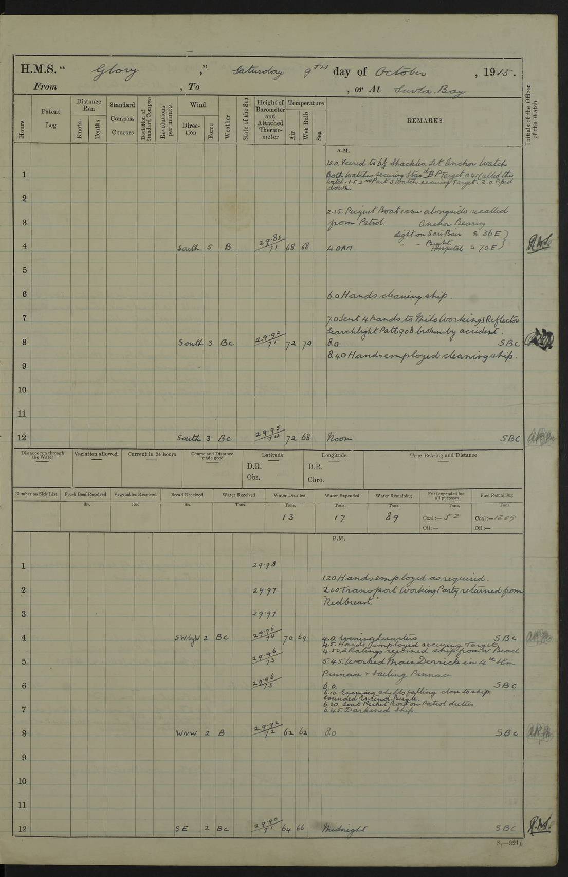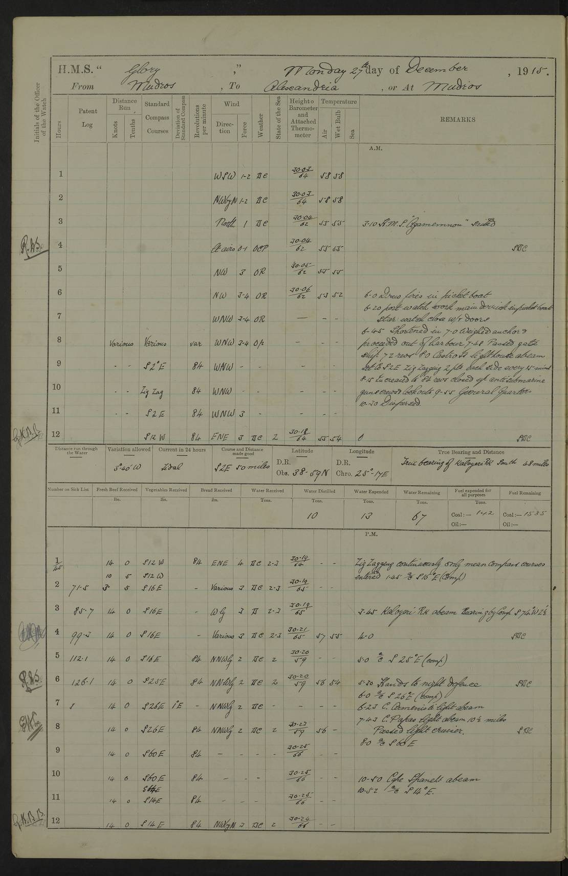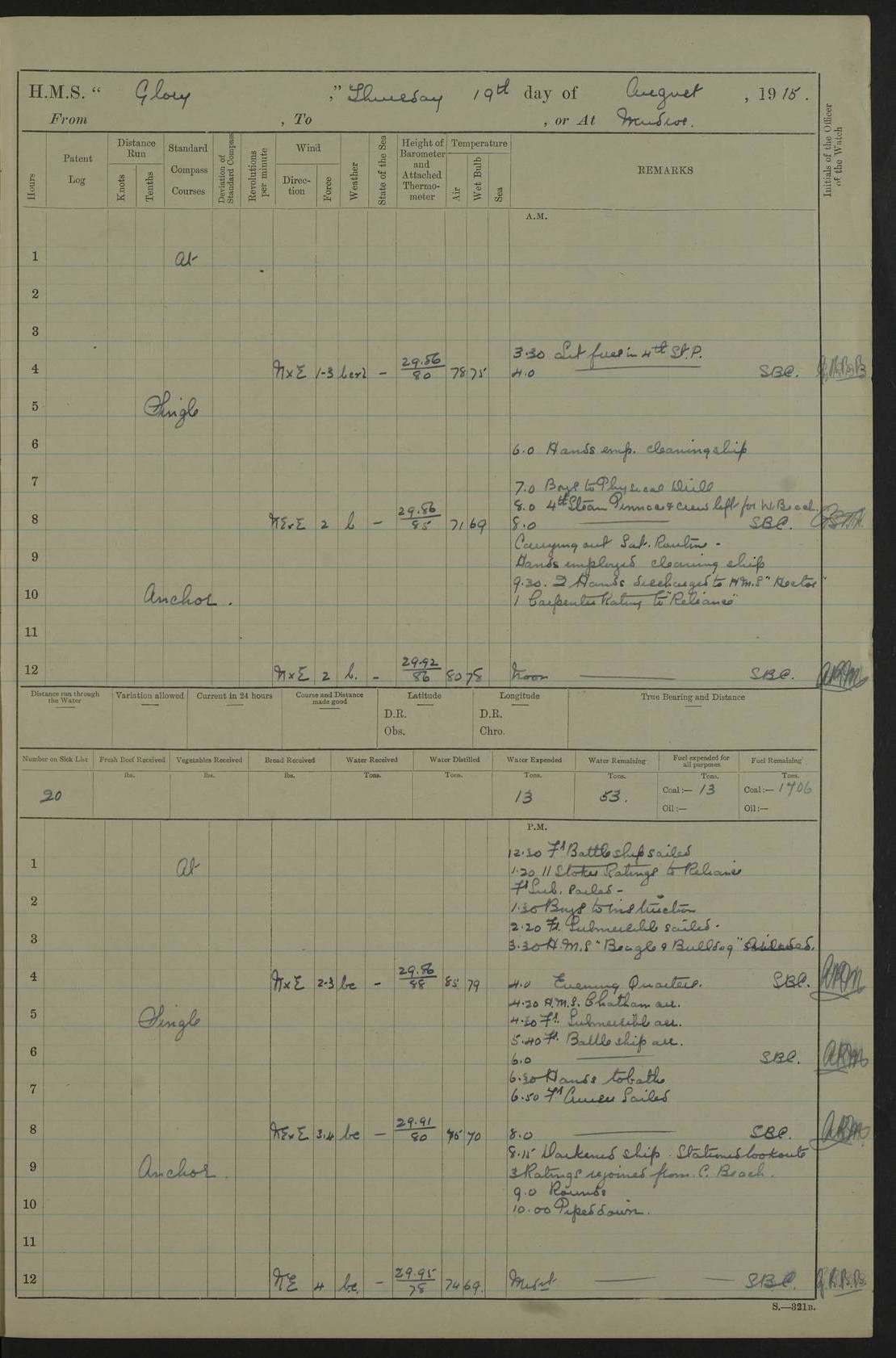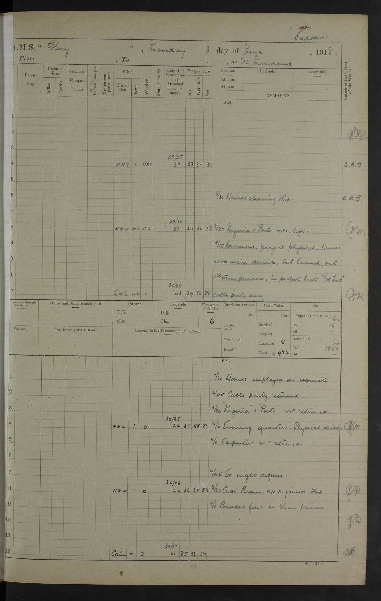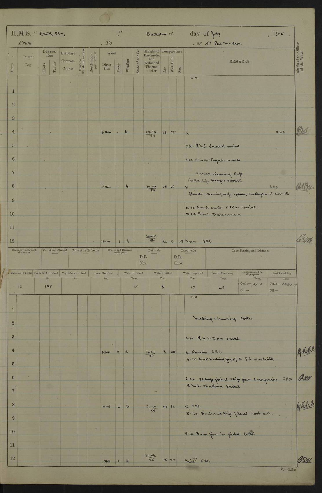 22 June 1915 At sea, Gibraltar to Lemnos Lat 36.1, Long -1.3 4.15am: Sighted land on starboard bow. 10.20am: Stopped port engine for repairs. 11.20am: proceeded with port engine. pm: a/c due to change in deviation. 10.00pm: Cape Tenez Light abeam, 18 miles. 4f73cd61a2fc8ea9030015f6: (https://s3.amazonaws.com:443/oldweather/ADM53-43015/0012_1.jpg) 23 June 1915 At sea, Gibraltar to Lemnos Lat 37.5, Long 4.8 Number on sick list: 4 5.00am: Secured from night defence stations. Placed anti-submarine guns. pm: Life saving appliances served out to men stationed in ? ?at abandon ship. 4f73cd61a2fc8ea9030015f7: (https://s3.amazonaws.com:443/oldweather/ADM53-43015/0013_0.jpg) 24 June 1915 At sea, Gibraltar to Lemnos Lat 37.4, Long 10.8 Position in log clearly bears no resemblance to the location of the ship. Position above is approximate and is based sighting of Zembra Island at 11.55am. 5.00am: Dispersed from night defence stations. Manned anti-submarine guns. am: Sighted two French torpedo boats. am: Torpedo boats passed to ~ No 362, 363. am: Sighted land on starboard beam. 11.55am: Zembra Island abeam, 25 miles. 2.00pm: Sighted Pantellaria S34ºE. 4.45pm: Pantellaria Light House abeam 12 miles. 4f73cd61a2fc8ea9030015f8: (https://s3.amazonaws.com:443/oldweather/ADM53-43015/0013_1.jpg) 25 June 1915 At sea, Gibraltar to Lemnos Lat 35.5, Long 16.7 2.10am: Gozo Light abeam 17 miles. 5.00am: Dispersed from night defence stations. Manned anti-submarine guns. 4f73cd61a2fc8ea9030015f9: (https://s3.amazonaws.com:443/oldweather/ADM53-43015/0014_0.jpg) 26 June 1915 At sea, Gibraltar to Lemnos Lat 35.5, Long 22.6 Number on sick list: 5 5.00am: Dispersed from night defence stations. Manned anti-submarine guns. am: Aired night clothing. am: marines at maxim practice on quarter deck. 2.00pm: Observed land on either bow. 3.00pm: Sighted French patrol destroyer. 4.15pm: Sighted French patrol destroyer. 9.40pm: Milo Peak N63ºW. 10.26pm: Polino Light abeam to port 5.5 miles. 4f73cd62a2fc8ea9030015fa: (https://s3.amazonaws.com:443/oldweather/ADM53-43015/0014_1.jpg) 27 June 1915 At sea and at Lemnos Lat 39.1, Long 24.4 From 0.50 to 3.05am sighting of multiple light houses. 3.50am: a/c to N39ºW and commenced to zig-zag. 5.00am: Dispersed from night defence stations and placed anti-submarine guns and look-outs. am: Lost overboard by accident Hazlewood fender, pat. 311, one in number. 10.30am: Held Divine Service onboard. pm: Met and signalled HMS Minerva on patrol duty. pm: Courses and speeds as requisite while waiting orders to approach Mudros. 3.00pm: Proceeded. 5.16pm: Increased to 90 revs, commenced to zig-zag. Course as requisite for Mudros. 7.00pm: Entered Mudros Bay. 7.47pm: Stopped. Let go port anchor in ‘M3’. 8.30pm: Darkened ship. pm: Manned one 6” and one 12 pdr. 4f73cd62a2fc8ea9030015fb: (https://s3.amazonaws.com:443/oldweather/ADM53-43015/0015_0.jpg) 28 June 1915 Mudros Bay, Lemnos Lat 39.89, Long 25.24 5,00am: HMS Vengeance entered harbour. HMS Vengeance was a pre-dreadnought of the Canopus class, launched in 1899 at Vickers, Barrow, and sold for scrapping in 1921. Details at http://en.wikipedia.org/wiki/HMS_Vengeance_(1899) . am/pm/: hands preparing for coaling and about ship’s work. pm: Collier Wabana secured alongside. 4f73cd62a2fc8ea9030015fc: (https://s3.amazonaws.com:443/oldweather/ADM53-43015/0015_1.jpg) 29 June 1915 Mudros Bay, Lemnos Lat 39.89, Long 25.24 5.15am: Commenced coaling. 2.00pm: Finished coaling. Collier left. 4f73cd62a2fc8ea9030015fd: (https://s3.amazonaws.com:443/oldweather/ADM53-43015/0016_0.jpg) 30 June 1915 Mudros Bay, Lemnos Lat 39.89, Long 25.24 am: Parties away sanding, and with fire engines onshore. am: Boats away disembarking troops. am: French Flagship Patrie sailed. The Patrie was a French pre-dreadnought, launched at La Seyne shipyard in 1903, and stricken in 1921. Details at http://en.wikipedia.org/wiki/French_battleship_Patrie . 6.30pm: Hands to bathe. 4f73cd63a2fc8ea9030015fe: (https://s3.amazonaws.com:443/oldweather/ADM53-43015/0016_1.jpg) 4f73cd63a2fc8ea9030015ff: (https://s3.amazonaws.com:443/oldweather/ADM53-43015/0017_0.jpg) 4f73cd63a2fc8ea903001600: (https://s3.amazonaws.com:443/oldweather/ADM53-43015/0017_1.jpg) 4f73cd63a2fc8ea903001601: (https://s3.amazonaws.com:443/oldweather/ADM53-43015/0018_0.jpg) 4f73cd64a2fc8ea903001602: (https://s3.amazonaws.com:443/oldweather/ADM53-43015/0018_1.jpg) LOGS FOR JULY 1915 From July to October 1915, HMS Glory spent her time at Port Mudros. Certain activities typically took place daily and are not generally noted in the pages below. These activities include: Lighting fires in the picket boat around 4am and drawing the fires in the late evening; Divisions at around 9–9.30am and Evening Quarters at 4pm; Darken ship at around 8.30pm; Daily ‘cleaning ship’, with variations thereof; SBC (for ‘Signal Books Correct’) at the watch changes. 4f73cd64a2fc8ea903001603: (https://s3.amazonaws.com:443/oldweather/ADM53-43016/0000_0.jpg) 4f73cd64a2fc8ea903001604: (https://s3.amazonaws.com:443/oldweather/ADM53-43016/0000_1.jpg) 4f73cd65a2fc8ea903001605: (https://s3.amazonaws.com:443/oldweather/ADM53-43016/0001_0.jpg) 4f73cd65a2fc8ea903001606: (https://s3.amazonaws.com:443/oldweather/ADM53-43016/0001_1.jpg) 1 July 1915 Port Mudros Lat 39.89, Long 25.24 6.30am: Landed working parties preparing boom defence ships. am: Discharged Acting Commander Rayne to Hector. Hector was a kite balloon ship. No further details readily available. 5.00pm: Tug T.10 made fast astern. 7.15pm: HMS Venerable went out. 7.30pm: HMS Chatham went out. HMS Chatham was a ‘Town’ cruiser and lead ship of her class. She was launched in 1911 at Chatham Dockyard and sold in 1926. Details at http://en.wikipedia.org/wiki/HMS_Chatham_(1911) . 4f73cd65a2fc8ea903001607: (https://s3.amazonaws.com:443/oldweather/ADM53-43016/0002_0.jpg) 2 July 1915 Port Mudros Lat 39.89, Long 25.24 5.35am: Landed working parties preparing boom defence ships. am/pm: Boom defence par