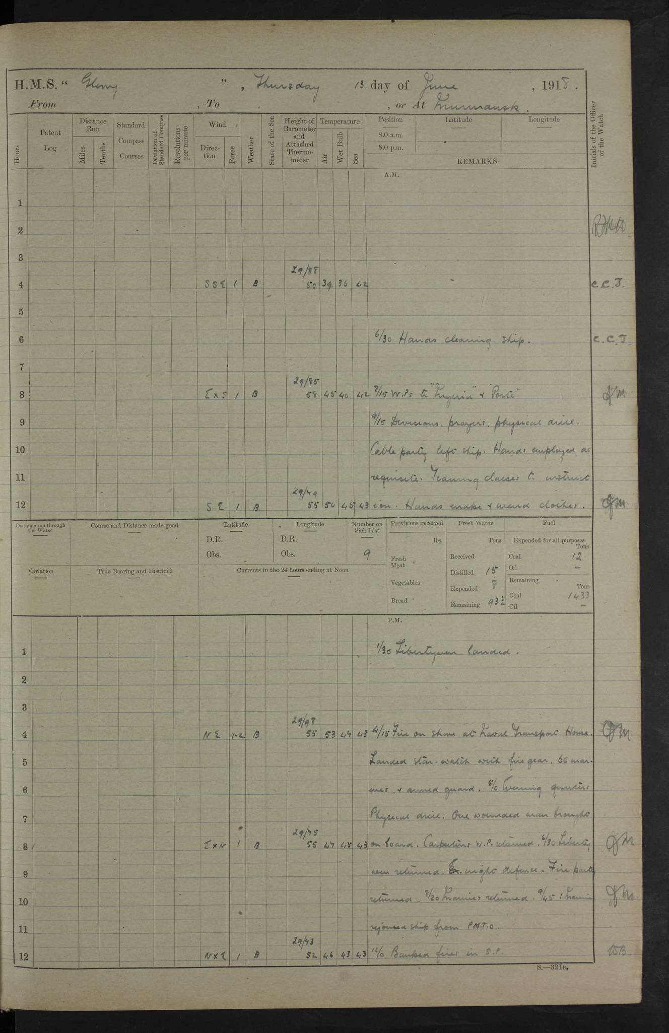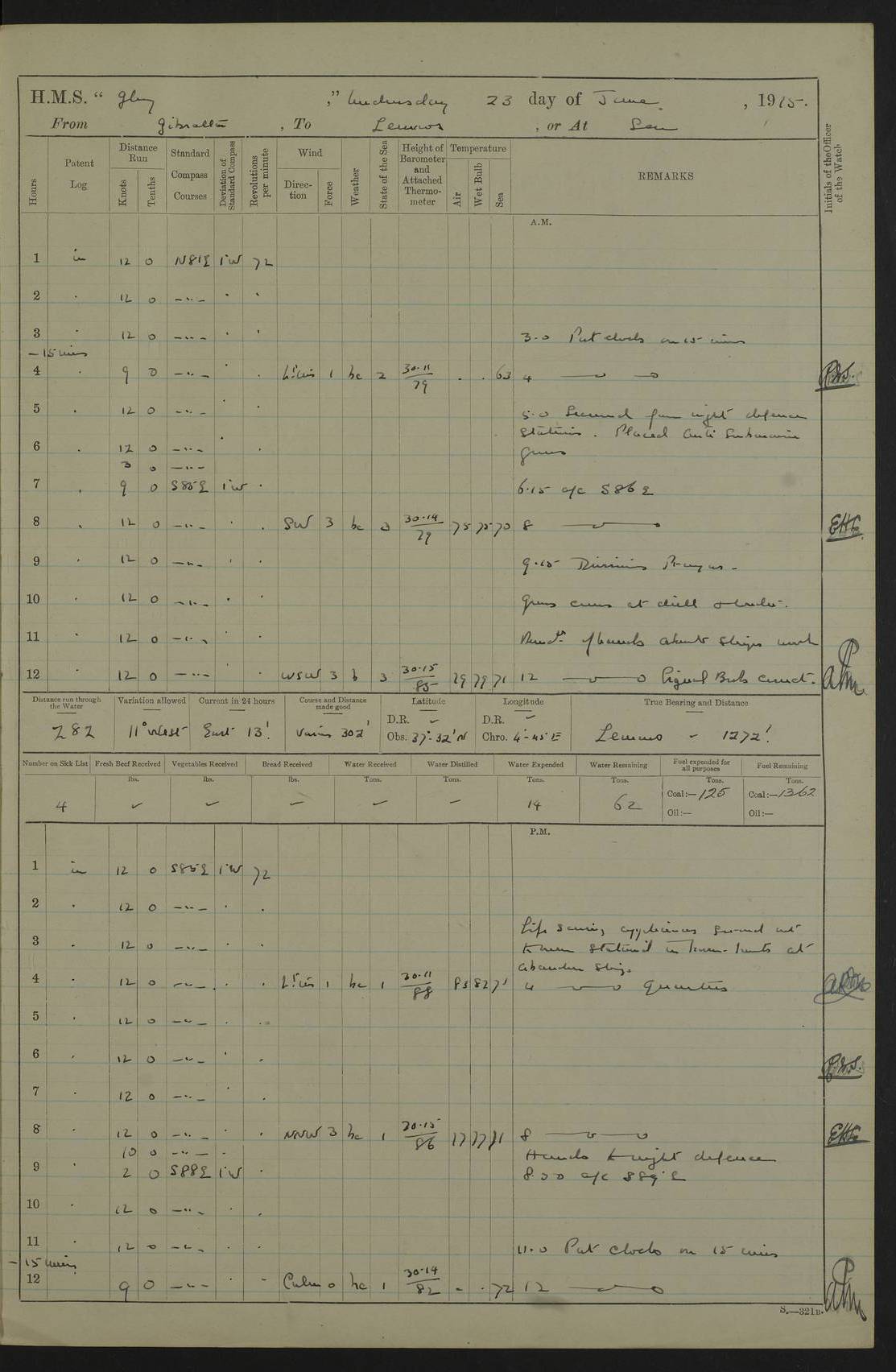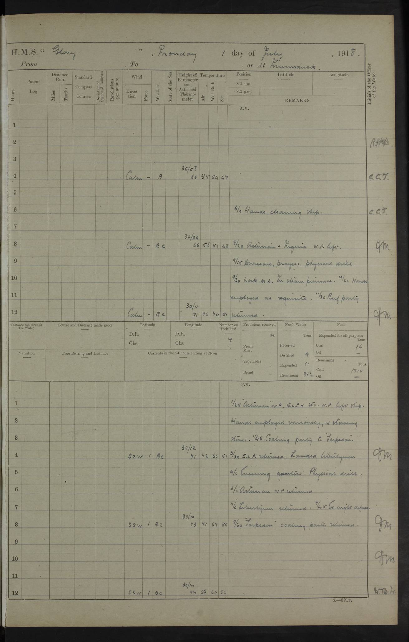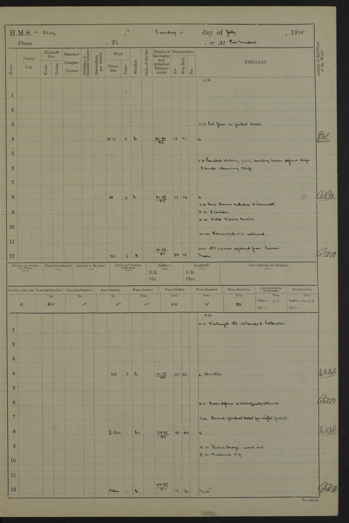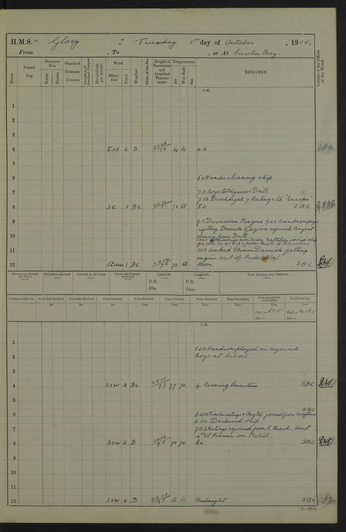 22 June 1915 At sea, Gibraltar to Lemnos Lat 36.1, Long -1.3 4.15am: Sighted land on starboard bow. 10.20am: Stopped port engine for repairs. 11.20am: proceeded with port engine. pm: a/c due to change in deviation. 10.00pm: Cape Tenez Light abeam, 18 miles. 4f73cd61a2fc8ea9030015f6: (https://s3.amazonaws.com:443/oldweather/ADM53-43015/0012_1.jpg) 23 June 1915 At sea, Gibraltar to Lemnos Lat 37.5, Long 4.8 Number on sick list: 4 5.00am: Secured from night defence stations. Placed anti-submarine guns. pm: Life saving appliances served out to men stationed in ? ?at abandon ship. 4f73cd61a2fc8ea9030015f7: (https://s3.amazonaws.com:443/oldweather/ADM53-43015/0013_0.jpg) 24 June 1915 At sea, Gibraltar to Lemnos Lat 37.4, Long 10.8 Position in log clearly bears no resemblance to the location of the ship. Position above is approximate and is based sighting of Zembra Island at 11.55am. 5.00am: Dispersed from night defence stations. Manned anti-submarine guns. am: Sighted two French torpedo boats. am: Torpedo boats passed to ~ No 362, 363. am: Sighted land on starboard beam. 11.55am: Zembra Island abeam, 25 miles. 2.00pm: Sighted Pantellaria S34ºE. 4.45pm: Pantellaria Light House abeam 12 miles. 4f73cd61a2fc8ea9030015f8: (https://s3.amazonaws.com:443/oldweather/ADM53-43015/0013_1.jpg) 25 June 1915 At sea, Gibraltar to Lemnos Lat 35.5, Long 16.7 2.10am: Gozo Light abeam 17 miles. 5.00am: Dispersed from night defence stations. Manned anti-submarine guns. 4f73cd61a2fc8ea9030015f9: (https://s3.amazonaws.com:443/oldweather/ADM53-43015/0014_0.jpg) 26 June 1915 At sea, Gibraltar to Lemnos Lat 35.5, Long 22.6 Number on sick list: 5 5.00am: Dispersed from night defence stations. Manned anti-submarine guns. am: Aired night clothing. am: marines at maxim practice on quarter deck. 2.00pm: Observed land on either bow. 3.00pm: Sighted French patrol destroyer. 4.15pm: Sighted French patrol destroyer. 9.40pm: Milo Peak N63ºW. 10.26pm: Polino Light abeam to port 5.5 miles. 4f73cd62a2fc8ea9030015fa: (https://s3.amazonaws.com:443/oldweather/ADM53-43015/0014_1.jpg) 27 June 1915 At sea and at Lemnos Lat 39.1, Long 24.4 From 0.50 to 3.05am sighting of multiple light houses. 3.50am: a/c to N39ºW and commenced to zig-zag. 5.00am: Dispersed from night defence stations and placed anti-submarine guns and look-outs. am: Lost overboard by accident Hazlewood fender, pat. 311, one in number. 10.30am: Held Divine Service onboard. pm: Met and signalled HMS Minerva on patrol duty. pm: Courses and speeds as requisite while waiting orders to approach Mudros. 3.00pm: Proceeded. 5.16pm: Increased to 90 revs, commenced to zig-zag. Course as requisite for Mudros. 7.00pm: Entered Mudros Bay. 7.47pm: Stopped. Let go port anchor in ‘M3’. 8.30pm: Darkened ship. pm: Manned one 6” and one 12 pdr. 4f73cd62a2fc8ea9030015fb: (https://s3.amazonaws.com:443/oldweather/ADM53-43015/0015_0.jpg) 28 June 1915 Mudros Bay, Lemnos Lat 39.89, Long 25.24 5,00am: HMS Vengeance entered harbour. HMS Vengeance was a pre-dreadnought of the Canopus class, launched in 1899 at Vickers, Barrow, and sold for scrapping in 1921. Details at http://en.wikipedia.org/wiki/HMS_Vengeance_(1899) . am/pm/: hands preparing for coaling and about ship’s work. pm: Collier Wabana secured alongside. 4f73cd62a2fc8ea9030015fc: (https://s3.amazonaws.com:443/oldweather/ADM53-43015/0015_1.jpg) 29 June 1915 Mudros Bay, Lemnos Lat 39.89, Long 25.24 5.15am: Commenced coaling. 2.00pm: Finished coaling. Collier left. 4f73cd62a2fc8ea9030015fd: (https://s3.amazonaws.com:443/oldweather/ADM53-43015/0016_0.jpg) 30 June 1915 Mudros Bay, Lemnos Lat 39.89, Long 25.24 am: Parties away sanding, and with fire engines onshore. am: Boats away disembarking troops. am: French Flagship Patrie sailed. The Patrie was a French pre-dreadnought, launched at La Seyne shipyard in 1903, and stricken in 1921. Details at http://en.wikipedia.org/wiki/French_battleship_Patrie . 6.30pm: Hands to bathe. 4f73cd63a2fc8ea9030015fe: (https://s3.amazonaws.com:443/oldweather/ADM53-43015/0016_1.jpg) 4f73cd63a2fc8ea9030015ff: (https://s3.amazonaws.com:443/oldweather/ADM53-43015/0017_0.jpg) 4f73cd63a2fc8ea903001600: (https://s3.amazonaws.com:443/oldweather/ADM53-43015/0017_1.jpg) 4f73cd63a2fc8ea903001601: (https://s3.amazonaws.com:443/oldweather/ADM53-43015/0018_0.jpg) 4f73cd64a2fc8ea903001602: (https://s3.amazonaws.com:443/oldweather/ADM53-43015/0018_1.jpg) LOGS FOR JULY 1915 From July to October 1915, HMS Glory spent her time at Port Mudros. Certain activities typically took place daily and are not generally noted in the pages below. These activities include: Lighting fires in the picket boat around 4am and drawing the fires in the late evening; Divisions at around 9–9.30am and Evening Quarters at 4pm; Darken ship at around 8.30pm; Daily ‘cleaning ship’, with variations thereof; SBC (for ‘Signal Books Correct’) at the watch changes. 4f73cd64a2fc8ea903001603: (https://s3.amazonaws.com:443/oldweather/ADM53-43016/0000_0.jpg) 4f73cd64a2fc8ea903001604: (https://s3.amazonaws.com:443/oldweather/ADM53-43016/0000_1.jpg) 4f73cd65a2fc8ea903001605: (https://s3.amazonaws.com:443/oldweather/ADM53-43016/0001_0.jpg) 4f73cd65a2fc8ea903001606: (https://s3.amazonaws.com:443/oldweather/ADM53-43016/0001_1.jpg) 1 July 1915 Port Mudros Lat 39.89, Long 25.24 6.30am: Landed working parties preparing boom defence ships. am: Discharged Acting Commander Rayne to Hector. Hector was a kite balloon ship. No further details readily available. 5.00pm: Tug T.10 made fast astern. 7.15pm: HMS Venerable went out. 7.30pm: HMS Chatham went out. HMS Chatham was a ‘Town’ cruiser and lead ship of her class. She was launched in 1911 at Chatham Dockyard and sold in 1926. Details at http://en.wikipedia.org/wiki/HMS_Chatham_(1911) . 4f73cd65a2fc8ea903001607: (https://s3.amazonaws.com:443/oldweather/ADM53-43016/0002_0.jpg) 2 July 1915 Port Mudros Lat 39.89, Long 25.24 5.35am: Landed working parties preparing boom defence ships. am/pm: Boom defence par