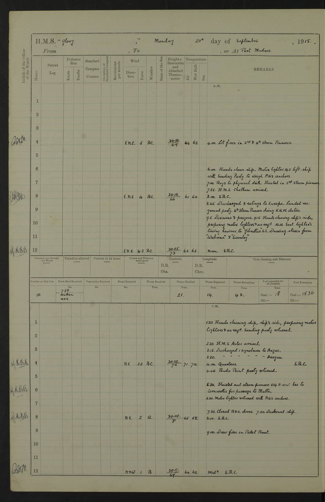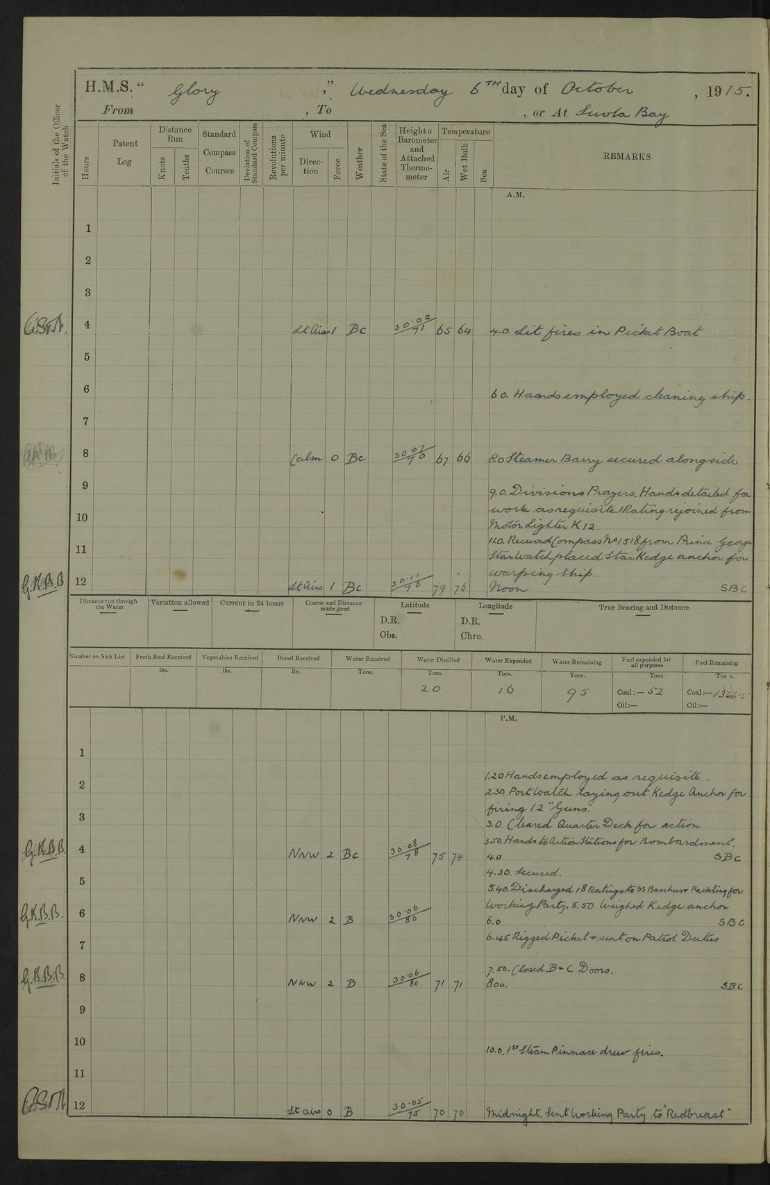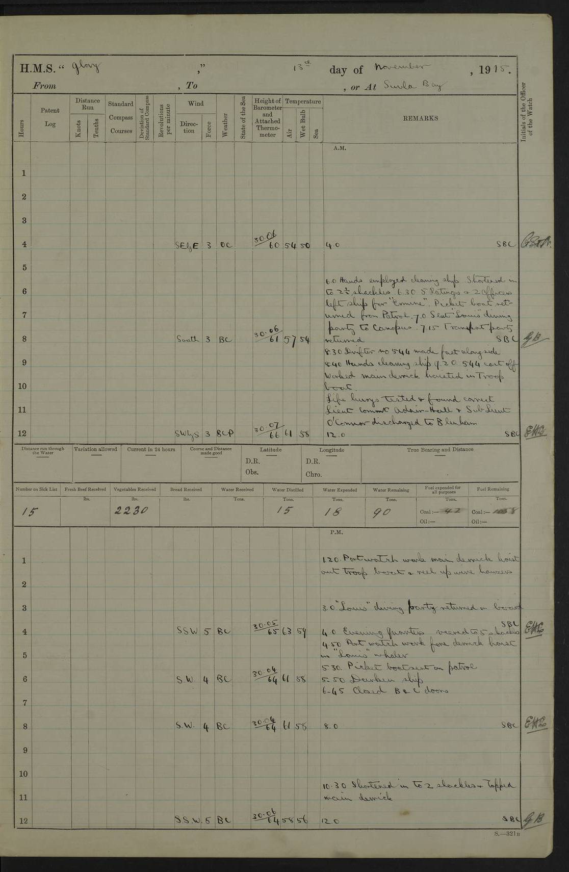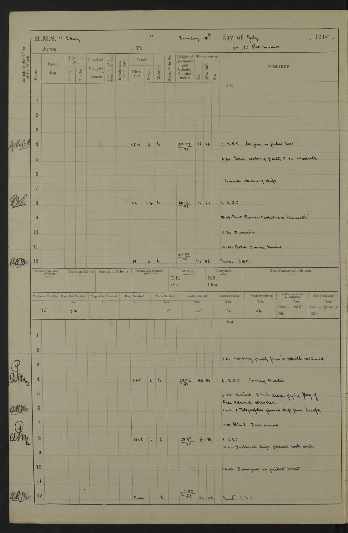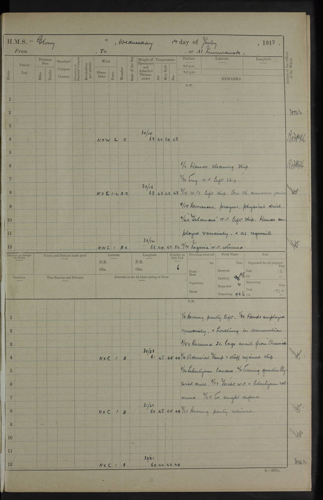 22 June 1915 At sea, Gibraltar to Lemnos Lat 36.1, Long -1.3 4.15am: Sighted land on starboard bow. 10.20am: Stopped port engine for repairs. 11.20am: proceeded with port engine. pm: a/c due to change in deviation. 10.00pm: Cape Tenez Light abeam, 18 miles. 4f73cd61a2fc8ea9030015f6: (https://s3.amazonaws.com:443/oldweather/ADM53-43015/0012_1.jpg) 23 June 1915 At sea, Gibraltar to Lemnos Lat 37.5, Long 4.8 Number on sick list: 4 5.00am: Secured from night defence stations. Placed anti-submarine guns. pm: Life saving appliances served out to men stationed in ? ?at abandon ship. 4f73cd61a2fc8ea9030015f7: (https://s3.amazonaws.com:443/oldweather/ADM53-43015/0013_0.jpg) 24 June 1915 At sea, Gibraltar to Lemnos Lat 37.4, Long 10.8 Position in log clearly bears no resemblance to the location of the ship. Position above is approximate and is based sighting of Zembra Island at 11.55am. 5.00am: Dispersed from night defence stations. Manned anti-submarine guns. am: Sighted two French torpedo boats. am: Torpedo boats passed to ~ No 362, 363. am: Sighted land on starboard beam. 11.55am: Zembra Island abeam, 25 miles. 2.00pm: Sighted Pantellaria S34ºE. 4.45pm: Pantellaria Light House abeam 12 miles. 4f73cd61a2fc8ea9030015f8: (https://s3.amazonaws.com:443/oldweather/ADM53-43015/0013_1.jpg) 25 June 1915 At sea, Gibraltar to Lemnos Lat 35.5, Long 16.7 2.10am: Gozo Light abeam 17 miles. 5.00am: Dispersed from night defence stations. Manned anti-submarine guns. 4f73cd61a2fc8ea9030015f9: (https://s3.amazonaws.com:443/oldweather/ADM53-43015/0014_0.jpg) 26 June 1915 At sea, Gibraltar to Lemnos Lat 35.5, Long 22.6 Number on sick list: 5 5.00am: Dispersed from night defence stations. Manned anti-submarine guns. am: Aired night clothing. am: marines at maxim practice on quarter deck. 2.00pm: Observed land on either bow. 3.00pm: Sighted French patrol destroyer. 4.15pm: Sighted French patrol destroyer. 9.40pm: Milo Peak N63ºW. 10.26pm: Polino Light abeam to port 5.5 miles. 4f73cd62a2fc8ea9030015fa: (https://s3.amazonaws.com:443/oldweather/ADM53-43015/0014_1.jpg) 27 June 1915 At sea and at Lemnos Lat 39.1, Long 24.4 From 0.50 to 3.05am sighting of multiple light houses. 3.50am: a/c to N39ºW and commenced to zig-zag. 5.00am: Dispersed from night defence stations and placed anti-submarine guns and look-outs. am: Lost overboard by accident Hazlewood fender, pat. 311, one in number. 10.30am: Held Divine Service onboard. pm: Met and signalled HMS Minerva on patrol duty. pm: Courses and speeds as requisite while waiting orders to approach Mudros. 3.00pm: Proceeded. 5.16pm: Increased to 90 revs, commenced to zig-zag. Course as requisite for Mudros. 7.00pm: Entered Mudros Bay. 7.47pm: Stopped. Let go port anchor in ‘M3’. 8.30pm: Darkened ship. pm: Manned one 6” and one 12 pdr. 4f73cd62a2fc8ea9030015fb: (https://s3.amazonaws.com:443/oldweather/ADM53-43015/0015_0.jpg) 28 June 1915 Mudros Bay, Lemnos Lat 39.89, Long 25.24 5,00am: HMS Vengeance entered harbour. HMS Vengeance was a pre-dreadnought of the Canopus class, launched in 1899 at Vickers, Barrow, and sold for scrapping in 1921. Details at http://en.wikipedia.org/wiki/HMS_Vengeance_(1899) . am/pm/: hands preparing for coaling and about ship’s work. pm: Collier Wabana secured alongside. 4f73cd62a2fc8ea9030015fc: (https://s3.amazonaws.com:443/oldweather/ADM53-43015/0015_1.jpg) 29 June 1915 Mudros Bay, Lemnos Lat 39.89, Long 25.24 5.15am: Commenced coaling. 2.00pm: Finished coaling. Collier left. 4f73cd62a2fc8ea9030015fd: (https://s3.amazonaws.com:443/oldweather/ADM53-43015/0016_0.jpg) 30 June 1915 Mudros Bay, Lemnos Lat 39.89, Long 25.24 am: Parties away sanding, and with fire engines onshore. am: Boats away disembarking troops. am: French Flagship Patrie sailed. The Patrie was a French pre-dreadnought, launched at La Seyne shipyard in 1903, and stricken in 1921. Details at http://en.wikipedia.org/wiki/French_battleship_Patrie . 6.30pm: Hands to bathe. 4f73cd63a2fc8ea9030015fe: (https://s3.amazonaws.com:443/oldweather/ADM53-43015/0016_1.jpg) 4f73cd63a2fc8ea9030015ff: (https://s3.amazonaws.com:443/oldweather/ADM53-43015/0017_0.jpg) 4f73cd63a2fc8ea903001600: (https://s3.amazonaws.com:443/oldweather/ADM53-43015/0017_1.jpg) 4f73cd63a2fc8ea903001601: (https://s3.amazonaws.com:443/oldweather/ADM53-43015/0018_0.jpg) 4f73cd64a2fc8ea903001602: (https://s3.amazonaws.com:443/oldweather/ADM53-43015/0018_1.jpg) LOGS FOR JULY 1915 From July to October 1915, HMS Glory spent her time at Port Mudros. Certain activities typically took place daily and are not generally noted in the pages below. These activities include: Lighting fires in the picket boat around 4am and drawing the fires in the late evening; Divisions at around 9–9.30am and Evening Quarters at 4pm; Darken ship at around 8.30pm; Daily ‘cleaning ship’, with variations thereof; SBC (for ‘Signal Books Correct’) at the watch changes. 4f73cd64a2fc8ea903001603: (https://s3.amazonaws.com:443/oldweather/ADM53-43016/0000_0.jpg) 4f73cd64a2fc8ea903001604: (https://s3.amazonaws.com:443/oldweather/ADM53-43016/0000_1.jpg) 4f73cd65a2fc8ea903001605: (https://s3.amazonaws.com:443/oldweather/ADM53-43016/0001_0.jpg) 4f73cd65a2fc8ea903001606: (https://s3.amazonaws.com:443/oldweather/ADM53-43016/0001_1.jpg) 1 July 1915 Port Mudros Lat 39.89, Long 25.24 6.30am: Landed working parties preparing boom defence ships. am: Discharged Acting Commander Rayne to Hector. Hector was a kite balloon ship. No further details readily available. 5.00pm: Tug T.10 made fast astern. 7.15pm: HMS Venerable went out. 7.30pm: HMS Chatham went out. HMS Chatham was a ‘Town’ cruiser and lead ship of her class. She was launched in 1911 at Chatham Dockyard and sold in 1926. Details at http://en.wikipedia.org/wiki/HMS_Chatham_(1911) . 4f73cd65a2fc8ea903001607: (https://s3.amazonaws.com:443/oldweather/ADM53-43016/0002_0.jpg) 2 July 1915 Port Mudros Lat 39.89, Long 25.24 5.35am: Landed working parties preparing boom defence ships. am/pm: Boom defence par