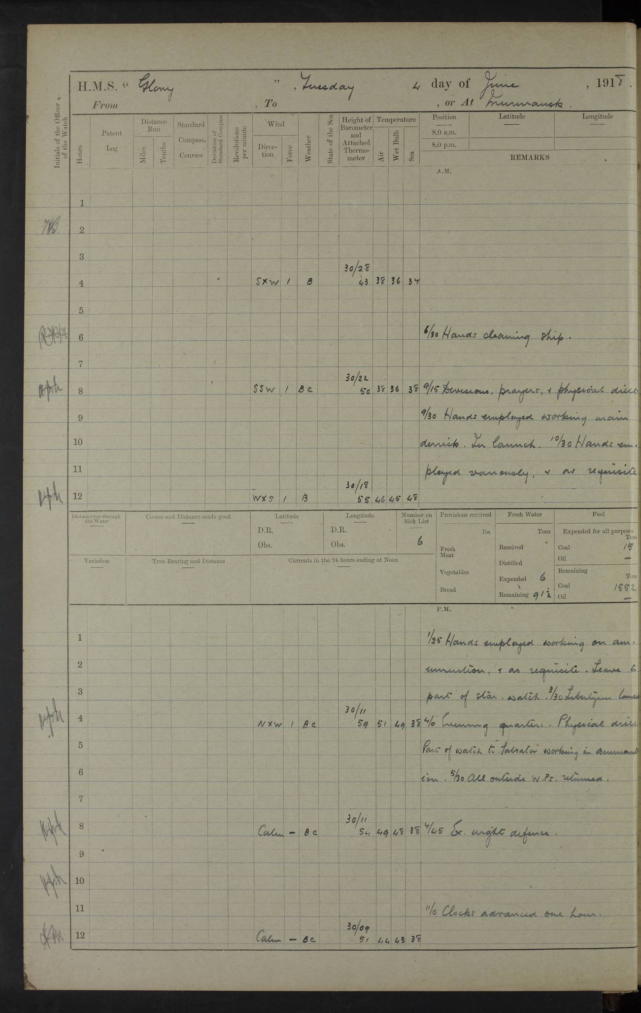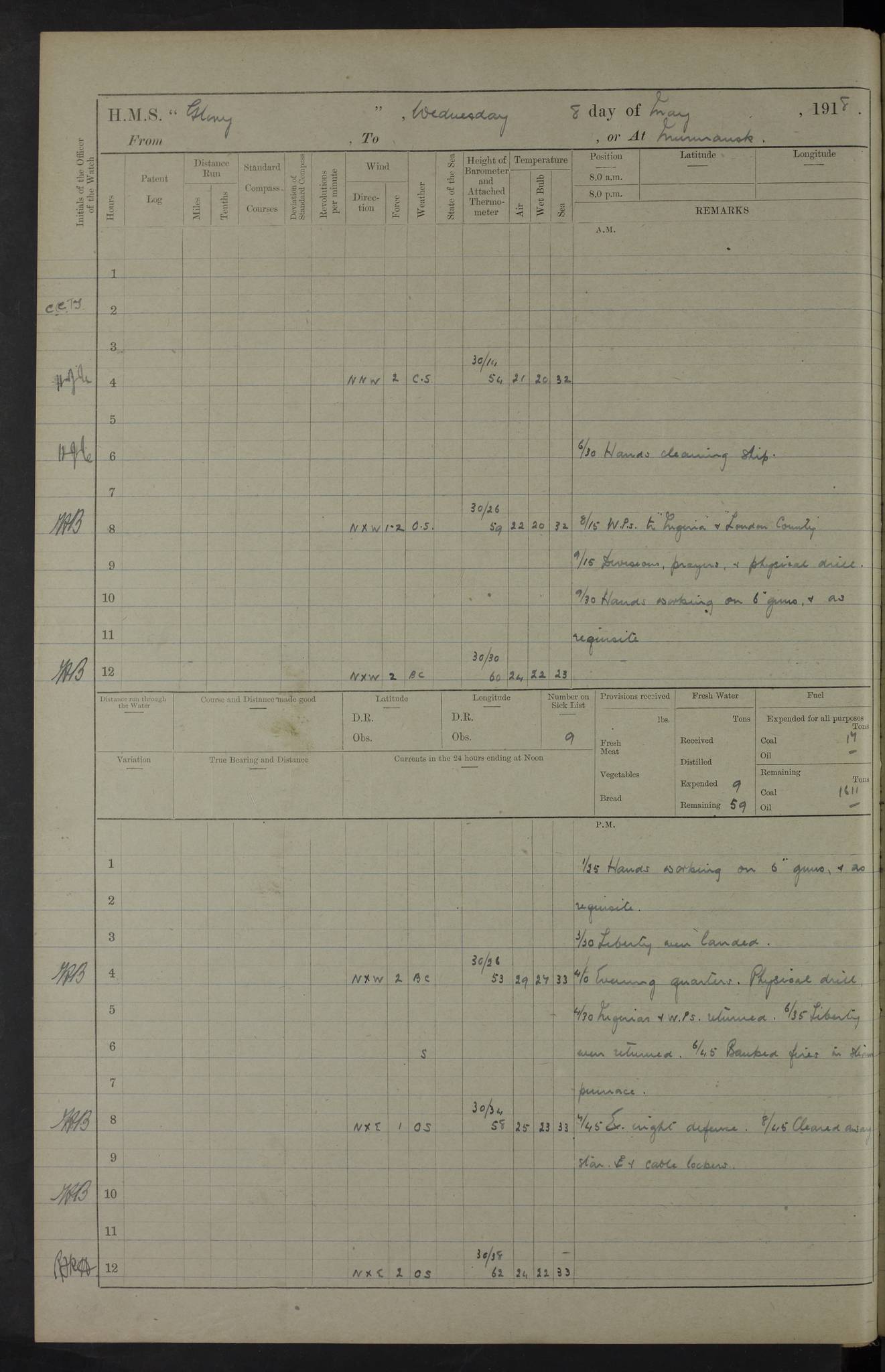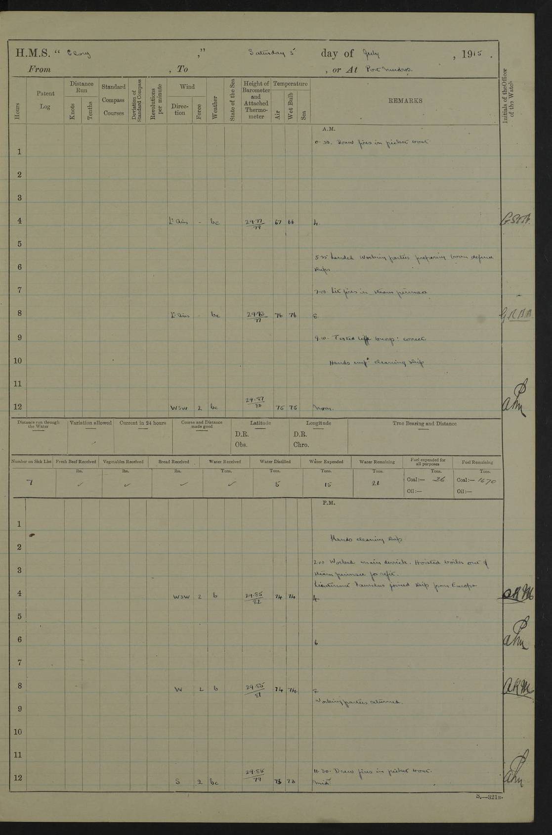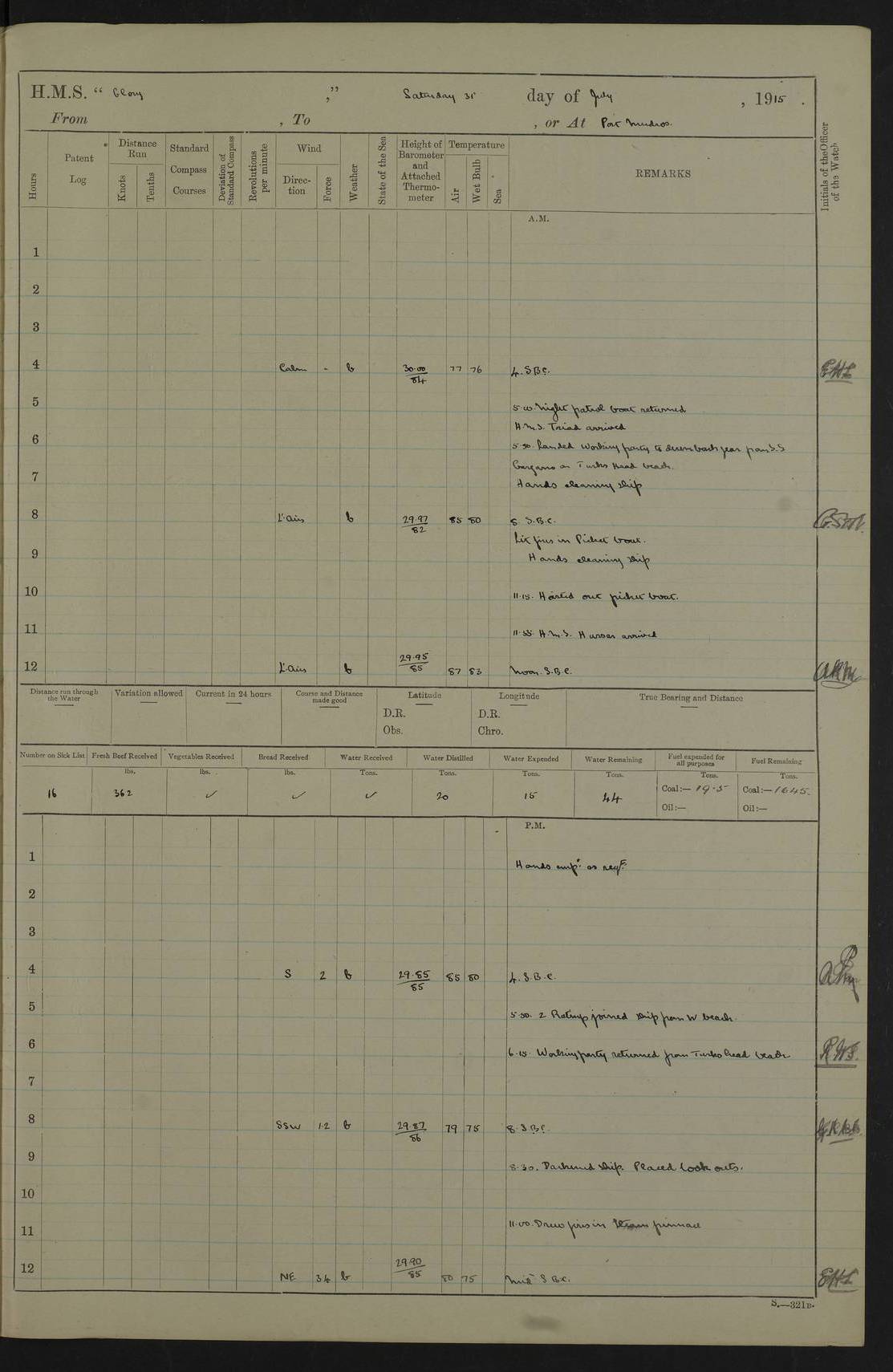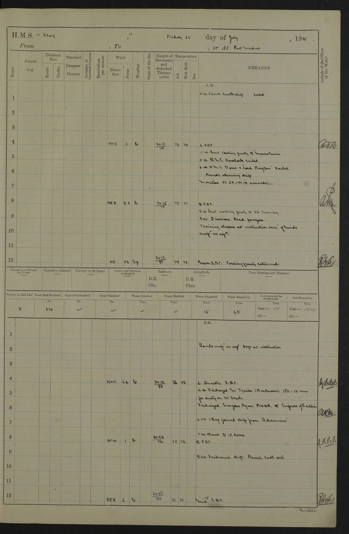22 June 1915 At sea, Gibraltar to Lemnos Lat 36.1, Long -1.3 4.15am: Sighted land on starboard bow. 10.20am: Stopped port engine for repairs. 11.20am: proceeded with port engine. pm: a/c due to change in deviation. 10.00pm: Cape Tenez Light abeam, 18 miles. 4f73cd61a2fc8ea9030015f6: (https://s3.amazonaws.com:443/oldweather/ADM53-43015/0012_1.jpg) 23 June 1915 At sea, Gibraltar to Lemnos Lat 37.5, Long 4.8 Number on sick list: 4 5.00am: Secured from night defence stations. Placed anti-submarine guns. pm: Life saving appliances served out to men stationed in ? ?at abandon ship. 4f73cd61a2fc8ea9030015f7: (https://s3.amazonaws.com:443/oldweather/ADM53-43015/0013_0.jpg) 24 June 1915 At sea, Gibraltar to Lemnos Lat 37.4, Long 10.8 Position in log clearly bears no resemblance to the location of the ship. Position above is approximate and is based sighting of Zembra Island at 11.55am. 5.00am: Dispersed from night defence stations. Manned anti-submarine guns. am: Sighted two French torpedo boats. am: Torpedo boats passed to ~ No 362, 363. am: Sighted land on starboard beam. 11.55am: Zembra Island abeam, 25 miles. 2.00pm: Sighted Pantellaria S34ºE. 4.45pm: Pantellaria Light House abeam 12 miles. 4f73cd61a2fc8ea9030015f8: (https://s3.amazonaws.com:443/oldweather/ADM53-43015/0013_1.jpg) 25 June 1915 At sea, Gibraltar to Lemnos Lat 35.5, Long 16.7 2.10am: Gozo Light abeam 17 miles. 5.00am: Dispersed from night defence stations. Manned anti-submarine guns. 4f73cd61a2fc8ea9030015f9: (https://s3.amazonaws.com:443/oldweather/ADM53-43015/0014_0.jpg) 26 June 1915 At sea, Gibraltar to Lemnos Lat 35.5, Long 22.6 Number on sick list: 5 5.00am: Dispersed from night defence stations. Manned anti-submarine guns. am: Aired night clothing. am: marines at maxim practice on quarter deck. 2.00pm: Observed land on either bow. 3.00pm: Sighted French patrol destroyer. 4.15pm: Sighted French patrol destroyer. 9.40pm: Milo Peak N63ºW. 10.26pm: Polino Light abeam to port 5.5 miles. 4f73cd62a2fc8ea9030015fa: (https://s3.amazonaws.com:443/oldweather/ADM53-43015/0014_1.jpg) 27 June 1915 At sea and at Lemnos Lat 39.1, Long 24.4 From 0.50 to 3.05am sighting of multiple light houses. 3.50am: a/c to N39ºW and commenced to zig-zag. 5.00am: Dispersed from night defence stations and placed anti-submarine guns and look-outs. am: Lost overboard by accident Hazlewood fender, pat. 311, one in number. 10.30am: Held Divine Service onboard. pm: Met and signalled HMS Minerva on patrol duty. pm: Courses and speeds as requisite while waiting orders to approach Mudros. 3.00pm: Proceeded. 5.16pm: Increased to 90 revs, commenced to zig-zag. Course as requisite for Mudros. 7.00pm: Entered Mudros Bay. 7.47pm: Stopped. Let go port anchor in ‘M3’. 8.30pm: Darkened ship. pm: Manned one 6” and one 12 pdr. 4f73cd62a2fc8ea9030015fb: (https://s3.amazonaws.com:443/oldweather/ADM53-43015/0015_0.jpg) 28 June 1915 Mudros Bay, Lemnos Lat 39.89, Long 25.24 5,00am: HMS Vengeance entered harbour. HMS Vengeance was a pre-dreadnought of the Canopus class, launched in 1899 at Vickers, Barrow, and sold for scrapping in 1921. Details at http://en.wikipedia.org/wiki/HMS_Vengeance_(1899) . am/pm/: hands preparing for coaling and about ship’s work. pm: Collier Wabana secured alongside. 4f73cd62a2fc8ea9030015fc: (https://s3.amazonaws.com:443/oldweather/ADM53-43015/0015_1.jpg) 29 June 1915 Mudros Bay, Lemnos Lat 39.89, Long 25.24 5.15am: Commenced coaling. 2.00pm: Finished coaling. Collier left. 4f73cd62a2fc8ea9030015fd: (https://s3.amazonaws.com:443/oldweather/ADM53-43015/0016_0.jpg) 30 June 1915 Mudros Bay, Lemnos Lat 39.89, Long 25.24 am: Parties away sanding, and with fire engines onshore. am: Boats away disembarking troops. am: French Flagship Patrie sailed. The Patrie was a French pre-dreadnought, launched at La Seyne shipyard in 1903, and stricken in 1921. Details at http://en.wikipedia.org/wiki/French_battleship_Patrie . 6.30pm: Hands to bathe. 4f73cd63a2fc8ea9030015fe: (https://s3.amazonaws.com:443/oldweather/ADM53-43015/0016_1.jpg) 4f73cd63a2fc8ea9030015ff: (https://s3.amazonaws.com:443/oldweather/ADM53-43015/0017_0.jpg) 4f73cd63a2fc8ea903001600: (https://s3.amazonaws.com:443/oldweather/ADM53-43015/0017_1.jpg) 4f73cd63a2fc8ea903001601: (https://s3.amazonaws.com:443/oldweather/ADM53-43015/0018_0.jpg) 4f73cd64a2fc8ea903001602: (https://s3.amazonaws.com:443/oldweather/ADM53-43015/0018_1.jpg) LOGS FOR JULY 1915 From July to October 1915, HMS Glory spent her time at Port Mudros. Certain activities typically took place daily and are not generally noted in the pages below. These activities include: Lighting fires in the picket boat around 4am and drawing the fires in the late evening; Divisions at around 9–9.30am and Evening Quarters at 4pm; Darken ship at around 8.30pm; Daily ‘cleaning ship’, with variations thereof; SBC (for ‘Signal Books Correct’) at the watch changes. 4f73cd64a2fc8ea903001603: (https://s3.amazonaws.com:443/oldweather/ADM53-43016/0000_0.jpg) 4f73cd64a2fc8ea903001604: (https://s3.amazonaws.com:443/oldweather/ADM53-43016/0000_1.jpg) 4f73cd65a2fc8ea903001605: (https://s3.amazonaws.com:443/oldweather/ADM53-43016/0001_0.jpg) 4f73cd65a2fc8ea903001606: (https://s3.amazonaws.com:443/oldweather/ADM53-43016/0001_1.jpg) 1 July 1915 Port Mudros Lat 39.89, Long 25.24 6.30am: Landed working parties preparing boom defence ships. am: Discharged Acting Commander Rayne to Hector. Hector was a kite balloon ship. No further details readily available. 5.00pm: Tug T.10 made fast astern. 7.15pm: HMS Venerable went out. 7.30pm: HMS Chatham went out. HMS Chatham was a ‘Town’ cruiser and lead ship of her class. She was launched in 1911 at Chatham Dockyard and sold in 1926. Details at http://en.wikipedia.org/wiki/HMS_Chatham_(1911) . 4f73cd65a2fc8ea903001607: (https://s3.amazonaws.com:443/oldweather/ADM53-43016/0002_0.jpg) 2 July 1915 Port Mudros Lat 39.89, Long 25.24 5.35am: Landed working parties preparing boom defence ships. am/pm: Boom defence par