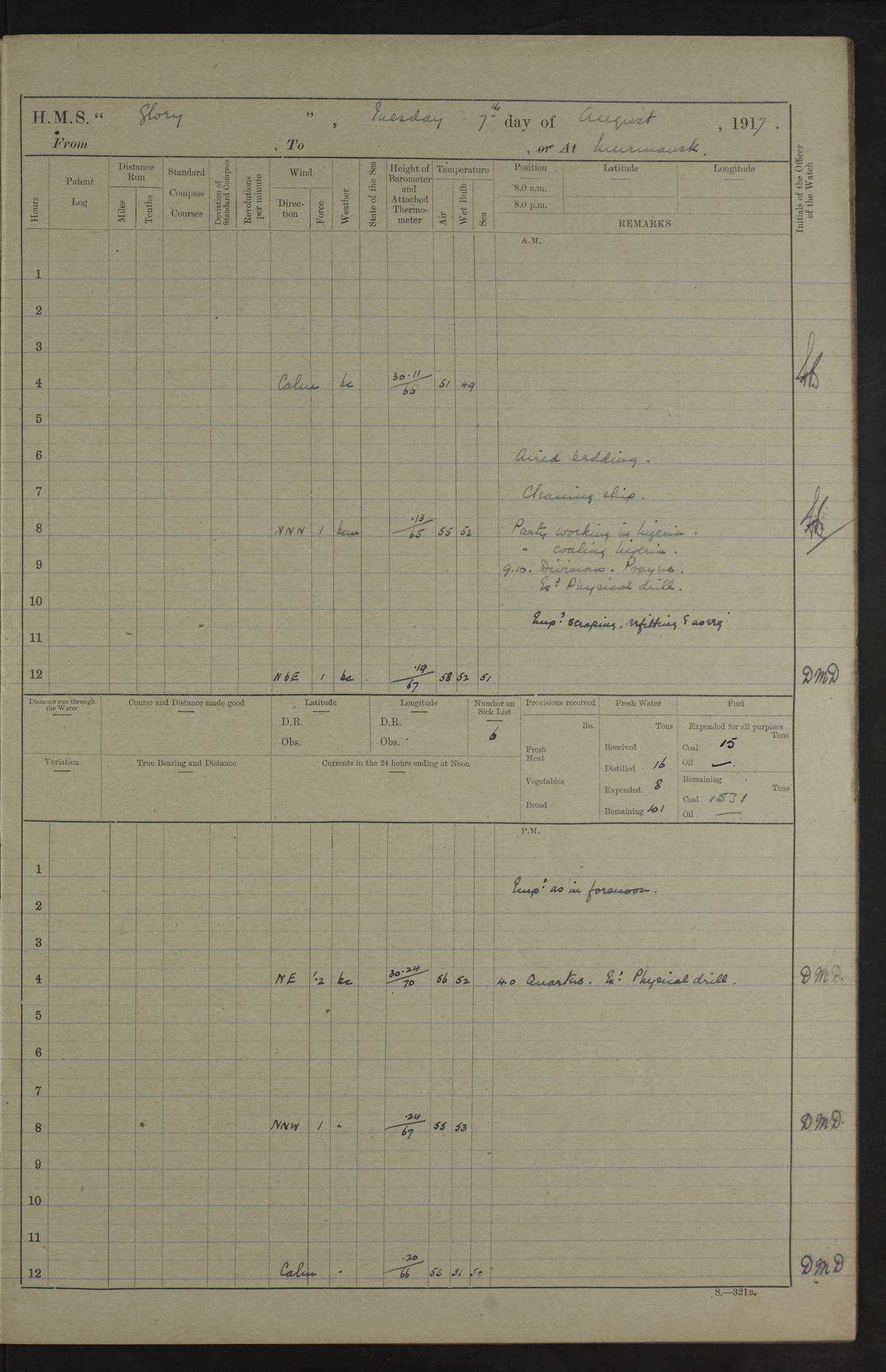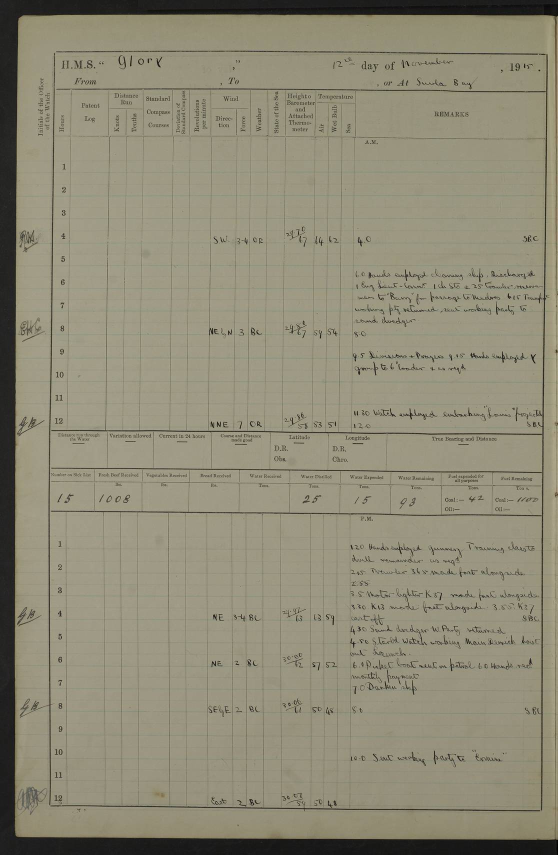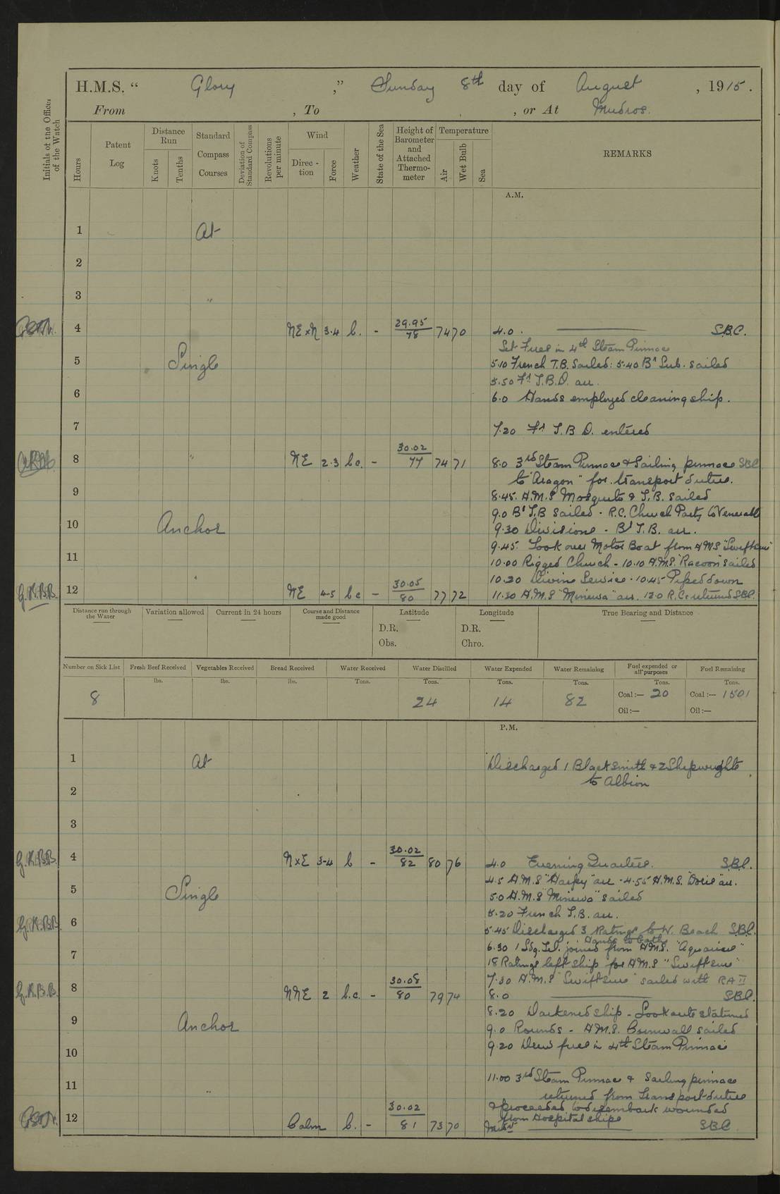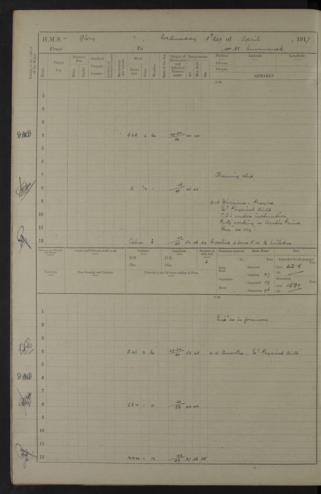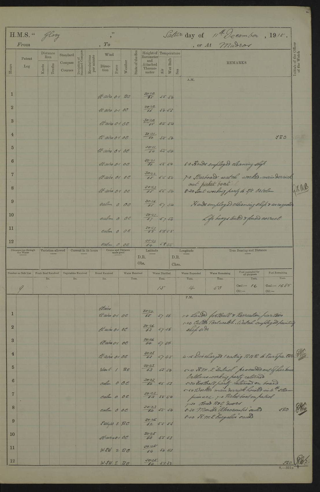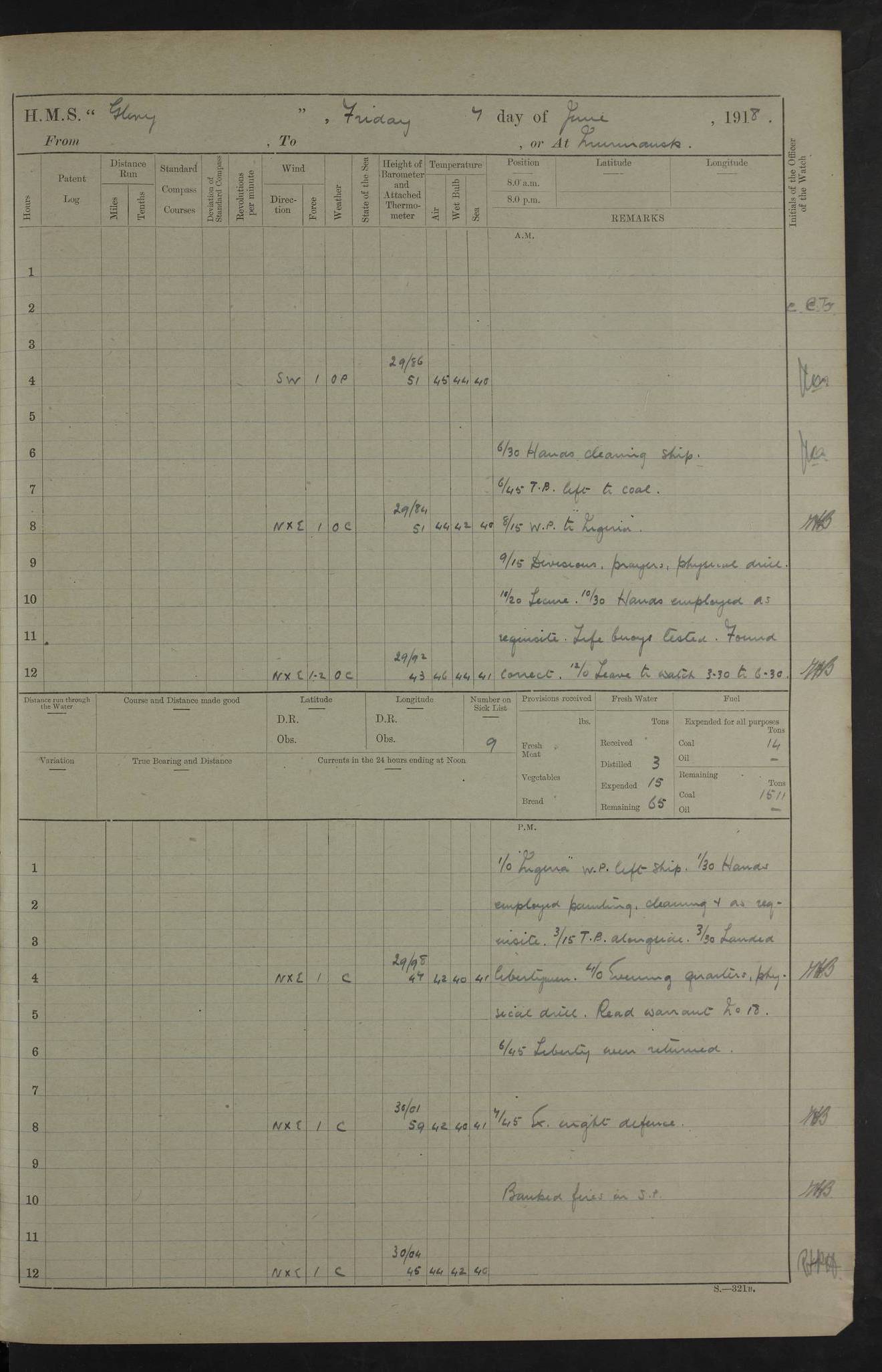 22 June 1915 At sea, Gibraltar to Lemnos Lat 36.1, Long -1.3 4.15am: Sighted land on starboard bow. 10.20am: Stopped port engine for repairs. 11.20am: proceeded with port engine. pm: a/c due to change in deviation. 10.00pm: Cape Tenez Light abeam, 18 miles. 4f73cd61a2fc8ea9030015f6: (https://s3.amazonaws.com:443/oldweather/ADM53-43015/0012_1.jpg) 23 June 1915 At sea, Gibraltar to Lemnos Lat 37.5, Long 4.8 Number on sick list: 4 5.00am: Secured from night defence stations. Placed anti-submarine guns. pm: Life saving appliances served out to men stationed in ? ?at abandon ship. 4f73cd61a2fc8ea9030015f7: (https://s3.amazonaws.com:443/oldweather/ADM53-43015/0013_0.jpg) 24 June 1915 At sea, Gibraltar to Lemnos Lat 37.4, Long 10.8 Position in log clearly bears no resemblance to the location of the ship. Position above is approximate and is based sighting of Zembra Island at 11.55am. 5.00am: Dispersed from night defence stations. Manned anti-submarine guns. am: Sighted two French torpedo boats. am: Torpedo boats passed to ~ No 362, 363. am: Sighted land on starboard beam. 11.55am: Zembra Island abeam, 25 miles. 2.00pm: Sighted Pantellaria S34ºE. 4.45pm: Pantellaria Light House abeam 12 miles. 4f73cd61a2fc8ea9030015f8: (https://s3.amazonaws.com:443/oldweather/ADM53-43015/0013_1.jpg) 25 June 1915 At sea, Gibraltar to Lemnos Lat 35.5, Long 16.7 2.10am: Gozo Light abeam 17 miles. 5.00am: Dispersed from night defence stations. Manned anti-submarine guns. 4f73cd61a2fc8ea9030015f9: (https://s3.amazonaws.com:443/oldweather/ADM53-43015/0014_0.jpg) 26 June 1915 At sea, Gibraltar to Lemnos Lat 35.5, Long 22.6 Number on sick list: 5 5.00am: Dispersed from night defence stations. Manned anti-submarine guns. am: Aired night clothing. am: marines at maxim practice on quarter deck. 2.00pm: Observed land on either bow. 3.00pm: Sighted French patrol destroyer. 4.15pm: Sighted French patrol destroyer. 9.40pm: Milo Peak N63ºW. 10.26pm: Polino Light abeam to port 5.5 miles. 4f73cd62a2fc8ea9030015fa: (https://s3.amazonaws.com:443/oldweather/ADM53-43015/0014_1.jpg) 27 June 1915 At sea and at Lemnos Lat 39.1, Long 24.4 From 0.50 to 3.05am sighting of multiple light houses. 3.50am: a/c to N39ºW and commenced to zig-zag. 5.00am: Dispersed from night defence stations and placed anti-submarine guns and look-outs. am: Lost overboard by accident Hazlewood fender, pat. 311, one in number. 10.30am: Held Divine Service onboard. pm: Met and signalled HMS Minerva on patrol duty. pm: Courses and speeds as requisite while waiting orders to approach Mudros. 3.00pm: Proceeded. 5.16pm: Increased to 90 revs, commenced to zig-zag. Course as requisite for Mudros. 7.00pm: Entered Mudros Bay. 7.47pm: Stopped. Let go port anchor in ‘M3’. 8.30pm: Darkened ship. pm: Manned one 6” and one 12 pdr. 4f73cd62a2fc8ea9030015fb: (https://s3.amazonaws.com:443/oldweather/ADM53-43015/0015_0.jpg) 28 June 1915 Mudros Bay, Lemnos Lat 39.89, Long 25.24 5,00am: HMS Vengeance entered harbour. HMS Vengeance was a pre-dreadnought of the Canopus class, launched in 1899 at Vickers, Barrow, and sold for scrapping in 1921. Details at http://en.wikipedia.org/wiki/HMS_Vengeance_(1899) . am/pm/: hands preparing for coaling and about ship’s work. pm: Collier Wabana secured alongside. 4f73cd62a2fc8ea9030015fc: (https://s3.amazonaws.com:443/oldweather/ADM53-43015/0015_1.jpg) 29 June 1915 Mudros Bay, Lemnos Lat 39.89, Long 25.24 5.15am: Commenced coaling. 2.00pm: Finished coaling. Collier left. 4f73cd62a2fc8ea9030015fd: (https://s3.amazonaws.com:443/oldweather/ADM53-43015/0016_0.jpg) 30 June 1915 Mudros Bay, Lemnos Lat 39.89, Long 25.24 am: Parties away sanding, and with fire engines onshore. am: Boats away disembarking troops. am: French Flagship Patrie sailed. The Patrie was a French pre-dreadnought, launched at La Seyne shipyard in 1903, and stricken in 1921. Details at http://en.wikipedia.org/wiki/French_battleship_Patrie . 6.30pm: Hands to bathe. 4f73cd63a2fc8ea9030015fe: (https://s3.amazonaws.com:443/oldweather/ADM53-43015/0016_1.jpg) 4f73cd63a2fc8ea9030015ff: (https://s3.amazonaws.com:443/oldweather/ADM53-43015/0017_0.jpg) 4f73cd63a2fc8ea903001600: (https://s3.amazonaws.com:443/oldweather/ADM53-43015/0017_1.jpg) 4f73cd63a2fc8ea903001601: (https://s3.amazonaws.com:443/oldweather/ADM53-43015/0018_0.jpg) 4f73cd64a2fc8ea903001602: (https://s3.amazonaws.com:443/oldweather/ADM53-43015/0018_1.jpg) LOGS FOR JULY 1915 From July to October 1915, HMS Glory spent her time at Port Mudros. Certain activities typically took place daily and are not generally noted in the pages below. These activities include: Lighting fires in the picket boat around 4am and drawing the fires in the late evening; Divisions at around 9–9.30am and Evening Quarters at 4pm; Darken ship at around 8.30pm; Daily ‘cleaning ship’, with variations thereof; SBC (for ‘Signal Books Correct’) at the watch changes. 4f73cd64a2fc8ea903001603: (https://s3.amazonaws.com:443/oldweather/ADM53-43016/0000_0.jpg) 4f73cd64a2fc8ea903001604: (https://s3.amazonaws.com:443/oldweather/ADM53-43016/0000_1.jpg) 4f73cd65a2fc8ea903001605: (https://s3.amazonaws.com:443/oldweather/ADM53-43016/0001_0.jpg) 4f73cd65a2fc8ea903001606: (https://s3.amazonaws.com:443/oldweather/ADM53-43016/0001_1.jpg) 1 July 1915 Port Mudros Lat 39.89, Long 25.24 6.30am: Landed working parties preparing boom defence ships. am: Discharged Acting Commander Rayne to Hector. Hector was a kite balloon ship. No further details readily available. 5.00pm: Tug T.10 made fast astern. 7.15pm: HMS Venerable went out. 7.30pm: HMS Chatham went out. HMS Chatham was a ‘Town’ cruiser and lead ship of her class. She was launched in 1911 at Chatham Dockyard and sold in 1926. Details at http://en.wikipedia.org/wiki/HMS_Chatham_(1911) . 4f73cd65a2fc8ea903001607: (https://s3.amazonaws.com:443/oldweather/ADM53-43016/0002_0.jpg) 2 July 1915 Port Mudros Lat 39.89, Long 25.24 5.35am: Landed working parties preparing boom defence ships. am/pm: Boom defence par