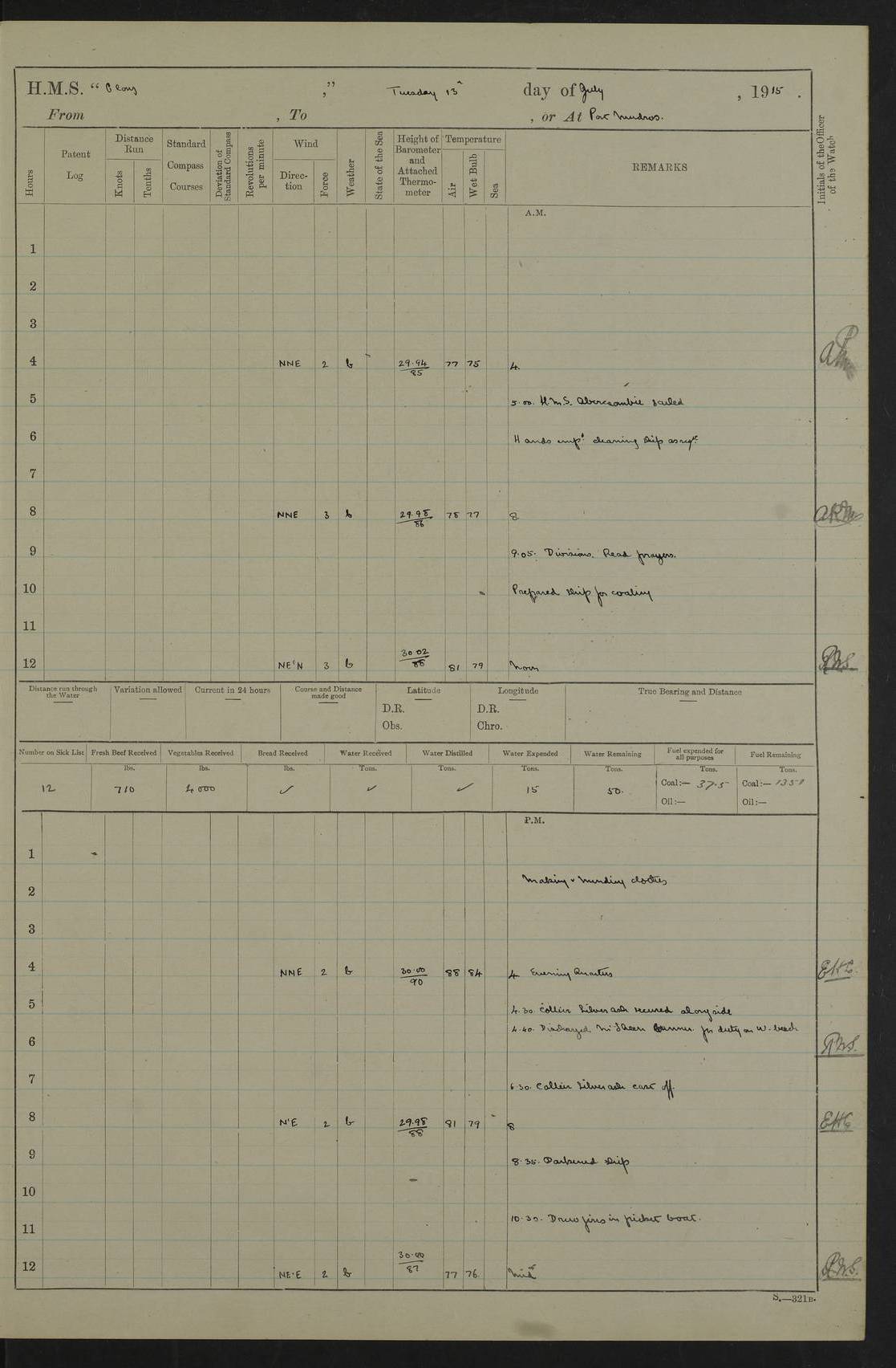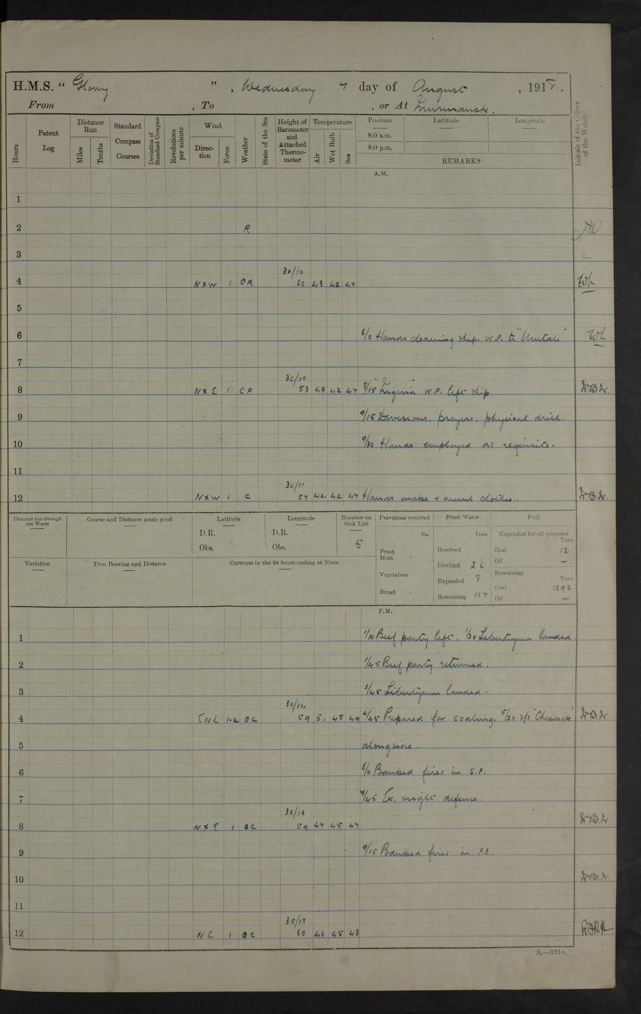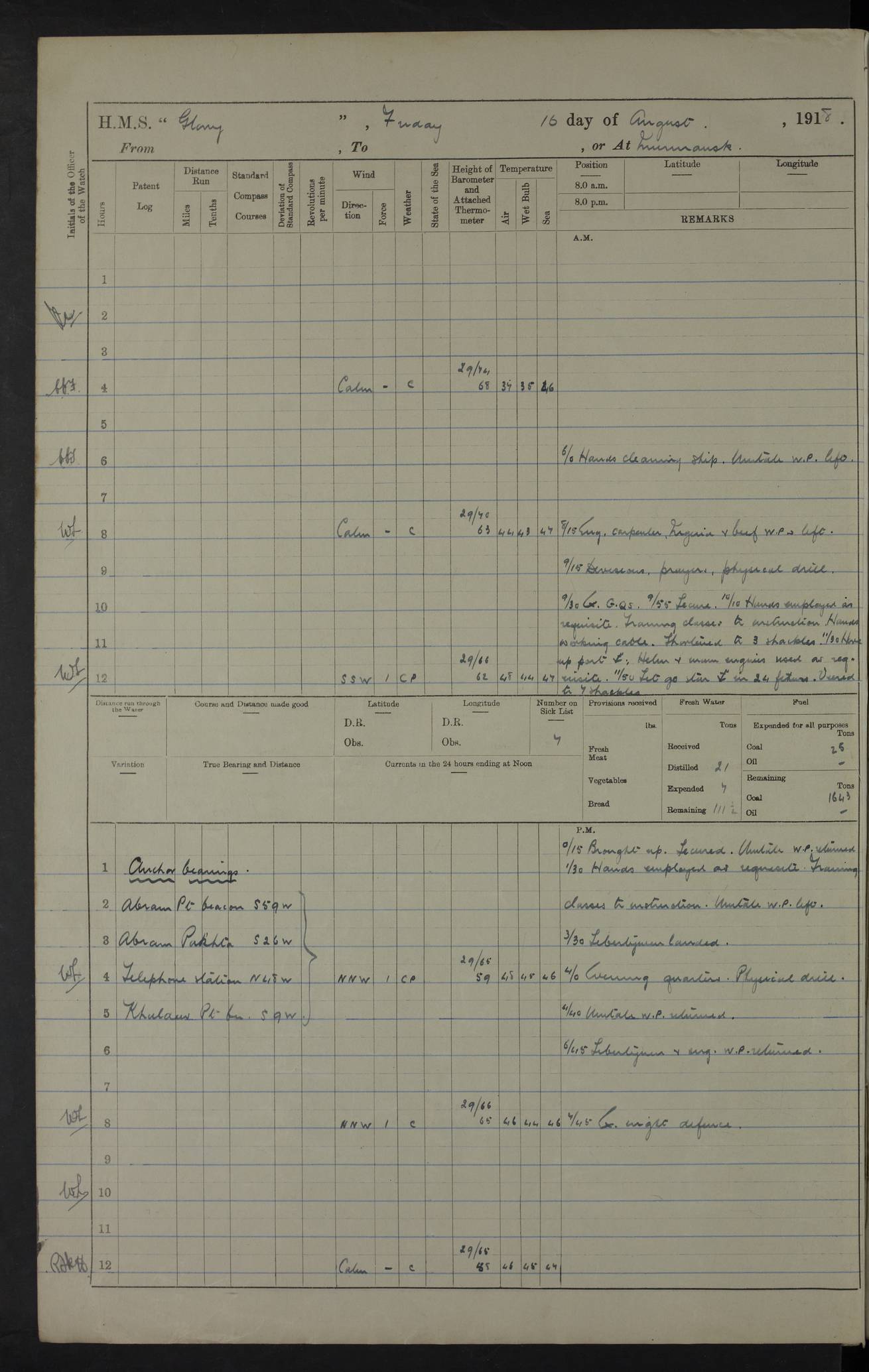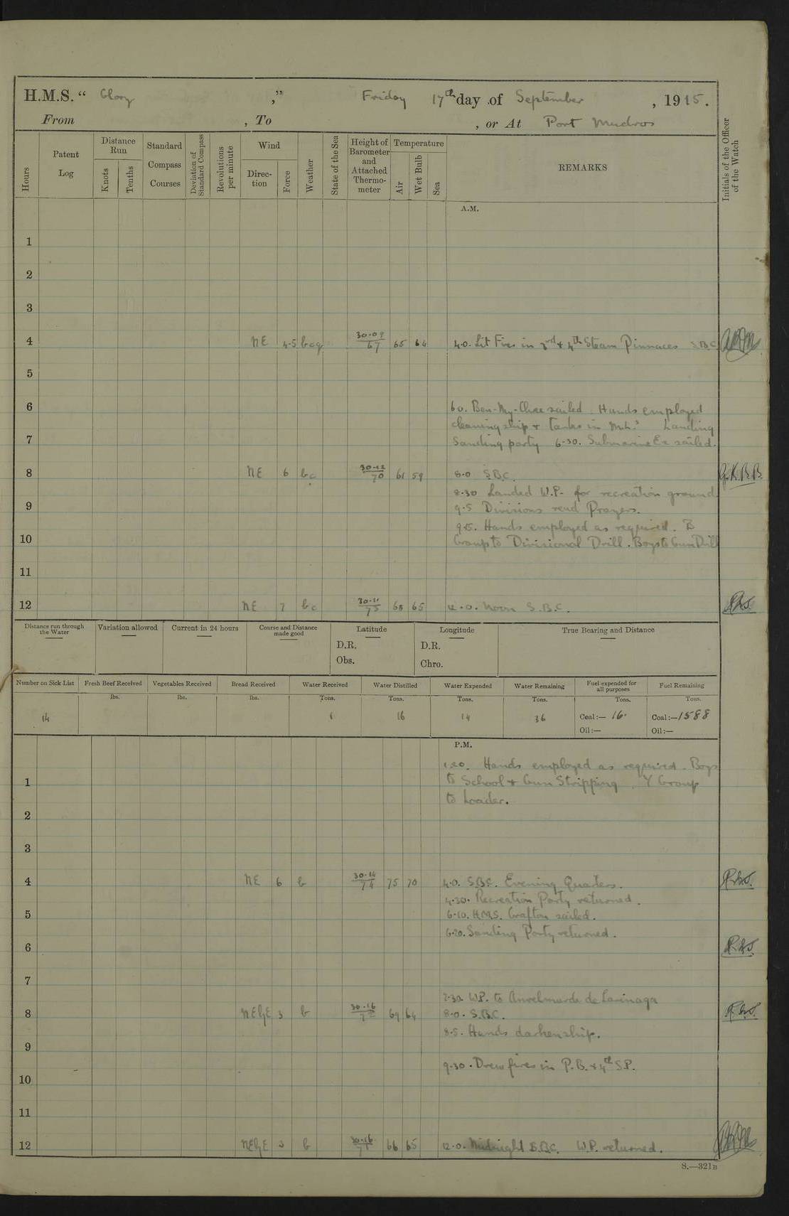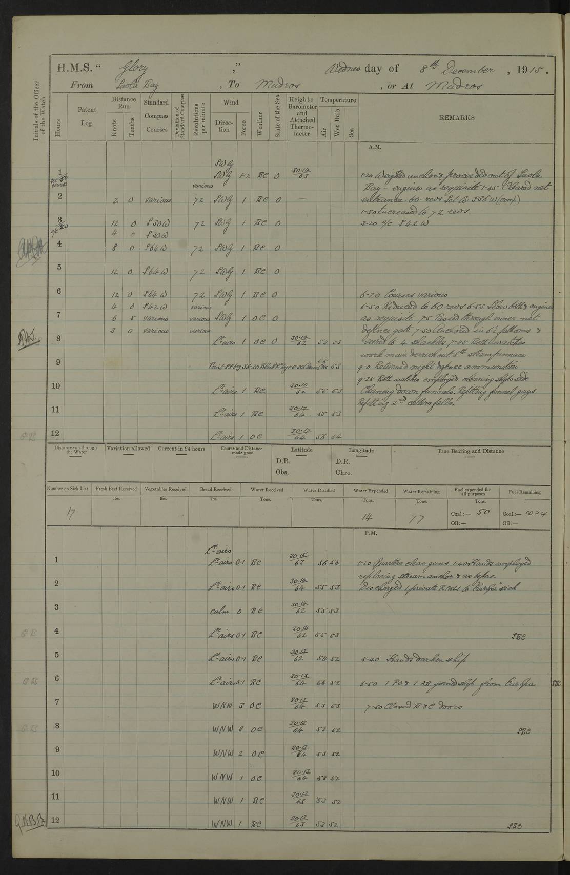 22 June 1915 At sea, Gibraltar to Lemnos Lat 36.1, Long -1.3 4.15am: Sighted land on starboard bow. 10.20am: Stopped port engine for repairs. 11.20am: proceeded with port engine. pm: a/c due to change in deviation. 10.00pm: Cape Tenez Light abeam, 18 miles. 4f73cd61a2fc8ea9030015f6: (https://s3.amazonaws.com:443/oldweather/ADM53-43015/0012_1.jpg) 23 June 1915 At sea, Gibraltar to Lemnos Lat 37.5, Long 4.8 Number on sick list: 4 5.00am: Secured from night defence stations. Placed anti-submarine guns. pm: Life saving appliances served out to men stationed in ? ?at abandon ship. 4f73cd61a2fc8ea9030015f7: (https://s3.amazonaws.com:443/oldweather/ADM53-43015/0013_0.jpg) 24 June 1915 At sea, Gibraltar to Lemnos Lat 37.4, Long 10.8 Position in log clearly bears no resemblance to the location of the ship. Position above is approximate and is based sighting of Zembra Island at 11.55am. 5.00am: Dispersed from night defence stations. Manned anti-submarine guns. am: Sighted two French torpedo boats. am: Torpedo boats passed to ~ No 362, 363. am: Sighted land on starboard beam. 11.55am: Zembra Island abeam, 25 miles. 2.00pm: Sighted Pantellaria S34ºE. 4.45pm: Pantellaria Light House abeam 12 miles. 4f73cd61a2fc8ea9030015f8: (https://s3.amazonaws.com:443/oldweather/ADM53-43015/0013_1.jpg) 25 June 1915 At sea, Gibraltar to Lemnos Lat 35.5, Long 16.7 2.10am: Gozo Light abeam 17 miles. 5.00am: Dispersed from night defence stations. Manned anti-submarine guns. 4f73cd61a2fc8ea9030015f9: (https://s3.amazonaws.com:443/oldweather/ADM53-43015/0014_0.jpg) 26 June 1915 At sea, Gibraltar to Lemnos Lat 35.5, Long 22.6 Number on sick list: 5 5.00am: Dispersed from night defence stations. Manned anti-submarine guns. am: Aired night clothing. am: marines at maxim practice on quarter deck. 2.00pm: Observed land on either bow. 3.00pm: Sighted French patrol destroyer. 4.15pm: Sighted French patrol destroyer. 9.40pm: Milo Peak N63ºW. 10.26pm: Polino Light abeam to port 5.5 miles. 4f73cd62a2fc8ea9030015fa: (https://s3.amazonaws.com:443/oldweather/ADM53-43015/0014_1.jpg) 27 June 1915 At sea and at Lemnos Lat 39.1, Long 24.4 From 0.50 to 3.05am sighting of multiple light houses. 3.50am: a/c to N39ºW and commenced to zig-zag. 5.00am: Dispersed from night defence stations and placed anti-submarine guns and look-outs. am: Lost overboard by accident Hazlewood fender, pat. 311, one in number. 10.30am: Held Divine Service onboard. pm: Met and signalled HMS Minerva on patrol duty. pm: Courses and speeds as requisite while waiting orders to approach Mudros. 3.00pm: Proceeded. 5.16pm: Increased to 90 revs, commenced to zig-zag. Course as requisite for Mudros. 7.00pm: Entered Mudros Bay. 7.47pm: Stopped. Let go port anchor in ‘M3’. 8.30pm: Darkened ship. pm: Manned one 6” and one 12 pdr. 4f73cd62a2fc8ea9030015fb: (https://s3.amazonaws.com:443/oldweather/ADM53-43015/0015_0.jpg) 28 June 1915 Mudros Bay, Lemnos Lat 39.89, Long 25.24 5,00am: HMS Vengeance entered harbour. HMS Vengeance was a pre-dreadnought of the Canopus class, launched in 1899 at Vickers, Barrow, and sold for scrapping in 1921. Details at http://en.wikipedia.org/wiki/HMS_Vengeance_(1899) . am/pm/: hands preparing for coaling and about ship’s work. pm: Collier Wabana secured alongside. 4f73cd62a2fc8ea9030015fc: (https://s3.amazonaws.com:443/oldweather/ADM53-43015/0015_1.jpg) 29 June 1915 Mudros Bay, Lemnos Lat 39.89, Long 25.24 5.15am: Commenced coaling. 2.00pm: Finished coaling. Collier left. 4f73cd62a2fc8ea9030015fd: (https://s3.amazonaws.com:443/oldweather/ADM53-43015/0016_0.jpg) 30 June 1915 Mudros Bay, Lemnos Lat 39.89, Long 25.24 am: Parties away sanding, and with fire engines onshore. am: Boats away disembarking troops. am: French Flagship Patrie sailed. The Patrie was a French pre-dreadnought, launched at La Seyne shipyard in 1903, and stricken in 1921. Details at http://en.wikipedia.org/wiki/French_battleship_Patrie . 6.30pm: Hands to bathe. 4f73cd63a2fc8ea9030015fe: (https://s3.amazonaws.com:443/oldweather/ADM53-43015/0016_1.jpg) 4f73cd63a2fc8ea9030015ff: (https://s3.amazonaws.com:443/oldweather/ADM53-43015/0017_0.jpg) 4f73cd63a2fc8ea903001600: (https://s3.amazonaws.com:443/oldweather/ADM53-43015/0017_1.jpg) 4f73cd63a2fc8ea903001601: (https://s3.amazonaws.com:443/oldweather/ADM53-43015/0018_0.jpg) 4f73cd64a2fc8ea903001602: (https://s3.amazonaws.com:443/oldweather/ADM53-43015/0018_1.jpg) LOGS FOR JULY 1915 From July to October 1915, HMS Glory spent her time at Port Mudros. Certain activities typically took place daily and are not generally noted in the pages below. These activities include: Lighting fires in the picket boat around 4am and drawing the fires in the late evening; Divisions at around 9–9.30am and Evening Quarters at 4pm; Darken ship at around 8.30pm; Daily ‘cleaning ship’, with variations thereof; SBC (for ‘Signal Books Correct’) at the watch changes. 4f73cd64a2fc8ea903001603: (https://s3.amazonaws.com:443/oldweather/ADM53-43016/0000_0.jpg) 4f73cd64a2fc8ea903001604: (https://s3.amazonaws.com:443/oldweather/ADM53-43016/0000_1.jpg) 4f73cd65a2fc8ea903001605: (https://s3.amazonaws.com:443/oldweather/ADM53-43016/0001_0.jpg) 4f73cd65a2fc8ea903001606: (https://s3.amazonaws.com:443/oldweather/ADM53-43016/0001_1.jpg) 1 July 1915 Port Mudros Lat 39.89, Long 25.24 6.30am: Landed working parties preparing boom defence ships. am: Discharged Acting Commander Rayne to Hector. Hector was a kite balloon ship. No further details readily available. 5.00pm: Tug T.10 made fast astern. 7.15pm: HMS Venerable went out. 7.30pm: HMS Chatham went out. HMS Chatham was a ‘Town’ cruiser and lead ship of her class. She was launched in 1911 at Chatham Dockyard and sold in 1926. Details at http://en.wikipedia.org/wiki/HMS_Chatham_(1911) . 4f73cd65a2fc8ea903001607: (https://s3.amazonaws.com:443/oldweather/ADM53-43016/0002_0.jpg) 2 July 1915 Port Mudros Lat 39.89, Long 25.24 5.35am: Landed working parties preparing boom defence ships. am/pm: Boom defence par