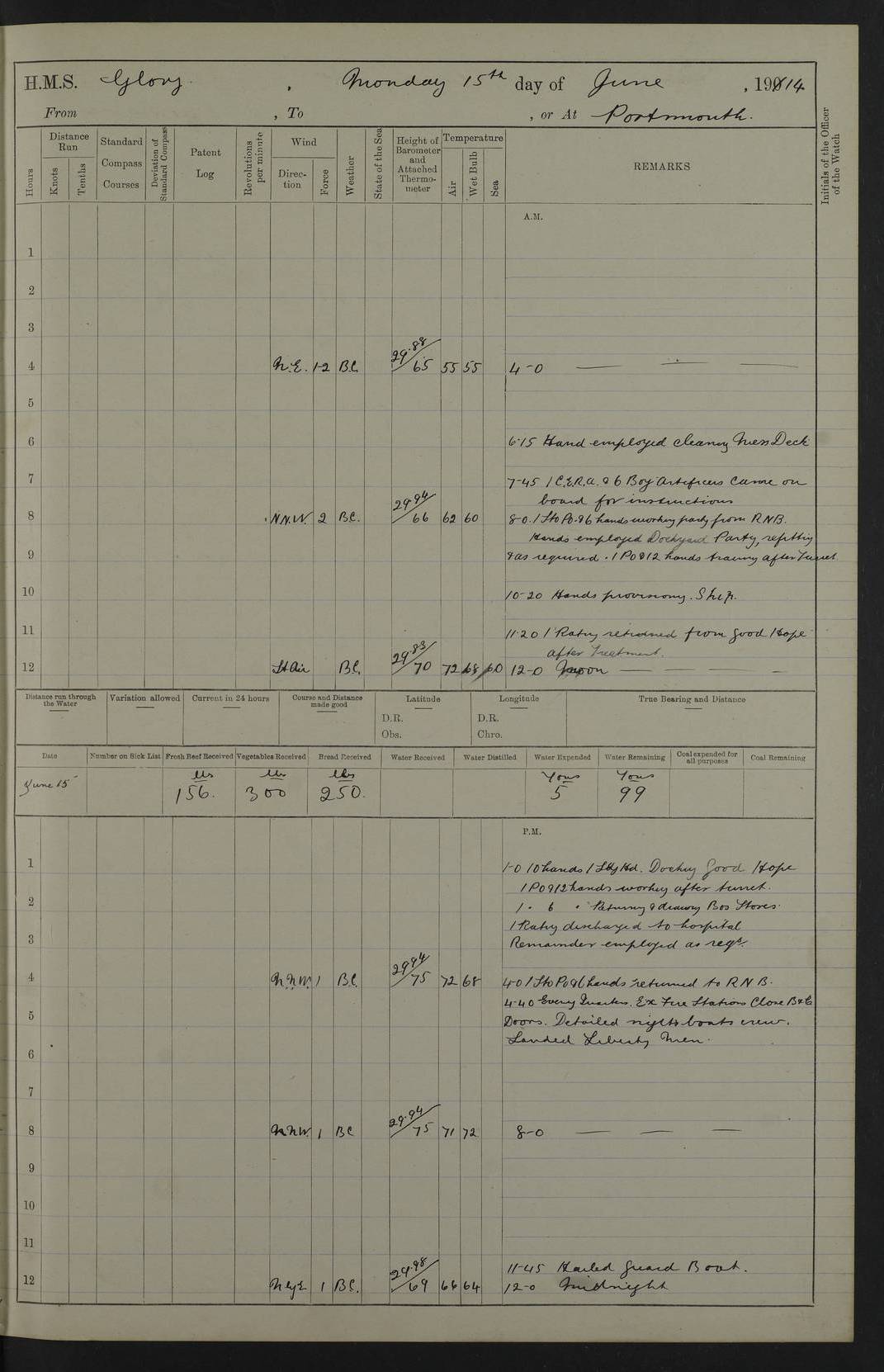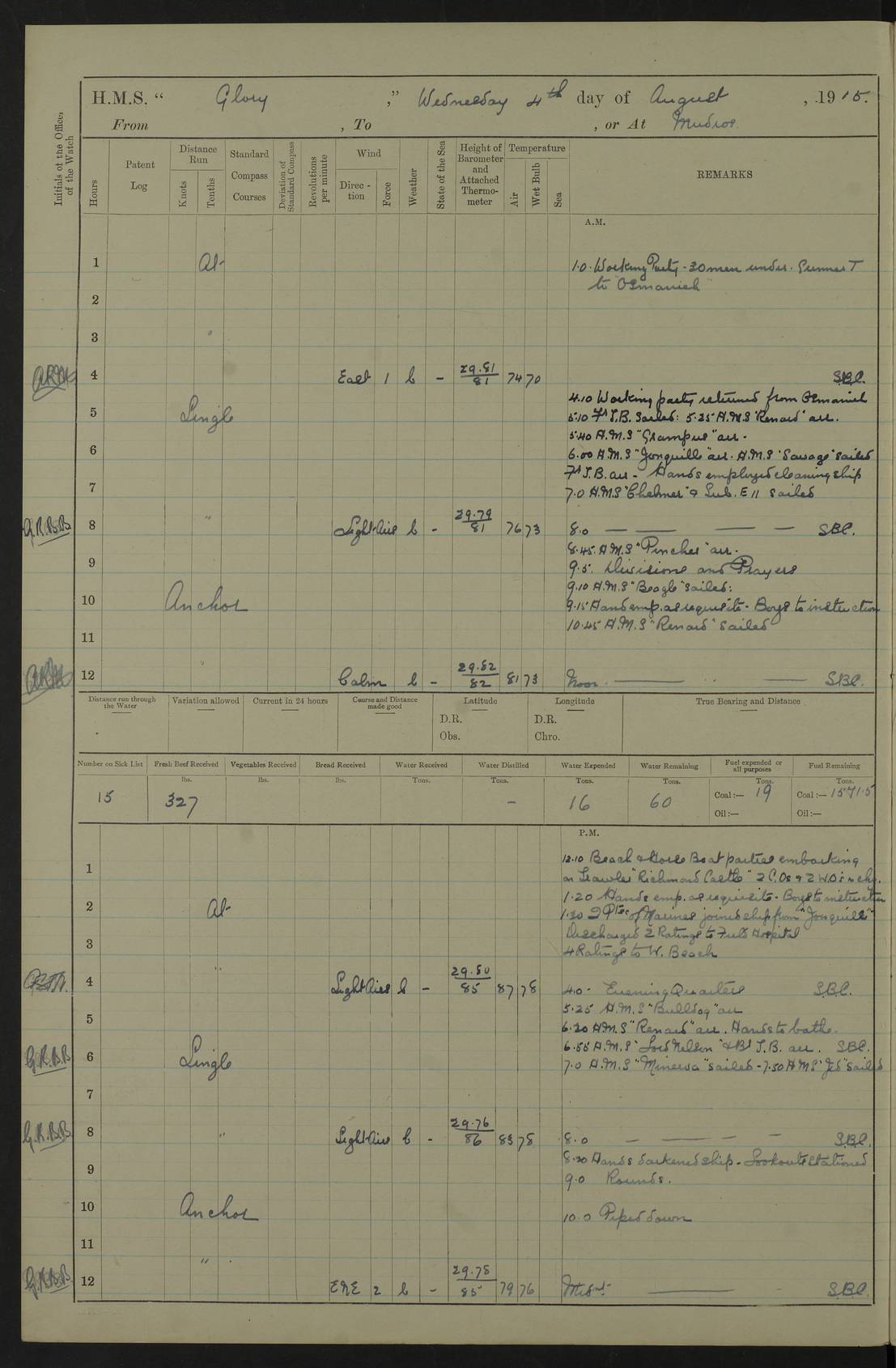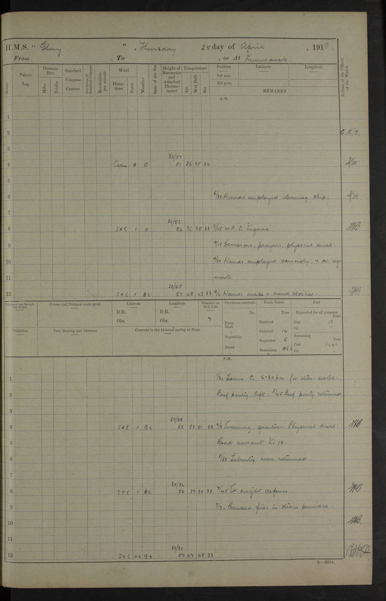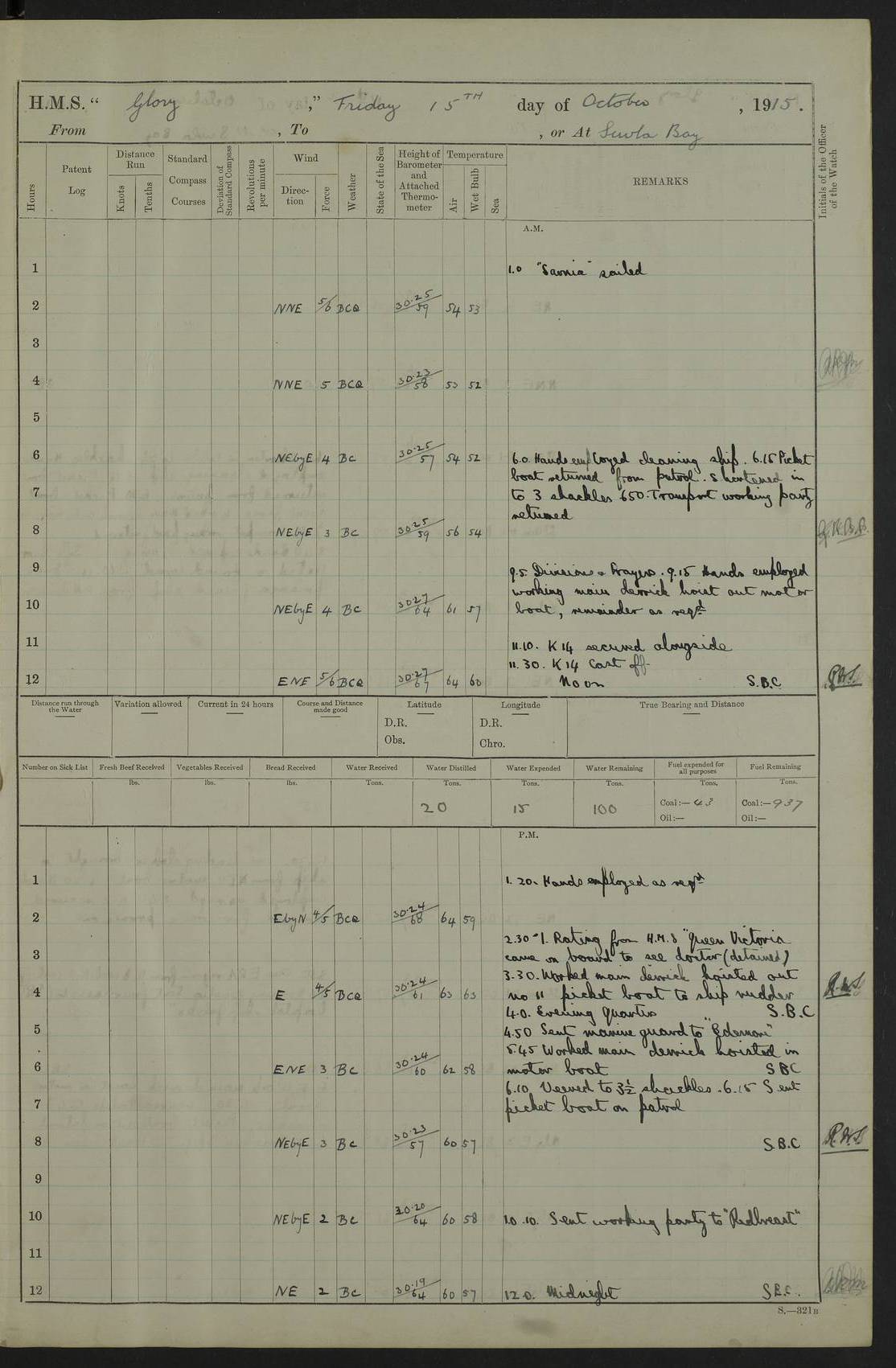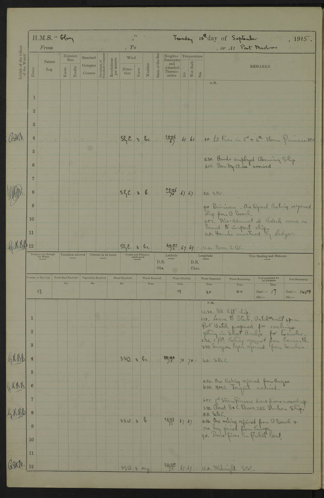 22 June 1915 At sea, Gibraltar to Lemnos Lat 36.1, Long -1.3 4.15am: Sighted land on starboard bow. 10.20am: Stopped port engine for repairs. 11.20am: proceeded with port engine. pm: a/c due to change in deviation. 10.00pm: Cape Tenez Light abeam, 18 miles. 4f73cd61a2fc8ea9030015f6: (https://s3.amazonaws.com:443/oldweather/ADM53-43015/0012_1.jpg) 23 June 1915 At sea, Gibraltar to Lemnos Lat 37.5, Long 4.8 Number on sick list: 4 5.00am: Secured from night defence stations. Placed anti-submarine guns. pm: Life saving appliances served out to men stationed in ? ?at abandon ship. 4f73cd61a2fc8ea9030015f7: (https://s3.amazonaws.com:443/oldweather/ADM53-43015/0013_0.jpg) 24 June 1915 At sea, Gibraltar to Lemnos Lat 37.4, Long 10.8 Position in log clearly bears no resemblance to the location of the ship. Position above is approximate and is based sighting of Zembra Island at 11.55am. 5.00am: Dispersed from night defence stations. Manned anti-submarine guns. am: Sighted two French torpedo boats. am: Torpedo boats passed to ~ No 362, 363. am: Sighted land on starboard beam. 11.55am: Zembra Island abeam, 25 miles. 2.00pm: Sighted Pantellaria S34ºE. 4.45pm: Pantellaria Light House abeam 12 miles. 4f73cd61a2fc8ea9030015f8: (https://s3.amazonaws.com:443/oldweather/ADM53-43015/0013_1.jpg) 25 June 1915 At sea, Gibraltar to Lemnos Lat 35.5, Long 16.7 2.10am: Gozo Light abeam 17 miles. 5.00am: Dispersed from night defence stations. Manned anti-submarine guns. 4f73cd61a2fc8ea9030015f9: (https://s3.amazonaws.com:443/oldweather/ADM53-43015/0014_0.jpg) 26 June 1915 At sea, Gibraltar to Lemnos Lat 35.5, Long 22.6 Number on sick list: 5 5.00am: Dispersed from night defence stations. Manned anti-submarine guns. am: Aired night clothing. am: marines at maxim practice on quarter deck. 2.00pm: Observed land on either bow. 3.00pm: Sighted French patrol destroyer. 4.15pm: Sighted French patrol destroyer. 9.40pm: Milo Peak N63ºW. 10.26pm: Polino Light abeam to port 5.5 miles. 4f73cd62a2fc8ea9030015fa: (https://s3.amazonaws.com:443/oldweather/ADM53-43015/0014_1.jpg) 27 June 1915 At sea and at Lemnos Lat 39.1, Long 24.4 From 0.50 to 3.05am sighting of multiple light houses. 3.50am: a/c to N39ºW and commenced to zig-zag. 5.00am: Dispersed from night defence stations and placed anti-submarine guns and look-outs. am: Lost overboard by accident Hazlewood fender, pat. 311, one in number. 10.30am: Held Divine Service onboard. pm: Met and signalled HMS Minerva on patrol duty. pm: Courses and speeds as requisite while waiting orders to approach Mudros. 3.00pm: Proceeded. 5.16pm: Increased to 90 revs, commenced to zig-zag. Course as requisite for Mudros. 7.00pm: Entered Mudros Bay. 7.47pm: Stopped. Let go port anchor in ‘M3’. 8.30pm: Darkened ship. pm: Manned one 6” and one 12 pdr. 4f73cd62a2fc8ea9030015fb: (https://s3.amazonaws.com:443/oldweather/ADM53-43015/0015_0.jpg) 28 June 1915 Mudros Bay, Lemnos Lat 39.89, Long 25.24 5,00am: HMS Vengeance entered harbour. HMS Vengeance was a pre-dreadnought of the Canopus class, launched in 1899 at Vickers, Barrow, and sold for scrapping in 1921. Details at http://en.wikipedia.org/wiki/HMS_Vengeance_(1899) . am/pm/: hands preparing for coaling and about ship’s work. pm: Collier Wabana secured alongside. 4f73cd62a2fc8ea9030015fc: (https://s3.amazonaws.com:443/oldweather/ADM53-43015/0015_1.jpg) 29 June 1915 Mudros Bay, Lemnos Lat 39.89, Long 25.24 5.15am: Commenced coaling. 2.00pm: Finished coaling. Collier left. 4f73cd62a2fc8ea9030015fd: (https://s3.amazonaws.com:443/oldweather/ADM53-43015/0016_0.jpg) 30 June 1915 Mudros Bay, Lemnos Lat 39.89, Long 25.24 am: Parties away sanding, and with fire engines onshore. am: Boats away disembarking troops. am: French Flagship Patrie sailed. The Patrie was a French pre-dreadnought, launched at La Seyne shipyard in 1903, and stricken in 1921. Details at http://en.wikipedia.org/wiki/French_battleship_Patrie . 6.30pm: Hands to bathe. 4f73cd63a2fc8ea9030015fe: (https://s3.amazonaws.com:443/oldweather/ADM53-43015/0016_1.jpg) 4f73cd63a2fc8ea9030015ff: (https://s3.amazonaws.com:443/oldweather/ADM53-43015/0017_0.jpg) 4f73cd63a2fc8ea903001600: (https://s3.amazonaws.com:443/oldweather/ADM53-43015/0017_1.jpg) 4f73cd63a2fc8ea903001601: (https://s3.amazonaws.com:443/oldweather/ADM53-43015/0018_0.jpg) 4f73cd64a2fc8ea903001602: (https://s3.amazonaws.com:443/oldweather/ADM53-43015/0018_1.jpg) LOGS FOR JULY 1915 From July to October 1915, HMS Glory spent her time at Port Mudros. Certain activities typically took place daily and are not generally noted in the pages below. These activities include: Lighting fires in the picket boat around 4am and drawing the fires in the late evening; Divisions at around 9–9.30am and Evening Quarters at 4pm; Darken ship at around 8.30pm; Daily ‘cleaning ship’, with variations thereof; SBC (for ‘Signal Books Correct’) at the watch changes. 4f73cd64a2fc8ea903001603: (https://s3.amazonaws.com:443/oldweather/ADM53-43016/0000_0.jpg) 4f73cd64a2fc8ea903001604: (https://s3.amazonaws.com:443/oldweather/ADM53-43016/0000_1.jpg) 4f73cd65a2fc8ea903001605: (https://s3.amazonaws.com:443/oldweather/ADM53-43016/0001_0.jpg) 4f73cd65a2fc8ea903001606: (https://s3.amazonaws.com:443/oldweather/ADM53-43016/0001_1.jpg) 1 July 1915 Port Mudros Lat 39.89, Long 25.24 6.30am: Landed working parties preparing boom defence ships. am: Discharged Acting Commander Rayne to Hector. Hector was a kite balloon ship. No further details readily available. 5.00pm: Tug T.10 made fast astern. 7.15pm: HMS Venerable went out. 7.30pm: HMS Chatham went out. HMS Chatham was a ‘Town’ cruiser and lead ship of her class. She was launched in 1911 at Chatham Dockyard and sold in 1926. Details at http://en.wikipedia.org/wiki/HMS_Chatham_(1911) . 4f73cd65a2fc8ea903001607: (https://s3.amazonaws.com:443/oldweather/ADM53-43016/0002_0.jpg) 2 July 1915 Port Mudros Lat 39.89, Long 25.24 5.35am: Landed working parties preparing boom defence ships. am/pm: Boom defence par