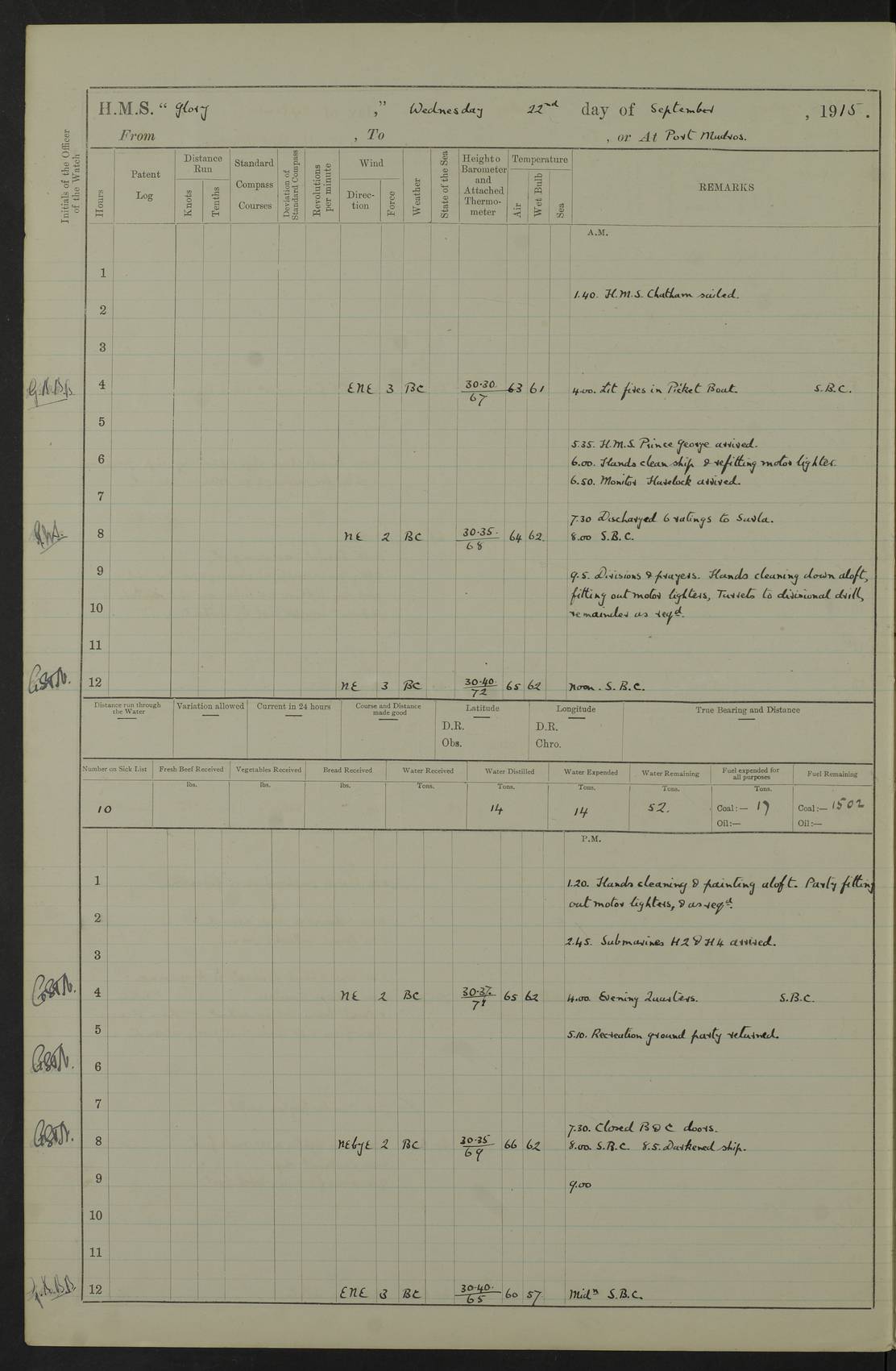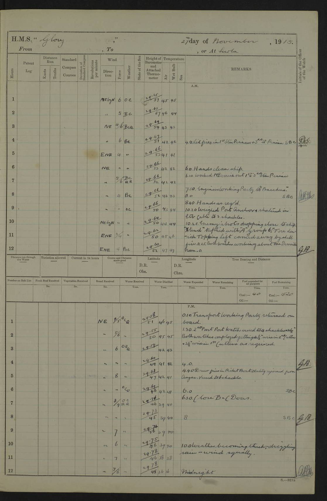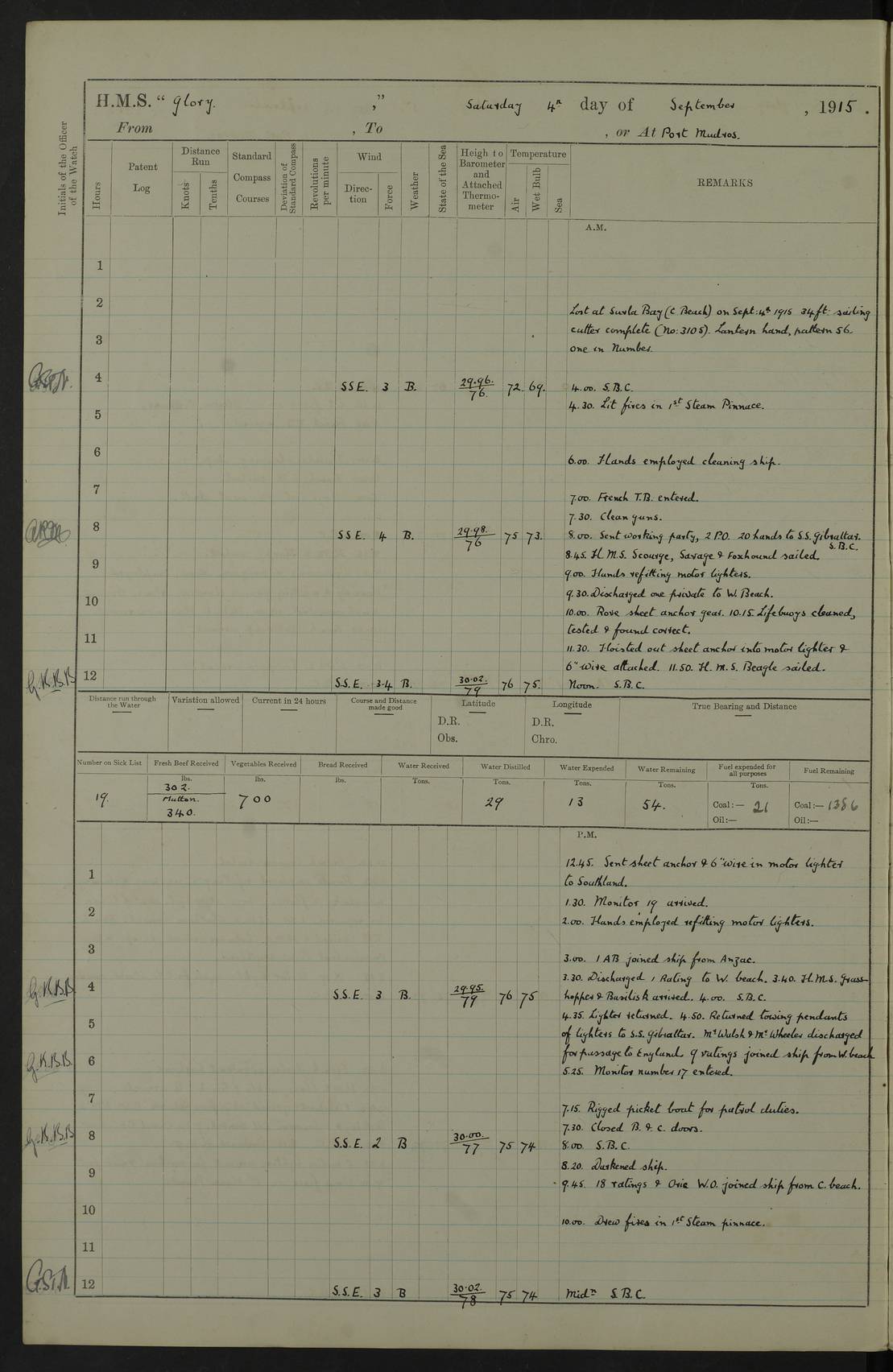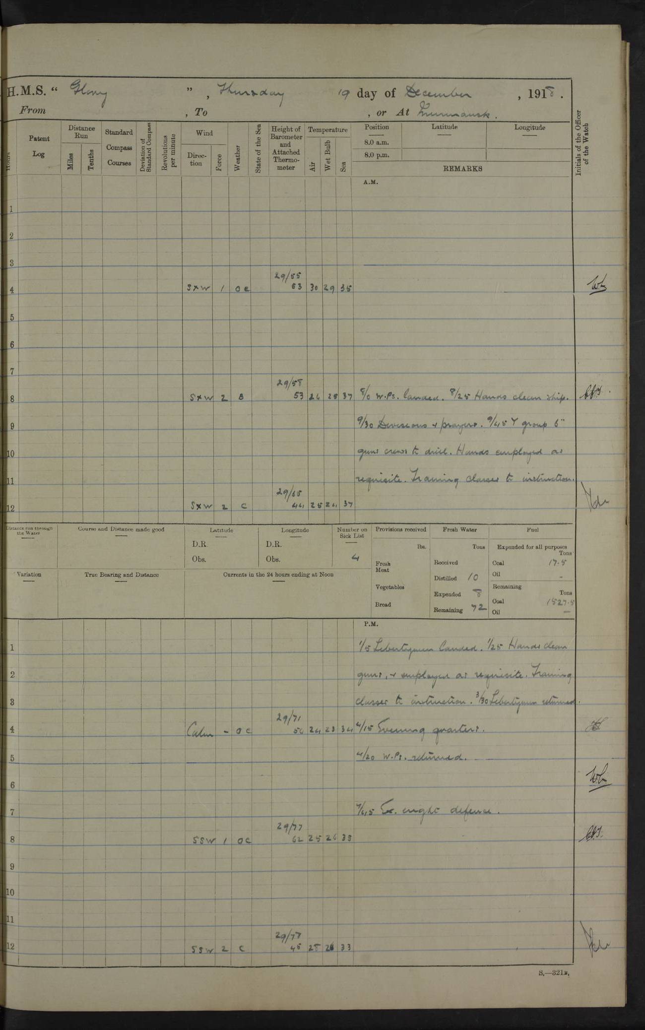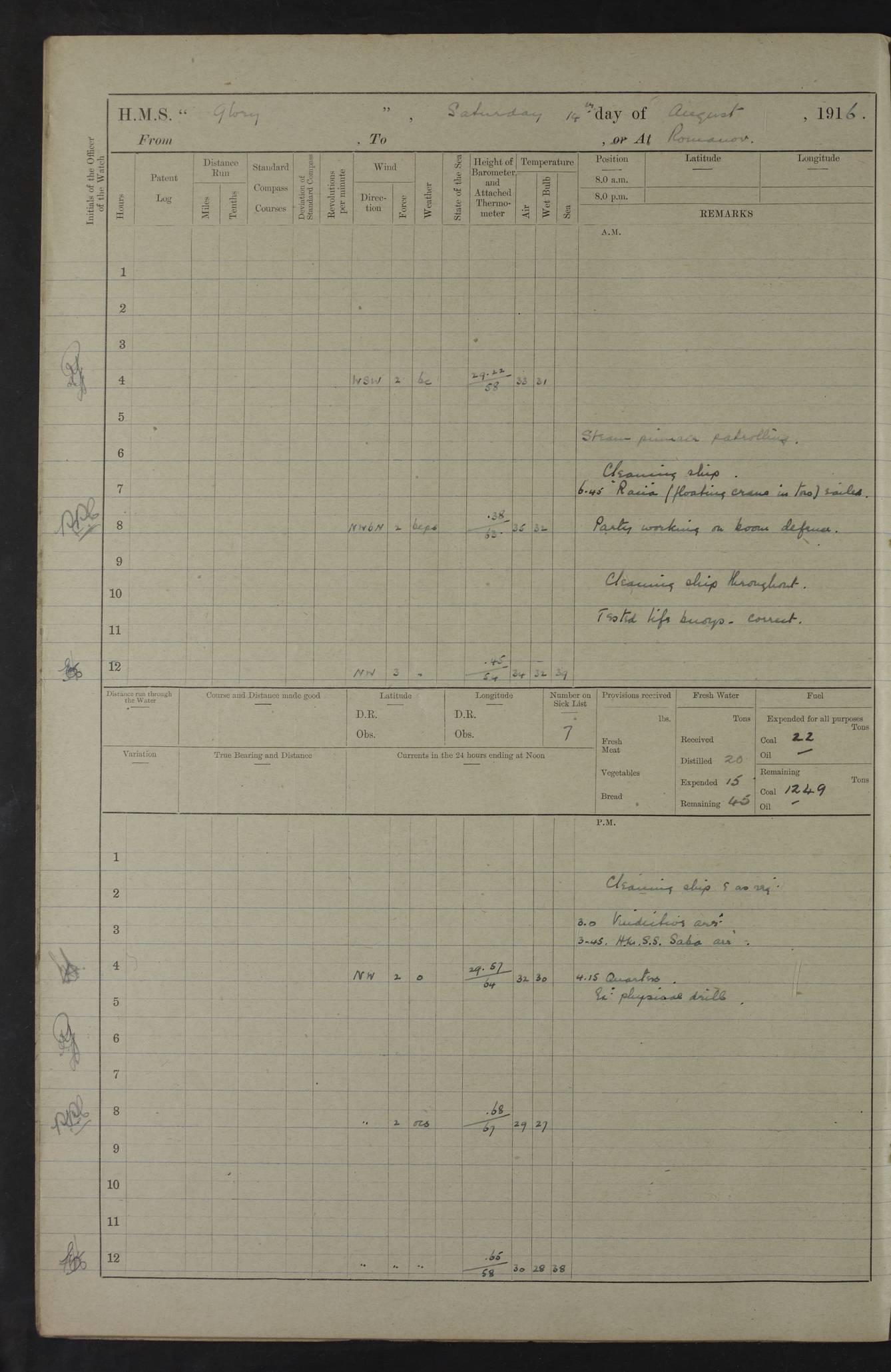 22 June 1915 At sea, Gibraltar to Lemnos Lat 36.1, Long -1.3 4.15am: Sighted land on starboard bow. 10.20am: Stopped port engine for repairs. 11.20am: proceeded with port engine. pm: a/c due to change in deviation. 10.00pm: Cape Tenez Light abeam, 18 miles. 4f73cd61a2fc8ea9030015f6: (https://s3.amazonaws.com:443/oldweather/ADM53-43015/0012_1.jpg) 23 June 1915 At sea, Gibraltar to Lemnos Lat 37.5, Long 4.8 Number on sick list: 4 5.00am: Secured from night defence stations. Placed anti-submarine guns. pm: Life saving appliances served out to men stationed in ? ?at abandon ship. 4f73cd61a2fc8ea9030015f7: (https://s3.amazonaws.com:443/oldweather/ADM53-43015/0013_0.jpg) 24 June 1915 At sea, Gibraltar to Lemnos Lat 37.4, Long 10.8 Position in log clearly bears no resemblance to the location of the ship. Position above is approximate and is based sighting of Zembra Island at 11.55am. 5.00am: Dispersed from night defence stations. Manned anti-submarine guns. am: Sighted two French torpedo boats. am: Torpedo boats passed to ~ No 362, 363. am: Sighted land on starboard beam. 11.55am: Zembra Island abeam, 25 miles. 2.00pm: Sighted Pantellaria S34ºE. 4.45pm: Pantellaria Light House abeam 12 miles. 4f73cd61a2fc8ea9030015f8: (https://s3.amazonaws.com:443/oldweather/ADM53-43015/0013_1.jpg) 25 June 1915 At sea, Gibraltar to Lemnos Lat 35.5, Long 16.7 2.10am: Gozo Light abeam 17 miles. 5.00am: Dispersed from night defence stations. Manned anti-submarine guns. 4f73cd61a2fc8ea9030015f9: (https://s3.amazonaws.com:443/oldweather/ADM53-43015/0014_0.jpg) 26 June 1915 At sea, Gibraltar to Lemnos Lat 35.5, Long 22.6 Number on sick list: 5 5.00am: Dispersed from night defence stations. Manned anti-submarine guns. am: Aired night clothing. am: marines at maxim practice on quarter deck. 2.00pm: Observed land on either bow. 3.00pm: Sighted French patrol destroyer. 4.15pm: Sighted French patrol destroyer. 9.40pm: Milo Peak N63ºW. 10.26pm: Polino Light abeam to port 5.5 miles. 4f73cd62a2fc8ea9030015fa: (https://s3.amazonaws.com:443/oldweather/ADM53-43015/0014_1.jpg) 27 June 1915 At sea and at Lemnos Lat 39.1, Long 24.4 From 0.50 to 3.05am sighting of multiple light houses. 3.50am: a/c to N39ºW and commenced to zig-zag. 5.00am: Dispersed from night defence stations and placed anti-submarine guns and look-outs. am: Lost overboard by accident Hazlewood fender, pat. 311, one in number. 10.30am: Held Divine Service onboard. pm: Met and signalled HMS Minerva on patrol duty. pm: Courses and speeds as requisite while waiting orders to approach Mudros. 3.00pm: Proceeded. 5.16pm: Increased to 90 revs, commenced to zig-zag. Course as requisite for Mudros. 7.00pm: Entered Mudros Bay. 7.47pm: Stopped. Let go port anchor in ‘M3’. 8.30pm: Darkened ship. pm: Manned one 6” and one 12 pdr. 4f73cd62a2fc8ea9030015fb: (https://s3.amazonaws.com:443/oldweather/ADM53-43015/0015_0.jpg) 28 June 1915 Mudros Bay, Lemnos Lat 39.89, Long 25.24 5,00am: HMS Vengeance entered harbour. HMS Vengeance was a pre-dreadnought of the Canopus class, launched in 1899 at Vickers, Barrow, and sold for scrapping in 1921. Details at http://en.wikipedia.org/wiki/HMS_Vengeance_(1899) . am/pm/: hands preparing for coaling and about ship’s work. pm: Collier Wabana secured alongside. 4f73cd62a2fc8ea9030015fc: (https://s3.amazonaws.com:443/oldweather/ADM53-43015/0015_1.jpg) 29 June 1915 Mudros Bay, Lemnos Lat 39.89, Long 25.24 5.15am: Commenced coaling. 2.00pm: Finished coaling. Collier left. 4f73cd62a2fc8ea9030015fd: (https://s3.amazonaws.com:443/oldweather/ADM53-43015/0016_0.jpg) 30 June 1915 Mudros Bay, Lemnos Lat 39.89, Long 25.24 am: Parties away sanding, and with fire engines onshore. am: Boats away disembarking troops. am: French Flagship Patrie sailed. The Patrie was a French pre-dreadnought, launched at La Seyne shipyard in 1903, and stricken in 1921. Details at http://en.wikipedia.org/wiki/French_battleship_Patrie . 6.30pm: Hands to bathe. 4f73cd63a2fc8ea9030015fe: (https://s3.amazonaws.com:443/oldweather/ADM53-43015/0016_1.jpg) 4f73cd63a2fc8ea9030015ff: (https://s3.amazonaws.com:443/oldweather/ADM53-43015/0017_0.jpg) 4f73cd63a2fc8ea903001600: (https://s3.amazonaws.com:443/oldweather/ADM53-43015/0017_1.jpg) 4f73cd63a2fc8ea903001601: (https://s3.amazonaws.com:443/oldweather/ADM53-43015/0018_0.jpg) 4f73cd64a2fc8ea903001602: (https://s3.amazonaws.com:443/oldweather/ADM53-43015/0018_1.jpg) LOGS FOR JULY 1915 From July to October 1915, HMS Glory spent her time at Port Mudros. Certain activities typically took place daily and are not generally noted in the pages below. These activities include: Lighting fires in the picket boat around 4am and drawing the fires in the late evening; Divisions at around 9–9.30am and Evening Quarters at 4pm; Darken ship at around 8.30pm; Daily ‘cleaning ship’, with variations thereof; SBC (for ‘Signal Books Correct’) at the watch changes. 4f73cd64a2fc8ea903001603: (https://s3.amazonaws.com:443/oldweather/ADM53-43016/0000_0.jpg) 4f73cd64a2fc8ea903001604: (https://s3.amazonaws.com:443/oldweather/ADM53-43016/0000_1.jpg) 4f73cd65a2fc8ea903001605: (https://s3.amazonaws.com:443/oldweather/ADM53-43016/0001_0.jpg) 4f73cd65a2fc8ea903001606: (https://s3.amazonaws.com:443/oldweather/ADM53-43016/0001_1.jpg) 1 July 1915 Port Mudros Lat 39.89, Long 25.24 6.30am: Landed working parties preparing boom defence ships. am: Discharged Acting Commander Rayne to Hector. Hector was a kite balloon ship. No further details readily available. 5.00pm: Tug T.10 made fast astern. 7.15pm: HMS Venerable went out. 7.30pm: HMS Chatham went out. HMS Chatham was a ‘Town’ cruiser and lead ship of her class. She was launched in 1911 at Chatham Dockyard and sold in 1926. Details at http://en.wikipedia.org/wiki/HMS_Chatham_(1911) . 4f73cd65a2fc8ea903001607: (https://s3.amazonaws.com:443/oldweather/ADM53-43016/0002_0.jpg) 2 July 1915 Port Mudros Lat 39.89, Long 25.24 5.35am: Landed working parties preparing boom defence ships. am/pm: Boom defence par