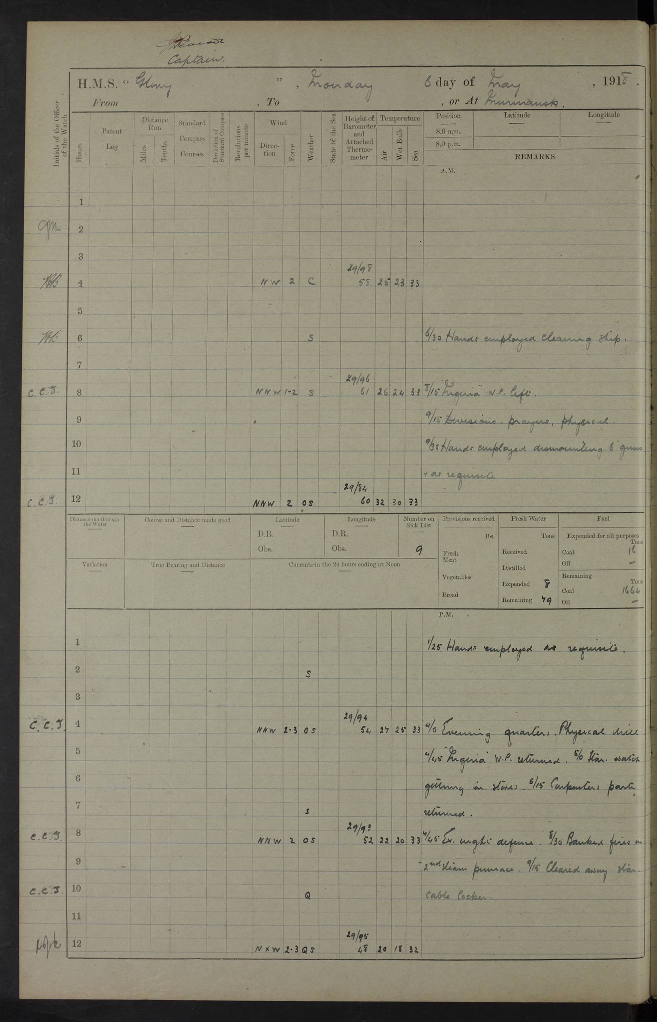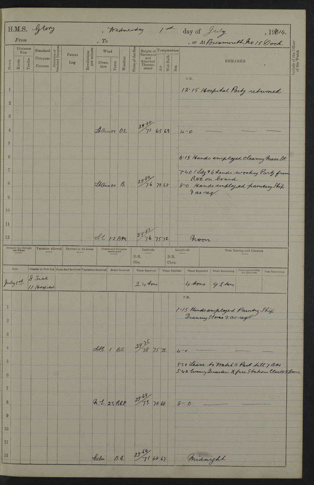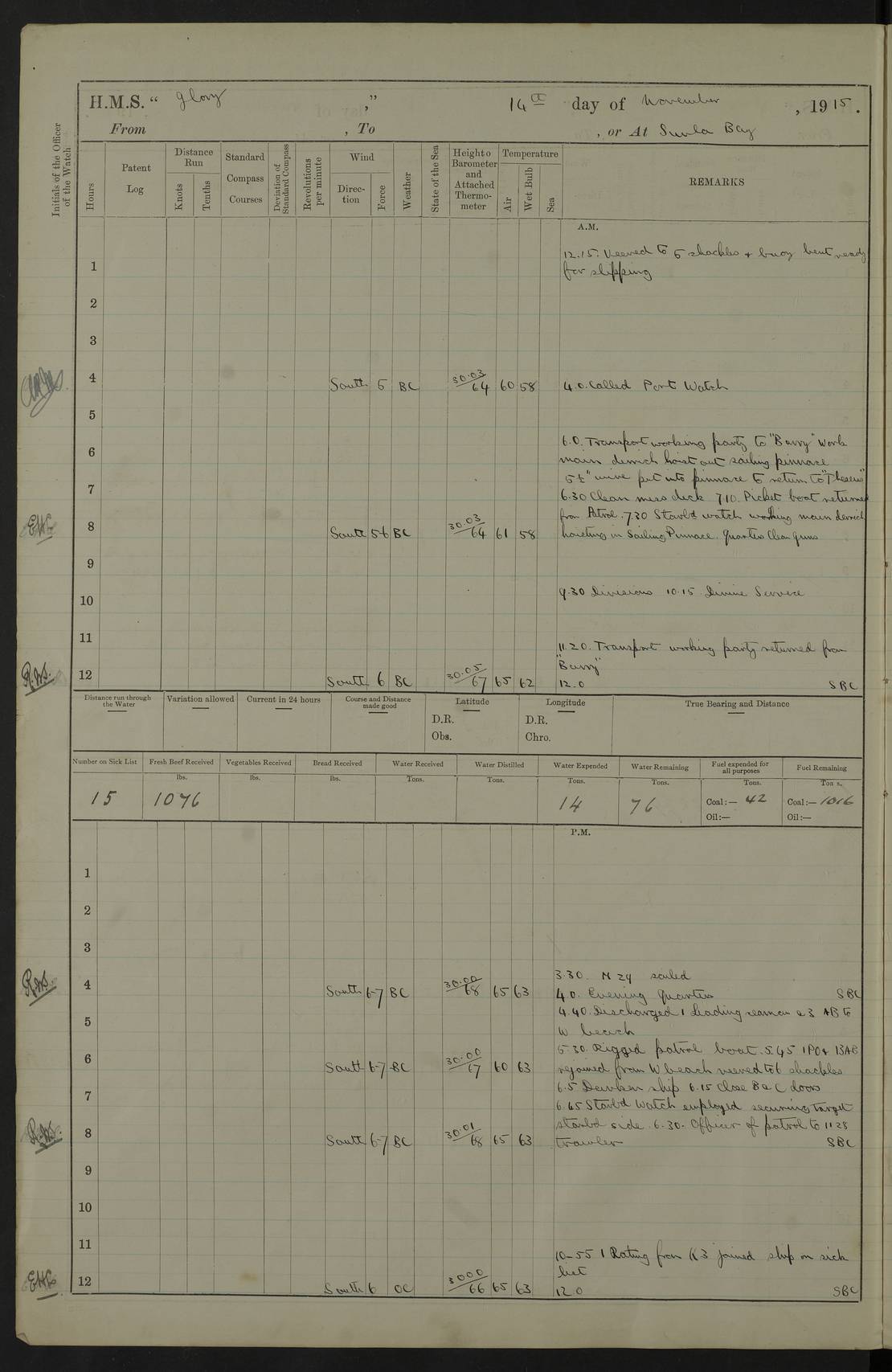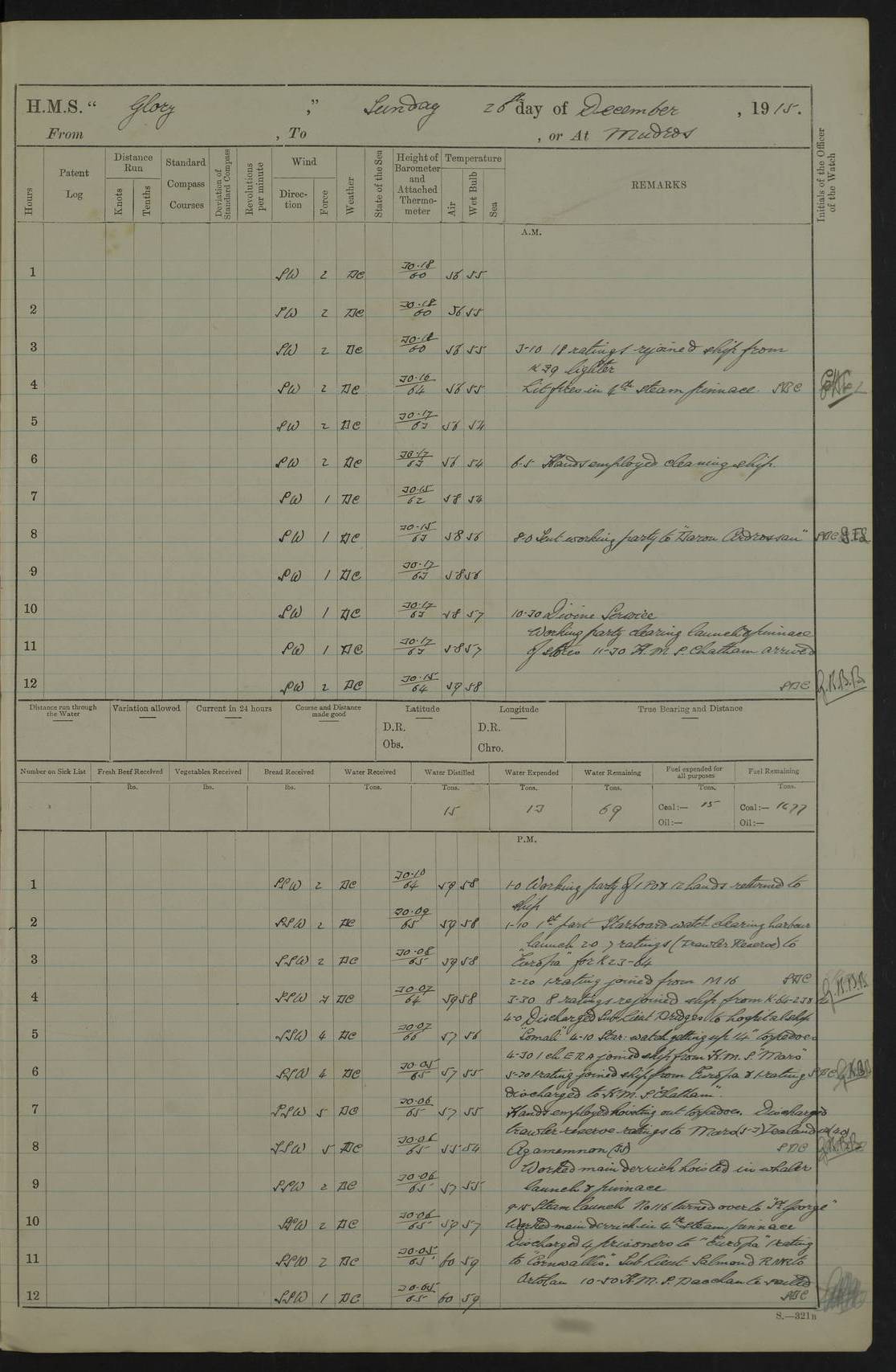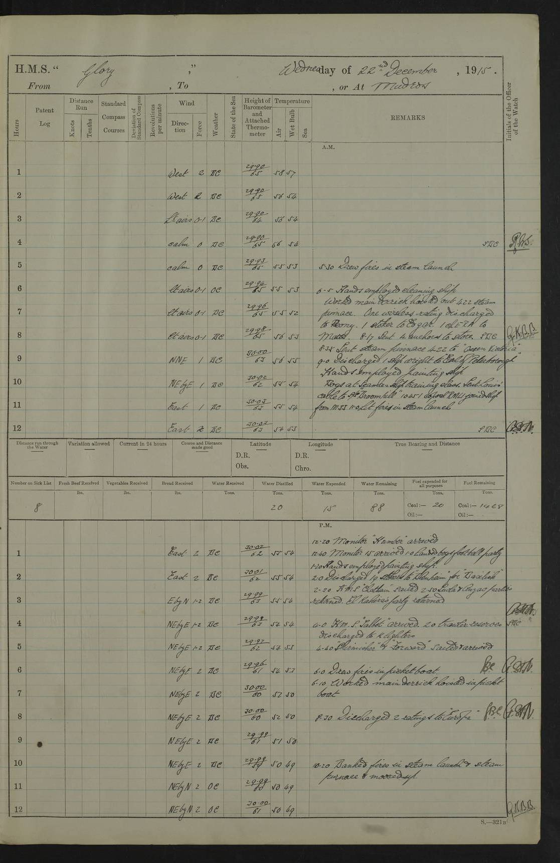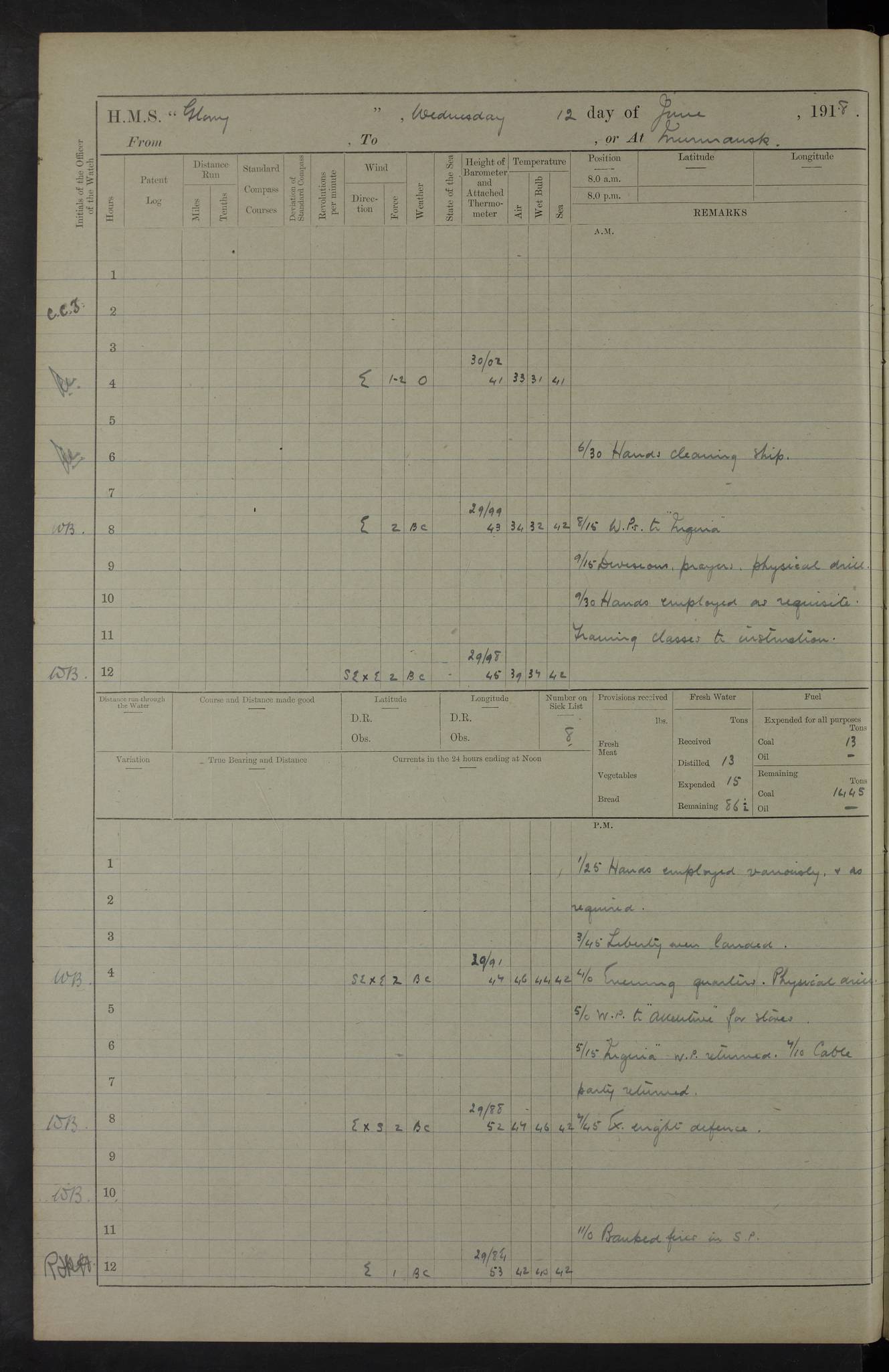 22 June 1915 At sea, Gibraltar to Lemnos Lat 36.1, Long -1.3 4.15am: Sighted land on starboard bow. 10.20am: Stopped port engine for repairs. 11.20am: proceeded with port engine. pm: a/c due to change in deviation. 10.00pm: Cape Tenez Light abeam, 18 miles. 4f73cd61a2fc8ea9030015f6: (https://s3.amazonaws.com:443/oldweather/ADM53-43015/0012_1.jpg) 23 June 1915 At sea, Gibraltar to Lemnos Lat 37.5, Long 4.8 Number on sick list: 4 5.00am: Secured from night defence stations. Placed anti-submarine guns. pm: Life saving appliances served out to men stationed in ? ?at abandon ship. 4f73cd61a2fc8ea9030015f7: (https://s3.amazonaws.com:443/oldweather/ADM53-43015/0013_0.jpg) 24 June 1915 At sea, Gibraltar to Lemnos Lat 37.4, Long 10.8 Position in log clearly bears no resemblance to the location of the ship. Position above is approximate and is based sighting of Zembra Island at 11.55am. 5.00am: Dispersed from night defence stations. Manned anti-submarine guns. am: Sighted two French torpedo boats. am: Torpedo boats passed to ~ No 362, 363. am: Sighted land on starboard beam. 11.55am: Zembra Island abeam, 25 miles. 2.00pm: Sighted Pantellaria S34ºE. 4.45pm: Pantellaria Light House abeam 12 miles. 4f73cd61a2fc8ea9030015f8: (https://s3.amazonaws.com:443/oldweather/ADM53-43015/0013_1.jpg) 25 June 1915 At sea, Gibraltar to Lemnos Lat 35.5, Long 16.7 2.10am: Gozo Light abeam 17 miles. 5.00am: Dispersed from night defence stations. Manned anti-submarine guns. 4f73cd61a2fc8ea9030015f9: (https://s3.amazonaws.com:443/oldweather/ADM53-43015/0014_0.jpg) 26 June 1915 At sea, Gibraltar to Lemnos Lat 35.5, Long 22.6 Number on sick list: 5 5.00am: Dispersed from night defence stations. Manned anti-submarine guns. am: Aired night clothing. am: marines at maxim practice on quarter deck. 2.00pm: Observed land on either bow. 3.00pm: Sighted French patrol destroyer. 4.15pm: Sighted French patrol destroyer. 9.40pm: Milo Peak N63ºW. 10.26pm: Polino Light abeam to port 5.5 miles. 4f73cd62a2fc8ea9030015fa: (https://s3.amazonaws.com:443/oldweather/ADM53-43015/0014_1.jpg) 27 June 1915 At sea and at Lemnos Lat 39.1, Long 24.4 From 0.50 to 3.05am sighting of multiple light houses. 3.50am: a/c to N39ºW and commenced to zig-zag. 5.00am: Dispersed from night defence stations and placed anti-submarine guns and look-outs. am: Lost overboard by accident Hazlewood fender, pat. 311, one in number. 10.30am: Held Divine Service onboard. pm: Met and signalled HMS Minerva on patrol duty. pm: Courses and speeds as requisite while waiting orders to approach Mudros. 3.00pm: Proceeded. 5.16pm: Increased to 90 revs, commenced to zig-zag. Course as requisite for Mudros. 7.00pm: Entered Mudros Bay. 7.47pm: Stopped. Let go port anchor in ‘M3’. 8.30pm: Darkened ship. pm: Manned one 6” and one 12 pdr. 4f73cd62a2fc8ea9030015fb: (https://s3.amazonaws.com:443/oldweather/ADM53-43015/0015_0.jpg) 28 June 1915 Mudros Bay, Lemnos Lat 39.89, Long 25.24 5,00am: HMS Vengeance entered harbour. HMS Vengeance was a pre-dreadnought of the Canopus class, launched in 1899 at Vickers, Barrow, and sold for scrapping in 1921. Details at http://en.wikipedia.org/wiki/HMS_Vengeance_(1899) . am/pm/: hands preparing for coaling and about ship’s work. pm: Collier Wabana secured alongside. 4f73cd62a2fc8ea9030015fc: (https://s3.amazonaws.com:443/oldweather/ADM53-43015/0015_1.jpg) 29 June 1915 Mudros Bay, Lemnos Lat 39.89, Long 25.24 5.15am: Commenced coaling. 2.00pm: Finished coaling. Collier left. 4f73cd62a2fc8ea9030015fd: (https://s3.amazonaws.com:443/oldweather/ADM53-43015/0016_0.jpg) 30 June 1915 Mudros Bay, Lemnos Lat 39.89, Long 25.24 am: Parties away sanding, and with fire engines onshore. am: Boats away disembarking troops. am: French Flagship Patrie sailed. The Patrie was a French pre-dreadnought, launched at La Seyne shipyard in 1903, and stricken in 1921. Details at http://en.wikipedia.org/wiki/French_battleship_Patrie . 6.30pm: Hands to bathe. 4f73cd63a2fc8ea9030015fe: (https://s3.amazonaws.com:443/oldweather/ADM53-43015/0016_1.jpg) 4f73cd63a2fc8ea9030015ff: (https://s3.amazonaws.com:443/oldweather/ADM53-43015/0017_0.jpg) 4f73cd63a2fc8ea903001600: (https://s3.amazonaws.com:443/oldweather/ADM53-43015/0017_1.jpg) 4f73cd63a2fc8ea903001601: (https://s3.amazonaws.com:443/oldweather/ADM53-43015/0018_0.jpg) 4f73cd64a2fc8ea903001602: (https://s3.amazonaws.com:443/oldweather/ADM53-43015/0018_1.jpg) LOGS FOR JULY 1915 From July to October 1915, HMS Glory spent her time at Port Mudros. Certain activities typically took place daily and are not generally noted in the pages below. These activities include: Lighting fires in the picket boat around 4am and drawing the fires in the late evening; Divisions at around 9–9.30am and Evening Quarters at 4pm; Darken ship at around 8.30pm; Daily ‘cleaning ship’, with variations thereof; SBC (for ‘Signal Books Correct’) at the watch changes. 4f73cd64a2fc8ea903001603: (https://s3.amazonaws.com:443/oldweather/ADM53-43016/0000_0.jpg) 4f73cd64a2fc8ea903001604: (https://s3.amazonaws.com:443/oldweather/ADM53-43016/0000_1.jpg) 4f73cd65a2fc8ea903001605: (https://s3.amazonaws.com:443/oldweather/ADM53-43016/0001_0.jpg) 4f73cd65a2fc8ea903001606: (https://s3.amazonaws.com:443/oldweather/ADM53-43016/0001_1.jpg) 1 July 1915 Port Mudros Lat 39.89, Long 25.24 6.30am: Landed working parties preparing boom defence ships. am: Discharged Acting Commander Rayne to Hector. Hector was a kite balloon ship. No further details readily available. 5.00pm: Tug T.10 made fast astern. 7.15pm: HMS Venerable went out. 7.30pm: HMS Chatham went out. HMS Chatham was a ‘Town’ cruiser and lead ship of her class. She was launched in 1911 at Chatham Dockyard and sold in 1926. Details at http://en.wikipedia.org/wiki/HMS_Chatham_(1911) . 4f73cd65a2fc8ea903001607: (https://s3.amazonaws.com:443/oldweather/ADM53-43016/0002_0.jpg) 2 July 1915 Port Mudros Lat 39.89, Long 25.24 5.35am: Landed working parties preparing boom defence ships. am/pm: Boom defence par