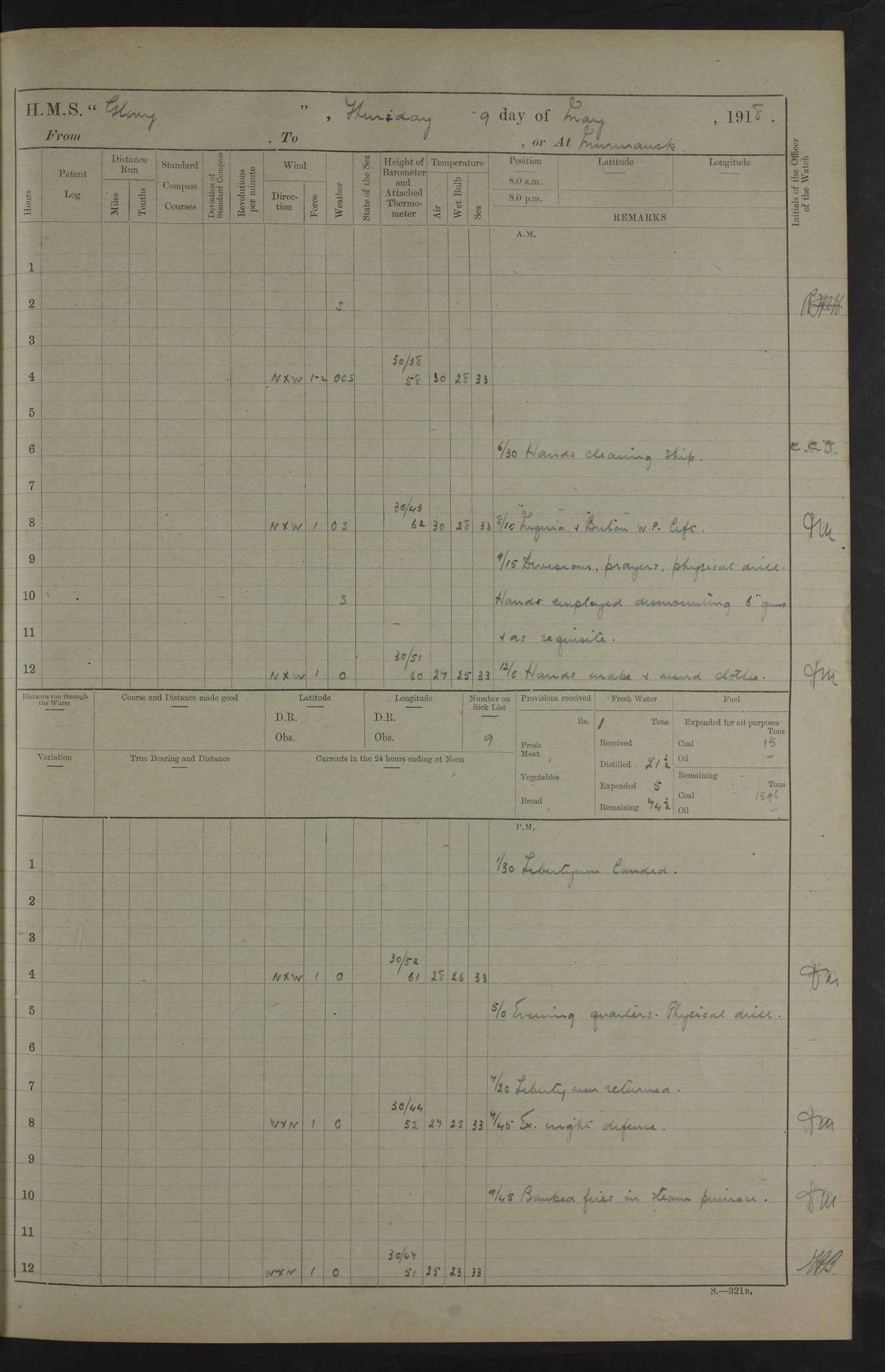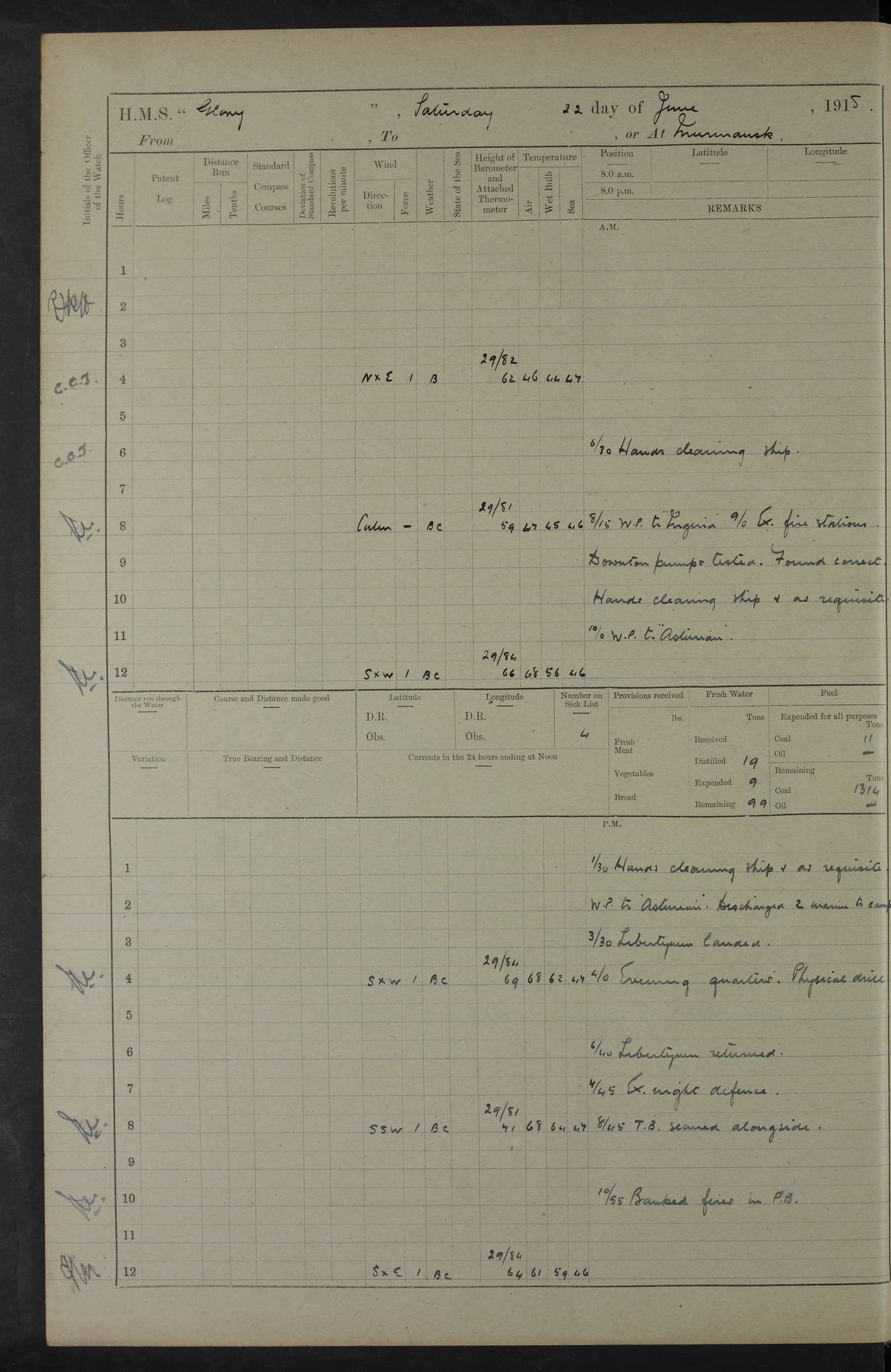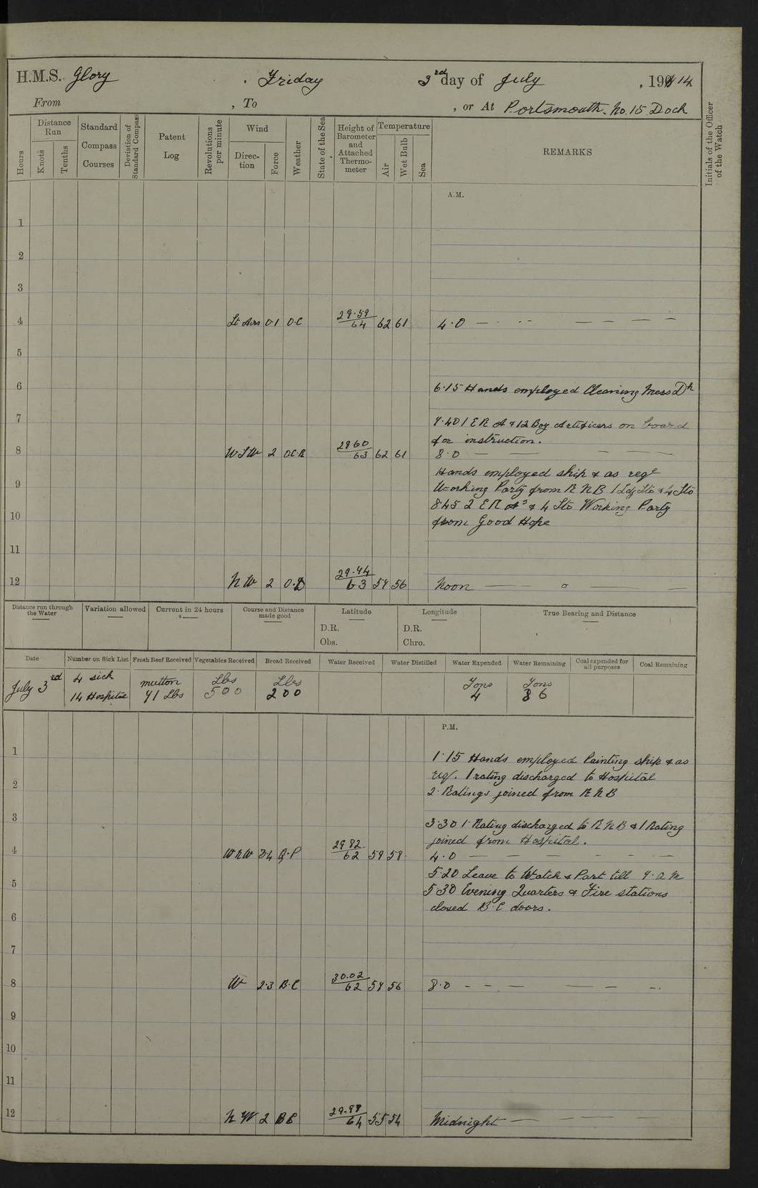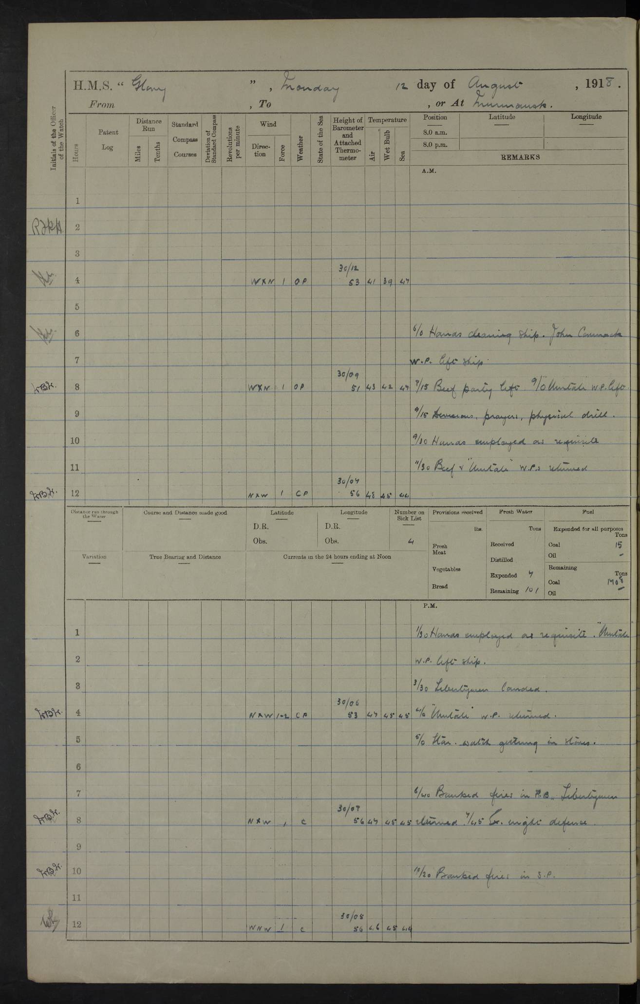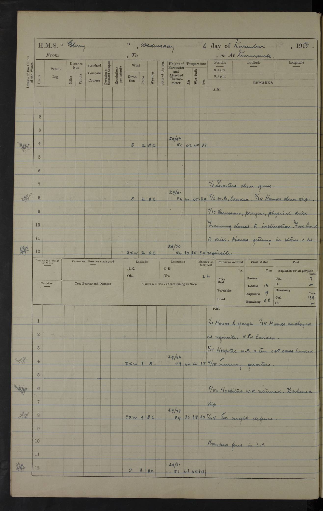 22 June 1915 At sea, Gibraltar to Lemnos Lat 36.1, Long -1.3 4.15am: Sighted land on starboard bow. 10.20am: Stopped port engine for repairs. 11.20am: proceeded with port engine. pm: a/c due to change in deviation. 10.00pm: Cape Tenez Light abeam, 18 miles. 4f73cd61a2fc8ea9030015f6: (https://s3.amazonaws.com:443/oldweather/ADM53-43015/0012_1.jpg) 23 June 1915 At sea, Gibraltar to Lemnos Lat 37.5, Long 4.8 Number on sick list: 4 5.00am: Secured from night defence stations. Placed anti-submarine guns. pm: Life saving appliances served out to men stationed in ? ?at abandon ship. 4f73cd61a2fc8ea9030015f7: (https://s3.amazonaws.com:443/oldweather/ADM53-43015/0013_0.jpg) 24 June 1915 At sea, Gibraltar to Lemnos Lat 37.4, Long 10.8 Position in log clearly bears no resemblance to the location of the ship. Position above is approximate and is based sighting of Zembra Island at 11.55am. 5.00am: Dispersed from night defence stations. Manned anti-submarine guns. am: Sighted two French torpedo boats. am: Torpedo boats passed to ~ No 362, 363. am: Sighted land on starboard beam. 11.55am: Zembra Island abeam, 25 miles. 2.00pm: Sighted Pantellaria S34ºE. 4.45pm: Pantellaria Light House abeam 12 miles. 4f73cd61a2fc8ea9030015f8: (https://s3.amazonaws.com:443/oldweather/ADM53-43015/0013_1.jpg) 25 June 1915 At sea, Gibraltar to Lemnos Lat 35.5, Long 16.7 2.10am: Gozo Light abeam 17 miles. 5.00am: Dispersed from night defence stations. Manned anti-submarine guns. 4f73cd61a2fc8ea9030015f9: (https://s3.amazonaws.com:443/oldweather/ADM53-43015/0014_0.jpg) 26 June 1915 At sea, Gibraltar to Lemnos Lat 35.5, Long 22.6 Number on sick list: 5 5.00am: Dispersed from night defence stations. Manned anti-submarine guns. am: Aired night clothing. am: marines at maxim practice on quarter deck. 2.00pm: Observed land on either bow. 3.00pm: Sighted French patrol destroyer. 4.15pm: Sighted French patrol destroyer. 9.40pm: Milo Peak N63ºW. 10.26pm: Polino Light abeam to port 5.5 miles. 4f73cd62a2fc8ea9030015fa: (https://s3.amazonaws.com:443/oldweather/ADM53-43015/0014_1.jpg) 27 June 1915 At sea and at Lemnos Lat 39.1, Long 24.4 From 0.50 to 3.05am sighting of multiple light houses. 3.50am: a/c to N39ºW and commenced to zig-zag. 5.00am: Dispersed from night defence stations and placed anti-submarine guns and look-outs. am: Lost overboard by accident Hazlewood fender, pat. 311, one in number. 10.30am: Held Divine Service onboard. pm: Met and signalled HMS Minerva on patrol duty. pm: Courses and speeds as requisite while waiting orders to approach Mudros. 3.00pm: Proceeded. 5.16pm: Increased to 90 revs, commenced to zig-zag. Course as requisite for Mudros. 7.00pm: Entered Mudros Bay. 7.47pm: Stopped. Let go port anchor in ‘M3’. 8.30pm: Darkened ship. pm: Manned one 6” and one 12 pdr. 4f73cd62a2fc8ea9030015fb: (https://s3.amazonaws.com:443/oldweather/ADM53-43015/0015_0.jpg) 28 June 1915 Mudros Bay, Lemnos Lat 39.89, Long 25.24 5,00am: HMS Vengeance entered harbour. HMS Vengeance was a pre-dreadnought of the Canopus class, launched in 1899 at Vickers, Barrow, and sold for scrapping in 1921. Details at http://en.wikipedia.org/wiki/HMS_Vengeance_(1899) . am/pm/: hands preparing for coaling and about ship’s work. pm: Collier Wabana secured alongside. 4f73cd62a2fc8ea9030015fc: (https://s3.amazonaws.com:443/oldweather/ADM53-43015/0015_1.jpg) 29 June 1915 Mudros Bay, Lemnos Lat 39.89, Long 25.24 5.15am: Commenced coaling. 2.00pm: Finished coaling. Collier left. 4f73cd62a2fc8ea9030015fd: (https://s3.amazonaws.com:443/oldweather/ADM53-43015/0016_0.jpg) 30 June 1915 Mudros Bay, Lemnos Lat 39.89, Long 25.24 am: Parties away sanding, and with fire engines onshore. am: Boats away disembarking troops. am: French Flagship Patrie sailed. The Patrie was a French pre-dreadnought, launched at La Seyne shipyard in 1903, and stricken in 1921. Details at http://en.wikipedia.org/wiki/French_battleship_Patrie . 6.30pm: Hands to bathe. 4f73cd63a2fc8ea9030015fe: (https://s3.amazonaws.com:443/oldweather/ADM53-43015/0016_1.jpg) 4f73cd63a2fc8ea9030015ff: (https://s3.amazonaws.com:443/oldweather/ADM53-43015/0017_0.jpg) 4f73cd63a2fc8ea903001600: (https://s3.amazonaws.com:443/oldweather/ADM53-43015/0017_1.jpg) 4f73cd63a2fc8ea903001601: (https://s3.amazonaws.com:443/oldweather/ADM53-43015/0018_0.jpg) 4f73cd64a2fc8ea903001602: (https://s3.amazonaws.com:443/oldweather/ADM53-43015/0018_1.jpg) LOGS FOR JULY 1915 From July to October 1915, HMS Glory spent her time at Port Mudros. Certain activities typically took place daily and are not generally noted in the pages below. These activities include: Lighting fires in the picket boat around 4am and drawing the fires in the late evening; Divisions at around 9–9.30am and Evening Quarters at 4pm; Darken ship at around 8.30pm; Daily ‘cleaning ship’, with variations thereof; SBC (for ‘Signal Books Correct’) at the watch changes. 4f73cd64a2fc8ea903001603: (https://s3.amazonaws.com:443/oldweather/ADM53-43016/0000_0.jpg) 4f73cd64a2fc8ea903001604: (https://s3.amazonaws.com:443/oldweather/ADM53-43016/0000_1.jpg) 4f73cd65a2fc8ea903001605: (https://s3.amazonaws.com:443/oldweather/ADM53-43016/0001_0.jpg) 4f73cd65a2fc8ea903001606: (https://s3.amazonaws.com:443/oldweather/ADM53-43016/0001_1.jpg) 1 July 1915 Port Mudros Lat 39.89, Long 25.24 6.30am: Landed working parties preparing boom defence ships. am: Discharged Acting Commander Rayne to Hector. Hector was a kite balloon ship. No further details readily available. 5.00pm: Tug T.10 made fast astern. 7.15pm: HMS Venerable went out. 7.30pm: HMS Chatham went out. HMS Chatham was a ‘Town’ cruiser and lead ship of her class. She was launched in 1911 at Chatham Dockyard and sold in 1926. Details at http://en.wikipedia.org/wiki/HMS_Chatham_(1911) . 4f73cd65a2fc8ea903001607: (https://s3.amazonaws.com:443/oldweather/ADM53-43016/0002_0.jpg) 2 July 1915 Port Mudros Lat 39.89, Long 25.24 5.35am: Landed working parties preparing boom defence ships. am/pm: Boom defence par