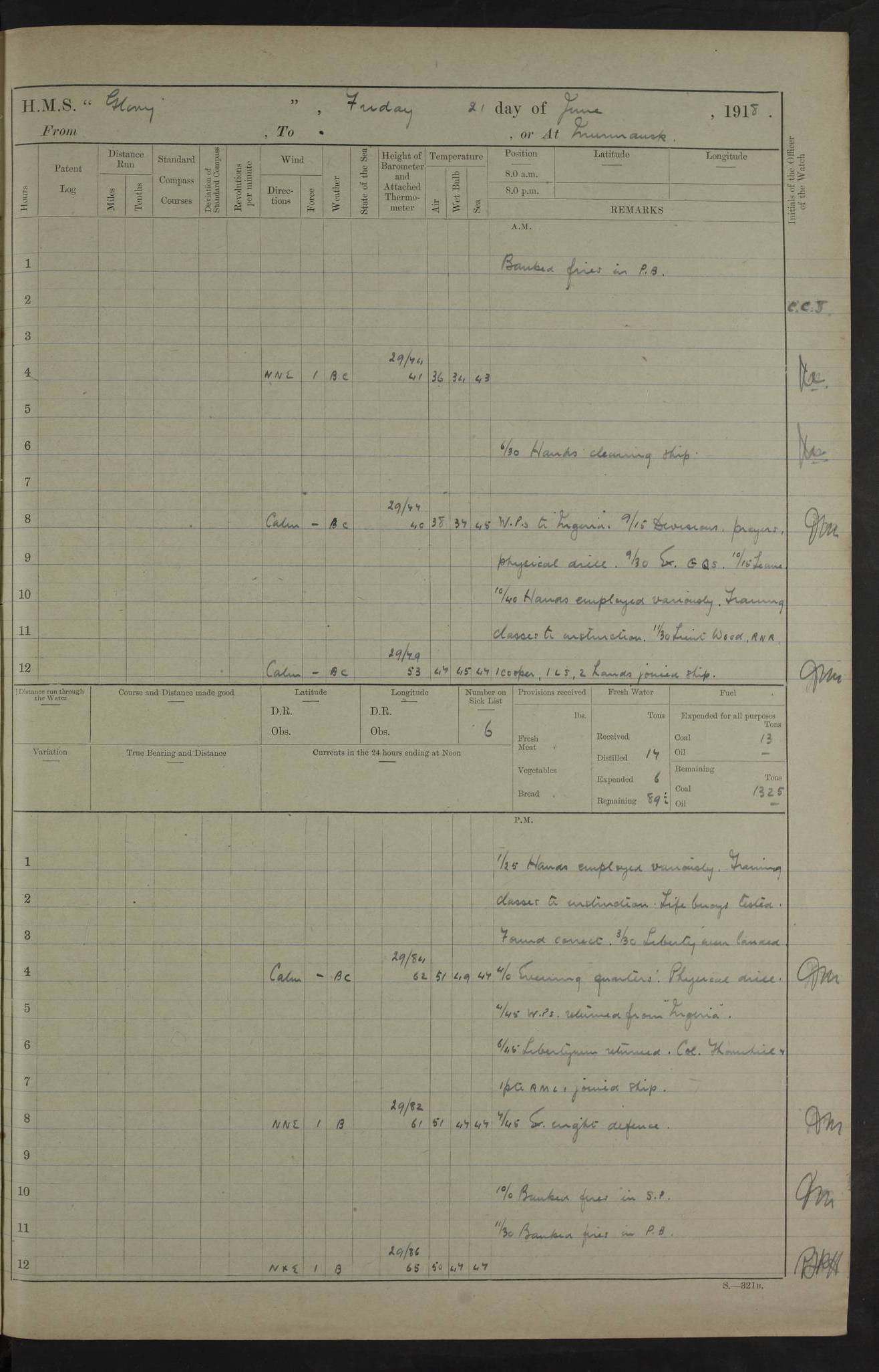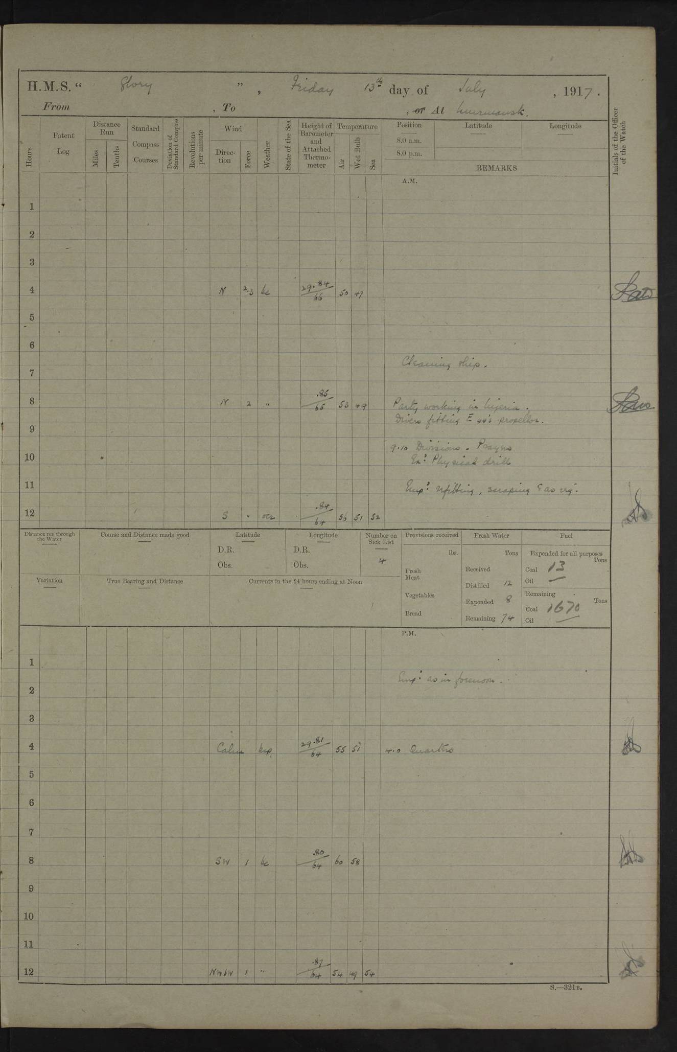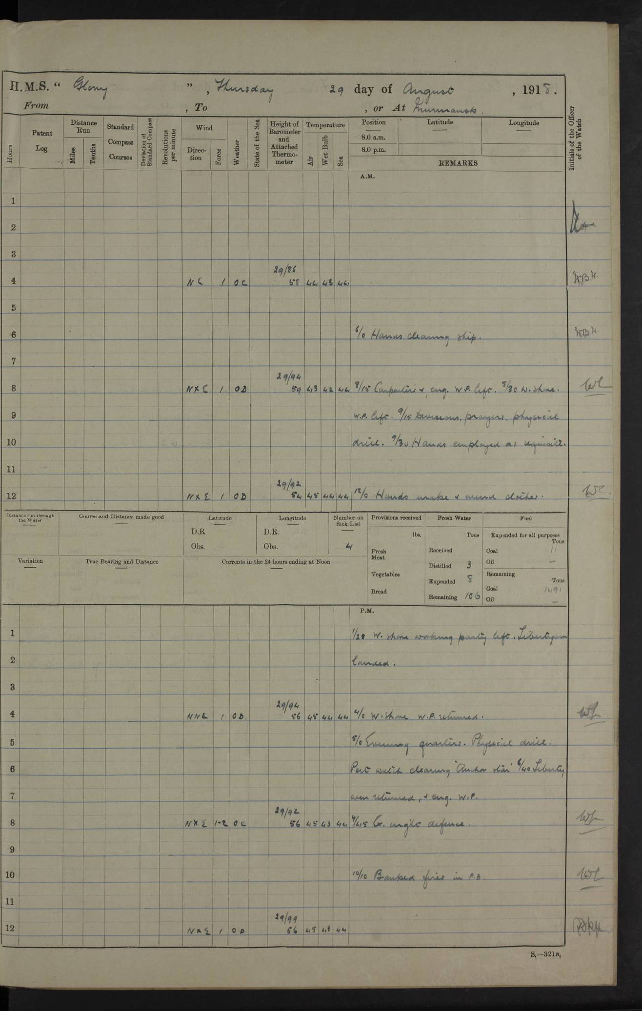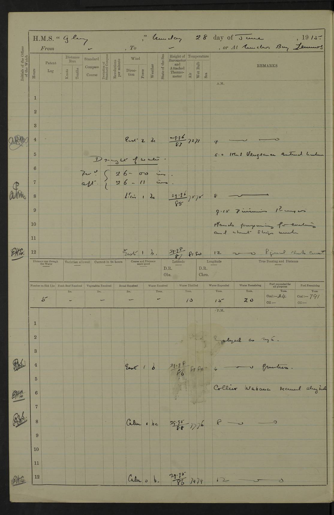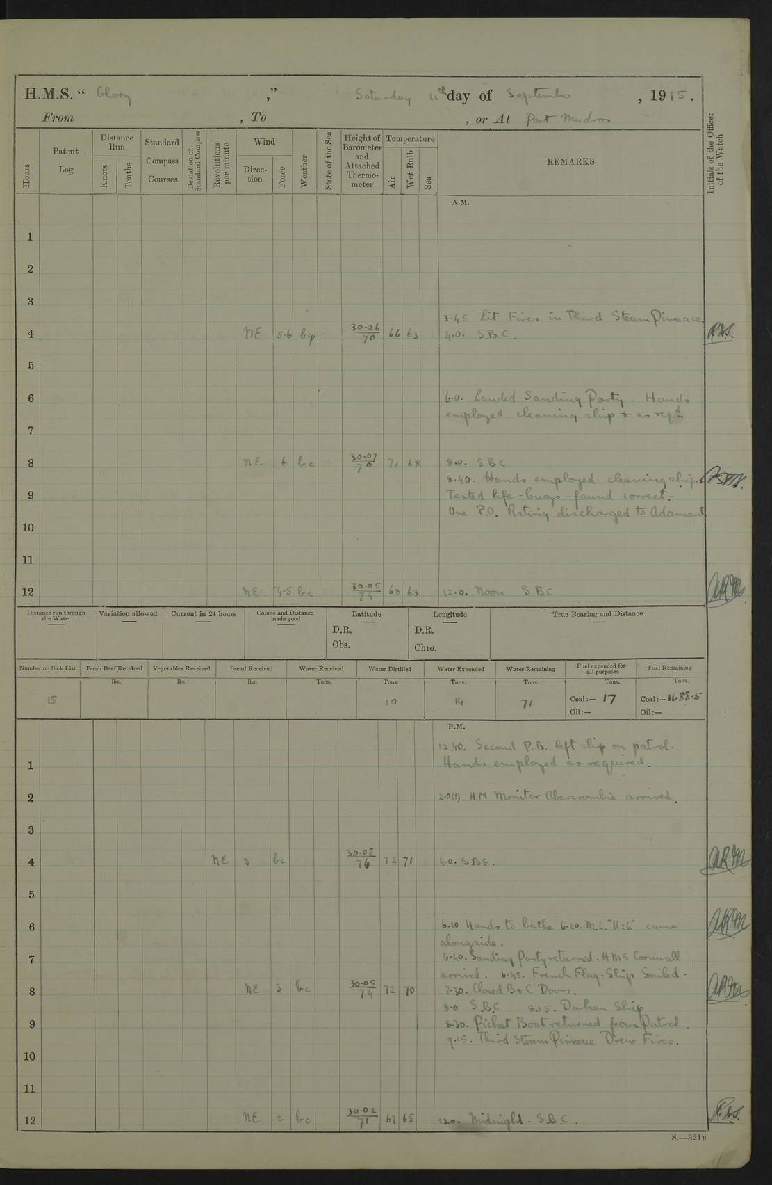 22 June 1915 At sea, Gibraltar to Lemnos Lat 36.1, Long -1.3 4.15am: Sighted land on starboard bow. 10.20am: Stopped port engine for repairs. 11.20am: proceeded with port engine. pm: a/c due to change in deviation. 10.00pm: Cape Tenez Light abeam, 18 miles. 4f73cd61a2fc8ea9030015f6: (https://s3.amazonaws.com:443/oldweather/ADM53-43015/0012_1.jpg) 23 June 1915 At sea, Gibraltar to Lemnos Lat 37.5, Long 4.8 Number on sick list: 4 5.00am: Secured from night defence stations. Placed anti-submarine guns. pm: Life saving appliances served out to men stationed in ? ?at abandon ship. 4f73cd61a2fc8ea9030015f7: (https://s3.amazonaws.com:443/oldweather/ADM53-43015/0013_0.jpg) 24 June 1915 At sea, Gibraltar to Lemnos Lat 37.4, Long 10.8 Position in log clearly bears no resemblance to the location of the ship. Position above is approximate and is based sighting of Zembra Island at 11.55am. 5.00am: Dispersed from night defence stations. Manned anti-submarine guns. am: Sighted two French torpedo boats. am: Torpedo boats passed to ~ No 362, 363. am: Sighted land on starboard beam. 11.55am: Zembra Island abeam, 25 miles. 2.00pm: Sighted Pantellaria S34ºE. 4.45pm: Pantellaria Light House abeam 12 miles. 4f73cd61a2fc8ea9030015f8: (https://s3.amazonaws.com:443/oldweather/ADM53-43015/0013_1.jpg) 25 June 1915 At sea, Gibraltar to Lemnos Lat 35.5, Long 16.7 2.10am: Gozo Light abeam 17 miles. 5.00am: Dispersed from night defence stations. Manned anti-submarine guns. 4f73cd61a2fc8ea9030015f9: (https://s3.amazonaws.com:443/oldweather/ADM53-43015/0014_0.jpg) 26 June 1915 At sea, Gibraltar to Lemnos Lat 35.5, Long 22.6 Number on sick list: 5 5.00am: Dispersed from night defence stations. Manned anti-submarine guns. am: Aired night clothing. am: marines at maxim practice on quarter deck. 2.00pm: Observed land on either bow. 3.00pm: Sighted French patrol destroyer. 4.15pm: Sighted French patrol destroyer. 9.40pm: Milo Peak N63ºW. 10.26pm: Polino Light abeam to port 5.5 miles. 4f73cd62a2fc8ea9030015fa: (https://s3.amazonaws.com:443/oldweather/ADM53-43015/0014_1.jpg) 27 June 1915 At sea and at Lemnos Lat 39.1, Long 24.4 From 0.50 to 3.05am sighting of multiple light houses. 3.50am: a/c to N39ºW and commenced to zig-zag. 5.00am: Dispersed from night defence stations and placed anti-submarine guns and look-outs. am: Lost overboard by accident Hazlewood fender, pat. 311, one in number. 10.30am: Held Divine Service onboard. pm: Met and signalled HMS Minerva on patrol duty. pm: Courses and speeds as requisite while waiting orders to approach Mudros. 3.00pm: Proceeded. 5.16pm: Increased to 90 revs, commenced to zig-zag. Course as requisite for Mudros. 7.00pm: Entered Mudros Bay. 7.47pm: Stopped. Let go port anchor in ‘M3’. 8.30pm: Darkened ship. pm: Manned one 6” and one 12 pdr. 4f73cd62a2fc8ea9030015fb: (https://s3.amazonaws.com:443/oldweather/ADM53-43015/0015_0.jpg) 28 June 1915 Mudros Bay, Lemnos Lat 39.89, Long 25.24 5,00am: HMS Vengeance entered harbour. HMS Vengeance was a pre-dreadnought of the Canopus class, launched in 1899 at Vickers, Barrow, and sold for scrapping in 1921. Details at http://en.wikipedia.org/wiki/HMS_Vengeance_(1899) . am/pm/: hands preparing for coaling and about ship’s work. pm: Collier Wabana secured alongside. 4f73cd62a2fc8ea9030015fc: (https://s3.amazonaws.com:443/oldweather/ADM53-43015/0015_1.jpg) 29 June 1915 Mudros Bay, Lemnos Lat 39.89, Long 25.24 5.15am: Commenced coaling. 2.00pm: Finished coaling. Collier left. 4f73cd62a2fc8ea9030015fd: (https://s3.amazonaws.com:443/oldweather/ADM53-43015/0016_0.jpg) 30 June 1915 Mudros Bay, Lemnos Lat 39.89, Long 25.24 am: Parties away sanding, and with fire engines onshore. am: Boats away disembarking troops. am: French Flagship Patrie sailed. The Patrie was a French pre-dreadnought, launched at La Seyne shipyard in 1903, and stricken in 1921. Details at http://en.wikipedia.org/wiki/French_battleship_Patrie . 6.30pm: Hands to bathe. 4f73cd63a2fc8ea9030015fe: (https://s3.amazonaws.com:443/oldweather/ADM53-43015/0016_1.jpg) 4f73cd63a2fc8ea9030015ff: (https://s3.amazonaws.com:443/oldweather/ADM53-43015/0017_0.jpg) 4f73cd63a2fc8ea903001600: (https://s3.amazonaws.com:443/oldweather/ADM53-43015/0017_1.jpg) 4f73cd63a2fc8ea903001601: (https://s3.amazonaws.com:443/oldweather/ADM53-43015/0018_0.jpg) 4f73cd64a2fc8ea903001602: (https://s3.amazonaws.com:443/oldweather/ADM53-43015/0018_1.jpg) LOGS FOR JULY 1915 From July to October 1915, HMS Glory spent her time at Port Mudros. Certain activities typically took place daily and are not generally noted in the pages below. These activities include: Lighting fires in the picket boat around 4am and drawing the fires in the late evening; Divisions at around 9–9.30am and Evening Quarters at 4pm; Darken ship at around 8.30pm; Daily ‘cleaning ship’, with variations thereof; SBC (for ‘Signal Books Correct’) at the watch changes. 4f73cd64a2fc8ea903001603: (https://s3.amazonaws.com:443/oldweather/ADM53-43016/0000_0.jpg) 4f73cd64a2fc8ea903001604: (https://s3.amazonaws.com:443/oldweather/ADM53-43016/0000_1.jpg) 4f73cd65a2fc8ea903001605: (https://s3.amazonaws.com:443/oldweather/ADM53-43016/0001_0.jpg) 4f73cd65a2fc8ea903001606: (https://s3.amazonaws.com:443/oldweather/ADM53-43016/0001_1.jpg) 1 July 1915 Port Mudros Lat 39.89, Long 25.24 6.30am: Landed working parties preparing boom defence ships. am: Discharged Acting Commander Rayne to Hector. Hector was a kite balloon ship. No further details readily available. 5.00pm: Tug T.10 made fast astern. 7.15pm: HMS Venerable went out. 7.30pm: HMS Chatham went out. HMS Chatham was a ‘Town’ cruiser and lead ship of her class. She was launched in 1911 at Chatham Dockyard and sold in 1926. Details at http://en.wikipedia.org/wiki/HMS_Chatham_(1911) . 4f73cd65a2fc8ea903001607: (https://s3.amazonaws.com:443/oldweather/ADM53-43016/0002_0.jpg) 2 July 1915 Port Mudros Lat 39.89, Long 25.24 5.35am: Landed working parties preparing boom defence ships. am/pm: Boom defence par