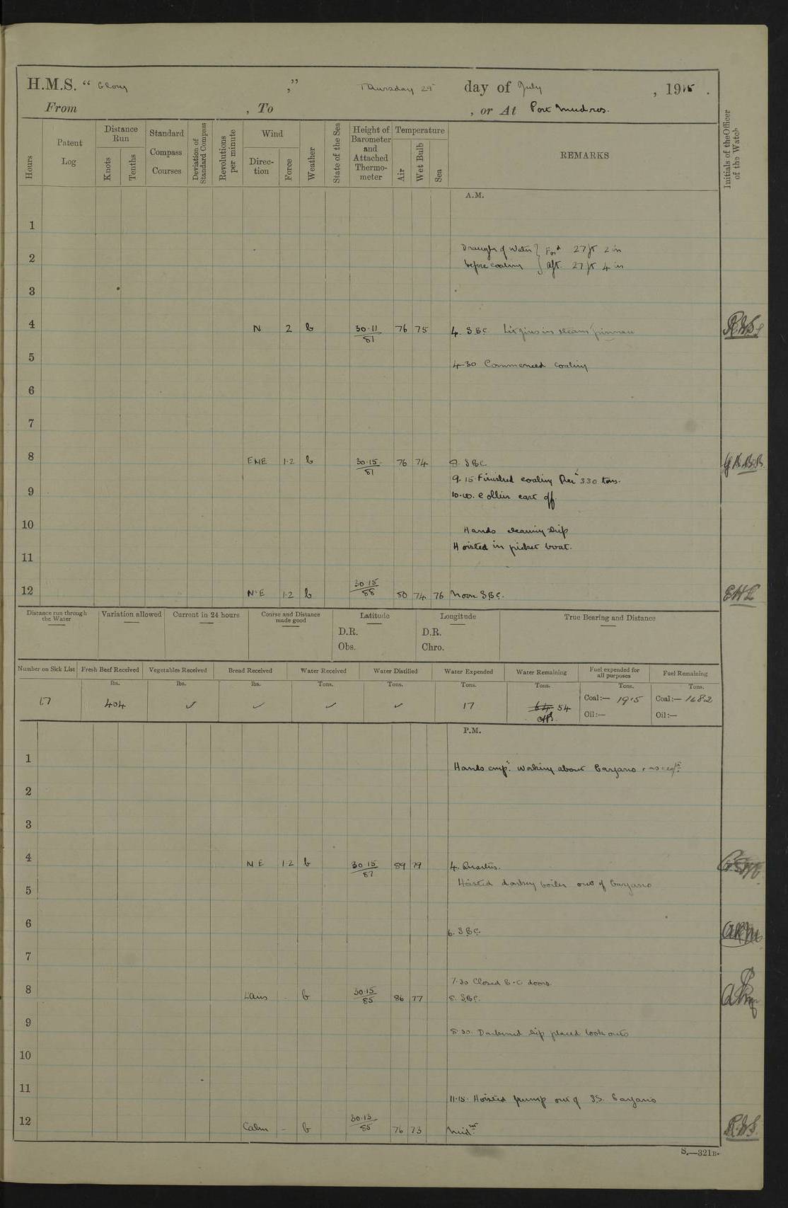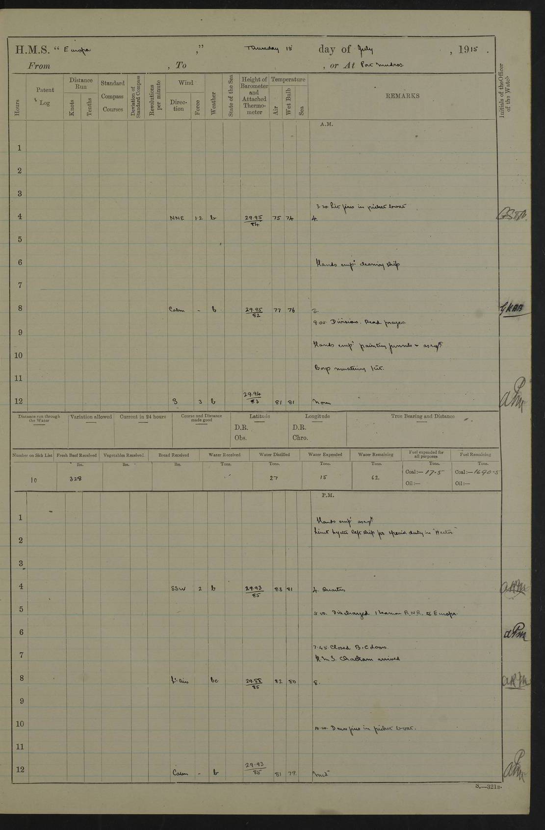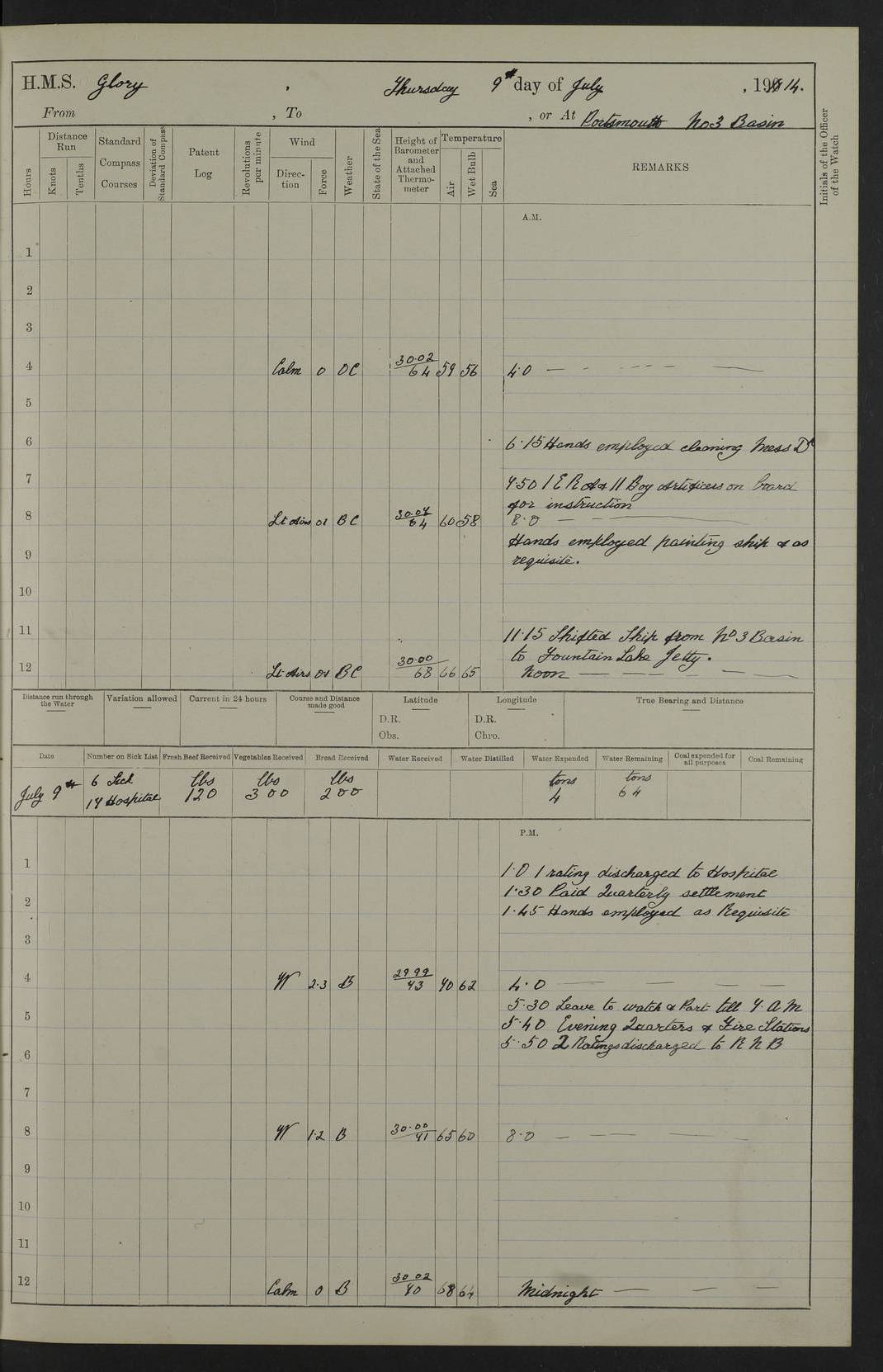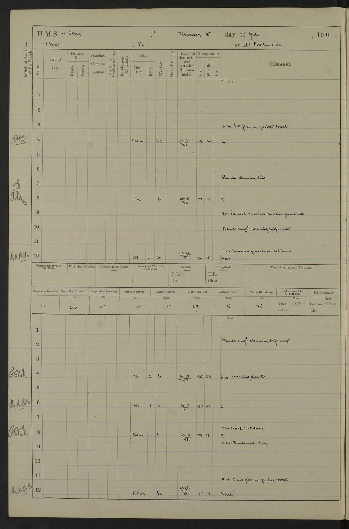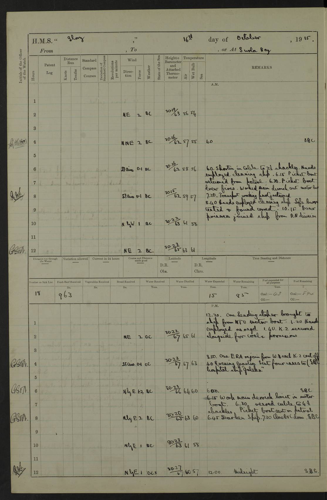 22 June 1915 At sea, Gibraltar to Lemnos Lat 36.1, Long -1.3 4.15am: Sighted land on starboard bow. 10.20am: Stopped port engine for repairs. 11.20am: proceeded with port engine. pm: a/c due to change in deviation. 10.00pm: Cape Tenez Light abeam, 18 miles. 4f73cd61a2fc8ea9030015f6: (https://s3.amazonaws.com:443/oldweather/ADM53-43015/0012_1.jpg) 23 June 1915 At sea, Gibraltar to Lemnos Lat 37.5, Long 4.8 Number on sick list: 4 5.00am: Secured from night defence stations. Placed anti-submarine guns. pm: Life saving appliances served out to men stationed in ? ?at abandon ship. 4f73cd61a2fc8ea9030015f7: (https://s3.amazonaws.com:443/oldweather/ADM53-43015/0013_0.jpg) 24 June 1915 At sea, Gibraltar to Lemnos Lat 37.4, Long 10.8 Position in log clearly bears no resemblance to the location of the ship. Position above is approximate and is based sighting of Zembra Island at 11.55am. 5.00am: Dispersed from night defence stations. Manned anti-submarine guns. am: Sighted two French torpedo boats. am: Torpedo boats passed to ~ No 362, 363. am: Sighted land on starboard beam. 11.55am: Zembra Island abeam, 25 miles. 2.00pm: Sighted Pantellaria S34ºE. 4.45pm: Pantellaria Light House abeam 12 miles. 4f73cd61a2fc8ea9030015f8: (https://s3.amazonaws.com:443/oldweather/ADM53-43015/0013_1.jpg) 25 June 1915 At sea, Gibraltar to Lemnos Lat 35.5, Long 16.7 2.10am: Gozo Light abeam 17 miles. 5.00am: Dispersed from night defence stations. Manned anti-submarine guns. 4f73cd61a2fc8ea9030015f9: (https://s3.amazonaws.com:443/oldweather/ADM53-43015/0014_0.jpg) 26 June 1915 At sea, Gibraltar to Lemnos Lat 35.5, Long 22.6 Number on sick list: 5 5.00am: Dispersed from night defence stations. Manned anti-submarine guns. am: Aired night clothing. am: marines at maxim practice on quarter deck. 2.00pm: Observed land on either bow. 3.00pm: Sighted French patrol destroyer. 4.15pm: Sighted French patrol destroyer. 9.40pm: Milo Peak N63ºW. 10.26pm: Polino Light abeam to port 5.5 miles. 4f73cd62a2fc8ea9030015fa: (https://s3.amazonaws.com:443/oldweather/ADM53-43015/0014_1.jpg) 27 June 1915 At sea and at Lemnos Lat 39.1, Long 24.4 From 0.50 to 3.05am sighting of multiple light houses. 3.50am: a/c to N39ºW and commenced to zig-zag. 5.00am: Dispersed from night defence stations and placed anti-submarine guns and look-outs. am: Lost overboard by accident Hazlewood fender, pat. 311, one in number. 10.30am: Held Divine Service onboard. pm: Met and signalled HMS Minerva on patrol duty. pm: Courses and speeds as requisite while waiting orders to approach Mudros. 3.00pm: Proceeded. 5.16pm: Increased to 90 revs, commenced to zig-zag. Course as requisite for Mudros. 7.00pm: Entered Mudros Bay. 7.47pm: Stopped. Let go port anchor in ‘M3’. 8.30pm: Darkened ship. pm: Manned one 6” and one 12 pdr. 4f73cd62a2fc8ea9030015fb: (https://s3.amazonaws.com:443/oldweather/ADM53-43015/0015_0.jpg) 28 June 1915 Mudros Bay, Lemnos Lat 39.89, Long 25.24 5,00am: HMS Vengeance entered harbour. HMS Vengeance was a pre-dreadnought of the Canopus class, launched in 1899 at Vickers, Barrow, and sold for scrapping in 1921. Details at http://en.wikipedia.org/wiki/HMS_Vengeance_(1899) . am/pm/: hands preparing for coaling and about ship’s work. pm: Collier Wabana secured alongside. 4f73cd62a2fc8ea9030015fc: (https://s3.amazonaws.com:443/oldweather/ADM53-43015/0015_1.jpg) 29 June 1915 Mudros Bay, Lemnos Lat 39.89, Long 25.24 5.15am: Commenced coaling. 2.00pm: Finished coaling. Collier left. 4f73cd62a2fc8ea9030015fd: (https://s3.amazonaws.com:443/oldweather/ADM53-43015/0016_0.jpg) 30 June 1915 Mudros Bay, Lemnos Lat 39.89, Long 25.24 am: Parties away sanding, and with fire engines onshore. am: Boats away disembarking troops. am: French Flagship Patrie sailed. The Patrie was a French pre-dreadnought, launched at La Seyne shipyard in 1903, and stricken in 1921. Details at http://en.wikipedia.org/wiki/French_battleship_Patrie . 6.30pm: Hands to bathe. 4f73cd63a2fc8ea9030015fe: (https://s3.amazonaws.com:443/oldweather/ADM53-43015/0016_1.jpg) 4f73cd63a2fc8ea9030015ff: (https://s3.amazonaws.com:443/oldweather/ADM53-43015/0017_0.jpg) 4f73cd63a2fc8ea903001600: (https://s3.amazonaws.com:443/oldweather/ADM53-43015/0017_1.jpg) 4f73cd63a2fc8ea903001601: (https://s3.amazonaws.com:443/oldweather/ADM53-43015/0018_0.jpg) 4f73cd64a2fc8ea903001602: (https://s3.amazonaws.com:443/oldweather/ADM53-43015/0018_1.jpg) LOGS FOR JULY 1915 From July to October 1915, HMS Glory spent her time at Port Mudros. Certain activities typically took place daily and are not generally noted in the pages below. These activities include: Lighting fires in the picket boat around 4am and drawing the fires in the late evening; Divisions at around 9–9.30am and Evening Quarters at 4pm; Darken ship at around 8.30pm; Daily ‘cleaning ship’, with variations thereof; SBC (for ‘Signal Books Correct’) at the watch changes. 4f73cd64a2fc8ea903001603: (https://s3.amazonaws.com:443/oldweather/ADM53-43016/0000_0.jpg) 4f73cd64a2fc8ea903001604: (https://s3.amazonaws.com:443/oldweather/ADM53-43016/0000_1.jpg) 4f73cd65a2fc8ea903001605: (https://s3.amazonaws.com:443/oldweather/ADM53-43016/0001_0.jpg) 4f73cd65a2fc8ea903001606: (https://s3.amazonaws.com:443/oldweather/ADM53-43016/0001_1.jpg) 1 July 1915 Port Mudros Lat 39.89, Long 25.24 6.30am: Landed working parties preparing boom defence ships. am: Discharged Acting Commander Rayne to Hector. Hector was a kite balloon ship. No further details readily available. 5.00pm: Tug T.10 made fast astern. 7.15pm: HMS Venerable went out. 7.30pm: HMS Chatham went out. HMS Chatham was a ‘Town’ cruiser and lead ship of her class. She was launched in 1911 at Chatham Dockyard and sold in 1926. Details at http://en.wikipedia.org/wiki/HMS_Chatham_(1911) . 4f73cd65a2fc8ea903001607: (https://s3.amazonaws.com:443/oldweather/ADM53-43016/0002_0.jpg) 2 July 1915 Port Mudros Lat 39.89, Long 25.24 5.35am: Landed working parties preparing boom defence ships. am/pm: Boom defence par