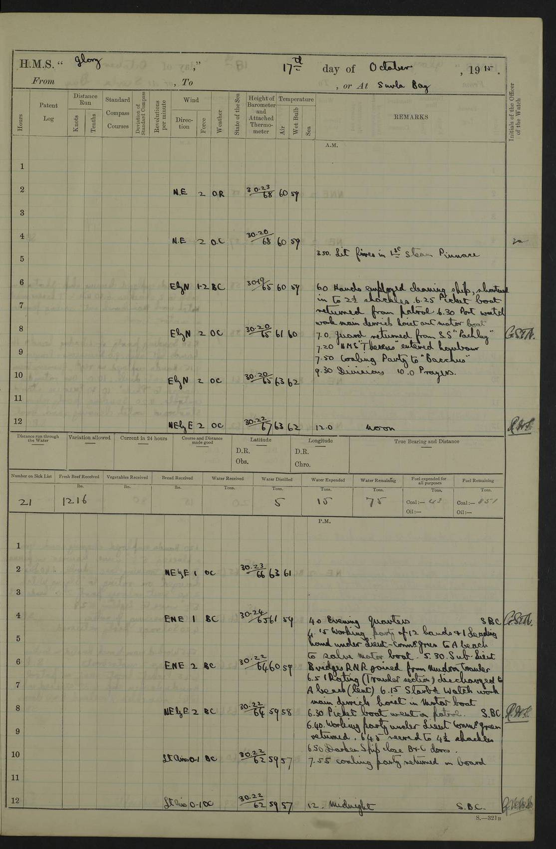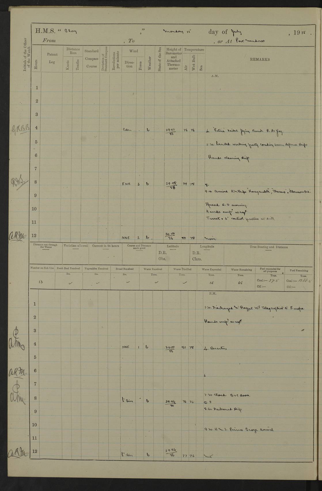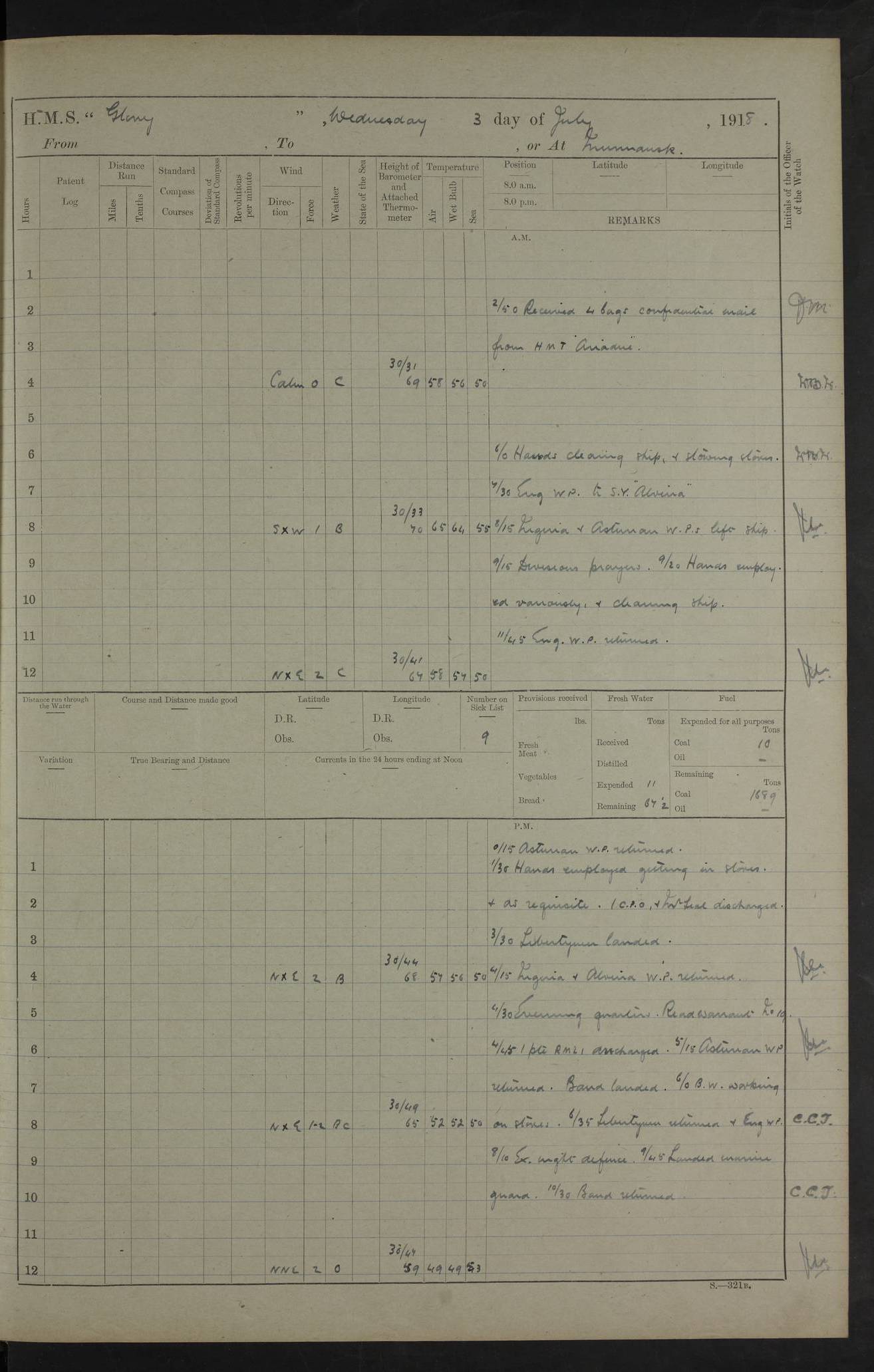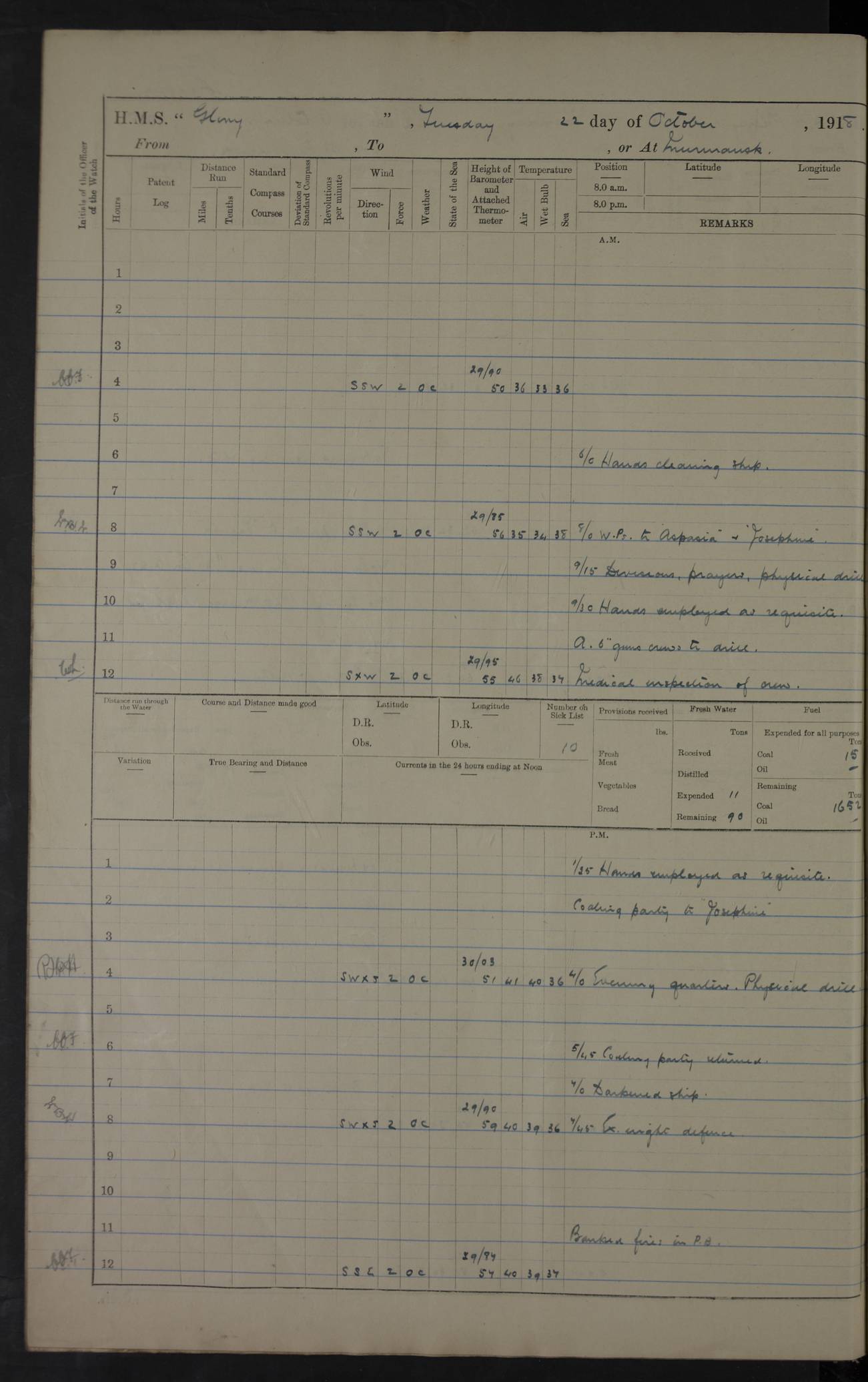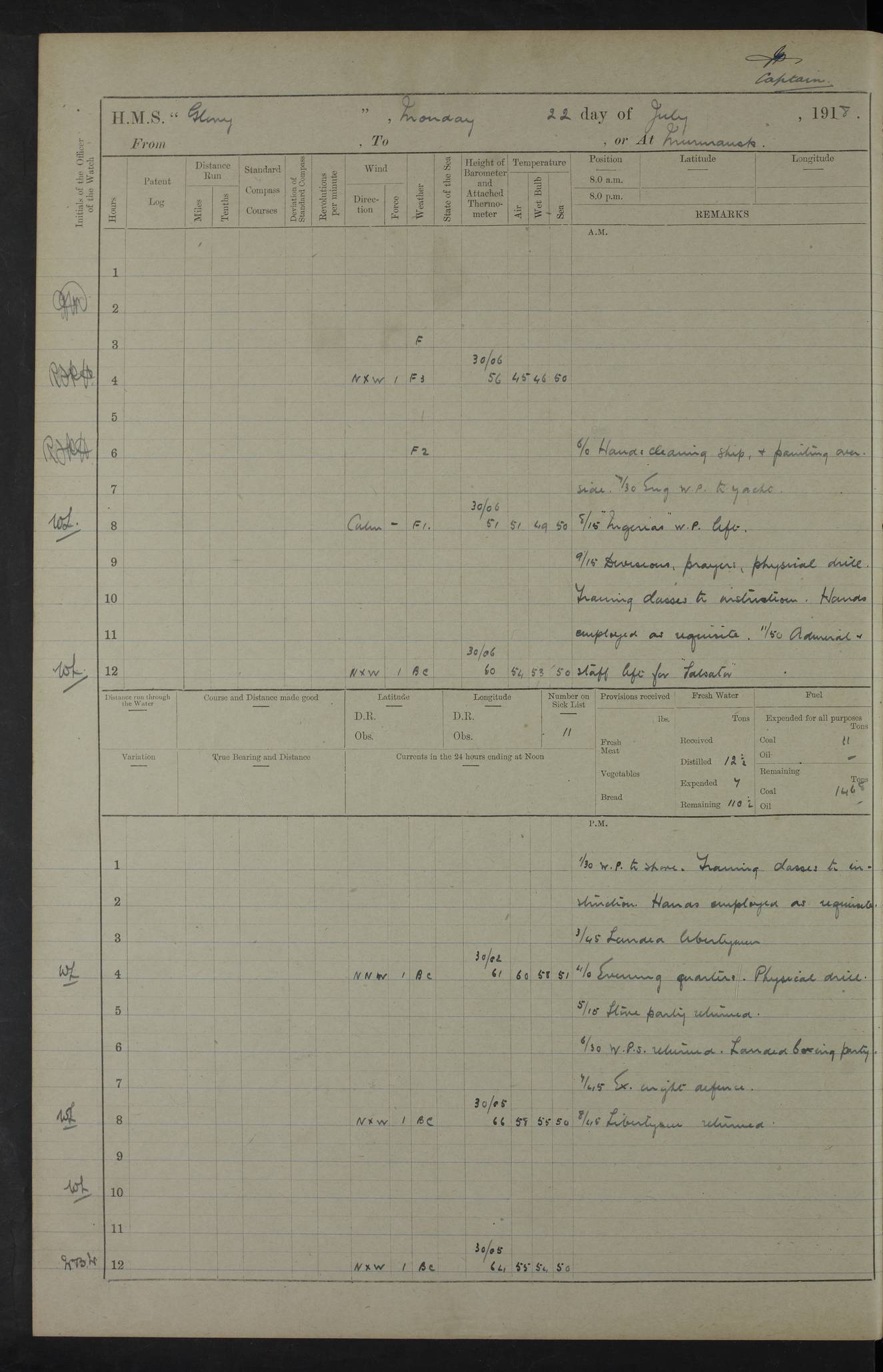 22 June 1915 At sea, Gibraltar to Lemnos Lat 36.1, Long -1.3 4.15am: Sighted land on starboard bow. 10.20am: Stopped port engine for repairs. 11.20am: proceeded with port engine. pm: a/c due to change in deviation. 10.00pm: Cape Tenez Light abeam, 18 miles. 4f73cd61a2fc8ea9030015f6: (https://s3.amazonaws.com:443/oldweather/ADM53-43015/0012_1.jpg) 23 June 1915 At sea, Gibraltar to Lemnos Lat 37.5, Long 4.8 Number on sick list: 4 5.00am: Secured from night defence stations. Placed anti-submarine guns. pm: Life saving appliances served out to men stationed in ? ?at abandon ship. 4f73cd61a2fc8ea9030015f7: (https://s3.amazonaws.com:443/oldweather/ADM53-43015/0013_0.jpg) 24 June 1915 At sea, Gibraltar to Lemnos Lat 37.4, Long 10.8 Position in log clearly bears no resemblance to the location of the ship. Position above is approximate and is based sighting of Zembra Island at 11.55am. 5.00am: Dispersed from night defence stations. Manned anti-submarine guns. am: Sighted two French torpedo boats. am: Torpedo boats passed to ~ No 362, 363. am: Sighted land on starboard beam. 11.55am: Zembra Island abeam, 25 miles. 2.00pm: Sighted Pantellaria S34ºE. 4.45pm: Pantellaria Light House abeam 12 miles. 4f73cd61a2fc8ea9030015f8: (https://s3.amazonaws.com:443/oldweather/ADM53-43015/0013_1.jpg) 25 June 1915 At sea, Gibraltar to Lemnos Lat 35.5, Long 16.7 2.10am: Gozo Light abeam 17 miles. 5.00am: Dispersed from night defence stations. Manned anti-submarine guns. 4f73cd61a2fc8ea9030015f9: (https://s3.amazonaws.com:443/oldweather/ADM53-43015/0014_0.jpg) 26 June 1915 At sea, Gibraltar to Lemnos Lat 35.5, Long 22.6 Number on sick list: 5 5.00am: Dispersed from night defence stations. Manned anti-submarine guns. am: Aired night clothing. am: marines at maxim practice on quarter deck. 2.00pm: Observed land on either bow. 3.00pm: Sighted French patrol destroyer. 4.15pm: Sighted French patrol destroyer. 9.40pm: Milo Peak N63ºW. 10.26pm: Polino Light abeam to port 5.5 miles. 4f73cd62a2fc8ea9030015fa: (https://s3.amazonaws.com:443/oldweather/ADM53-43015/0014_1.jpg) 27 June 1915 At sea and at Lemnos Lat 39.1, Long 24.4 From 0.50 to 3.05am sighting of multiple light houses. 3.50am: a/c to N39ºW and commenced to zig-zag. 5.00am: Dispersed from night defence stations and placed anti-submarine guns and look-outs. am: Lost overboard by accident Hazlewood fender, pat. 311, one in number. 10.30am: Held Divine Service onboard. pm: Met and signalled HMS Minerva on patrol duty. pm: Courses and speeds as requisite while waiting orders to approach Mudros. 3.00pm: Proceeded. 5.16pm: Increased to 90 revs, commenced to zig-zag. Course as requisite for Mudros. 7.00pm: Entered Mudros Bay. 7.47pm: Stopped. Let go port anchor in ‘M3’. 8.30pm: Darkened ship. pm: Manned one 6” and one 12 pdr. 4f73cd62a2fc8ea9030015fb: (https://s3.amazonaws.com:443/oldweather/ADM53-43015/0015_0.jpg) 28 June 1915 Mudros Bay, Lemnos Lat 39.89, Long 25.24 5,00am: HMS Vengeance entered harbour. HMS Vengeance was a pre-dreadnought of the Canopus class, launched in 1899 at Vickers, Barrow, and sold for scrapping in 1921. Details at http://en.wikipedia.org/wiki/HMS_Vengeance_(1899) . am/pm/: hands preparing for coaling and about ship’s work. pm: Collier Wabana secured alongside. 4f73cd62a2fc8ea9030015fc: (https://s3.amazonaws.com:443/oldweather/ADM53-43015/0015_1.jpg) 29 June 1915 Mudros Bay, Lemnos Lat 39.89, Long 25.24 5.15am: Commenced coaling. 2.00pm: Finished coaling. Collier left. 4f73cd62a2fc8ea9030015fd: (https://s3.amazonaws.com:443/oldweather/ADM53-43015/0016_0.jpg) 30 June 1915 Mudros Bay, Lemnos Lat 39.89, Long 25.24 am: Parties away sanding, and with fire engines onshore. am: Boats away disembarking troops. am: French Flagship Patrie sailed. The Patrie was a French pre-dreadnought, launched at La Seyne shipyard in 1903, and stricken in 1921. Details at http://en.wikipedia.org/wiki/French_battleship_Patrie . 6.30pm: Hands to bathe. 4f73cd63a2fc8ea9030015fe: (https://s3.amazonaws.com:443/oldweather/ADM53-43015/0016_1.jpg) 4f73cd63a2fc8ea9030015ff: (https://s3.amazonaws.com:443/oldweather/ADM53-43015/0017_0.jpg) 4f73cd63a2fc8ea903001600: (https://s3.amazonaws.com:443/oldweather/ADM53-43015/0017_1.jpg) 4f73cd63a2fc8ea903001601: (https://s3.amazonaws.com:443/oldweather/ADM53-43015/0018_0.jpg) 4f73cd64a2fc8ea903001602: (https://s3.amazonaws.com:443/oldweather/ADM53-43015/0018_1.jpg) LOGS FOR JULY 1915 From July to October 1915, HMS Glory spent her time at Port Mudros. Certain activities typically took place daily and are not generally noted in the pages below. These activities include: Lighting fires in the picket boat around 4am and drawing the fires in the late evening; Divisions at around 9–9.30am and Evening Quarters at 4pm; Darken ship at around 8.30pm; Daily ‘cleaning ship’, with variations thereof; SBC (for ‘Signal Books Correct’) at the watch changes. 4f73cd64a2fc8ea903001603: (https://s3.amazonaws.com:443/oldweather/ADM53-43016/0000_0.jpg) 4f73cd64a2fc8ea903001604: (https://s3.amazonaws.com:443/oldweather/ADM53-43016/0000_1.jpg) 4f73cd65a2fc8ea903001605: (https://s3.amazonaws.com:443/oldweather/ADM53-43016/0001_0.jpg) 4f73cd65a2fc8ea903001606: (https://s3.amazonaws.com:443/oldweather/ADM53-43016/0001_1.jpg) 1 July 1915 Port Mudros Lat 39.89, Long 25.24 6.30am: Landed working parties preparing boom defence ships. am: Discharged Acting Commander Rayne to Hector. Hector was a kite balloon ship. No further details readily available. 5.00pm: Tug T.10 made fast astern. 7.15pm: HMS Venerable went out. 7.30pm: HMS Chatham went out. HMS Chatham was a ‘Town’ cruiser and lead ship of her class. She was launched in 1911 at Chatham Dockyard and sold in 1926. Details at http://en.wikipedia.org/wiki/HMS_Chatham_(1911) . 4f73cd65a2fc8ea903001607: (https://s3.amazonaws.com:443/oldweather/ADM53-43016/0002_0.jpg) 2 July 1915 Port Mudros Lat 39.89, Long 25.24 5.35am: Landed working parties preparing boom defence ships. am/pm: Boom defence par