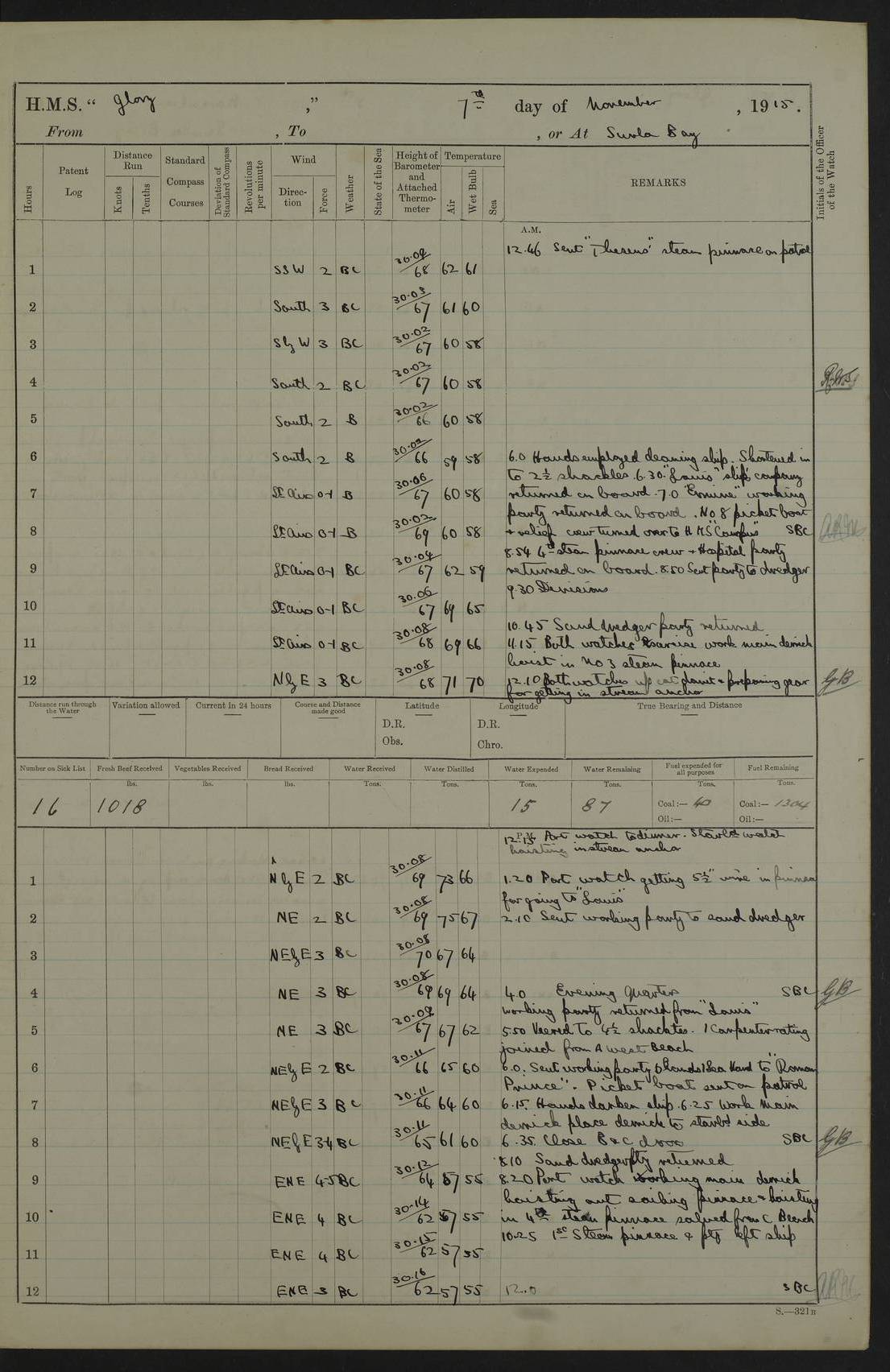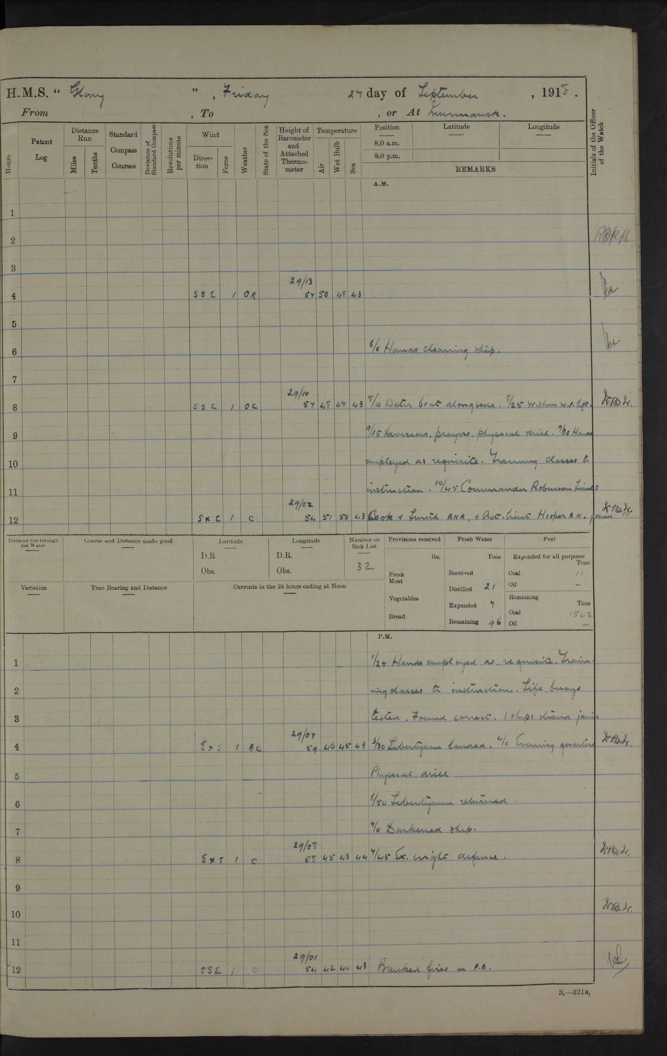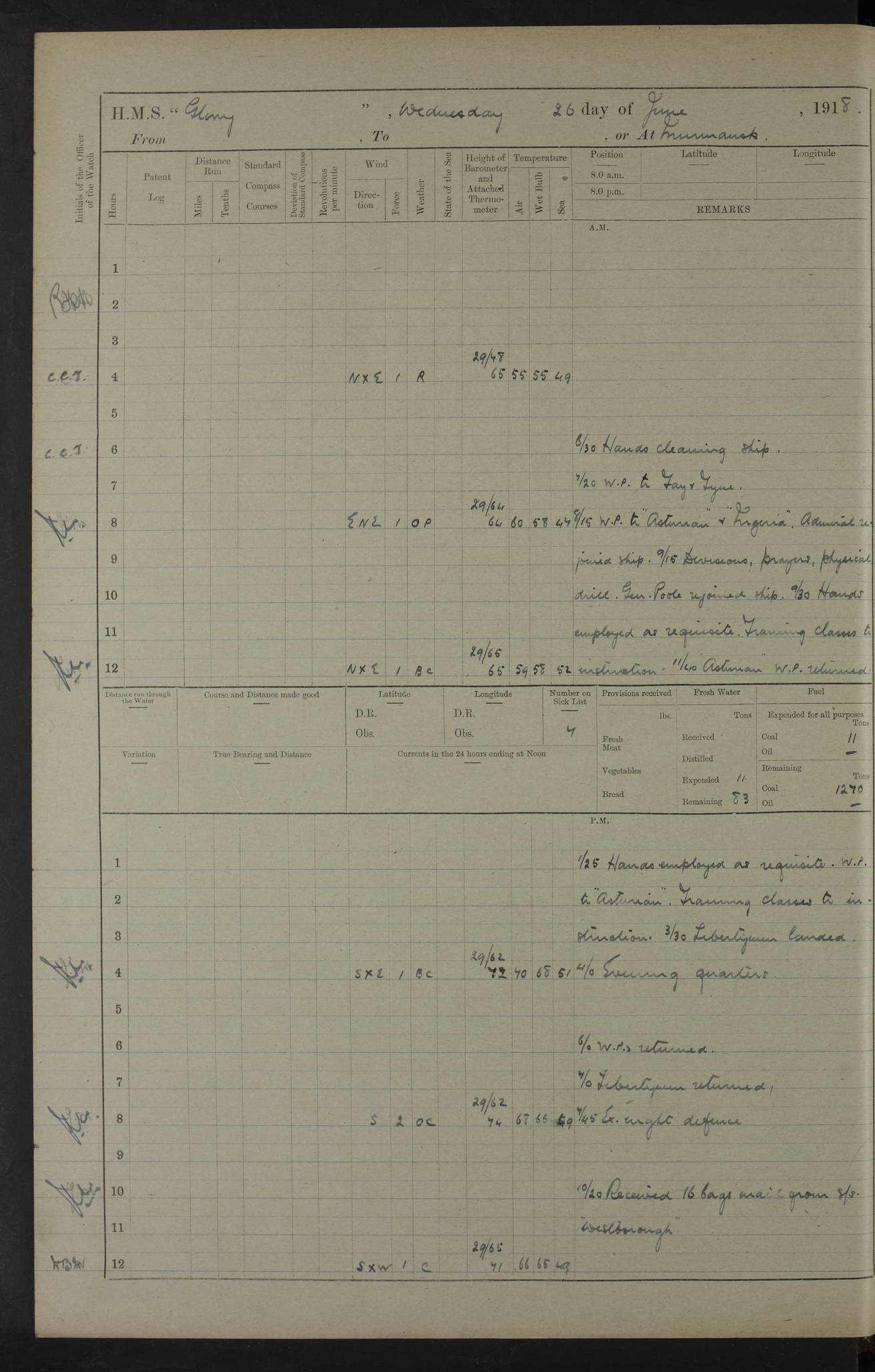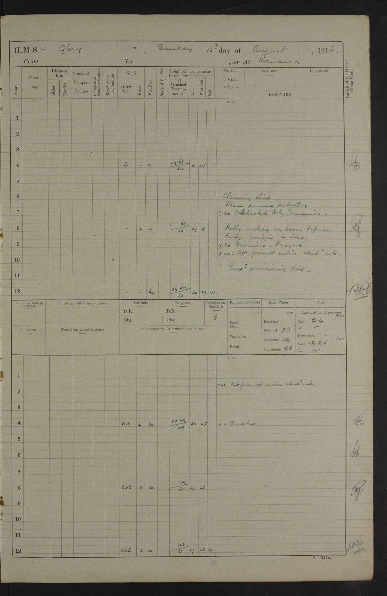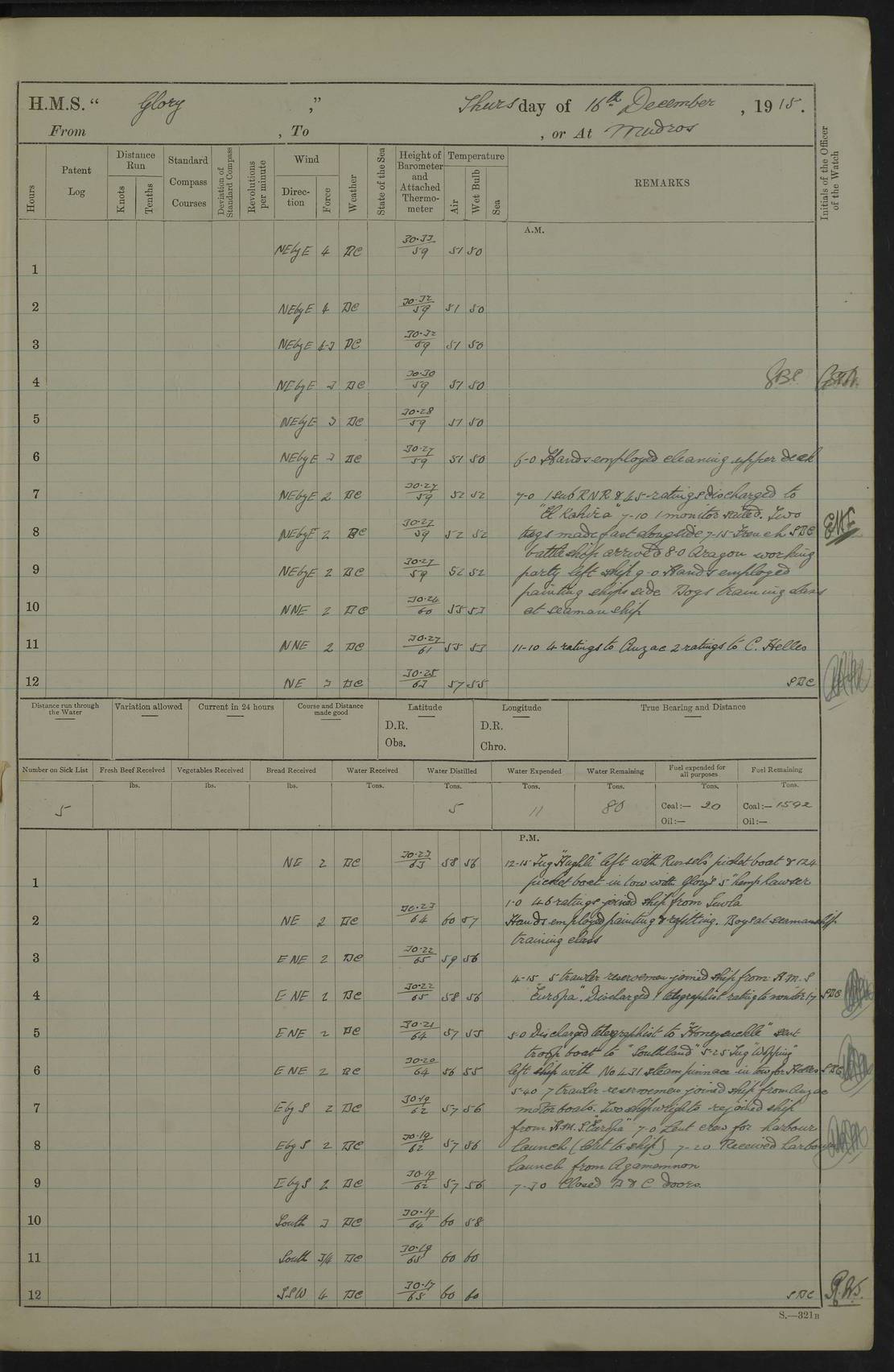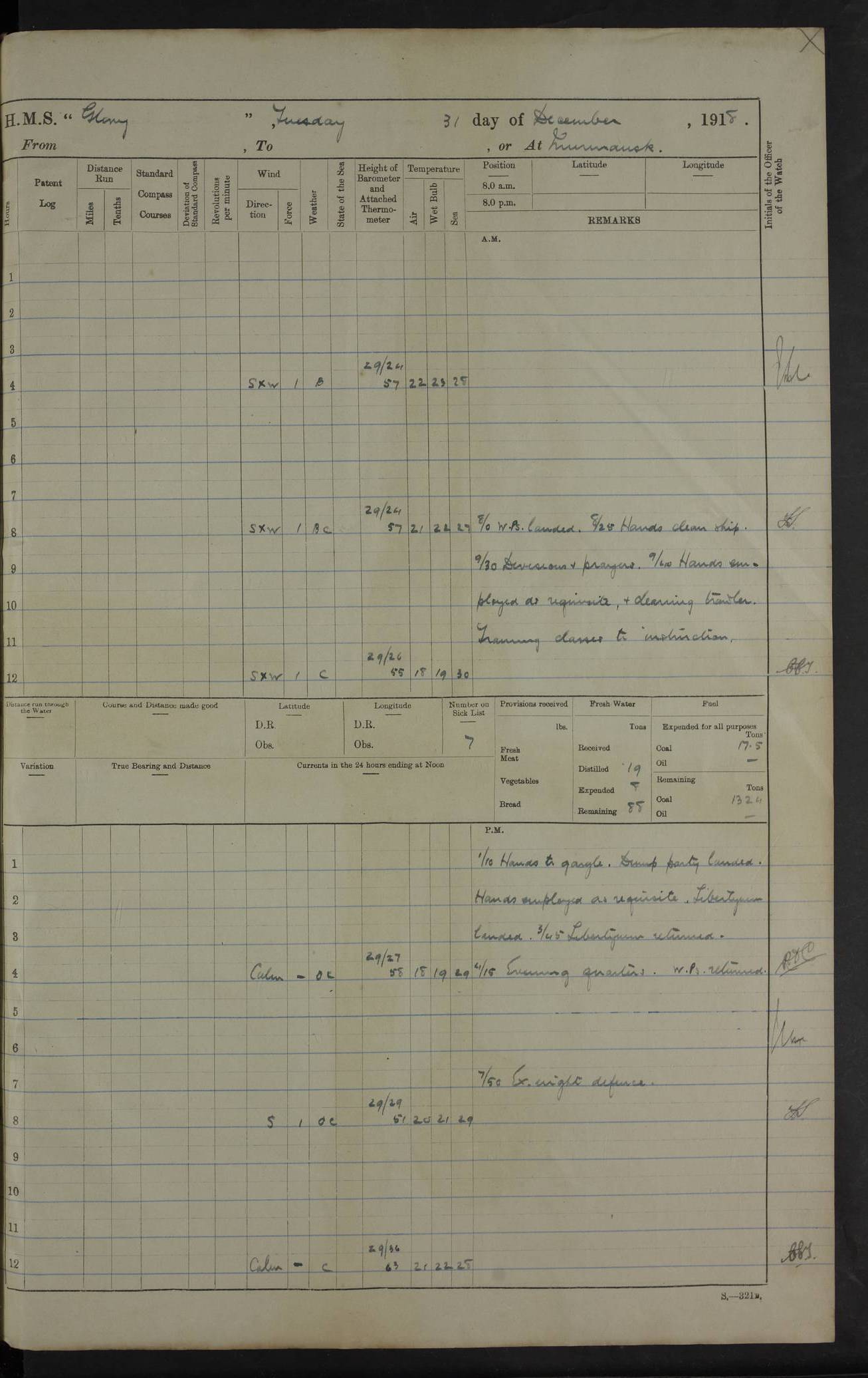 22 June 1915 At sea, Gibraltar to Lemnos Lat 36.1, Long -1.3 4.15am: Sighted land on starboard bow. 10.20am: Stopped port engine for repairs. 11.20am: proceeded with port engine. pm: a/c due to change in deviation. 10.00pm: Cape Tenez Light abeam, 18 miles. 4f73cd61a2fc8ea9030015f6: (https://s3.amazonaws.com:443/oldweather/ADM53-43015/0012_1.jpg) 23 June 1915 At sea, Gibraltar to Lemnos Lat 37.5, Long 4.8 Number on sick list: 4 5.00am: Secured from night defence stations. Placed anti-submarine guns. pm: Life saving appliances served out to men stationed in ? ?at abandon ship. 4f73cd61a2fc8ea9030015f7: (https://s3.amazonaws.com:443/oldweather/ADM53-43015/0013_0.jpg) 24 June 1915 At sea, Gibraltar to Lemnos Lat 37.4, Long 10.8 Position in log clearly bears no resemblance to the location of the ship. Position above is approximate and is based sighting of Zembra Island at 11.55am. 5.00am: Dispersed from night defence stations. Manned anti-submarine guns. am: Sighted two French torpedo boats. am: Torpedo boats passed to ~ No 362, 363. am: Sighted land on starboard beam. 11.55am: Zembra Island abeam, 25 miles. 2.00pm: Sighted Pantellaria S34ºE. 4.45pm: Pantellaria Light House abeam 12 miles. 4f73cd61a2fc8ea9030015f8: (https://s3.amazonaws.com:443/oldweather/ADM53-43015/0013_1.jpg) 25 June 1915 At sea, Gibraltar to Lemnos Lat 35.5, Long 16.7 2.10am: Gozo Light abeam 17 miles. 5.00am: Dispersed from night defence stations. Manned anti-submarine guns. 4f73cd61a2fc8ea9030015f9: (https://s3.amazonaws.com:443/oldweather/ADM53-43015/0014_0.jpg) 26 June 1915 At sea, Gibraltar to Lemnos Lat 35.5, Long 22.6 Number on sick list: 5 5.00am: Dispersed from night defence stations. Manned anti-submarine guns. am: Aired night clothing. am: marines at maxim practice on quarter deck. 2.00pm: Observed land on either bow. 3.00pm: Sighted French patrol destroyer. 4.15pm: Sighted French patrol destroyer. 9.40pm: Milo Peak N63ºW. 10.26pm: Polino Light abeam to port 5.5 miles. 4f73cd62a2fc8ea9030015fa: (https://s3.amazonaws.com:443/oldweather/ADM53-43015/0014_1.jpg) 27 June 1915 At sea and at Lemnos Lat 39.1, Long 24.4 From 0.50 to 3.05am sighting of multiple light houses. 3.50am: a/c to N39ºW and commenced to zig-zag. 5.00am: Dispersed from night defence stations and placed anti-submarine guns and look-outs. am: Lost overboard by accident Hazlewood fender, pat. 311, one in number. 10.30am: Held Divine Service onboard. pm: Met and signalled HMS Minerva on patrol duty. pm: Courses and speeds as requisite while waiting orders to approach Mudros. 3.00pm: Proceeded. 5.16pm: Increased to 90 revs, commenced to zig-zag. Course as requisite for Mudros. 7.00pm: Entered Mudros Bay. 7.47pm: Stopped. Let go port anchor in ‘M3’. 8.30pm: Darkened ship. pm: Manned one 6” and one 12 pdr. 4f73cd62a2fc8ea9030015fb: (https://s3.amazonaws.com:443/oldweather/ADM53-43015/0015_0.jpg) 28 June 1915 Mudros Bay, Lemnos Lat 39.89, Long 25.24 5,00am: HMS Vengeance entered harbour. HMS Vengeance was a pre-dreadnought of the Canopus class, launched in 1899 at Vickers, Barrow, and sold for scrapping in 1921. Details at http://en.wikipedia.org/wiki/HMS_Vengeance_(1899) . am/pm/: hands preparing for coaling and about ship’s work. pm: Collier Wabana secured alongside. 4f73cd62a2fc8ea9030015fc: (https://s3.amazonaws.com:443/oldweather/ADM53-43015/0015_1.jpg) 29 June 1915 Mudros Bay, Lemnos Lat 39.89, Long 25.24 5.15am: Commenced coaling. 2.00pm: Finished coaling. Collier left. 4f73cd62a2fc8ea9030015fd: (https://s3.amazonaws.com:443/oldweather/ADM53-43015/0016_0.jpg) 30 June 1915 Mudros Bay, Lemnos Lat 39.89, Long 25.24 am: Parties away sanding, and with fire engines onshore. am: Boats away disembarking troops. am: French Flagship Patrie sailed. The Patrie was a French pre-dreadnought, launched at La Seyne shipyard in 1903, and stricken in 1921. Details at http://en.wikipedia.org/wiki/French_battleship_Patrie . 6.30pm: Hands to bathe. 4f73cd63a2fc8ea9030015fe: (https://s3.amazonaws.com:443/oldweather/ADM53-43015/0016_1.jpg) 4f73cd63a2fc8ea9030015ff: (https://s3.amazonaws.com:443/oldweather/ADM53-43015/0017_0.jpg) 4f73cd63a2fc8ea903001600: (https://s3.amazonaws.com:443/oldweather/ADM53-43015/0017_1.jpg) 4f73cd63a2fc8ea903001601: (https://s3.amazonaws.com:443/oldweather/ADM53-43015/0018_0.jpg) 4f73cd64a2fc8ea903001602: (https://s3.amazonaws.com:443/oldweather/ADM53-43015/0018_1.jpg) LOGS FOR JULY 1915 From July to October 1915, HMS Glory spent her time at Port Mudros. Certain activities typically took place daily and are not generally noted in the pages below. These activities include: Lighting fires in the picket boat around 4am and drawing the fires in the late evening; Divisions at around 9–9.30am and Evening Quarters at 4pm; Darken ship at around 8.30pm; Daily ‘cleaning ship’, with variations thereof; SBC (for ‘Signal Books Correct’) at the watch changes. 4f73cd64a2fc8ea903001603: (https://s3.amazonaws.com:443/oldweather/ADM53-43016/0000_0.jpg) 4f73cd64a2fc8ea903001604: (https://s3.amazonaws.com:443/oldweather/ADM53-43016/0000_1.jpg) 4f73cd65a2fc8ea903001605: (https://s3.amazonaws.com:443/oldweather/ADM53-43016/0001_0.jpg) 4f73cd65a2fc8ea903001606: (https://s3.amazonaws.com:443/oldweather/ADM53-43016/0001_1.jpg) 1 July 1915 Port Mudros Lat 39.89, Long 25.24 6.30am: Landed working parties preparing boom defence ships. am: Discharged Acting Commander Rayne to Hector. Hector was a kite balloon ship. No further details readily available. 5.00pm: Tug T.10 made fast astern. 7.15pm: HMS Venerable went out. 7.30pm: HMS Chatham went out. HMS Chatham was a ‘Town’ cruiser and lead ship of her class. She was launched in 1911 at Chatham Dockyard and sold in 1926. Details at http://en.wikipedia.org/wiki/HMS_Chatham_(1911) . 4f73cd65a2fc8ea903001607: (https://s3.amazonaws.com:443/oldweather/ADM53-43016/0002_0.jpg) 2 July 1915 Port Mudros Lat 39.89, Long 25.24 5.35am: Landed working parties preparing boom defence ships. am/pm: Boom defence par