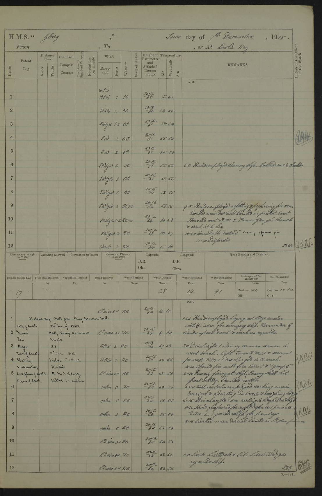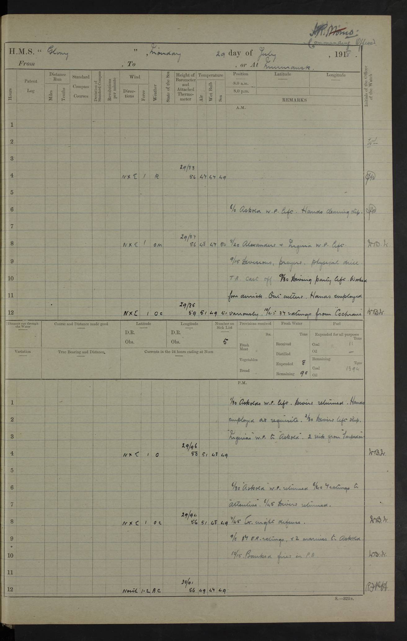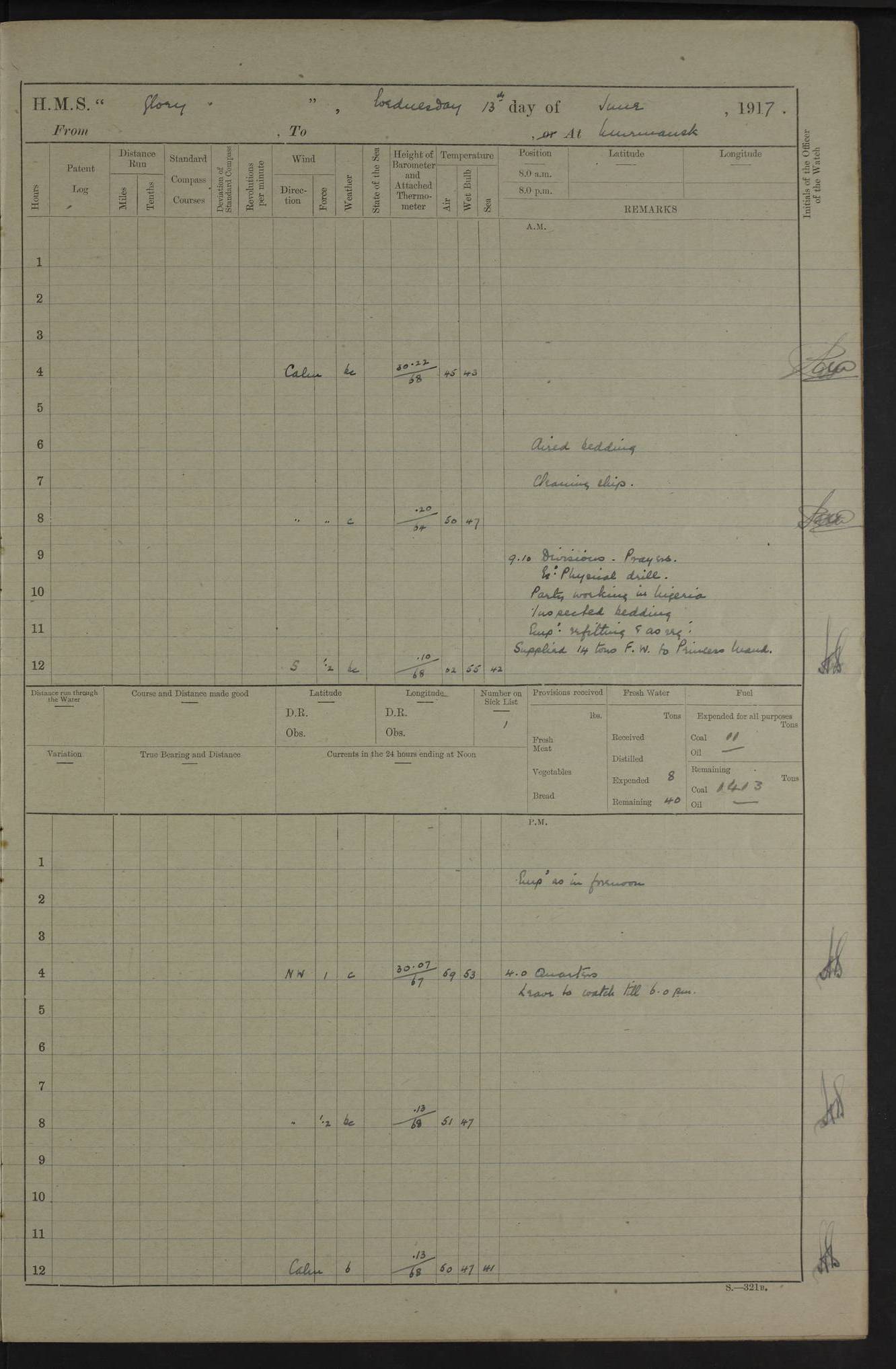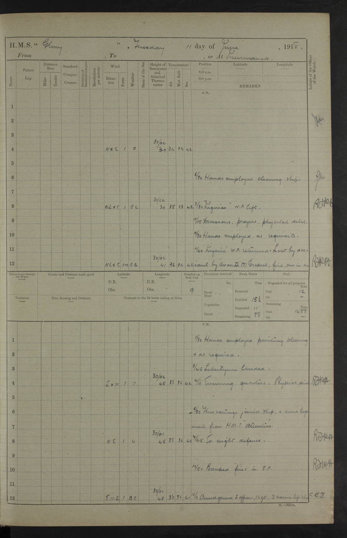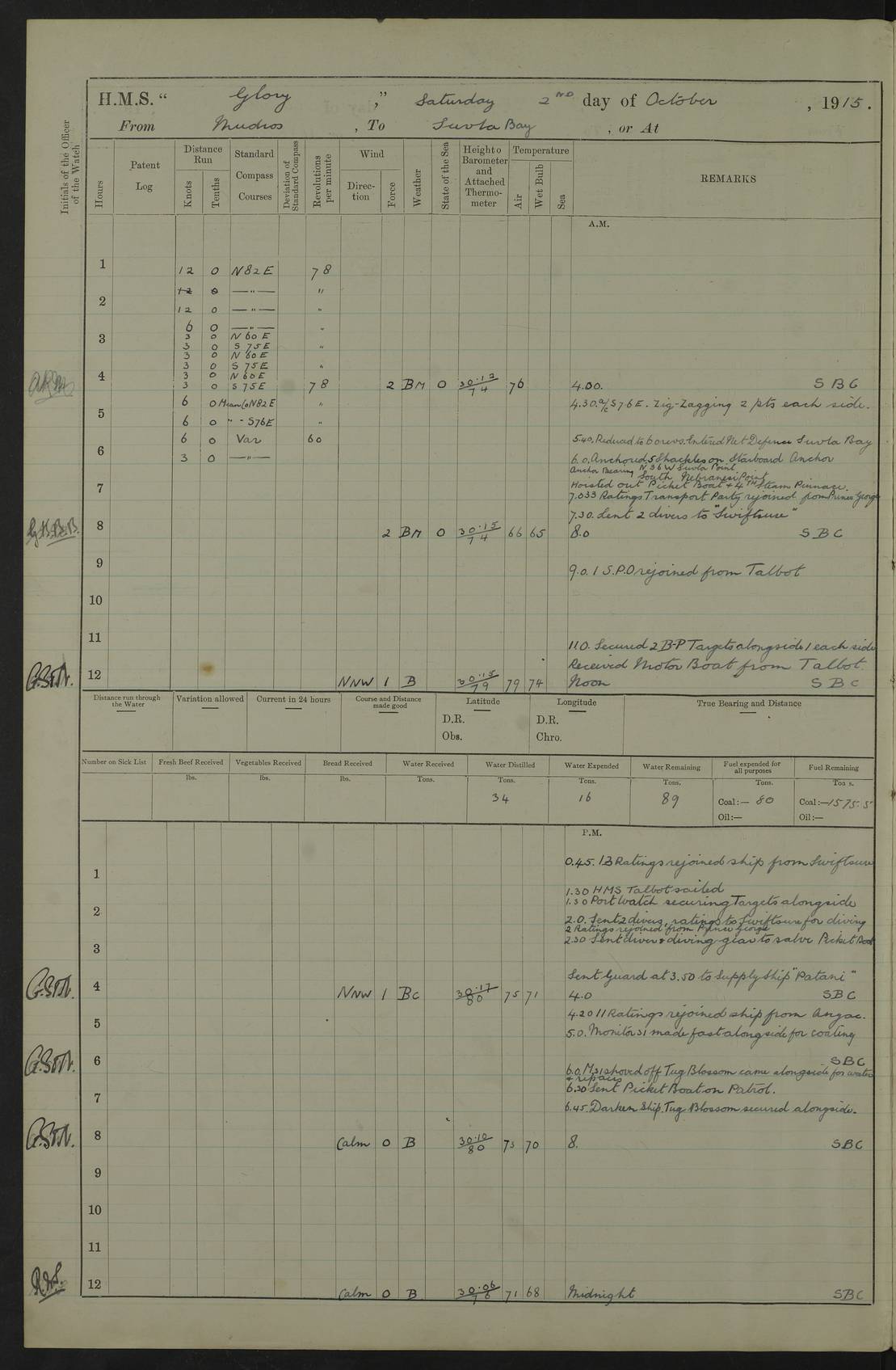 22 June 1915 At sea, Gibraltar to Lemnos Lat 36.1, Long -1.3 4.15am: Sighted land on starboard bow. 10.20am: Stopped port engine for repairs. 11.20am: proceeded with port engine. pm: a/c due to change in deviation. 10.00pm: Cape Tenez Light abeam, 18 miles. 4f73cd61a2fc8ea9030015f6: (https://s3.amazonaws.com:443/oldweather/ADM53-43015/0012_1.jpg) 23 June 1915 At sea, Gibraltar to Lemnos Lat 37.5, Long 4.8 Number on sick list: 4 5.00am: Secured from night defence stations. Placed anti-submarine guns. pm: Life saving appliances served out to men stationed in ? ?at abandon ship. 4f73cd61a2fc8ea9030015f7: (https://s3.amazonaws.com:443/oldweather/ADM53-43015/0013_0.jpg) 24 June 1915 At sea, Gibraltar to Lemnos Lat 37.4, Long 10.8 Position in log clearly bears no resemblance to the location of the ship. Position above is approximate and is based sighting of Zembra Island at 11.55am. 5.00am: Dispersed from night defence stations. Manned anti-submarine guns. am: Sighted two French torpedo boats. am: Torpedo boats passed to ~ No 362, 363. am: Sighted land on starboard beam. 11.55am: Zembra Island abeam, 25 miles. 2.00pm: Sighted Pantellaria S34ºE. 4.45pm: Pantellaria Light House abeam 12 miles. 4f73cd61a2fc8ea9030015f8: (https://s3.amazonaws.com:443/oldweather/ADM53-43015/0013_1.jpg) 25 June 1915 At sea, Gibraltar to Lemnos Lat 35.5, Long 16.7 2.10am: Gozo Light abeam 17 miles. 5.00am: Dispersed from night defence stations. Manned anti-submarine guns. 4f73cd61a2fc8ea9030015f9: (https://s3.amazonaws.com:443/oldweather/ADM53-43015/0014_0.jpg) 26 June 1915 At sea, Gibraltar to Lemnos Lat 35.5, Long 22.6 Number on sick list: 5 5.00am: Dispersed from night defence stations. Manned anti-submarine guns. am: Aired night clothing. am: marines at maxim practice on quarter deck. 2.00pm: Observed land on either bow. 3.00pm: Sighted French patrol destroyer. 4.15pm: Sighted French patrol destroyer. 9.40pm: Milo Peak N63ºW. 10.26pm: Polino Light abeam to port 5.5 miles. 4f73cd62a2fc8ea9030015fa: (https://s3.amazonaws.com:443/oldweather/ADM53-43015/0014_1.jpg) 27 June 1915 At sea and at Lemnos Lat 39.1, Long 24.4 From 0.50 to 3.05am sighting of multiple light houses. 3.50am: a/c to N39ºW and commenced to zig-zag. 5.00am: Dispersed from night defence stations and placed anti-submarine guns and look-outs. am: Lost overboard by accident Hazlewood fender, pat. 311, one in number. 10.30am: Held Divine Service onboard. pm: Met and signalled HMS Minerva on patrol duty. pm: Courses and speeds as requisite while waiting orders to approach Mudros. 3.00pm: Proceeded. 5.16pm: Increased to 90 revs, commenced to zig-zag. Course as requisite for Mudros. 7.00pm: Entered Mudros Bay. 7.47pm: Stopped. Let go port anchor in ‘M3’. 8.30pm: Darkened ship. pm: Manned one 6” and one 12 pdr. 4f73cd62a2fc8ea9030015fb: (https://s3.amazonaws.com:443/oldweather/ADM53-43015/0015_0.jpg) 28 June 1915 Mudros Bay, Lemnos Lat 39.89, Long 25.24 5,00am: HMS Vengeance entered harbour. HMS Vengeance was a pre-dreadnought of the Canopus class, launched in 1899 at Vickers, Barrow, and sold for scrapping in 1921. Details at http://en.wikipedia.org/wiki/HMS_Vengeance_(1899) . am/pm/: hands preparing for coaling and about ship’s work. pm: Collier Wabana secured alongside. 4f73cd62a2fc8ea9030015fc: (https://s3.amazonaws.com:443/oldweather/ADM53-43015/0015_1.jpg) 29 June 1915 Mudros Bay, Lemnos Lat 39.89, Long 25.24 5.15am: Commenced coaling. 2.00pm: Finished coaling. Collier left. 4f73cd62a2fc8ea9030015fd: (https://s3.amazonaws.com:443/oldweather/ADM53-43015/0016_0.jpg) 30 June 1915 Mudros Bay, Lemnos Lat 39.89, Long 25.24 am: Parties away sanding, and with fire engines onshore. am: Boats away disembarking troops. am: French Flagship Patrie sailed. The Patrie was a French pre-dreadnought, launched at La Seyne shipyard in 1903, and stricken in 1921. Details at http://en.wikipedia.org/wiki/French_battleship_Patrie . 6.30pm: Hands to bathe. 4f73cd63a2fc8ea9030015fe: (https://s3.amazonaws.com:443/oldweather/ADM53-43015/0016_1.jpg) 4f73cd63a2fc8ea9030015ff: (https://s3.amazonaws.com:443/oldweather/ADM53-43015/0017_0.jpg) 4f73cd63a2fc8ea903001600: (https://s3.amazonaws.com:443/oldweather/ADM53-43015/0017_1.jpg) 4f73cd63a2fc8ea903001601: (https://s3.amazonaws.com:443/oldweather/ADM53-43015/0018_0.jpg) 4f73cd64a2fc8ea903001602: (https://s3.amazonaws.com:443/oldweather/ADM53-43015/0018_1.jpg) LOGS FOR JULY 1915 From July to October 1915, HMS Glory spent her time at Port Mudros. Certain activities typically took place daily and are not generally noted in the pages below. These activities include: Lighting fires in the picket boat around 4am and drawing the fires in the late evening; Divisions at around 9–9.30am and Evening Quarters at 4pm; Darken ship at around 8.30pm; Daily ‘cleaning ship’, with variations thereof; SBC (for ‘Signal Books Correct’) at the watch changes. 4f73cd64a2fc8ea903001603: (https://s3.amazonaws.com:443/oldweather/ADM53-43016/0000_0.jpg) 4f73cd64a2fc8ea903001604: (https://s3.amazonaws.com:443/oldweather/ADM53-43016/0000_1.jpg) 4f73cd65a2fc8ea903001605: (https://s3.amazonaws.com:443/oldweather/ADM53-43016/0001_0.jpg) 4f73cd65a2fc8ea903001606: (https://s3.amazonaws.com:443/oldweather/ADM53-43016/0001_1.jpg) 1 July 1915 Port Mudros Lat 39.89, Long 25.24 6.30am: Landed working parties preparing boom defence ships. am: Discharged Acting Commander Rayne to Hector. Hector was a kite balloon ship. No further details readily available. 5.00pm: Tug T.10 made fast astern. 7.15pm: HMS Venerable went out. 7.30pm: HMS Chatham went out. HMS Chatham was a ‘Town’ cruiser and lead ship of her class. She was launched in 1911 at Chatham Dockyard and sold in 1926. Details at http://en.wikipedia.org/wiki/HMS_Chatham_(1911) . 4f73cd65a2fc8ea903001607: (https://s3.amazonaws.com:443/oldweather/ADM53-43016/0002_0.jpg) 2 July 1915 Port Mudros Lat 39.89, Long 25.24 5.35am: Landed working parties preparing boom defence ships. am/pm: Boom defence par