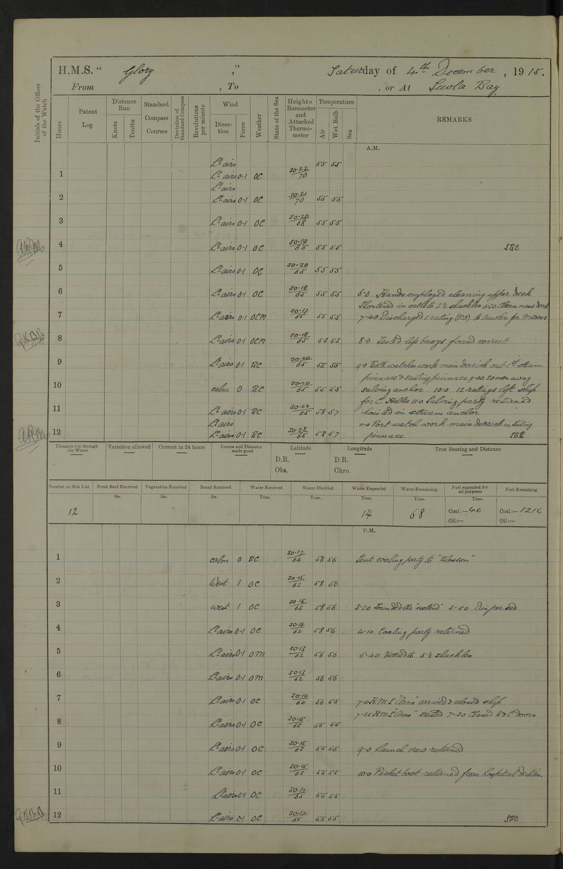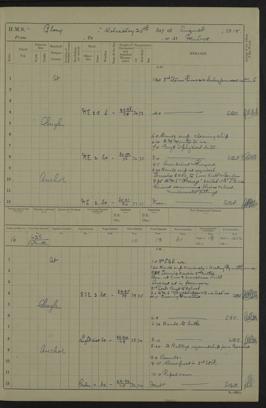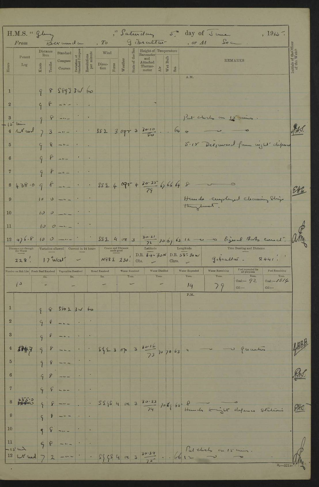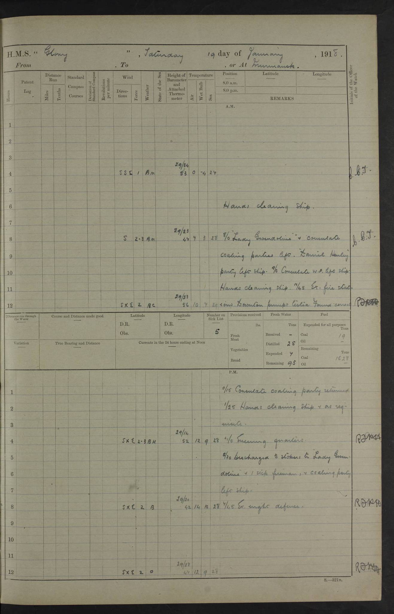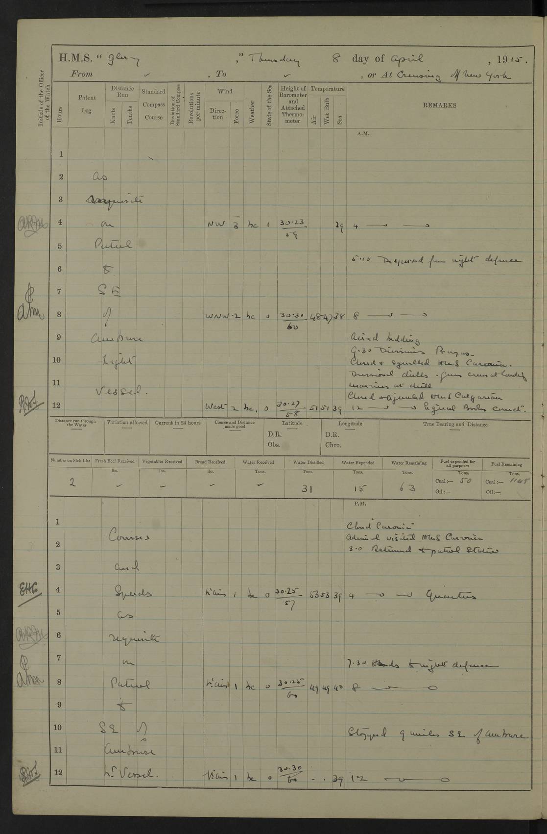22 June 1915 At sea, Gibraltar to Lemnos Lat 36.1, Long -1.3 4.15am: Sighted land on starboard bow. 10.20am: Stopped port engine for repairs. 11.20am: proceeded with port engine. pm: a/c due to change in deviation. 10.00pm: Cape Tenez Light abeam, 18 miles. 4f73cd61a2fc8ea9030015f6: (https://s3.amazonaws.com:443/oldweather/ADM53-43015/0012_1.jpg) 23 June 1915 At sea, Gibraltar to Lemnos Lat 37.5, Long 4.8 Number on sick list: 4 5.00am: Secured from night defence stations. Placed anti-submarine guns. pm: Life saving appliances served out to men stationed in ? ?at abandon ship. 4f73cd61a2fc8ea9030015f7: (https://s3.amazonaws.com:443/oldweather/ADM53-43015/0013_0.jpg) 24 June 1915 At sea, Gibraltar to Lemnos Lat 37.4, Long 10.8 Position in log clearly bears no resemblance to the location of the ship. Position above is approximate and is based sighting of Zembra Island at 11.55am. 5.00am: Dispersed from night defence stations. Manned anti-submarine guns. am: Sighted two French torpedo boats. am: Torpedo boats passed to ~ No 362, 363. am: Sighted land on starboard beam. 11.55am: Zembra Island abeam, 25 miles. 2.00pm: Sighted Pantellaria S34ºE. 4.45pm: Pantellaria Light House abeam 12 miles. 4f73cd61a2fc8ea9030015f8: (https://s3.amazonaws.com:443/oldweather/ADM53-43015/0013_1.jpg) 25 June 1915 At sea, Gibraltar to Lemnos Lat 35.5, Long 16.7 2.10am: Gozo Light abeam 17 miles. 5.00am: Dispersed from night defence stations. Manned anti-submarine guns. 4f73cd61a2fc8ea9030015f9: (https://s3.amazonaws.com:443/oldweather/ADM53-43015/0014_0.jpg) 26 June 1915 At sea, Gibraltar to Lemnos Lat 35.5, Long 22.6 Number on sick list: 5 5.00am: Dispersed from night defence stations. Manned anti-submarine guns. am: Aired night clothing. am: marines at maxim practice on quarter deck. 2.00pm: Observed land on either bow. 3.00pm: Sighted French patrol destroyer. 4.15pm: Sighted French patrol destroyer. 9.40pm: Milo Peak N63ºW. 10.26pm: Polino Light abeam to port 5.5 miles. 4f73cd62a2fc8ea9030015fa: (https://s3.amazonaws.com:443/oldweather/ADM53-43015/0014_1.jpg) 27 June 1915 At sea and at Lemnos Lat 39.1, Long 24.4 From 0.50 to 3.05am sighting of multiple light houses. 3.50am: a/c to N39ºW and commenced to zig-zag. 5.00am: Dispersed from night defence stations and placed anti-submarine guns and look-outs. am: Lost overboard by accident Hazlewood fender, pat. 311, one in number. 10.30am: Held Divine Service onboard. pm: Met and signalled HMS Minerva on patrol duty. pm: Courses and speeds as requisite while waiting orders to approach Mudros. 3.00pm: Proceeded. 5.16pm: Increased to 90 revs, commenced to zig-zag. Course as requisite for Mudros. 7.00pm: Entered Mudros Bay. 7.47pm: Stopped. Let go port anchor in ‘M3’. 8.30pm: Darkened ship. pm: Manned one 6” and one 12 pdr. 4f73cd62a2fc8ea9030015fb: (https://s3.amazonaws.com:443/oldweather/ADM53-43015/0015_0.jpg) 28 June 1915 Mudros Bay, Lemnos Lat 39.89, Long 25.24 5,00am: HMS Vengeance entered harbour. HMS Vengeance was a pre-dreadnought of the Canopus class, launched in 1899 at Vickers, Barrow, and sold for scrapping in 1921. Details at http://en.wikipedia.org/wiki/HMS_Vengeance_(1899) . am/pm/: hands preparing for coaling and about ship’s work. pm: Collier Wabana secured alongside. 4f73cd62a2fc8ea9030015fc: (https://s3.amazonaws.com:443/oldweather/ADM53-43015/0015_1.jpg) 29 June 1915 Mudros Bay, Lemnos Lat 39.89, Long 25.24 5.15am: Commenced coaling. 2.00pm: Finished coaling. Collier left. 4f73cd62a2fc8ea9030015fd: (https://s3.amazonaws.com:443/oldweather/ADM53-43015/0016_0.jpg) 30 June 1915 Mudros Bay, Lemnos Lat 39.89, Long 25.24 am: Parties away sanding, and with fire engines onshore. am: Boats away disembarking troops. am: French Flagship Patrie sailed. The Patrie was a French pre-dreadnought, launched at La Seyne shipyard in 1903, and stricken in 1921. Details at http://en.wikipedia.org/wiki/French_battleship_Patrie . 6.30pm: Hands to bathe. 4f73cd63a2fc8ea9030015fe: (https://s3.amazonaws.com:443/oldweather/ADM53-43015/0016_1.jpg) 4f73cd63a2fc8ea9030015ff: (https://s3.amazonaws.com:443/oldweather/ADM53-43015/0017_0.jpg) 4f73cd63a2fc8ea903001600: (https://s3.amazonaws.com:443/oldweather/ADM53-43015/0017_1.jpg) 4f73cd63a2fc8ea903001601: (https://s3.amazonaws.com:443/oldweather/ADM53-43015/0018_0.jpg) 4f73cd64a2fc8ea903001602: (https://s3.amazonaws.com:443/oldweather/ADM53-43015/0018_1.jpg) LOGS FOR JULY 1915 From July to October 1915, HMS Glory spent her time at Port Mudros. Certain activities typically took place daily and are not generally noted in the pages below. These activities include: Lighting fires in the picket boat around 4am and drawing the fires in the late evening; Divisions at around 9–9.30am and Evening Quarters at 4pm; Darken ship at around 8.30pm; Daily ‘cleaning ship’, with variations thereof; SBC (for ‘Signal Books Correct’) at the watch changes. 4f73cd64a2fc8ea903001603: (https://s3.amazonaws.com:443/oldweather/ADM53-43016/0000_0.jpg) 4f73cd64a2fc8ea903001604: (https://s3.amazonaws.com:443/oldweather/ADM53-43016/0000_1.jpg) 4f73cd65a2fc8ea903001605: (https://s3.amazonaws.com:443/oldweather/ADM53-43016/0001_0.jpg) 4f73cd65a2fc8ea903001606: (https://s3.amazonaws.com:443/oldweather/ADM53-43016/0001_1.jpg) 1 July 1915 Port Mudros Lat 39.89, Long 25.24 6.30am: Landed working parties preparing boom defence ships. am: Discharged Acting Commander Rayne to Hector. Hector was a kite balloon ship. No further details readily available. 5.00pm: Tug T.10 made fast astern. 7.15pm: HMS Venerable went out. 7.30pm: HMS Chatham went out. HMS Chatham was a ‘Town’ cruiser and lead ship of her class. She was launched in 1911 at Chatham Dockyard and sold in 1926. Details at http://en.wikipedia.org/wiki/HMS_Chatham_(1911) . 4f73cd65a2fc8ea903001607: (https://s3.amazonaws.com:443/oldweather/ADM53-43016/0002_0.jpg) 2 July 1915 Port Mudros Lat 39.89, Long 25.24 5.35am: Landed working parties preparing boom defence ships. am/pm: Boom defence par