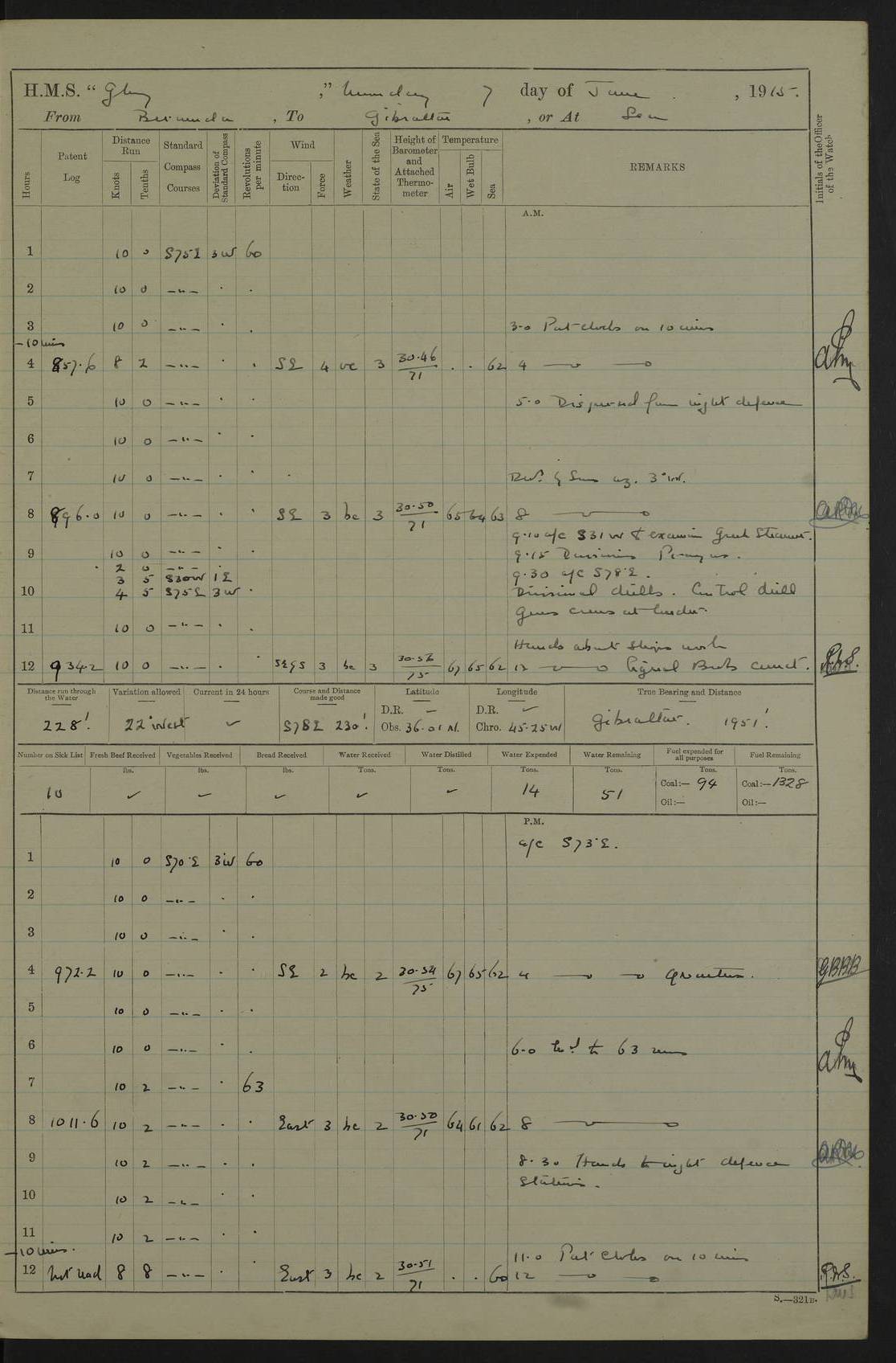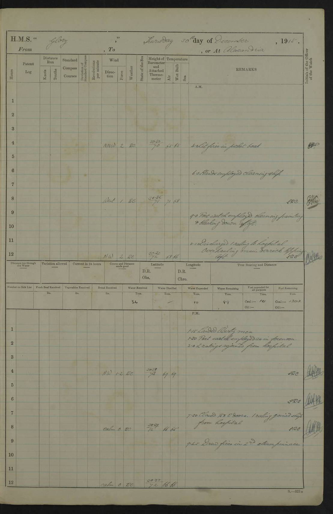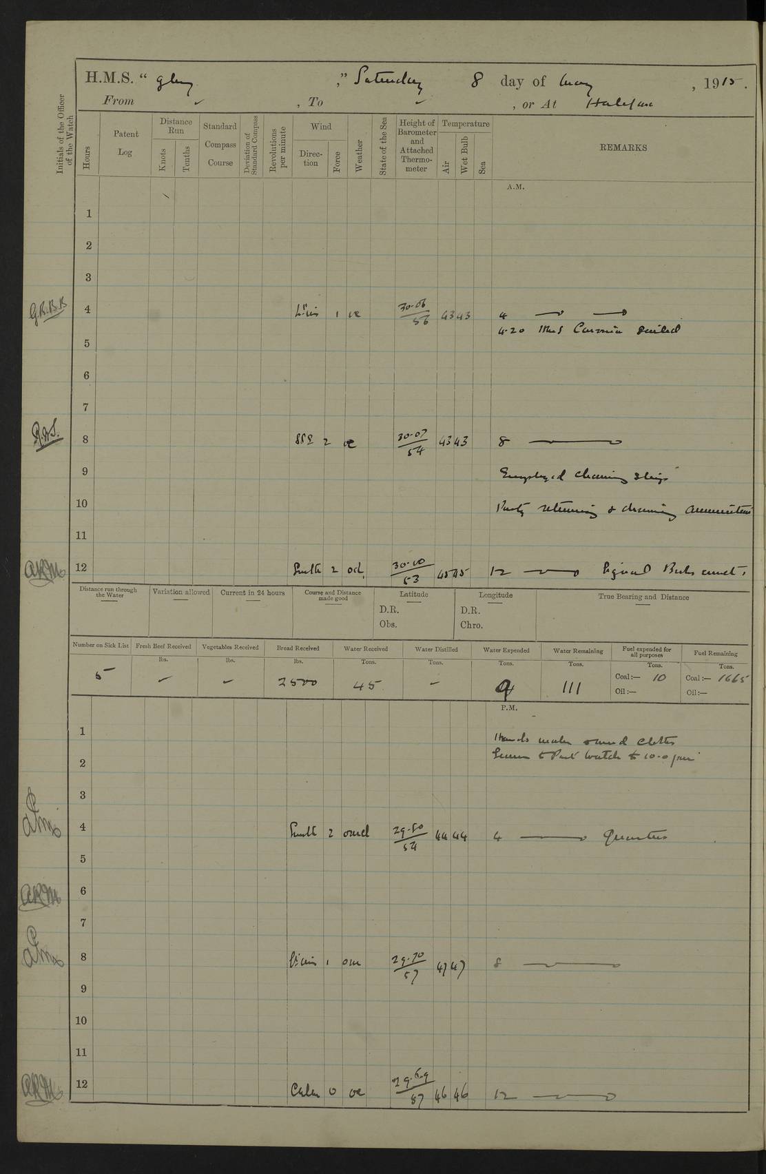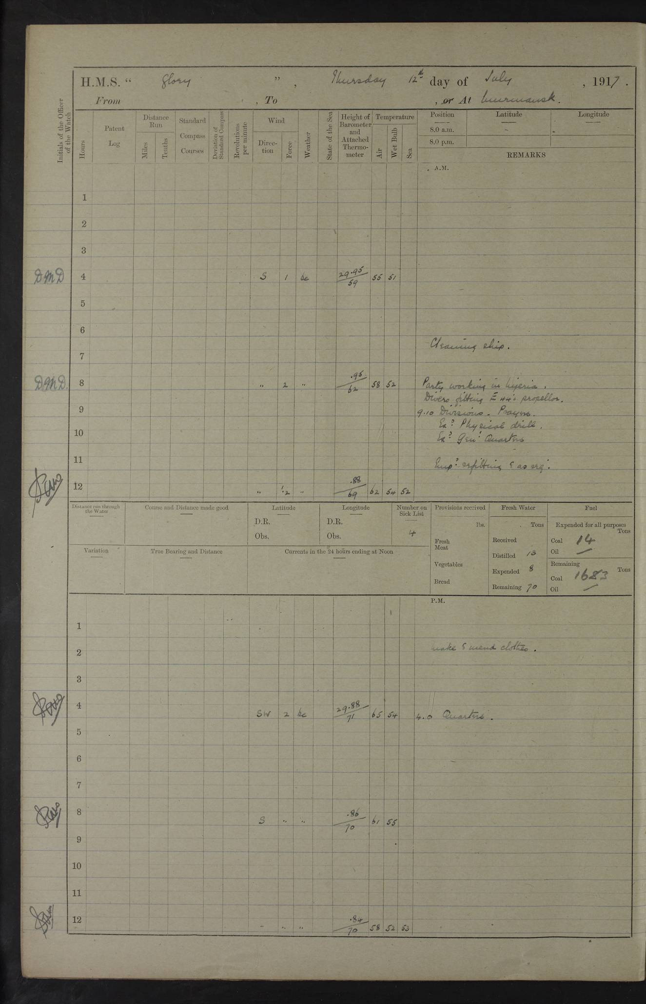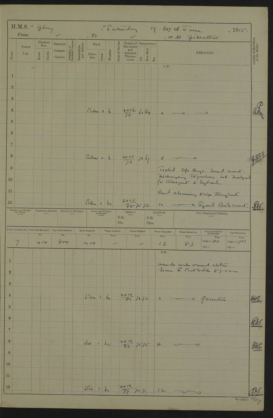 22 June 1915 At sea, Gibraltar to Lemnos Lat 36.1, Long -1.3 4.15am: Sighted land on starboard bow. 10.20am: Stopped port engine for repairs. 11.20am: proceeded with port engine. pm: a/c due to change in deviation. 10.00pm: Cape Tenez Light abeam, 18 miles. 4f73cd61a2fc8ea9030015f6: (https://s3.amazonaws.com:443/oldweather/ADM53-43015/0012_1.jpg) 23 June 1915 At sea, Gibraltar to Lemnos Lat 37.5, Long 4.8 Number on sick list: 4 5.00am: Secured from night defence stations. Placed anti-submarine guns. pm: Life saving appliances served out to men stationed in ? ?at abandon ship. 4f73cd61a2fc8ea9030015f7: (https://s3.amazonaws.com:443/oldweather/ADM53-43015/0013_0.jpg) 24 June 1915 At sea, Gibraltar to Lemnos Lat 37.4, Long 10.8 Position in log clearly bears no resemblance to the location of the ship. Position above is approximate and is based sighting of Zembra Island at 11.55am. 5.00am: Dispersed from night defence stations. Manned anti-submarine guns. am: Sighted two French torpedo boats. am: Torpedo boats passed to ~ No 362, 363. am: Sighted land on starboard beam. 11.55am: Zembra Island abeam, 25 miles. 2.00pm: Sighted Pantellaria S34ºE. 4.45pm: Pantellaria Light House abeam 12 miles. 4f73cd61a2fc8ea9030015f8: (https://s3.amazonaws.com:443/oldweather/ADM53-43015/0013_1.jpg) 25 June 1915 At sea, Gibraltar to Lemnos Lat 35.5, Long 16.7 2.10am: Gozo Light abeam 17 miles. 5.00am: Dispersed from night defence stations. Manned anti-submarine guns. 4f73cd61a2fc8ea9030015f9: (https://s3.amazonaws.com:443/oldweather/ADM53-43015/0014_0.jpg) 26 June 1915 At sea, Gibraltar to Lemnos Lat 35.5, Long 22.6 Number on sick list: 5 5.00am: Dispersed from night defence stations. Manned anti-submarine guns. am: Aired night clothing. am: marines at maxim practice on quarter deck. 2.00pm: Observed land on either bow. 3.00pm: Sighted French patrol destroyer. 4.15pm: Sighted French patrol destroyer. 9.40pm: Milo Peak N63ºW. 10.26pm: Polino Light abeam to port 5.5 miles. 4f73cd62a2fc8ea9030015fa: (https://s3.amazonaws.com:443/oldweather/ADM53-43015/0014_1.jpg) 27 June 1915 At sea and at Lemnos Lat 39.1, Long 24.4 From 0.50 to 3.05am sighting of multiple light houses. 3.50am: a/c to N39ºW and commenced to zig-zag. 5.00am: Dispersed from night defence stations and placed anti-submarine guns and look-outs. am: Lost overboard by accident Hazlewood fender, pat. 311, one in number. 10.30am: Held Divine Service onboard. pm: Met and signalled HMS Minerva on patrol duty. pm: Courses and speeds as requisite while waiting orders to approach Mudros. 3.00pm: Proceeded. 5.16pm: Increased to 90 revs, commenced to zig-zag. Course as requisite for Mudros. 7.00pm: Entered Mudros Bay. 7.47pm: Stopped. Let go port anchor in ‘M3’. 8.30pm: Darkened ship. pm: Manned one 6” and one 12 pdr. 4f73cd62a2fc8ea9030015fb: (https://s3.amazonaws.com:443/oldweather/ADM53-43015/0015_0.jpg) 28 June 1915 Mudros Bay, Lemnos Lat 39.89, Long 25.24 5,00am: HMS Vengeance entered harbour. HMS Vengeance was a pre-dreadnought of the Canopus class, launched in 1899 at Vickers, Barrow, and sold for scrapping in 1921. Details at http://en.wikipedia.org/wiki/HMS_Vengeance_(1899) . am/pm/: hands preparing for coaling and about ship’s work. pm: Collier Wabana secured alongside. 4f73cd62a2fc8ea9030015fc: (https://s3.amazonaws.com:443/oldweather/ADM53-43015/0015_1.jpg) 29 June 1915 Mudros Bay, Lemnos Lat 39.89, Long 25.24 5.15am: Commenced coaling. 2.00pm: Finished coaling. Collier left. 4f73cd62a2fc8ea9030015fd: (https://s3.amazonaws.com:443/oldweather/ADM53-43015/0016_0.jpg) 30 June 1915 Mudros Bay, Lemnos Lat 39.89, Long 25.24 am: Parties away sanding, and with fire engines onshore. am: Boats away disembarking troops. am: French Flagship Patrie sailed. The Patrie was a French pre-dreadnought, launched at La Seyne shipyard in 1903, and stricken in 1921. Details at http://en.wikipedia.org/wiki/French_battleship_Patrie . 6.30pm: Hands to bathe. 4f73cd63a2fc8ea9030015fe: (https://s3.amazonaws.com:443/oldweather/ADM53-43015/0016_1.jpg) 4f73cd63a2fc8ea9030015ff: (https://s3.amazonaws.com:443/oldweather/ADM53-43015/0017_0.jpg) 4f73cd63a2fc8ea903001600: (https://s3.amazonaws.com:443/oldweather/ADM53-43015/0017_1.jpg) 4f73cd63a2fc8ea903001601: (https://s3.amazonaws.com:443/oldweather/ADM53-43015/0018_0.jpg) 4f73cd64a2fc8ea903001602: (https://s3.amazonaws.com:443/oldweather/ADM53-43015/0018_1.jpg) LOGS FOR JULY 1915 From July to October 1915, HMS Glory spent her time at Port Mudros. Certain activities typically took place daily and are not generally noted in the pages below. These activities include: Lighting fires in the picket boat around 4am and drawing the fires in the late evening; Divisions at around 9–9.30am and Evening Quarters at 4pm; Darken ship at around 8.30pm; Daily ‘cleaning ship’, with variations thereof; SBC (for ‘Signal Books Correct’) at the watch changes. 4f73cd64a2fc8ea903001603: (https://s3.amazonaws.com:443/oldweather/ADM53-43016/0000_0.jpg) 4f73cd64a2fc8ea903001604: (https://s3.amazonaws.com:443/oldweather/ADM53-43016/0000_1.jpg) 4f73cd65a2fc8ea903001605: (https://s3.amazonaws.com:443/oldweather/ADM53-43016/0001_0.jpg) 4f73cd65a2fc8ea903001606: (https://s3.amazonaws.com:443/oldweather/ADM53-43016/0001_1.jpg) 1 July 1915 Port Mudros Lat 39.89, Long 25.24 6.30am: Landed working parties preparing boom defence ships. am: Discharged Acting Commander Rayne to Hector. Hector was a kite balloon ship. No further details readily available. 5.00pm: Tug T.10 made fast astern. 7.15pm: HMS Venerable went out. 7.30pm: HMS Chatham went out. HMS Chatham was a ‘Town’ cruiser and lead ship of her class. She was launched in 1911 at Chatham Dockyard and sold in 1926. Details at http://en.wikipedia.org/wiki/HMS_Chatham_(1911) . 4f73cd65a2fc8ea903001607: (https://s3.amazonaws.com:443/oldweather/ADM53-43016/0002_0.jpg) 2 July 1915 Port Mudros Lat 39.89, Long 25.24 5.35am: Landed working parties preparing boom defence ships. am/pm: Boom defence par