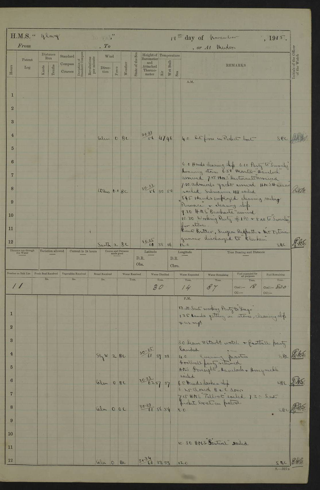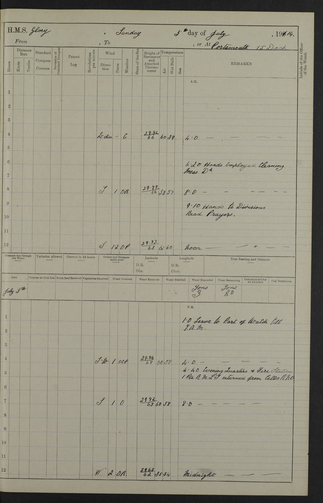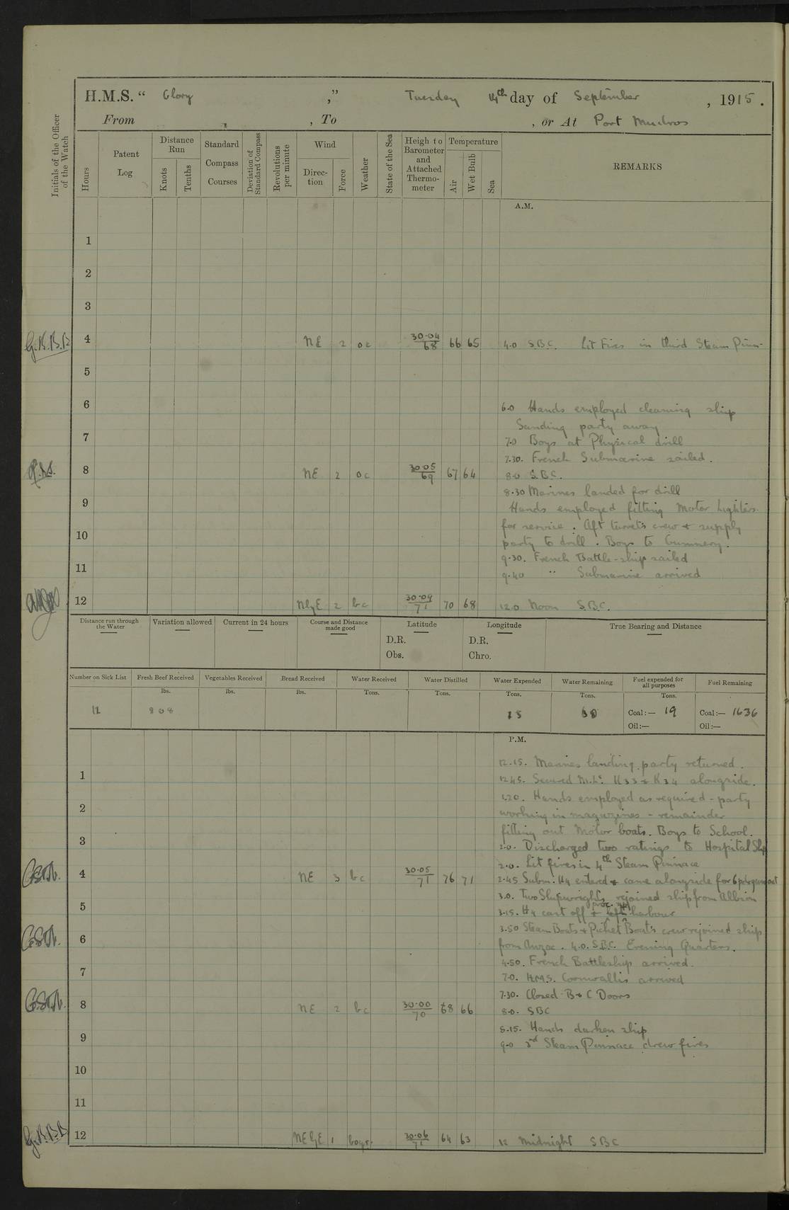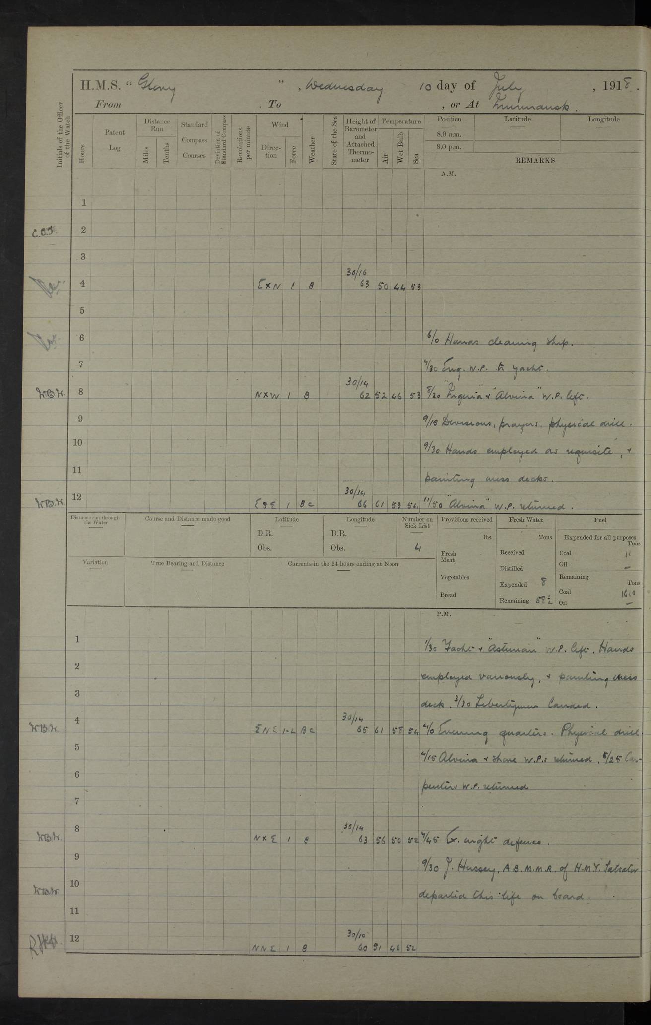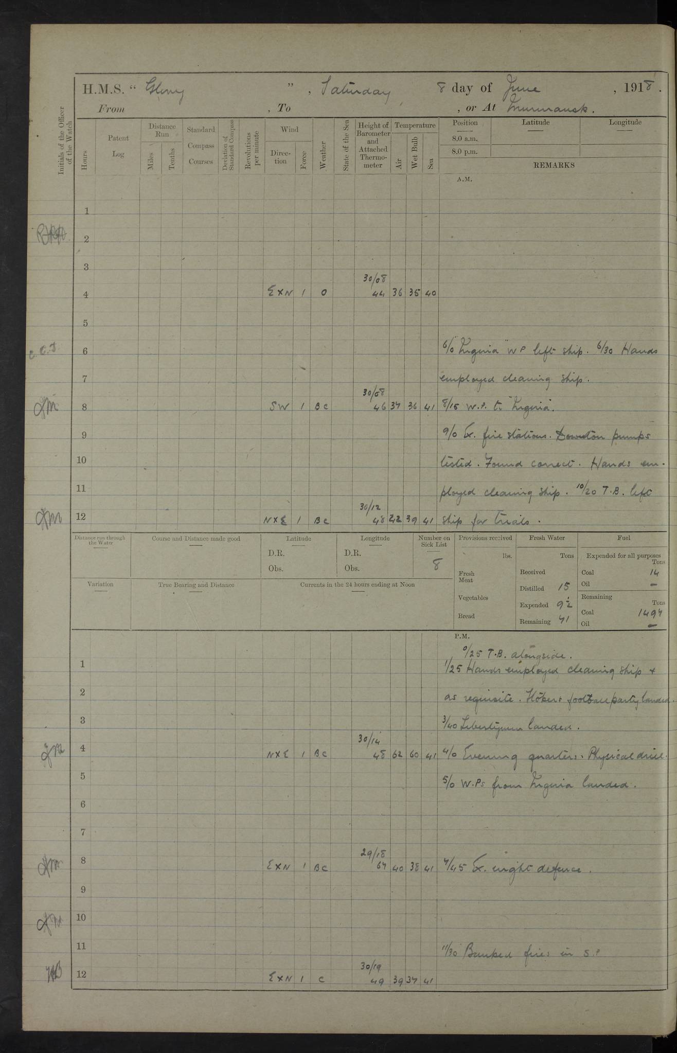 22 June 1915 At sea, Gibraltar to Lemnos Lat 36.1, Long -1.3 4.15am: Sighted land on starboard bow. 10.20am: Stopped port engine for repairs. 11.20am: proceeded with port engine. pm: a/c due to change in deviation. 10.00pm: Cape Tenez Light abeam, 18 miles. 4f73cd61a2fc8ea9030015f6: (https://s3.amazonaws.com:443/oldweather/ADM53-43015/0012_1.jpg) 23 June 1915 At sea, Gibraltar to Lemnos Lat 37.5, Long 4.8 Number on sick list: 4 5.00am: Secured from night defence stations. Placed anti-submarine guns. pm: Life saving appliances served out to men stationed in ? ?at abandon ship. 4f73cd61a2fc8ea9030015f7: (https://s3.amazonaws.com:443/oldweather/ADM53-43015/0013_0.jpg) 24 June 1915 At sea, Gibraltar to Lemnos Lat 37.4, Long 10.8 Position in log clearly bears no resemblance to the location of the ship. Position above is approximate and is based sighting of Zembra Island at 11.55am. 5.00am: Dispersed from night defence stations. Manned anti-submarine guns. am: Sighted two French torpedo boats. am: Torpedo boats passed to ~ No 362, 363. am: Sighted land on starboard beam. 11.55am: Zembra Island abeam, 25 miles. 2.00pm: Sighted Pantellaria S34ºE. 4.45pm: Pantellaria Light House abeam 12 miles. 4f73cd61a2fc8ea9030015f8: (https://s3.amazonaws.com:443/oldweather/ADM53-43015/0013_1.jpg) 25 June 1915 At sea, Gibraltar to Lemnos Lat 35.5, Long 16.7 2.10am: Gozo Light abeam 17 miles. 5.00am: Dispersed from night defence stations. Manned anti-submarine guns. 4f73cd61a2fc8ea9030015f9: (https://s3.amazonaws.com:443/oldweather/ADM53-43015/0014_0.jpg) 26 June 1915 At sea, Gibraltar to Lemnos Lat 35.5, Long 22.6 Number on sick list: 5 5.00am: Dispersed from night defence stations. Manned anti-submarine guns. am: Aired night clothing. am: marines at maxim practice on quarter deck. 2.00pm: Observed land on either bow. 3.00pm: Sighted French patrol destroyer. 4.15pm: Sighted French patrol destroyer. 9.40pm: Milo Peak N63ºW. 10.26pm: Polino Light abeam to port 5.5 miles. 4f73cd62a2fc8ea9030015fa: (https://s3.amazonaws.com:443/oldweather/ADM53-43015/0014_1.jpg) 27 June 1915 At sea and at Lemnos Lat 39.1, Long 24.4 From 0.50 to 3.05am sighting of multiple light houses. 3.50am: a/c to N39ºW and commenced to zig-zag. 5.00am: Dispersed from night defence stations and placed anti-submarine guns and look-outs. am: Lost overboard by accident Hazlewood fender, pat. 311, one in number. 10.30am: Held Divine Service onboard. pm: Met and signalled HMS Minerva on patrol duty. pm: Courses and speeds as requisite while waiting orders to approach Mudros. 3.00pm: Proceeded. 5.16pm: Increased to 90 revs, commenced to zig-zag. Course as requisite for Mudros. 7.00pm: Entered Mudros Bay. 7.47pm: Stopped. Let go port anchor in ‘M3’. 8.30pm: Darkened ship. pm: Manned one 6” and one 12 pdr. 4f73cd62a2fc8ea9030015fb: (https://s3.amazonaws.com:443/oldweather/ADM53-43015/0015_0.jpg) 28 June 1915 Mudros Bay, Lemnos Lat 39.89, Long 25.24 5,00am: HMS Vengeance entered harbour. HMS Vengeance was a pre-dreadnought of the Canopus class, launched in 1899 at Vickers, Barrow, and sold for scrapping in 1921. Details at http://en.wikipedia.org/wiki/HMS_Vengeance_(1899) . am/pm/: hands preparing for coaling and about ship’s work. pm: Collier Wabana secured alongside. 4f73cd62a2fc8ea9030015fc: (https://s3.amazonaws.com:443/oldweather/ADM53-43015/0015_1.jpg) 29 June 1915 Mudros Bay, Lemnos Lat 39.89, Long 25.24 5.15am: Commenced coaling. 2.00pm: Finished coaling. Collier left. 4f73cd62a2fc8ea9030015fd: (https://s3.amazonaws.com:443/oldweather/ADM53-43015/0016_0.jpg) 30 June 1915 Mudros Bay, Lemnos Lat 39.89, Long 25.24 am: Parties away sanding, and with fire engines onshore. am: Boats away disembarking troops. am: French Flagship Patrie sailed. The Patrie was a French pre-dreadnought, launched at La Seyne shipyard in 1903, and stricken in 1921. Details at http://en.wikipedia.org/wiki/French_battleship_Patrie . 6.30pm: Hands to bathe. 4f73cd63a2fc8ea9030015fe: (https://s3.amazonaws.com:443/oldweather/ADM53-43015/0016_1.jpg) 4f73cd63a2fc8ea9030015ff: (https://s3.amazonaws.com:443/oldweather/ADM53-43015/0017_0.jpg) 4f73cd63a2fc8ea903001600: (https://s3.amazonaws.com:443/oldweather/ADM53-43015/0017_1.jpg) 4f73cd63a2fc8ea903001601: (https://s3.amazonaws.com:443/oldweather/ADM53-43015/0018_0.jpg) 4f73cd64a2fc8ea903001602: (https://s3.amazonaws.com:443/oldweather/ADM53-43015/0018_1.jpg) LOGS FOR JULY 1915 From July to October 1915, HMS Glory spent her time at Port Mudros. Certain activities typically took place daily and are not generally noted in the pages below. These activities include: Lighting fires in the picket boat around 4am and drawing the fires in the late evening; Divisions at around 9–9.30am and Evening Quarters at 4pm; Darken ship at around 8.30pm; Daily ‘cleaning ship’, with variations thereof; SBC (for ‘Signal Books Correct’) at the watch changes. 4f73cd64a2fc8ea903001603: (https://s3.amazonaws.com:443/oldweather/ADM53-43016/0000_0.jpg) 4f73cd64a2fc8ea903001604: (https://s3.amazonaws.com:443/oldweather/ADM53-43016/0000_1.jpg) 4f73cd65a2fc8ea903001605: (https://s3.amazonaws.com:443/oldweather/ADM53-43016/0001_0.jpg) 4f73cd65a2fc8ea903001606: (https://s3.amazonaws.com:443/oldweather/ADM53-43016/0001_1.jpg) 1 July 1915 Port Mudros Lat 39.89, Long 25.24 6.30am: Landed working parties preparing boom defence ships. am: Discharged Acting Commander Rayne to Hector. Hector was a kite balloon ship. No further details readily available. 5.00pm: Tug T.10 made fast astern. 7.15pm: HMS Venerable went out. 7.30pm: HMS Chatham went out. HMS Chatham was a ‘Town’ cruiser and lead ship of her class. She was launched in 1911 at Chatham Dockyard and sold in 1926. Details at http://en.wikipedia.org/wiki/HMS_Chatham_(1911) . 4f73cd65a2fc8ea903001607: (https://s3.amazonaws.com:443/oldweather/ADM53-43016/0002_0.jpg) 2 July 1915 Port Mudros Lat 39.89, Long 25.24 5.35am: Landed working parties preparing boom defence ships. am/pm: Boom defence par