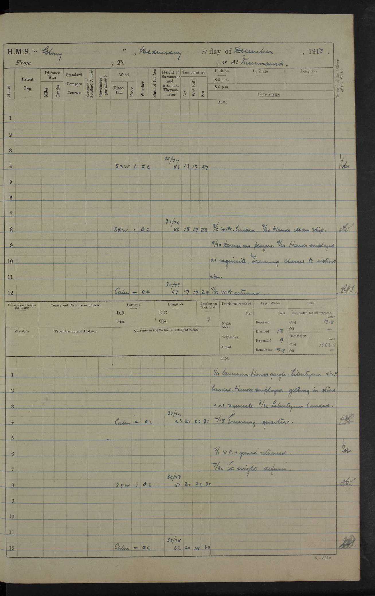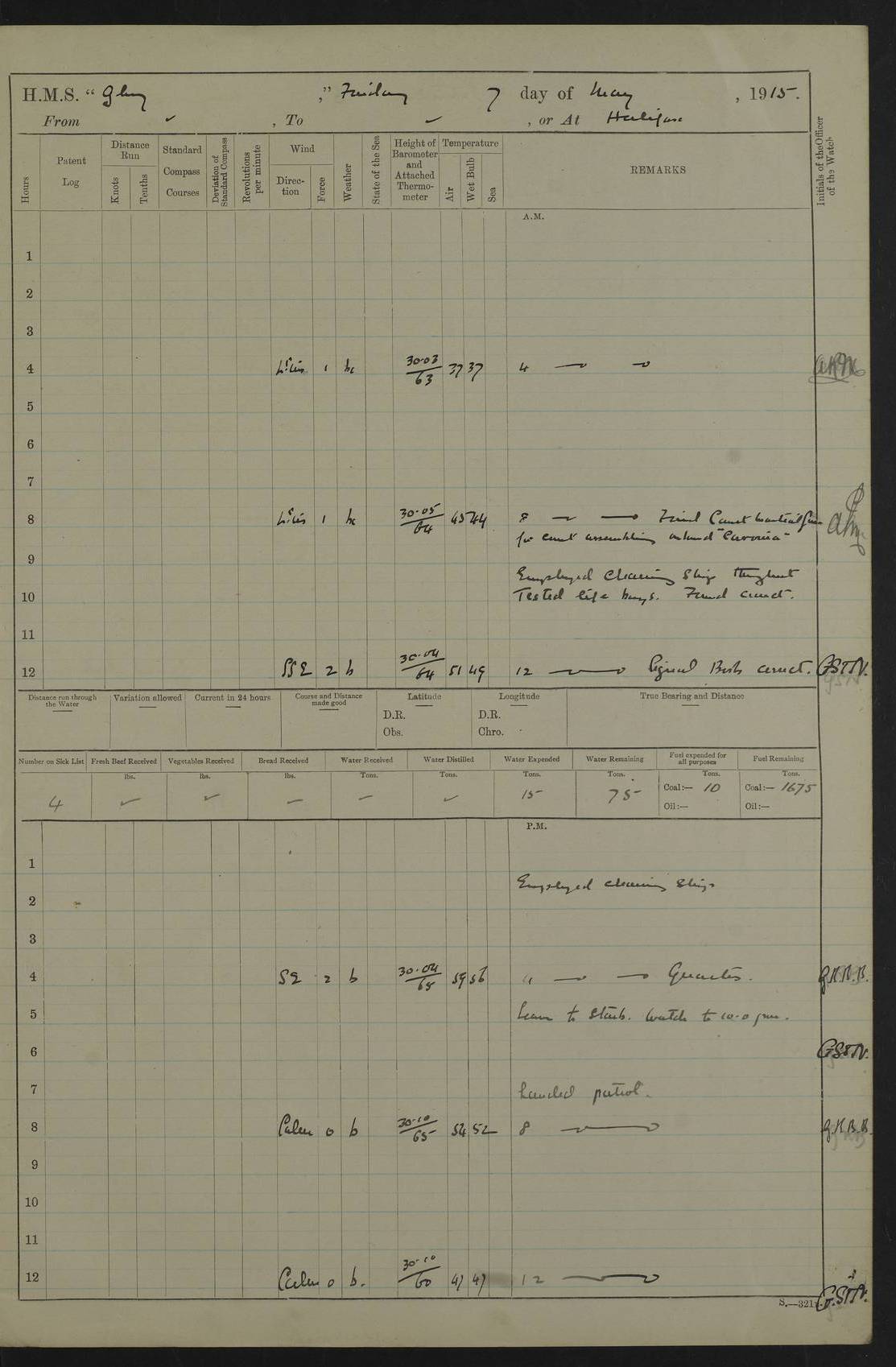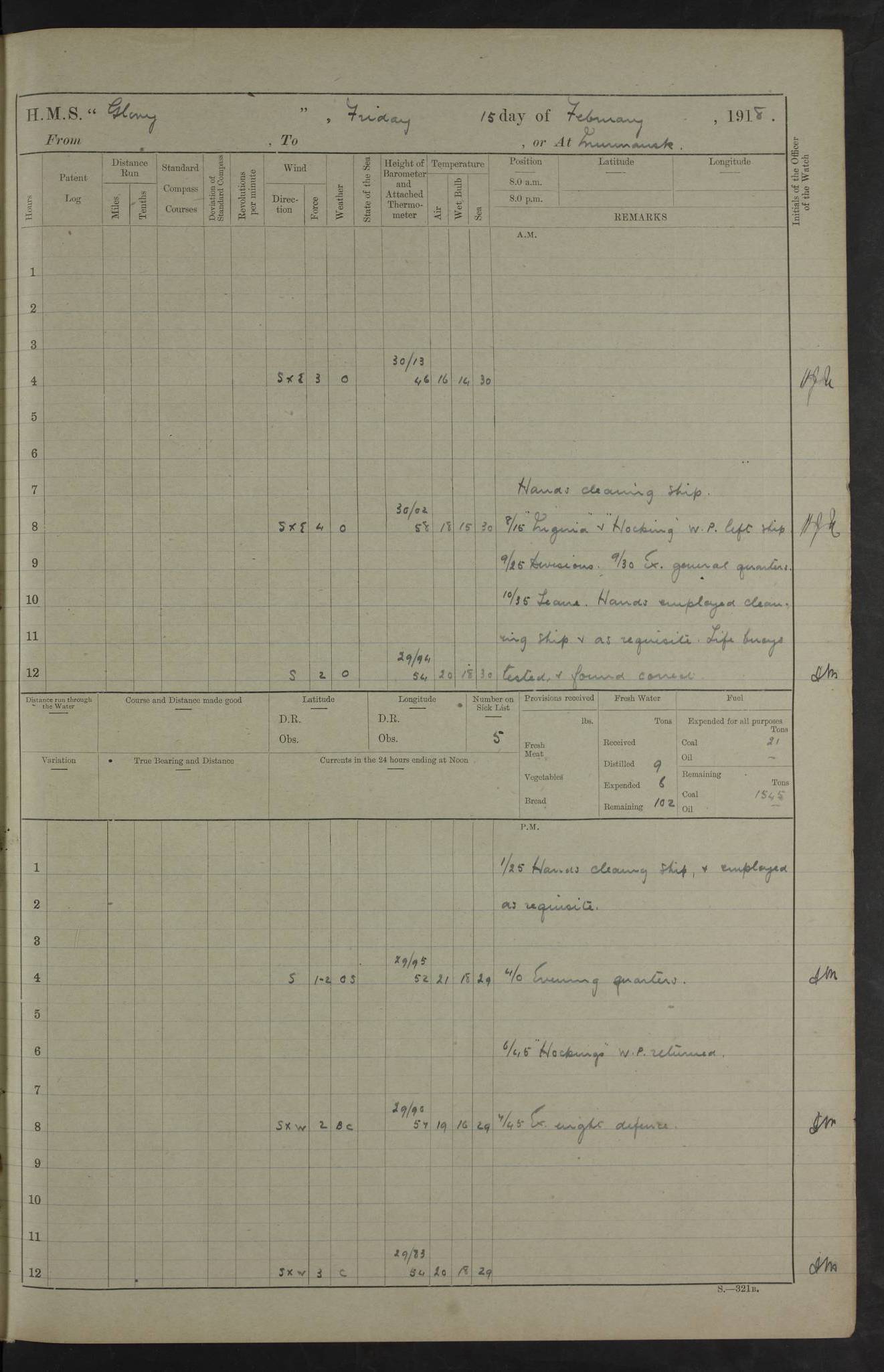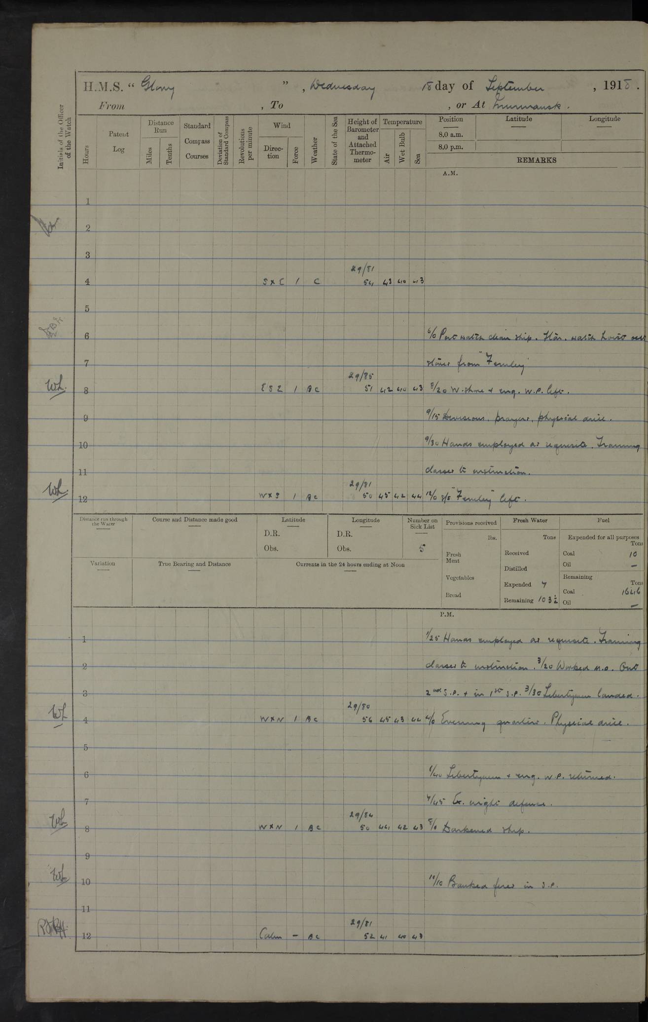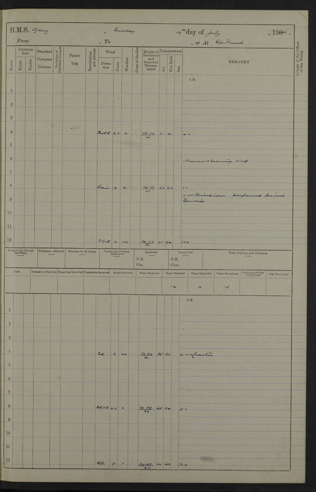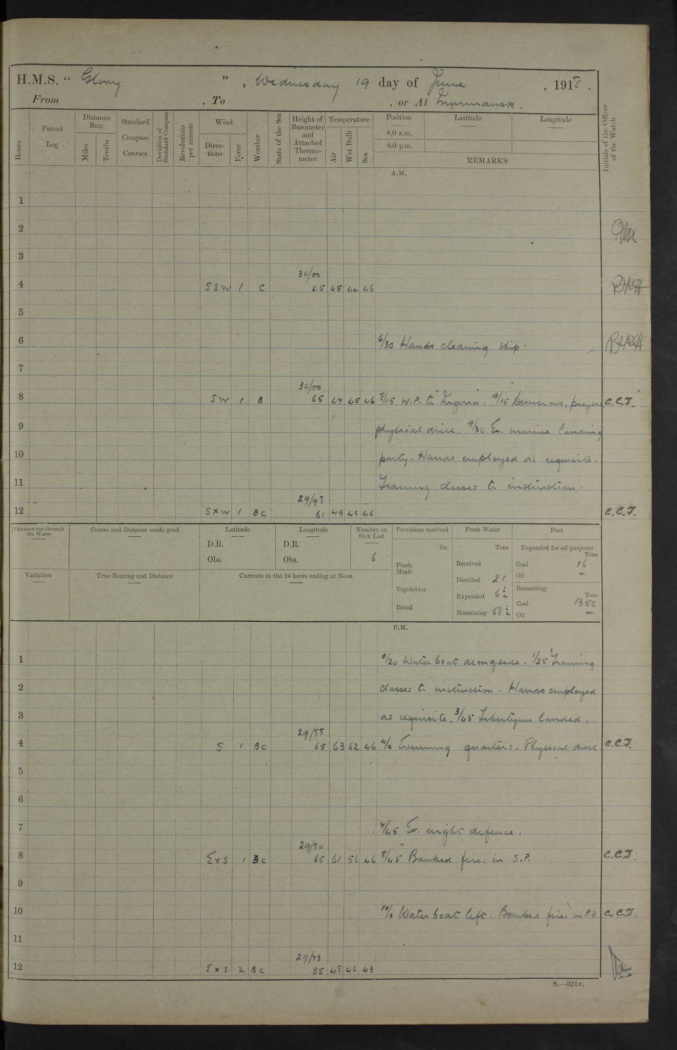 22 June 1915 At sea, Gibraltar to Lemnos Lat 36.1, Long -1.3 4.15am: Sighted land on starboard bow. 10.20am: Stopped port engine for repairs. 11.20am: proceeded with port engine. pm: a/c due to change in deviation. 10.00pm: Cape Tenez Light abeam, 18 miles. 4f73cd61a2fc8ea9030015f6: (https://s3.amazonaws.com:443/oldweather/ADM53-43015/0012_1.jpg) 23 June 1915 At sea, Gibraltar to Lemnos Lat 37.5, Long 4.8 Number on sick list: 4 5.00am: Secured from night defence stations. Placed anti-submarine guns. pm: Life saving appliances served out to men stationed in ? ?at abandon ship. 4f73cd61a2fc8ea9030015f7: (https://s3.amazonaws.com:443/oldweather/ADM53-43015/0013_0.jpg) 24 June 1915 At sea, Gibraltar to Lemnos Lat 37.4, Long 10.8 Position in log clearly bears no resemblance to the location of the ship. Position above is approximate and is based sighting of Zembra Island at 11.55am. 5.00am: Dispersed from night defence stations. Manned anti-submarine guns. am: Sighted two French torpedo boats. am: Torpedo boats passed to ~ No 362, 363. am: Sighted land on starboard beam. 11.55am: Zembra Island abeam, 25 miles. 2.00pm: Sighted Pantellaria S34ºE. 4.45pm: Pantellaria Light House abeam 12 miles. 4f73cd61a2fc8ea9030015f8: (https://s3.amazonaws.com:443/oldweather/ADM53-43015/0013_1.jpg) 25 June 1915 At sea, Gibraltar to Lemnos Lat 35.5, Long 16.7 2.10am: Gozo Light abeam 17 miles. 5.00am: Dispersed from night defence stations. Manned anti-submarine guns. 4f73cd61a2fc8ea9030015f9: (https://s3.amazonaws.com:443/oldweather/ADM53-43015/0014_0.jpg) 26 June 1915 At sea, Gibraltar to Lemnos Lat 35.5, Long 22.6 Number on sick list: 5 5.00am: Dispersed from night defence stations. Manned anti-submarine guns. am: Aired night clothing. am: marines at maxim practice on quarter deck. 2.00pm: Observed land on either bow. 3.00pm: Sighted French patrol destroyer. 4.15pm: Sighted French patrol destroyer. 9.40pm: Milo Peak N63ºW. 10.26pm: Polino Light abeam to port 5.5 miles. 4f73cd62a2fc8ea9030015fa: (https://s3.amazonaws.com:443/oldweather/ADM53-43015/0014_1.jpg) 27 June 1915 At sea and at Lemnos Lat 39.1, Long 24.4 From 0.50 to 3.05am sighting of multiple light houses. 3.50am: a/c to N39ºW and commenced to zig-zag. 5.00am: Dispersed from night defence stations and placed anti-submarine guns and look-outs. am: Lost overboard by accident Hazlewood fender, pat. 311, one in number. 10.30am: Held Divine Service onboard. pm: Met and signalled HMS Minerva on patrol duty. pm: Courses and speeds as requisite while waiting orders to approach Mudros. 3.00pm: Proceeded. 5.16pm: Increased to 90 revs, commenced to zig-zag. Course as requisite for Mudros. 7.00pm: Entered Mudros Bay. 7.47pm: Stopped. Let go port anchor in ‘M3’. 8.30pm: Darkened ship. pm: Manned one 6” and one 12 pdr. 4f73cd62a2fc8ea9030015fb: (https://s3.amazonaws.com:443/oldweather/ADM53-43015/0015_0.jpg) 28 June 1915 Mudros Bay, Lemnos Lat 39.89, Long 25.24 5,00am: HMS Vengeance entered harbour. HMS Vengeance was a pre-dreadnought of the Canopus class, launched in 1899 at Vickers, Barrow, and sold for scrapping in 1921. Details at http://en.wikipedia.org/wiki/HMS_Vengeance_(1899) . am/pm/: hands preparing for coaling and about ship’s work. pm: Collier Wabana secured alongside. 4f73cd62a2fc8ea9030015fc: (https://s3.amazonaws.com:443/oldweather/ADM53-43015/0015_1.jpg) 29 June 1915 Mudros Bay, Lemnos Lat 39.89, Long 25.24 5.15am: Commenced coaling. 2.00pm: Finished coaling. Collier left. 4f73cd62a2fc8ea9030015fd: (https://s3.amazonaws.com:443/oldweather/ADM53-43015/0016_0.jpg) 30 June 1915 Mudros Bay, Lemnos Lat 39.89, Long 25.24 am: Parties away sanding, and with fire engines onshore. am: Boats away disembarking troops. am: French Flagship Patrie sailed. The Patrie was a French pre-dreadnought, launched at La Seyne shipyard in 1903, and stricken in 1921. Details at http://en.wikipedia.org/wiki/French_battleship_Patrie . 6.30pm: Hands to bathe. 4f73cd63a2fc8ea9030015fe: (https://s3.amazonaws.com:443/oldweather/ADM53-43015/0016_1.jpg) 4f73cd63a2fc8ea9030015ff: (https://s3.amazonaws.com:443/oldweather/ADM53-43015/0017_0.jpg) 4f73cd63a2fc8ea903001600: (https://s3.amazonaws.com:443/oldweather/ADM53-43015/0017_1.jpg) 4f73cd63a2fc8ea903001601: (https://s3.amazonaws.com:443/oldweather/ADM53-43015/0018_0.jpg) 4f73cd64a2fc8ea903001602: (https://s3.amazonaws.com:443/oldweather/ADM53-43015/0018_1.jpg) LOGS FOR JULY 1915 From July to October 1915, HMS Glory spent her time at Port Mudros. Certain activities typically took place daily and are not generally noted in the pages below. These activities include: Lighting fires in the picket boat around 4am and drawing the fires in the late evening; Divisions at around 9–9.30am and Evening Quarters at 4pm; Darken ship at around 8.30pm; Daily ‘cleaning ship’, with variations thereof; SBC (for ‘Signal Books Correct’) at the watch changes. 4f73cd64a2fc8ea903001603: (https://s3.amazonaws.com:443/oldweather/ADM53-43016/0000_0.jpg) 4f73cd64a2fc8ea903001604: (https://s3.amazonaws.com:443/oldweather/ADM53-43016/0000_1.jpg) 4f73cd65a2fc8ea903001605: (https://s3.amazonaws.com:443/oldweather/ADM53-43016/0001_0.jpg) 4f73cd65a2fc8ea903001606: (https://s3.amazonaws.com:443/oldweather/ADM53-43016/0001_1.jpg) 1 July 1915 Port Mudros Lat 39.89, Long 25.24 6.30am: Landed working parties preparing boom defence ships. am: Discharged Acting Commander Rayne to Hector. Hector was a kite balloon ship. No further details readily available. 5.00pm: Tug T.10 made fast astern. 7.15pm: HMS Venerable went out. 7.30pm: HMS Chatham went out. HMS Chatham was a ‘Town’ cruiser and lead ship of her class. She was launched in 1911 at Chatham Dockyard and sold in 1926. Details at http://en.wikipedia.org/wiki/HMS_Chatham_(1911) . 4f73cd65a2fc8ea903001607: (https://s3.amazonaws.com:443/oldweather/ADM53-43016/0002_0.jpg) 2 July 1915 Port Mudros Lat 39.89, Long 25.24 5.35am: Landed working parties preparing boom defence ships. am/pm: Boom defence par