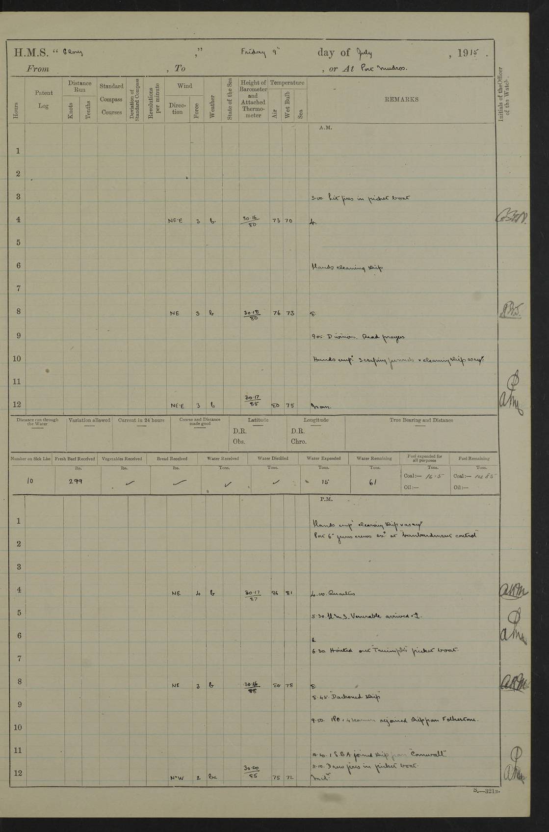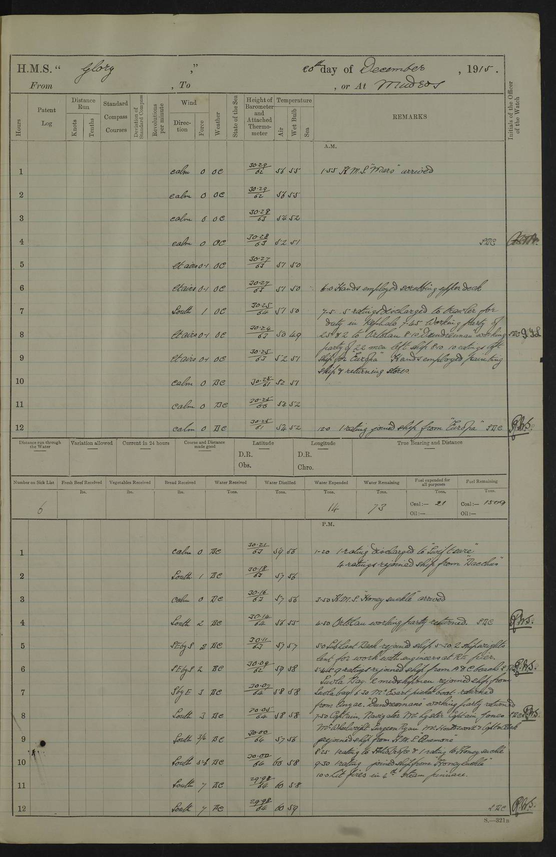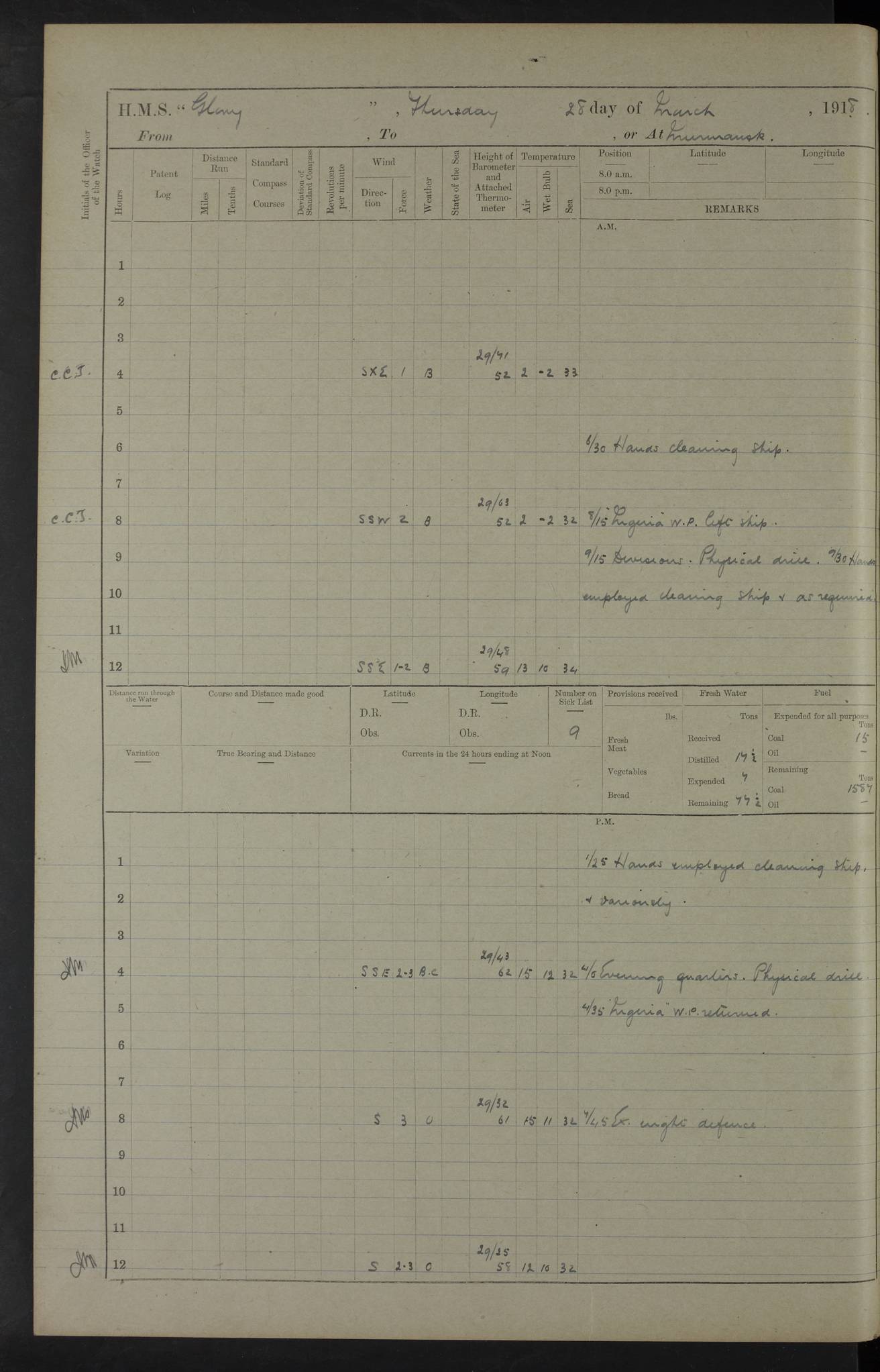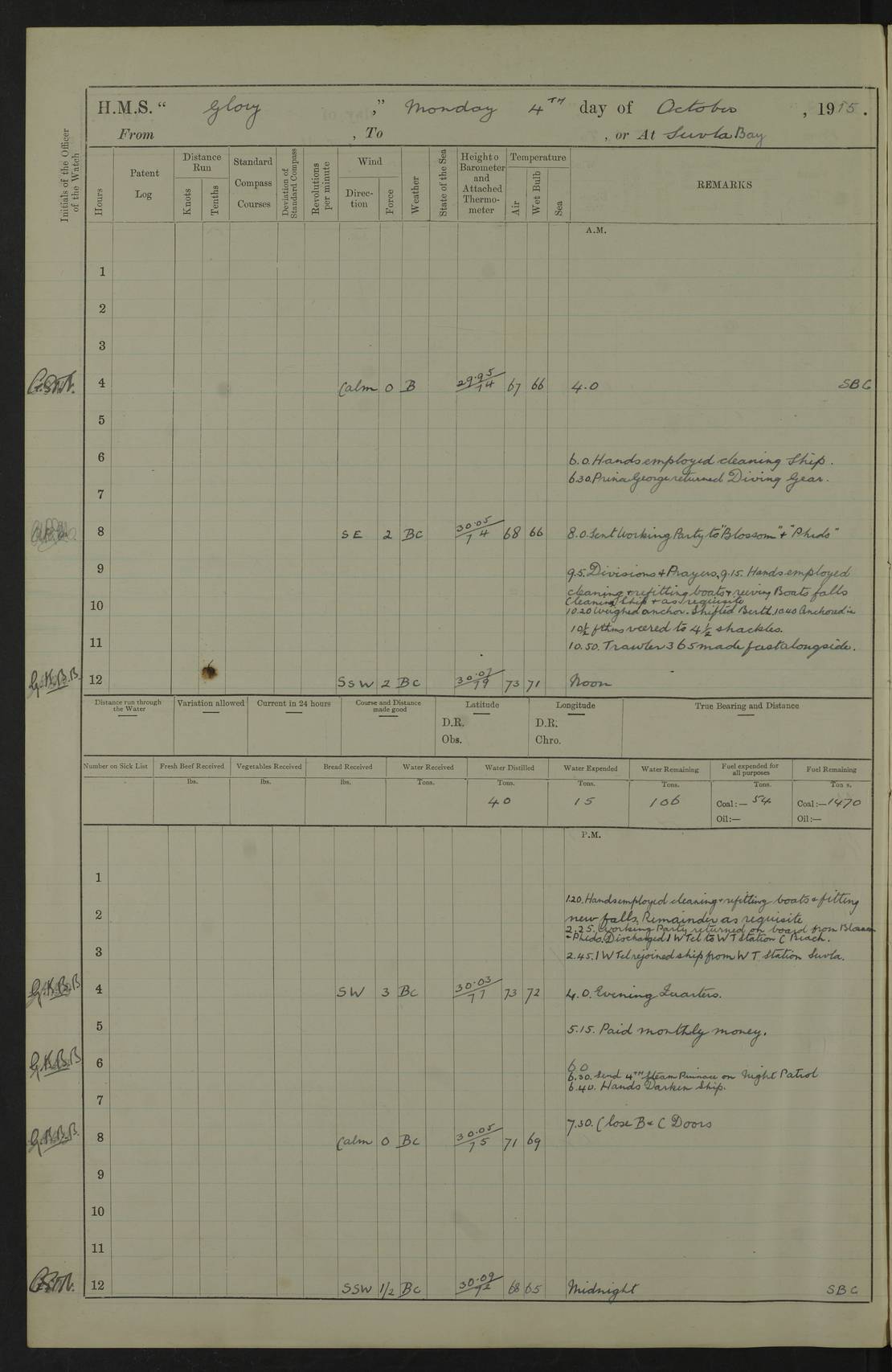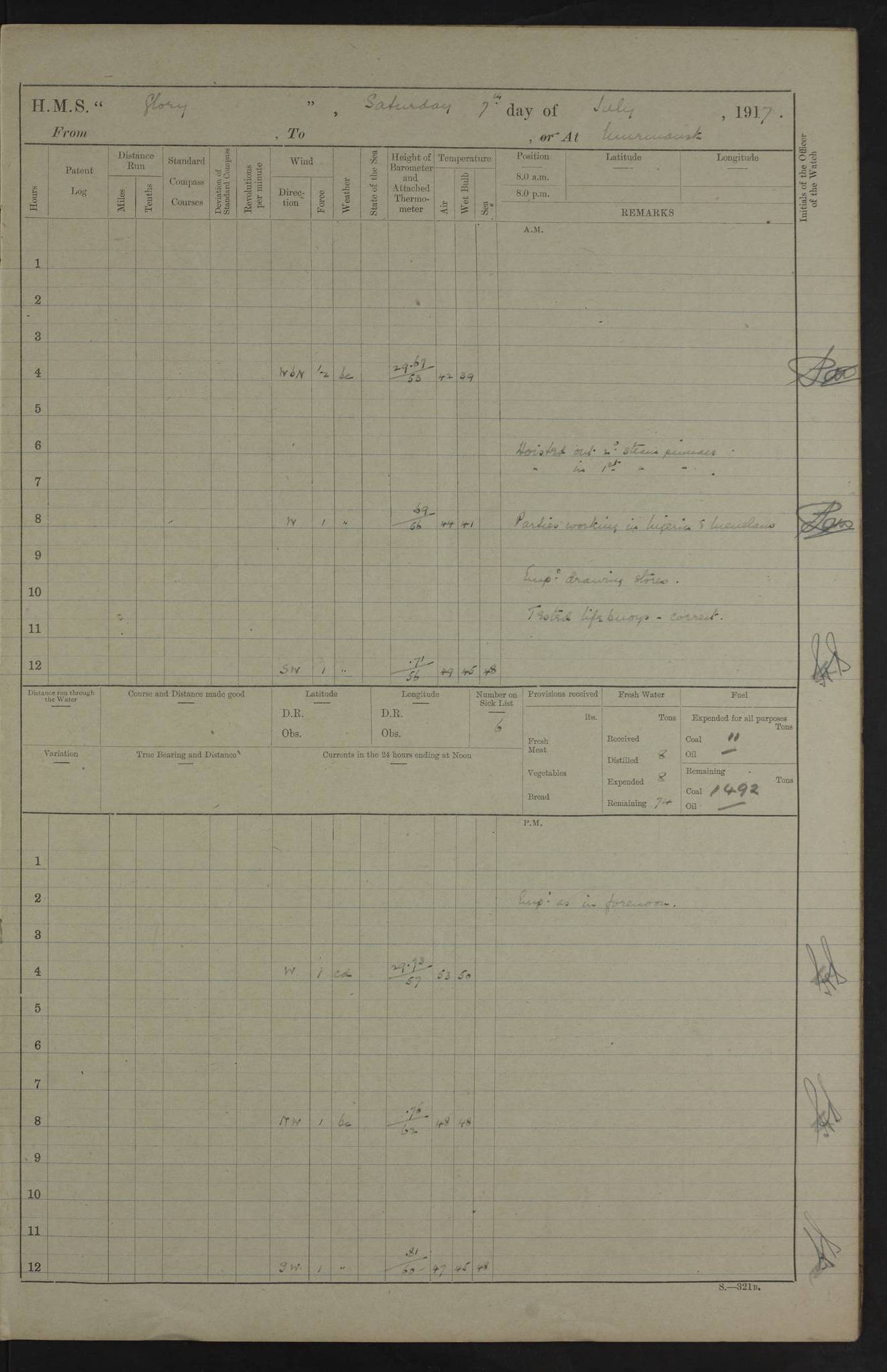 22 June 1915 At sea, Gibraltar to Lemnos Lat 36.1, Long -1.3 4.15am: Sighted land on starboard bow. 10.20am: Stopped port engine for repairs. 11.20am: proceeded with port engine. pm: a/c due to change in deviation. 10.00pm: Cape Tenez Light abeam, 18 miles. 4f73cd61a2fc8ea9030015f6: (https://s3.amazonaws.com:443/oldweather/ADM53-43015/0012_1.jpg) 23 June 1915 At sea, Gibraltar to Lemnos Lat 37.5, Long 4.8 Number on sick list: 4 5.00am: Secured from night defence stations. Placed anti-submarine guns. pm: Life saving appliances served out to men stationed in ? ?at abandon ship. 4f73cd61a2fc8ea9030015f7: (https://s3.amazonaws.com:443/oldweather/ADM53-43015/0013_0.jpg) 24 June 1915 At sea, Gibraltar to Lemnos Lat 37.4, Long 10.8 Position in log clearly bears no resemblance to the location of the ship. Position above is approximate and is based sighting of Zembra Island at 11.55am. 5.00am: Dispersed from night defence stations. Manned anti-submarine guns. am: Sighted two French torpedo boats. am: Torpedo boats passed to ~ No 362, 363. am: Sighted land on starboard beam. 11.55am: Zembra Island abeam, 25 miles. 2.00pm: Sighted Pantellaria S34ºE. 4.45pm: Pantellaria Light House abeam 12 miles. 4f73cd61a2fc8ea9030015f8: (https://s3.amazonaws.com:443/oldweather/ADM53-43015/0013_1.jpg) 25 June 1915 At sea, Gibraltar to Lemnos Lat 35.5, Long 16.7 2.10am: Gozo Light abeam 17 miles. 5.00am: Dispersed from night defence stations. Manned anti-submarine guns. 4f73cd61a2fc8ea9030015f9: (https://s3.amazonaws.com:443/oldweather/ADM53-43015/0014_0.jpg) 26 June 1915 At sea, Gibraltar to Lemnos Lat 35.5, Long 22.6 Number on sick list: 5 5.00am: Dispersed from night defence stations. Manned anti-submarine guns. am: Aired night clothing. am: marines at maxim practice on quarter deck. 2.00pm: Observed land on either bow. 3.00pm: Sighted French patrol destroyer. 4.15pm: Sighted French patrol destroyer. 9.40pm: Milo Peak N63ºW. 10.26pm: Polino Light abeam to port 5.5 miles. 4f73cd62a2fc8ea9030015fa: (https://s3.amazonaws.com:443/oldweather/ADM53-43015/0014_1.jpg) 27 June 1915 At sea and at Lemnos Lat 39.1, Long 24.4 From 0.50 to 3.05am sighting of multiple light houses. 3.50am: a/c to N39ºW and commenced to zig-zag. 5.00am: Dispersed from night defence stations and placed anti-submarine guns and look-outs. am: Lost overboard by accident Hazlewood fender, pat. 311, one in number. 10.30am: Held Divine Service onboard. pm: Met and signalled HMS Minerva on patrol duty. pm: Courses and speeds as requisite while waiting orders to approach Mudros. 3.00pm: Proceeded. 5.16pm: Increased to 90 revs, commenced to zig-zag. Course as requisite for Mudros. 7.00pm: Entered Mudros Bay. 7.47pm: Stopped. Let go port anchor in ‘M3’. 8.30pm: Darkened ship. pm: Manned one 6” and one 12 pdr. 4f73cd62a2fc8ea9030015fb: (https://s3.amazonaws.com:443/oldweather/ADM53-43015/0015_0.jpg) 28 June 1915 Mudros Bay, Lemnos Lat 39.89, Long 25.24 5,00am: HMS Vengeance entered harbour. HMS Vengeance was a pre-dreadnought of the Canopus class, launched in 1899 at Vickers, Barrow, and sold for scrapping in 1921. Details at http://en.wikipedia.org/wiki/HMS_Vengeance_(1899) . am/pm/: hands preparing for coaling and about ship’s work. pm: Collier Wabana secured alongside. 4f73cd62a2fc8ea9030015fc: (https://s3.amazonaws.com:443/oldweather/ADM53-43015/0015_1.jpg) 29 June 1915 Mudros Bay, Lemnos Lat 39.89, Long 25.24 5.15am: Commenced coaling. 2.00pm: Finished coaling. Collier left. 4f73cd62a2fc8ea9030015fd: (https://s3.amazonaws.com:443/oldweather/ADM53-43015/0016_0.jpg) 30 June 1915 Mudros Bay, Lemnos Lat 39.89, Long 25.24 am: Parties away sanding, and with fire engines onshore. am: Boats away disembarking troops. am: French Flagship Patrie sailed. The Patrie was a French pre-dreadnought, launched at La Seyne shipyard in 1903, and stricken in 1921. Details at http://en.wikipedia.org/wiki/French_battleship_Patrie . 6.30pm: Hands to bathe. 4f73cd63a2fc8ea9030015fe: (https://s3.amazonaws.com:443/oldweather/ADM53-43015/0016_1.jpg) 4f73cd63a2fc8ea9030015ff: (https://s3.amazonaws.com:443/oldweather/ADM53-43015/0017_0.jpg) 4f73cd63a2fc8ea903001600: (https://s3.amazonaws.com:443/oldweather/ADM53-43015/0017_1.jpg) 4f73cd63a2fc8ea903001601: (https://s3.amazonaws.com:443/oldweather/ADM53-43015/0018_0.jpg) 4f73cd64a2fc8ea903001602: (https://s3.amazonaws.com:443/oldweather/ADM53-43015/0018_1.jpg) LOGS FOR JULY 1915 From July to October 1915, HMS Glory spent her time at Port Mudros. Certain activities typically took place daily and are not generally noted in the pages below. These activities include: Lighting fires in the picket boat around 4am and drawing the fires in the late evening; Divisions at around 9–9.30am and Evening Quarters at 4pm; Darken ship at around 8.30pm; Daily ‘cleaning ship’, with variations thereof; SBC (for ‘Signal Books Correct’) at the watch changes. 4f73cd64a2fc8ea903001603: (https://s3.amazonaws.com:443/oldweather/ADM53-43016/0000_0.jpg) 4f73cd64a2fc8ea903001604: (https://s3.amazonaws.com:443/oldweather/ADM53-43016/0000_1.jpg) 4f73cd65a2fc8ea903001605: (https://s3.amazonaws.com:443/oldweather/ADM53-43016/0001_0.jpg) 4f73cd65a2fc8ea903001606: (https://s3.amazonaws.com:443/oldweather/ADM53-43016/0001_1.jpg) 1 July 1915 Port Mudros Lat 39.89, Long 25.24 6.30am: Landed working parties preparing boom defence ships. am: Discharged Acting Commander Rayne to Hector. Hector was a kite balloon ship. No further details readily available. 5.00pm: Tug T.10 made fast astern. 7.15pm: HMS Venerable went out. 7.30pm: HMS Chatham went out. HMS Chatham was a ‘Town’ cruiser and lead ship of her class. She was launched in 1911 at Chatham Dockyard and sold in 1926. Details at http://en.wikipedia.org/wiki/HMS_Chatham_(1911) . 4f73cd65a2fc8ea903001607: (https://s3.amazonaws.com:443/oldweather/ADM53-43016/0002_0.jpg) 2 July 1915 Port Mudros Lat 39.89, Long 25.24 5.35am: Landed working parties preparing boom defence ships. am/pm: Boom defence par