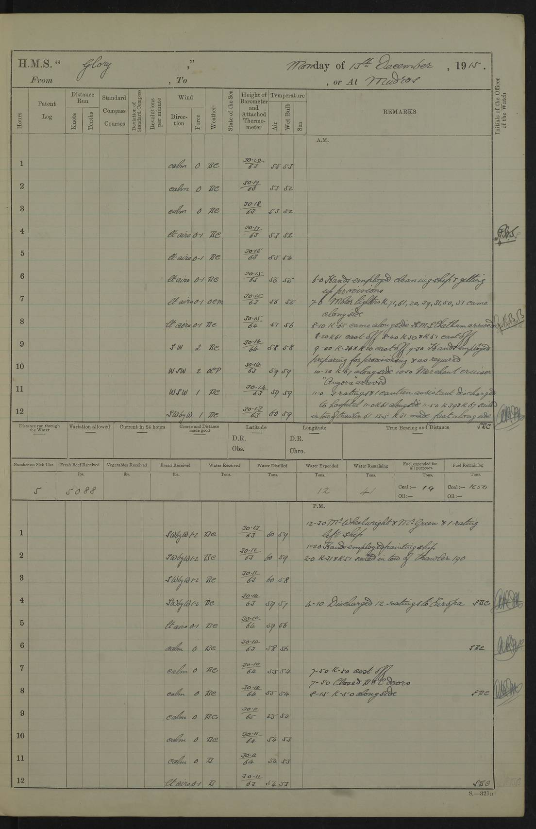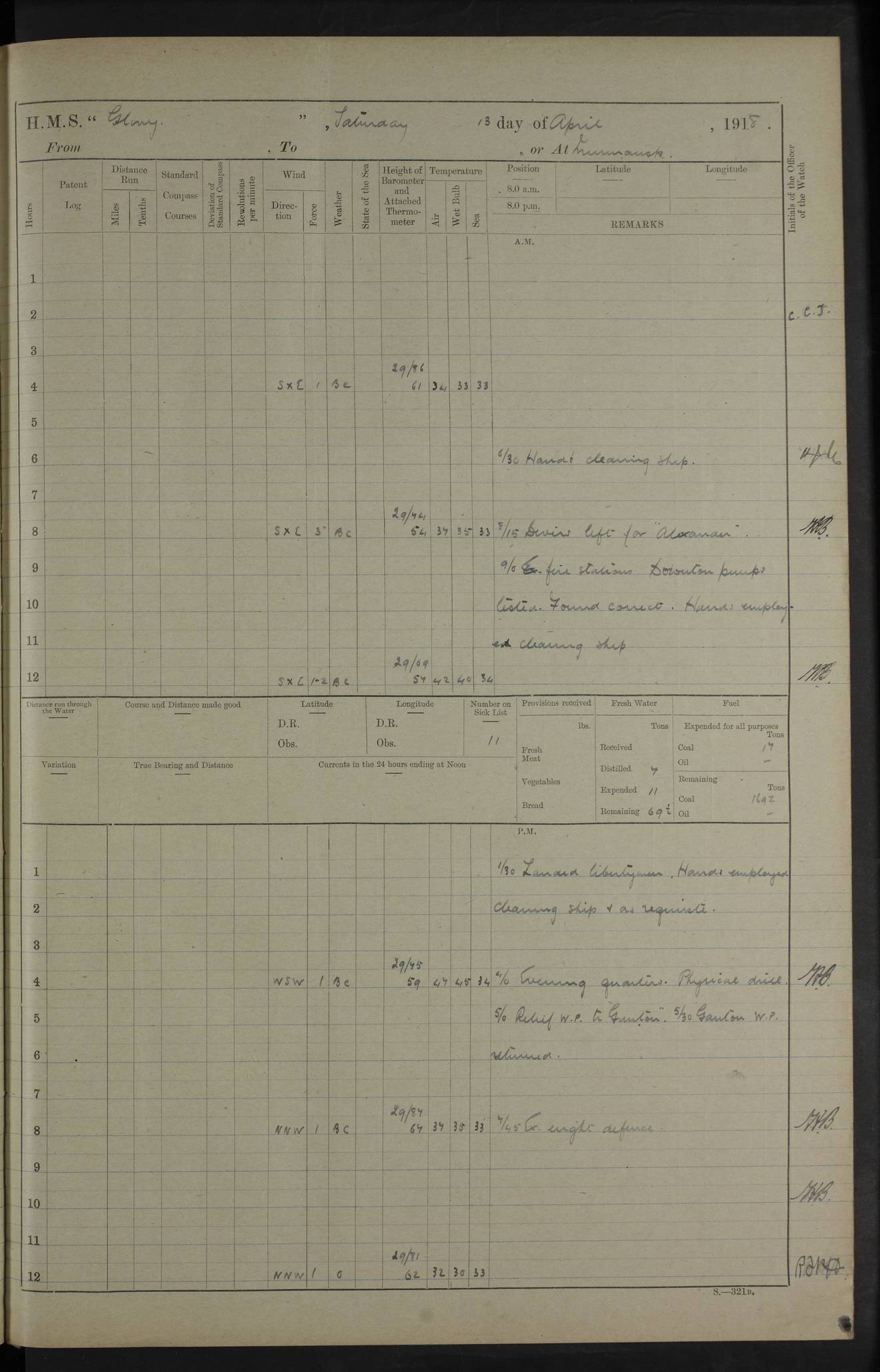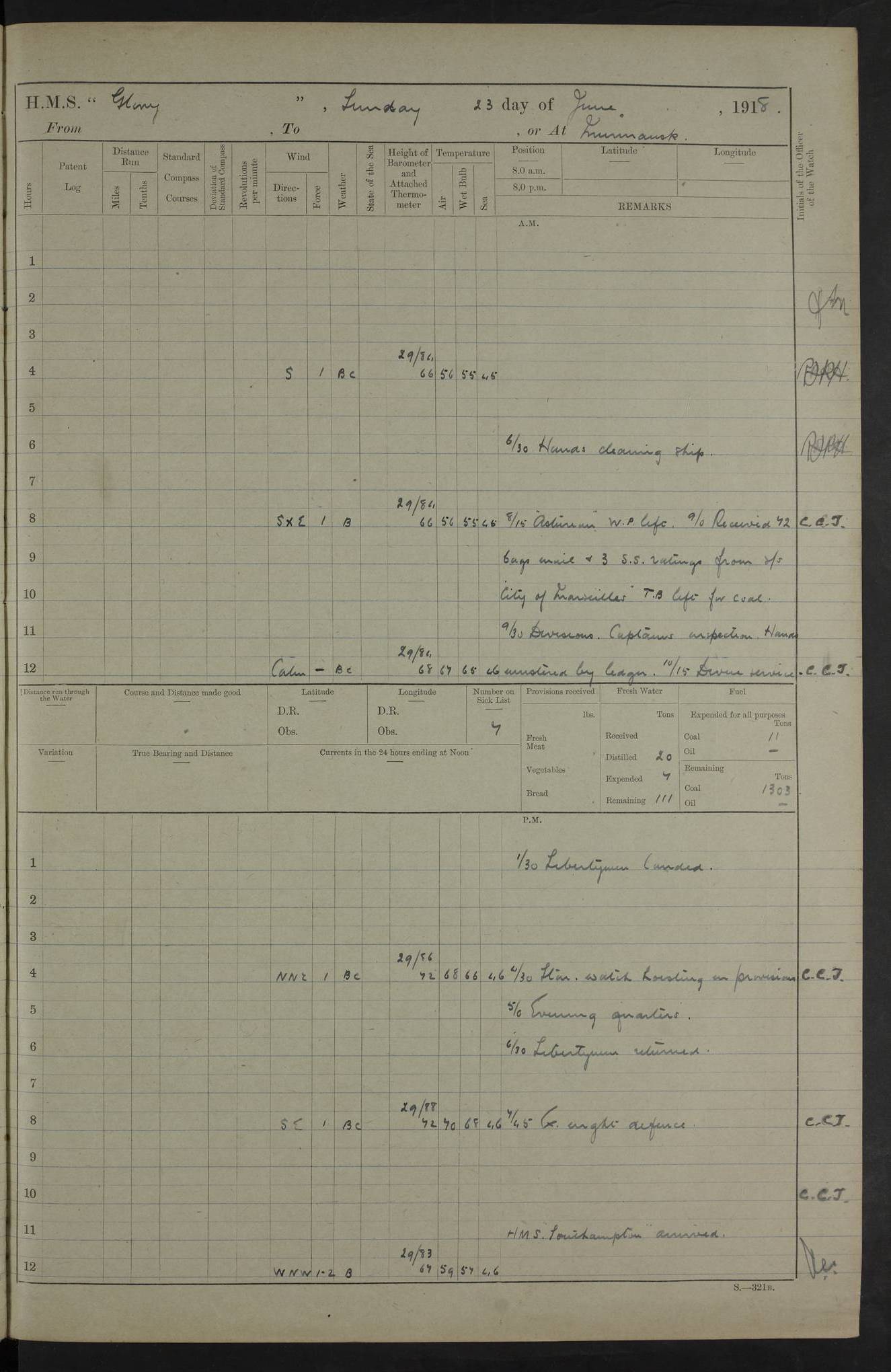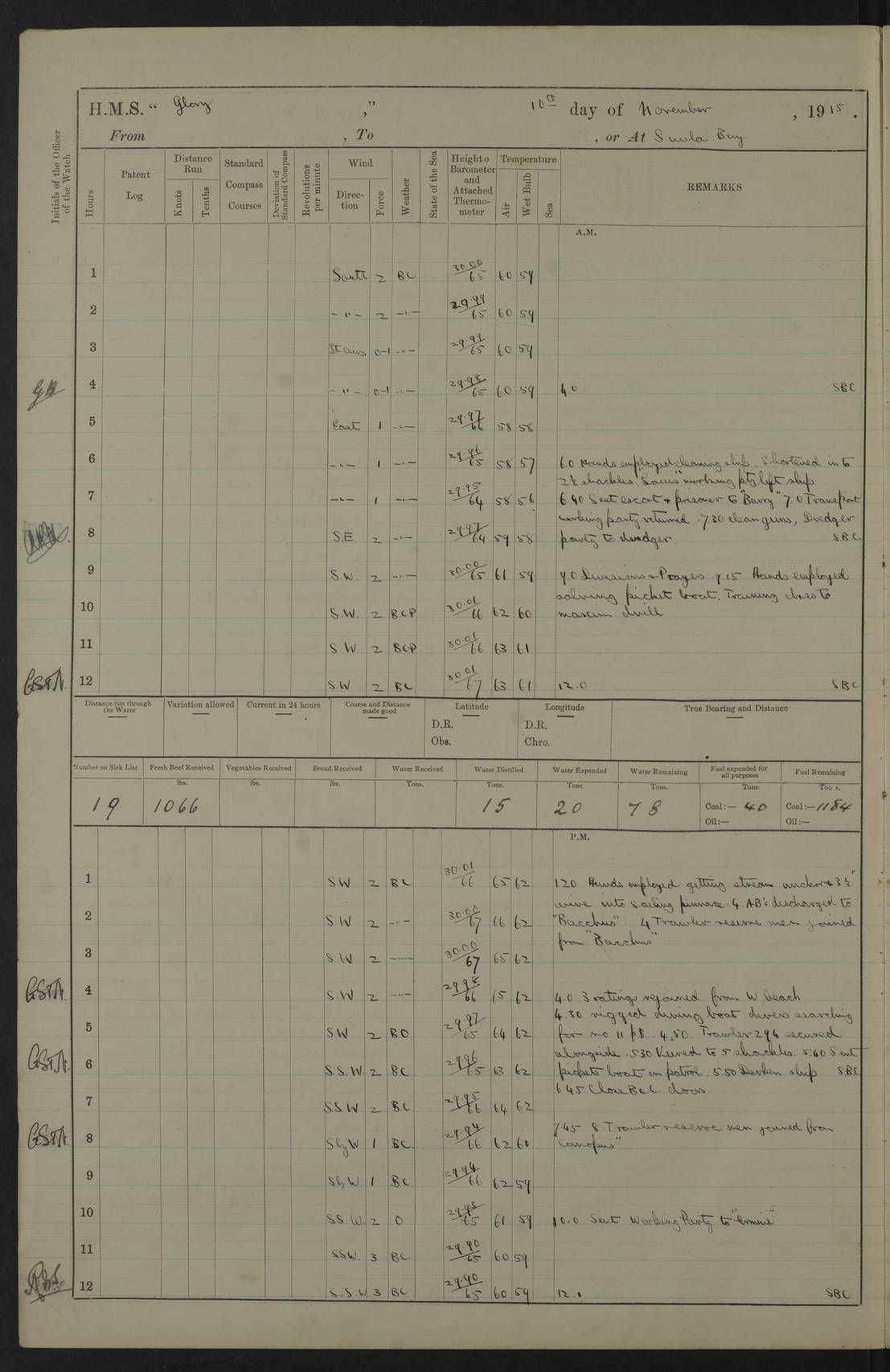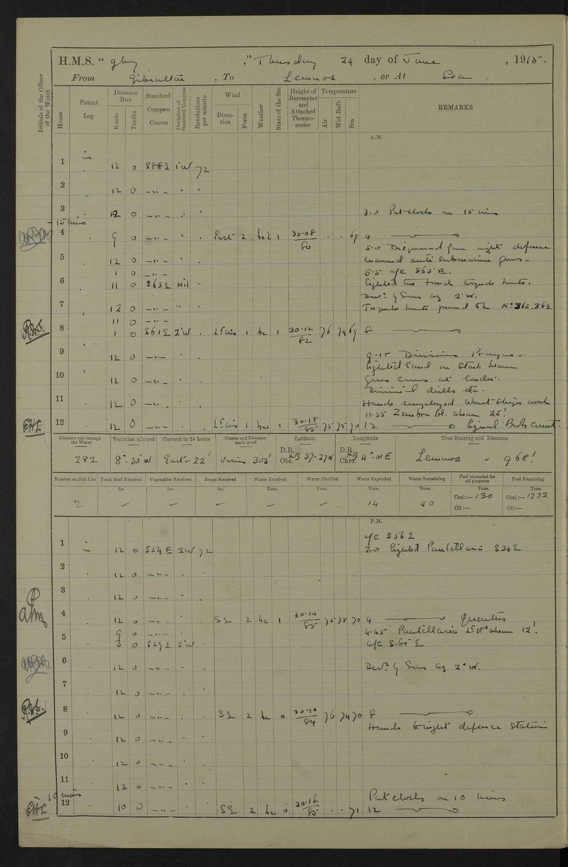 22 June 1915 At sea, Gibraltar to Lemnos Lat 36.1, Long -1.3 4.15am: Sighted land on starboard bow. 10.20am: Stopped port engine for repairs. 11.20am: proceeded with port engine. pm: a/c due to change in deviation. 10.00pm: Cape Tenez Light abeam, 18 miles. 4f73cd61a2fc8ea9030015f6: (https://s3.amazonaws.com:443/oldweather/ADM53-43015/0012_1.jpg) 23 June 1915 At sea, Gibraltar to Lemnos Lat 37.5, Long 4.8 Number on sick list: 4 5.00am: Secured from night defence stations. Placed anti-submarine guns. pm: Life saving appliances served out to men stationed in ? ?at abandon ship. 4f73cd61a2fc8ea9030015f7: (https://s3.amazonaws.com:443/oldweather/ADM53-43015/0013_0.jpg) 24 June 1915 At sea, Gibraltar to Lemnos Lat 37.4, Long 10.8 Position in log clearly bears no resemblance to the location of the ship. Position above is approximate and is based sighting of Zembra Island at 11.55am. 5.00am: Dispersed from night defence stations. Manned anti-submarine guns. am: Sighted two French torpedo boats. am: Torpedo boats passed to ~ No 362, 363. am: Sighted land on starboard beam. 11.55am: Zembra Island abeam, 25 miles. 2.00pm: Sighted Pantellaria S34ºE. 4.45pm: Pantellaria Light House abeam 12 miles. 4f73cd61a2fc8ea9030015f8: (https://s3.amazonaws.com:443/oldweather/ADM53-43015/0013_1.jpg) 25 June 1915 At sea, Gibraltar to Lemnos Lat 35.5, Long 16.7 2.10am: Gozo Light abeam 17 miles. 5.00am: Dispersed from night defence stations. Manned anti-submarine guns. 4f73cd61a2fc8ea9030015f9: (https://s3.amazonaws.com:443/oldweather/ADM53-43015/0014_0.jpg) 26 June 1915 At sea, Gibraltar to Lemnos Lat 35.5, Long 22.6 Number on sick list: 5 5.00am: Dispersed from night defence stations. Manned anti-submarine guns. am: Aired night clothing. am: marines at maxim practice on quarter deck. 2.00pm: Observed land on either bow. 3.00pm: Sighted French patrol destroyer. 4.15pm: Sighted French patrol destroyer. 9.40pm: Milo Peak N63ºW. 10.26pm: Polino Light abeam to port 5.5 miles. 4f73cd62a2fc8ea9030015fa: (https://s3.amazonaws.com:443/oldweather/ADM53-43015/0014_1.jpg) 27 June 1915 At sea and at Lemnos Lat 39.1, Long 24.4 From 0.50 to 3.05am sighting of multiple light houses. 3.50am: a/c to N39ºW and commenced to zig-zag. 5.00am: Dispersed from night defence stations and placed anti-submarine guns and look-outs. am: Lost overboard by accident Hazlewood fender, pat. 311, one in number. 10.30am: Held Divine Service onboard. pm: Met and signalled HMS Minerva on patrol duty. pm: Courses and speeds as requisite while waiting orders to approach Mudros. 3.00pm: Proceeded. 5.16pm: Increased to 90 revs, commenced to zig-zag. Course as requisite for Mudros. 7.00pm: Entered Mudros Bay. 7.47pm: Stopped. Let go port anchor in ‘M3’. 8.30pm: Darkened ship. pm: Manned one 6” and one 12 pdr. 4f73cd62a2fc8ea9030015fb: (https://s3.amazonaws.com:443/oldweather/ADM53-43015/0015_0.jpg) 28 June 1915 Mudros Bay, Lemnos Lat 39.89, Long 25.24 5,00am: HMS Vengeance entered harbour. HMS Vengeance was a pre-dreadnought of the Canopus class, launched in 1899 at Vickers, Barrow, and sold for scrapping in 1921. Details at http://en.wikipedia.org/wiki/HMS_Vengeance_(1899) . am/pm/: hands preparing for coaling and about ship’s work. pm: Collier Wabana secured alongside. 4f73cd62a2fc8ea9030015fc: (https://s3.amazonaws.com:443/oldweather/ADM53-43015/0015_1.jpg) 29 June 1915 Mudros Bay, Lemnos Lat 39.89, Long 25.24 5.15am: Commenced coaling. 2.00pm: Finished coaling. Collier left. 4f73cd62a2fc8ea9030015fd: (https://s3.amazonaws.com:443/oldweather/ADM53-43015/0016_0.jpg) 30 June 1915 Mudros Bay, Lemnos Lat 39.89, Long 25.24 am: Parties away sanding, and with fire engines onshore. am: Boats away disembarking troops. am: French Flagship Patrie sailed. The Patrie was a French pre-dreadnought, launched at La Seyne shipyard in 1903, and stricken in 1921. Details at http://en.wikipedia.org/wiki/French_battleship_Patrie . 6.30pm: Hands to bathe. 4f73cd63a2fc8ea9030015fe: (https://s3.amazonaws.com:443/oldweather/ADM53-43015/0016_1.jpg) 4f73cd63a2fc8ea9030015ff: (https://s3.amazonaws.com:443/oldweather/ADM53-43015/0017_0.jpg) 4f73cd63a2fc8ea903001600: (https://s3.amazonaws.com:443/oldweather/ADM53-43015/0017_1.jpg) 4f73cd63a2fc8ea903001601: (https://s3.amazonaws.com:443/oldweather/ADM53-43015/0018_0.jpg) 4f73cd64a2fc8ea903001602: (https://s3.amazonaws.com:443/oldweather/ADM53-43015/0018_1.jpg) LOGS FOR JULY 1915 From July to October 1915, HMS Glory spent her time at Port Mudros. Certain activities typically took place daily and are not generally noted in the pages below. These activities include: Lighting fires in the picket boat around 4am and drawing the fires in the late evening; Divisions at around 9–9.30am and Evening Quarters at 4pm; Darken ship at around 8.30pm; Daily ‘cleaning ship’, with variations thereof; SBC (for ‘Signal Books Correct’) at the watch changes. 4f73cd64a2fc8ea903001603: (https://s3.amazonaws.com:443/oldweather/ADM53-43016/0000_0.jpg) 4f73cd64a2fc8ea903001604: (https://s3.amazonaws.com:443/oldweather/ADM53-43016/0000_1.jpg) 4f73cd65a2fc8ea903001605: (https://s3.amazonaws.com:443/oldweather/ADM53-43016/0001_0.jpg) 4f73cd65a2fc8ea903001606: (https://s3.amazonaws.com:443/oldweather/ADM53-43016/0001_1.jpg) 1 July 1915 Port Mudros Lat 39.89, Long 25.24 6.30am: Landed working parties preparing boom defence ships. am: Discharged Acting Commander Rayne to Hector. Hector was a kite balloon ship. No further details readily available. 5.00pm: Tug T.10 made fast astern. 7.15pm: HMS Venerable went out. 7.30pm: HMS Chatham went out. HMS Chatham was a ‘Town’ cruiser and lead ship of her class. She was launched in 1911 at Chatham Dockyard and sold in 1926. Details at http://en.wikipedia.org/wiki/HMS_Chatham_(1911) . 4f73cd65a2fc8ea903001607: (https://s3.amazonaws.com:443/oldweather/ADM53-43016/0002_0.jpg) 2 July 1915 Port Mudros Lat 39.89, Long 25.24 5.35am: Landed working parties preparing boom defence ships. am/pm: Boom defence par