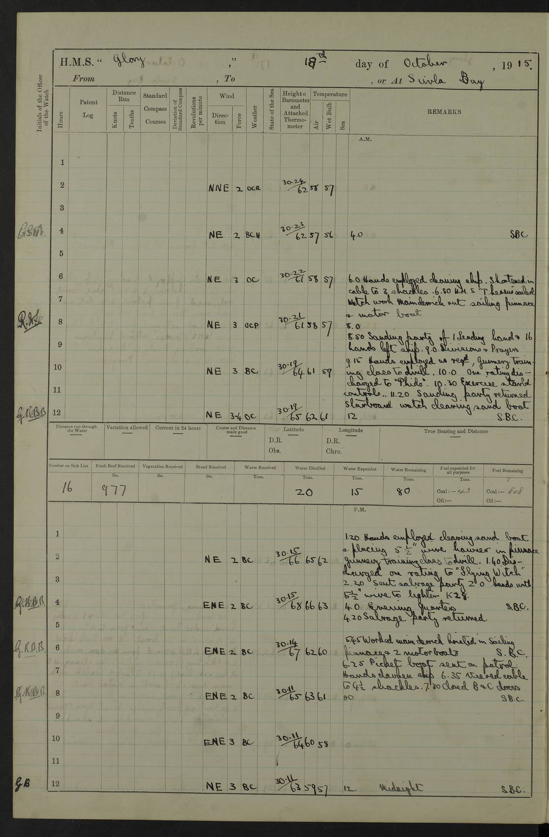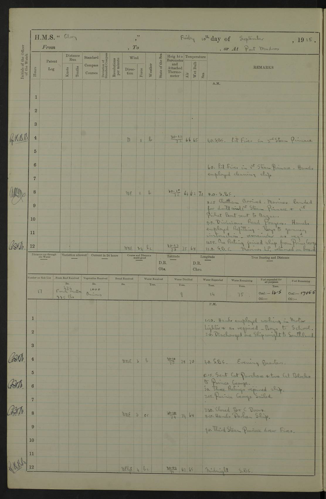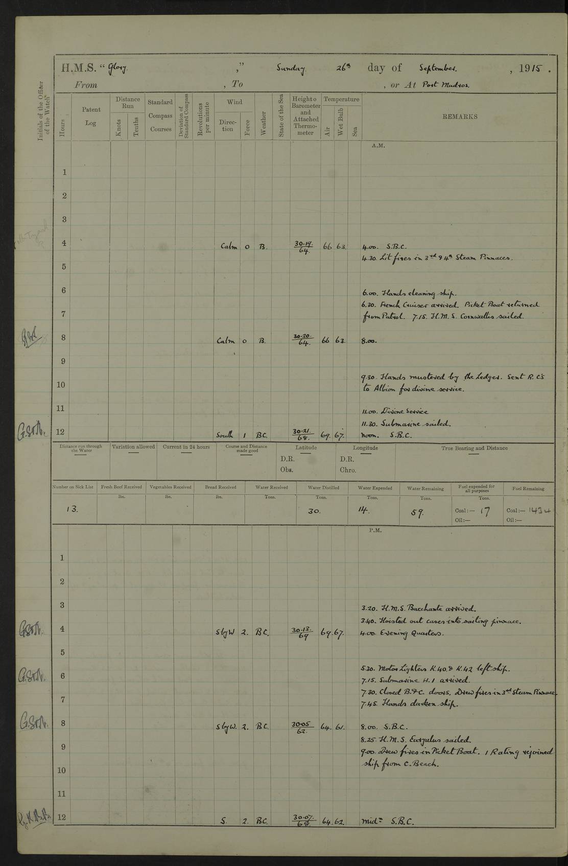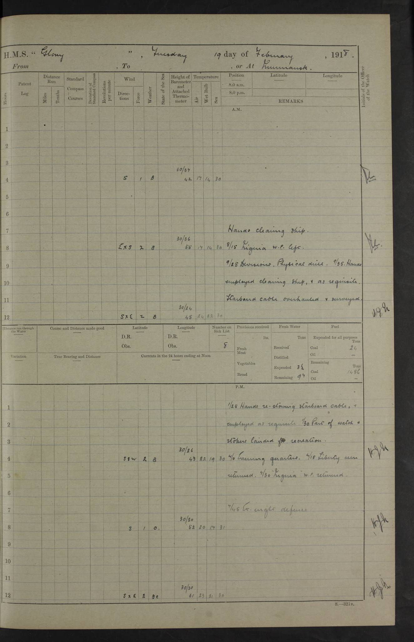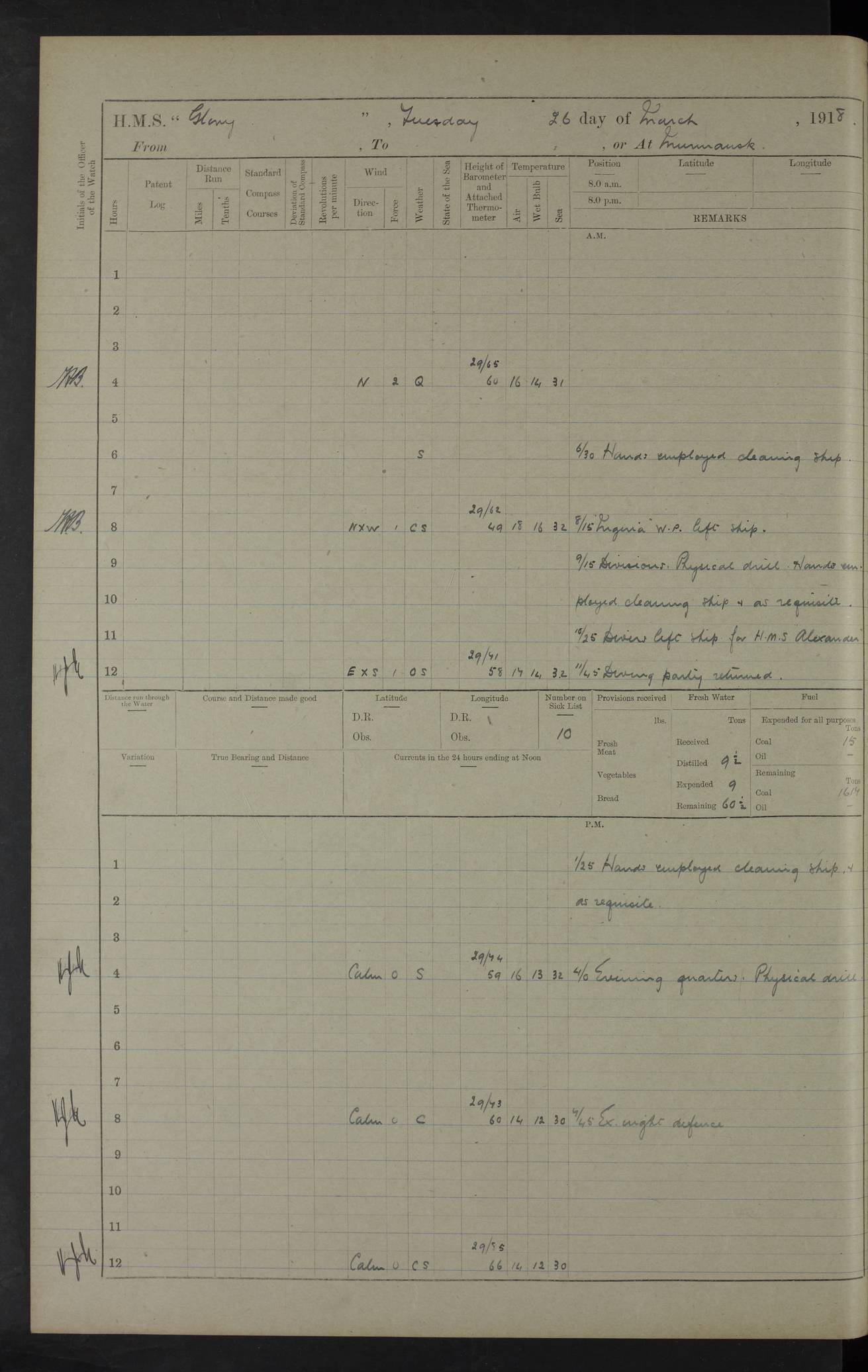 22 June 1915 At sea, Gibraltar to Lemnos Lat 36.1, Long -1.3 4.15am: Sighted land on starboard bow. 10.20am: Stopped port engine for repairs. 11.20am: proceeded with port engine. pm: a/c due to change in deviation. 10.00pm: Cape Tenez Light abeam, 18 miles. 4f73cd61a2fc8ea9030015f6: (https://s3.amazonaws.com:443/oldweather/ADM53-43015/0012_1.jpg) 23 June 1915 At sea, Gibraltar to Lemnos Lat 37.5, Long 4.8 Number on sick list: 4 5.00am: Secured from night defence stations. Placed anti-submarine guns. pm: Life saving appliances served out to men stationed in ? ?at abandon ship. 4f73cd61a2fc8ea9030015f7: (https://s3.amazonaws.com:443/oldweather/ADM53-43015/0013_0.jpg) 24 June 1915 At sea, Gibraltar to Lemnos Lat 37.4, Long 10.8 Position in log clearly bears no resemblance to the location of the ship. Position above is approximate and is based sighting of Zembra Island at 11.55am. 5.00am: Dispersed from night defence stations. Manned anti-submarine guns. am: Sighted two French torpedo boats. am: Torpedo boats passed to ~ No 362, 363. am: Sighted land on starboard beam. 11.55am: Zembra Island abeam, 25 miles. 2.00pm: Sighted Pantellaria S34ºE. 4.45pm: Pantellaria Light House abeam 12 miles. 4f73cd61a2fc8ea9030015f8: (https://s3.amazonaws.com:443/oldweather/ADM53-43015/0013_1.jpg) 25 June 1915 At sea, Gibraltar to Lemnos Lat 35.5, Long 16.7 2.10am: Gozo Light abeam 17 miles. 5.00am: Dispersed from night defence stations. Manned anti-submarine guns. 4f73cd61a2fc8ea9030015f9: (https://s3.amazonaws.com:443/oldweather/ADM53-43015/0014_0.jpg) 26 June 1915 At sea, Gibraltar to Lemnos Lat 35.5, Long 22.6 Number on sick list: 5 5.00am: Dispersed from night defence stations. Manned anti-submarine guns. am: Aired night clothing. am: marines at maxim practice on quarter deck. 2.00pm: Observed land on either bow. 3.00pm: Sighted French patrol destroyer. 4.15pm: Sighted French patrol destroyer. 9.40pm: Milo Peak N63ºW. 10.26pm: Polino Light abeam to port 5.5 miles. 4f73cd62a2fc8ea9030015fa: (https://s3.amazonaws.com:443/oldweather/ADM53-43015/0014_1.jpg) 27 June 1915 At sea and at Lemnos Lat 39.1, Long 24.4 From 0.50 to 3.05am sighting of multiple light houses. 3.50am: a/c to N39ºW and commenced to zig-zag. 5.00am: Dispersed from night defence stations and placed anti-submarine guns and look-outs. am: Lost overboard by accident Hazlewood fender, pat. 311, one in number. 10.30am: Held Divine Service onboard. pm: Met and signalled HMS Minerva on patrol duty. pm: Courses and speeds as requisite while waiting orders to approach Mudros. 3.00pm: Proceeded. 5.16pm: Increased to 90 revs, commenced to zig-zag. Course as requisite for Mudros. 7.00pm: Entered Mudros Bay. 7.47pm: Stopped. Let go port anchor in ‘M3’. 8.30pm: Darkened ship. pm: Manned one 6” and one 12 pdr. 4f73cd62a2fc8ea9030015fb: (https://s3.amazonaws.com:443/oldweather/ADM53-43015/0015_0.jpg) 28 June 1915 Mudros Bay, Lemnos Lat 39.89, Long 25.24 5,00am: HMS Vengeance entered harbour. HMS Vengeance was a pre-dreadnought of the Canopus class, launched in 1899 at Vickers, Barrow, and sold for scrapping in 1921. Details at http://en.wikipedia.org/wiki/HMS_Vengeance_(1899) . am/pm/: hands preparing for coaling and about ship’s work. pm: Collier Wabana secured alongside. 4f73cd62a2fc8ea9030015fc: (https://s3.amazonaws.com:443/oldweather/ADM53-43015/0015_1.jpg) 29 June 1915 Mudros Bay, Lemnos Lat 39.89, Long 25.24 5.15am: Commenced coaling. 2.00pm: Finished coaling. Collier left. 4f73cd62a2fc8ea9030015fd: (https://s3.amazonaws.com:443/oldweather/ADM53-43015/0016_0.jpg) 30 June 1915 Mudros Bay, Lemnos Lat 39.89, Long 25.24 am: Parties away sanding, and with fire engines onshore. am: Boats away disembarking troops. am: French Flagship Patrie sailed. The Patrie was a French pre-dreadnought, launched at La Seyne shipyard in 1903, and stricken in 1921. Details at http://en.wikipedia.org/wiki/French_battleship_Patrie . 6.30pm: Hands to bathe. 4f73cd63a2fc8ea9030015fe: (https://s3.amazonaws.com:443/oldweather/ADM53-43015/0016_1.jpg) 4f73cd63a2fc8ea9030015ff: (https://s3.amazonaws.com:443/oldweather/ADM53-43015/0017_0.jpg) 4f73cd63a2fc8ea903001600: (https://s3.amazonaws.com:443/oldweather/ADM53-43015/0017_1.jpg) 4f73cd63a2fc8ea903001601: (https://s3.amazonaws.com:443/oldweather/ADM53-43015/0018_0.jpg) 4f73cd64a2fc8ea903001602: (https://s3.amazonaws.com:443/oldweather/ADM53-43015/0018_1.jpg) LOGS FOR JULY 1915 From July to October 1915, HMS Glory spent her time at Port Mudros. Certain activities typically took place daily and are not generally noted in the pages below. These activities include: Lighting fires in the picket boat around 4am and drawing the fires in the late evening; Divisions at around 9–9.30am and Evening Quarters at 4pm; Darken ship at around 8.30pm; Daily ‘cleaning ship’, with variations thereof; SBC (for ‘Signal Books Correct’) at the watch changes. 4f73cd64a2fc8ea903001603: (https://s3.amazonaws.com:443/oldweather/ADM53-43016/0000_0.jpg) 4f73cd64a2fc8ea903001604: (https://s3.amazonaws.com:443/oldweather/ADM53-43016/0000_1.jpg) 4f73cd65a2fc8ea903001605: (https://s3.amazonaws.com:443/oldweather/ADM53-43016/0001_0.jpg) 4f73cd65a2fc8ea903001606: (https://s3.amazonaws.com:443/oldweather/ADM53-43016/0001_1.jpg) 1 July 1915 Port Mudros Lat 39.89, Long 25.24 6.30am: Landed working parties preparing boom defence ships. am: Discharged Acting Commander Rayne to Hector. Hector was a kite balloon ship. No further details readily available. 5.00pm: Tug T.10 made fast astern. 7.15pm: HMS Venerable went out. 7.30pm: HMS Chatham went out. HMS Chatham was a ‘Town’ cruiser and lead ship of her class. She was launched in 1911 at Chatham Dockyard and sold in 1926. Details at http://en.wikipedia.org/wiki/HMS_Chatham_(1911) . 4f73cd65a2fc8ea903001607: (https://s3.amazonaws.com:443/oldweather/ADM53-43016/0002_0.jpg) 2 July 1915 Port Mudros Lat 39.89, Long 25.24 5.35am: Landed working parties preparing boom defence ships. am/pm: Boom defence par