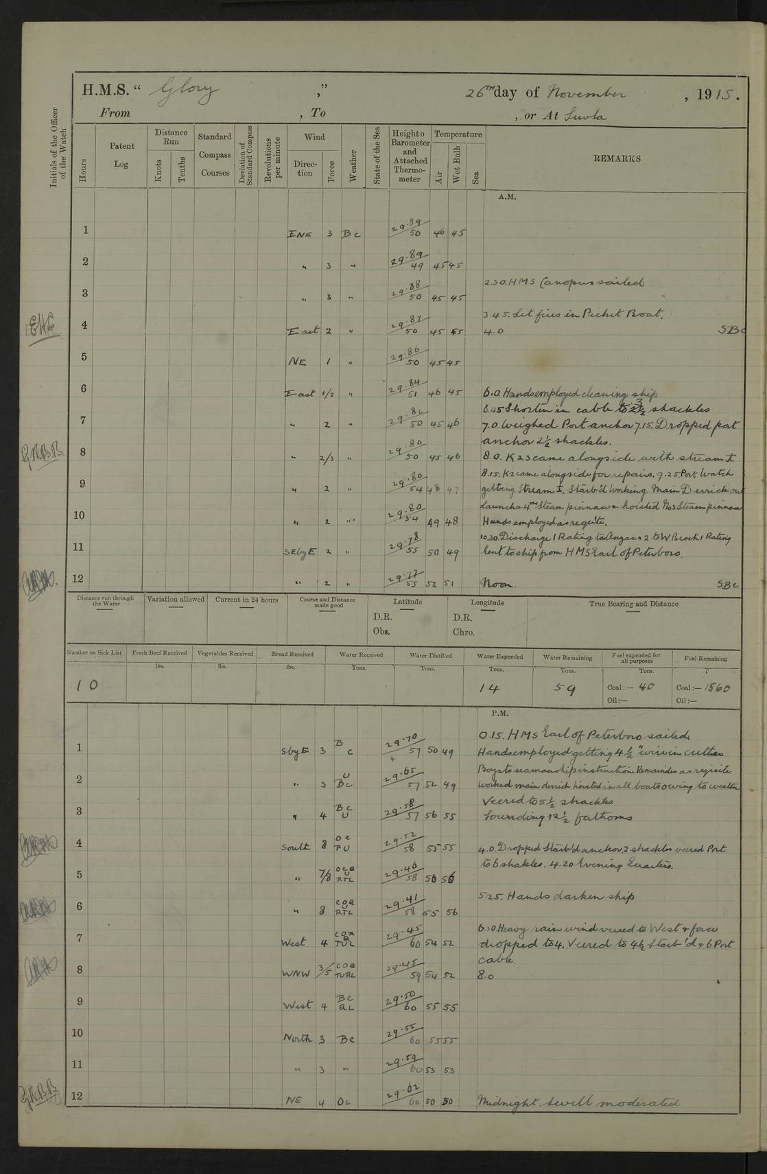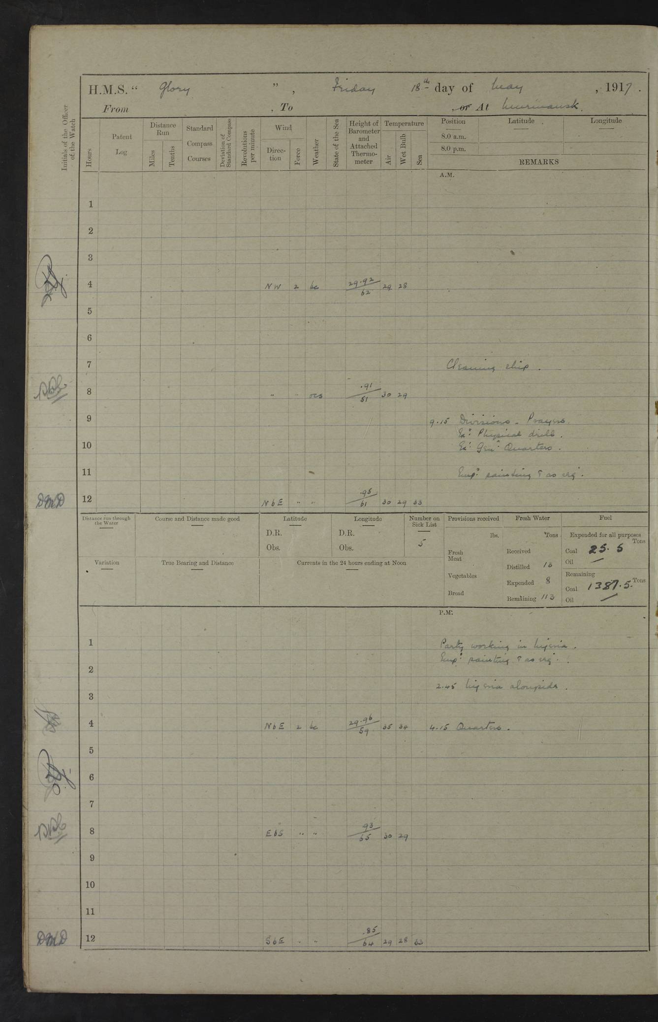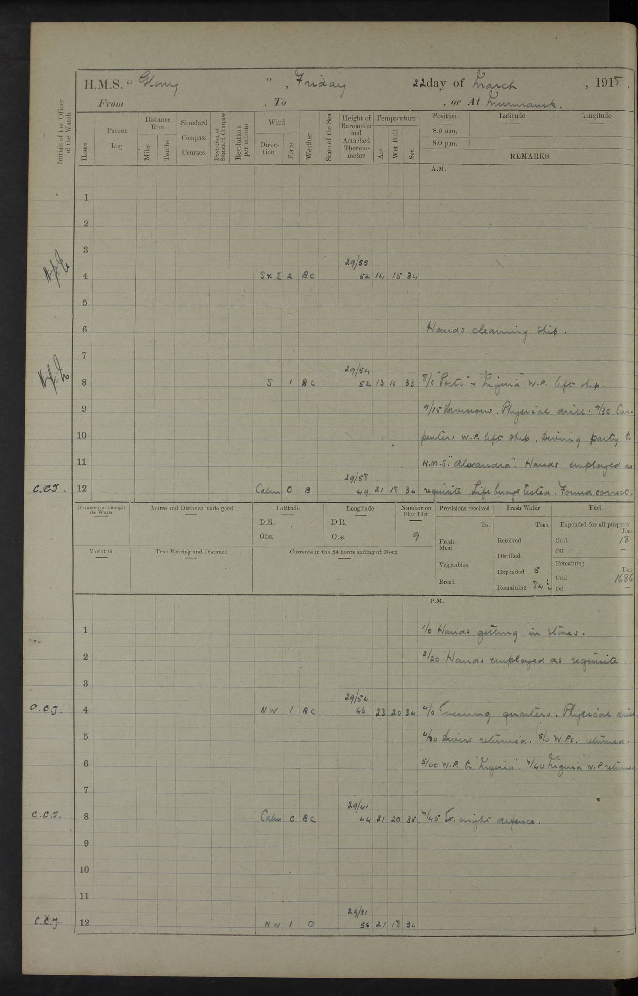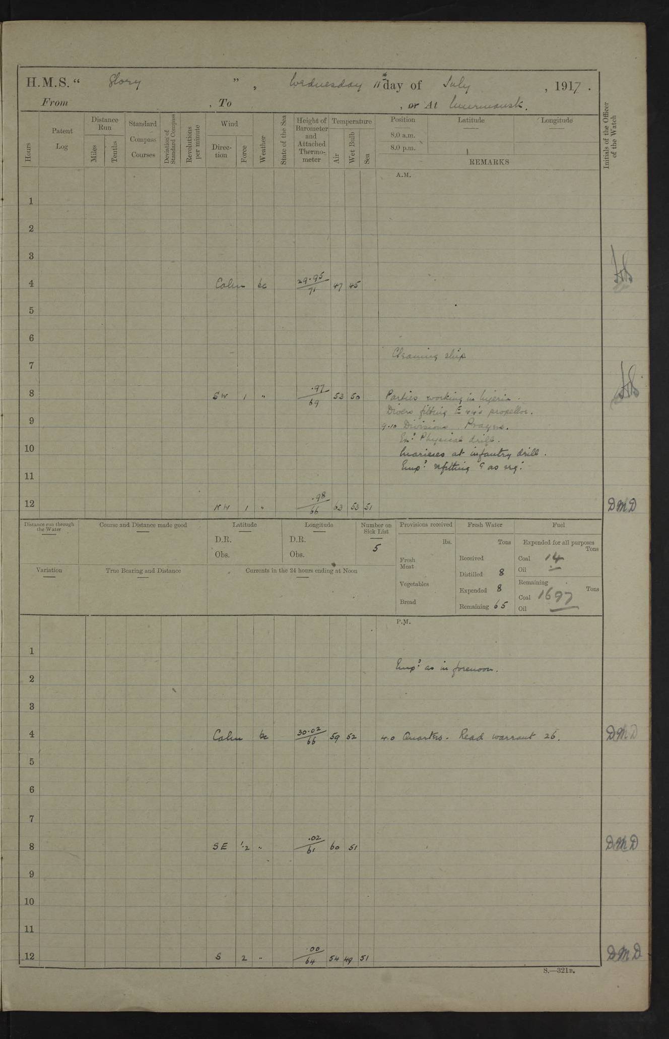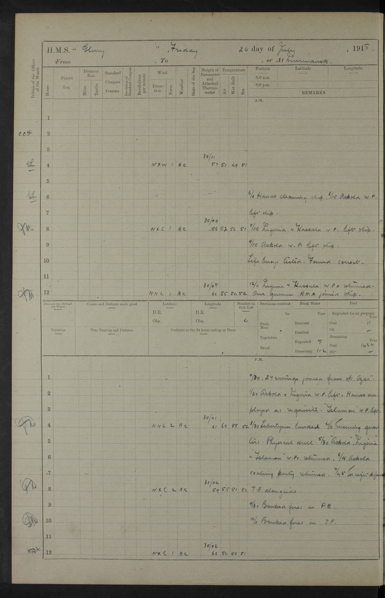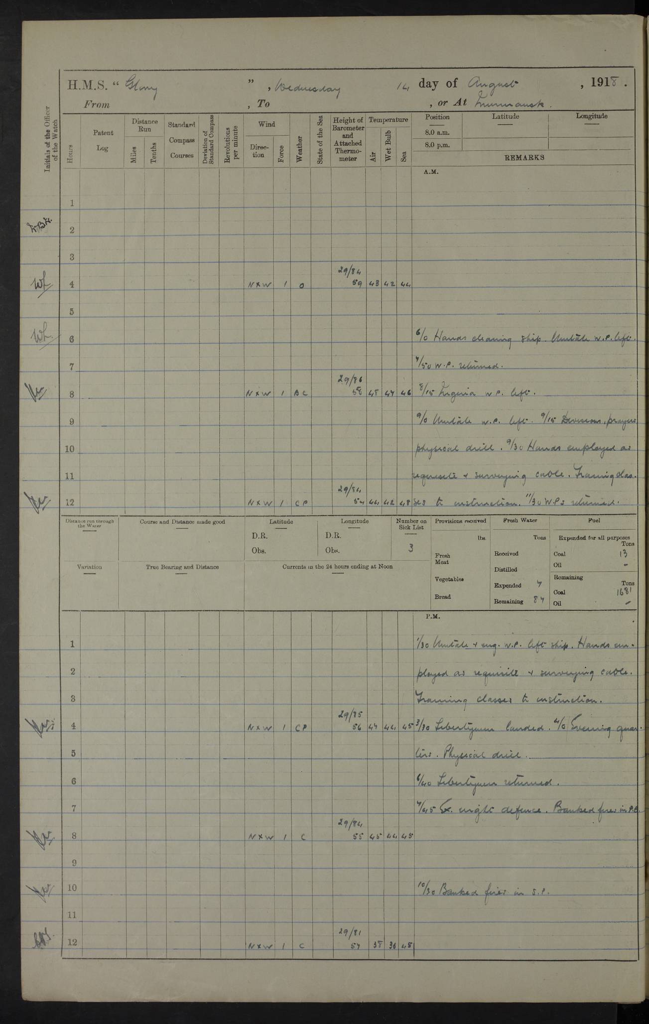 22 June 1915 At sea, Gibraltar to Lemnos Lat 36.1, Long -1.3 4.15am: Sighted land on starboard bow. 10.20am: Stopped port engine for repairs. 11.20am: proceeded with port engine. pm: a/c due to change in deviation. 10.00pm: Cape Tenez Light abeam, 18 miles. 4f73cd61a2fc8ea9030015f6: (https://s3.amazonaws.com:443/oldweather/ADM53-43015/0012_1.jpg) 23 June 1915 At sea, Gibraltar to Lemnos Lat 37.5, Long 4.8 Number on sick list: 4 5.00am: Secured from night defence stations. Placed anti-submarine guns. pm: Life saving appliances served out to men stationed in ? ?at abandon ship. 4f73cd61a2fc8ea9030015f7: (https://s3.amazonaws.com:443/oldweather/ADM53-43015/0013_0.jpg) 24 June 1915 At sea, Gibraltar to Lemnos Lat 37.4, Long 10.8 Position in log clearly bears no resemblance to the location of the ship. Position above is approximate and is based sighting of Zembra Island at 11.55am. 5.00am: Dispersed from night defence stations. Manned anti-submarine guns. am: Sighted two French torpedo boats. am: Torpedo boats passed to ~ No 362, 363. am: Sighted land on starboard beam. 11.55am: Zembra Island abeam, 25 miles. 2.00pm: Sighted Pantellaria S34ºE. 4.45pm: Pantellaria Light House abeam 12 miles. 4f73cd61a2fc8ea9030015f8: (https://s3.amazonaws.com:443/oldweather/ADM53-43015/0013_1.jpg) 25 June 1915 At sea, Gibraltar to Lemnos Lat 35.5, Long 16.7 2.10am: Gozo Light abeam 17 miles. 5.00am: Dispersed from night defence stations. Manned anti-submarine guns. 4f73cd61a2fc8ea9030015f9: (https://s3.amazonaws.com:443/oldweather/ADM53-43015/0014_0.jpg) 26 June 1915 At sea, Gibraltar to Lemnos Lat 35.5, Long 22.6 Number on sick list: 5 5.00am: Dispersed from night defence stations. Manned anti-submarine guns. am: Aired night clothing. am: marines at maxim practice on quarter deck. 2.00pm: Observed land on either bow. 3.00pm: Sighted French patrol destroyer. 4.15pm: Sighted French patrol destroyer. 9.40pm: Milo Peak N63ºW. 10.26pm: Polino Light abeam to port 5.5 miles. 4f73cd62a2fc8ea9030015fa: (https://s3.amazonaws.com:443/oldweather/ADM53-43015/0014_1.jpg) 27 June 1915 At sea and at Lemnos Lat 39.1, Long 24.4 From 0.50 to 3.05am sighting of multiple light houses. 3.50am: a/c to N39ºW and commenced to zig-zag. 5.00am: Dispersed from night defence stations and placed anti-submarine guns and look-outs. am: Lost overboard by accident Hazlewood fender, pat. 311, one in number. 10.30am: Held Divine Service onboard. pm: Met and signalled HMS Minerva on patrol duty. pm: Courses and speeds as requisite while waiting orders to approach Mudros. 3.00pm: Proceeded. 5.16pm: Increased to 90 revs, commenced to zig-zag. Course as requisite for Mudros. 7.00pm: Entered Mudros Bay. 7.47pm: Stopped. Let go port anchor in ‘M3’. 8.30pm: Darkened ship. pm: Manned one 6” and one 12 pdr. 4f73cd62a2fc8ea9030015fb: (https://s3.amazonaws.com:443/oldweather/ADM53-43015/0015_0.jpg) 28 June 1915 Mudros Bay, Lemnos Lat 39.89, Long 25.24 5,00am: HMS Vengeance entered harbour. HMS Vengeance was a pre-dreadnought of the Canopus class, launched in 1899 at Vickers, Barrow, and sold for scrapping in 1921. Details at http://en.wikipedia.org/wiki/HMS_Vengeance_(1899) . am/pm/: hands preparing for coaling and about ship’s work. pm: Collier Wabana secured alongside. 4f73cd62a2fc8ea9030015fc: (https://s3.amazonaws.com:443/oldweather/ADM53-43015/0015_1.jpg) 29 June 1915 Mudros Bay, Lemnos Lat 39.89, Long 25.24 5.15am: Commenced coaling. 2.00pm: Finished coaling. Collier left. 4f73cd62a2fc8ea9030015fd: (https://s3.amazonaws.com:443/oldweather/ADM53-43015/0016_0.jpg) 30 June 1915 Mudros Bay, Lemnos Lat 39.89, Long 25.24 am: Parties away sanding, and with fire engines onshore. am: Boats away disembarking troops. am: French Flagship Patrie sailed. The Patrie was a French pre-dreadnought, launched at La Seyne shipyard in 1903, and stricken in 1921. Details at http://en.wikipedia.org/wiki/French_battleship_Patrie . 6.30pm: Hands to bathe. 4f73cd63a2fc8ea9030015fe: (https://s3.amazonaws.com:443/oldweather/ADM53-43015/0016_1.jpg) 4f73cd63a2fc8ea9030015ff: (https://s3.amazonaws.com:443/oldweather/ADM53-43015/0017_0.jpg) 4f73cd63a2fc8ea903001600: (https://s3.amazonaws.com:443/oldweather/ADM53-43015/0017_1.jpg) 4f73cd63a2fc8ea903001601: (https://s3.amazonaws.com:443/oldweather/ADM53-43015/0018_0.jpg) 4f73cd64a2fc8ea903001602: (https://s3.amazonaws.com:443/oldweather/ADM53-43015/0018_1.jpg) LOGS FOR JULY 1915 From July to October 1915, HMS Glory spent her time at Port Mudros. Certain activities typically took place daily and are not generally noted in the pages below. These activities include: Lighting fires in the picket boat around 4am and drawing the fires in the late evening; Divisions at around 9–9.30am and Evening Quarters at 4pm; Darken ship at around 8.30pm; Daily ‘cleaning ship’, with variations thereof; SBC (for ‘Signal Books Correct’) at the watch changes. 4f73cd64a2fc8ea903001603: (https://s3.amazonaws.com:443/oldweather/ADM53-43016/0000_0.jpg) 4f73cd64a2fc8ea903001604: (https://s3.amazonaws.com:443/oldweather/ADM53-43016/0000_1.jpg) 4f73cd65a2fc8ea903001605: (https://s3.amazonaws.com:443/oldweather/ADM53-43016/0001_0.jpg) 4f73cd65a2fc8ea903001606: (https://s3.amazonaws.com:443/oldweather/ADM53-43016/0001_1.jpg) 1 July 1915 Port Mudros Lat 39.89, Long 25.24 6.30am: Landed working parties preparing boom defence ships. am: Discharged Acting Commander Rayne to Hector. Hector was a kite balloon ship. No further details readily available. 5.00pm: Tug T.10 made fast astern. 7.15pm: HMS Venerable went out. 7.30pm: HMS Chatham went out. HMS Chatham was a ‘Town’ cruiser and lead ship of her class. She was launched in 1911 at Chatham Dockyard and sold in 1926. Details at http://en.wikipedia.org/wiki/HMS_Chatham_(1911) . 4f73cd65a2fc8ea903001607: (https://s3.amazonaws.com:443/oldweather/ADM53-43016/0002_0.jpg) 2 July 1915 Port Mudros Lat 39.89, Long 25.24 5.35am: Landed working parties preparing boom defence ships. am/pm: Boom defence par