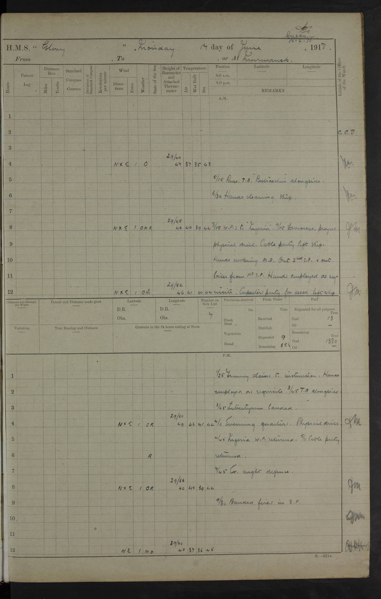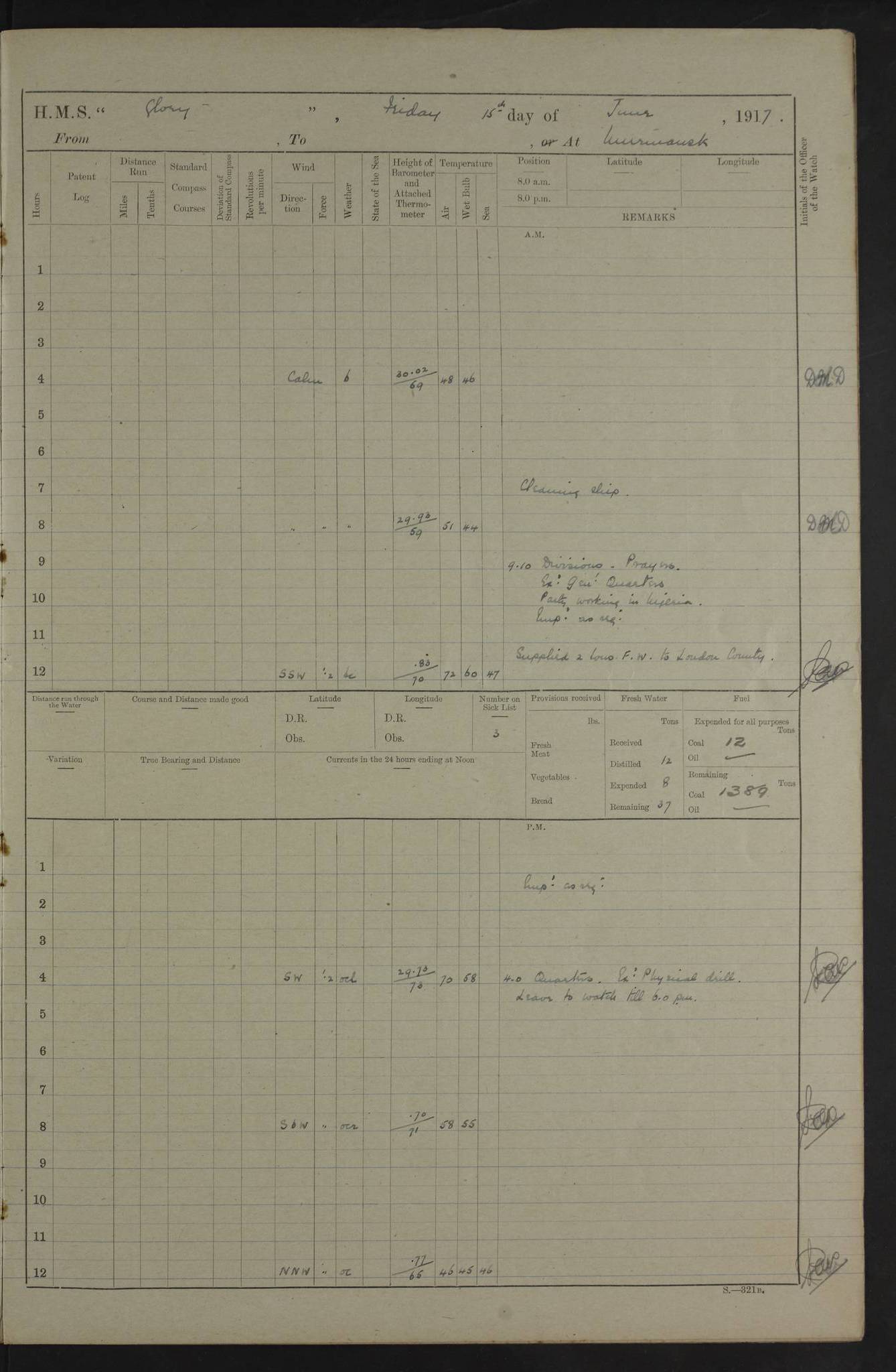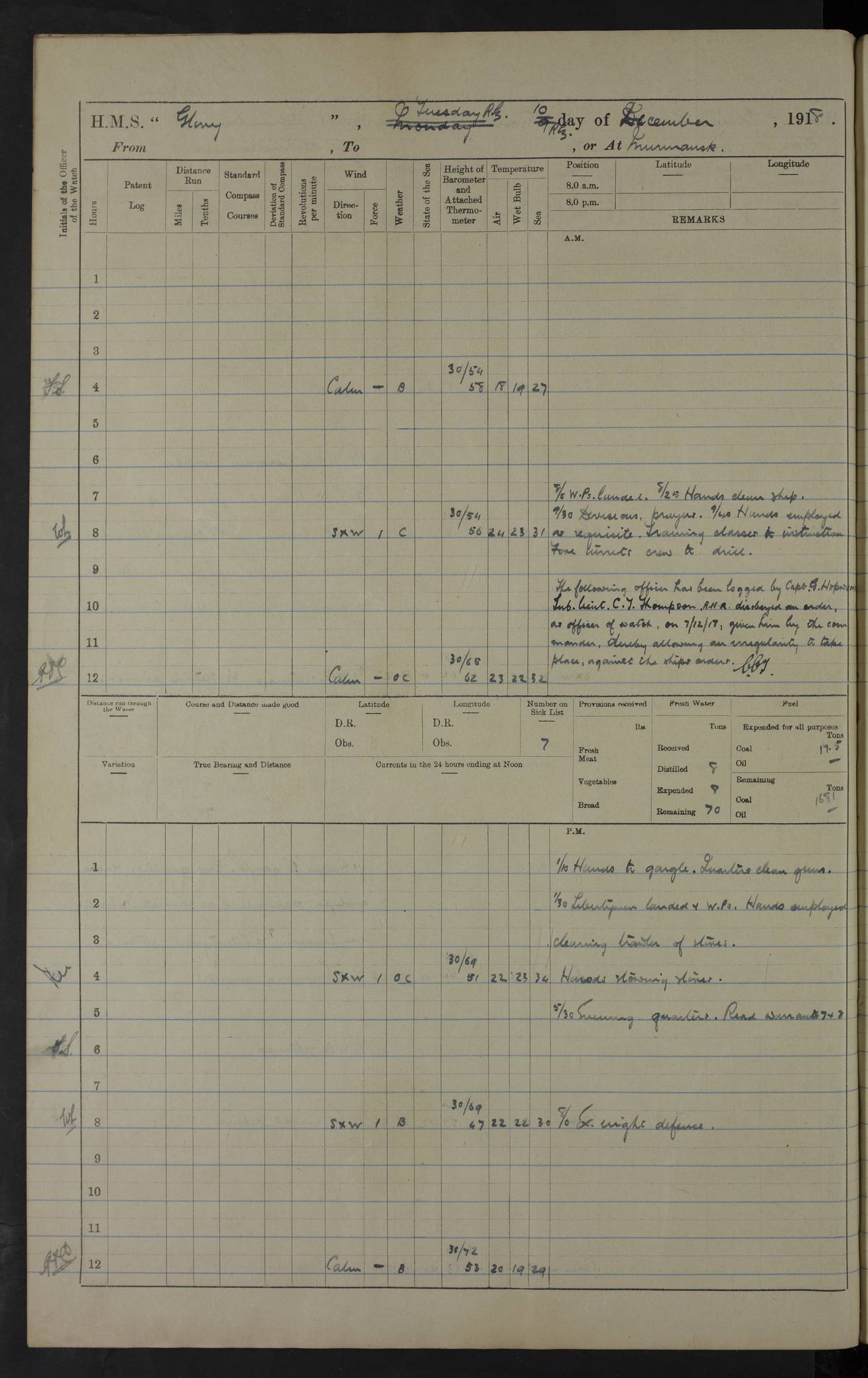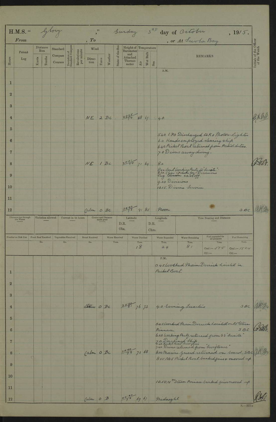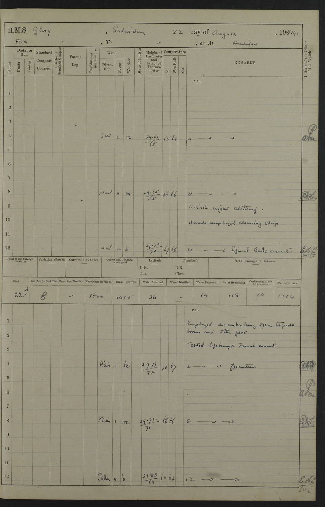 22 June 1915 At sea, Gibraltar to Lemnos Lat 36.1, Long -1.3 4.15am: Sighted land on starboard bow. 10.20am: Stopped port engine for repairs. 11.20am: proceeded with port engine. pm: a/c due to change in deviation. 10.00pm: Cape Tenez Light abeam, 18 miles. 4f73cd61a2fc8ea9030015f6: (https://s3.amazonaws.com:443/oldweather/ADM53-43015/0012_1.jpg) 23 June 1915 At sea, Gibraltar to Lemnos Lat 37.5, Long 4.8 Number on sick list: 4 5.00am: Secured from night defence stations. Placed anti-submarine guns. pm: Life saving appliances served out to men stationed in ? ?at abandon ship. 4f73cd61a2fc8ea9030015f7: (https://s3.amazonaws.com:443/oldweather/ADM53-43015/0013_0.jpg) 24 June 1915 At sea, Gibraltar to Lemnos Lat 37.4, Long 10.8 Position in log clearly bears no resemblance to the location of the ship. Position above is approximate and is based sighting of Zembra Island at 11.55am. 5.00am: Dispersed from night defence stations. Manned anti-submarine guns. am: Sighted two French torpedo boats. am: Torpedo boats passed to ~ No 362, 363. am: Sighted land on starboard beam. 11.55am: Zembra Island abeam, 25 miles. 2.00pm: Sighted Pantellaria S34ºE. 4.45pm: Pantellaria Light House abeam 12 miles. 4f73cd61a2fc8ea9030015f8: (https://s3.amazonaws.com:443/oldweather/ADM53-43015/0013_1.jpg) 25 June 1915 At sea, Gibraltar to Lemnos Lat 35.5, Long 16.7 2.10am: Gozo Light abeam 17 miles. 5.00am: Dispersed from night defence stations. Manned anti-submarine guns. 4f73cd61a2fc8ea9030015f9: (https://s3.amazonaws.com:443/oldweather/ADM53-43015/0014_0.jpg) 26 June 1915 At sea, Gibraltar to Lemnos Lat 35.5, Long 22.6 Number on sick list: 5 5.00am: Dispersed from night defence stations. Manned anti-submarine guns. am: Aired night clothing. am: marines at maxim practice on quarter deck. 2.00pm: Observed land on either bow. 3.00pm: Sighted French patrol destroyer. 4.15pm: Sighted French patrol destroyer. 9.40pm: Milo Peak N63ºW. 10.26pm: Polino Light abeam to port 5.5 miles. 4f73cd62a2fc8ea9030015fa: (https://s3.amazonaws.com:443/oldweather/ADM53-43015/0014_1.jpg) 27 June 1915 At sea and at Lemnos Lat 39.1, Long 24.4 From 0.50 to 3.05am sighting of multiple light houses. 3.50am: a/c to N39ºW and commenced to zig-zag. 5.00am: Dispersed from night defence stations and placed anti-submarine guns and look-outs. am: Lost overboard by accident Hazlewood fender, pat. 311, one in number. 10.30am: Held Divine Service onboard. pm: Met and signalled HMS Minerva on patrol duty. pm: Courses and speeds as requisite while waiting orders to approach Mudros. 3.00pm: Proceeded. 5.16pm: Increased to 90 revs, commenced to zig-zag. Course as requisite for Mudros. 7.00pm: Entered Mudros Bay. 7.47pm: Stopped. Let go port anchor in ‘M3’. 8.30pm: Darkened ship. pm: Manned one 6” and one 12 pdr. 4f73cd62a2fc8ea9030015fb: (https://s3.amazonaws.com:443/oldweather/ADM53-43015/0015_0.jpg) 28 June 1915 Mudros Bay, Lemnos Lat 39.89, Long 25.24 5,00am: HMS Vengeance entered harbour. HMS Vengeance was a pre-dreadnought of the Canopus class, launched in 1899 at Vickers, Barrow, and sold for scrapping in 1921. Details at http://en.wikipedia.org/wiki/HMS_Vengeance_(1899) . am/pm/: hands preparing for coaling and about ship’s work. pm: Collier Wabana secured alongside. 4f73cd62a2fc8ea9030015fc: (https://s3.amazonaws.com:443/oldweather/ADM53-43015/0015_1.jpg) 29 June 1915 Mudros Bay, Lemnos Lat 39.89, Long 25.24 5.15am: Commenced coaling. 2.00pm: Finished coaling. Collier left. 4f73cd62a2fc8ea9030015fd: (https://s3.amazonaws.com:443/oldweather/ADM53-43015/0016_0.jpg) 30 June 1915 Mudros Bay, Lemnos Lat 39.89, Long 25.24 am: Parties away sanding, and with fire engines onshore. am: Boats away disembarking troops. am: French Flagship Patrie sailed. The Patrie was a French pre-dreadnought, launched at La Seyne shipyard in 1903, and stricken in 1921. Details at http://en.wikipedia.org/wiki/French_battleship_Patrie . 6.30pm: Hands to bathe. 4f73cd63a2fc8ea9030015fe: (https://s3.amazonaws.com:443/oldweather/ADM53-43015/0016_1.jpg) 4f73cd63a2fc8ea9030015ff: (https://s3.amazonaws.com:443/oldweather/ADM53-43015/0017_0.jpg) 4f73cd63a2fc8ea903001600: (https://s3.amazonaws.com:443/oldweather/ADM53-43015/0017_1.jpg) 4f73cd63a2fc8ea903001601: (https://s3.amazonaws.com:443/oldweather/ADM53-43015/0018_0.jpg) 4f73cd64a2fc8ea903001602: (https://s3.amazonaws.com:443/oldweather/ADM53-43015/0018_1.jpg) LOGS FOR JULY 1915 From July to October 1915, HMS Glory spent her time at Port Mudros. Certain activities typically took place daily and are not generally noted in the pages below. These activities include: Lighting fires in the picket boat around 4am and drawing the fires in the late evening; Divisions at around 9–9.30am and Evening Quarters at 4pm; Darken ship at around 8.30pm; Daily ‘cleaning ship’, with variations thereof; SBC (for ‘Signal Books Correct’) at the watch changes. 4f73cd64a2fc8ea903001603: (https://s3.amazonaws.com:443/oldweather/ADM53-43016/0000_0.jpg) 4f73cd64a2fc8ea903001604: (https://s3.amazonaws.com:443/oldweather/ADM53-43016/0000_1.jpg) 4f73cd65a2fc8ea903001605: (https://s3.amazonaws.com:443/oldweather/ADM53-43016/0001_0.jpg) 4f73cd65a2fc8ea903001606: (https://s3.amazonaws.com:443/oldweather/ADM53-43016/0001_1.jpg) 1 July 1915 Port Mudros Lat 39.89, Long 25.24 6.30am: Landed working parties preparing boom defence ships. am: Discharged Acting Commander Rayne to Hector. Hector was a kite balloon ship. No further details readily available. 5.00pm: Tug T.10 made fast astern. 7.15pm: HMS Venerable went out. 7.30pm: HMS Chatham went out. HMS Chatham was a ‘Town’ cruiser and lead ship of her class. She was launched in 1911 at Chatham Dockyard and sold in 1926. Details at http://en.wikipedia.org/wiki/HMS_Chatham_(1911) . 4f73cd65a2fc8ea903001607: (https://s3.amazonaws.com:443/oldweather/ADM53-43016/0002_0.jpg) 2 July 1915 Port Mudros Lat 39.89, Long 25.24 5.35am: Landed working parties preparing boom defence ships. am/pm: Boom defence par