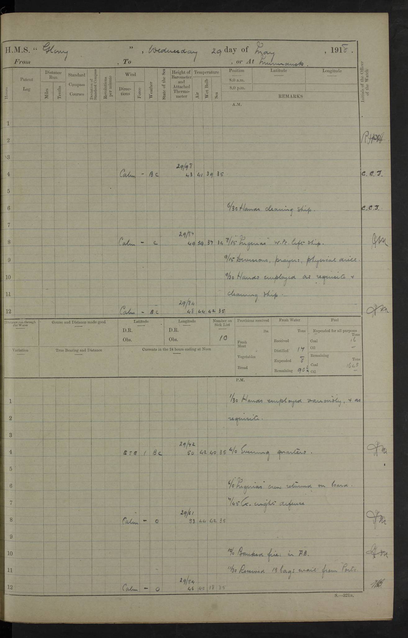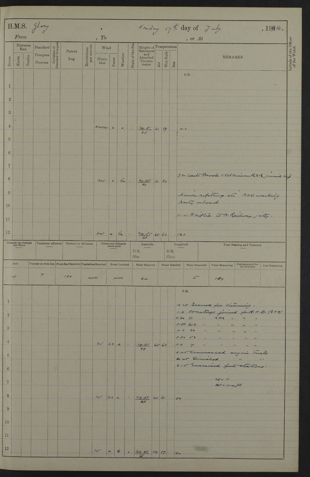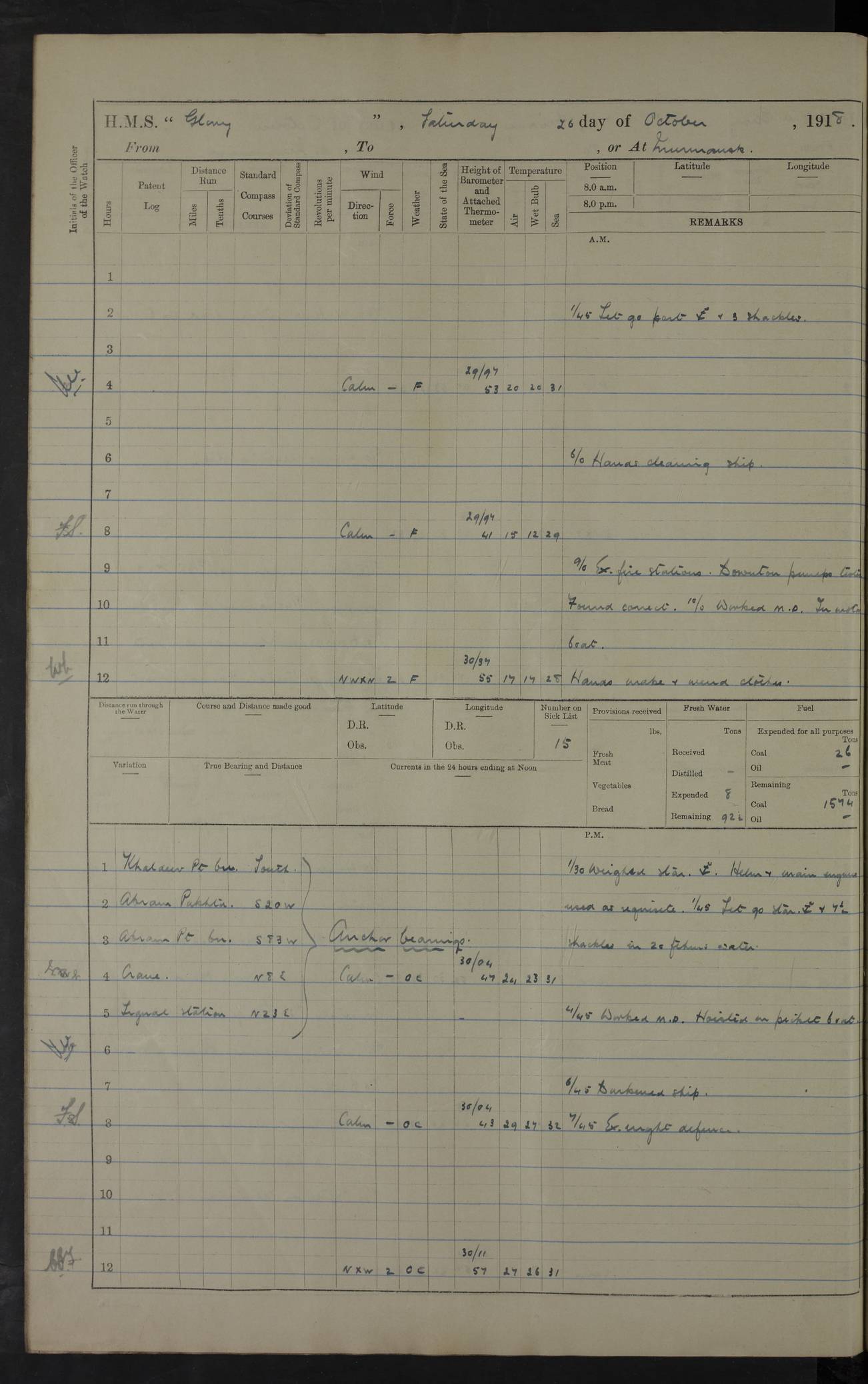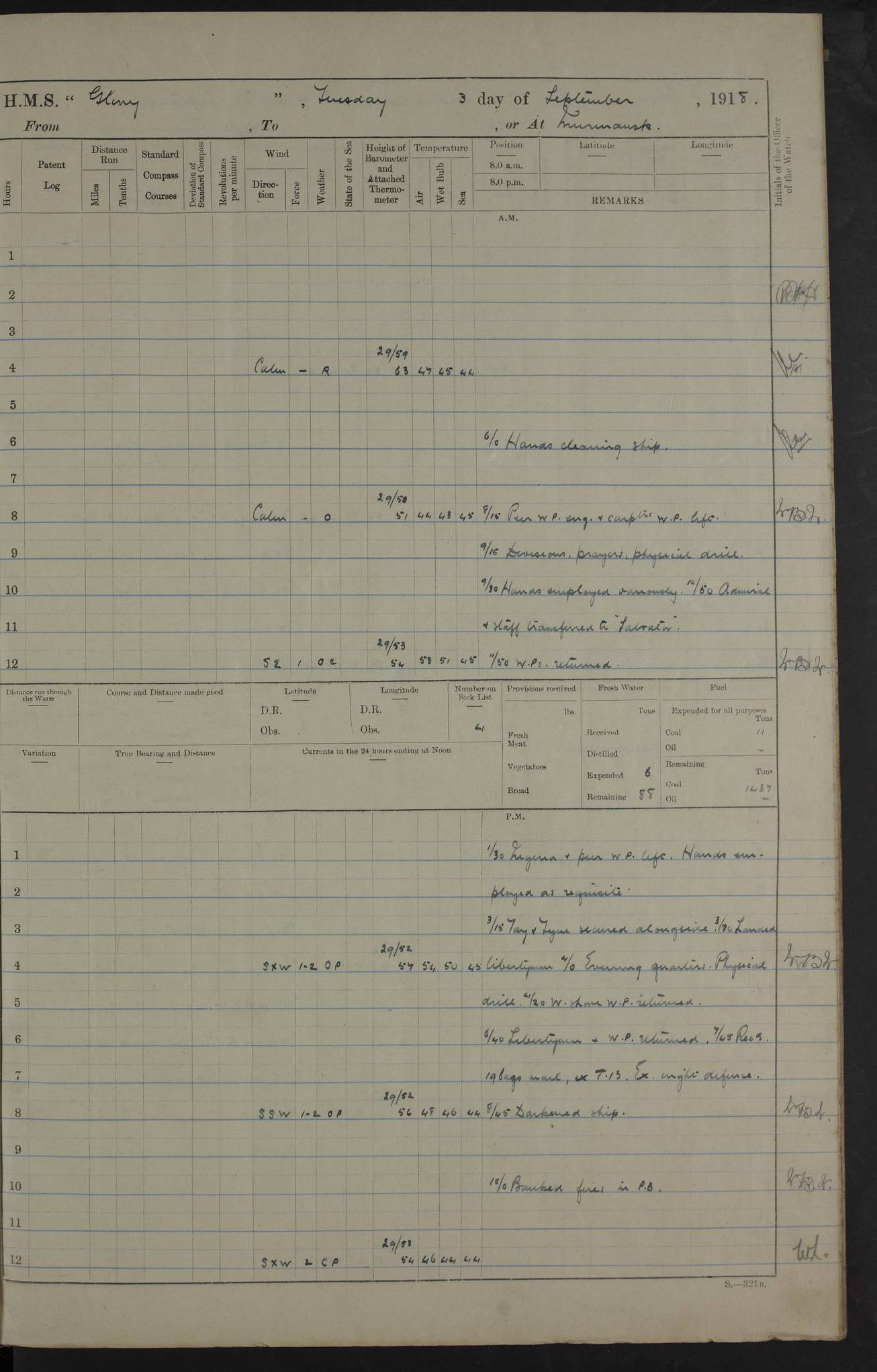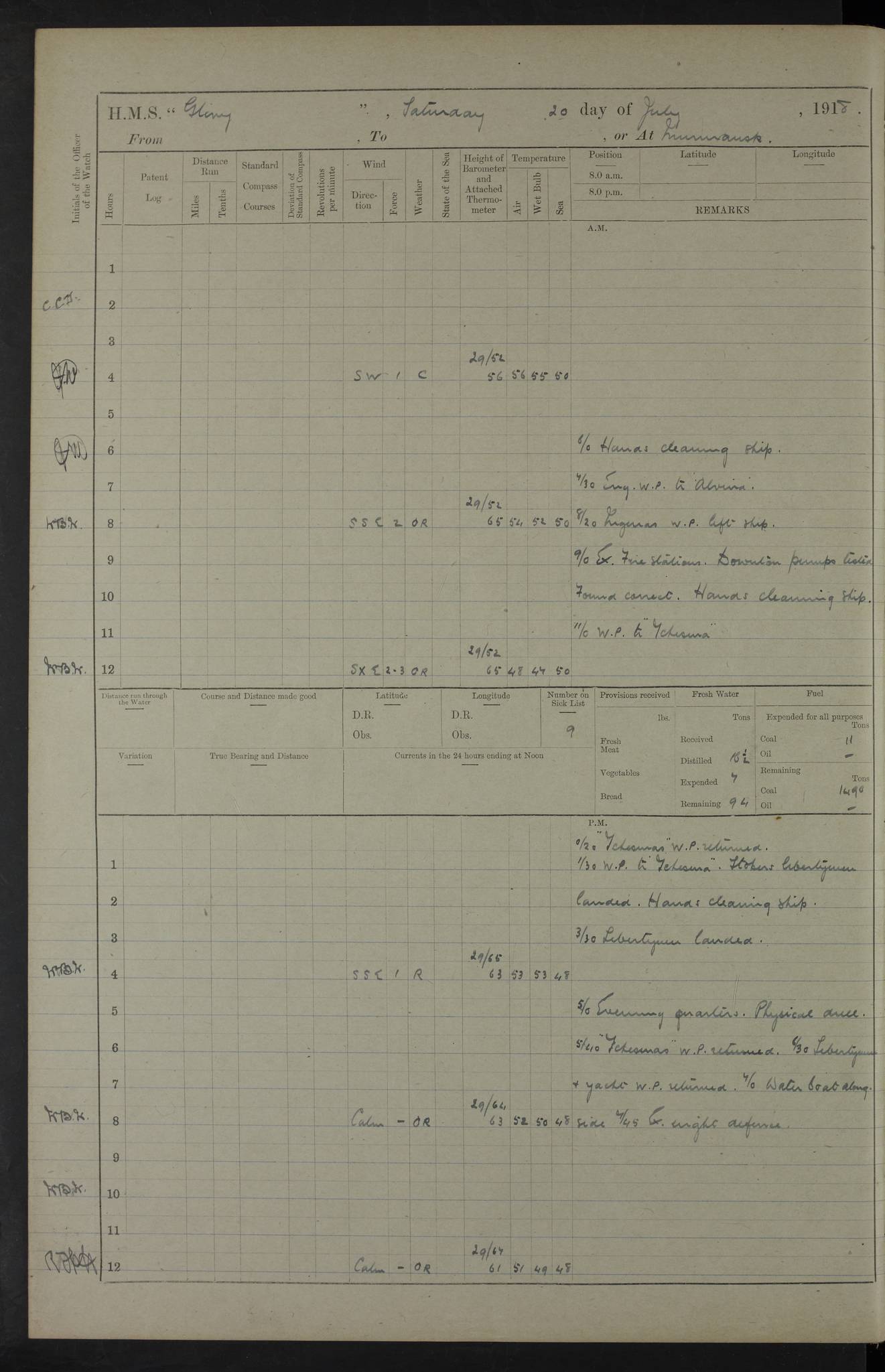 22 June 1915 At sea, Gibraltar to Lemnos Lat 36.1, Long -1.3 4.15am: Sighted land on starboard bow. 10.20am: Stopped port engine for repairs. 11.20am: proceeded with port engine. pm: a/c due to change in deviation. 10.00pm: Cape Tenez Light abeam, 18 miles. 4f73cd61a2fc8ea9030015f6: (https://s3.amazonaws.com:443/oldweather/ADM53-43015/0012_1.jpg) 23 June 1915 At sea, Gibraltar to Lemnos Lat 37.5, Long 4.8 Number on sick list: 4 5.00am: Secured from night defence stations. Placed anti-submarine guns. pm: Life saving appliances served out to men stationed in ? ?at abandon ship. 4f73cd61a2fc8ea9030015f7: (https://s3.amazonaws.com:443/oldweather/ADM53-43015/0013_0.jpg) 24 June 1915 At sea, Gibraltar to Lemnos Lat 37.4, Long 10.8 Position in log clearly bears no resemblance to the location of the ship. Position above is approximate and is based sighting of Zembra Island at 11.55am. 5.00am: Dispersed from night defence stations. Manned anti-submarine guns. am: Sighted two French torpedo boats. am: Torpedo boats passed to ~ No 362, 363. am: Sighted land on starboard beam. 11.55am: Zembra Island abeam, 25 miles. 2.00pm: Sighted Pantellaria S34ºE. 4.45pm: Pantellaria Light House abeam 12 miles. 4f73cd61a2fc8ea9030015f8: (https://s3.amazonaws.com:443/oldweather/ADM53-43015/0013_1.jpg) 25 June 1915 At sea, Gibraltar to Lemnos Lat 35.5, Long 16.7 2.10am: Gozo Light abeam 17 miles. 5.00am: Dispersed from night defence stations. Manned anti-submarine guns. 4f73cd61a2fc8ea9030015f9: (https://s3.amazonaws.com:443/oldweather/ADM53-43015/0014_0.jpg) 26 June 1915 At sea, Gibraltar to Lemnos Lat 35.5, Long 22.6 Number on sick list: 5 5.00am: Dispersed from night defence stations. Manned anti-submarine guns. am: Aired night clothing. am: marines at maxim practice on quarter deck. 2.00pm: Observed land on either bow. 3.00pm: Sighted French patrol destroyer. 4.15pm: Sighted French patrol destroyer. 9.40pm: Milo Peak N63ºW. 10.26pm: Polino Light abeam to port 5.5 miles. 4f73cd62a2fc8ea9030015fa: (https://s3.amazonaws.com:443/oldweather/ADM53-43015/0014_1.jpg) 27 June 1915 At sea and at Lemnos Lat 39.1, Long 24.4 From 0.50 to 3.05am sighting of multiple light houses. 3.50am: a/c to N39ºW and commenced to zig-zag. 5.00am: Dispersed from night defence stations and placed anti-submarine guns and look-outs. am: Lost overboard by accident Hazlewood fender, pat. 311, one in number. 10.30am: Held Divine Service onboard. pm: Met and signalled HMS Minerva on patrol duty. pm: Courses and speeds as requisite while waiting orders to approach Mudros. 3.00pm: Proceeded. 5.16pm: Increased to 90 revs, commenced to zig-zag. Course as requisite for Mudros. 7.00pm: Entered Mudros Bay. 7.47pm: Stopped. Let go port anchor in ‘M3’. 8.30pm: Darkened ship. pm: Manned one 6” and one 12 pdr. 4f73cd62a2fc8ea9030015fb: (https://s3.amazonaws.com:443/oldweather/ADM53-43015/0015_0.jpg) 28 June 1915 Mudros Bay, Lemnos Lat 39.89, Long 25.24 5,00am: HMS Vengeance entered harbour. HMS Vengeance was a pre-dreadnought of the Canopus class, launched in 1899 at Vickers, Barrow, and sold for scrapping in 1921. Details at http://en.wikipedia.org/wiki/HMS_Vengeance_(1899) . am/pm/: hands preparing for coaling and about ship’s work. pm: Collier Wabana secured alongside. 4f73cd62a2fc8ea9030015fc: (https://s3.amazonaws.com:443/oldweather/ADM53-43015/0015_1.jpg) 29 June 1915 Mudros Bay, Lemnos Lat 39.89, Long 25.24 5.15am: Commenced coaling. 2.00pm: Finished coaling. Collier left. 4f73cd62a2fc8ea9030015fd: (https://s3.amazonaws.com:443/oldweather/ADM53-43015/0016_0.jpg) 30 June 1915 Mudros Bay, Lemnos Lat 39.89, Long 25.24 am: Parties away sanding, and with fire engines onshore. am: Boats away disembarking troops. am: French Flagship Patrie sailed. The Patrie was a French pre-dreadnought, launched at La Seyne shipyard in 1903, and stricken in 1921. Details at http://en.wikipedia.org/wiki/French_battleship_Patrie . 6.30pm: Hands to bathe. 4f73cd63a2fc8ea9030015fe: (https://s3.amazonaws.com:443/oldweather/ADM53-43015/0016_1.jpg) 4f73cd63a2fc8ea9030015ff: (https://s3.amazonaws.com:443/oldweather/ADM53-43015/0017_0.jpg) 4f73cd63a2fc8ea903001600: (https://s3.amazonaws.com:443/oldweather/ADM53-43015/0017_1.jpg) 4f73cd63a2fc8ea903001601: (https://s3.amazonaws.com:443/oldweather/ADM53-43015/0018_0.jpg) 4f73cd64a2fc8ea903001602: (https://s3.amazonaws.com:443/oldweather/ADM53-43015/0018_1.jpg) LOGS FOR JULY 1915 From July to October 1915, HMS Glory spent her time at Port Mudros. Certain activities typically took place daily and are not generally noted in the pages below. These activities include: Lighting fires in the picket boat around 4am and drawing the fires in the late evening; Divisions at around 9–9.30am and Evening Quarters at 4pm; Darken ship at around 8.30pm; Daily ‘cleaning ship’, with variations thereof; SBC (for ‘Signal Books Correct’) at the watch changes. 4f73cd64a2fc8ea903001603: (https://s3.amazonaws.com:443/oldweather/ADM53-43016/0000_0.jpg) 4f73cd64a2fc8ea903001604: (https://s3.amazonaws.com:443/oldweather/ADM53-43016/0000_1.jpg) 4f73cd65a2fc8ea903001605: (https://s3.amazonaws.com:443/oldweather/ADM53-43016/0001_0.jpg) 4f73cd65a2fc8ea903001606: (https://s3.amazonaws.com:443/oldweather/ADM53-43016/0001_1.jpg) 1 July 1915 Port Mudros Lat 39.89, Long 25.24 6.30am: Landed working parties preparing boom defence ships. am: Discharged Acting Commander Rayne to Hector. Hector was a kite balloon ship. No further details readily available. 5.00pm: Tug T.10 made fast astern. 7.15pm: HMS Venerable went out. 7.30pm: HMS Chatham went out. HMS Chatham was a ‘Town’ cruiser and lead ship of her class. She was launched in 1911 at Chatham Dockyard and sold in 1926. Details at http://en.wikipedia.org/wiki/HMS_Chatham_(1911) . 4f73cd65a2fc8ea903001607: (https://s3.amazonaws.com:443/oldweather/ADM53-43016/0002_0.jpg) 2 July 1915 Port Mudros Lat 39.89, Long 25.24 5.35am: Landed working parties preparing boom defence ships. am/pm: Boom defence par