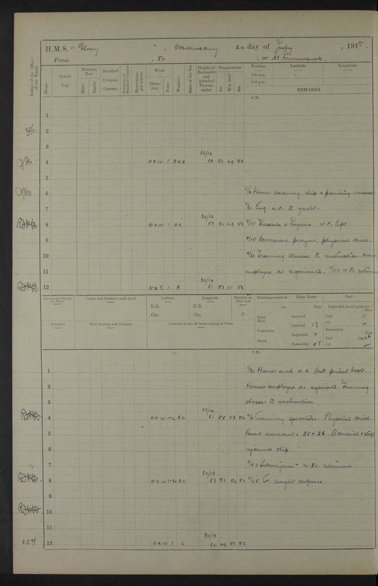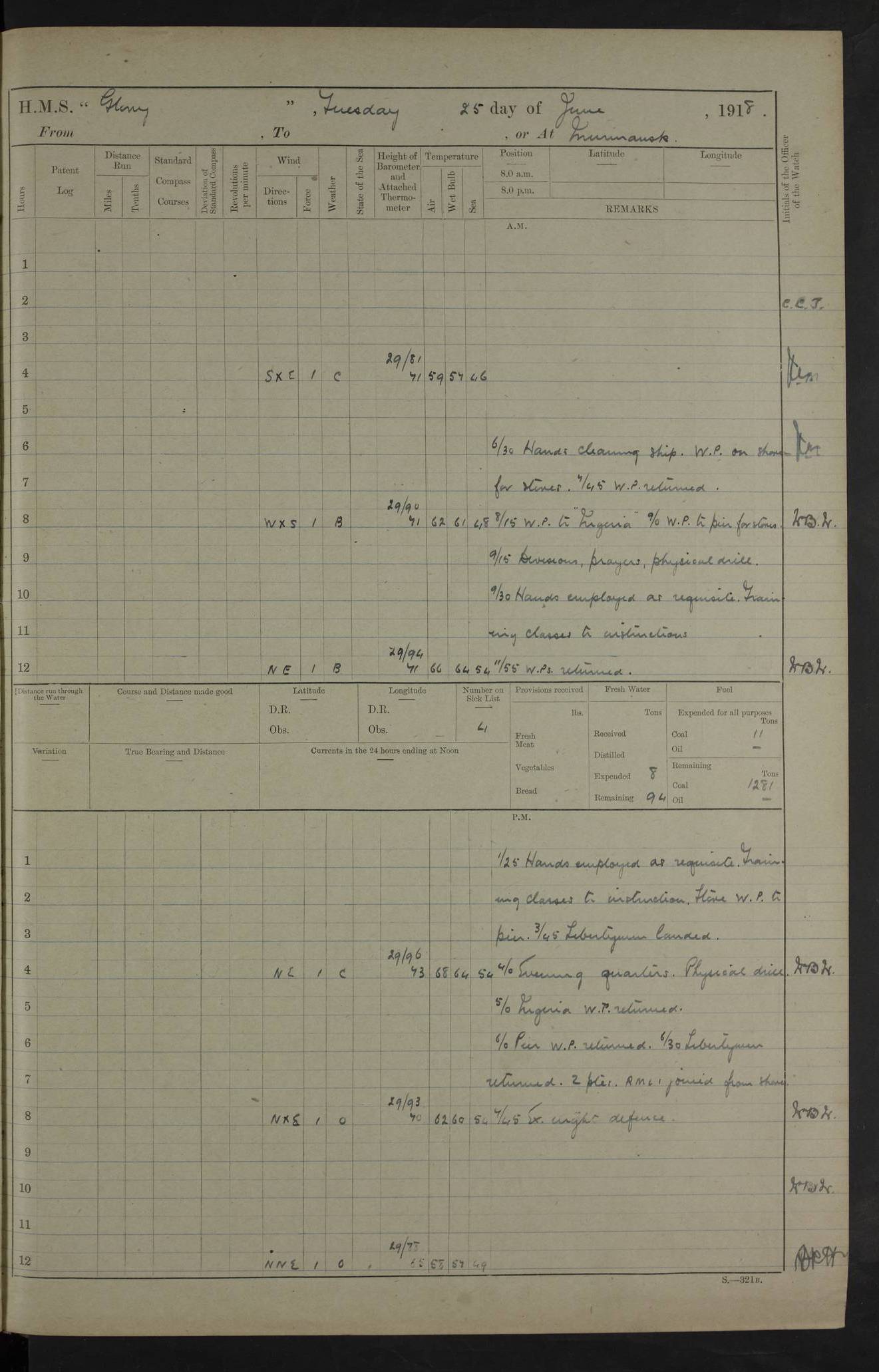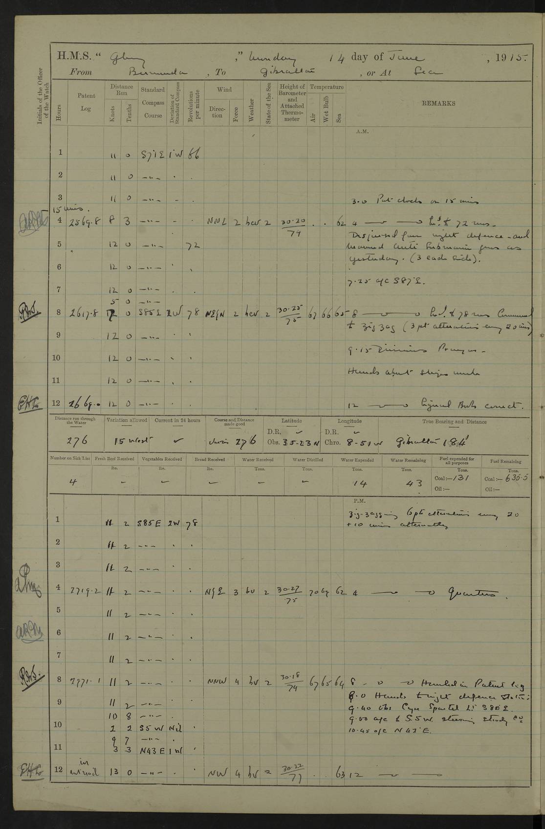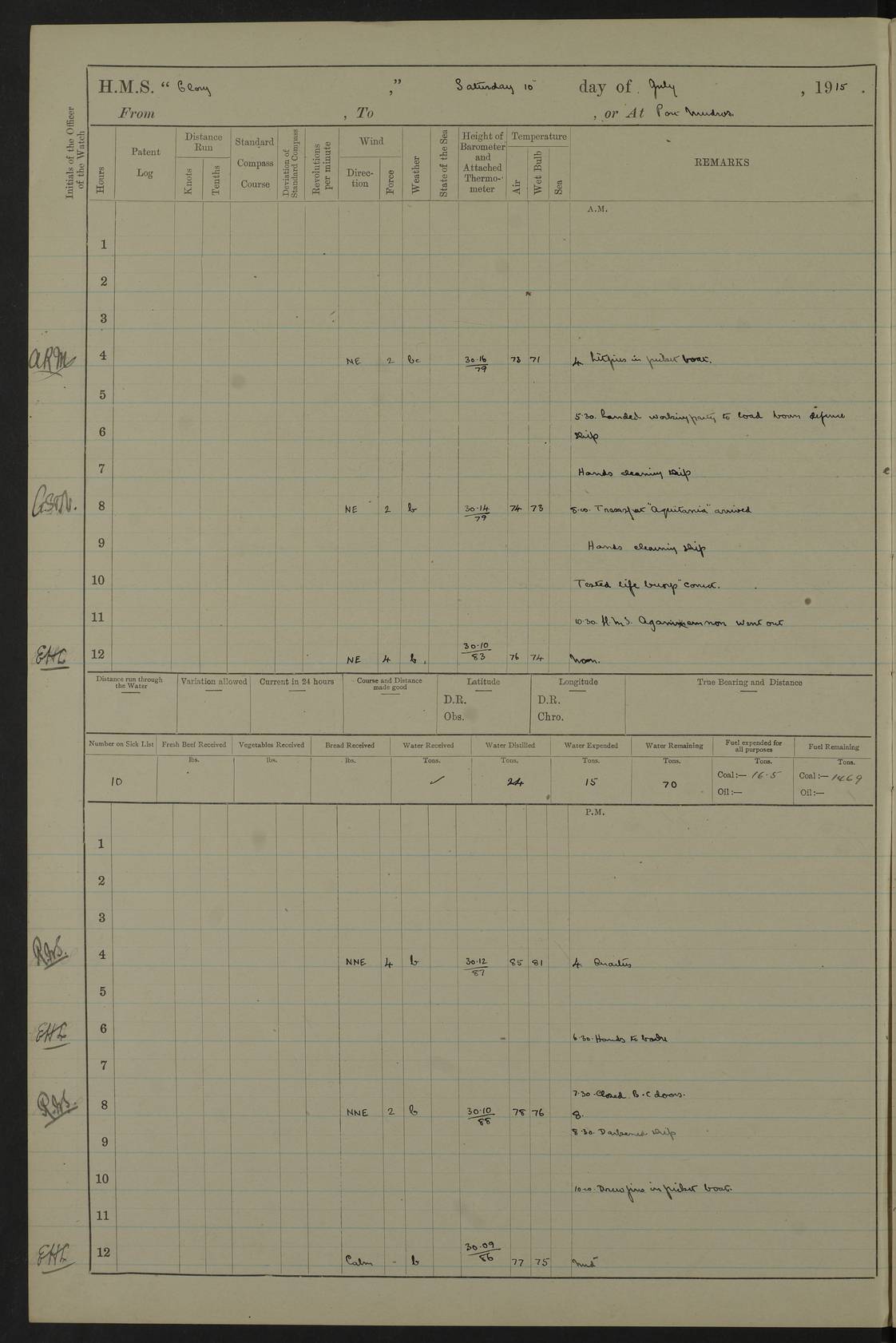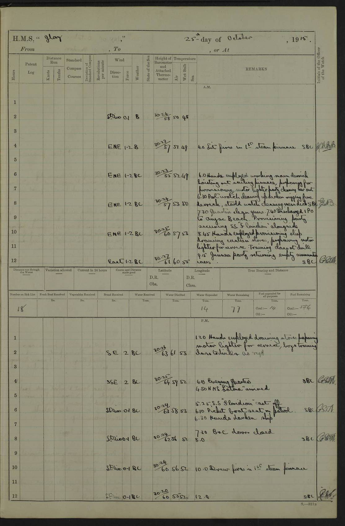 22 June 1915 At sea, Gibraltar to Lemnos Lat 36.1, Long -1.3 4.15am: Sighted land on starboard bow. 10.20am: Stopped port engine for repairs. 11.20am: proceeded with port engine. pm: a/c due to change in deviation. 10.00pm: Cape Tenez Light abeam, 18 miles. 4f73cd61a2fc8ea9030015f6: (https://s3.amazonaws.com:443/oldweather/ADM53-43015/0012_1.jpg) 23 June 1915 At sea, Gibraltar to Lemnos Lat 37.5, Long 4.8 Number on sick list: 4 5.00am: Secured from night defence stations. Placed anti-submarine guns. pm: Life saving appliances served out to men stationed in ? ?at abandon ship. 4f73cd61a2fc8ea9030015f7: (https://s3.amazonaws.com:443/oldweather/ADM53-43015/0013_0.jpg) 24 June 1915 At sea, Gibraltar to Lemnos Lat 37.4, Long 10.8 Position in log clearly bears no resemblance to the location of the ship. Position above is approximate and is based sighting of Zembra Island at 11.55am. 5.00am: Dispersed from night defence stations. Manned anti-submarine guns. am: Sighted two French torpedo boats. am: Torpedo boats passed to ~ No 362, 363. am: Sighted land on starboard beam. 11.55am: Zembra Island abeam, 25 miles. 2.00pm: Sighted Pantellaria S34ºE. 4.45pm: Pantellaria Light House abeam 12 miles. 4f73cd61a2fc8ea9030015f8: (https://s3.amazonaws.com:443/oldweather/ADM53-43015/0013_1.jpg) 25 June 1915 At sea, Gibraltar to Lemnos Lat 35.5, Long 16.7 2.10am: Gozo Light abeam 17 miles. 5.00am: Dispersed from night defence stations. Manned anti-submarine guns. 4f73cd61a2fc8ea9030015f9: (https://s3.amazonaws.com:443/oldweather/ADM53-43015/0014_0.jpg) 26 June 1915 At sea, Gibraltar to Lemnos Lat 35.5, Long 22.6 Number on sick list: 5 5.00am: Dispersed from night defence stations. Manned anti-submarine guns. am: Aired night clothing. am: marines at maxim practice on quarter deck. 2.00pm: Observed land on either bow. 3.00pm: Sighted French patrol destroyer. 4.15pm: Sighted French patrol destroyer. 9.40pm: Milo Peak N63ºW. 10.26pm: Polino Light abeam to port 5.5 miles. 4f73cd62a2fc8ea9030015fa: (https://s3.amazonaws.com:443/oldweather/ADM53-43015/0014_1.jpg) 27 June 1915 At sea and at Lemnos Lat 39.1, Long 24.4 From 0.50 to 3.05am sighting of multiple light houses. 3.50am: a/c to N39ºW and commenced to zig-zag. 5.00am: Dispersed from night defence stations and placed anti-submarine guns and look-outs. am: Lost overboard by accident Hazlewood fender, pat. 311, one in number. 10.30am: Held Divine Service onboard. pm: Met and signalled HMS Minerva on patrol duty. pm: Courses and speeds as requisite while waiting orders to approach Mudros. 3.00pm: Proceeded. 5.16pm: Increased to 90 revs, commenced to zig-zag. Course as requisite for Mudros. 7.00pm: Entered Mudros Bay. 7.47pm: Stopped. Let go port anchor in ‘M3’. 8.30pm: Darkened ship. pm: Manned one 6” and one 12 pdr. 4f73cd62a2fc8ea9030015fb: (https://s3.amazonaws.com:443/oldweather/ADM53-43015/0015_0.jpg) 28 June 1915 Mudros Bay, Lemnos Lat 39.89, Long 25.24 5,00am: HMS Vengeance entered harbour. HMS Vengeance was a pre-dreadnought of the Canopus class, launched in 1899 at Vickers, Barrow, and sold for scrapping in 1921. Details at http://en.wikipedia.org/wiki/HMS_Vengeance_(1899) . am/pm/: hands preparing for coaling and about ship’s work. pm: Collier Wabana secured alongside. 4f73cd62a2fc8ea9030015fc: (https://s3.amazonaws.com:443/oldweather/ADM53-43015/0015_1.jpg) 29 June 1915 Mudros Bay, Lemnos Lat 39.89, Long 25.24 5.15am: Commenced coaling. 2.00pm: Finished coaling. Collier left. 4f73cd62a2fc8ea9030015fd: (https://s3.amazonaws.com:443/oldweather/ADM53-43015/0016_0.jpg) 30 June 1915 Mudros Bay, Lemnos Lat 39.89, Long 25.24 am: Parties away sanding, and with fire engines onshore. am: Boats away disembarking troops. am: French Flagship Patrie sailed. The Patrie was a French pre-dreadnought, launched at La Seyne shipyard in 1903, and stricken in 1921. Details at http://en.wikipedia.org/wiki/French_battleship_Patrie . 6.30pm: Hands to bathe. 4f73cd63a2fc8ea9030015fe: (https://s3.amazonaws.com:443/oldweather/ADM53-43015/0016_1.jpg) 4f73cd63a2fc8ea9030015ff: (https://s3.amazonaws.com:443/oldweather/ADM53-43015/0017_0.jpg) 4f73cd63a2fc8ea903001600: (https://s3.amazonaws.com:443/oldweather/ADM53-43015/0017_1.jpg) 4f73cd63a2fc8ea903001601: (https://s3.amazonaws.com:443/oldweather/ADM53-43015/0018_0.jpg) 4f73cd64a2fc8ea903001602: (https://s3.amazonaws.com:443/oldweather/ADM53-43015/0018_1.jpg) LOGS FOR JULY 1915 From July to October 1915, HMS Glory spent her time at Port Mudros. Certain activities typically took place daily and are not generally noted in the pages below. These activities include: Lighting fires in the picket boat around 4am and drawing the fires in the late evening; Divisions at around 9–9.30am and Evening Quarters at 4pm; Darken ship at around 8.30pm; Daily ‘cleaning ship’, with variations thereof; SBC (for ‘Signal Books Correct’) at the watch changes. 4f73cd64a2fc8ea903001603: (https://s3.amazonaws.com:443/oldweather/ADM53-43016/0000_0.jpg) 4f73cd64a2fc8ea903001604: (https://s3.amazonaws.com:443/oldweather/ADM53-43016/0000_1.jpg) 4f73cd65a2fc8ea903001605: (https://s3.amazonaws.com:443/oldweather/ADM53-43016/0001_0.jpg) 4f73cd65a2fc8ea903001606: (https://s3.amazonaws.com:443/oldweather/ADM53-43016/0001_1.jpg) 1 July 1915 Port Mudros Lat 39.89, Long 25.24 6.30am: Landed working parties preparing boom defence ships. am: Discharged Acting Commander Rayne to Hector. Hector was a kite balloon ship. No further details readily available. 5.00pm: Tug T.10 made fast astern. 7.15pm: HMS Venerable went out. 7.30pm: HMS Chatham went out. HMS Chatham was a ‘Town’ cruiser and lead ship of her class. She was launched in 1911 at Chatham Dockyard and sold in 1926. Details at http://en.wikipedia.org/wiki/HMS_Chatham_(1911) . 4f73cd65a2fc8ea903001607: (https://s3.amazonaws.com:443/oldweather/ADM53-43016/0002_0.jpg) 2 July 1915 Port Mudros Lat 39.89, Long 25.24 5.35am: Landed working parties preparing boom defence ships. am/pm: Boom defence par