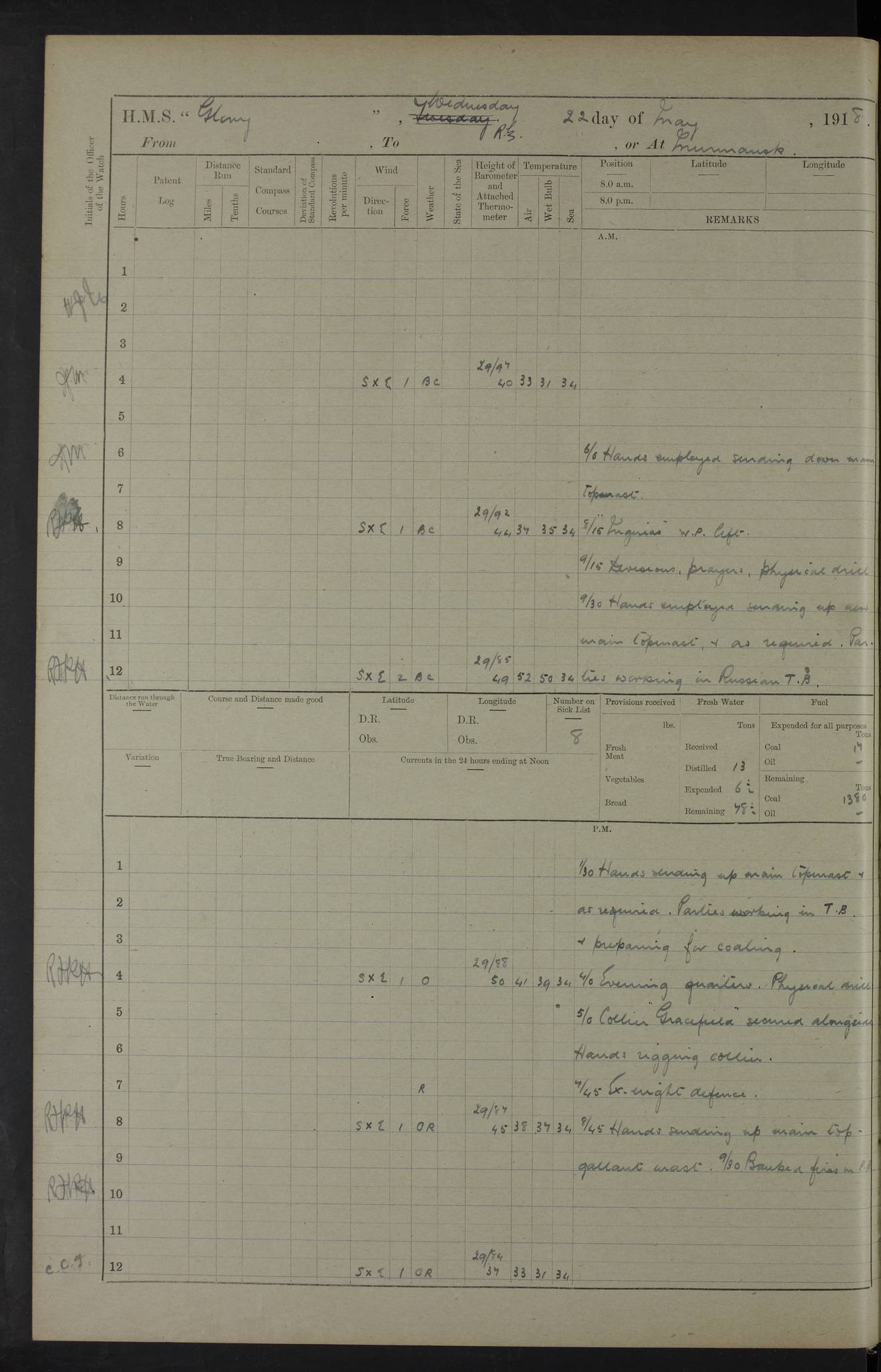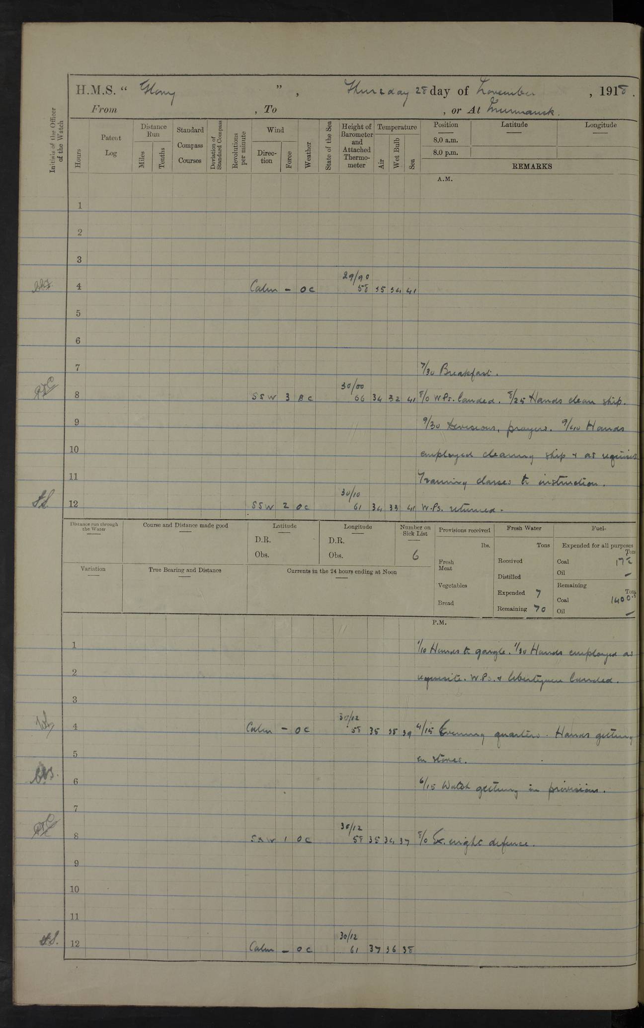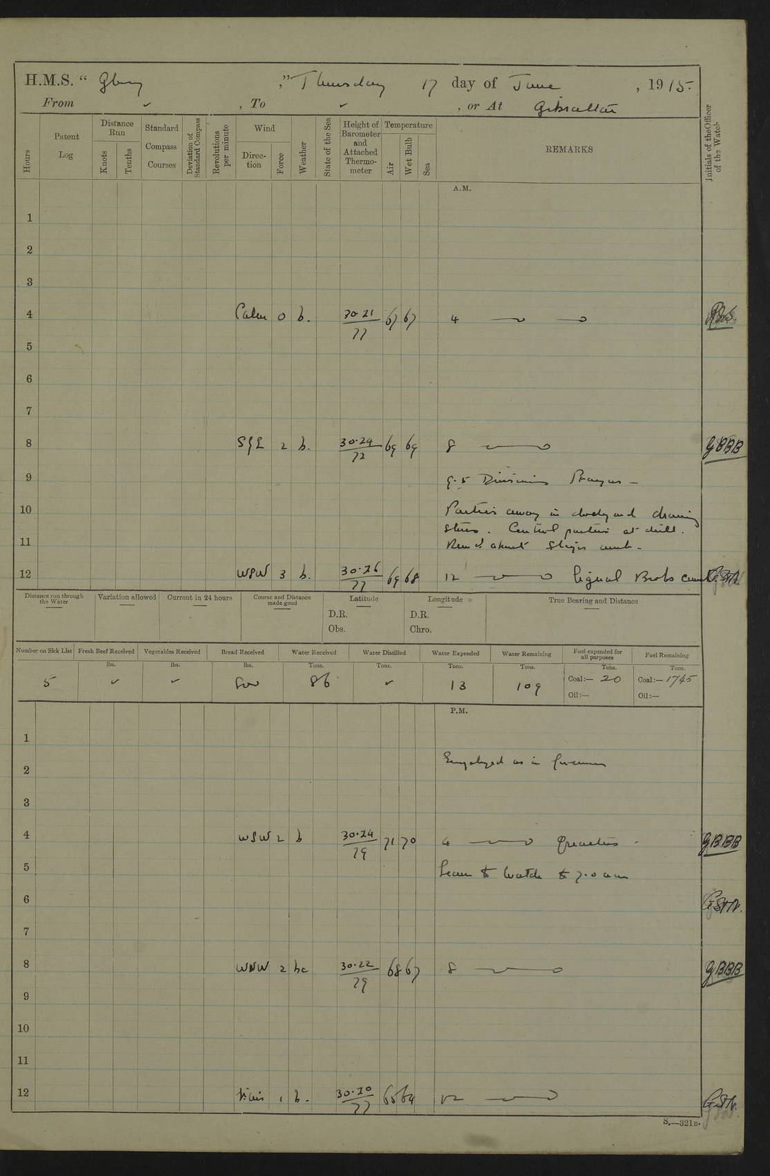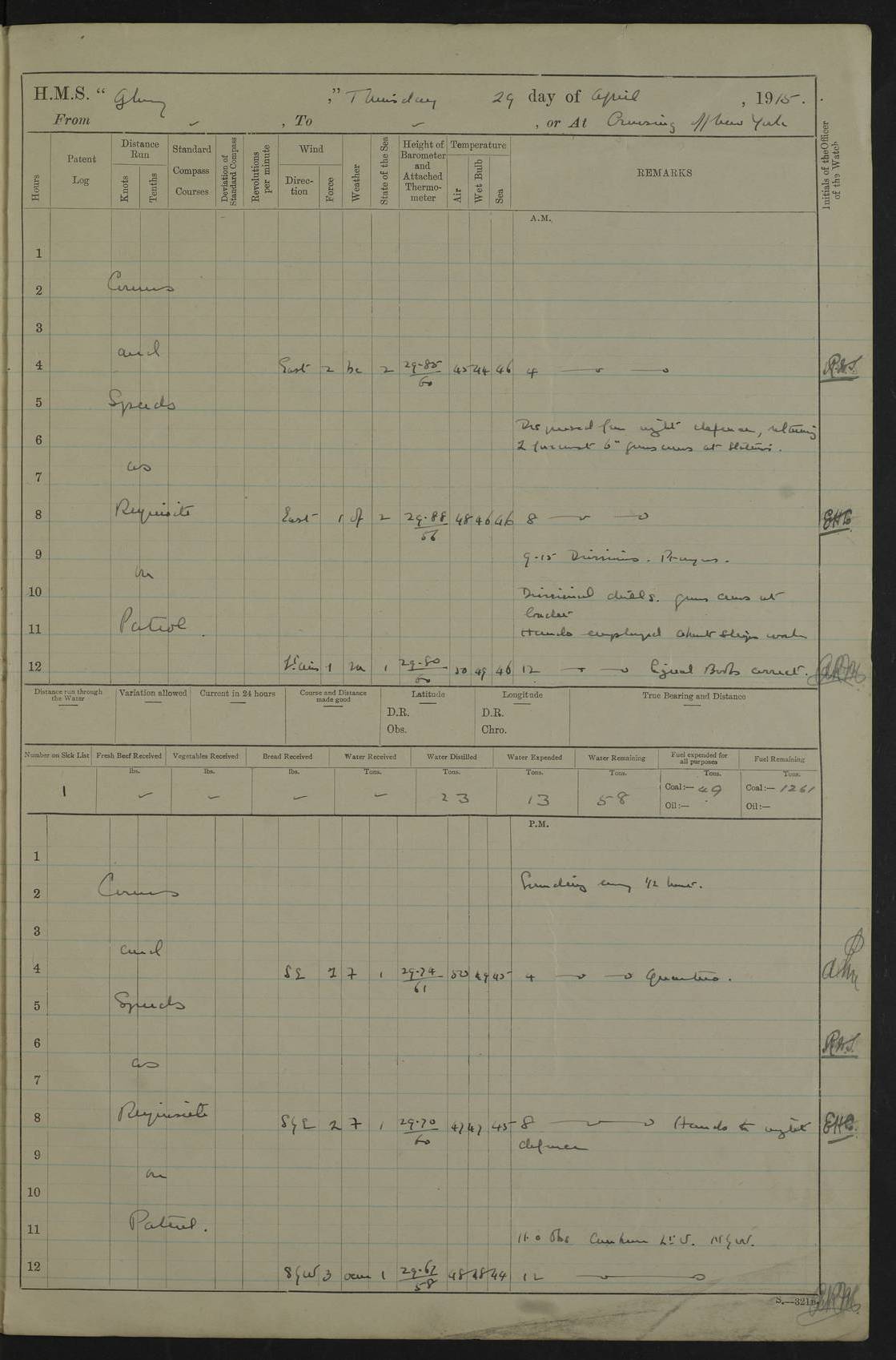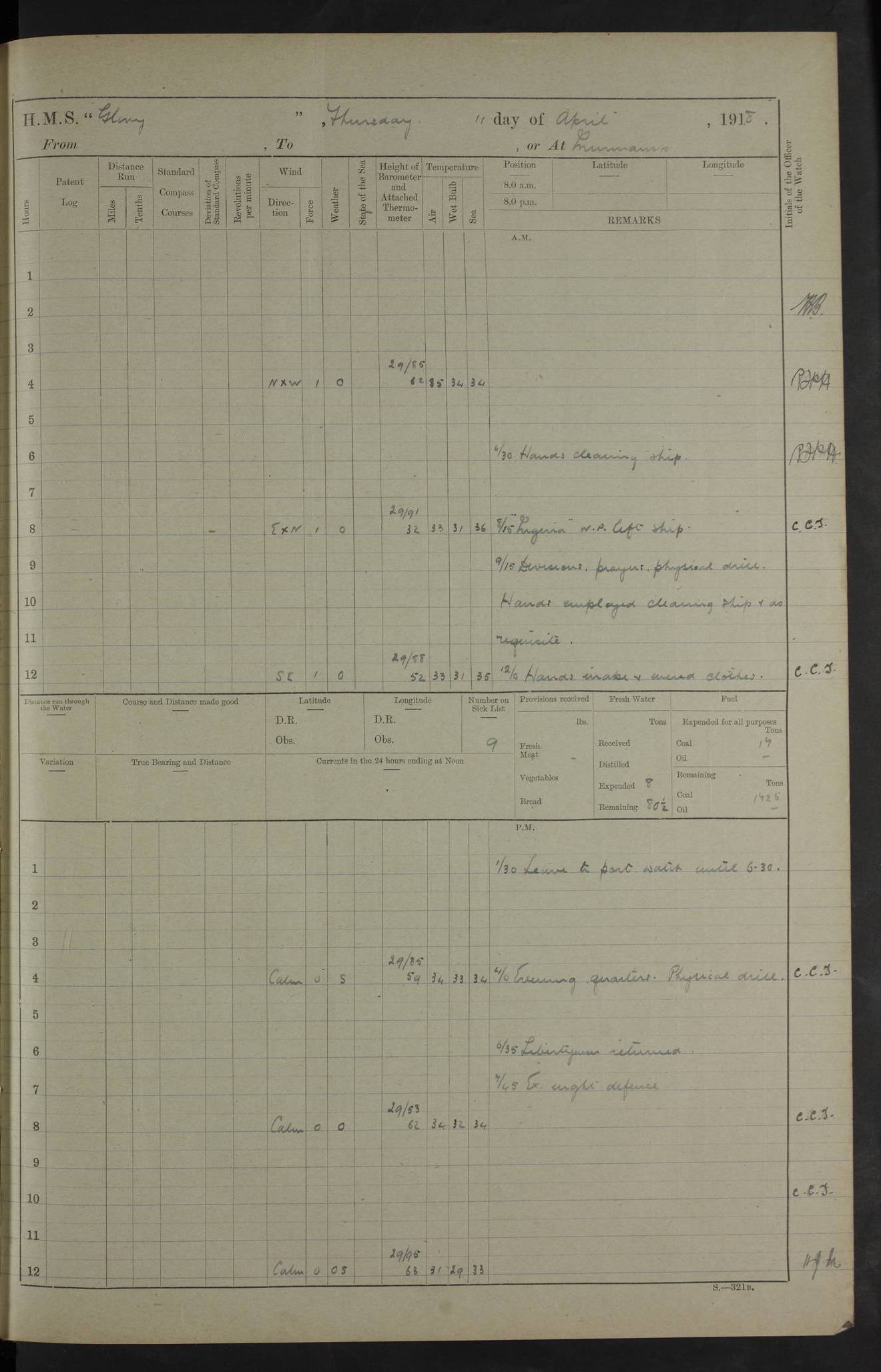 22 June 1915 At sea, Gibraltar to Lemnos Lat 36.1, Long -1.3 4.15am: Sighted land on starboard bow. 10.20am: Stopped port engine for repairs. 11.20am: proceeded with port engine. pm: a/c due to change in deviation. 10.00pm: Cape Tenez Light abeam, 18 miles. 4f73cd61a2fc8ea9030015f6: (https://s3.amazonaws.com:443/oldweather/ADM53-43015/0012_1.jpg) 23 June 1915 At sea, Gibraltar to Lemnos Lat 37.5, Long 4.8 Number on sick list: 4 5.00am: Secured from night defence stations. Placed anti-submarine guns. pm: Life saving appliances served out to men stationed in ? ?at abandon ship. 4f73cd61a2fc8ea9030015f7: (https://s3.amazonaws.com:443/oldweather/ADM53-43015/0013_0.jpg) 24 June 1915 At sea, Gibraltar to Lemnos Lat 37.4, Long 10.8 Position in log clearly bears no resemblance to the location of the ship. Position above is approximate and is based sighting of Zembra Island at 11.55am. 5.00am: Dispersed from night defence stations. Manned anti-submarine guns. am: Sighted two French torpedo boats. am: Torpedo boats passed to ~ No 362, 363. am: Sighted land on starboard beam. 11.55am: Zembra Island abeam, 25 miles. 2.00pm: Sighted Pantellaria S34ºE. 4.45pm: Pantellaria Light House abeam 12 miles. 4f73cd61a2fc8ea9030015f8: (https://s3.amazonaws.com:443/oldweather/ADM53-43015/0013_1.jpg) 25 June 1915 At sea, Gibraltar to Lemnos Lat 35.5, Long 16.7 2.10am: Gozo Light abeam 17 miles. 5.00am: Dispersed from night defence stations. Manned anti-submarine guns. 4f73cd61a2fc8ea9030015f9: (https://s3.amazonaws.com:443/oldweather/ADM53-43015/0014_0.jpg) 26 June 1915 At sea, Gibraltar to Lemnos Lat 35.5, Long 22.6 Number on sick list: 5 5.00am: Dispersed from night defence stations. Manned anti-submarine guns. am: Aired night clothing. am: marines at maxim practice on quarter deck. 2.00pm: Observed land on either bow. 3.00pm: Sighted French patrol destroyer. 4.15pm: Sighted French patrol destroyer. 9.40pm: Milo Peak N63ºW. 10.26pm: Polino Light abeam to port 5.5 miles. 4f73cd62a2fc8ea9030015fa: (https://s3.amazonaws.com:443/oldweather/ADM53-43015/0014_1.jpg) 27 June 1915 At sea and at Lemnos Lat 39.1, Long 24.4 From 0.50 to 3.05am sighting of multiple light houses. 3.50am: a/c to N39ºW and commenced to zig-zag. 5.00am: Dispersed from night defence stations and placed anti-submarine guns and look-outs. am: Lost overboard by accident Hazlewood fender, pat. 311, one in number. 10.30am: Held Divine Service onboard. pm: Met and signalled HMS Minerva on patrol duty. pm: Courses and speeds as requisite while waiting orders to approach Mudros. 3.00pm: Proceeded. 5.16pm: Increased to 90 revs, commenced to zig-zag. Course as requisite for Mudros. 7.00pm: Entered Mudros Bay. 7.47pm: Stopped. Let go port anchor in ‘M3’. 8.30pm: Darkened ship. pm: Manned one 6” and one 12 pdr. 4f73cd62a2fc8ea9030015fb: (https://s3.amazonaws.com:443/oldweather/ADM53-43015/0015_0.jpg) 28 June 1915 Mudros Bay, Lemnos Lat 39.89, Long 25.24 5,00am: HMS Vengeance entered harbour. HMS Vengeance was a pre-dreadnought of the Canopus class, launched in 1899 at Vickers, Barrow, and sold for scrapping in 1921. Details at http://en.wikipedia.org/wiki/HMS_Vengeance_(1899) . am/pm/: hands preparing for coaling and about ship’s work. pm: Collier Wabana secured alongside. 4f73cd62a2fc8ea9030015fc: (https://s3.amazonaws.com:443/oldweather/ADM53-43015/0015_1.jpg) 29 June 1915 Mudros Bay, Lemnos Lat 39.89, Long 25.24 5.15am: Commenced coaling. 2.00pm: Finished coaling. Collier left. 4f73cd62a2fc8ea9030015fd: (https://s3.amazonaws.com:443/oldweather/ADM53-43015/0016_0.jpg) 30 June 1915 Mudros Bay, Lemnos Lat 39.89, Long 25.24 am: Parties away sanding, and with fire engines onshore. am: Boats away disembarking troops. am: French Flagship Patrie sailed. The Patrie was a French pre-dreadnought, launched at La Seyne shipyard in 1903, and stricken in 1921. Details at http://en.wikipedia.org/wiki/French_battleship_Patrie . 6.30pm: Hands to bathe. 4f73cd63a2fc8ea9030015fe: (https://s3.amazonaws.com:443/oldweather/ADM53-43015/0016_1.jpg) 4f73cd63a2fc8ea9030015ff: (https://s3.amazonaws.com:443/oldweather/ADM53-43015/0017_0.jpg) 4f73cd63a2fc8ea903001600: (https://s3.amazonaws.com:443/oldweather/ADM53-43015/0017_1.jpg) 4f73cd63a2fc8ea903001601: (https://s3.amazonaws.com:443/oldweather/ADM53-43015/0018_0.jpg) 4f73cd64a2fc8ea903001602: (https://s3.amazonaws.com:443/oldweather/ADM53-43015/0018_1.jpg) LOGS FOR JULY 1915 From July to October 1915, HMS Glory spent her time at Port Mudros. Certain activities typically took place daily and are not generally noted in the pages below. These activities include: Lighting fires in the picket boat around 4am and drawing the fires in the late evening; Divisions at around 9–9.30am and Evening Quarters at 4pm; Darken ship at around 8.30pm; Daily ‘cleaning ship’, with variations thereof; SBC (for ‘Signal Books Correct’) at the watch changes. 4f73cd64a2fc8ea903001603: (https://s3.amazonaws.com:443/oldweather/ADM53-43016/0000_0.jpg) 4f73cd64a2fc8ea903001604: (https://s3.amazonaws.com:443/oldweather/ADM53-43016/0000_1.jpg) 4f73cd65a2fc8ea903001605: (https://s3.amazonaws.com:443/oldweather/ADM53-43016/0001_0.jpg) 4f73cd65a2fc8ea903001606: (https://s3.amazonaws.com:443/oldweather/ADM53-43016/0001_1.jpg) 1 July 1915 Port Mudros Lat 39.89, Long 25.24 6.30am: Landed working parties preparing boom defence ships. am: Discharged Acting Commander Rayne to Hector. Hector was a kite balloon ship. No further details readily available. 5.00pm: Tug T.10 made fast astern. 7.15pm: HMS Venerable went out. 7.30pm: HMS Chatham went out. HMS Chatham was a ‘Town’ cruiser and lead ship of her class. She was launched in 1911 at Chatham Dockyard and sold in 1926. Details at http://en.wikipedia.org/wiki/HMS_Chatham_(1911) . 4f73cd65a2fc8ea903001607: (https://s3.amazonaws.com:443/oldweather/ADM53-43016/0002_0.jpg) 2 July 1915 Port Mudros Lat 39.89, Long 25.24 5.35am: Landed working parties preparing boom defence ships. am/pm: Boom defence par