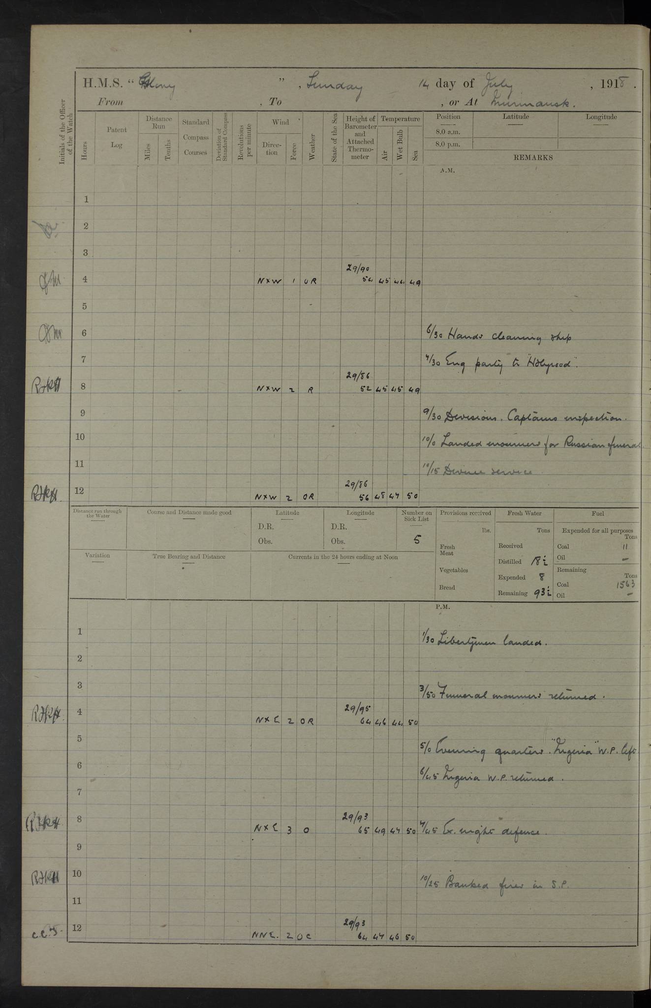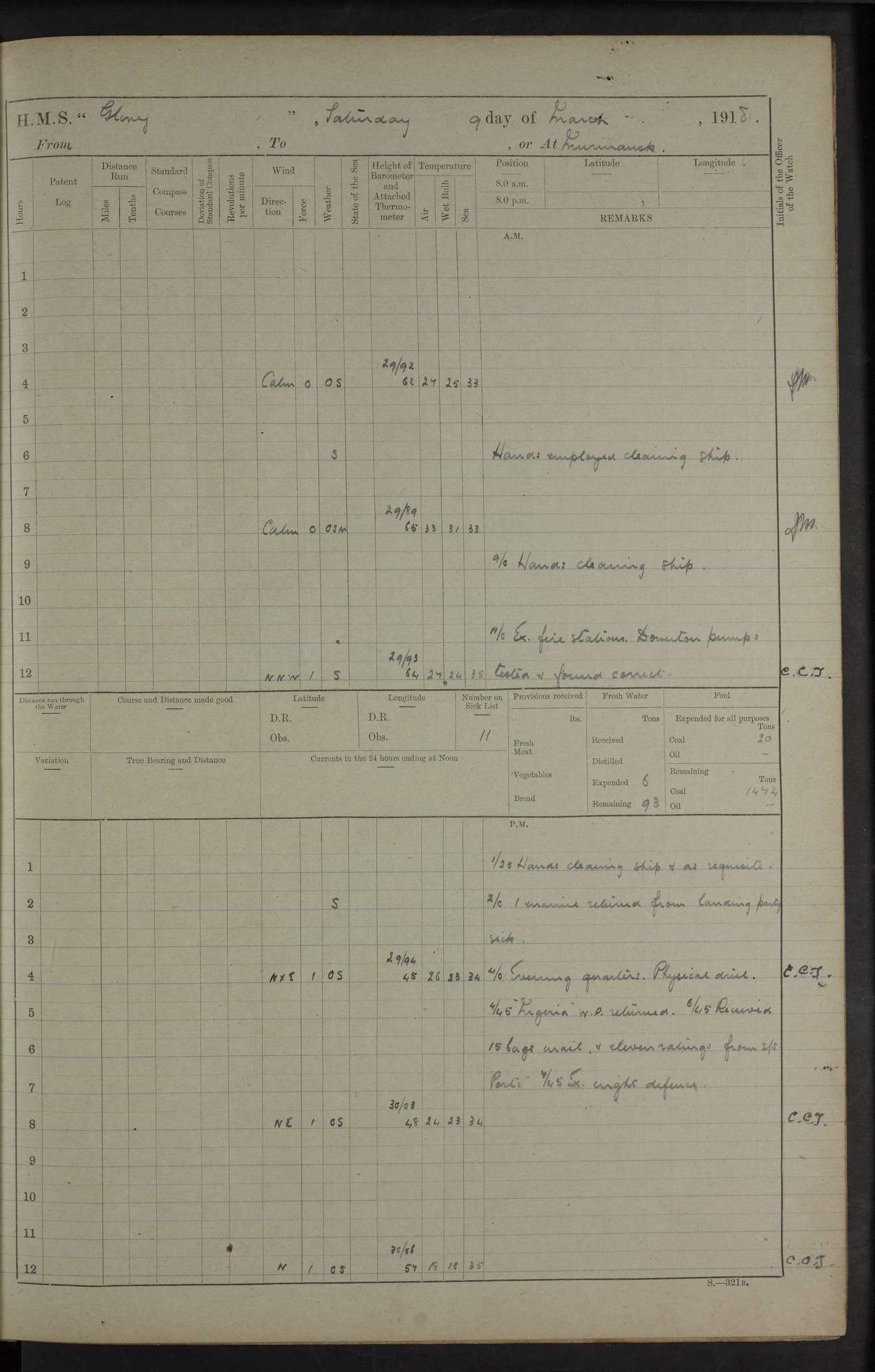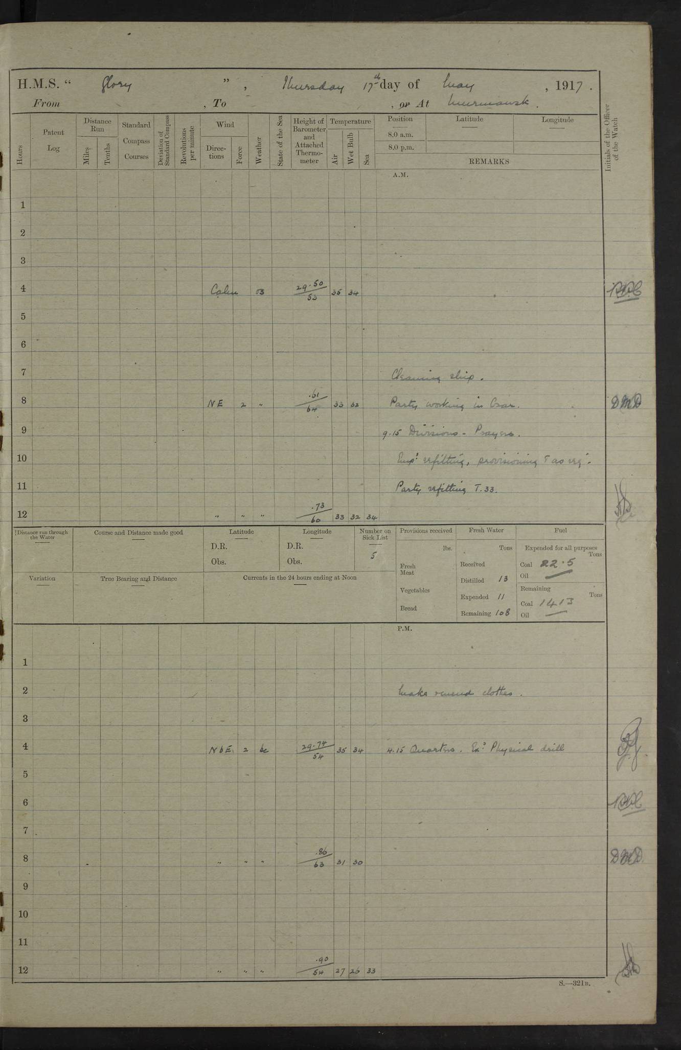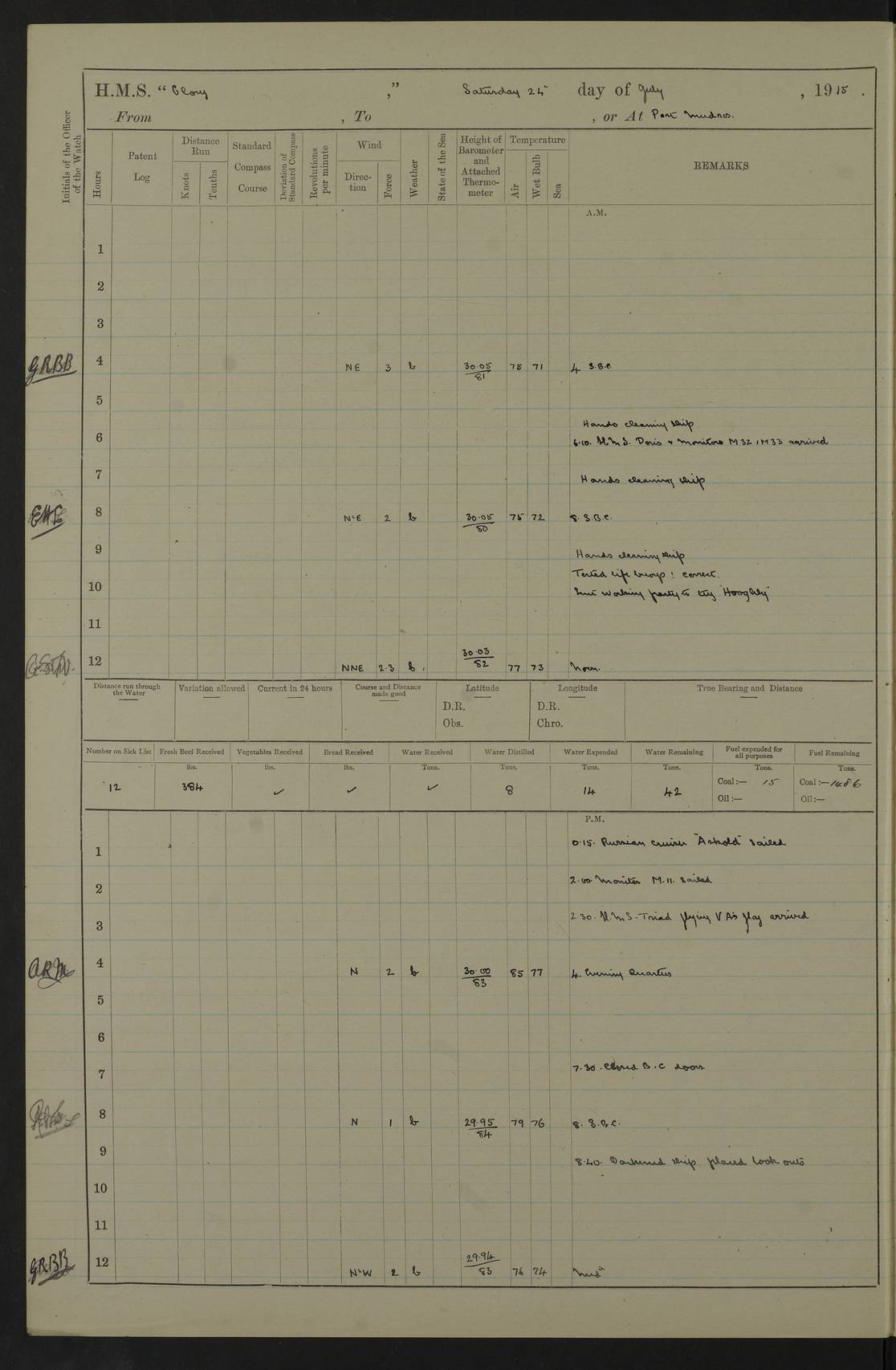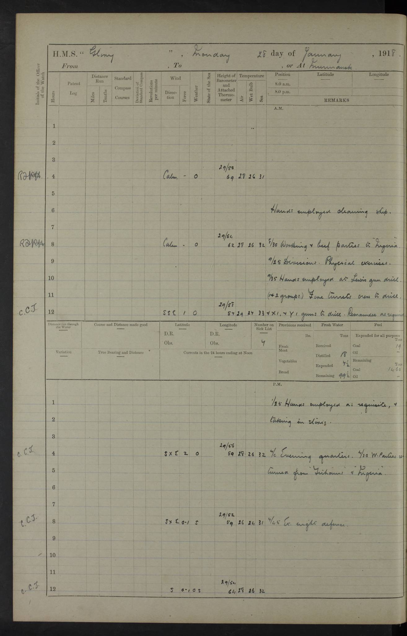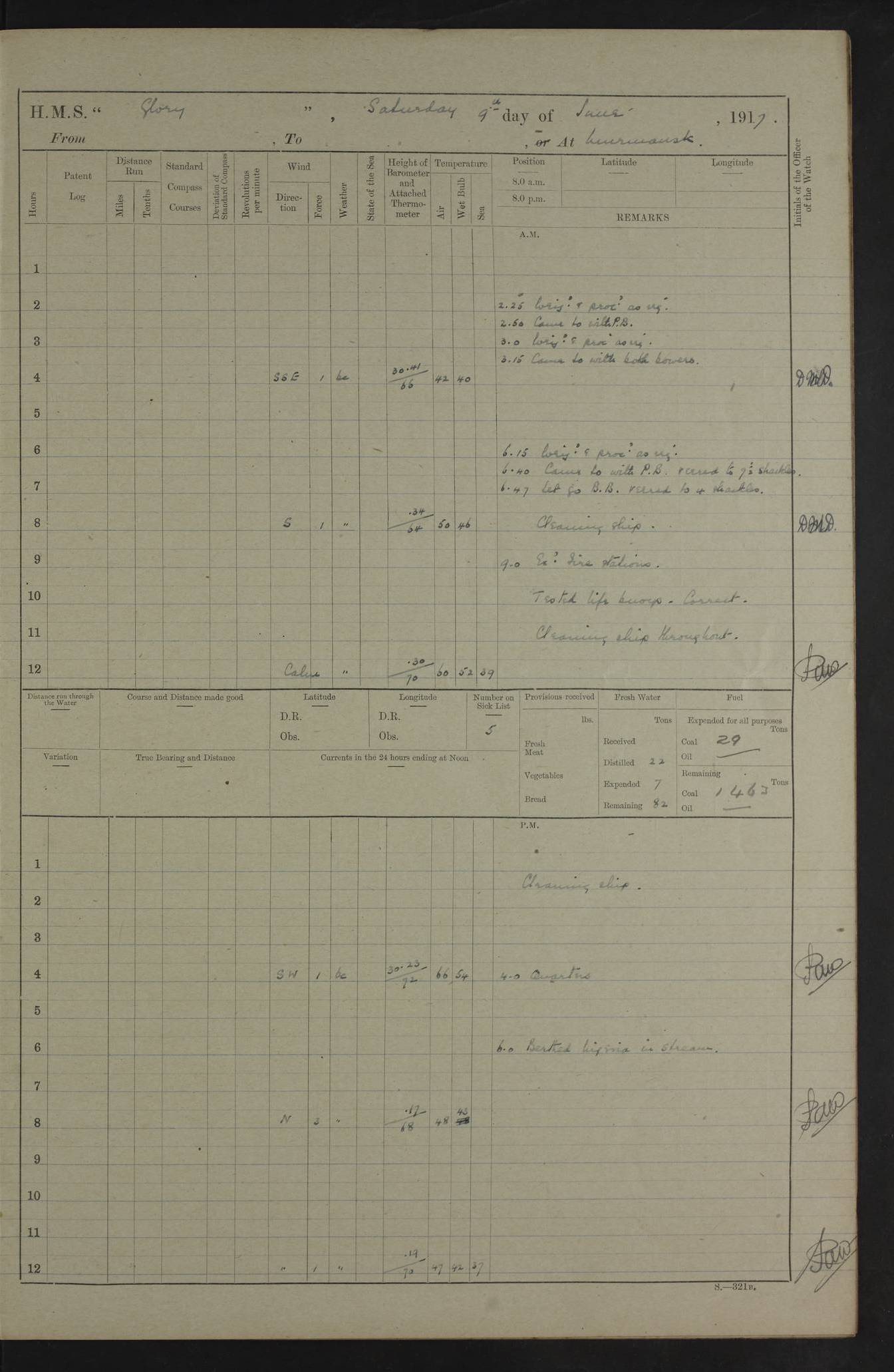 22 June 1915 At sea, Gibraltar to Lemnos Lat 36.1, Long -1.3 4.15am: Sighted land on starboard bow. 10.20am: Stopped port engine for repairs. 11.20am: proceeded with port engine. pm: a/c due to change in deviation. 10.00pm: Cape Tenez Light abeam, 18 miles. 4f73cd61a2fc8ea9030015f6: (https://s3.amazonaws.com:443/oldweather/ADM53-43015/0012_1.jpg) 23 June 1915 At sea, Gibraltar to Lemnos Lat 37.5, Long 4.8 Number on sick list: 4 5.00am: Secured from night defence stations. Placed anti-submarine guns. pm: Life saving appliances served out to men stationed in ? ?at abandon ship. 4f73cd61a2fc8ea9030015f7: (https://s3.amazonaws.com:443/oldweather/ADM53-43015/0013_0.jpg) 24 June 1915 At sea, Gibraltar to Lemnos Lat 37.4, Long 10.8 Position in log clearly bears no resemblance to the location of the ship. Position above is approximate and is based sighting of Zembra Island at 11.55am. 5.00am: Dispersed from night defence stations. Manned anti-submarine guns. am: Sighted two French torpedo boats. am: Torpedo boats passed to ~ No 362, 363. am: Sighted land on starboard beam. 11.55am: Zembra Island abeam, 25 miles. 2.00pm: Sighted Pantellaria S34ºE. 4.45pm: Pantellaria Light House abeam 12 miles. 4f73cd61a2fc8ea9030015f8: (https://s3.amazonaws.com:443/oldweather/ADM53-43015/0013_1.jpg) 25 June 1915 At sea, Gibraltar to Lemnos Lat 35.5, Long 16.7 2.10am: Gozo Light abeam 17 miles. 5.00am: Dispersed from night defence stations. Manned anti-submarine guns. 4f73cd61a2fc8ea9030015f9: (https://s3.amazonaws.com:443/oldweather/ADM53-43015/0014_0.jpg) 26 June 1915 At sea, Gibraltar to Lemnos Lat 35.5, Long 22.6 Number on sick list: 5 5.00am: Dispersed from night defence stations. Manned anti-submarine guns. am: Aired night clothing. am: marines at maxim practice on quarter deck. 2.00pm: Observed land on either bow. 3.00pm: Sighted French patrol destroyer. 4.15pm: Sighted French patrol destroyer. 9.40pm: Milo Peak N63ºW. 10.26pm: Polino Light abeam to port 5.5 miles. 4f73cd62a2fc8ea9030015fa: (https://s3.amazonaws.com:443/oldweather/ADM53-43015/0014_1.jpg) 27 June 1915 At sea and at Lemnos Lat 39.1, Long 24.4 From 0.50 to 3.05am sighting of multiple light houses. 3.50am: a/c to N39ºW and commenced to zig-zag. 5.00am: Dispersed from night defence stations and placed anti-submarine guns and look-outs. am: Lost overboard by accident Hazlewood fender, pat. 311, one in number. 10.30am: Held Divine Service onboard. pm: Met and signalled HMS Minerva on patrol duty. pm: Courses and speeds as requisite while waiting orders to approach Mudros. 3.00pm: Proceeded. 5.16pm: Increased to 90 revs, commenced to zig-zag. Course as requisite for Mudros. 7.00pm: Entered Mudros Bay. 7.47pm: Stopped. Let go port anchor in ‘M3’. 8.30pm: Darkened ship. pm: Manned one 6” and one 12 pdr. 4f73cd62a2fc8ea9030015fb: (https://s3.amazonaws.com:443/oldweather/ADM53-43015/0015_0.jpg) 28 June 1915 Mudros Bay, Lemnos Lat 39.89, Long 25.24 5,00am: HMS Vengeance entered harbour. HMS Vengeance was a pre-dreadnought of the Canopus class, launched in 1899 at Vickers, Barrow, and sold for scrapping in 1921. Details at http://en.wikipedia.org/wiki/HMS_Vengeance_(1899) . am/pm/: hands preparing for coaling and about ship’s work. pm: Collier Wabana secured alongside. 4f73cd62a2fc8ea9030015fc: (https://s3.amazonaws.com:443/oldweather/ADM53-43015/0015_1.jpg) 29 June 1915 Mudros Bay, Lemnos Lat 39.89, Long 25.24 5.15am: Commenced coaling. 2.00pm: Finished coaling. Collier left. 4f73cd62a2fc8ea9030015fd: (https://s3.amazonaws.com:443/oldweather/ADM53-43015/0016_0.jpg) 30 June 1915 Mudros Bay, Lemnos Lat 39.89, Long 25.24 am: Parties away sanding, and with fire engines onshore. am: Boats away disembarking troops. am: French Flagship Patrie sailed. The Patrie was a French pre-dreadnought, launched at La Seyne shipyard in 1903, and stricken in 1921. Details at http://en.wikipedia.org/wiki/French_battleship_Patrie . 6.30pm: Hands to bathe. 4f73cd63a2fc8ea9030015fe: (https://s3.amazonaws.com:443/oldweather/ADM53-43015/0016_1.jpg) 4f73cd63a2fc8ea9030015ff: (https://s3.amazonaws.com:443/oldweather/ADM53-43015/0017_0.jpg) 4f73cd63a2fc8ea903001600: (https://s3.amazonaws.com:443/oldweather/ADM53-43015/0017_1.jpg) 4f73cd63a2fc8ea903001601: (https://s3.amazonaws.com:443/oldweather/ADM53-43015/0018_0.jpg) 4f73cd64a2fc8ea903001602: (https://s3.amazonaws.com:443/oldweather/ADM53-43015/0018_1.jpg) LOGS FOR JULY 1915 From July to October 1915, HMS Glory spent her time at Port Mudros. Certain activities typically took place daily and are not generally noted in the pages below. These activities include: Lighting fires in the picket boat around 4am and drawing the fires in the late evening; Divisions at around 9–9.30am and Evening Quarters at 4pm; Darken ship at around 8.30pm; Daily ‘cleaning ship’, with variations thereof; SBC (for ‘Signal Books Correct’) at the watch changes. 4f73cd64a2fc8ea903001603: (https://s3.amazonaws.com:443/oldweather/ADM53-43016/0000_0.jpg) 4f73cd64a2fc8ea903001604: (https://s3.amazonaws.com:443/oldweather/ADM53-43016/0000_1.jpg) 4f73cd65a2fc8ea903001605: (https://s3.amazonaws.com:443/oldweather/ADM53-43016/0001_0.jpg) 4f73cd65a2fc8ea903001606: (https://s3.amazonaws.com:443/oldweather/ADM53-43016/0001_1.jpg) 1 July 1915 Port Mudros Lat 39.89, Long 25.24 6.30am: Landed working parties preparing boom defence ships. am: Discharged Acting Commander Rayne to Hector. Hector was a kite balloon ship. No further details readily available. 5.00pm: Tug T.10 made fast astern. 7.15pm: HMS Venerable went out. 7.30pm: HMS Chatham went out. HMS Chatham was a ‘Town’ cruiser and lead ship of her class. She was launched in 1911 at Chatham Dockyard and sold in 1926. Details at http://en.wikipedia.org/wiki/HMS_Chatham_(1911) . 4f73cd65a2fc8ea903001607: (https://s3.amazonaws.com:443/oldweather/ADM53-43016/0002_0.jpg) 2 July 1915 Port Mudros Lat 39.89, Long 25.24 5.35am: Landed working parties preparing boom defence ships. am/pm: Boom defence par