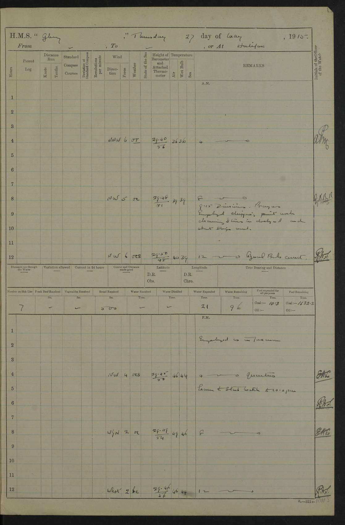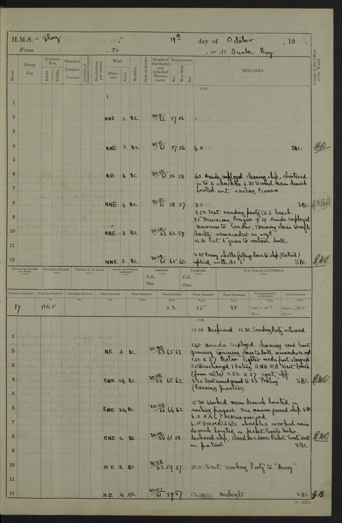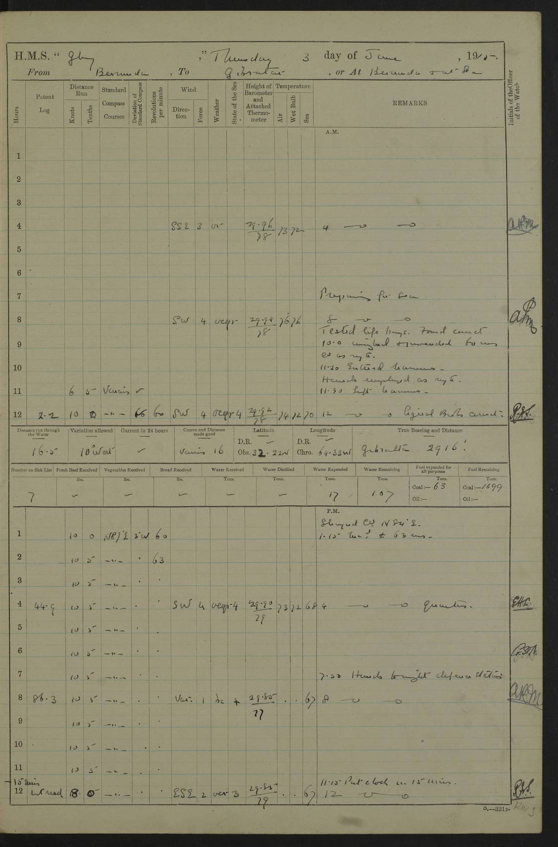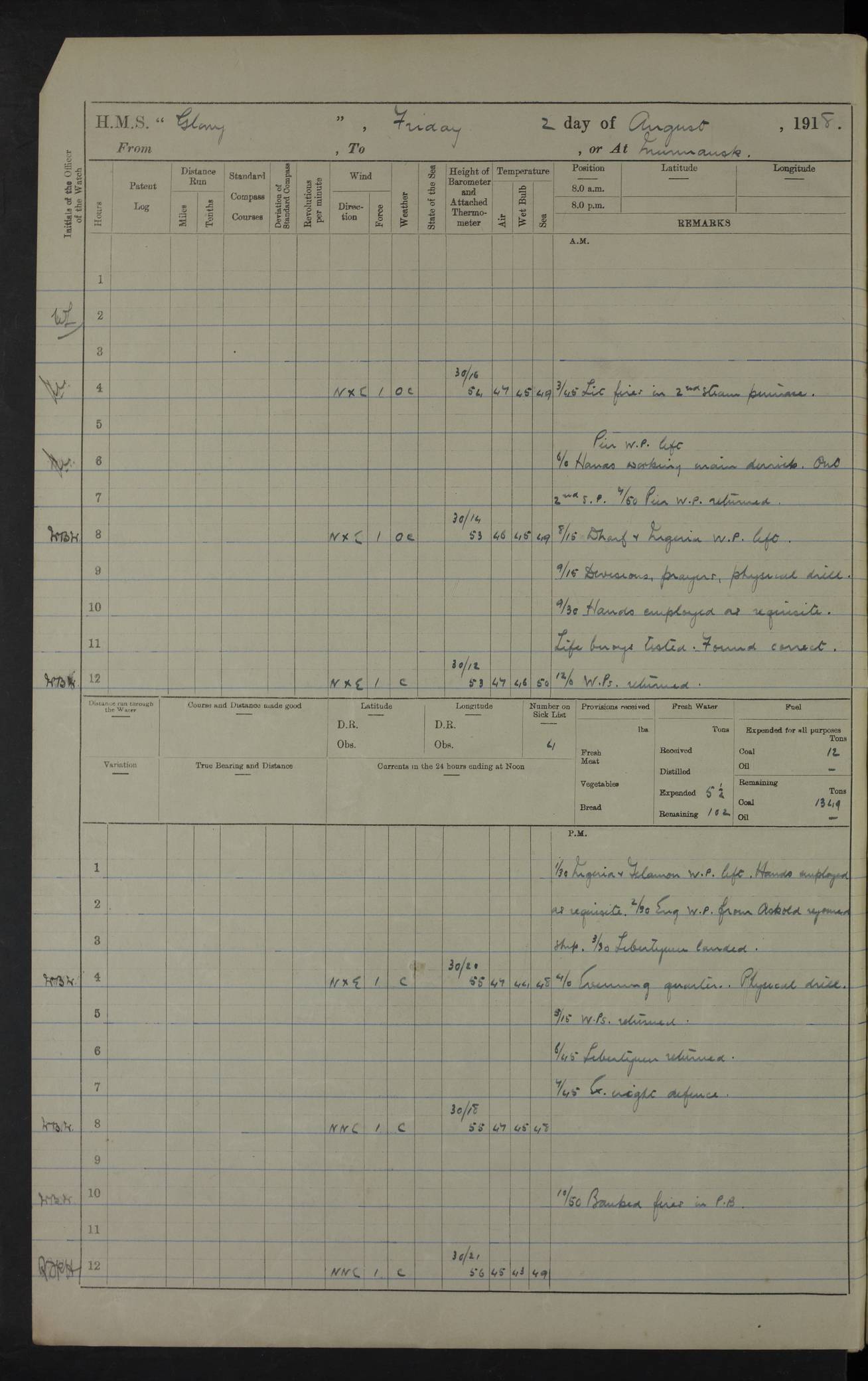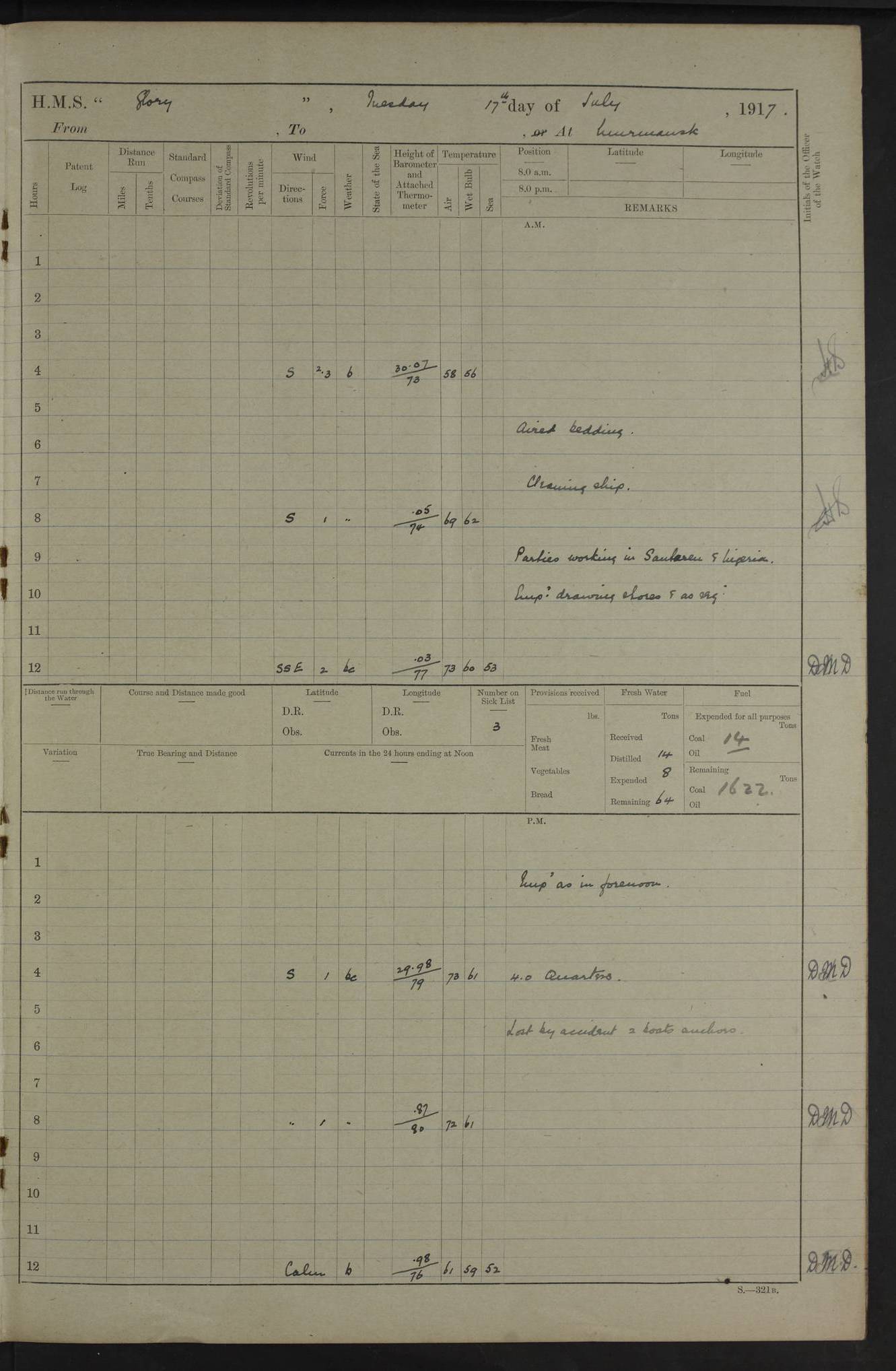 22 June 1915 At sea, Gibraltar to Lemnos Lat 36.1, Long -1.3 4.15am: Sighted land on starboard bow. 10.20am: Stopped port engine for repairs. 11.20am: proceeded with port engine. pm: a/c due to change in deviation. 10.00pm: Cape Tenez Light abeam, 18 miles. 4f73cd61a2fc8ea9030015f6: (https://s3.amazonaws.com:443/oldweather/ADM53-43015/0012_1.jpg) 23 June 1915 At sea, Gibraltar to Lemnos Lat 37.5, Long 4.8 Number on sick list: 4 5.00am: Secured from night defence stations. Placed anti-submarine guns. pm: Life saving appliances served out to men stationed in ? ?at abandon ship. 4f73cd61a2fc8ea9030015f7: (https://s3.amazonaws.com:443/oldweather/ADM53-43015/0013_0.jpg) 24 June 1915 At sea, Gibraltar to Lemnos Lat 37.4, Long 10.8 Position in log clearly bears no resemblance to the location of the ship. Position above is approximate and is based sighting of Zembra Island at 11.55am. 5.00am: Dispersed from night defence stations. Manned anti-submarine guns. am: Sighted two French torpedo boats. am: Torpedo boats passed to ~ No 362, 363. am: Sighted land on starboard beam. 11.55am: Zembra Island abeam, 25 miles. 2.00pm: Sighted Pantellaria S34ºE. 4.45pm: Pantellaria Light House abeam 12 miles. 4f73cd61a2fc8ea9030015f8: (https://s3.amazonaws.com:443/oldweather/ADM53-43015/0013_1.jpg) 25 June 1915 At sea, Gibraltar to Lemnos Lat 35.5, Long 16.7 2.10am: Gozo Light abeam 17 miles. 5.00am: Dispersed from night defence stations. Manned anti-submarine guns. 4f73cd61a2fc8ea9030015f9: (https://s3.amazonaws.com:443/oldweather/ADM53-43015/0014_0.jpg) 26 June 1915 At sea, Gibraltar to Lemnos Lat 35.5, Long 22.6 Number on sick list: 5 5.00am: Dispersed from night defence stations. Manned anti-submarine guns. am: Aired night clothing. am: marines at maxim practice on quarter deck. 2.00pm: Observed land on either bow. 3.00pm: Sighted French patrol destroyer. 4.15pm: Sighted French patrol destroyer. 9.40pm: Milo Peak N63ºW. 10.26pm: Polino Light abeam to port 5.5 miles. 4f73cd62a2fc8ea9030015fa: (https://s3.amazonaws.com:443/oldweather/ADM53-43015/0014_1.jpg) 27 June 1915 At sea and at Lemnos Lat 39.1, Long 24.4 From 0.50 to 3.05am sighting of multiple light houses. 3.50am: a/c to N39ºW and commenced to zig-zag. 5.00am: Dispersed from night defence stations and placed anti-submarine guns and look-outs. am: Lost overboard by accident Hazlewood fender, pat. 311, one in number. 10.30am: Held Divine Service onboard. pm: Met and signalled HMS Minerva on patrol duty. pm: Courses and speeds as requisite while waiting orders to approach Mudros. 3.00pm: Proceeded. 5.16pm: Increased to 90 revs, commenced to zig-zag. Course as requisite for Mudros. 7.00pm: Entered Mudros Bay. 7.47pm: Stopped. Let go port anchor in ‘M3’. 8.30pm: Darkened ship. pm: Manned one 6” and one 12 pdr. 4f73cd62a2fc8ea9030015fb: (https://s3.amazonaws.com:443/oldweather/ADM53-43015/0015_0.jpg) 28 June 1915 Mudros Bay, Lemnos Lat 39.89, Long 25.24 5,00am: HMS Vengeance entered harbour. HMS Vengeance was a pre-dreadnought of the Canopus class, launched in 1899 at Vickers, Barrow, and sold for scrapping in 1921. Details at http://en.wikipedia.org/wiki/HMS_Vengeance_(1899) . am/pm/: hands preparing for coaling and about ship’s work. pm: Collier Wabana secured alongside. 4f73cd62a2fc8ea9030015fc: (https://s3.amazonaws.com:443/oldweather/ADM53-43015/0015_1.jpg) 29 June 1915 Mudros Bay, Lemnos Lat 39.89, Long 25.24 5.15am: Commenced coaling. 2.00pm: Finished coaling. Collier left. 4f73cd62a2fc8ea9030015fd: (https://s3.amazonaws.com:443/oldweather/ADM53-43015/0016_0.jpg) 30 June 1915 Mudros Bay, Lemnos Lat 39.89, Long 25.24 am: Parties away sanding, and with fire engines onshore. am: Boats away disembarking troops. am: French Flagship Patrie sailed. The Patrie was a French pre-dreadnought, launched at La Seyne shipyard in 1903, and stricken in 1921. Details at http://en.wikipedia.org/wiki/French_battleship_Patrie . 6.30pm: Hands to bathe. 4f73cd63a2fc8ea9030015fe: (https://s3.amazonaws.com:443/oldweather/ADM53-43015/0016_1.jpg) 4f73cd63a2fc8ea9030015ff: (https://s3.amazonaws.com:443/oldweather/ADM53-43015/0017_0.jpg) 4f73cd63a2fc8ea903001600: (https://s3.amazonaws.com:443/oldweather/ADM53-43015/0017_1.jpg) 4f73cd63a2fc8ea903001601: (https://s3.amazonaws.com:443/oldweather/ADM53-43015/0018_0.jpg) 4f73cd64a2fc8ea903001602: (https://s3.amazonaws.com:443/oldweather/ADM53-43015/0018_1.jpg) LOGS FOR JULY 1915 From July to October 1915, HMS Glory spent her time at Port Mudros. Certain activities typically took place daily and are not generally noted in the pages below. These activities include: Lighting fires in the picket boat around 4am and drawing the fires in the late evening; Divisions at around 9–9.30am and Evening Quarters at 4pm; Darken ship at around 8.30pm; Daily ‘cleaning ship’, with variations thereof; SBC (for ‘Signal Books Correct’) at the watch changes. 4f73cd64a2fc8ea903001603: (https://s3.amazonaws.com:443/oldweather/ADM53-43016/0000_0.jpg) 4f73cd64a2fc8ea903001604: (https://s3.amazonaws.com:443/oldweather/ADM53-43016/0000_1.jpg) 4f73cd65a2fc8ea903001605: (https://s3.amazonaws.com:443/oldweather/ADM53-43016/0001_0.jpg) 4f73cd65a2fc8ea903001606: (https://s3.amazonaws.com:443/oldweather/ADM53-43016/0001_1.jpg) 1 July 1915 Port Mudros Lat 39.89, Long 25.24 6.30am: Landed working parties preparing boom defence ships. am: Discharged Acting Commander Rayne to Hector. Hector was a kite balloon ship. No further details readily available. 5.00pm: Tug T.10 made fast astern. 7.15pm: HMS Venerable went out. 7.30pm: HMS Chatham went out. HMS Chatham was a ‘Town’ cruiser and lead ship of her class. She was launched in 1911 at Chatham Dockyard and sold in 1926. Details at http://en.wikipedia.org/wiki/HMS_Chatham_(1911) . 4f73cd65a2fc8ea903001607: (https://s3.amazonaws.com:443/oldweather/ADM53-43016/0002_0.jpg) 2 July 1915 Port Mudros Lat 39.89, Long 25.24 5.35am: Landed working parties preparing boom defence ships. am/pm: Boom defence par
