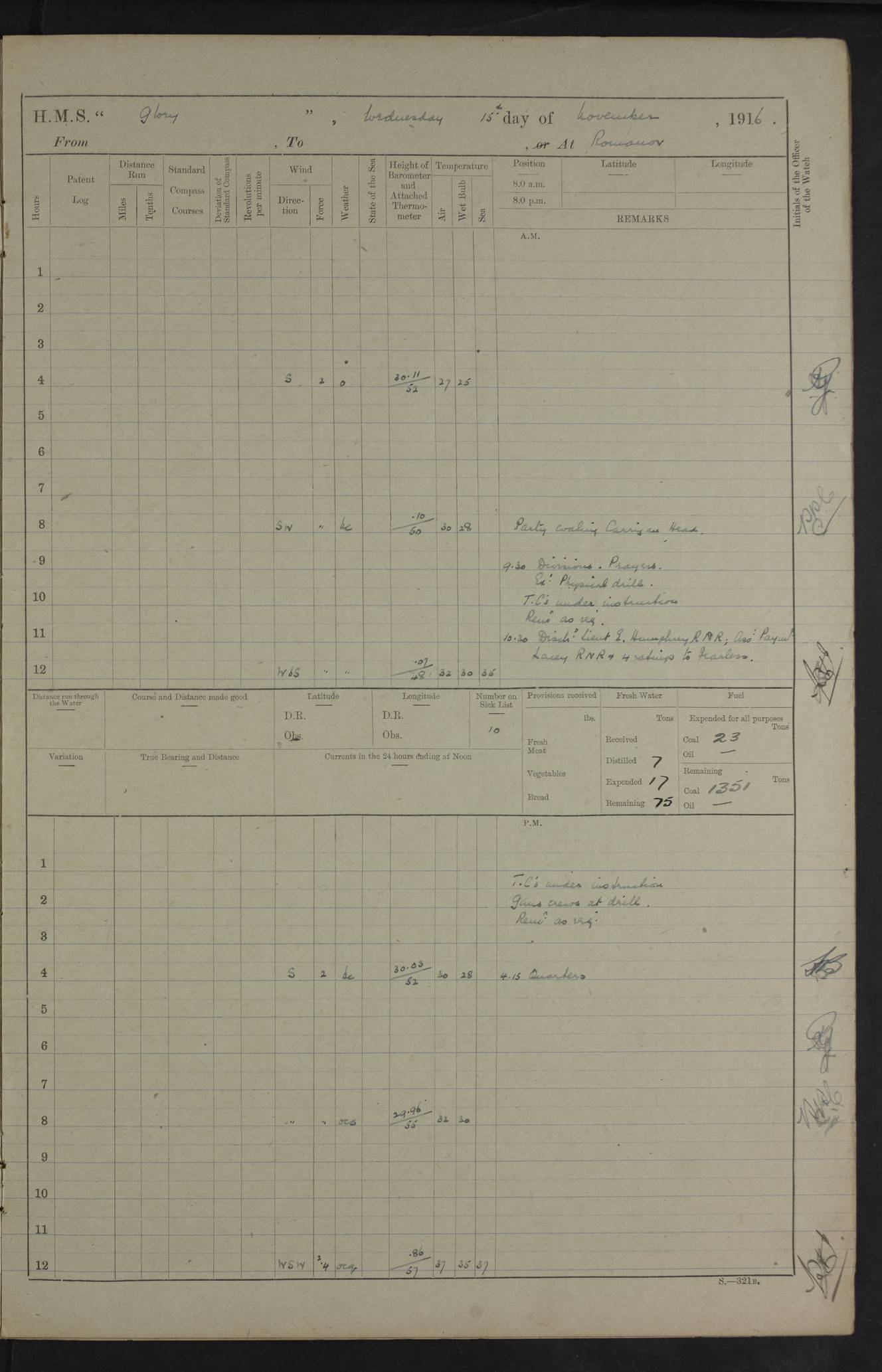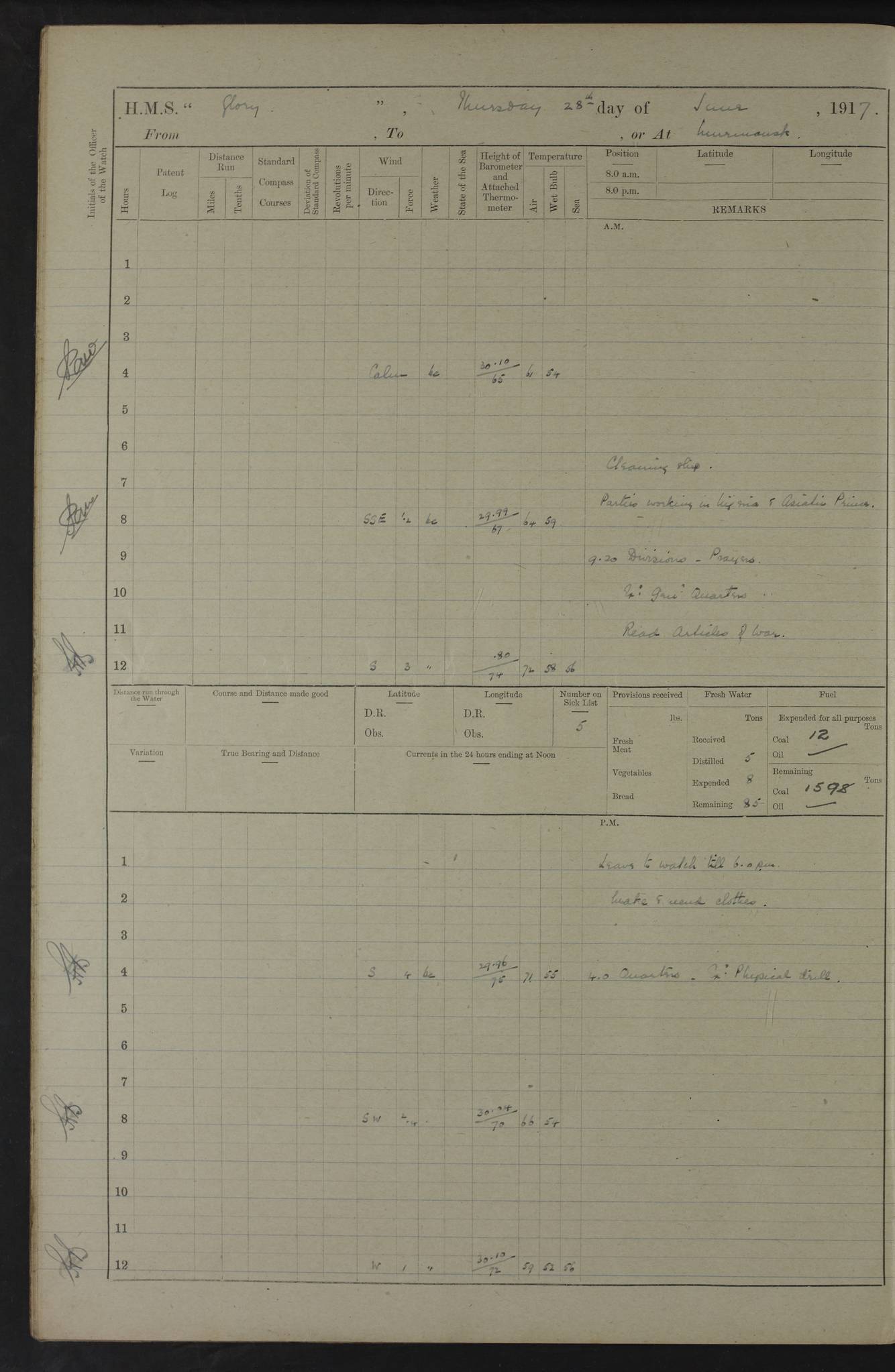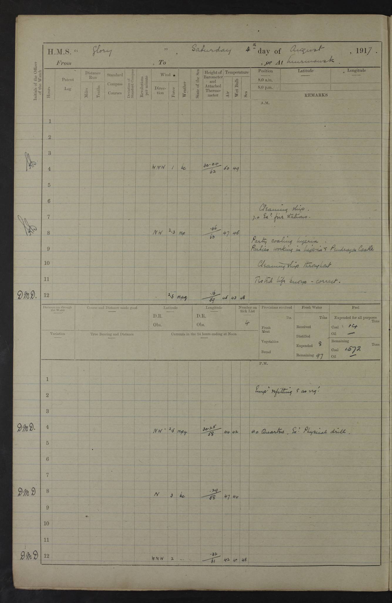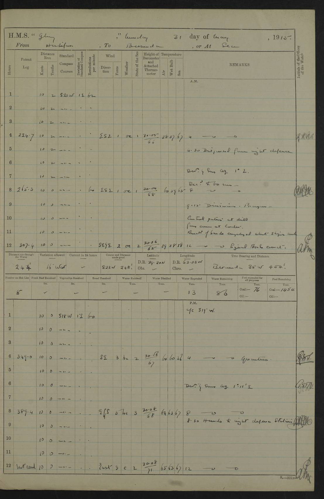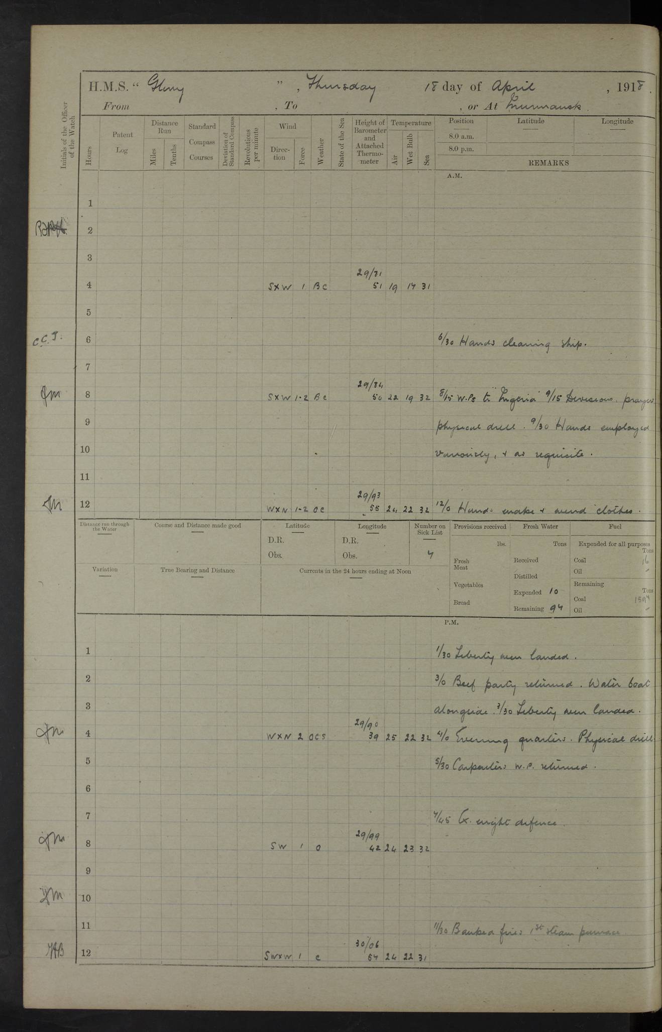 22 June 1915 At sea, Gibraltar to Lemnos Lat 36.1, Long -1.3 4.15am: Sighted land on starboard bow. 10.20am: Stopped port engine for repairs. 11.20am: proceeded with port engine. pm: a/c due to change in deviation. 10.00pm: Cape Tenez Light abeam, 18 miles. 4f73cd61a2fc8ea9030015f6: (https://s3.amazonaws.com:443/oldweather/ADM53-43015/0012_1.jpg) 23 June 1915 At sea, Gibraltar to Lemnos Lat 37.5, Long 4.8 Number on sick list: 4 5.00am: Secured from night defence stations. Placed anti-submarine guns. pm: Life saving appliances served out to men stationed in ? ?at abandon ship. 4f73cd61a2fc8ea9030015f7: (https://s3.amazonaws.com:443/oldweather/ADM53-43015/0013_0.jpg) 24 June 1915 At sea, Gibraltar to Lemnos Lat 37.4, Long 10.8 Position in log clearly bears no resemblance to the location of the ship. Position above is approximate and is based sighting of Zembra Island at 11.55am. 5.00am: Dispersed from night defence stations. Manned anti-submarine guns. am: Sighted two French torpedo boats. am: Torpedo boats passed to ~ No 362, 363. am: Sighted land on starboard beam. 11.55am: Zembra Island abeam, 25 miles. 2.00pm: Sighted Pantellaria S34ºE. 4.45pm: Pantellaria Light House abeam 12 miles. 4f73cd61a2fc8ea9030015f8: (https://s3.amazonaws.com:443/oldweather/ADM53-43015/0013_1.jpg) 25 June 1915 At sea, Gibraltar to Lemnos Lat 35.5, Long 16.7 2.10am: Gozo Light abeam 17 miles. 5.00am: Dispersed from night defence stations. Manned anti-submarine guns. 4f73cd61a2fc8ea9030015f9: (https://s3.amazonaws.com:443/oldweather/ADM53-43015/0014_0.jpg) 26 June 1915 At sea, Gibraltar to Lemnos Lat 35.5, Long 22.6 Number on sick list: 5 5.00am: Dispersed from night defence stations. Manned anti-submarine guns. am: Aired night clothing. am: marines at maxim practice on quarter deck. 2.00pm: Observed land on either bow. 3.00pm: Sighted French patrol destroyer. 4.15pm: Sighted French patrol destroyer. 9.40pm: Milo Peak N63ºW. 10.26pm: Polino Light abeam to port 5.5 miles. 4f73cd62a2fc8ea9030015fa: (https://s3.amazonaws.com:443/oldweather/ADM53-43015/0014_1.jpg) 27 June 1915 At sea and at Lemnos Lat 39.1, Long 24.4 From 0.50 to 3.05am sighting of multiple light houses. 3.50am: a/c to N39ºW and commenced to zig-zag. 5.00am: Dispersed from night defence stations and placed anti-submarine guns and look-outs. am: Lost overboard by accident Hazlewood fender, pat. 311, one in number. 10.30am: Held Divine Service onboard. pm: Met and signalled HMS Minerva on patrol duty. pm: Courses and speeds as requisite while waiting orders to approach Mudros. 3.00pm: Proceeded. 5.16pm: Increased to 90 revs, commenced to zig-zag. Course as requisite for Mudros. 7.00pm: Entered Mudros Bay. 7.47pm: Stopped. Let go port anchor in ‘M3’. 8.30pm: Darkened ship. pm: Manned one 6” and one 12 pdr. 4f73cd62a2fc8ea9030015fb: (https://s3.amazonaws.com:443/oldweather/ADM53-43015/0015_0.jpg) 28 June 1915 Mudros Bay, Lemnos Lat 39.89, Long 25.24 5,00am: HMS Vengeance entered harbour. HMS Vengeance was a pre-dreadnought of the Canopus class, launched in 1899 at Vickers, Barrow, and sold for scrapping in 1921. Details at http://en.wikipedia.org/wiki/HMS_Vengeance_(1899) . am/pm/: hands preparing for coaling and about ship’s work. pm: Collier Wabana secured alongside. 4f73cd62a2fc8ea9030015fc: (https://s3.amazonaws.com:443/oldweather/ADM53-43015/0015_1.jpg) 29 June 1915 Mudros Bay, Lemnos Lat 39.89, Long 25.24 5.15am: Commenced coaling. 2.00pm: Finished coaling. Collier left. 4f73cd62a2fc8ea9030015fd: (https://s3.amazonaws.com:443/oldweather/ADM53-43015/0016_0.jpg) 30 June 1915 Mudros Bay, Lemnos Lat 39.89, Long 25.24 am: Parties away sanding, and with fire engines onshore. am: Boats away disembarking troops. am: French Flagship Patrie sailed. The Patrie was a French pre-dreadnought, launched at La Seyne shipyard in 1903, and stricken in 1921. Details at http://en.wikipedia.org/wiki/French_battleship_Patrie . 6.30pm: Hands to bathe. 4f73cd63a2fc8ea9030015fe: (https://s3.amazonaws.com:443/oldweather/ADM53-43015/0016_1.jpg) 4f73cd63a2fc8ea9030015ff: (https://s3.amazonaws.com:443/oldweather/ADM53-43015/0017_0.jpg) 4f73cd63a2fc8ea903001600: (https://s3.amazonaws.com:443/oldweather/ADM53-43015/0017_1.jpg) 4f73cd63a2fc8ea903001601: (https://s3.amazonaws.com:443/oldweather/ADM53-43015/0018_0.jpg) 4f73cd64a2fc8ea903001602: (https://s3.amazonaws.com:443/oldweather/ADM53-43015/0018_1.jpg) LOGS FOR JULY 1915 From July to October 1915, HMS Glory spent her time at Port Mudros. Certain activities typically took place daily and are not generally noted in the pages below. These activities include: Lighting fires in the picket boat around 4am and drawing the fires in the late evening; Divisions at around 9–9.30am and Evening Quarters at 4pm; Darken ship at around 8.30pm; Daily ‘cleaning ship’, with variations thereof; SBC (for ‘Signal Books Correct’) at the watch changes. 4f73cd64a2fc8ea903001603: (https://s3.amazonaws.com:443/oldweather/ADM53-43016/0000_0.jpg) 4f73cd64a2fc8ea903001604: (https://s3.amazonaws.com:443/oldweather/ADM53-43016/0000_1.jpg) 4f73cd65a2fc8ea903001605: (https://s3.amazonaws.com:443/oldweather/ADM53-43016/0001_0.jpg) 4f73cd65a2fc8ea903001606: (https://s3.amazonaws.com:443/oldweather/ADM53-43016/0001_1.jpg) 1 July 1915 Port Mudros Lat 39.89, Long 25.24 6.30am: Landed working parties preparing boom defence ships. am: Discharged Acting Commander Rayne to Hector. Hector was a kite balloon ship. No further details readily available. 5.00pm: Tug T.10 made fast astern. 7.15pm: HMS Venerable went out. 7.30pm: HMS Chatham went out. HMS Chatham was a ‘Town’ cruiser and lead ship of her class. She was launched in 1911 at Chatham Dockyard and sold in 1926. Details at http://en.wikipedia.org/wiki/HMS_Chatham_(1911) . 4f73cd65a2fc8ea903001607: (https://s3.amazonaws.com:443/oldweather/ADM53-43016/0002_0.jpg) 2 July 1915 Port Mudros Lat 39.89, Long 25.24 5.35am: Landed working parties preparing boom defence ships. am/pm: Boom defence par