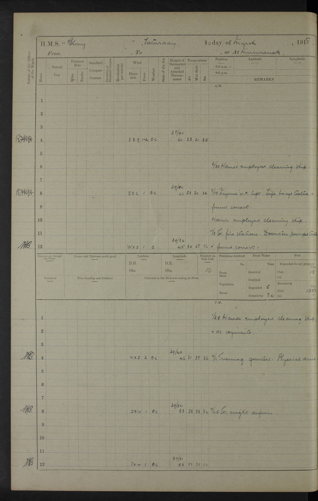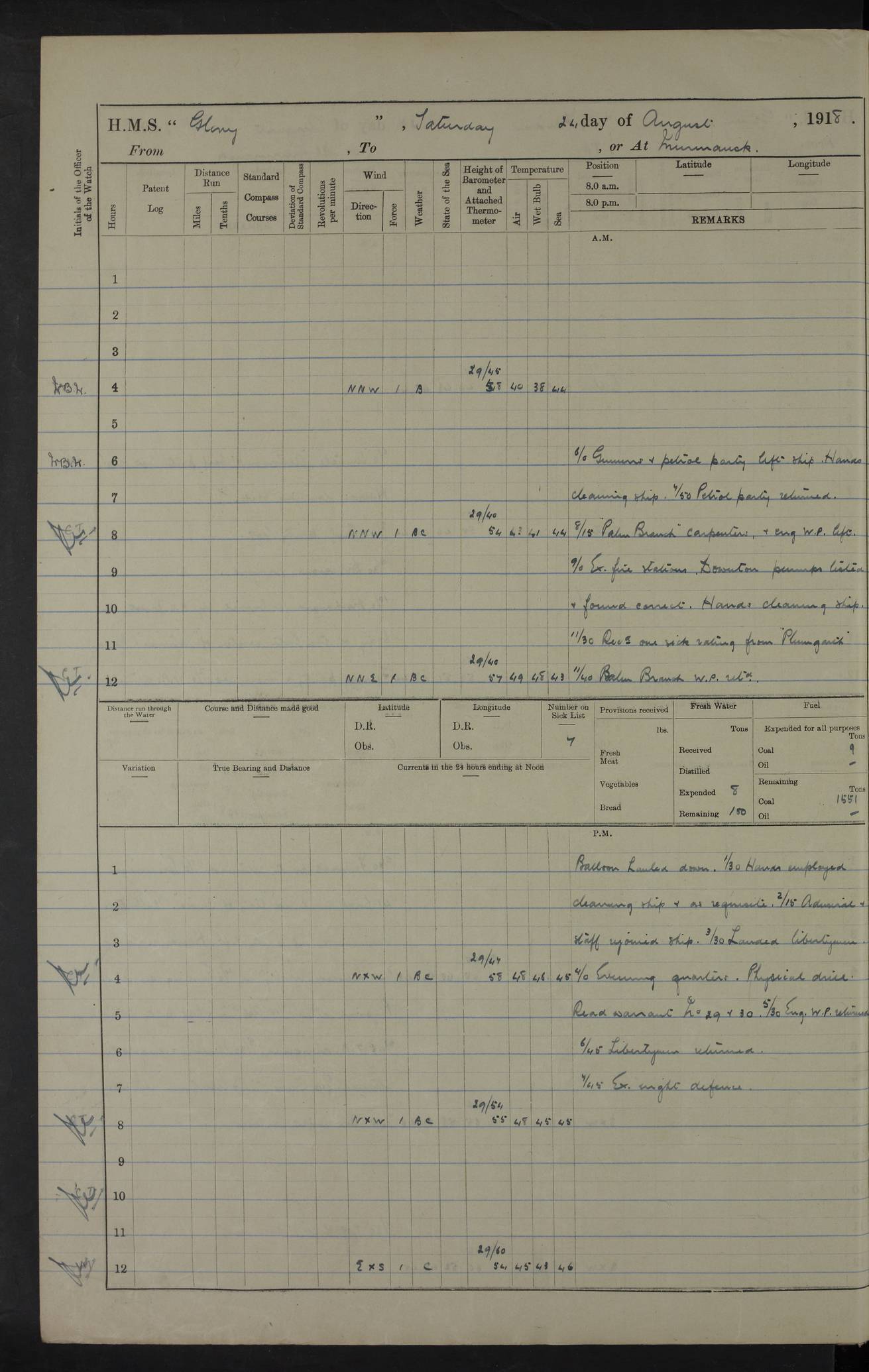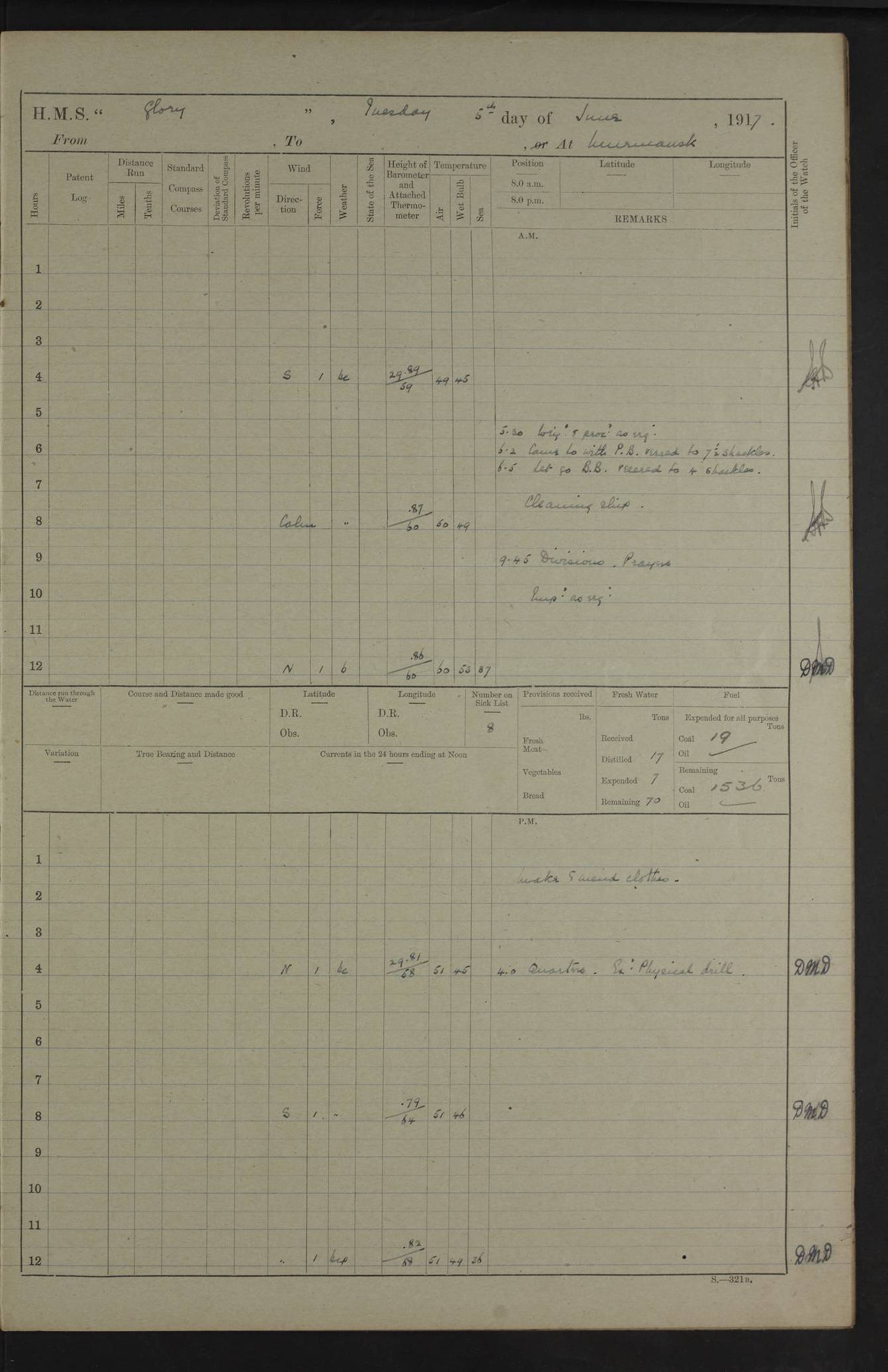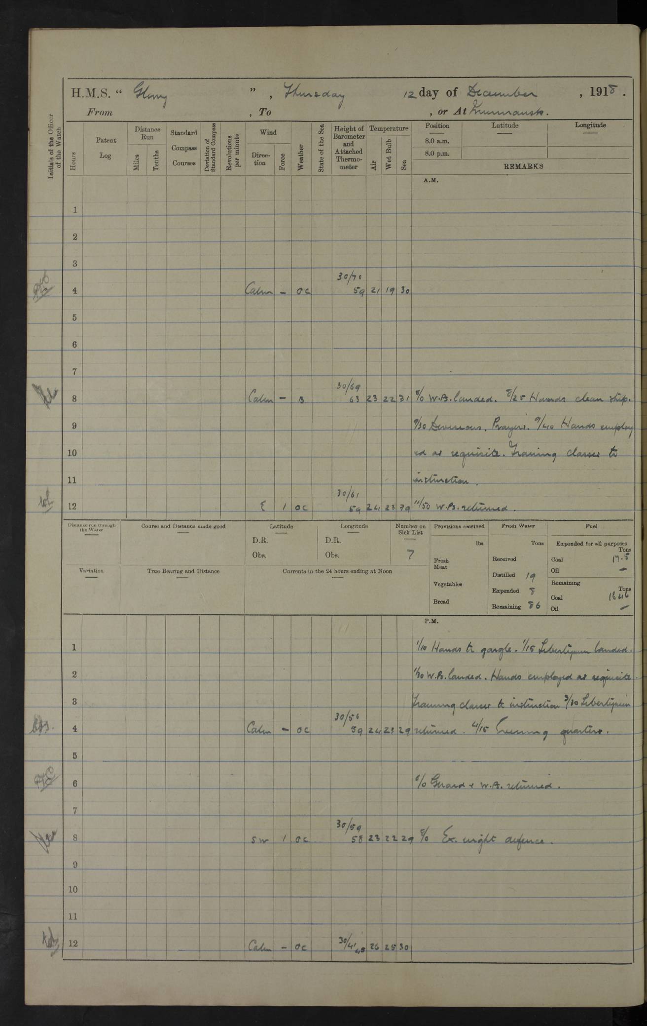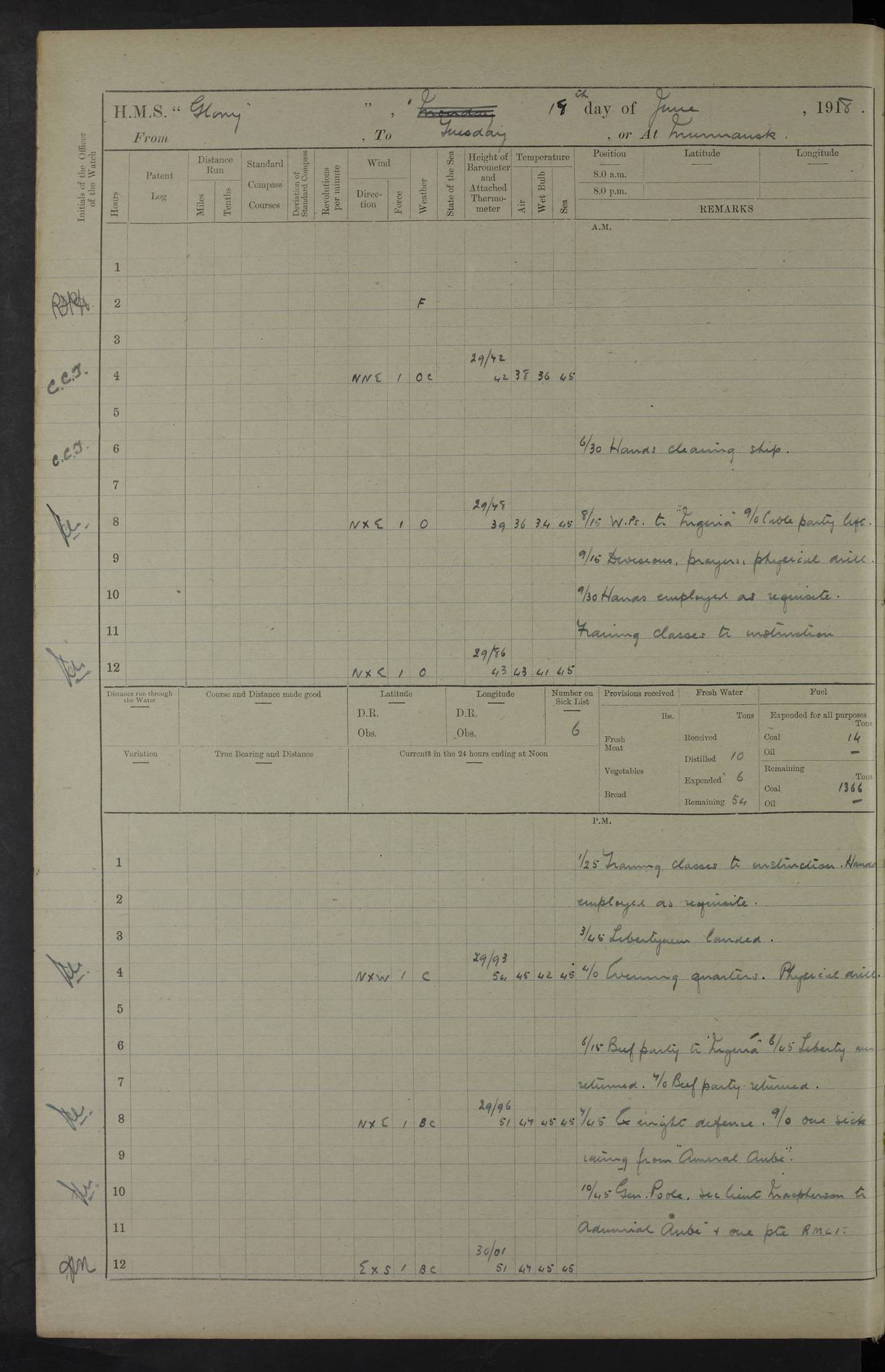 22 June 1915 At sea, Gibraltar to Lemnos Lat 36.1, Long -1.3 4.15am: Sighted land on starboard bow. 10.20am: Stopped port engine for repairs. 11.20am: proceeded with port engine. pm: a/c due to change in deviation. 10.00pm: Cape Tenez Light abeam, 18 miles. 4f73cd61a2fc8ea9030015f6: (https://s3.amazonaws.com:443/oldweather/ADM53-43015/0012_1.jpg) 23 June 1915 At sea, Gibraltar to Lemnos Lat 37.5, Long 4.8 Number on sick list: 4 5.00am: Secured from night defence stations. Placed anti-submarine guns. pm: Life saving appliances served out to men stationed in ? ?at abandon ship. 4f73cd61a2fc8ea9030015f7: (https://s3.amazonaws.com:443/oldweather/ADM53-43015/0013_0.jpg) 24 June 1915 At sea, Gibraltar to Lemnos Lat 37.4, Long 10.8 Position in log clearly bears no resemblance to the location of the ship. Position above is approximate and is based sighting of Zembra Island at 11.55am. 5.00am: Dispersed from night defence stations. Manned anti-submarine guns. am: Sighted two French torpedo boats. am: Torpedo boats passed to ~ No 362, 363. am: Sighted land on starboard beam. 11.55am: Zembra Island abeam, 25 miles. 2.00pm: Sighted Pantellaria S34ºE. 4.45pm: Pantellaria Light House abeam 12 miles. 4f73cd61a2fc8ea9030015f8: (https://s3.amazonaws.com:443/oldweather/ADM53-43015/0013_1.jpg) 25 June 1915 At sea, Gibraltar to Lemnos Lat 35.5, Long 16.7 2.10am: Gozo Light abeam 17 miles. 5.00am: Dispersed from night defence stations. Manned anti-submarine guns. 4f73cd61a2fc8ea9030015f9: (https://s3.amazonaws.com:443/oldweather/ADM53-43015/0014_0.jpg) 26 June 1915 At sea, Gibraltar to Lemnos Lat 35.5, Long 22.6 Number on sick list: 5 5.00am: Dispersed from night defence stations. Manned anti-submarine guns. am: Aired night clothing. am: marines at maxim practice on quarter deck. 2.00pm: Observed land on either bow. 3.00pm: Sighted French patrol destroyer. 4.15pm: Sighted French patrol destroyer. 9.40pm: Milo Peak N63ºW. 10.26pm: Polino Light abeam to port 5.5 miles. 4f73cd62a2fc8ea9030015fa: (https://s3.amazonaws.com:443/oldweather/ADM53-43015/0014_1.jpg) 27 June 1915 At sea and at Lemnos Lat 39.1, Long 24.4 From 0.50 to 3.05am sighting of multiple light houses. 3.50am: a/c to N39ºW and commenced to zig-zag. 5.00am: Dispersed from night defence stations and placed anti-submarine guns and look-outs. am: Lost overboard by accident Hazlewood fender, pat. 311, one in number. 10.30am: Held Divine Service onboard. pm: Met and signalled HMS Minerva on patrol duty. pm: Courses and speeds as requisite while waiting orders to approach Mudros. 3.00pm: Proceeded. 5.16pm: Increased to 90 revs, commenced to zig-zag. Course as requisite for Mudros. 7.00pm: Entered Mudros Bay. 7.47pm: Stopped. Let go port anchor in ‘M3’. 8.30pm: Darkened ship. pm: Manned one 6” and one 12 pdr. 4f73cd62a2fc8ea9030015fb: (https://s3.amazonaws.com:443/oldweather/ADM53-43015/0015_0.jpg) 28 June 1915 Mudros Bay, Lemnos Lat 39.89, Long 25.24 5,00am: HMS Vengeance entered harbour. HMS Vengeance was a pre-dreadnought of the Canopus class, launched in 1899 at Vickers, Barrow, and sold for scrapping in 1921. Details at http://en.wikipedia.org/wiki/HMS_Vengeance_(1899) . am/pm/: hands preparing for coaling and about ship’s work. pm: Collier Wabana secured alongside. 4f73cd62a2fc8ea9030015fc: (https://s3.amazonaws.com:443/oldweather/ADM53-43015/0015_1.jpg) 29 June 1915 Mudros Bay, Lemnos Lat 39.89, Long 25.24 5.15am: Commenced coaling. 2.00pm: Finished coaling. Collier left. 4f73cd62a2fc8ea9030015fd: (https://s3.amazonaws.com:443/oldweather/ADM53-43015/0016_0.jpg) 30 June 1915 Mudros Bay, Lemnos Lat 39.89, Long 25.24 am: Parties away sanding, and with fire engines onshore. am: Boats away disembarking troops. am: French Flagship Patrie sailed. The Patrie was a French pre-dreadnought, launched at La Seyne shipyard in 1903, and stricken in 1921. Details at http://en.wikipedia.org/wiki/French_battleship_Patrie . 6.30pm: Hands to bathe. 4f73cd63a2fc8ea9030015fe: (https://s3.amazonaws.com:443/oldweather/ADM53-43015/0016_1.jpg) 4f73cd63a2fc8ea9030015ff: (https://s3.amazonaws.com:443/oldweather/ADM53-43015/0017_0.jpg) 4f73cd63a2fc8ea903001600: (https://s3.amazonaws.com:443/oldweather/ADM53-43015/0017_1.jpg) 4f73cd63a2fc8ea903001601: (https://s3.amazonaws.com:443/oldweather/ADM53-43015/0018_0.jpg) 4f73cd64a2fc8ea903001602: (https://s3.amazonaws.com:443/oldweather/ADM53-43015/0018_1.jpg) LOGS FOR JULY 1915 From July to October 1915, HMS Glory spent her time at Port Mudros. Certain activities typically took place daily and are not generally noted in the pages below. These activities include: Lighting fires in the picket boat around 4am and drawing the fires in the late evening; Divisions at around 9–9.30am and Evening Quarters at 4pm; Darken ship at around 8.30pm; Daily ‘cleaning ship’, with variations thereof; SBC (for ‘Signal Books Correct’) at the watch changes. 4f73cd64a2fc8ea903001603: (https://s3.amazonaws.com:443/oldweather/ADM53-43016/0000_0.jpg) 4f73cd64a2fc8ea903001604: (https://s3.amazonaws.com:443/oldweather/ADM53-43016/0000_1.jpg) 4f73cd65a2fc8ea903001605: (https://s3.amazonaws.com:443/oldweather/ADM53-43016/0001_0.jpg) 4f73cd65a2fc8ea903001606: (https://s3.amazonaws.com:443/oldweather/ADM53-43016/0001_1.jpg) 1 July 1915 Port Mudros Lat 39.89, Long 25.24 6.30am: Landed working parties preparing boom defence ships. am: Discharged Acting Commander Rayne to Hector. Hector was a kite balloon ship. No further details readily available. 5.00pm: Tug T.10 made fast astern. 7.15pm: HMS Venerable went out. 7.30pm: HMS Chatham went out. HMS Chatham was a ‘Town’ cruiser and lead ship of her class. She was launched in 1911 at Chatham Dockyard and sold in 1926. Details at http://en.wikipedia.org/wiki/HMS_Chatham_(1911) . 4f73cd65a2fc8ea903001607: (https://s3.amazonaws.com:443/oldweather/ADM53-43016/0002_0.jpg) 2 July 1915 Port Mudros Lat 39.89, Long 25.24 5.35am: Landed working parties preparing boom defence ships. am/pm: Boom defence par