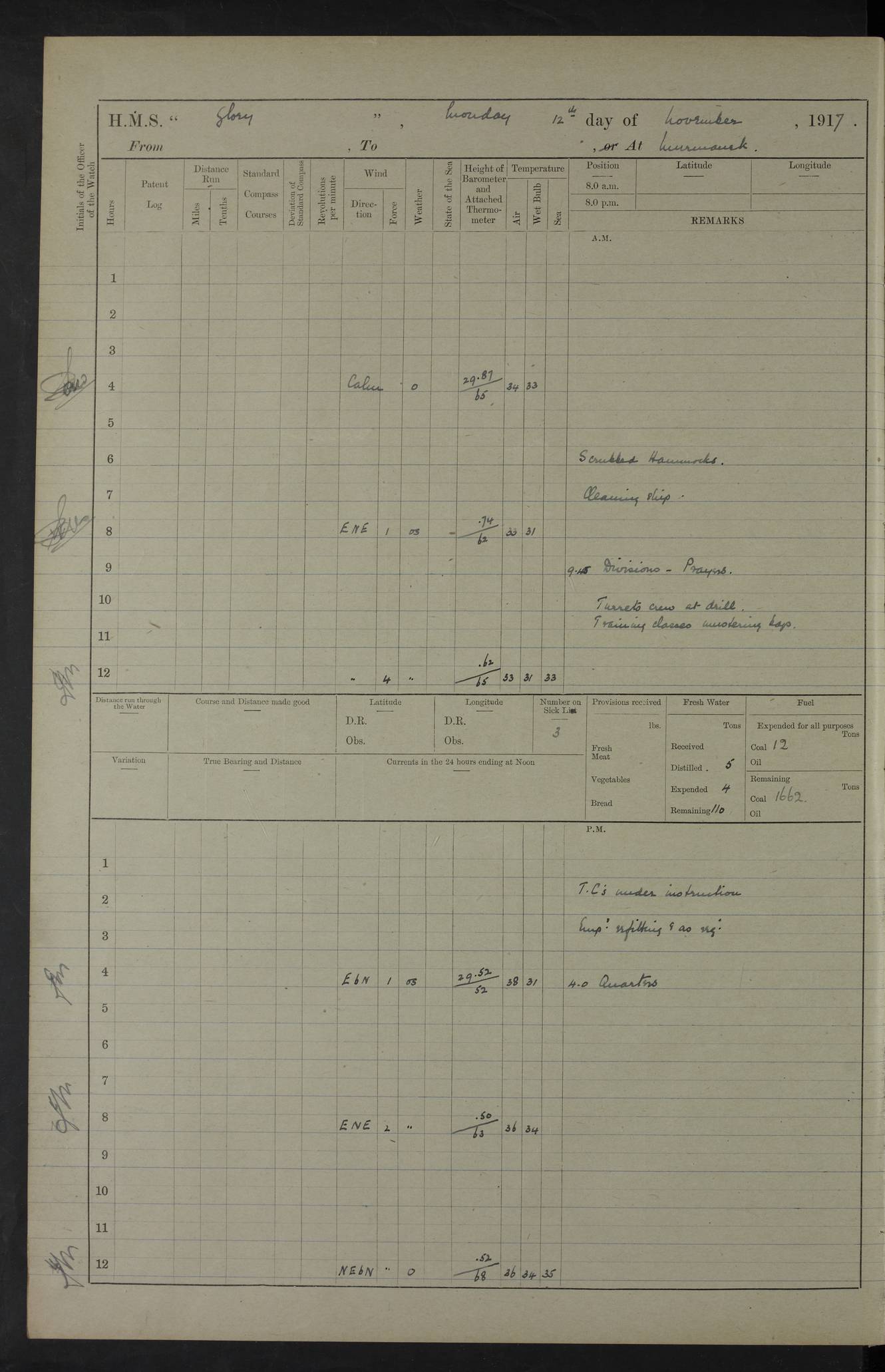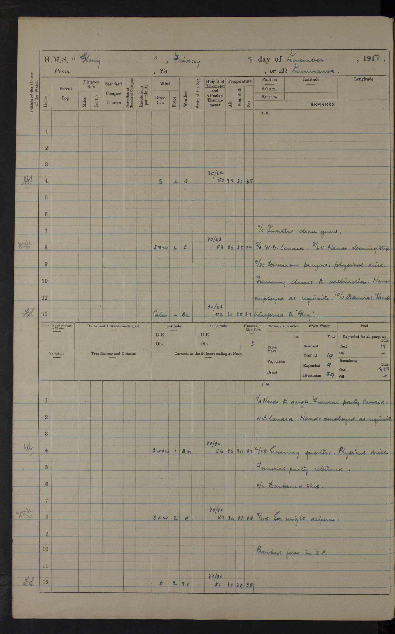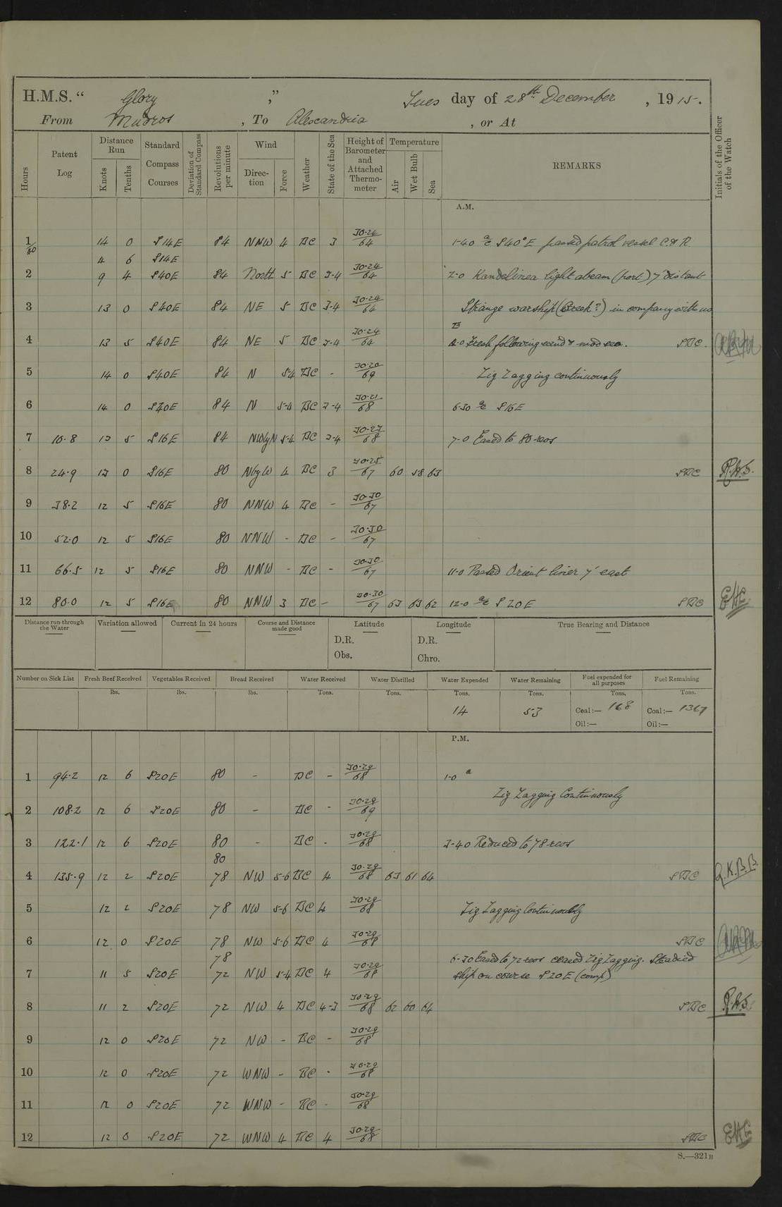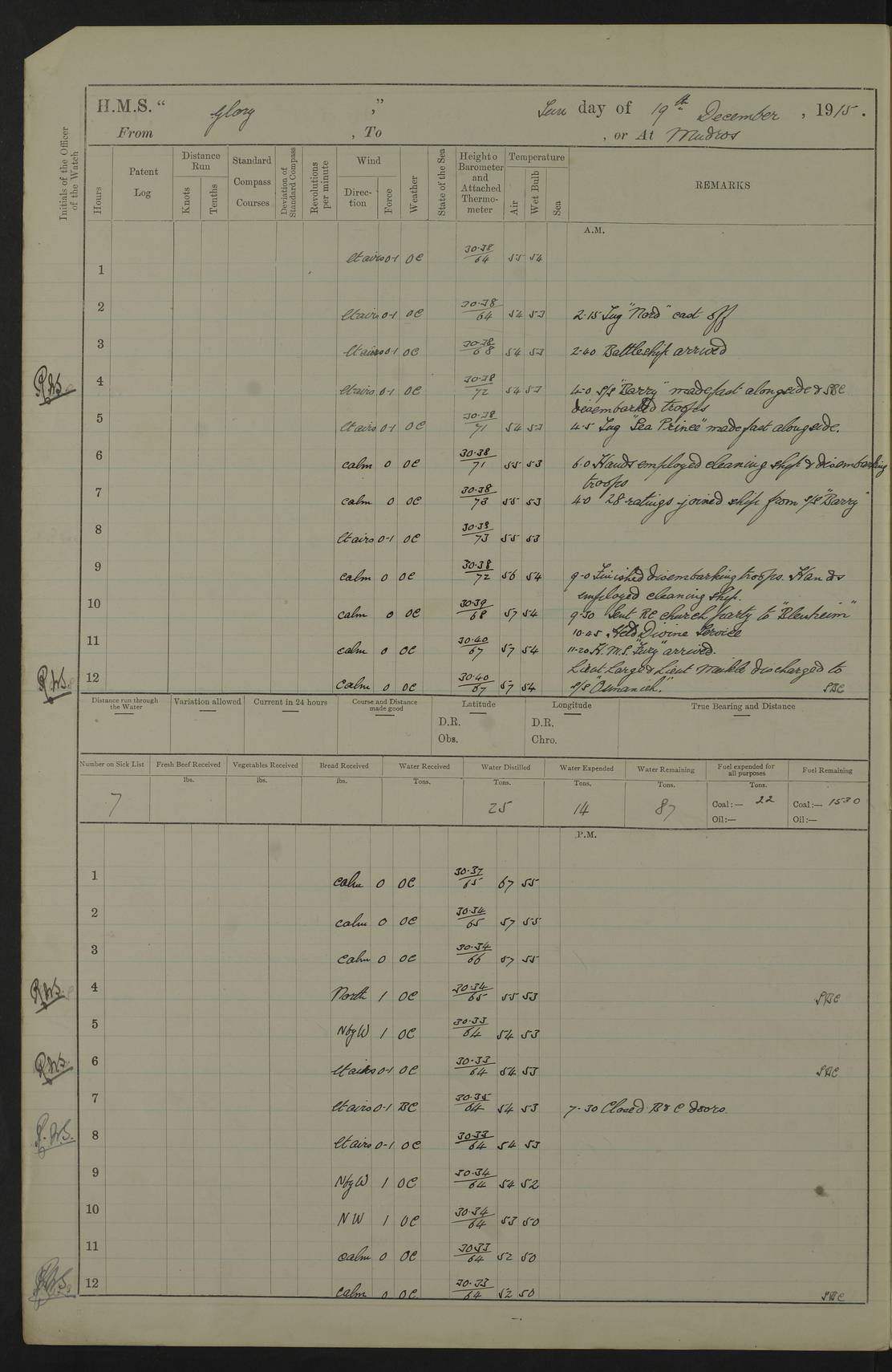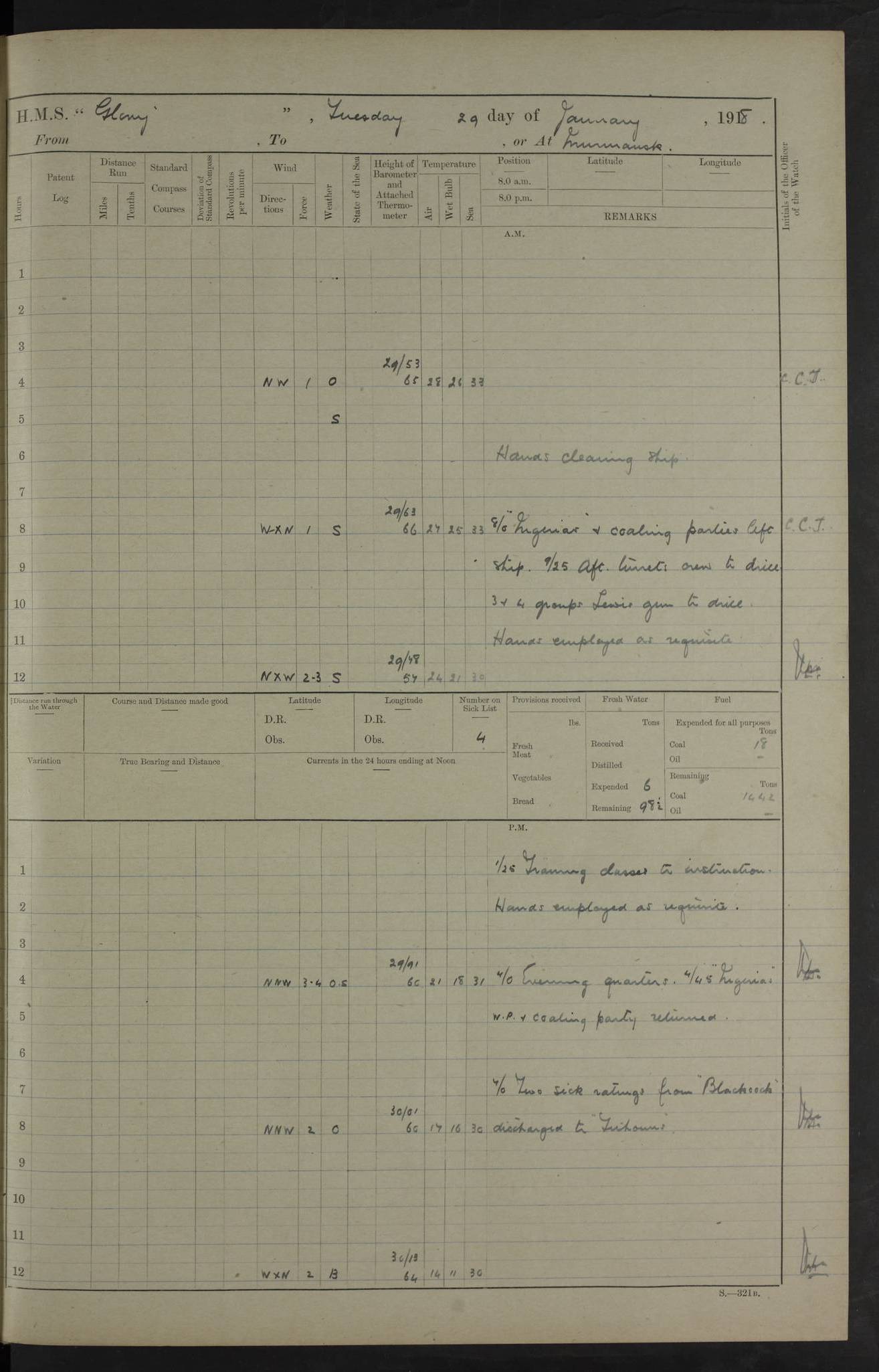 22 June 1915 At sea, Gibraltar to Lemnos Lat 36.1, Long -1.3 4.15am: Sighted land on starboard bow. 10.20am: Stopped port engine for repairs. 11.20am: proceeded with port engine. pm: a/c due to change in deviation. 10.00pm: Cape Tenez Light abeam, 18 miles. 4f73cd61a2fc8ea9030015f6: (https://s3.amazonaws.com:443/oldweather/ADM53-43015/0012_1.jpg) 23 June 1915 At sea, Gibraltar to Lemnos Lat 37.5, Long 4.8 Number on sick list: 4 5.00am: Secured from night defence stations. Placed anti-submarine guns. pm: Life saving appliances served out to men stationed in ? ?at abandon ship. 4f73cd61a2fc8ea9030015f7: (https://s3.amazonaws.com:443/oldweather/ADM53-43015/0013_0.jpg) 24 June 1915 At sea, Gibraltar to Lemnos Lat 37.4, Long 10.8 Position in log clearly bears no resemblance to the location of the ship. Position above is approximate and is based sighting of Zembra Island at 11.55am. 5.00am: Dispersed from night defence stations. Manned anti-submarine guns. am: Sighted two French torpedo boats. am: Torpedo boats passed to ~ No 362, 363. am: Sighted land on starboard beam. 11.55am: Zembra Island abeam, 25 miles. 2.00pm: Sighted Pantellaria S34ºE. 4.45pm: Pantellaria Light House abeam 12 miles. 4f73cd61a2fc8ea9030015f8: (https://s3.amazonaws.com:443/oldweather/ADM53-43015/0013_1.jpg) 25 June 1915 At sea, Gibraltar to Lemnos Lat 35.5, Long 16.7 2.10am: Gozo Light abeam 17 miles. 5.00am: Dispersed from night defence stations. Manned anti-submarine guns. 4f73cd61a2fc8ea9030015f9: (https://s3.amazonaws.com:443/oldweather/ADM53-43015/0014_0.jpg) 26 June 1915 At sea, Gibraltar to Lemnos Lat 35.5, Long 22.6 Number on sick list: 5 5.00am: Dispersed from night defence stations. Manned anti-submarine guns. am: Aired night clothing. am: marines at maxim practice on quarter deck. 2.00pm: Observed land on either bow. 3.00pm: Sighted French patrol destroyer. 4.15pm: Sighted French patrol destroyer. 9.40pm: Milo Peak N63ºW. 10.26pm: Polino Light abeam to port 5.5 miles. 4f73cd62a2fc8ea9030015fa: (https://s3.amazonaws.com:443/oldweather/ADM53-43015/0014_1.jpg) 27 June 1915 At sea and at Lemnos Lat 39.1, Long 24.4 From 0.50 to 3.05am sighting of multiple light houses. 3.50am: a/c to N39ºW and commenced to zig-zag. 5.00am: Dispersed from night defence stations and placed anti-submarine guns and look-outs. am: Lost overboard by accident Hazlewood fender, pat. 311, one in number. 10.30am: Held Divine Service onboard. pm: Met and signalled HMS Minerva on patrol duty. pm: Courses and speeds as requisite while waiting orders to approach Mudros. 3.00pm: Proceeded. 5.16pm: Increased to 90 revs, commenced to zig-zag. Course as requisite for Mudros. 7.00pm: Entered Mudros Bay. 7.47pm: Stopped. Let go port anchor in ‘M3’. 8.30pm: Darkened ship. pm: Manned one 6” and one 12 pdr. 4f73cd62a2fc8ea9030015fb: (https://s3.amazonaws.com:443/oldweather/ADM53-43015/0015_0.jpg) 28 June 1915 Mudros Bay, Lemnos Lat 39.89, Long 25.24 5,00am: HMS Vengeance entered harbour. HMS Vengeance was a pre-dreadnought of the Canopus class, launched in 1899 at Vickers, Barrow, and sold for scrapping in 1921. Details at http://en.wikipedia.org/wiki/HMS_Vengeance_(1899) . am/pm/: hands preparing for coaling and about ship’s work. pm: Collier Wabana secured alongside. 4f73cd62a2fc8ea9030015fc: (https://s3.amazonaws.com:443/oldweather/ADM53-43015/0015_1.jpg) 29 June 1915 Mudros Bay, Lemnos Lat 39.89, Long 25.24 5.15am: Commenced coaling. 2.00pm: Finished coaling. Collier left. 4f73cd62a2fc8ea9030015fd: (https://s3.amazonaws.com:443/oldweather/ADM53-43015/0016_0.jpg) 30 June 1915 Mudros Bay, Lemnos Lat 39.89, Long 25.24 am: Parties away sanding, and with fire engines onshore. am: Boats away disembarking troops. am: French Flagship Patrie sailed. The Patrie was a French pre-dreadnought, launched at La Seyne shipyard in 1903, and stricken in 1921. Details at http://en.wikipedia.org/wiki/French_battleship_Patrie . 6.30pm: Hands to bathe. 4f73cd63a2fc8ea9030015fe: (https://s3.amazonaws.com:443/oldweather/ADM53-43015/0016_1.jpg) 4f73cd63a2fc8ea9030015ff: (https://s3.amazonaws.com:443/oldweather/ADM53-43015/0017_0.jpg) 4f73cd63a2fc8ea903001600: (https://s3.amazonaws.com:443/oldweather/ADM53-43015/0017_1.jpg) 4f73cd63a2fc8ea903001601: (https://s3.amazonaws.com:443/oldweather/ADM53-43015/0018_0.jpg) 4f73cd64a2fc8ea903001602: (https://s3.amazonaws.com:443/oldweather/ADM53-43015/0018_1.jpg) LOGS FOR JULY 1915 From July to October 1915, HMS Glory spent her time at Port Mudros. Certain activities typically took place daily and are not generally noted in the pages below. These activities include: Lighting fires in the picket boat around 4am and drawing the fires in the late evening; Divisions at around 9–9.30am and Evening Quarters at 4pm; Darken ship at around 8.30pm; Daily ‘cleaning ship’, with variations thereof; SBC (for ‘Signal Books Correct’) at the watch changes. 4f73cd64a2fc8ea903001603: (https://s3.amazonaws.com:443/oldweather/ADM53-43016/0000_0.jpg) 4f73cd64a2fc8ea903001604: (https://s3.amazonaws.com:443/oldweather/ADM53-43016/0000_1.jpg) 4f73cd65a2fc8ea903001605: (https://s3.amazonaws.com:443/oldweather/ADM53-43016/0001_0.jpg) 4f73cd65a2fc8ea903001606: (https://s3.amazonaws.com:443/oldweather/ADM53-43016/0001_1.jpg) 1 July 1915 Port Mudros Lat 39.89, Long 25.24 6.30am: Landed working parties preparing boom defence ships. am: Discharged Acting Commander Rayne to Hector. Hector was a kite balloon ship. No further details readily available. 5.00pm: Tug T.10 made fast astern. 7.15pm: HMS Venerable went out. 7.30pm: HMS Chatham went out. HMS Chatham was a ‘Town’ cruiser and lead ship of her class. She was launched in 1911 at Chatham Dockyard and sold in 1926. Details at http://en.wikipedia.org/wiki/HMS_Chatham_(1911) . 4f73cd65a2fc8ea903001607: (https://s3.amazonaws.com:443/oldweather/ADM53-43016/0002_0.jpg) 2 July 1915 Port Mudros Lat 39.89, Long 25.24 5.35am: Landed working parties preparing boom defence ships. am/pm: Boom defence par