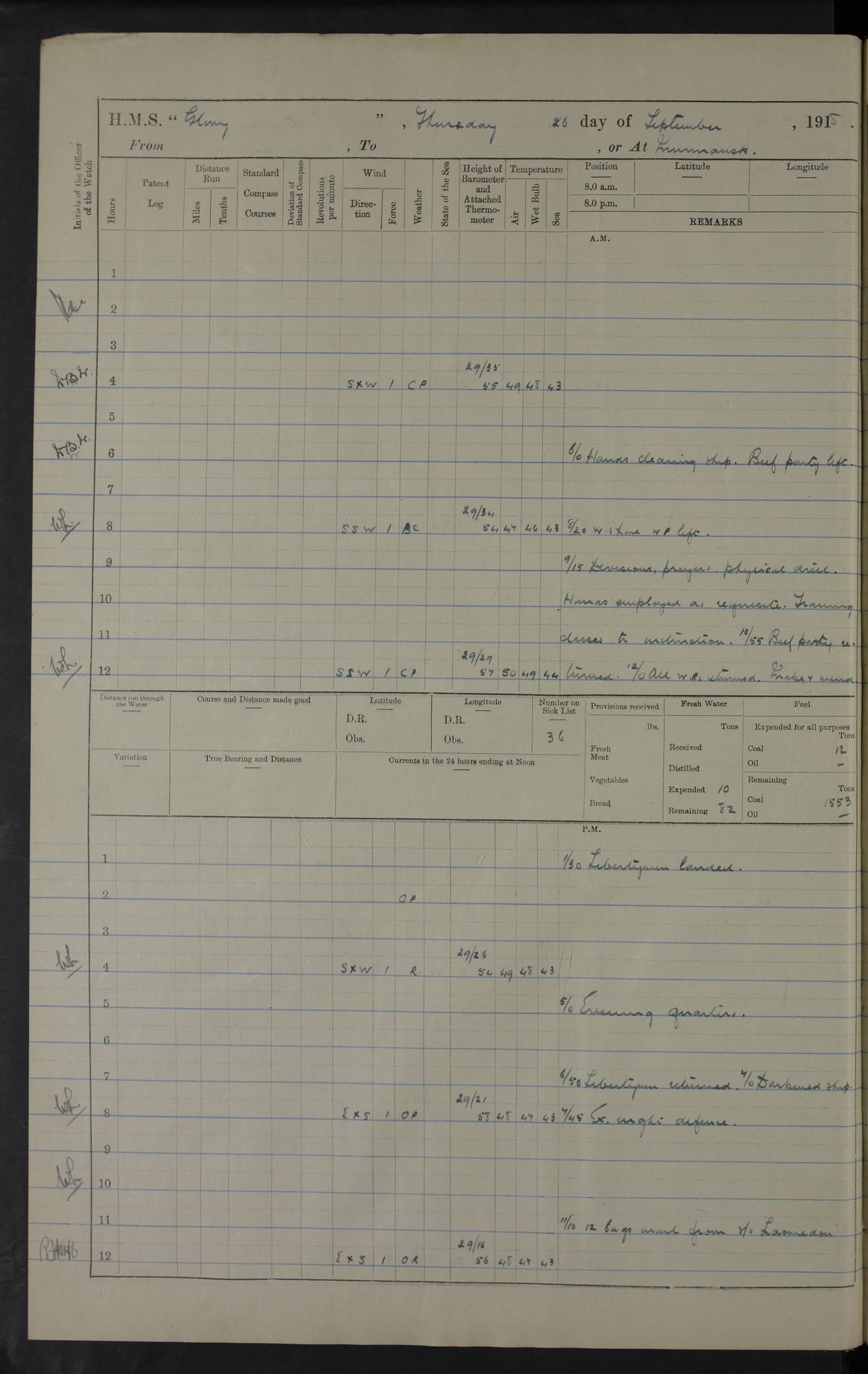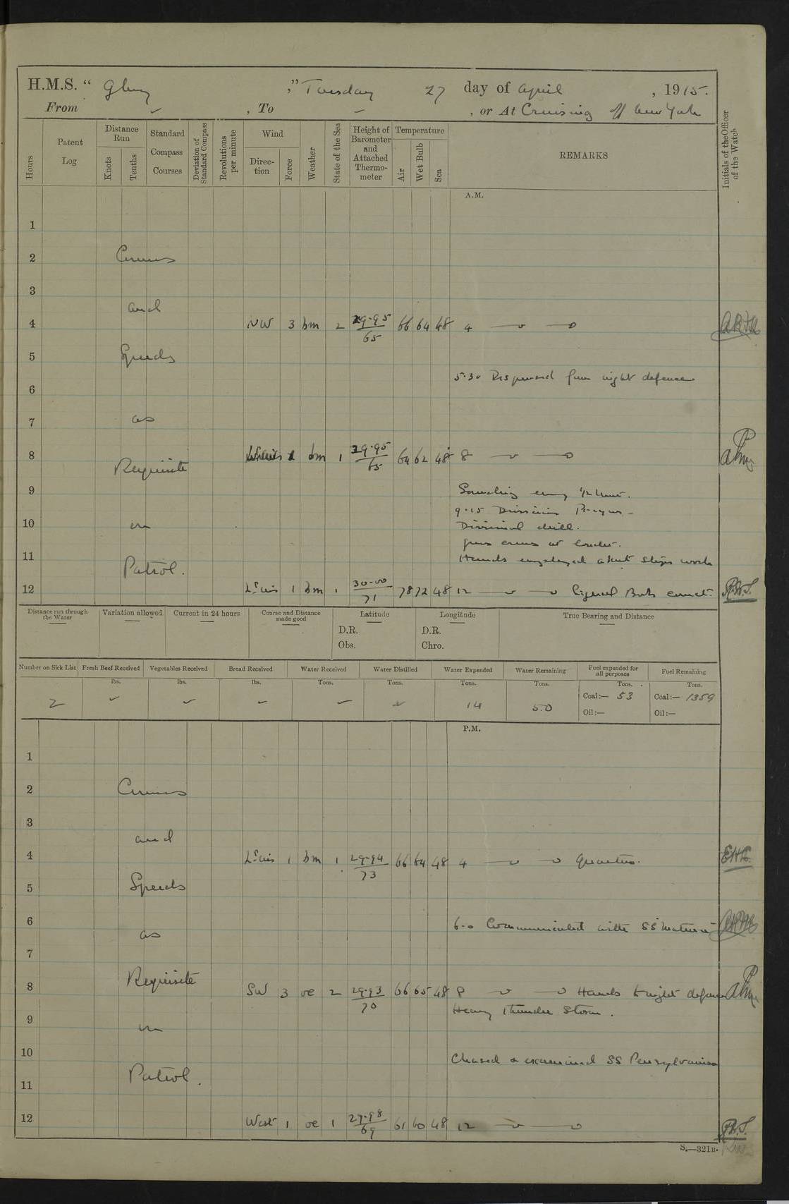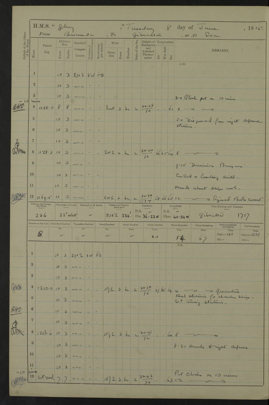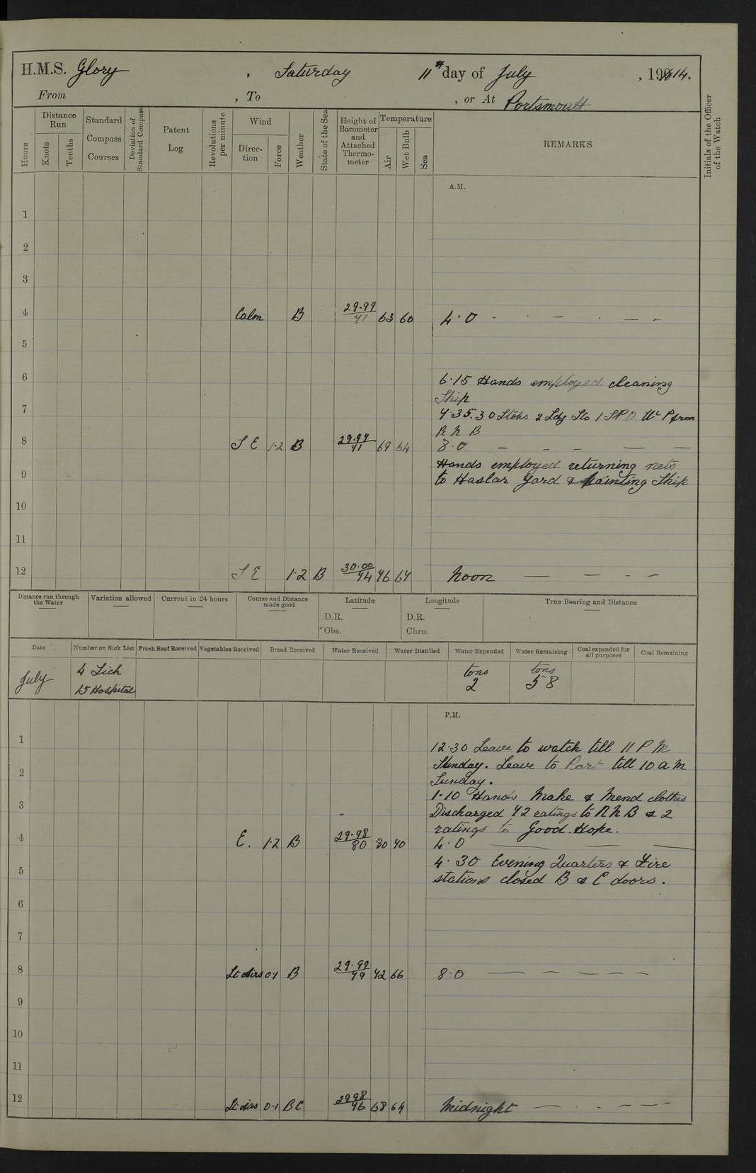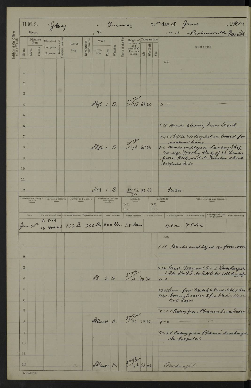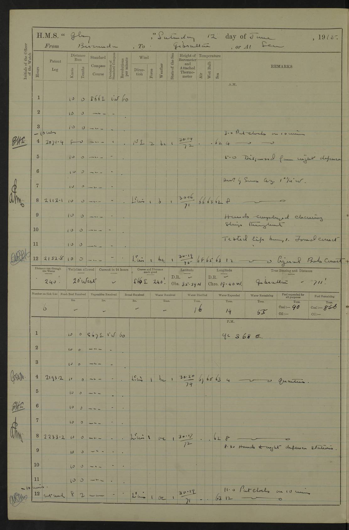 22 June 1915 At sea, Gibraltar to Lemnos Lat 36.1, Long -1.3 4.15am: Sighted land on starboard bow. 10.20am: Stopped port engine for repairs. 11.20am: proceeded with port engine. pm: a/c due to change in deviation. 10.00pm: Cape Tenez Light abeam, 18 miles. 4f73cd61a2fc8ea9030015f6: (https://s3.amazonaws.com:443/oldweather/ADM53-43015/0012_1.jpg) 23 June 1915 At sea, Gibraltar to Lemnos Lat 37.5, Long 4.8 Number on sick list: 4 5.00am: Secured from night defence stations. Placed anti-submarine guns. pm: Life saving appliances served out to men stationed in ? ?at abandon ship. 4f73cd61a2fc8ea9030015f7: (https://s3.amazonaws.com:443/oldweather/ADM53-43015/0013_0.jpg) 24 June 1915 At sea, Gibraltar to Lemnos Lat 37.4, Long 10.8 Position in log clearly bears no resemblance to the location of the ship. Position above is approximate and is based sighting of Zembra Island at 11.55am. 5.00am: Dispersed from night defence stations. Manned anti-submarine guns. am: Sighted two French torpedo boats. am: Torpedo boats passed to ~ No 362, 363. am: Sighted land on starboard beam. 11.55am: Zembra Island abeam, 25 miles. 2.00pm: Sighted Pantellaria S34ºE. 4.45pm: Pantellaria Light House abeam 12 miles. 4f73cd61a2fc8ea9030015f8: (https://s3.amazonaws.com:443/oldweather/ADM53-43015/0013_1.jpg) 25 June 1915 At sea, Gibraltar to Lemnos Lat 35.5, Long 16.7 2.10am: Gozo Light abeam 17 miles. 5.00am: Dispersed from night defence stations. Manned anti-submarine guns. 4f73cd61a2fc8ea9030015f9: (https://s3.amazonaws.com:443/oldweather/ADM53-43015/0014_0.jpg) 26 June 1915 At sea, Gibraltar to Lemnos Lat 35.5, Long 22.6 Number on sick list: 5 5.00am: Dispersed from night defence stations. Manned anti-submarine guns. am: Aired night clothing. am: marines at maxim practice on quarter deck. 2.00pm: Observed land on either bow. 3.00pm: Sighted French patrol destroyer. 4.15pm: Sighted French patrol destroyer. 9.40pm: Milo Peak N63ºW. 10.26pm: Polino Light abeam to port 5.5 miles. 4f73cd62a2fc8ea9030015fa: (https://s3.amazonaws.com:443/oldweather/ADM53-43015/0014_1.jpg) 27 June 1915 At sea and at Lemnos Lat 39.1, Long 24.4 From 0.50 to 3.05am sighting of multiple light houses. 3.50am: a/c to N39ºW and commenced to zig-zag. 5.00am: Dispersed from night defence stations and placed anti-submarine guns and look-outs. am: Lost overboard by accident Hazlewood fender, pat. 311, one in number. 10.30am: Held Divine Service onboard. pm: Met and signalled HMS Minerva on patrol duty. pm: Courses and speeds as requisite while waiting orders to approach Mudros. 3.00pm: Proceeded. 5.16pm: Increased to 90 revs, commenced to zig-zag. Course as requisite for Mudros. 7.00pm: Entered Mudros Bay. 7.47pm: Stopped. Let go port anchor in ‘M3’. 8.30pm: Darkened ship. pm: Manned one 6” and one 12 pdr. 4f73cd62a2fc8ea9030015fb: (https://s3.amazonaws.com:443/oldweather/ADM53-43015/0015_0.jpg) 28 June 1915 Mudros Bay, Lemnos Lat 39.89, Long 25.24 5,00am: HMS Vengeance entered harbour. HMS Vengeance was a pre-dreadnought of the Canopus class, launched in 1899 at Vickers, Barrow, and sold for scrapping in 1921. Details at http://en.wikipedia.org/wiki/HMS_Vengeance_(1899) . am/pm/: hands preparing for coaling and about ship’s work. pm: Collier Wabana secured alongside. 4f73cd62a2fc8ea9030015fc: (https://s3.amazonaws.com:443/oldweather/ADM53-43015/0015_1.jpg) 29 June 1915 Mudros Bay, Lemnos Lat 39.89, Long 25.24 5.15am: Commenced coaling. 2.00pm: Finished coaling. Collier left. 4f73cd62a2fc8ea9030015fd: (https://s3.amazonaws.com:443/oldweather/ADM53-43015/0016_0.jpg) 30 June 1915 Mudros Bay, Lemnos Lat 39.89, Long 25.24 am: Parties away sanding, and with fire engines onshore. am: Boats away disembarking troops. am: French Flagship Patrie sailed. The Patrie was a French pre-dreadnought, launched at La Seyne shipyard in 1903, and stricken in 1921. Details at http://en.wikipedia.org/wiki/French_battleship_Patrie . 6.30pm: Hands to bathe. 4f73cd63a2fc8ea9030015fe: (https://s3.amazonaws.com:443/oldweather/ADM53-43015/0016_1.jpg) 4f73cd63a2fc8ea9030015ff: (https://s3.amazonaws.com:443/oldweather/ADM53-43015/0017_0.jpg) 4f73cd63a2fc8ea903001600: (https://s3.amazonaws.com:443/oldweather/ADM53-43015/0017_1.jpg) 4f73cd63a2fc8ea903001601: (https://s3.amazonaws.com:443/oldweather/ADM53-43015/0018_0.jpg) 4f73cd64a2fc8ea903001602: (https://s3.amazonaws.com:443/oldweather/ADM53-43015/0018_1.jpg) LOGS FOR JULY 1915 From July to October 1915, HMS Glory spent her time at Port Mudros. Certain activities typically took place daily and are not generally noted in the pages below. These activities include: Lighting fires in the picket boat around 4am and drawing the fires in the late evening; Divisions at around 9–9.30am and Evening Quarters at 4pm; Darken ship at around 8.30pm; Daily ‘cleaning ship’, with variations thereof; SBC (for ‘Signal Books Correct’) at the watch changes. 4f73cd64a2fc8ea903001603: (https://s3.amazonaws.com:443/oldweather/ADM53-43016/0000_0.jpg) 4f73cd64a2fc8ea903001604: (https://s3.amazonaws.com:443/oldweather/ADM53-43016/0000_1.jpg) 4f73cd65a2fc8ea903001605: (https://s3.amazonaws.com:443/oldweather/ADM53-43016/0001_0.jpg) 4f73cd65a2fc8ea903001606: (https://s3.amazonaws.com:443/oldweather/ADM53-43016/0001_1.jpg) 1 July 1915 Port Mudros Lat 39.89, Long 25.24 6.30am: Landed working parties preparing boom defence ships. am: Discharged Acting Commander Rayne to Hector. Hector was a kite balloon ship. No further details readily available. 5.00pm: Tug T.10 made fast astern. 7.15pm: HMS Venerable went out. 7.30pm: HMS Chatham went out. HMS Chatham was a ‘Town’ cruiser and lead ship of her class. She was launched in 1911 at Chatham Dockyard and sold in 1926. Details at http://en.wikipedia.org/wiki/HMS_Chatham_(1911) . 4f73cd65a2fc8ea903001607: (https://s3.amazonaws.com:443/oldweather/ADM53-43016/0002_0.jpg) 2 July 1915 Port Mudros Lat 39.89, Long 25.24 5.35am: Landed working parties preparing boom defence ships. am/pm: Boom defence par
