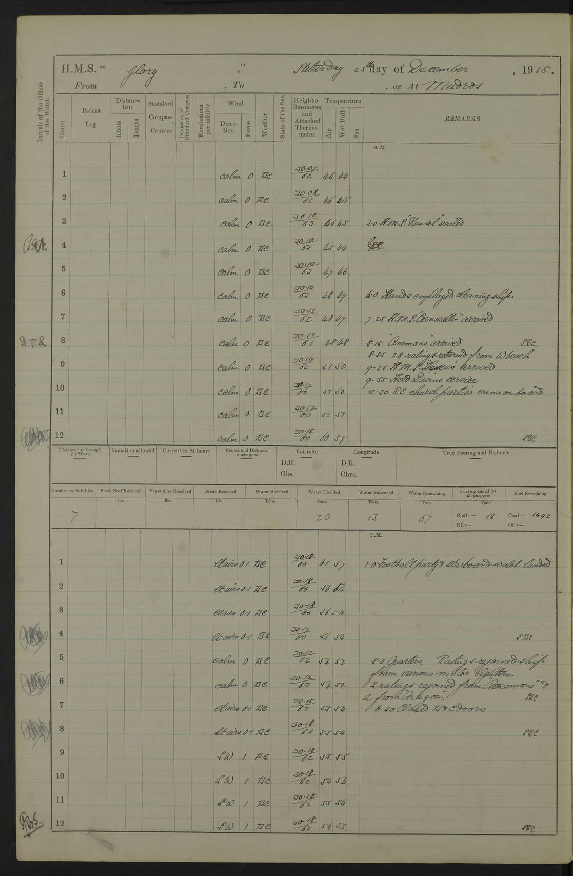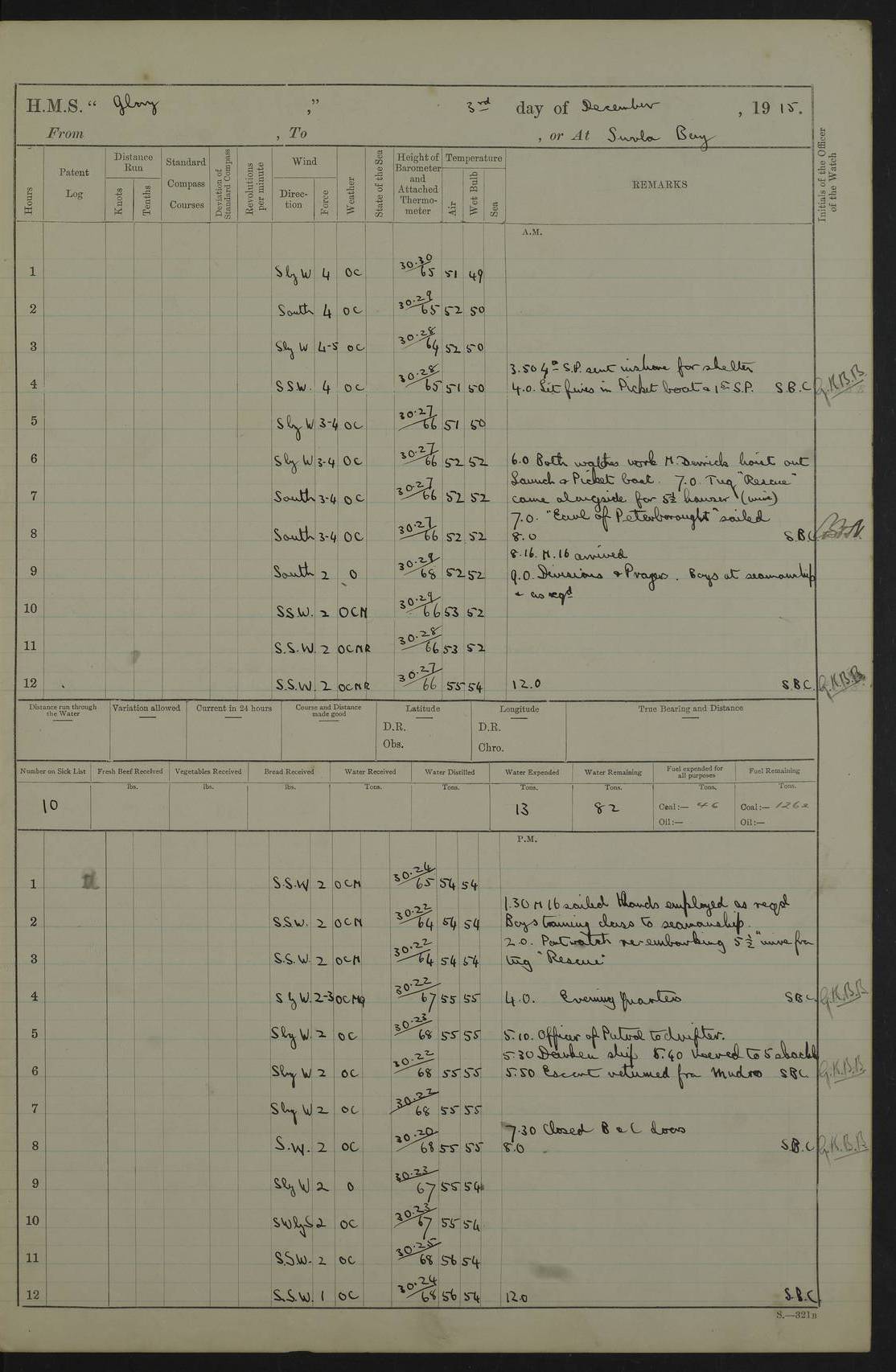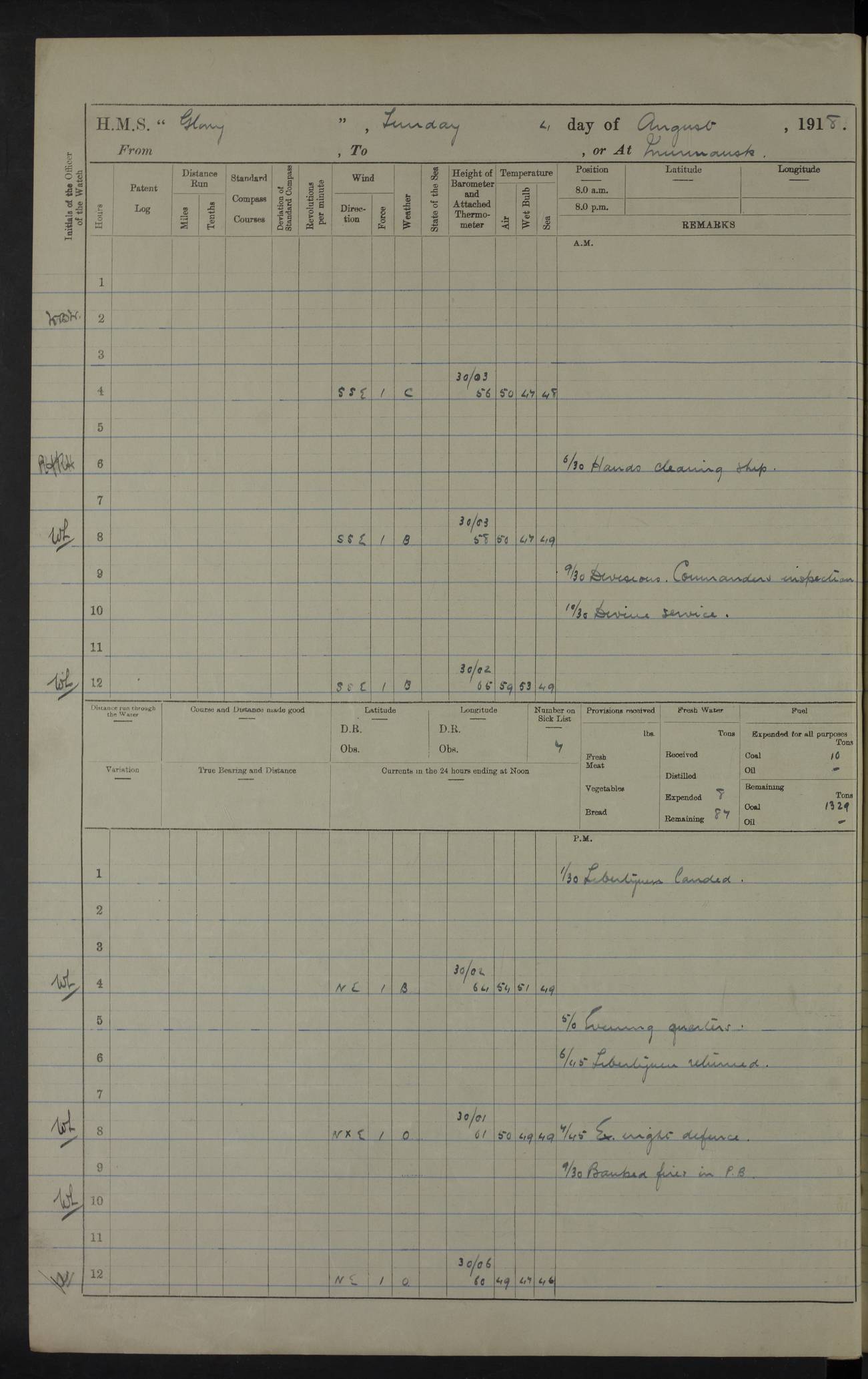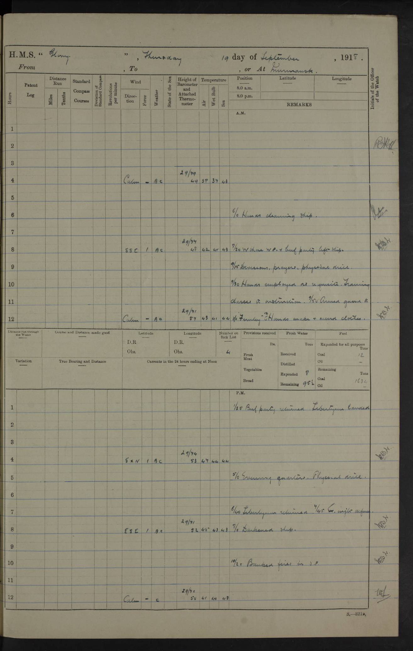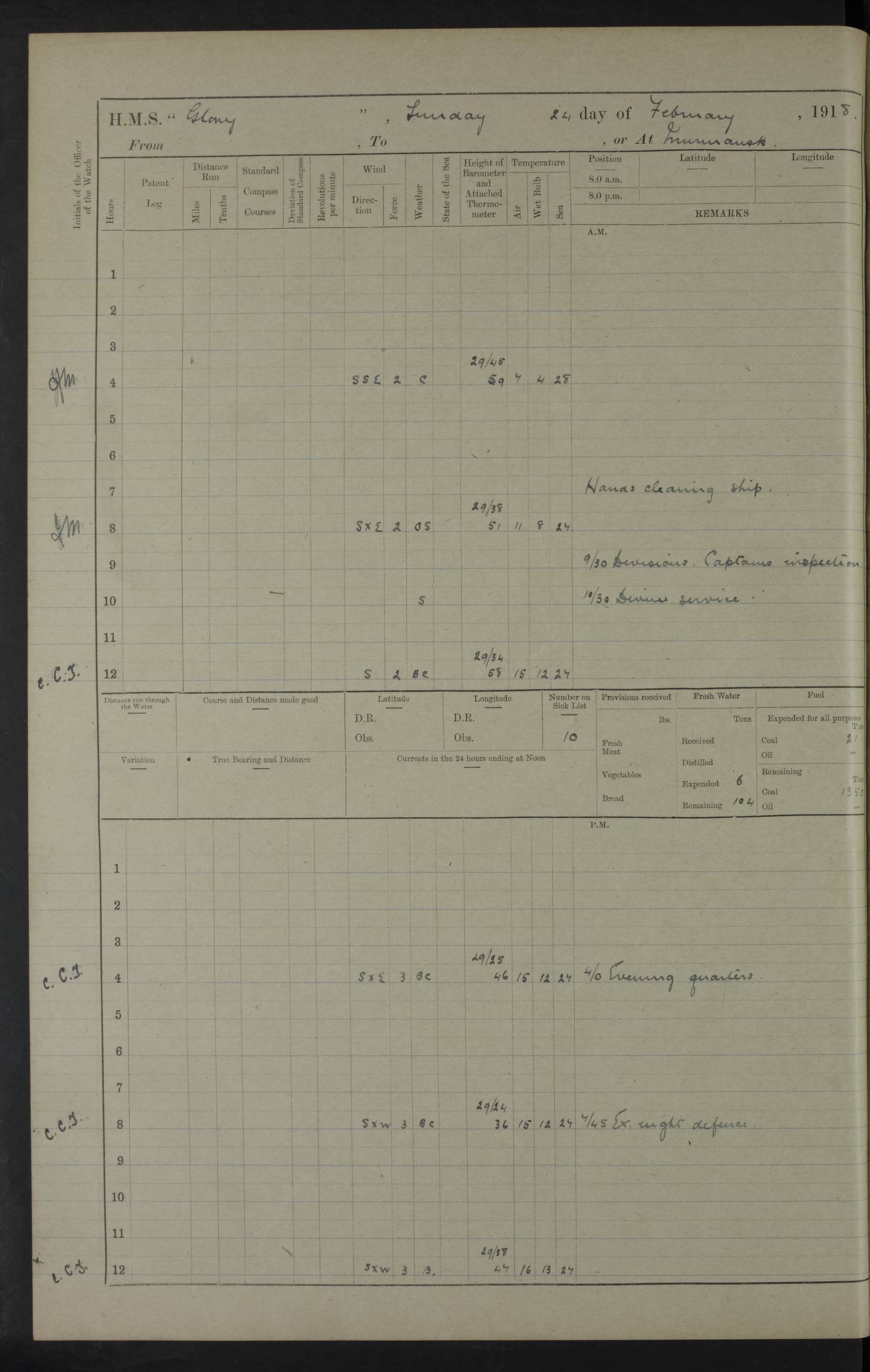 22 June 1915 At sea, Gibraltar to Lemnos Lat 36.1, Long -1.3 4.15am: Sighted land on starboard bow. 10.20am: Stopped port engine for repairs. 11.20am: proceeded with port engine. pm: a/c due to change in deviation. 10.00pm: Cape Tenez Light abeam, 18 miles. 4f73cd61a2fc8ea9030015f6: (https://s3.amazonaws.com:443/oldweather/ADM53-43015/0012_1.jpg) 23 June 1915 At sea, Gibraltar to Lemnos Lat 37.5, Long 4.8 Number on sick list: 4 5.00am: Secured from night defence stations. Placed anti-submarine guns. pm: Life saving appliances served out to men stationed in ? ?at abandon ship. 4f73cd61a2fc8ea9030015f7: (https://s3.amazonaws.com:443/oldweather/ADM53-43015/0013_0.jpg) 24 June 1915 At sea, Gibraltar to Lemnos Lat 37.4, Long 10.8 Position in log clearly bears no resemblance to the location of the ship. Position above is approximate and is based sighting of Zembra Island at 11.55am. 5.00am: Dispersed from night defence stations. Manned anti-submarine guns. am: Sighted two French torpedo boats. am: Torpedo boats passed to ~ No 362, 363. am: Sighted land on starboard beam. 11.55am: Zembra Island abeam, 25 miles. 2.00pm: Sighted Pantellaria S34ºE. 4.45pm: Pantellaria Light House abeam 12 miles. 4f73cd61a2fc8ea9030015f8: (https://s3.amazonaws.com:443/oldweather/ADM53-43015/0013_1.jpg) 25 June 1915 At sea, Gibraltar to Lemnos Lat 35.5, Long 16.7 2.10am: Gozo Light abeam 17 miles. 5.00am: Dispersed from night defence stations. Manned anti-submarine guns. 4f73cd61a2fc8ea9030015f9: (https://s3.amazonaws.com:443/oldweather/ADM53-43015/0014_0.jpg) 26 June 1915 At sea, Gibraltar to Lemnos Lat 35.5, Long 22.6 Number on sick list: 5 5.00am: Dispersed from night defence stations. Manned anti-submarine guns. am: Aired night clothing. am: marines at maxim practice on quarter deck. 2.00pm: Observed land on either bow. 3.00pm: Sighted French patrol destroyer. 4.15pm: Sighted French patrol destroyer. 9.40pm: Milo Peak N63ºW. 10.26pm: Polino Light abeam to port 5.5 miles. 4f73cd62a2fc8ea9030015fa: (https://s3.amazonaws.com:443/oldweather/ADM53-43015/0014_1.jpg) 27 June 1915 At sea and at Lemnos Lat 39.1, Long 24.4 From 0.50 to 3.05am sighting of multiple light houses. 3.50am: a/c to N39ºW and commenced to zig-zag. 5.00am: Dispersed from night defence stations and placed anti-submarine guns and look-outs. am: Lost overboard by accident Hazlewood fender, pat. 311, one in number. 10.30am: Held Divine Service onboard. pm: Met and signalled HMS Minerva on patrol duty. pm: Courses and speeds as requisite while waiting orders to approach Mudros. 3.00pm: Proceeded. 5.16pm: Increased to 90 revs, commenced to zig-zag. Course as requisite for Mudros. 7.00pm: Entered Mudros Bay. 7.47pm: Stopped. Let go port anchor in ‘M3’. 8.30pm: Darkened ship. pm: Manned one 6” and one 12 pdr. 4f73cd62a2fc8ea9030015fb: (https://s3.amazonaws.com:443/oldweather/ADM53-43015/0015_0.jpg) 28 June 1915 Mudros Bay, Lemnos Lat 39.89, Long 25.24 5,00am: HMS Vengeance entered harbour. HMS Vengeance was a pre-dreadnought of the Canopus class, launched in 1899 at Vickers, Barrow, and sold for scrapping in 1921. Details at http://en.wikipedia.org/wiki/HMS_Vengeance_(1899) . am/pm/: hands preparing for coaling and about ship’s work. pm: Collier Wabana secured alongside. 4f73cd62a2fc8ea9030015fc: (https://s3.amazonaws.com:443/oldweather/ADM53-43015/0015_1.jpg) 29 June 1915 Mudros Bay, Lemnos Lat 39.89, Long 25.24 5.15am: Commenced coaling. 2.00pm: Finished coaling. Collier left. 4f73cd62a2fc8ea9030015fd: (https://s3.amazonaws.com:443/oldweather/ADM53-43015/0016_0.jpg) 30 June 1915 Mudros Bay, Lemnos Lat 39.89, Long 25.24 am: Parties away sanding, and with fire engines onshore. am: Boats away disembarking troops. am: French Flagship Patrie sailed. The Patrie was a French pre-dreadnought, launched at La Seyne shipyard in 1903, and stricken in 1921. Details at http://en.wikipedia.org/wiki/French_battleship_Patrie . 6.30pm: Hands to bathe. 4f73cd63a2fc8ea9030015fe: (https://s3.amazonaws.com:443/oldweather/ADM53-43015/0016_1.jpg) 4f73cd63a2fc8ea9030015ff: (https://s3.amazonaws.com:443/oldweather/ADM53-43015/0017_0.jpg) 4f73cd63a2fc8ea903001600: (https://s3.amazonaws.com:443/oldweather/ADM53-43015/0017_1.jpg) 4f73cd63a2fc8ea903001601: (https://s3.amazonaws.com:443/oldweather/ADM53-43015/0018_0.jpg) 4f73cd64a2fc8ea903001602: (https://s3.amazonaws.com:443/oldweather/ADM53-43015/0018_1.jpg) LOGS FOR JULY 1915 From July to October 1915, HMS Glory spent her time at Port Mudros. Certain activities typically took place daily and are not generally noted in the pages below. These activities include: Lighting fires in the picket boat around 4am and drawing the fires in the late evening; Divisions at around 9–9.30am and Evening Quarters at 4pm; Darken ship at around 8.30pm; Daily ‘cleaning ship’, with variations thereof; SBC (for ‘Signal Books Correct’) at the watch changes. 4f73cd64a2fc8ea903001603: (https://s3.amazonaws.com:443/oldweather/ADM53-43016/0000_0.jpg) 4f73cd64a2fc8ea903001604: (https://s3.amazonaws.com:443/oldweather/ADM53-43016/0000_1.jpg) 4f73cd65a2fc8ea903001605: (https://s3.amazonaws.com:443/oldweather/ADM53-43016/0001_0.jpg) 4f73cd65a2fc8ea903001606: (https://s3.amazonaws.com:443/oldweather/ADM53-43016/0001_1.jpg) 1 July 1915 Port Mudros Lat 39.89, Long 25.24 6.30am: Landed working parties preparing boom defence ships. am: Discharged Acting Commander Rayne to Hector. Hector was a kite balloon ship. No further details readily available. 5.00pm: Tug T.10 made fast astern. 7.15pm: HMS Venerable went out. 7.30pm: HMS Chatham went out. HMS Chatham was a ‘Town’ cruiser and lead ship of her class. She was launched in 1911 at Chatham Dockyard and sold in 1926. Details at http://en.wikipedia.org/wiki/HMS_Chatham_(1911) . 4f73cd65a2fc8ea903001607: (https://s3.amazonaws.com:443/oldweather/ADM53-43016/0002_0.jpg) 2 July 1915 Port Mudros Lat 39.89, Long 25.24 5.35am: Landed working parties preparing boom defence ships. am/pm: Boom defence par